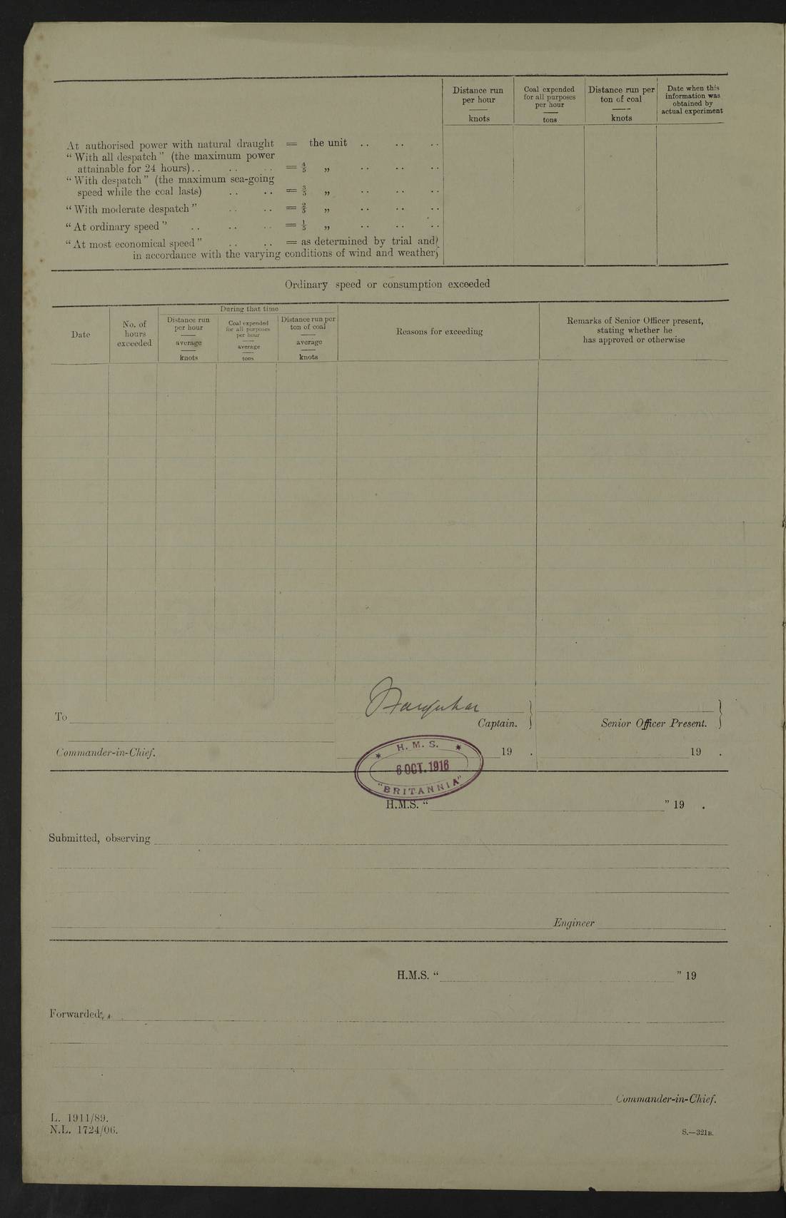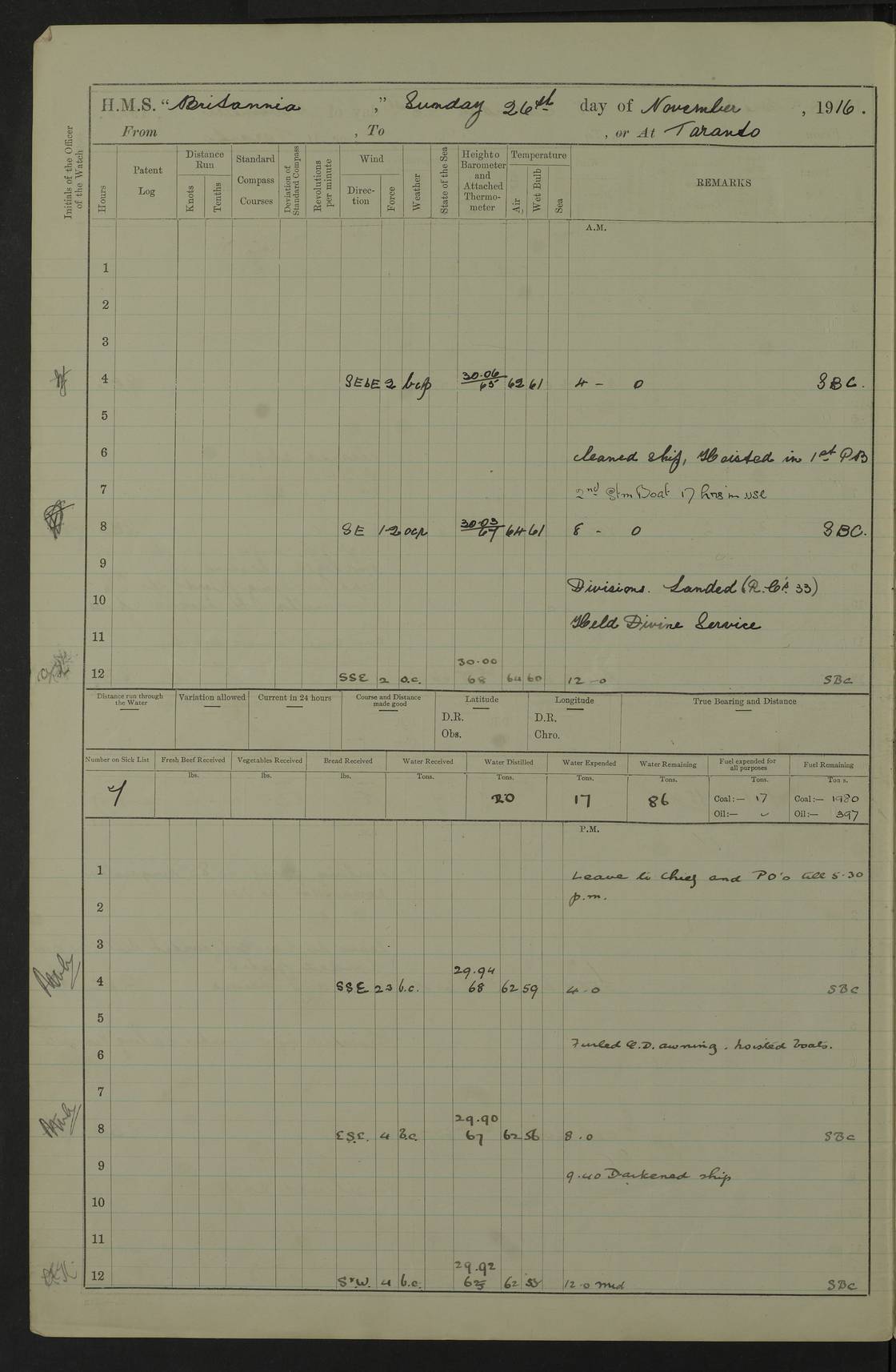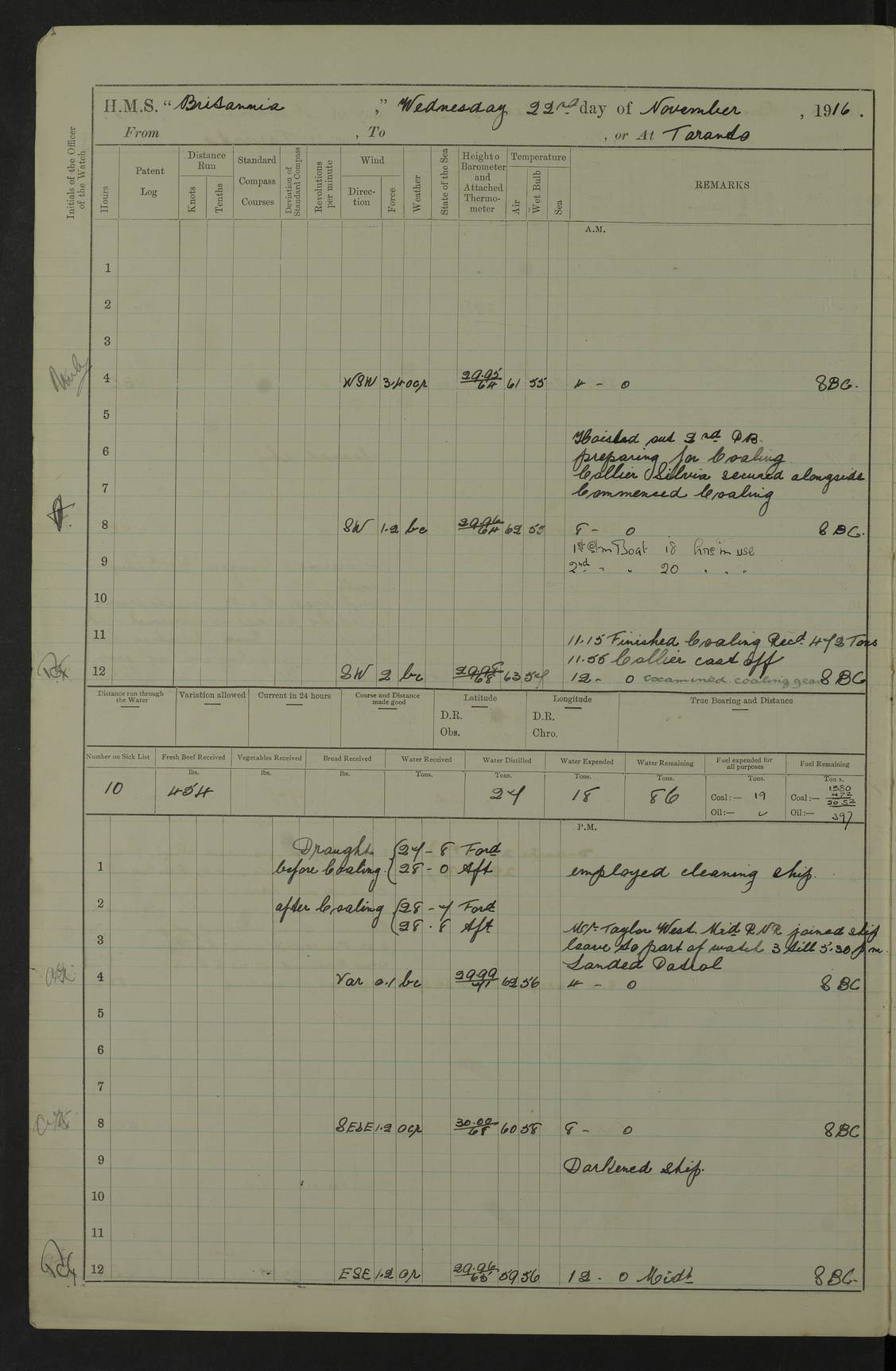LOGS FOR JULY 1917 4caf8498cadfd34197008a13: (http://oldweather.s3.amazonaws.com/ADM53-36194/ADM 53-36194-001_0.jpg) 4caf8498cadfd34197008a14: (http://oldweather.s3.amazonaws.com/ADM53-36194/ADM 53-36194-001_1.jpg) Part scans of title page of log, signed by Lieutenant Commander R.G. Hurst (Navigating Officer). 4caf8498cadfd34197008a15: (http://oldweather.s3.amazonaws.com/ADM53-36194/ADM 53-36194-002_0.jpg) Page for power and coal consumption figures with notation: No. C.R. 12/103 The Secretary of the Admiralty, Whitehall Forwarded F.W. Caulfield Britannia, 1st August 1917 4caf8498cadfd34197008a16: (http://oldweather.s3.amazonaws.com/ADM53-36194/ADM 53-36194-002_1.jpg) 1 July 1917 At sea, Simonstown to Sierra Leone Lat -17.0, Long 5.0 am: Spread quarter deck awning. 8.45am: Gunners clean guns. 10.00am: Divine Service. 4caf8498cadfd34197008a17: (http://oldweather.s3.amazonaws.com/ADM53-36194/ADM 53-36194-003_0.jpg) 2 July 1917 At sea, Simonstown to Sierra Leone Lat -13.5, Long 2.4 9.45am: X turrets and S1 6” to loader drill. am: Hauled in patent log, course and speed as required for gunnery practice. 12 noon: Lost through parting, two 5” grass hawsers 240 fathoms. pm: Finished gunnery practice. pm: Hauled in target. 2.10pm: Streamed patent log. 4caf8498cadfd34197008a18: (http://oldweather.s3.amazonaws.com/ADM53-36194/ADM 53-36194-003_1.jpg) 3 July 1917 At sea, Simonstown to Sierra Leone Lat -10.2, Long 0.1 Number on sick list: 9 am: Spread quarter deck awning. 10.00am: Hauled in patent log. 11.40am: Streamed patent log. 4caf8498cadfd34197008a19: (http://oldweather.s3.amazonaws.com/ADM53-36194/ADM 53-36194-004_0.jpg) 4 July 1917 At sea, Simonstown to Sierra Leone Lat -7.0, Long -2.9 10.00am: Course and speed as required for range finding exercise. 10.30am: B and Y turrets to division drill. Exercised range takers and control drill. 10.50am: Resumed station ahead of convoy. 6.00pm: Darken ship. 7.30pm: Observed partial eclipse of moon. 9.20pm: Centre of totality of eclipse. 4caf8498cadfd34197008a1a: (http://oldweather.s3.amazonaws.com/ADM53-36194/ADM 53-36194-004_1.jpg) 5 July 1917 At sea, Simonstown to Sierra Leone Lat -5.0, Long -6.0 Number on sick list: 7 am: Exercised classes at instruction and as requisite. 12.30pm: Exercised periscope bottle practice (seven bottles). 4caf8498cadfd34197008a1b: (http://oldweather.s3.amazonaws.com/ADM53-36194/ADM 53-36194-005_0.jpg) 6 July 1917 At sea, Simonstown to Sierra Leone Lat -3.0, Long -9.1 8.00am: Course as requisite for taking up station 6 miles 2points before beam of Galway Castle. am: Exercised action, Exercised heavy casualties, helm and engines as requisite. 11.00am: Secured, took station ahead of convoy. 12 noon: Taking station in company of Ulysses 10 miles ahead of convoy. 4.45pm: Stopped. Lowered sea boat to Ulysses for fresh provisions. pm: Hoisted sea boat, proceeded as requisite to rejoin convoy. 5.40pm: Rejoined. 4caf8498cadfd34197008a1c: (http://oldweather.s3.amazonaws.com/ADM53-36194/ADM 53-36194-005_1.jpg) 7 July 1917 At sea, Simonstown to Sierra Leone Lat -1.1, Long -12.2 Number on sick list: 7 9.30am: eased to 7 knots, opened out convoy for target practice. Veered periscope target. 10.50am: Took station 3 miles ahead of Clan MacGillivray. 11.44am: a/c 16 points, courses and speeds as requisite, ships of convoy firing on periscope target. pm: Courses and speeds as requisite for carrying out towing target practice for convoy. 3.00pm: Hauled in target, took station in centre of convoy. 4caf8498cadfd34197008a1d: (http://oldweather.s3.amazonaws.com/ADM53-36194/ADM 53-36194-006_0.jpg) 8 July 1917 At sea, Simonstown to Sierra Leone Lat 1.5, Long -14.0 am: Held Divine Service. pm: Dropped back between lines for signalling purposes. 4caf8498cadfd34197008a1e: (http://oldweather.s3.amazonaws.com/ADM53-36194/ADM 53-36194-006_1.jpg) 9 July 1917 At sea, Simonstown to Sierra Leone Lat 5.8, Long -15.0 8.00am: Took station on Galway Castle for range finder exercise. Galway Castle guide of convoy. am: Carried out two range finder exercises. 11.40am: Rejoined convoy. 1.20pm: Increased to 10 knots. Proceeded ahead of convoy with Ulysses, Convoy 7 knots. 4.45pm: Stopped. Sent boat to Ulysses for fresh provisions. 6.00pm: Rejoined convoy. 4caf8498cadfd34197008a1f: (http://oldweather.s3.amazonaws.com/ADM53-36194/ADM 53-36194-007_0.jpg) 10 July 1917 At sea and at Sierra Leone Lat 8.4, Long -13.6 Number on sick list: 9 4.00am: Commenced a line of soundings. Soundings recorded every 30 minutes until noon. 12.13pm: Sighted land on starboard bow. 12.30pm: Formed singles line, Galway Castle leading, Britannia guide. 2.00pm: Course and speed as requisite for anchorage. 3.25pm: Stopped, came to port anchor in 10 fathoms, 6 shackles. pm: Convoy anchored. 4.30pm: Collier Mallina alongside. 5.15pm: Commenced coaling. 6.00pm: Five Ratings joined ship from King Alfred. 8.00pm: Finished coaling for night. 4caf8498cadfd34197008a20: (http://oldweather.s3.amazonaws.com/ADM53-36194/ADM 53-36194-007_1.jpg) 11 July 1917 Sierra Leone Lat 8.5, Long -13.2 5.15pm: Commenced coaling. 6.20am: Bacchante arrived. 10.20am: Finished coaling. Finished 1640 tons. 11.00am: Collier cast off. 12 noon: Discharged Father Driscoll to Bacchante. pm: Examined coaling gear. pm: One Signalman joined Ship from Hospital. 4caf8498cadfd34197008a21: (http://oldweather.s3.amazonaws.com/ADM53-36194/ADM 53-36194-008_0.jpg) 12 July 1917: