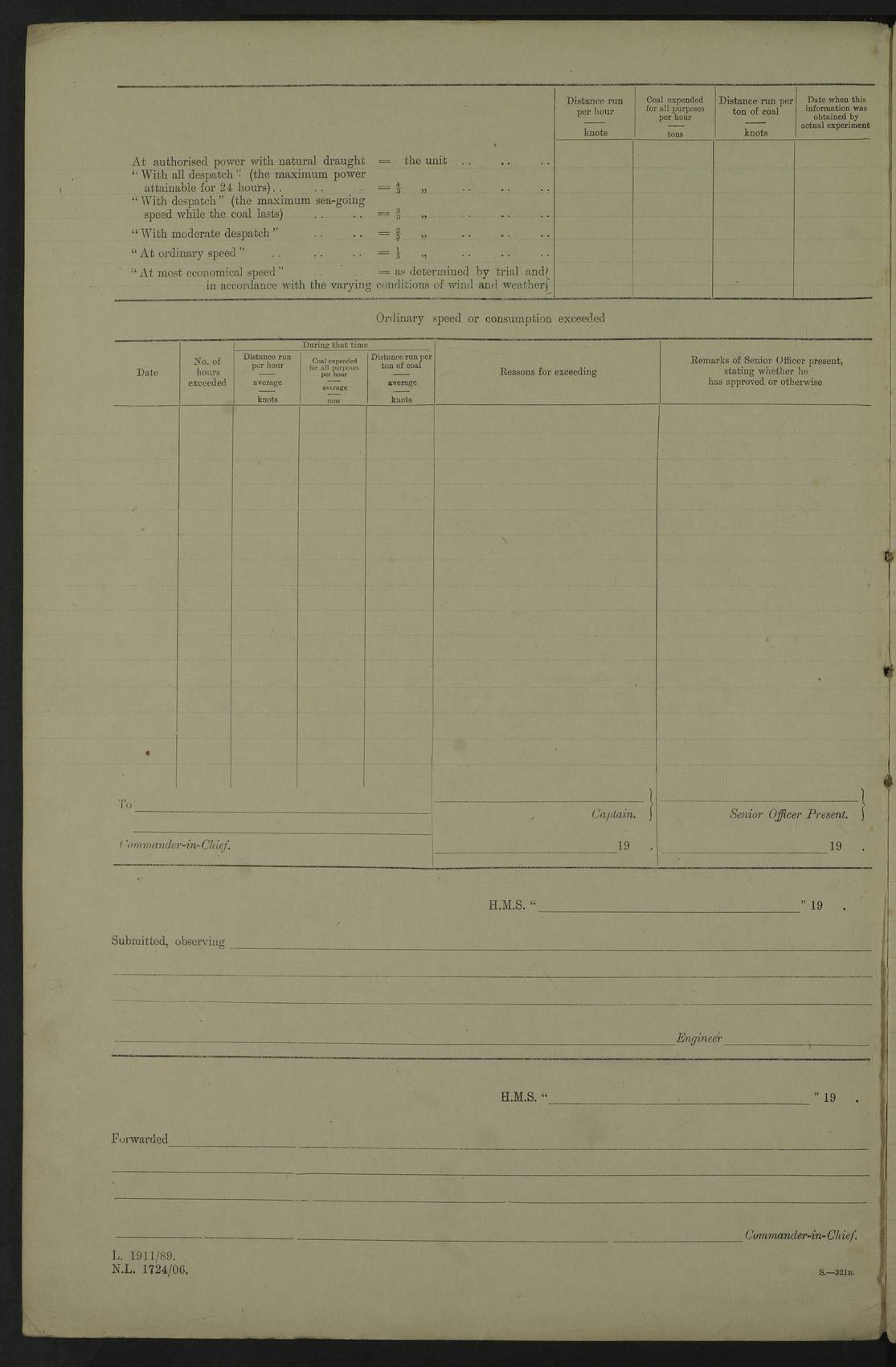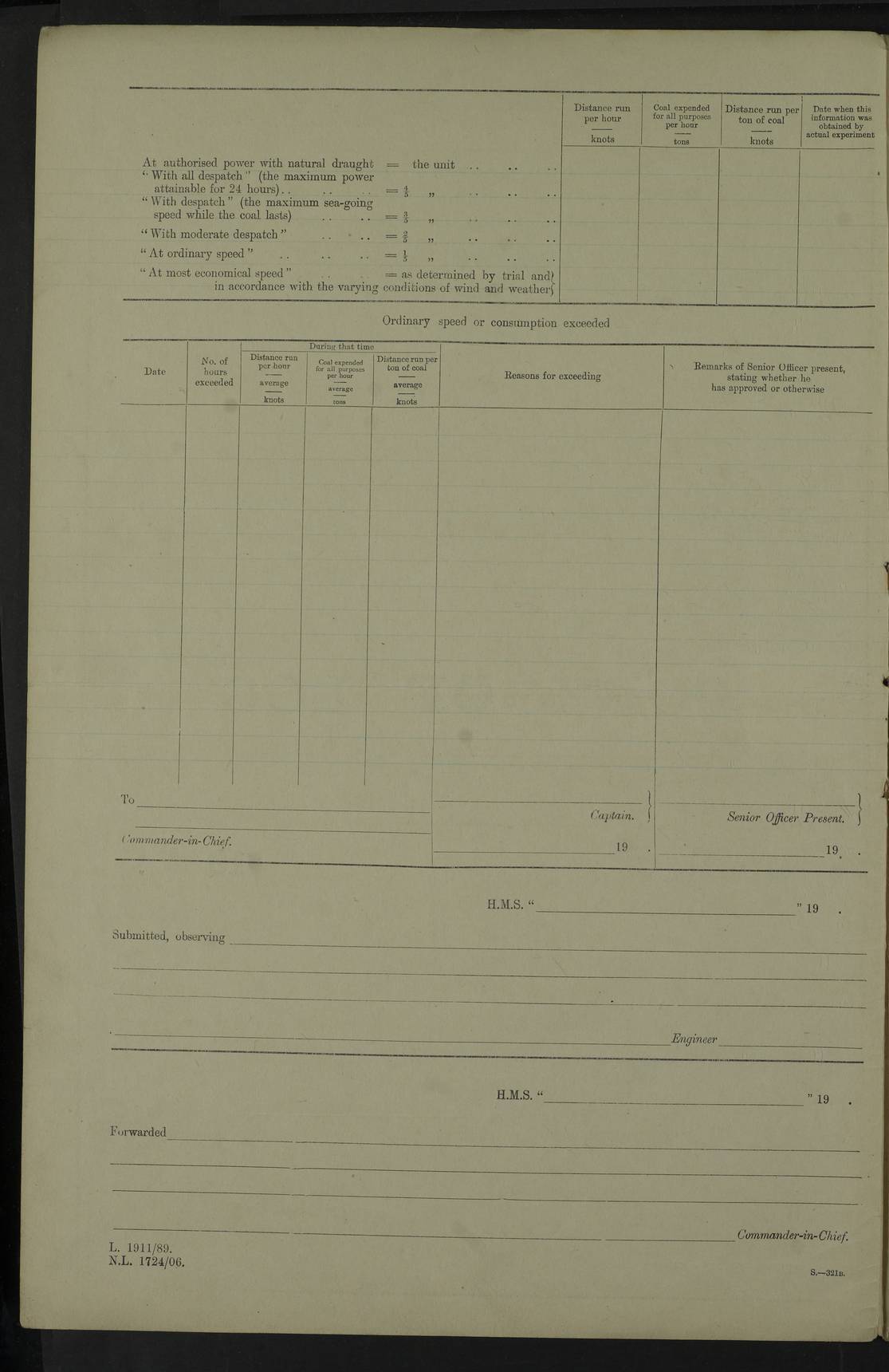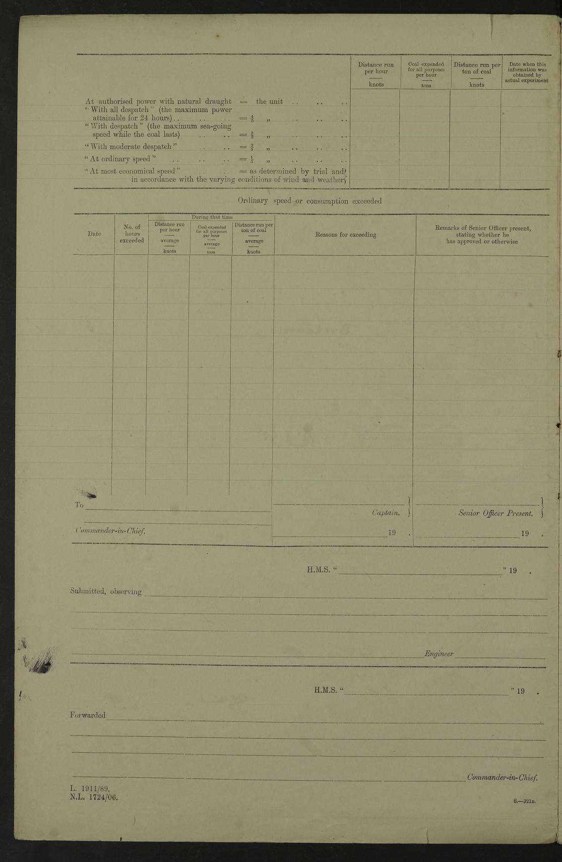 LOGS FOR JULY 1917 4caf8498cadfd34197008a13: (http://oldweather.s3.amazonaws.com/ADM53-36194/ADM 53-36194-001_0.jpg) 4caf8498cadfd34197008a14: (http://oldweather.s3.amazonaws.com/ADM53-36194/ADM 53-36194-001_1.jpg) Part scans of title page of log, signed by Lieutenant Commander R.G. Hurst (Navigating Officer). 4caf8498cadfd34197008a15: (http://oldweather.s3.amazonaws.com/ADM53-36194/ADM 53-36194-002_0.jpg) Page for power and coal consumption figures with notation: No. C.R. 12/103 The Secretary of the Admiralty, Whitehall Forwarded F.W. Caulfield Britannia, 1st August 1917 4caf8498cadfd34197008a16: (http://oldweather.s3.amazonaws.com/ADM53-36194/ADM 53-36194-002_1.jpg) 1 July 1917 At sea, Simonstown to Sierra Leone Lat -17.0, Long 5.0 am: Spread quarter deck awning. 8.45am: Gunners clean guns. 10.00am: Divine Service. 4caf8498cadfd34197008a17: (http://oldweather.s3.amazonaws.com/ADM53-36194/ADM 53-36194-003_0.jpg) 2 July 1917 At sea, Simonstown to Sierra Leone Lat -13.5, Long 2.4 9.45am: X turrets and S1 6” to loader drill. am: Hauled in patent log, course and speed as required for gunnery practice. 12 noon: Lost through parting, two 5” grass hawsers 240 fathoms. pm: Finished gunnery practice. pm: Hauled in target. 2.10pm: Streamed patent log. 4caf8498cadfd34197008a18: (http://oldweather.s3.amazonaws.com/ADM53-36194/ADM 53-36194-003_1.jpg) 3 July 1917 At sea, Simonstown to Sierra Leone Lat -10.2, Long 0.1 Number on sick list: 9 am: Spread quarter deck awning. 10.00am: Hauled in patent log. 11.40am: Streamed patent log. 4caf8498cadfd34197008a19: (http://oldweather.s3.amazonaws.com/ADM53-36194/ADM 53-36194-004_0.jpg) 4 July 1917 At sea, Simonstown to Sierra Leone Lat -7.0, Long -2.9 10.00am: Course and speed as required for range finding exercise. 10.30am: B and Y turrets to division drill. Exercised range takers and control drill. 10.50am: Resumed station ahead of convoy. 6.00pm: Darken ship. 7.30pm: Observed partial eclipse of moon. 9.20pm: Centre of totality of eclipse. 4caf8498cadfd34197008a1a: (http://oldweather.s3.amazonaws.com/ADM53-36194/ADM 53-36194-004_1.jpg) 5 July 1917 At sea, Simonstown to Sierra Leone Lat -5.0, Long -6.0 Number on sick list: 7 am: Exercised classes at instruction and as requisite. 12.30pm: Exercised periscope bottle practice (seven bottles). 4caf8498cadfd34197008a1b: (http://oldweather.s3.amazonaws.com/ADM53-36194/ADM 53-36194-005_0.jpg) 6 July 1917 At sea, Simonstown to Sierra Leone Lat -3.0, Long -9.1 8.00am: Course as requisite for taking up station 6 miles 2points before beam of Galway Castle. am: Exercised action, Exercised heavy casualties, helm and engines as requisite. 11.00am: Secured, took station ahead of convoy. 12 noon: Taking station in company of Ulysses 10 miles ahead of convoy. 4.45pm: Stopped. Lowered sea boat to Ulysses for fresh provisions. pm: Hoisted sea boat, proceeded as requisite to rejoin convoy. 5.40pm: Rejoined. 4caf8498cadfd34197008a1c: (http://oldweather.s3.amazonaws.com/ADM53-36194/ADM 53-36194-005_1.jpg) 7 July 1917 At sea, Simonstown to Sierra Leone Lat -1.1, Long -12.2 Number on sick list: 7 9.30am: eased to 7 knots, opened out convoy for target practice. Veered periscope target. 10.50am: Took station 3 miles ahead of Clan MacGillivray. 11.44am: a/c 16 points, courses and speeds as requisite, ships of convoy firing on periscope target. pm: Courses and speeds as requisite for carrying out towing target practice for convoy. 3.00pm: Hauled in target, took station in centre of convoy. 4caf8498cadfd34197008a1d: (http://oldweather.s3.amazonaws.com/ADM53-36194/ADM 53-36194-006_0.jpg) 8 July 1917 At sea, Simonstown to Sierra Leone Lat 1.5, Long -14.0 am: Held Divine Service. pm: Dropped back between lines for signalling purposes. 4caf8498cadfd34197008a1e: (http://oldweather.s3.amazonaws.com/ADM53-36194/ADM 53-36194-006_1.jpg) 9 July 1917 At sea, Simonstown to Sierra Leone Lat 5.8, Long -15.0 8.00am: Took station on Galway Castle for range finder exercise. Galway Castle guide of convoy. am: Carried out two range finder exercises. 11.40am: Rejoined convoy. 1.20pm: Increased to 10 knots. Proceeded ahead of convoy with Ulysses, Convoy 7 knots. 4.45pm: Stopped. Sent boat to Ulysses for fresh provisions. 6.00pm: Rejoined convoy. 4caf8498cadfd34197008a1f: (http://oldweather.s3.amazonaws.com/ADM53-36194/ADM 53-36194-007_0.jpg) 10 July 1917 At sea and at Sierra Leone Lat 8.4, Long -13.6 Number on sick list: 9 4.00am: Commenced a line of soundings. Soundings recorded every 30 minutes until noon. 12.13pm: Sighted land on starboard bow. 12.30pm: Formed singles line, Galway Castle leading, Britannia guide. 2.00pm: Course and speed as requisite for anchorage. 3.25pm: Stopped, came to port anchor in 10 fathoms, 6 shackles. pm: Convoy anchored. 4.30pm: Collier Mallina alongside. 5.15pm: Commenced coaling. 6.00pm: Five Ratings joined ship from King Alfred. 8.00pm: Finished coaling for night. 4caf8498cadfd34197008a20: (http://oldweather.s3.amazonaws.com/ADM53-36194/ADM 53-36194-007_1.jpg) 11 July 1917 Sierra Leone Lat 8.5, Long -13.2 5.15pm: Commenced coaling. 6.20am: Bacchante arrived. 10.20am: Finished coaling. Finished 1640 tons. 11.00am: Collier cast off. 12 noon: Discharged Father Driscoll to Bacchante. pm: Examined coaling gear. pm: One Signalman joined Ship from Hospital. 4caf8498cadfd34197008a21: (http://oldweather.s3.amazonaws.com/ADM53-36194/ADM 53-36194-008_0.jpg) 12 July 1917: