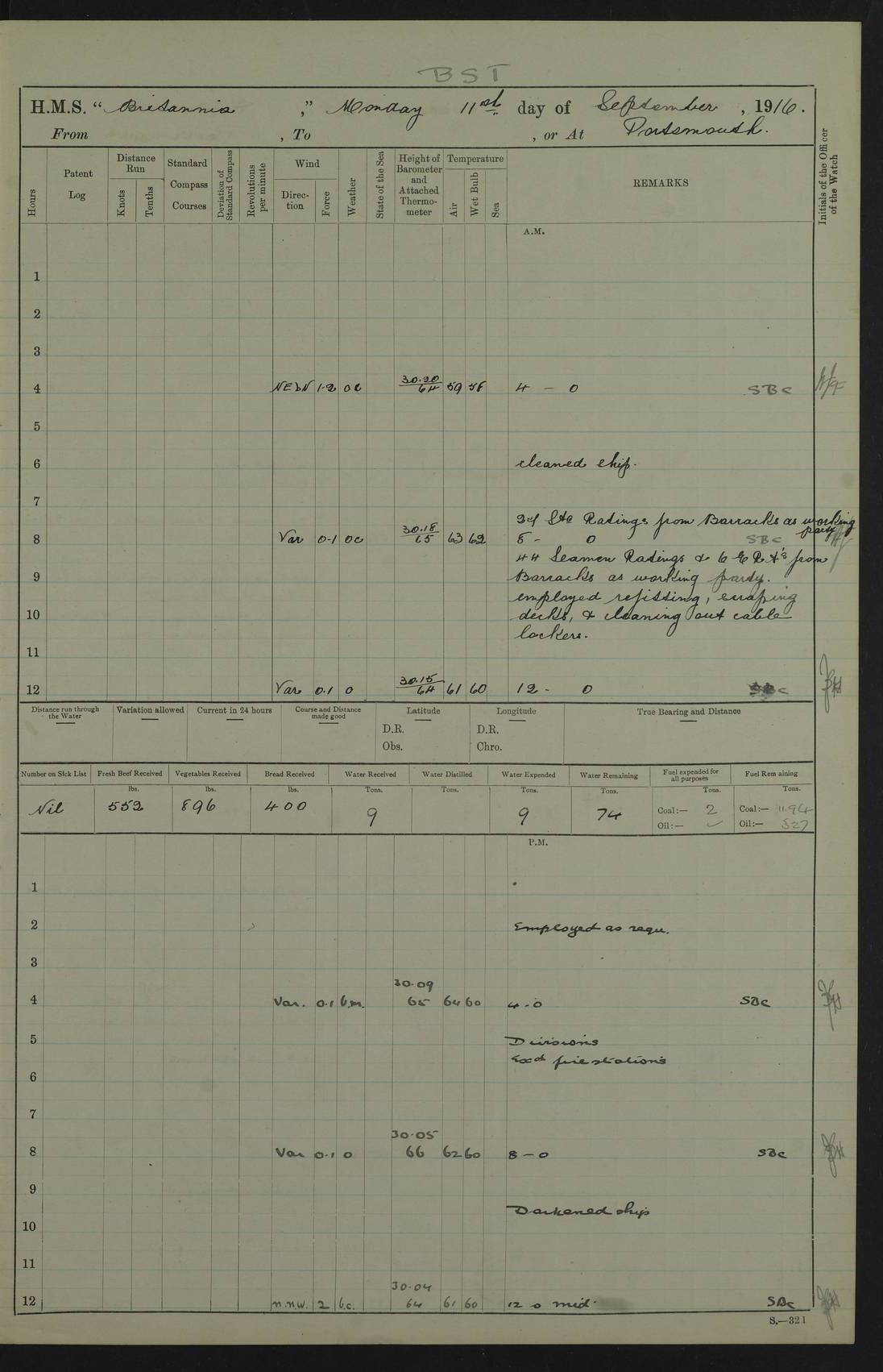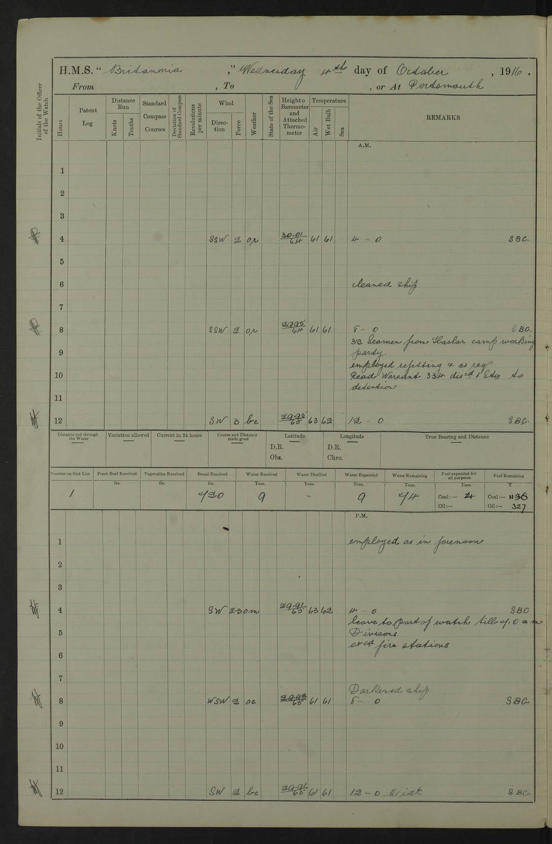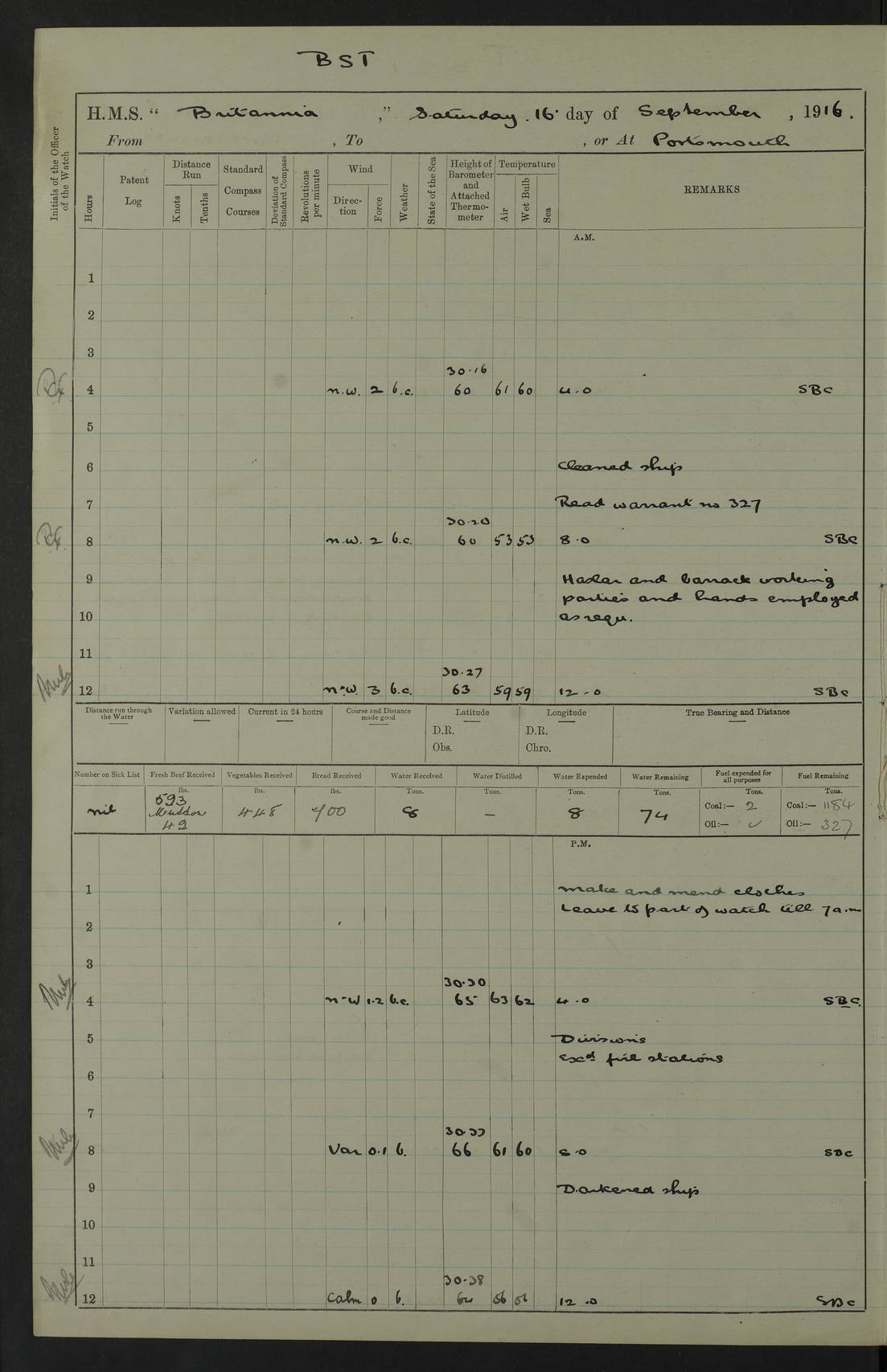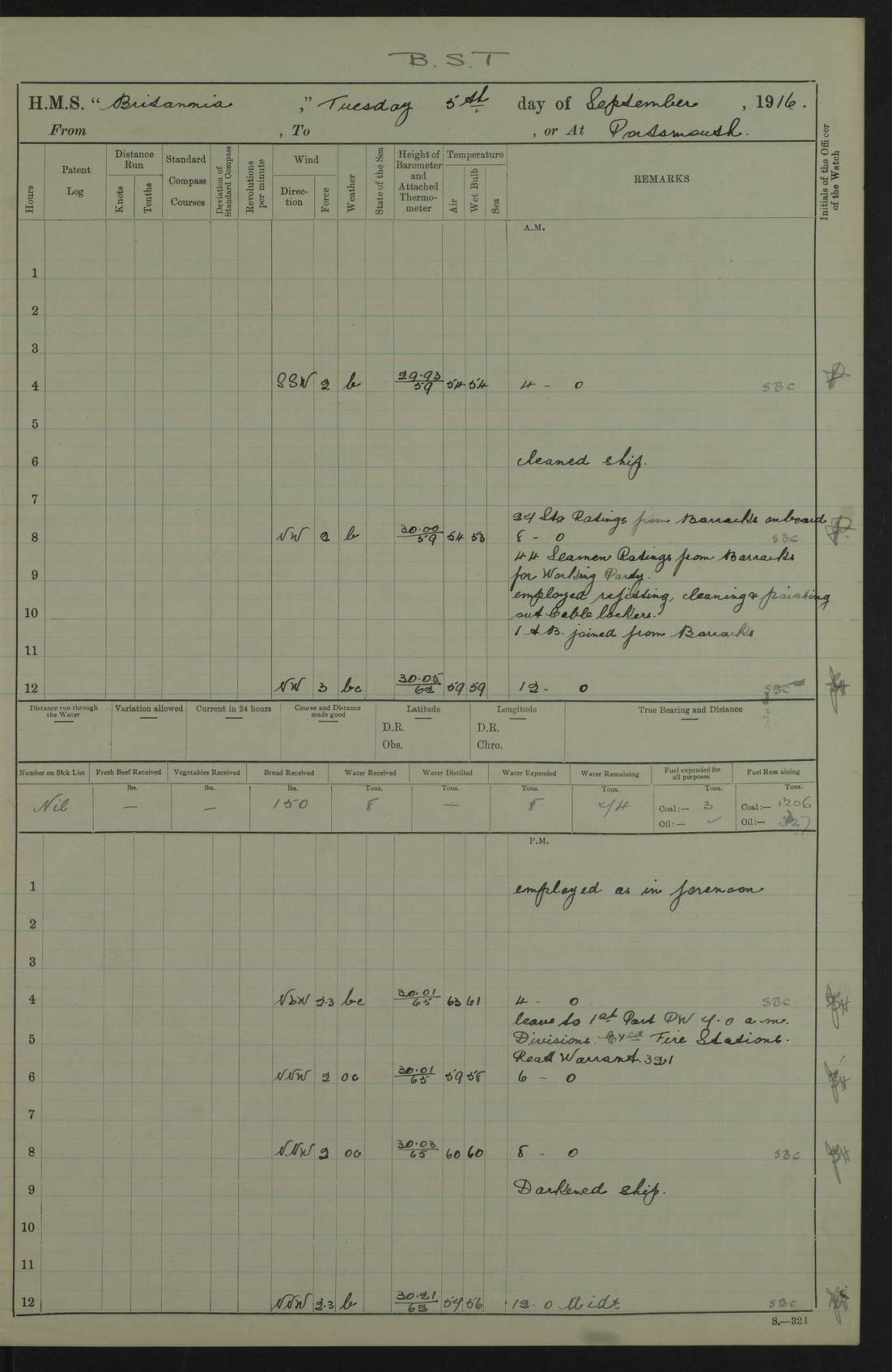 LOGS FOR SEPTEMBER 1916 4edebb6e14d045057800009f: (https://s3.amazonaws.com:443/oldweather/ADM53-36184/0001_0.jpg) Left half of cover page. 4edebb6f14d04505780000a0: (https://s3.amazonaws.com:443/oldweather/ADM53-36184/0001_1.jpg) Right half of cover page, signed by Lieutenant Commander R.G. Hurst, Navigating Officer. 4edebb6f14d04505780000a1: (https://s3.amazonaws.com:443/oldweather/ADM53-36184/0002_0.jpg) Page signed by Captain Farquhar and dated 6 October, 1916. 4edebb6f14d04505780000a2: (https://s3.amazonaws.com:443/oldweather/ADM53-36184/0002_1.jpg) 1 September 1916 Portsmouth Lat 50.81, Long -1.11 Number on sick list: 2 am: Cleaned ship and prepared to take in provisions. am: 39 ratings from Barracks as working party. pm: Paid monthly money to Starboard watch. Employed taking in provisions and as requisite. 4edebb6f14d04505780000a3: (https://s3.amazonaws.com:443/oldweather/ADM53-36184/0003_0.jpg) 2 September 1916 Portsmouth Lat 50.81, Long -1.11 Number on sick list: 0 am/pm: Employed provisioning ship. pm: 8 Ratings discharged to barracks. pm: 1 Private RMLI joined ship from Forton and 1 Private RMLI discharged to Forton. Forton Barracks, Portsmouth, was the home of the Portsmouth Division of the Royal Marines Light Infantry (RMLI) from 1848–1923. Some details at http://en.wikipedia.org/wiki/St_Vincent_College . 4edebb6f14d04505780000a4: (https://s3.amazonaws.com:443/oldweather/ADM53-36184/0003_1.jpg) 3 September 1916 Portsmouth Lat 50.81, Long -1.11 Number on sick list: 0 am: Landed church parties. 4edebb6f14d04505780000a5: (https://s3.amazonaws.com:443/oldweather/ADM53-36184/0004_0.jpg) 4 September 1916 Portsmouth Lat 50.81, Long -1.11 Number on sick list: 0 am: 38 Stoker Ratings from Barracks as Working Party. am: Employed refitting and as requisite. am: 46 Seamen Ratings and 46 ERAs employed onboard from Barracks. 4edebb6f14d04505780000a6: (https://s3.amazonaws.com:443/oldweather/ADM53-36184/0004_1.jpg) 5 September 1916 Portsmouth Lat 50.81, Long -1.11 Number on sick list: 0 am: 29 Stoker Ratings from Barracks onboard. am: 44 Seaman Ratings from barracks for working party. am: Employed refitting, cleaning and painting out cable lockers. am: 1 AB joined from Barracks. pm: Read Warrant 321. 4edebb6f14d04505780000a7: (https://s3.amazonaws.com:443/oldweather/ADM53-36184/0005_0.jpg) 6 September 1916 Portsmouth Lat 50.81, Long -1.11 Number on sick list: 0 am: 27 Stoker Ratings from Barracks onboard. am: 43 Seaman Ratings from barracks for working party. am: Employed cleaning and returning stores. pm: Discharged 5 Stokers to barracks. 4edebb6f14d04505780000a8: (https://s3.amazonaws.com:443/oldweather/ADM53-36184/0005_1.jpg) 7 September 1916 Portsmouth Lat 50.81, Long -1.11 Number on sick list: 1 am: 34 Stoker Ratings from Barracks as working party. am: 43 Seaman Ratings from Barracks as working party. pm: Lieutenant ~ends joined ship. 4edebb6f14d04505780000a9: (https://s3.amazonaws.com:443/oldweather/ADM53-36184/0006_0.jpg) 8 September 1916 Portsmouth Lat 50.81, Long -1.11 Number on sick list: 0 am: 33 Stoker Ratings from Barracks as working party. am: Read Warrant 322, one Gunner RMA to detention. am: 6 ERAs and 40 Seaman Ratings from Barracks working party. pm: Read Warrants 323, 324 and 325. 4edebb6f14d04505780000aa: (https://s3.amazonaws.com:443/oldweather/ADM53-36184/0006_1.jpg) 9 September 1916 Portsmouth Lat 50.81, Long -1.11 Number on sick list: 0 am: 37 Stoker Ratings from Barracks working party. 8.10am: Africa left 15 Dock. HMS Africa was a pre-dreadnought of the ‘King Edward VII’ class, launched in 1905 at Chatham Dockyard and sold for scrapping in 1920. Details at http://en.wikipedia.org/wiki/HMS_Africa_(1905) and logs at http://www.naval-history.net/OWShips-WW1-01-HMS_Africa.htm . am: 33 Stoker Ratings from Barracks working party. am: 12 Midshipmen left ship for Barracks. 4edebb6f14d04505780000ab: (https://s3.amazonaws.com:443/oldweather/ADM53-36184/0007_0.jpg) 10 September 1916 Portsmouth Lat 50.81, Long -1.11 Number on sick list: 0 am: Landed Church parties. 4edebb6f14d04505780000ac: (https://s3.amazonaws.com:443/oldweather/ADM53-36184/0007_1.jpg) 11 September 1916 Portsmouth Lat 50.81, Long -1.11 Number on sick list: 0 am: 37 Stoker Ratings from Barracks as working party. am: 44 Seaman Ratings and 6 ERAs from Barracks as working party. 4edebb6f14d04505780000ad: (https://s3.amazonaws.com:443/oldweather/ADM53-36184/0008_0.jpg) 12 September 1916 Portsmouth Lat 50.81, Long -1.11 Number on sick list: 1 am: Party of 43 ratings from Haslar camp employed as requisite. The Royal Hospital Haslar was a military hospital located at Gosport. Details at http://en.wikipedia.org/wiki/Royal_Hospital_Haslar . There are multiple on-line references to a ‘Haslar Camp’, which was presumably located near the hospital. 4.00pm: Read warrant no. 326. 4edebb6f14d04505780000ae: (https://s3.amazonaws.com:443/oldweather/ADM53-36184/0008_1.jpg) 13 September 1916 Portsmouth Lat 50.81, Long -1.11 Number on sick list: 0 am: Working party from Haslar camp employed as requisite. 4edebb6f14d04505780000af: (https://s3.amazonaws.com:443/oldweather/ADM53-36184/0009_0.jpg) 14 September 1916 Portsmouth Lat 50.81, Long -1.11 Number on sick list: 0 am/pm: Barrack and Haslar working parties employed as requisite. 4edebb6f14d04505780000b0: (https://s3.amazonaws.com:443/oldweather/ADM53-36184/0009_1.jpg) 15 September 1916 Portsmouth Lat 50.81, Long -1.11 Number on sick list: 0 am/pm: Barrack and Haslar working parties and hands employed as requisite. 4edebb7014d04505780000b1: (https://s3.amazonaws.com:443/oldweather/ADM53-36184/0010_0.jpg) 16 September 1916 Portsmouth Lat 50.81, Long -1.11 Number on sick list: 0 am: Read warrant no. 327. am: Haslar and Barrack working parties and hands employed as requisite. 4edebb7014d04505780000b2: (https://s3.amazonaws.com:443/oldweather/ADM53-36184/0010_1.jpg) 17 September 1916 Portsmouth Lat 50.81, Long -1.11 Number on sick list: 0 am: Landed Church parties. 4edebb70