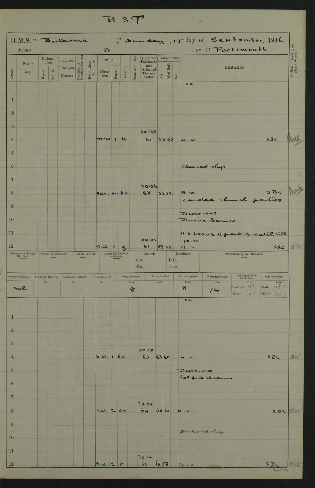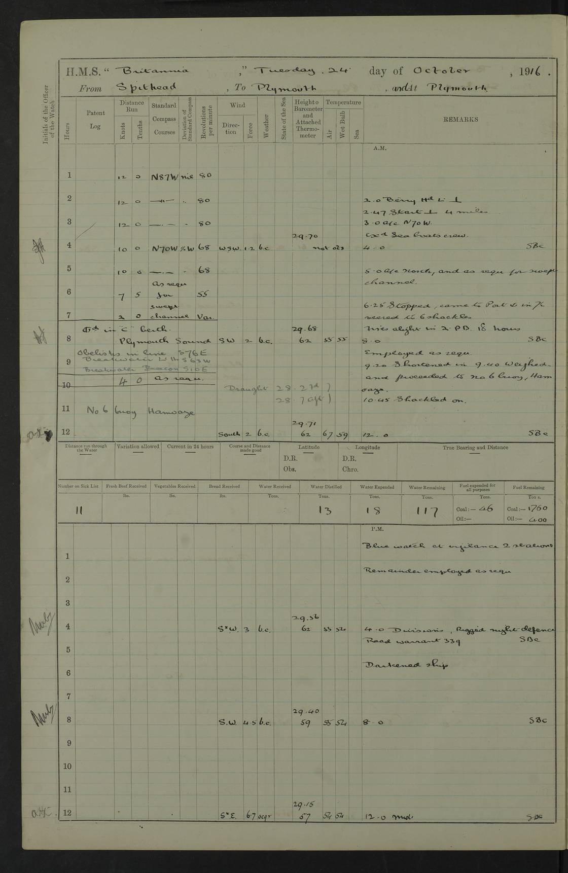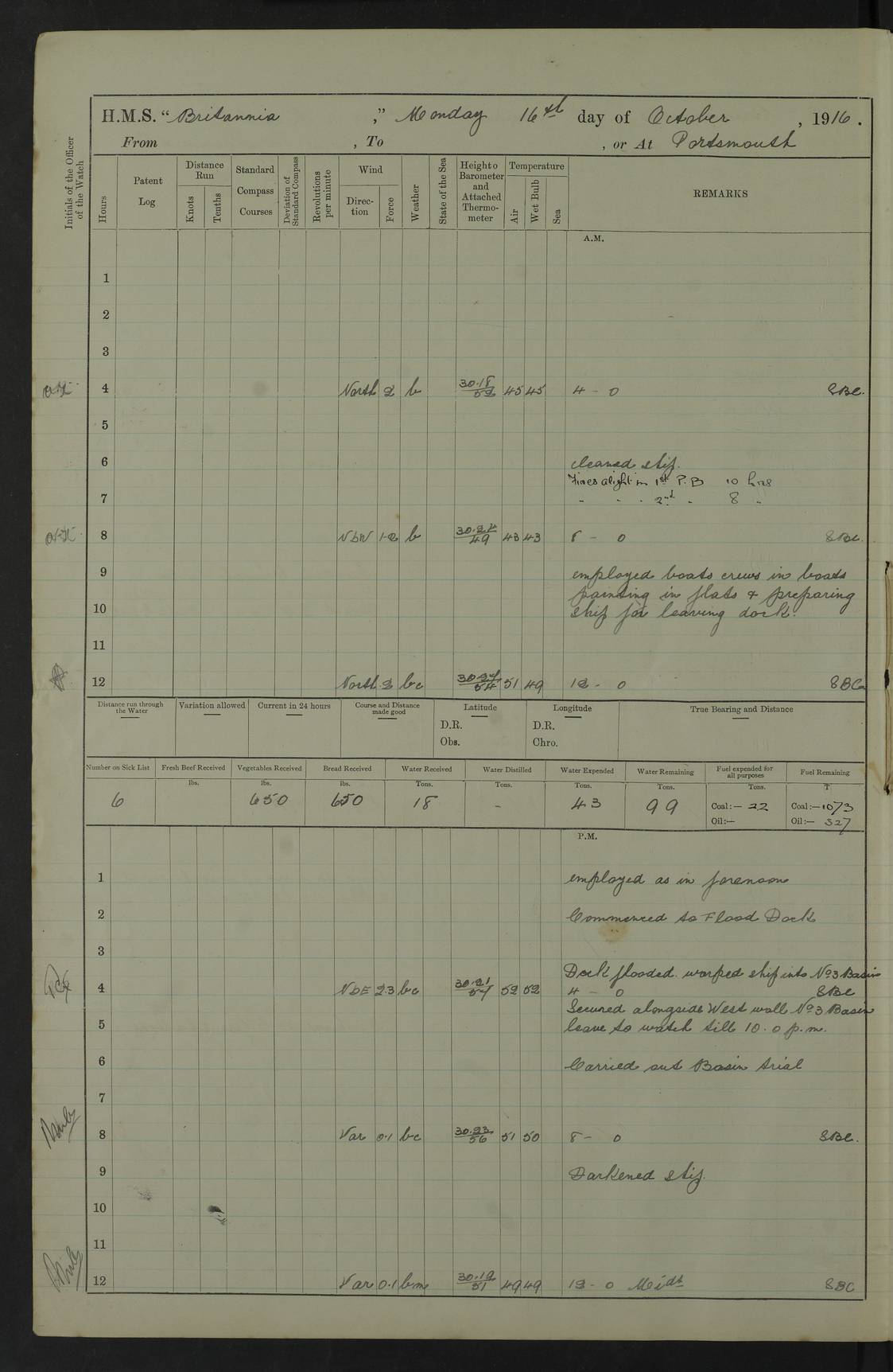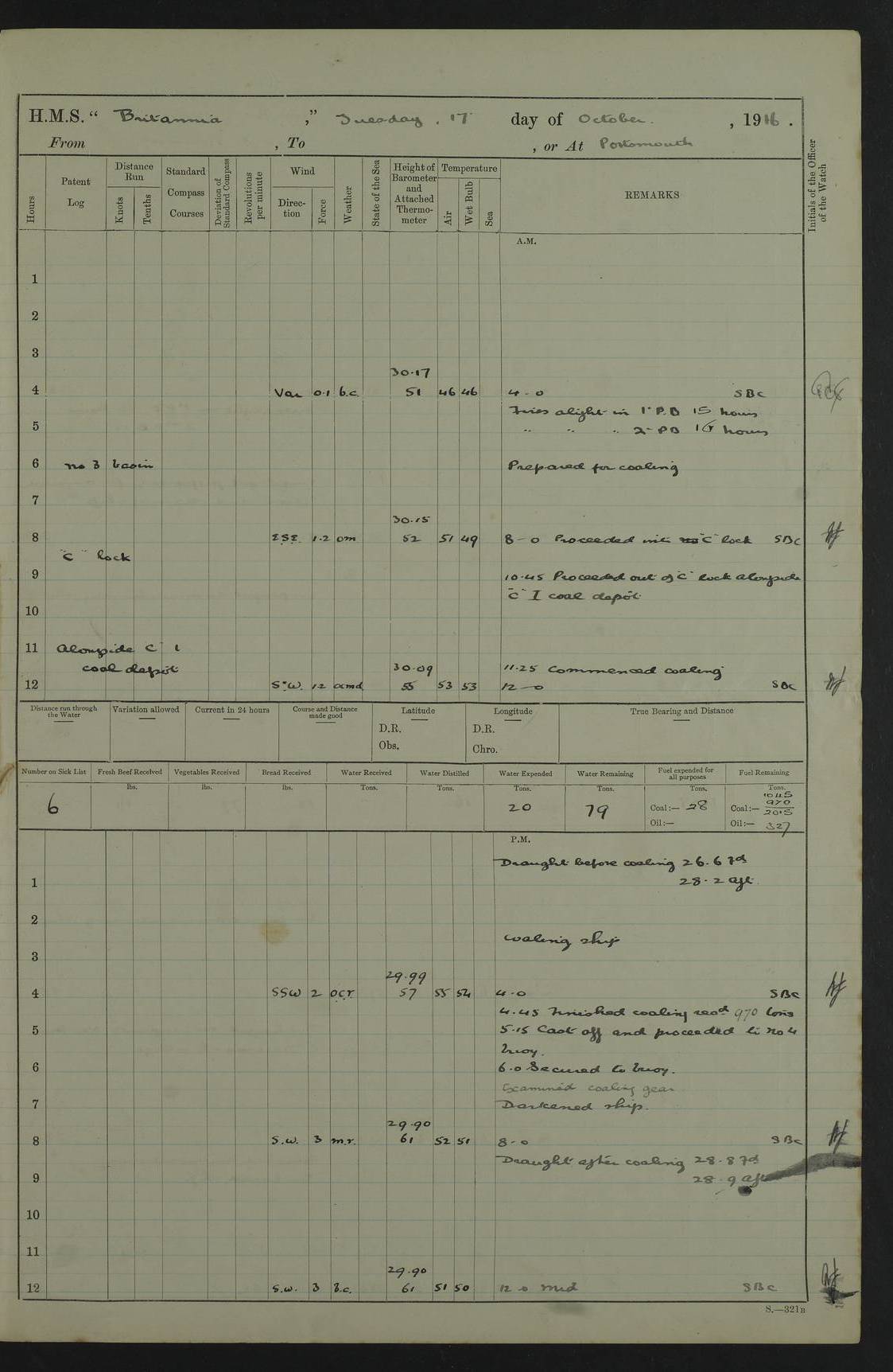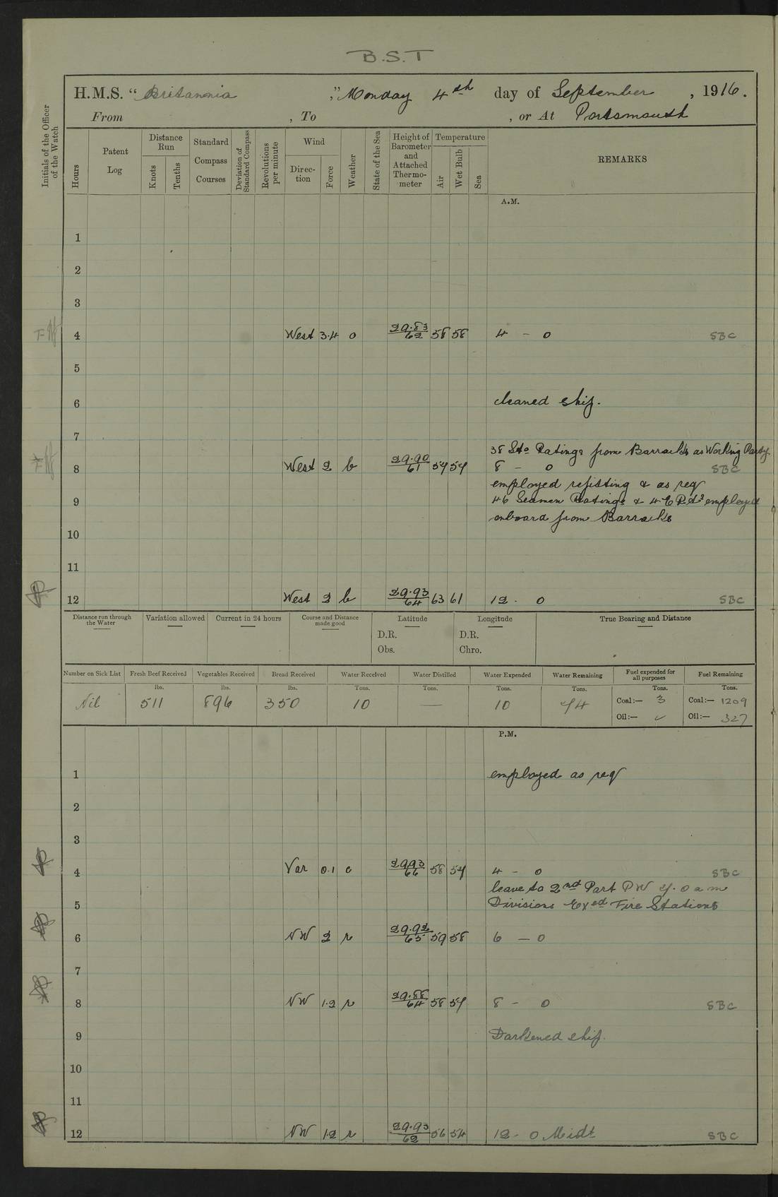 LOGS FOR SEPTEMBER 1916 4edebb6e14d045057800009f: (https://s3.amazonaws.com:443/oldweather/ADM53-36184/0001_0.jpg) Left half of cover page. 4edebb6f14d04505780000a0: (https://s3.amazonaws.com:443/oldweather/ADM53-36184/0001_1.jpg) Right half of cover page, signed by Lieutenant Commander R.G. Hurst, Navigating Officer. 4edebb6f14d04505780000a1: (https://s3.amazonaws.com:443/oldweather/ADM53-36184/0002_0.jpg) Page signed by Captain Farquhar and dated 6 October, 1916. 4edebb6f14d04505780000a2: (https://s3.amazonaws.com:443/oldweather/ADM53-36184/0002_1.jpg) 1 September 1916 Portsmouth Lat 50.81, Long -1.11 Number on sick list: 2 am: Cleaned ship and prepared to take in provisions. am: 39 ratings from Barracks as working party. pm: Paid monthly money to Starboard watch. Employed taking in provisions and as requisite. 4edebb6f14d04505780000a3: (https://s3.amazonaws.com:443/oldweather/ADM53-36184/0003_0.jpg) 2 September 1916 Portsmouth Lat 50.81, Long -1.11 Number on sick list: 0 am/pm: Employed provisioning ship. pm: 8 Ratings discharged to barracks. pm: 1 Private RMLI joined ship from Forton and 1 Private RMLI discharged to Forton. Forton Barracks, Portsmouth, was the home of the Portsmouth Division of the Royal Marines Light Infantry (RMLI) from 1848–1923. Some details at http://en.wikipedia.org/wiki/St_Vincent_College . 4edebb6f14d04505780000a4: (https://s3.amazonaws.com:443/oldweather/ADM53-36184/0003_1.jpg) 3 September 1916 Portsmouth Lat 50.81, Long -1.11 Number on sick list: 0 am: Landed church parties. 4edebb6f14d04505780000a5: (https://s3.amazonaws.com:443/oldweather/ADM53-36184/0004_0.jpg) 4 September 1916 Portsmouth Lat 50.81, Long -1.11 Number on sick list: 0 am: 38 Stoker Ratings from Barracks as Working Party. am: Employed refitting and as requisite. am: 46 Seamen Ratings and 46 ERAs employed onboard from Barracks. 4edebb6f14d04505780000a6: (https://s3.amazonaws.com:443/oldweather/ADM53-36184/0004_1.jpg) 5 September 1916 Portsmouth Lat 50.81, Long -1.11 Number on sick list: 0 am: 29 Stoker Ratings from Barracks onboard. am: 44 Seaman Ratings from barracks for working party. am: Employed refitting, cleaning and painting out cable lockers. am: 1 AB joined from Barracks. pm: Read Warrant 321. 4edebb6f14d04505780000a7: (https://s3.amazonaws.com:443/oldweather/ADM53-36184/0005_0.jpg) 6 September 1916 Portsmouth Lat 50.81, Long -1.11 Number on sick list: 0 am: 27 Stoker Ratings from Barracks onboard. am: 43 Seaman Ratings from barracks for working party. am: Employed cleaning and returning stores. pm: Discharged 5 Stokers to barracks. 4edebb6f14d04505780000a8: (https://s3.amazonaws.com:443/oldweather/ADM53-36184/0005_1.jpg) 7 September 1916 Portsmouth Lat 50.81, Long -1.11 Number on sick list: 1 am: 34 Stoker Ratings from Barracks as working party. am: 43 Seaman Ratings from Barracks as working party. pm: Lieutenant ~ends joined ship. 4edebb6f14d04505780000a9: (https://s3.amazonaws.com:443/oldweather/ADM53-36184/0006_0.jpg) 8 September 1916 Portsmouth Lat 50.81, Long -1.11 Number on sick list: 0 am: 33 Stoker Ratings from Barracks as working party. am: Read Warrant 322, one Gunner RMA to detention. am: 6 ERAs and 40 Seaman Ratings from Barracks working party. pm: Read Warrants 323, 324 and 325. 4edebb6f14d04505780000aa: (https://s3.amazonaws.com:443/oldweather/ADM53-36184/0006_1.jpg) 9 September 1916 Portsmouth Lat 50.81, Long -1.11 Number on sick list: 0 am: 37 Stoker Ratings from Barracks working party. 8.10am: Africa left 15 Dock. HMS Africa was a pre-dreadnought of the ‘King Edward VII’ class, launched in 1905 at Chatham Dockyard and sold for scrapping in 1920. Details at http://en.wikipedia.org/wiki/HMS_Africa_(1905) and logs at http://www.naval-history.net/OWShips-WW1-01-HMS_Africa.htm . am: 33 Stoker Ratings from Barracks working party. am: 12 Midshipmen left ship for Barracks. 4edebb6f14d04505780000ab: (https://s3.amazonaws.com:443/oldweather/ADM53-36184/0007_0.jpg) 10 September 1916 Portsmouth Lat 50.81, Long -1.11 Number on sick list: 0 am: Landed Church parties. 4edebb6f14d04505780000ac: (https://s3.amazonaws.com:443/oldweather/ADM53-36184/0007_1.jpg) 11 September 1916 Portsmouth Lat 50.81, Long -1.11 Number on sick list: 0 am: 37 Stoker Ratings from Barracks as working party. am: 44 Seaman Ratings and 6 ERAs from Barracks as working party. 4edebb6f14d04505780000ad: (https://s3.amazonaws.com:443/oldweather/ADM53-36184/0008_0.jpg) 12 September 1916 Portsmouth Lat 50.81, Long -1.11 Number on sick list: 1 am: Party of 43 ratings from Haslar camp employed as requisite. The Royal Hospital Haslar was a military hospital located at Gosport. Details at http://en.wikipedia.org/wiki/Royal_Hospital_Haslar . There are multiple on-line references to a ‘Haslar Camp’, which was presumably located near the hospital. 4.00pm: Read warrant no. 326. 4edebb6f14d04505780000ae: (https://s3.amazonaws.com:443/oldweather/ADM53-36184/0008_1.jpg) 13 September 1916 Portsmouth Lat 50.81, Long -1.11 Number on sick list: 0 am: Working party from Haslar camp employed as requisite. 4edebb6f14d04505780000af: (https://s3.amazonaws.com:443/oldweather/ADM53-36184/0009_0.jpg) 14 September 1916 Portsmouth Lat 50.81, Long -1.11 Number on sick list: 0 am/pm: Barrack and Haslar working parties employed as requisite. 4edebb6f14d04505780000b0: (https://s3.amazonaws.com:443/oldweather/ADM53-36184/0009_1.jpg) 15 September 1916 Portsmouth Lat 50.81, Long -1.11 Number on sick list: 0 am/pm: Barrack and Haslar working parties and hands employed as requisite. 4edebb7014d04505780000b1: (https://s3.amazonaws.com:443/oldweather/ADM53-36184/0010_0.jpg) 16 September 1916 Portsmouth Lat 50.81, Long -1.11 Number on sick list: 0 am: Read warrant no. 327. am: Haslar and Barrack working parties and hands employed as requisite. 4edebb7014d04505780000b2: (https://s3.amazonaws.com:443/oldweather/ADM53-36184/0010_1.jpg) 17 September 1916 Portsmouth Lat 50.81, Long -1.11 Number on sick list: 0 am: Landed Church parties. 4edebb70