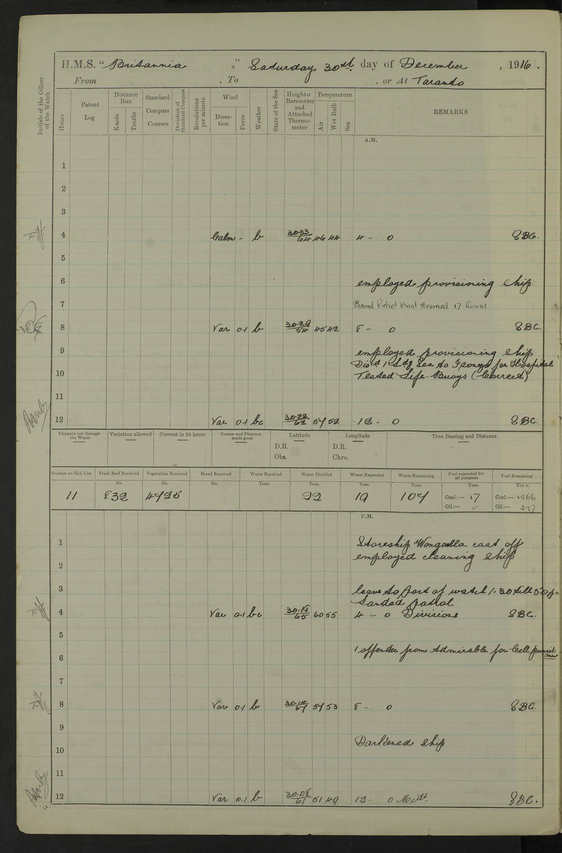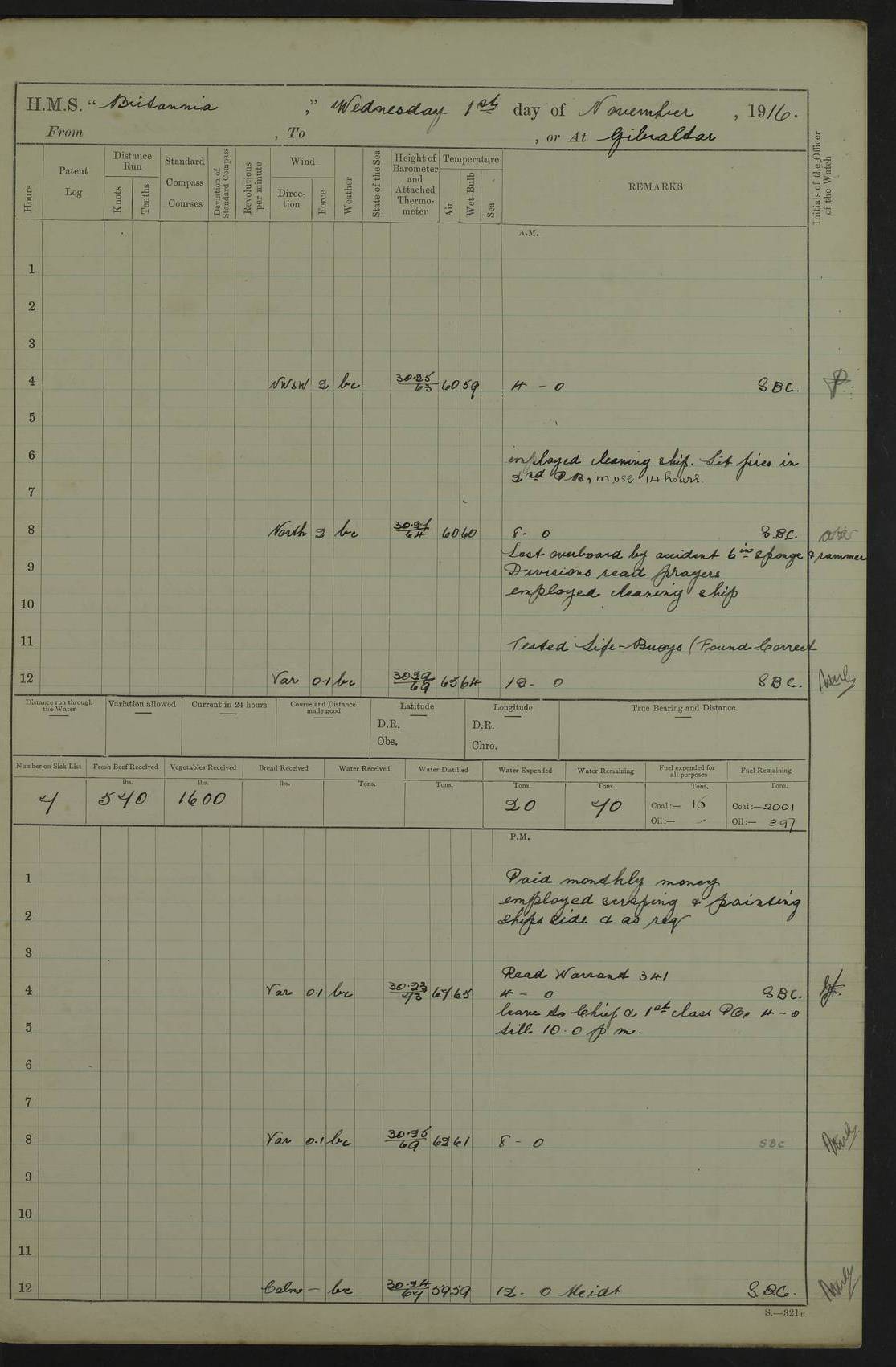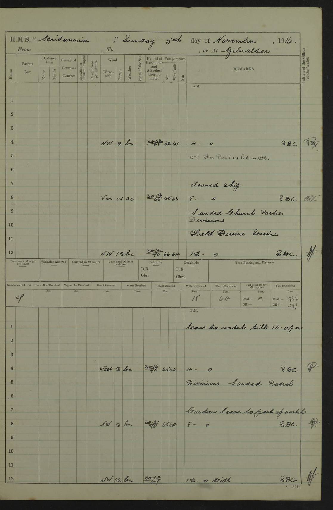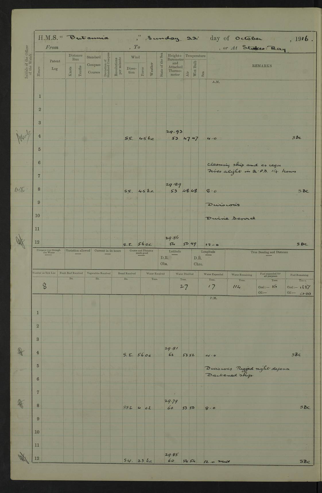 LOGS FOR SEPTEMBER 1916 4edebb6e14d045057800009f: (https://s3.amazonaws.com:443/oldweather/ADM53-36184/0001_0.jpg) Left half of cover page. 4edebb6f14d04505780000a0: (https://s3.amazonaws.com:443/oldweather/ADM53-36184/0001_1.jpg) Right half of cover page, signed by Lieutenant Commander R.G. Hurst, Navigating Officer. 4edebb6f14d04505780000a1: (https://s3.amazonaws.com:443/oldweather/ADM53-36184/0002_0.jpg) Page signed by Captain Farquhar and dated 6 October, 1916. 4edebb6f14d04505780000a2: (https://s3.amazonaws.com:443/oldweather/ADM53-36184/0002_1.jpg) 1 September 1916 Portsmouth Lat 50.81, Long -1.11 Number on sick list: 2 am: Cleaned ship and prepared to take in provisions. am: 39 ratings from Barracks as working party. pm: Paid monthly money to Starboard watch. Employed taking in provisions and as requisite. 4edebb6f14d04505780000a3: (https://s3.amazonaws.com:443/oldweather/ADM53-36184/0003_0.jpg) 2 September 1916 Portsmouth Lat 50.81, Long -1.11 Number on sick list: 0 am/pm: Employed provisioning ship. pm: 8 Ratings discharged to barracks. pm: 1 Private RMLI joined ship from Forton and 1 Private RMLI discharged to Forton. Forton Barracks, Portsmouth, was the home of the Portsmouth Division of the Royal Marines Light Infantry (RMLI) from 1848–1923. Some details at http://en.wikipedia.org/wiki/St_Vincent_College . 4edebb6f14d04505780000a4: (https://s3.amazonaws.com:443/oldweather/ADM53-36184/0003_1.jpg) 3 September 1916 Portsmouth Lat 50.81, Long -1.11 Number on sick list: 0 am: Landed church parties. 4edebb6f14d04505780000a5: (https://s3.amazonaws.com:443/oldweather/ADM53-36184/0004_0.jpg) 4 September 1916 Portsmouth Lat 50.81, Long -1.11 Number on sick list: 0 am: 38 Stoker Ratings from Barracks as Working Party. am: Employed refitting and as requisite. am: 46 Seamen Ratings and 46 ERAs employed onboard from Barracks. 4edebb6f14d04505780000a6: (https://s3.amazonaws.com:443/oldweather/ADM53-36184/0004_1.jpg) 5 September 1916 Portsmouth Lat 50.81, Long -1.11 Number on sick list: 0 am: 29 Stoker Ratings from Barracks onboard. am: 44 Seaman Ratings from barracks for working party. am: Employed refitting, cleaning and painting out cable lockers. am: 1 AB joined from Barracks. pm: Read Warrant 321. 4edebb6f14d04505780000a7: (https://s3.amazonaws.com:443/oldweather/ADM53-36184/0005_0.jpg) 6 September 1916 Portsmouth Lat 50.81, Long -1.11 Number on sick list: 0 am: 27 Stoker Ratings from Barracks onboard. am: 43 Seaman Ratings from barracks for working party. am: Employed cleaning and returning stores. pm: Discharged 5 Stokers to barracks. 4edebb6f14d04505780000a8: (https://s3.amazonaws.com:443/oldweather/ADM53-36184/0005_1.jpg) 7 September 1916 Portsmouth Lat 50.81, Long -1.11 Number on sick list: 1 am: 34 Stoker Ratings from Barracks as working party. am: 43 Seaman Ratings from Barracks as working party. pm: Lieutenant ~ends joined ship. 4edebb6f14d04505780000a9: (https://s3.amazonaws.com:443/oldweather/ADM53-36184/0006_0.jpg) 8 September 1916 Portsmouth Lat 50.81, Long -1.11 Number on sick list: 0 am: 33 Stoker Ratings from Barracks as working party. am: Read Warrant 322, one Gunner RMA to detention. am: 6 ERAs and 40 Seaman Ratings from Barracks working party. pm: Read Warrants 323, 324 and 325. 4edebb6f14d04505780000aa: (https://s3.amazonaws.com:443/oldweather/ADM53-36184/0006_1.jpg) 9 September 1916 Portsmouth Lat 50.81, Long -1.11 Number on sick list: 0 am: 37 Stoker Ratings from Barracks working party. 8.10am: Africa left 15 Dock. HMS Africa was a pre-dreadnought of the ‘King Edward VII’ class, launched in 1905 at Chatham Dockyard and sold for scrapping in 1920. Details at http://en.wikipedia.org/wiki/HMS_Africa_(1905) and logs at http://www.naval-history.net/OWShips-WW1-01-HMS_Africa.htm . am: 33 Stoker Ratings from Barracks working party. am: 12 Midshipmen left ship for Barracks. 4edebb6f14d04505780000ab: (https://s3.amazonaws.com:443/oldweather/ADM53-36184/0007_0.jpg) 10 September 1916 Portsmouth Lat 50.81, Long -1.11 Number on sick list: 0 am: Landed Church parties. 4edebb6f14d04505780000ac: (https://s3.amazonaws.com:443/oldweather/ADM53-36184/0007_1.jpg) 11 September 1916 Portsmouth Lat 50.81, Long -1.11 Number on sick list: 0 am: 37 Stoker Ratings from Barracks as working party. am: 44 Seaman Ratings and 6 ERAs from Barracks as working party. 4edebb6f14d04505780000ad: (https://s3.amazonaws.com:443/oldweather/ADM53-36184/0008_0.jpg) 12 September 1916 Portsmouth Lat 50.81, Long -1.11 Number on sick list: 1 am: Party of 43 ratings from Haslar camp employed as requisite. The Royal Hospital Haslar was a military hospital located at Gosport. Details at http://en.wikipedia.org/wiki/Royal_Hospital_Haslar . There are multiple on-line references to a ‘Haslar Camp’, which was presumably located near the hospital. 4.00pm: Read warrant no. 326. 4edebb6f14d04505780000ae: (https://s3.amazonaws.com:443/oldweather/ADM53-36184/0008_1.jpg) 13 September 1916 Portsmouth Lat 50.81, Long -1.11 Number on sick list: 0 am: Working party from Haslar camp employed as requisite. 4edebb6f14d04505780000af: (https://s3.amazonaws.com:443/oldweather/ADM53-36184/0009_0.jpg) 14 September 1916 Portsmouth Lat 50.81, Long -1.11 Number on sick list: 0 am/pm: Barrack and Haslar working parties employed as requisite. 4edebb6f14d04505780000b0: (https://s3.amazonaws.com:443/oldweather/ADM53-36184/0009_1.jpg) 15 September 1916 Portsmouth Lat 50.81, Long -1.11 Number on sick list: 0 am/pm: Barrack and Haslar working parties and hands employed as requisite. 4edebb7014d04505780000b1: (https://s3.amazonaws.com:443/oldweather/ADM53-36184/0010_0.jpg) 16 September 1916 Portsmouth Lat 50.81, Long -1.11 Number on sick list: 0 am: Read warrant no. 327. am: Haslar and Barrack working parties and hands employed as requisite. 4edebb7014d04505780000b2: (https://s3.amazonaws.com:443/oldweather/ADM53-36184/0010_1.jpg) 17 September 1916 Portsmouth Lat 50.81, Long -1.11 Number on sick list: 0 am: Landed Church parties. 4edebb70