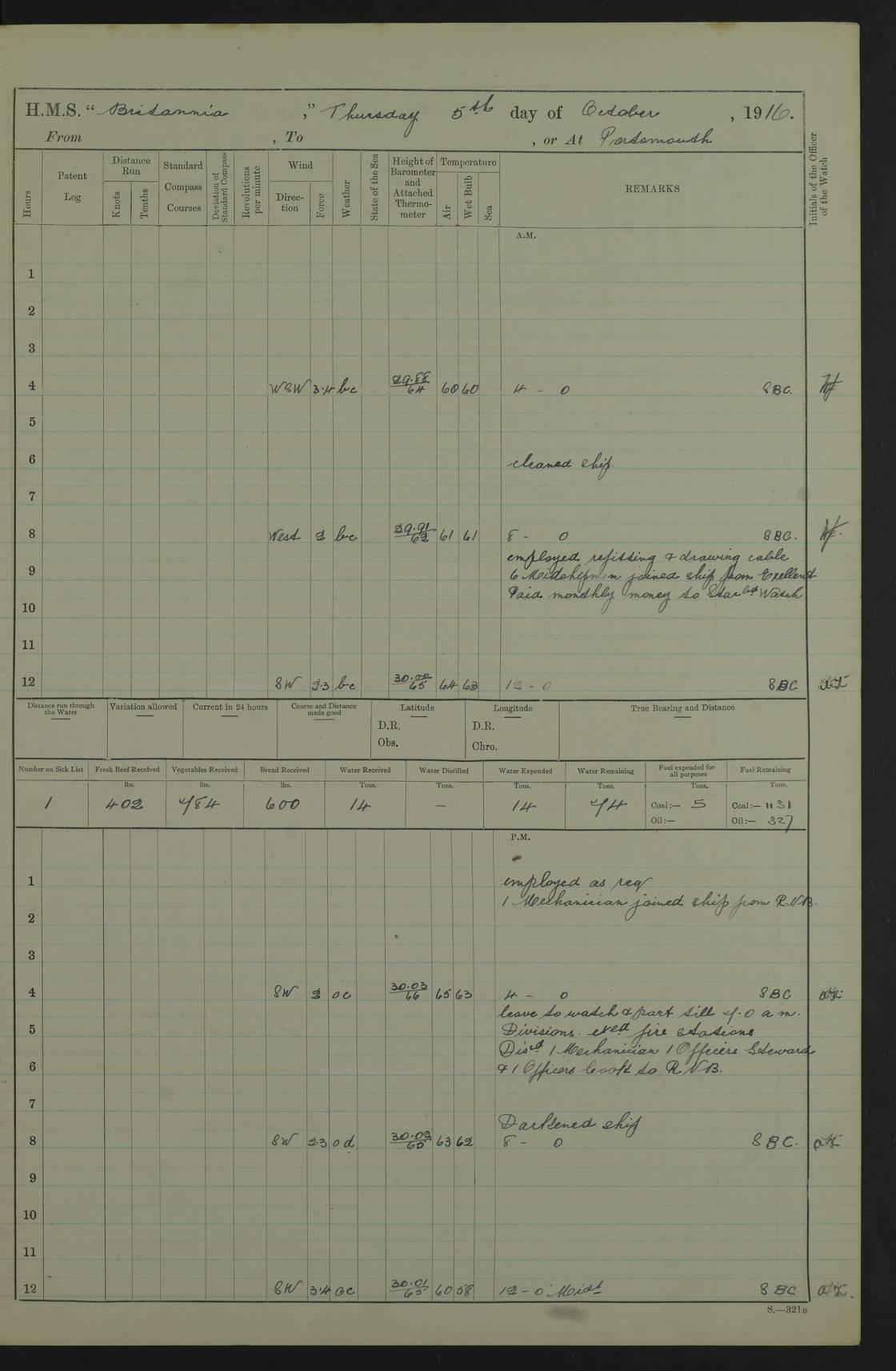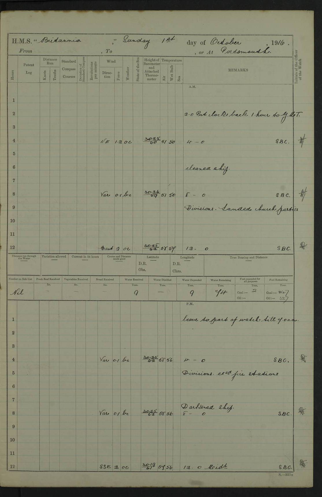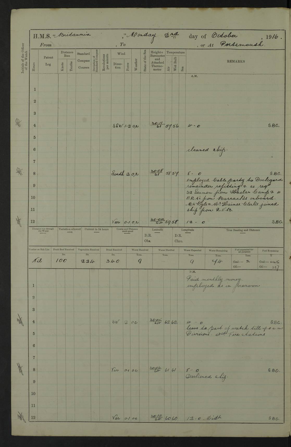 Portsmouth Lat 50.81, Long -1.11 Number on sick list: 0 am: 11 Stoker Ratings from Barracks onboard. am: Read Warrants 329, 330 and 331. 4edebb7014d04505780000b9: (https://s3.amazonaws.com:443/oldweather/ADM53-36184/0014_0.jpg) 24 September 1916 Portsmouth Lat 50.81, Long -1.11 Number on sick list: 0 4edebb7014d04505780000ba: (https://s3.amazonaws.com:443/oldweather/ADM53-36184/0014_1.jpg) 25 September 1916 Portsmouth Lat 50.81, Long -1.11 Number on sick list: 0 am: Leave to Starboard Watch till 7.0 am 5th October. am: 13 Stoker Ratings from Barracks onboard. am: 27 Ratings from Haslar Camp aboard and 5 ERAs from Barracks. pm: Mr Hill (Mate T.) joined ship. pm: 1 Private RMLI joined ship from Forton Barracks. pm: Aircraft guns crew closed up. 4edebb7014d04505780000bb: (https://s3.amazonaws.com:443/oldweather/ADM53-36184/0015_0.jpg) 26 September 1916 Portsmouth Lat 50.81, Long -1.11 Number on sick list: 2 am: 11 Stoker Ratings from Barracks onboard. am: Read Warrant 332. Discharged 1 Stoker to detention. am: 32 Seamen Ratings from Haslar Camp onboard. pm: Discharged 1 AB to Dolphin. HMS Dolphin was the home of the Royal Navy Submarine Service from 1904 to 1999, and location of the Royal Navy Submarine School. Details at http://en.wikipedia.org/wiki/HMS_Dolphin_(shore_establishment) . 4edebb7014d04505780000bc: (https://s3.amazonaws.com:443/oldweather/ADM53-36184/0015_1.jpg) 27 September 1916 Portsmouth Lat 50.81, Long -1.11 Number on sick list: 1 am: 11 Stoker Ratings from Barracks onboard. am: 33 Seamen Ratings from Haslar Camp onboard. am: Discharged 1 Private to Vindictive, 1 Private to Forton Barracks and 1 Gunner RMA to Eastney Barracks. The Eastney Barracks were located on Portsea Island. Details at http://history.inportsmouth.co.uk/places/eastney-barracks.htm . pm: Read Warrant 333. 4edebb7014d04505780000bd: (https://s3.amazonaws.com:443/oldweather/ADM53-36184/0016_0.jpg) 28 September 1916 Portsmouth Lat 50.81, Long -1.11 Number on sick list: 2 am: 13 Stoker Ratings from Barracks onboard. am: 33 Ratings from Haslar Camp onboard. pm: 4 Hands to rigging loft, remainder as in forenoon. 4edebb7014d04505780000be: (https://s3.amazonaws.com:443/oldweather/ADM53-36184/0016_1.jpg) 29 September 1916 Portsmouth Lat 50.81, Long -1.11 Number on sick list: 2 am: 12 Stoker Ratings from Barracks onboard. am: 33 Seamen Ratings from Haslar and 4 ERAs from Barracks onboard. pm: 1 AB discharged to RNB. 4edebb7014d04505780000bf: (https://s3.amazonaws.com:443/oldweather/ADM53-36184/0017_0.jpg) 30 September 1916 Portsmouth Lat 50.81, Long -1.11 Number on sick list: 0 am: 9 Stokers from Barracks onboard. am: 31 Ratings from Haslar and 3 ERAs from Barracks onboard. pm: 3 ABs joined ship from Vernon. Vernon was established on 26 April 1876 as the Royal Navy's Torpedo Branch and operated until 1 April 1996, when the various elements comprising the establishment were split up and moved to different commands. During World War I, HMS Vernon comprised several hulks in Portchester Creek. Details at http://en.wikipedia.org/wiki/HMS_Vernon_(shore_establishment) . 4edebb7014d04505780000c0: (https://s3.amazonaws.com:443/oldweather/ADM53-36184/0017_1.jpg) 4edebb7014d04505780000c1: (https://s3.amazonaws.com:443/oldweather/ADM53-36184/0018_0.jpg) 4edebb7014d04505780000c2: (https://s3.amazonaws.com:443/oldweather/ADM53-36184/0018_1.jpg) 4edebb7114d04505780000c3: (https://s3.amazonaws.com:443/oldweather/ADM53-36184/0019_0.jpg) 4edebb7114d04505780000c4: (https://s3.amazonaws.com:443/oldweather/ADM53-36184/0019_1.jpg) Above scans are all of blank pages or part-pages. LOGS FOR OCTOBER 1916 4edebb7114d04505780000c5: (https://s3.amazonaws.com:443/oldweather/ADM53-36185/0001_0.jpg) 4edebb7114d04505780000c6: (https://s3.amazonaws.com:443/oldweather/ADM53-36185/0001_1.jpg) Front page of log, including signatures of Lieutenant Commander R.G. Hurst (or Hunt), Navigating Officer and Captain J. Farquhar. 4edebb7114d04505780000c7: (https://s3.amazonaws.com:443/oldweather/ADM53-36185/0002_0.jpg) 4edebb7114d04505780000c8: (https://s3.amazonaws.com:443/oldweather/ADM53-36185/0002_1.jpg) 1 October 1916 Portsmouth Lat 50.81, Long -1.11 Number on sick list: 0 am: Put clocks back 1 hour to GMT. am: Landed Church parties. 4edebb7114d04505780000c9: (https://s3.amazonaws.com:443/oldweather/ADM53-36185/0003_0.jpg) 2 October 1916 Portsmouth Lat 50.81, Long -1.11 Number on sick list: 0 am: Employed Cable party to dockyard. am: 33 Seamen from Haslar Camp and 4 ERAs from Barracks onboard. am: Mr Kyle and Mr Haines, Clerks, joined ship from RNB. pm: Paid monthly money. 4edebb7114d04505780000ca: (https://s3.amazonaws.com:443/oldweather/ADM53-36185/0003_1.jpg) 3 October 1916 Portsmouth Lat 50.81, Long -1.11 Number on sick list: 1 am: 39 Seaman Ratings from Haslar Camp as working party. am: Employed refitting and drawing cable from dockyard. pm: Discharged 3 ABs to Vernon. pm: 2 Officers’ Cooks joined ship on passage. 4edebb7114d04505780000cb: (https://s3.amazonaws.com:443/oldweather/ADM53-36185/0004_0.jpg) 4 October 1916 Portsmouth Lat 50.81, Long -1.11 Number on sick list: 1 am: 32 Seamen from Haslar Camp working party. am: Read Warrant 334. Discharged 1 Stoker to detention. 4edebb7114d04505780000cc: (https://s3.amazonaws.com:443/oldweather/ADM53-36185/0004_1.jpg) 5 October 1916 Portsmouth Lat 50.81, Long -1.11 Number on sick list: 1 am: 6 Midshipmen joined ship from Excellent. HMS Excellent is an RN shore establishment at Whale Island, near Portsmouth. Details at http://en.wikipedia.org/wiki/HMS_Excellent_(shore_establishment) . am: Paid monthly money to Starboard Watch. pm: 1 Mechanician joined ship from RNB. pm: Discharged 1 Mechanician, 1 Officers Steward and 1 Officers Cook to RNB. 4edebb7114d04505780000cd: (https://s3.amazonaws.com:443/oldweather/ADM53-36185/0005_0.jpg) 6 October 1916 Portsmouth Lat 50.81, Long -1.11 Number on sick list: 1 am: Discharged 4 Corporals, 9 Privates RMLI to Forton and 1 Corporal, 9 Gunners RMA to Eastney. pm: 35 Boy