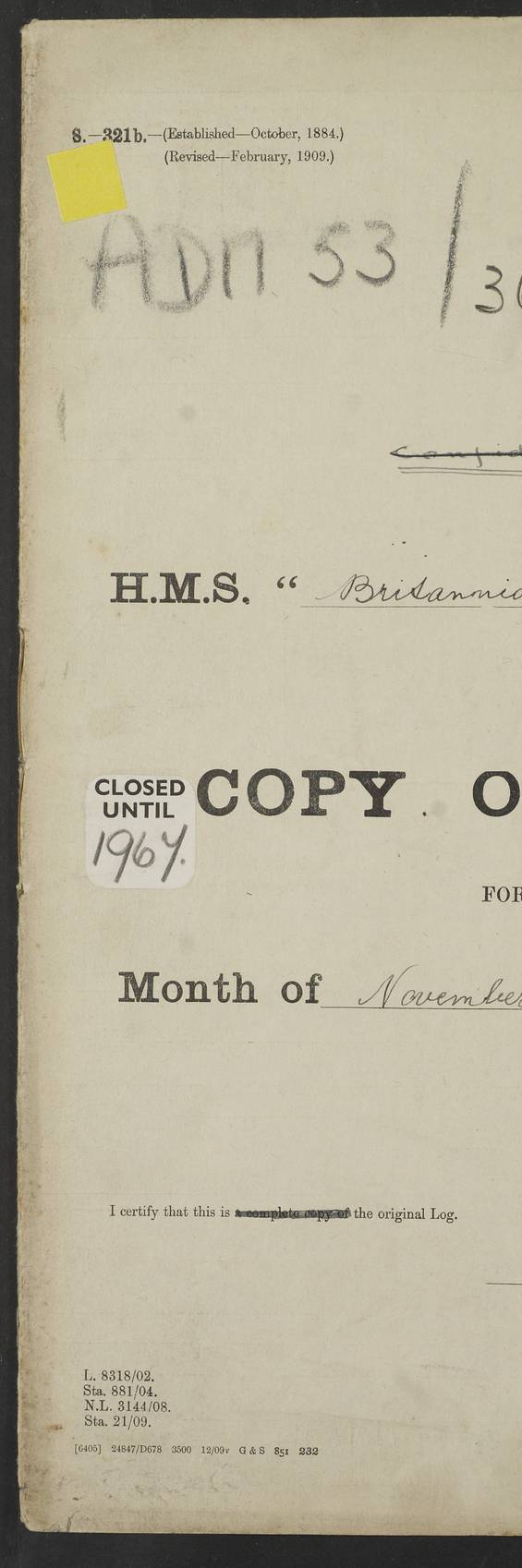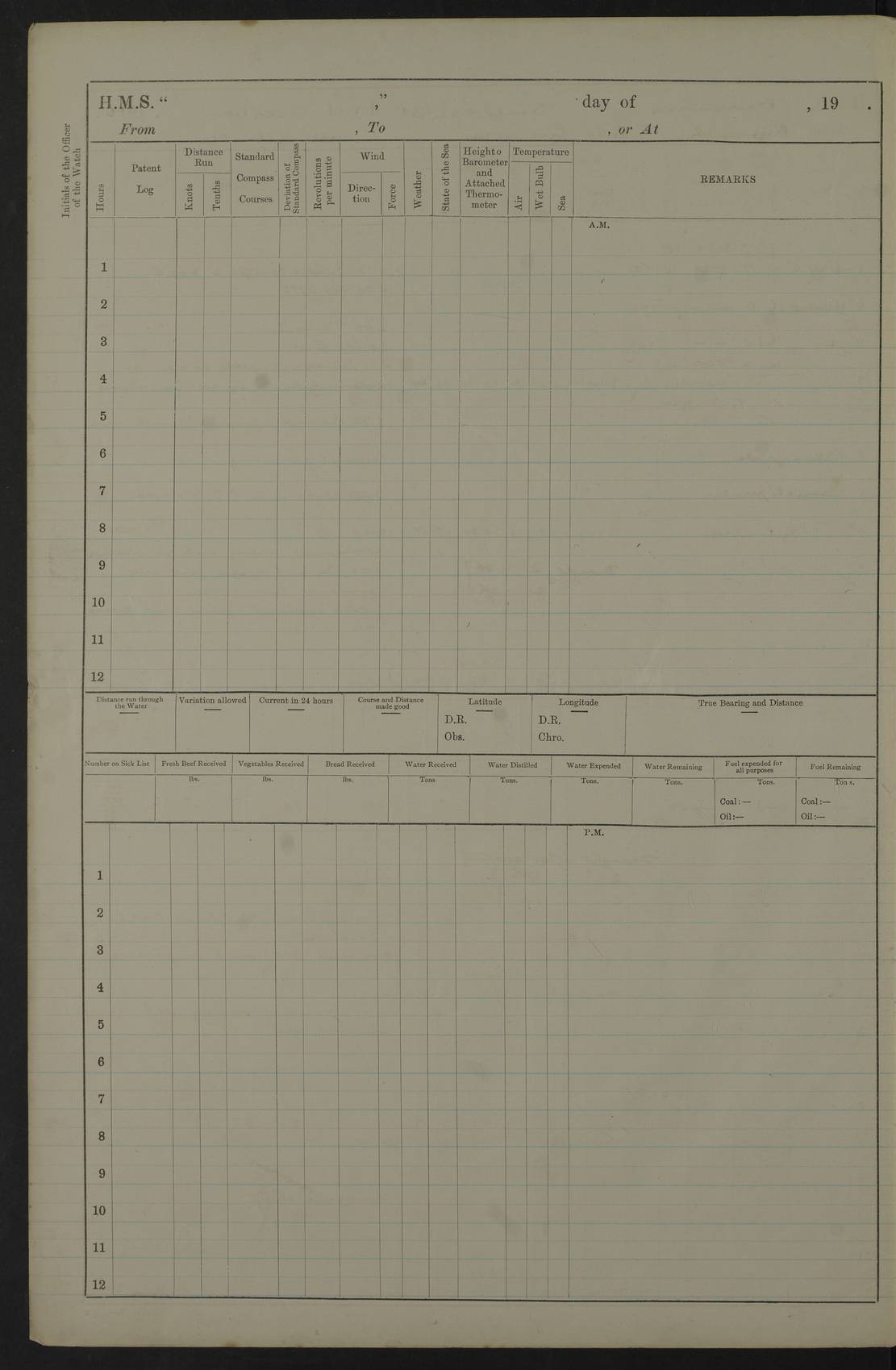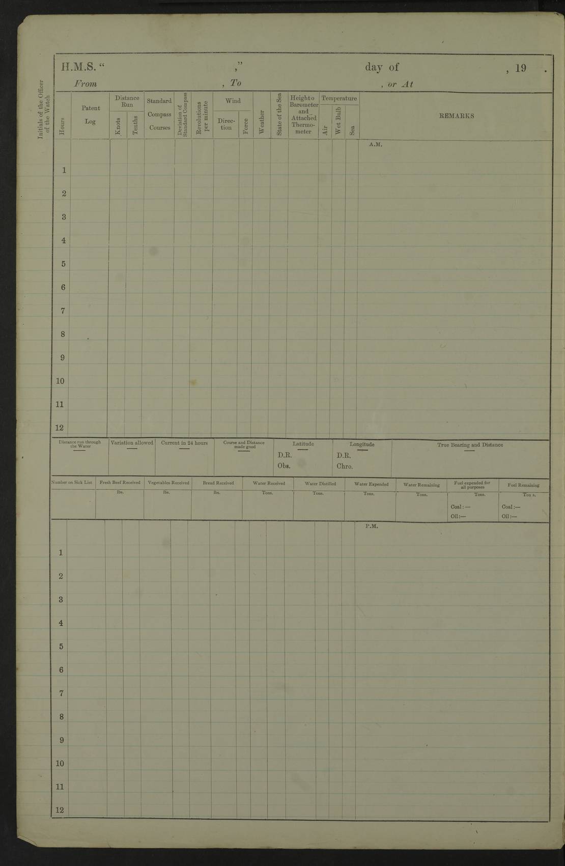 Portsmouth Lat 50.81, Long -1.11 Number on sick list: 0 am: 11 Stoker Ratings from Barracks onboard. am: Read Warrants 329, 330 and 331. 4edebb7014d04505780000b9: (https://s3.amazonaws.com:443/oldweather/ADM53-36184/0014_0.jpg) 24 September 1916 Portsmouth Lat 50.81, Long -1.11 Number on sick list: 0 4edebb7014d04505780000ba: (https://s3.amazonaws.com:443/oldweather/ADM53-36184/0014_1.jpg) 25 September 1916 Portsmouth Lat 50.81, Long -1.11 Number on sick list: 0 am: Leave to Starboard Watch till 7.0 am 5th October. am: 13 Stoker Ratings from Barracks onboard. am: 27 Ratings from Haslar Camp aboard and 5 ERAs from Barracks. pm: Mr Hill (Mate T.) joined ship. pm: 1 Private RMLI joined ship from Forton Barracks. pm: Aircraft guns crew closed up. 4edebb7014d04505780000bb: (https://s3.amazonaws.com:443/oldweather/ADM53-36184/0015_0.jpg) 26 September 1916 Portsmouth Lat 50.81, Long -1.11 Number on sick list: 2 am: 11 Stoker Ratings from Barracks onboard. am: Read Warrant 332. Discharged 1 Stoker to detention. am: 32 Seamen Ratings from Haslar Camp onboard. pm: Discharged 1 AB to Dolphin. HMS Dolphin was the home of the Royal Navy Submarine Service from 1904 to 1999, and location of the Royal Navy Submarine School. Details at http://en.wikipedia.org/wiki/HMS_Dolphin_(shore_establishment) . 4edebb7014d04505780000bc: (https://s3.amazonaws.com:443/oldweather/ADM53-36184/0015_1.jpg) 27 September 1916 Portsmouth Lat 50.81, Long -1.11 Number on sick list: 1 am: 11 Stoker Ratings from Barracks onboard. am: 33 Seamen Ratings from Haslar Camp onboard. am: Discharged 1 Private to Vindictive, 1 Private to Forton Barracks and 1 Gunner RMA to Eastney Barracks. The Eastney Barracks were located on Portsea Island. Details at http://history.inportsmouth.co.uk/places/eastney-barracks.htm . pm: Read Warrant 333. 4edebb7014d04505780000bd: (https://s3.amazonaws.com:443/oldweather/ADM53-36184/0016_0.jpg) 28 September 1916 Portsmouth Lat 50.81, Long -1.11 Number on sick list: 2 am: 13 Stoker Ratings from Barracks onboard. am: 33 Ratings from Haslar Camp onboard. pm: 4 Hands to rigging loft, remainder as in forenoon. 4edebb7014d04505780000be: (https://s3.amazonaws.com:443/oldweather/ADM53-36184/0016_1.jpg) 29 September 1916 Portsmouth Lat 50.81, Long -1.11 Number on sick list: 2 am: 12 Stoker Ratings from Barracks onboard. am: 33 Seamen Ratings from Haslar and 4 ERAs from Barracks onboard. pm: 1 AB discharged to RNB. 4edebb7014d04505780000bf: (https://s3.amazonaws.com:443/oldweather/ADM53-36184/0017_0.jpg) 30 September 1916 Portsmouth Lat 50.81, Long -1.11 Number on sick list: 0 am: 9 Stokers from Barracks onboard. am: 31 Ratings from Haslar and 3 ERAs from Barracks onboard. pm: 3 ABs joined ship from Vernon. Vernon was established on 26 April 1876 as the Royal Navy's Torpedo Branch and operated until 1 April 1996, when the various elements comprising the establishment were split up and moved to different commands. During World War I, HMS Vernon comprised several hulks in Portchester Creek. Details at http://en.wikipedia.org/wiki/HMS_Vernon_(shore_establishment) . 4edebb7014d04505780000c0: (https://s3.amazonaws.com:443/oldweather/ADM53-36184/0017_1.jpg) 4edebb7014d04505780000c1: (https://s3.amazonaws.com:443/oldweather/ADM53-36184/0018_0.jpg) 4edebb7014d04505780000c2: (https://s3.amazonaws.com:443/oldweather/ADM53-36184/0018_1.jpg) 4edebb7114d04505780000c3: (https://s3.amazonaws.com:443/oldweather/ADM53-36184/0019_0.jpg) 4edebb7114d04505780000c4: (https://s3.amazonaws.com:443/oldweather/ADM53-36184/0019_1.jpg) Above scans are all of blank pages or part-pages. LOGS FOR OCTOBER 1916 4edebb7114d04505780000c5: (https://s3.amazonaws.com:443/oldweather/ADM53-36185/0001_0.jpg) 4edebb7114d04505780000c6: (https://s3.amazonaws.com:443/oldweather/ADM53-36185/0001_1.jpg) Front page of log, including signatures of Lieutenant Commander R.G. Hurst (or Hunt), Navigating Officer and Captain J. Farquhar. 4edebb7114d04505780000c7: (https://s3.amazonaws.com:443/oldweather/ADM53-36185/0002_0.jpg) 4edebb7114d04505780000c8: (https://s3.amazonaws.com:443/oldweather/ADM53-36185/0002_1.jpg) 1 October 1916 Portsmouth Lat 50.81, Long -1.11 Number on sick list: 0 am: Put clocks back 1 hour to GMT. am: Landed Church parties. 4edebb7114d04505780000c9: (https://s3.amazonaws.com:443/oldweather/ADM53-36185/0003_0.jpg) 2 October 1916 Portsmouth Lat 50.81, Long -1.11 Number on sick list: 0 am: Employed Cable party to dockyard. am: 33 Seamen from Haslar Camp and 4 ERAs from Barracks onboard. am: Mr Kyle and Mr Haines, Clerks, joined ship from RNB. pm: Paid monthly money. 4edebb7114d04505780000ca: (https://s3.amazonaws.com:443/oldweather/ADM53-36185/0003_1.jpg) 3 October 1916 Portsmouth Lat 50.81, Long -1.11 Number on sick list: 1 am: 39 Seaman Ratings from Haslar Camp as working party. am: Employed refitting and drawing cable from dockyard. pm: Discharged 3 ABs to Vernon. pm: 2 Officers’ Cooks joined ship on passage. 4edebb7114d04505780000cb: (https://s3.amazonaws.com:443/oldweather/ADM53-36185/0004_0.jpg) 4 October 1916 Portsmouth Lat 50.81, Long -1.11 Number on sick list: 1 am: 32 Seamen from Haslar Camp working party. am: Read Warrant 334. Discharged 1 Stoker to detention. 4edebb7114d04505780000cc: (https://s3.amazonaws.com:443/oldweather/ADM53-36185/0004_1.jpg) 5 October 1916 Portsmouth Lat 50.81, Long -1.11 Number on sick list: 1 am: 6 Midshipmen joined ship from Excellent. HMS Excellent is an RN shore establishment at Whale Island, near Portsmouth. Details at http://en.wikipedia.org/wiki/HMS_Excellent_(shore_establishment) . am: Paid monthly money to Starboard Watch. pm: 1 Mechanician joined ship from RNB. pm: Discharged 1 Mechanician, 1 Officers Steward and 1 Officers Cook to RNB. 4edebb7114d04505780000cd: (https://s3.amazonaws.com:443/oldweather/ADM53-36185/0005_0.jpg) 6 October 1916 Portsmouth Lat 50.81, Long -1.11 Number on sick list: 1 am: Discharged 4 Corporals, 9 Privates RMLI to Forton and 1 Corporal, 9 Gunners RMA to Eastney. pm: 35 Boy