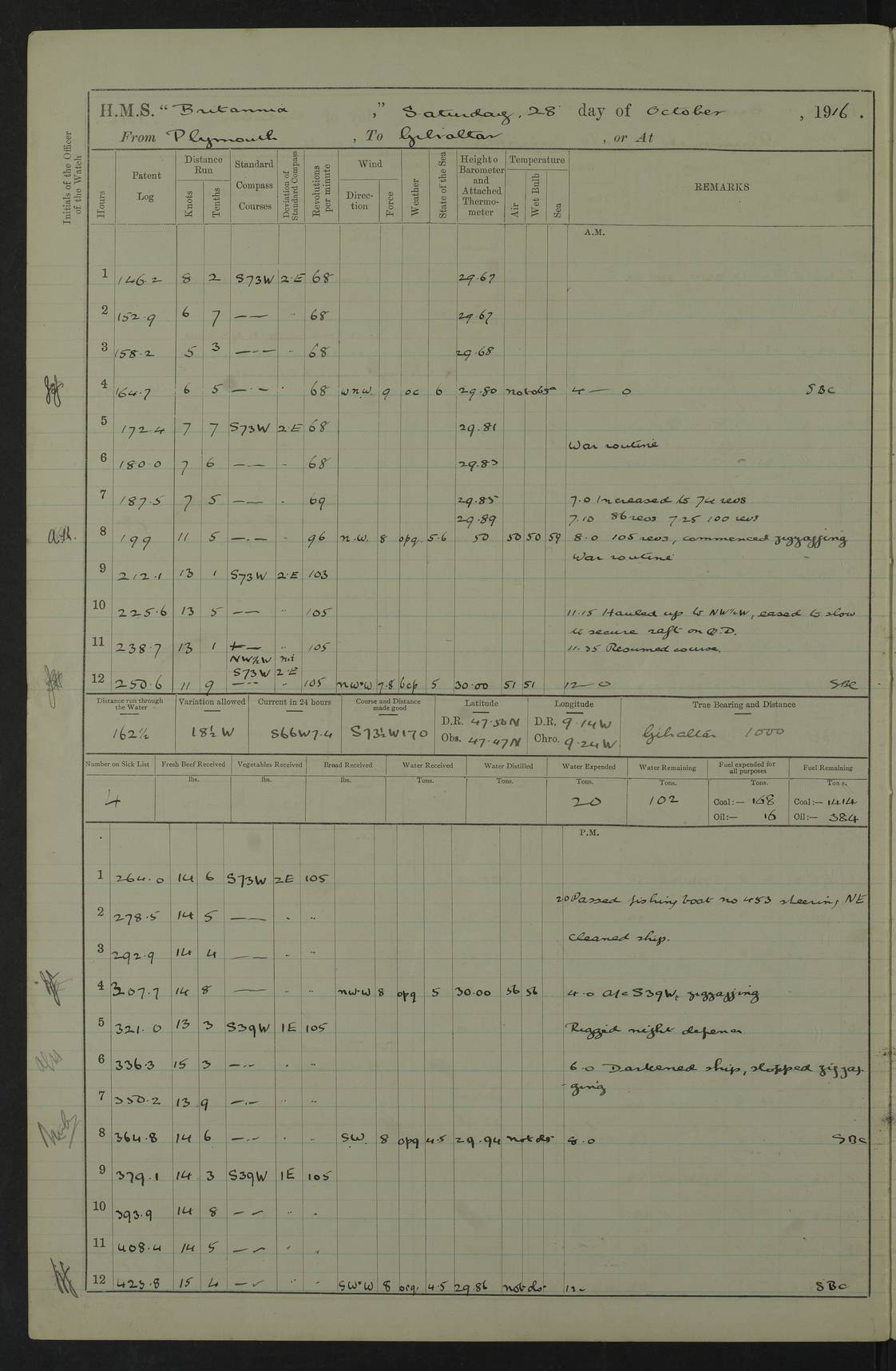 4caf8497cadfd3419700898e: (http://oldweather.s3.amazonaws.com/ADM53-36190/ADM 53-36190-006_1.jpg) 9 March 1917 Gibraltar and at sea to Freetown, Sierra Leone Lat 36.15, Long -5.37 am: Employed preparing for coaling. 7.45am: Commenced coaling. 10.05am: Finished coaling (Total 240 tons). pm: Employed drawing stores and provisions and preparing for sea. 5.45pm: Tugs came alongside. 6.35pm: Cast off from South Mole, proceeded as requisite out of northern entrance. 6.46pm: Cleared entrance. 7.25pm: Streamed patent log. 8.30pm: Commenced zigzagging. 9.08pm: Cape Spartel Light abeam 10.5 miles. 4caf8497cadfd3419700898f: (http://oldweather.s3.amazonaws.com/ADM53-36190/ADM 53-36190-007_0.jpg) 10 March 1917 At sea, Gibraltar to Freetown Lat 35.9, Long -10.7 am/pm: Zigzagging throughout. am: Exercised sea boats crew. 7.15pm: Stopped zigzagging. 9.15pm: Weather cleared, resumed zigzagging. pm: Exercised sea boats crew. 11.30pm: Secured Port 6”. 4caf8497cadfd34197008990: (http://oldweather.s3.amazonaws.com/ADM53-36190/ADM 53-36190-007_1.jpg) 11 March 1917 At sea, Gibraltar to Freetown Lat 34.8, Long -17.2 am/pm: Zigzagging throughout. am: Exercised sea boats crew. 9.20am: Eased and put ship’s head to SE to secure galley. 9.42am: Resumed course. 7.00pm: Stopped zigzagging. 10.00pm: Commenced zigzagging. pm: Exercised sea boats crew. 4caf8497cadfd34197008991: (http://oldweather.s3.amazonaws.com/ADM53-36190/ADM 53-36190-008_0.jpg) 12 March 1917 At sea, Gibraltar to Freetown Lat 31.4, Long -21.2 am: Zigzagging throughout. pm: Read stations for abandon ship. 6.30pm: Stopped zigzagging. pm: Exercised sea boats crew. 4caf8497cadfd34197008992: (http://oldweather.s3.amazonaws.com/ADM53-36190/ADM 53-36190-008_1.jpg) 13 March 1917 At sea, Gibraltar to Freetown Lat 26.7, Long -24.5 am: Exercised sea boats crew. 6.30am: Commenced zigzagging. am: Cleared ship for action. am: Replaced gear. 6.45pm: Stopped zigzagging. pm: Exercised sea boats crew. 4caf8497cadfd34197008993: (http://oldweather.s3.amazonaws.com/ADM53-36190/ADM 53-36190-009_0.jpg) 14 March 1917 At sea, Gibraltar to Freetown Lat 23.8, Long -27.6 No position in log. Position above is an approximate DR position computed from the course and speed in the log, tied to the position on 13th March and the location of Freetown on 18th March. am: Exercised sea boats crew. 6.45am: Commenced zigzagging. 7.30am: a/c to close steamer, course and speed as requisite, communicated with steamer SS Rokeby Gibraltar to Montevideo. am/pm: Zigzagging throughout. pm: Stopped zigzagging. pm: Exercised sea boats crew. 4caf8497cadfd34197008994: (http://oldweather.s3.amazonaws.com/ADM53-36190/ADM 53-36190-009_1.jpg) 15 March 1917 At sea, Gibraltar to Freetown Lat 18.8, Long -30.0 No position in log. Position above is an approximate DR position computed from the course and speed in the log, tied to the position on 13th March and the location of Freetown on 18th March. am: Exercised sea boats crew. 8.00am: Commenced zigzagging. 6.00pm: Stopped zigzagging. pm: Exercised sea boats crew. 4caf8497cadfd34197008995: (http://oldweather.s3.amazonaws.com/ADM53-36190/ADM 53-36190-010_0.jpg) 16 March 1917 At sea, Gibraltar to Freetown Lat 15.4, Long -25.3 No position in log. Position above is an approximate DR position computed from the course and speed in the log, tied to the position on 13th March and the location of Freetown on 18th March. am: Exercised sea boats crew. am: Exercised action. Secured. am: Exercised control parties. pm: Spread quarterdeck awning. pm: Exercised sea boats crew. 4caf8497cadfd34197008996: (http://oldweather.s3.amazonaws.com/ADM53-36190/ADM 53-36190-010_1.jpg) 17 March 1917 At sea, Gibraltar to Freetown Lat 12.2, Long -19.3 No position in log. Position above is an approximate DR position computed from the course and speed in the log, tied to the position on 13th March and the location of Freetown on 18th March. am: Exercised sea boats crew. 10.50am: Sighted steamer on port bow, steaming north-north-easterly. 7.00pm: Commenced a line of sounding. pm: Exercised sea boats crew. 4caf8497cadfd34197008997: (http://oldweather.s3.amazonaws.com/ADM53-36190/ADM 53-36190-011_0.jpg) 18 March 1917 At sea, Gibraltar to Freetown Lat 8.5, Long -13.2 am: Exercised sea boats crew. am: Running line of sounding. am: Divine Service. 10.00am: Course as requisite for anchorage. 10.45am: Sighted land 2 points on port bow. 11.32am: came to with starboard anchor in 9½ fathoms, veered to 6 shackles. pm: Employed preparing ship for coaling. pm: Collier Mallina secured alongside. 4caf8497cadfd34197008998: (http://oldweather.s3.amazonaws.com/ADM53-36190/ADM 53-36190-011_1.jpg) 19 March 1917 Sierra Leone Lat 8.5, Long -13.2 Number on sick list: 5 am: Commenced coaling. 10.35am: Cease coaling. 3.38pm: Commenced coaling. 6.50pm: Finished coaling (Total 1615 tons). 7.40pm: Collier cast off. 8.00pm: Examined coaling gear. 4caf8497cadfd34197008999: (http://oldweather.s3.amazonaws.com/ADM53-36190/ADM 53-36190-012_0.jpg) 20 March 1917 Sierra Leone Lat 8.5, Long -13.2 am: Roman Catholic Chaplain joined from Swiftsure. am: Sutlej arrived. pm: Overhauled coaling gear. pm: King Alfred arrived. Vessels encountered for the first time on this day: HMS Swiftsure was the lead ship of the Swiftsure class pre-dreadnought battleships, launched in 1903 at Armstrong Whitworth, Elswick, and sold for scrap in 1920. Details at http://en.wikipedia.org/wiki/HMS_Swiftsure_(1903) and logs at http://www.naval-history.net/OWShips-WW1-01-HMS_Swiftsure.htm . HMS Sutlej was a Cressy class armoured cruiser, launched in 1899 at John Brown, Clydebank, and sold in 1921. Details at http://en.wikipedia.org/wiki/HMS_Sutlej_(1899) and logs at http://www.naval-history.net/OWShips-WW1-05-HMS_Sutlej.htm . HMS King Alfred was a Drake class armoured cruiser, launched in 1901 at Vickers, Barrow, and sold in 1920 for breaking up. Details at http://en.wikipedia.org/wiki/HMS_King_Alfred_(1901) and logs at http://www.naval-history.net/OWSh