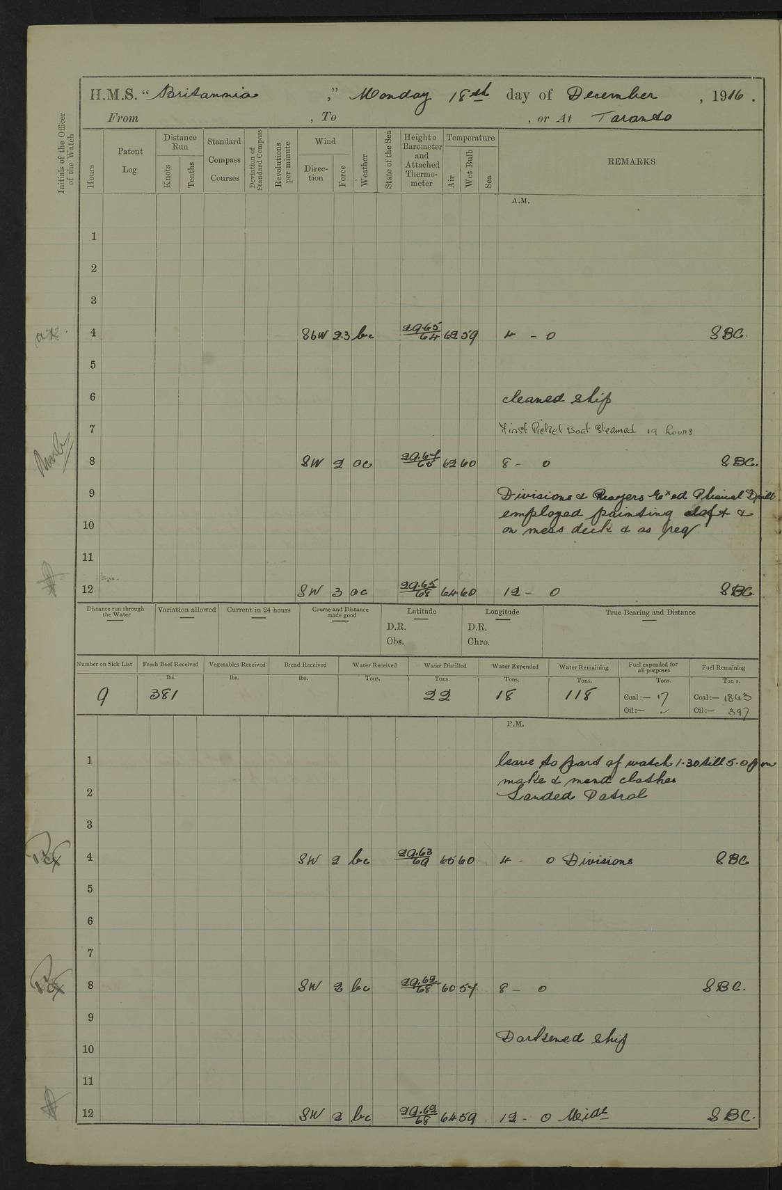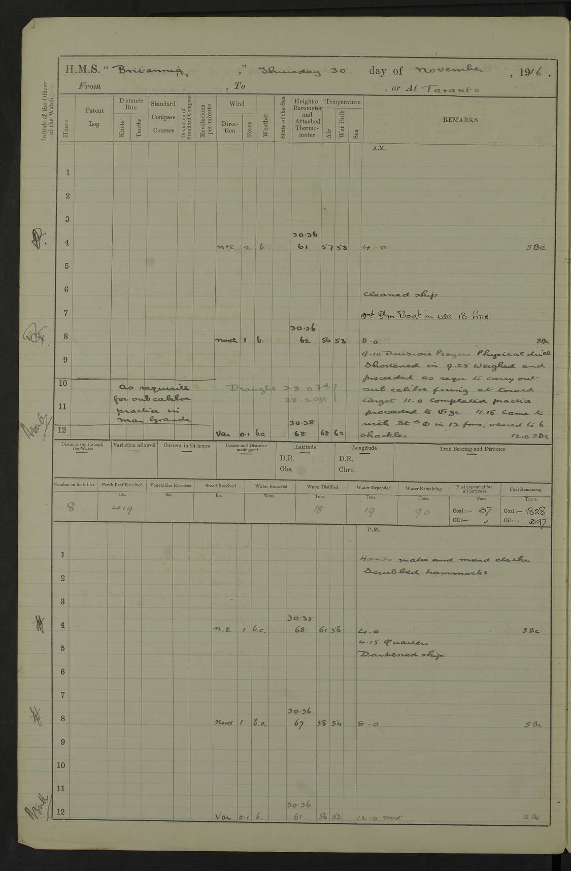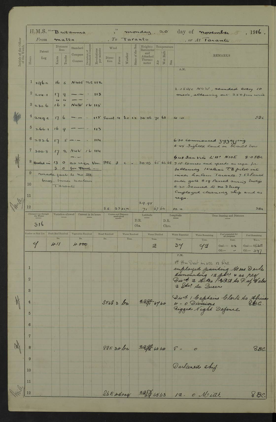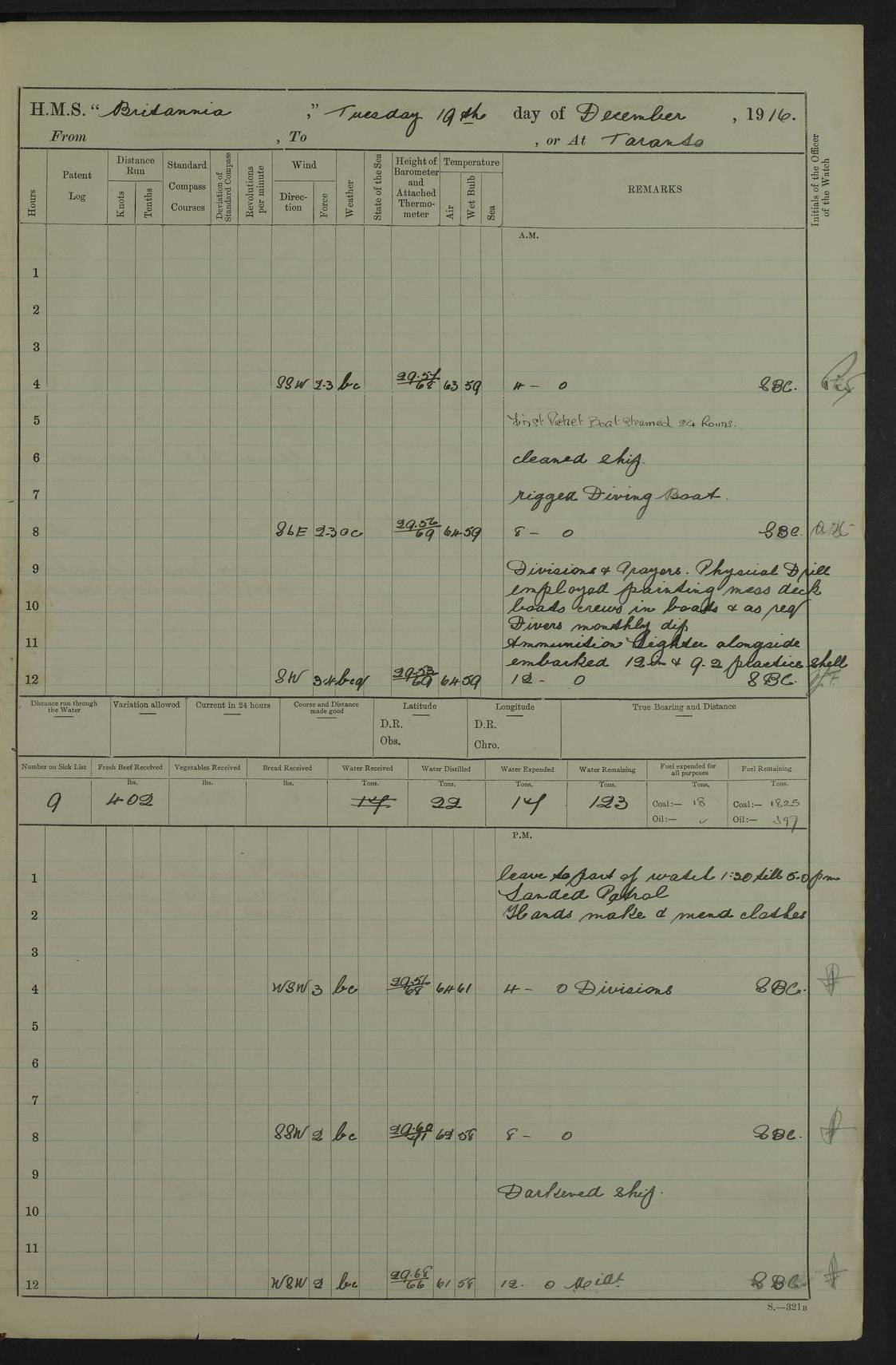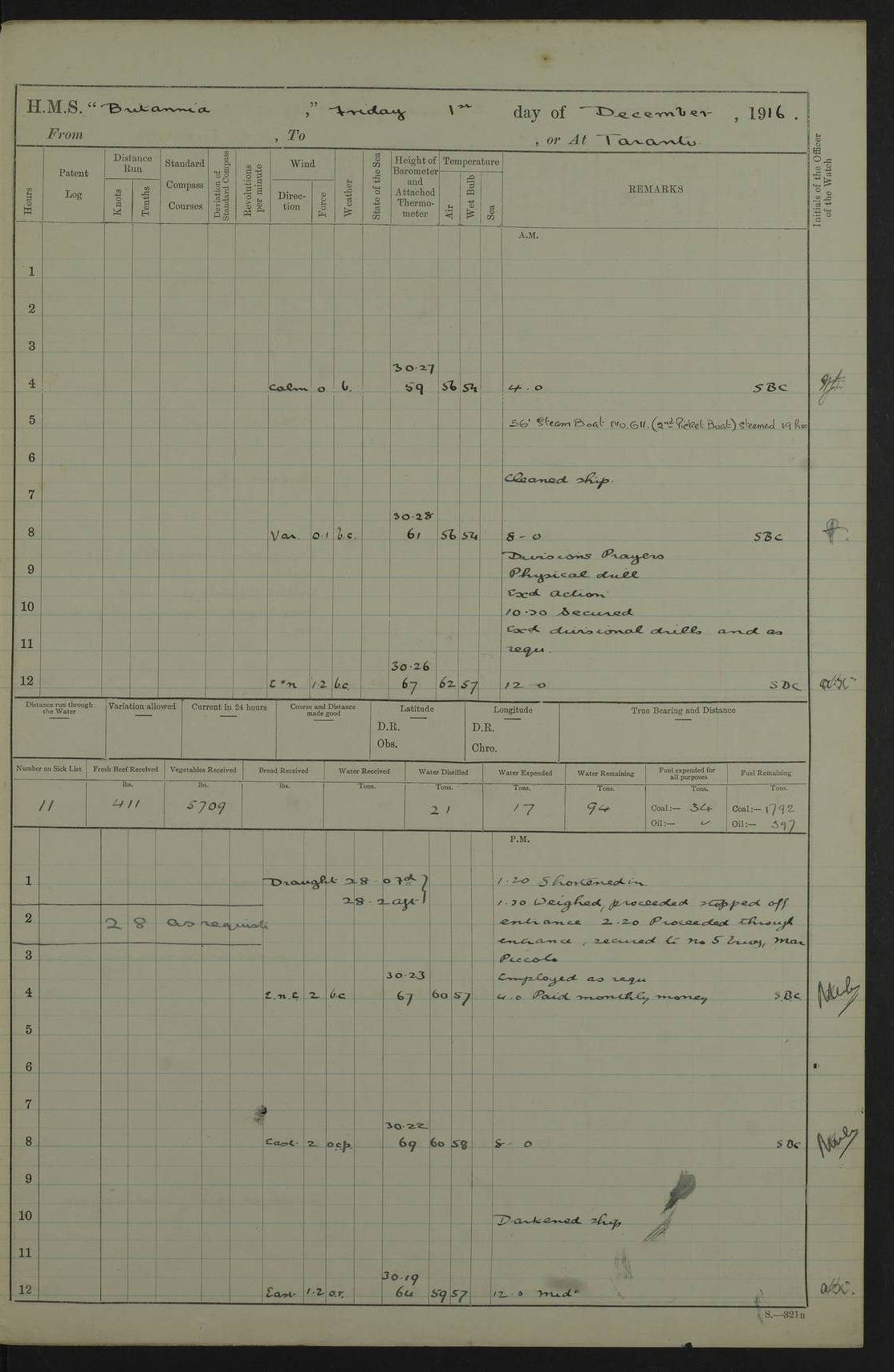 LOGS FOR JANUARY 1917 4caf8496cadfd3419700893f: (http://oldweather.s3.amazonaws.com/ADM53-36188/ADM 53-36188-001_0.jpg) 4caf8496cadfd34197008940: (http://oldweather.s3.amazonaws.com/ADM53-36188/ADM 53-36188-001_1.jpg) The above scans are of the front page of the log. 4caf8496cadfd34197008941: (http://oldweather.s3.amazonaws.com/ADM53-36188/ADM 53-36188-002_0.jpg) Power and fuel consumption page – blank. 4caf8496cadfd34197008942: (http://oldweather.s3.amazonaws.com/ADM53-36188/ADM 53-36188-002_1.jpg) 1 January 1917 Taranto Lat 40.46, Long 17.2 8.00am: Slipped and proceeded as requisite out of harbour. 8.35am: Stopped and came to in Mar Grande in 12 fathoms, veered to 5 shackles. am/pm: Exercised .303” aiming rifle. 4caf8496cadfd34197008943: (http://oldweather.s3.amazonaws.com/ADM53-36188/ADM 53-36188-003_0.jpg) 2 January 1917 Taranto Lat 40.46, Long 17.2 am: Sent party in tug to lay out trot(?) for calibration target. 1.45pm: Weighed, proceeded to entrance, joined fleet, carried out steam tactics. 4.00pm: Stopped, came to with starboard anchor in 9 fathoms, veered to 5 shackles. 4caf8496cadfd34197008944: (http://oldweather.s3.amazonaws.com/ADM53-36188/ADM 53-36188-003_1.jpg) 3 January 1917 Taranto Lat 40.46, Long 17.2 am: Sent party in tug to target. 11.36am: Weighed and proceeded to make fast to calibrating buoys. 1.30pm: Commenced calibration, starboard side. 3.20pm: Turned ship to fire port guns. pm: Range fouled. 4.50pm: Slipped and proceeded to anchorage. 5.07pm: Came to with starboard anchor in 9 fathoms, veered to 5 shackles. 4caf8496cadfd34197008945: (http://oldweather.s3.amazonaws.com/ADM53-36188/ADM 53-36188-004_0.jpg) 4 January 1917 Taranto Lat 40.46, Long 17.2 8.00am: Sent target party. 8.15am: Weighed and proceeded to calibrating buoys. 8.40am: Secured. pm: Commenced calibrating port guns. pm: Calibration completed. 1.52pm: Slipped from buoys, proceeded into Mar Piccolo. 2.45pm: Secured to No. 5 buoy. pm: Landed patrol. 4caf8496cadfd34197008946: (http://oldweather.s3.amazonaws.com/ADM53-36188/ADM 53-36188-004_1.jpg) 5 January 1917 Taranto Lat 40.46, Long 17.2 am: TBD Redpole arrived. HMS Redpole was a destroyer of the H (Acorn) class, launched in 1910 at J.S. White, Cowes, and sold in 1921. Details at http://www.dreadnoughtproject.org/tfs/index.php/H.M.S._Redpole_(1910) . pm: 1 Boy 1st class joined ship from hospital. pm: Discharged 1 AB to Admirable. pm: Landed liberty men and patrol. pm: Duncan arrived. 4caf8496cadfd34197008947: (http://oldweather.s3.amazonaws.com/ADM53-36188/ADM 53-36188-005_0.jpg) 6 January 1917 Taranto Lat 40.46, Long 17.2 am: Hoisted in 2nd picket boat. am: Divisions with night clothing. am: Discharged Mr Hill (Mate T) to hospital and 1 Ordinary Seaman , 1 Stoker to Isonzo. pm: Landed liberty men and patrol. pm: Isonzo proceeded. pm: Discharged 1 Private RMLI to Queen. 4caf8496cadfd34197008948: (http://oldweather.s3.amazonaws.com/ADM53-36188/ADM 53-36188-005_1.jpg) 7 January 1917 Taranto Lat 40.46, Long 17.2 am: Landed church parties. am: Held Divine Service. 4caf8496cadfd34197008949: (http://oldweather.s3.amazonaws.com/ADM53-36188/ADM 53-36188-006_0.jpg) 8 January 1917 Taranto Lat 40.6, Long 17.2 am: Hoisted out 2nd picket boat. am: Exercised all boats crews pull round fleet. Employed training classes to instructions, A and B 9.2 inch divisional drill, remainder as requisite. pm: Landed libertymen and Patrol. pm: Exercised searchlight crews. 4caf8496cadfd3419700894a: (http://oldweather.s3.amazonaws.com/ADM53-36188/ADM 53-36188-006_1.jpg) 9 January 1917 Taranto Lat 40.46, Long 17.2 am: Prince of Wales proceeded. am: marines to infantry drill. pm: landed liberty men and patrol. 4caf8496cadfd3419700894b: (http://oldweather.s3.amazonaws.com/ADM53-36188/ADM 53-36188-007_0.jpg) 10 January 1917 Taranto Lat 40.46, Long 17.2 am: 1 AB joined ship from SS Isonzo. pm: landed liberty men and patrol. pm: Prince of Wales arrived. 4caf8496cadfd3419700894c: (http://oldweather.s3.amazonaws.com/ADM53-36188/ADM 53-36188-007_1.jpg) 11 January 1917 Taranto Lat 40.46, Long 17.2 pm: Ammunition lighter secured alongside. pm: Gunners Party embarking ammunition. 4caf8496cadfd3419700894d: (http://oldweather.s3.amazonaws.com/ADM53-36188/ADM 53-36188-008_0.jpg) 12 January 1917 Taranto Lat 40.46, Long 17.2 am: Rigged coaling gear. am: Employed preparing ship for coaling. 12.45pm: Collier Silvia secured alongside. 1.06pm: Commenced coaling. 2.38pm: Completed coaling (total 406 tons). pm: Examined coaling gear. pm: Collier cast off. 4caf8496cadfd3419700894e: (http://oldweather.s3.amazonaws.com/ADM53-36188/ADM 53-36188-008_1.jpg) 13 January 1917 Taranto Lat 40.46, Long 17.2 am: Discharged 1 Chief Stoker and 1 Stoker to SS Isonzo. pm: Landed liberty men and patrol. 4caf8496cadfd3419700894f: (http://oldweather.s3.amazonaws.com/ADM53-36188/ADM 53-36188-009_0.jpg) 14 January 1917 Taranto Lat 40.46, Long 17.2 am: Landed church parties. am: Divisions. Read Articles of War. am: Held Divine Service. 4caf8496cadfd34197008950: (http://oldweather.s3.amazonaws.com/ADM53-36188/ADM 53-36188-009_1.jpg) 15 January 1917 Taranto Lat 40.46, Long 17.2 pm: Landed liberty men and patrol. 4caf8496cadfd34197008951: (http://oldweather.s3.amazonaws.com/ADM53-36188/ADM 53-36188-010_0.jpg) 16 January 1917 Taranto Lat 40.46, Long 17.2 am: Duncan proceeded into dock. am: Queen and Prince of Wales arrived. am: 6 inch guns crews, Boys of port watch and training classes to instruction. pm: Landed liberty men and patrol. pm: Discharged Court Martial prisoner to Queen. 4caf8496cadfd34197008952: (http://oldweather.s3.amazonaws.com/ADM53-36188/ADM 53-36188-010_1.jpg) 17 January 1917 Taranto Lat 40.46, Long 17.2 am: 1 Stoker joined ship from Admirable. pm: Training classes and Boys port watch to instructions, preparing ship for sea and as requisite. pm: Slipped and proceeded out of harbour. 2.55pm: Stopped, came to with starboard anchor in 10½ fathoms, veered to 5 shackles. 4caf8496cadfd34197008953: (http://oldweather