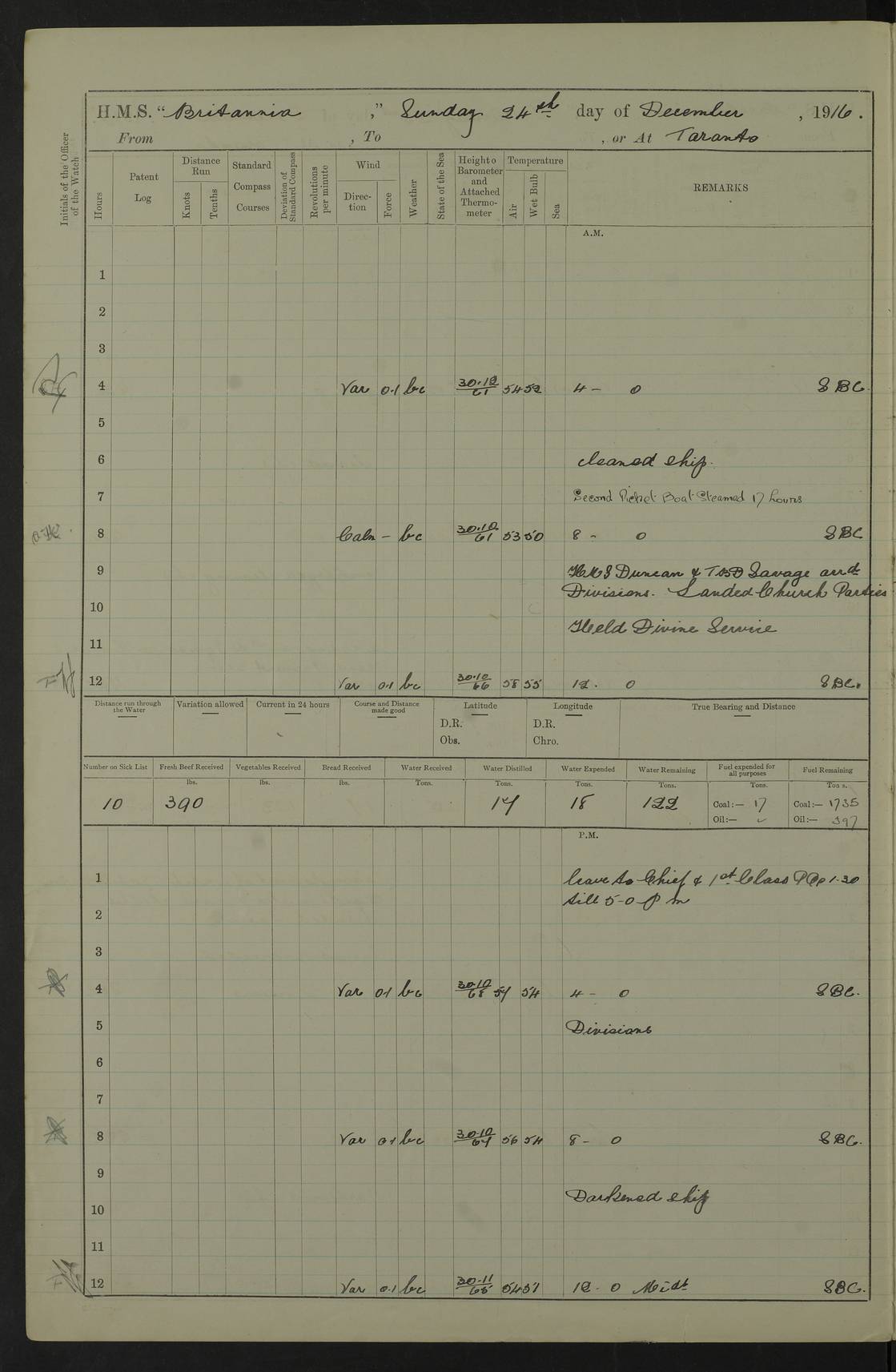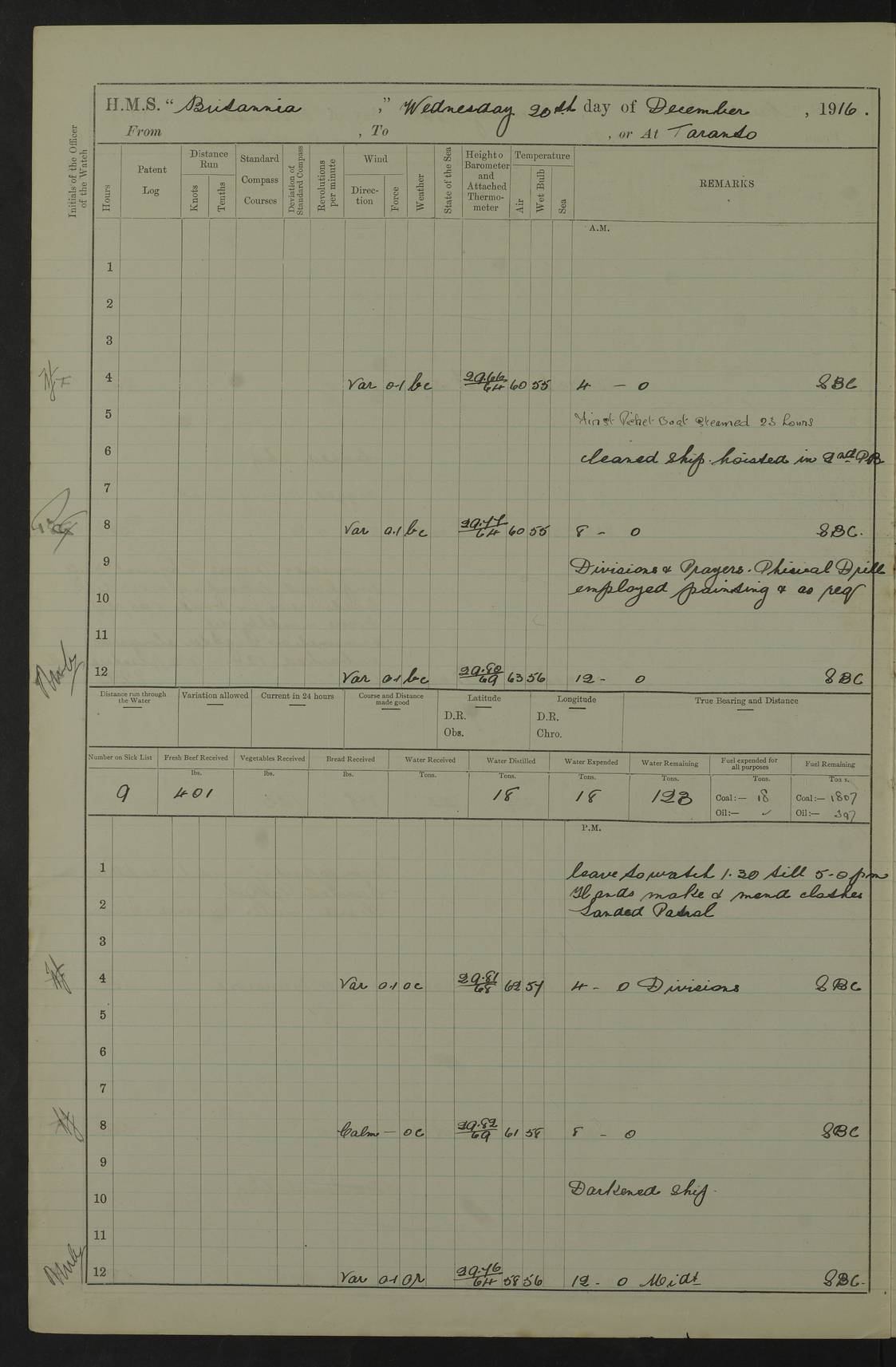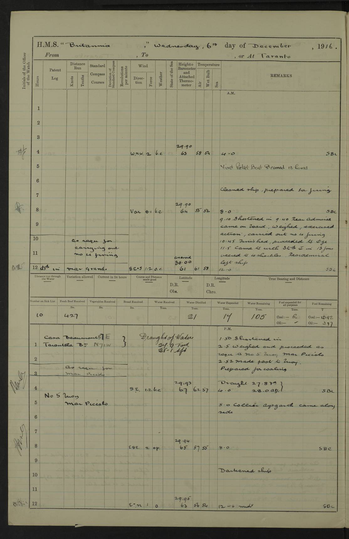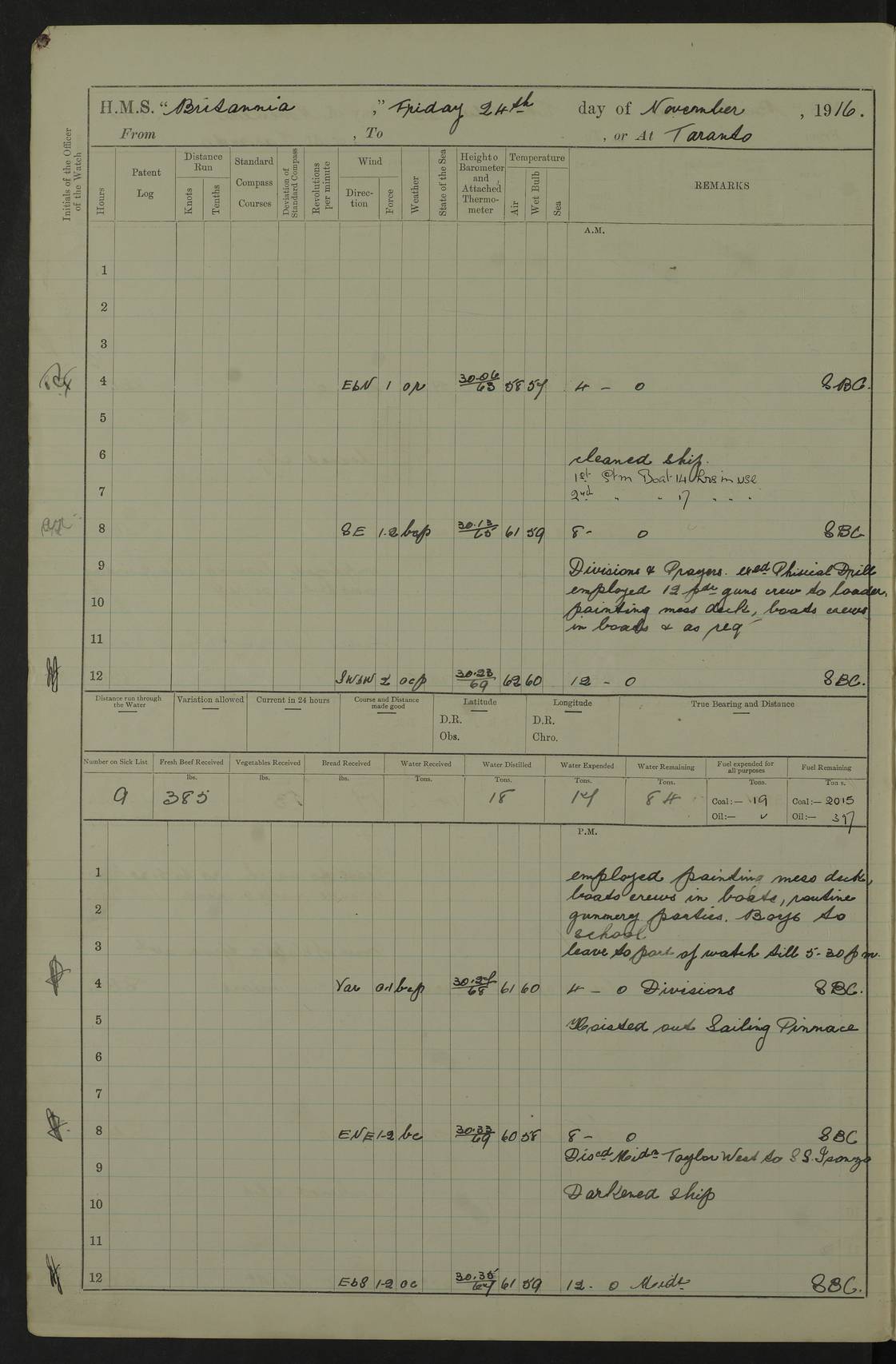 LOGS FOR JANUARY 1917 4caf8496cadfd3419700893f: (http://oldweather.s3.amazonaws.com/ADM53-36188/ADM 53-36188-001_0.jpg) 4caf8496cadfd34197008940: (http://oldweather.s3.amazonaws.com/ADM53-36188/ADM 53-36188-001_1.jpg) The above scans are of the front page of the log. 4caf8496cadfd34197008941: (http://oldweather.s3.amazonaws.com/ADM53-36188/ADM 53-36188-002_0.jpg) Power and fuel consumption page – blank. 4caf8496cadfd34197008942: (http://oldweather.s3.amazonaws.com/ADM53-36188/ADM 53-36188-002_1.jpg) 1 January 1917 Taranto Lat 40.46, Long 17.2 8.00am: Slipped and proceeded as requisite out of harbour. 8.35am: Stopped and came to in Mar Grande in 12 fathoms, veered to 5 shackles. am/pm: Exercised .303” aiming rifle. 4caf8496cadfd34197008943: (http://oldweather.s3.amazonaws.com/ADM53-36188/ADM 53-36188-003_0.jpg) 2 January 1917 Taranto Lat 40.46, Long 17.2 am: Sent party in tug to lay out trot(?) for calibration target. 1.45pm: Weighed, proceeded to entrance, joined fleet, carried out steam tactics. 4.00pm: Stopped, came to with starboard anchor in 9 fathoms, veered to 5 shackles. 4caf8496cadfd34197008944: (http://oldweather.s3.amazonaws.com/ADM53-36188/ADM 53-36188-003_1.jpg) 3 January 1917 Taranto Lat 40.46, Long 17.2 am: Sent party in tug to target. 11.36am: Weighed and proceeded to make fast to calibrating buoys. 1.30pm: Commenced calibration, starboard side. 3.20pm: Turned ship to fire port guns. pm: Range fouled. 4.50pm: Slipped and proceeded to anchorage. 5.07pm: Came to with starboard anchor in 9 fathoms, veered to 5 shackles. 4caf8496cadfd34197008945: (http://oldweather.s3.amazonaws.com/ADM53-36188/ADM 53-36188-004_0.jpg) 4 January 1917 Taranto Lat 40.46, Long 17.2 8.00am: Sent target party. 8.15am: Weighed and proceeded to calibrating buoys. 8.40am: Secured. pm: Commenced calibrating port guns. pm: Calibration completed. 1.52pm: Slipped from buoys, proceeded into Mar Piccolo. 2.45pm: Secured to No. 5 buoy. pm: Landed patrol. 4caf8496cadfd34197008946: (http://oldweather.s3.amazonaws.com/ADM53-36188/ADM 53-36188-004_1.jpg) 5 January 1917 Taranto Lat 40.46, Long 17.2 am: TBD Redpole arrived. HMS Redpole was a destroyer of the H (Acorn) class, launched in 1910 at J.S. White, Cowes, and sold in 1921. Details at http://www.dreadnoughtproject.org/tfs/index.php/H.M.S._Redpole_(1910) . pm: 1 Boy 1st class joined ship from hospital. pm: Discharged 1 AB to Admirable. pm: Landed liberty men and patrol. pm: Duncan arrived. 4caf8496cadfd34197008947: (http://oldweather.s3.amazonaws.com/ADM53-36188/ADM 53-36188-005_0.jpg) 6 January 1917 Taranto Lat 40.46, Long 17.2 am: Hoisted in 2nd picket boat. am: Divisions with night clothing. am: Discharged Mr Hill (Mate T) to hospital and 1 Ordinary Seaman , 1 Stoker to Isonzo. pm: Landed liberty men and patrol. pm: Isonzo proceeded. pm: Discharged 1 Private RMLI to Queen. 4caf8496cadfd34197008948: (http://oldweather.s3.amazonaws.com/ADM53-36188/ADM 53-36188-005_1.jpg) 7 January 1917 Taranto Lat 40.46, Long 17.2 am: Landed church parties. am: Held Divine Service. 4caf8496cadfd34197008949: (http://oldweather.s3.amazonaws.com/ADM53-36188/ADM 53-36188-006_0.jpg) 8 January 1917 Taranto Lat 40.6, Long 17.2 am: Hoisted out 2nd picket boat. am: Exercised all boats crews pull round fleet. Employed training classes to instructions, A and B 9.2 inch divisional drill, remainder as requisite. pm: Landed libertymen and Patrol. pm: Exercised searchlight crews. 4caf8496cadfd3419700894a: (http://oldweather.s3.amazonaws.com/ADM53-36188/ADM 53-36188-006_1.jpg) 9 January 1917 Taranto Lat 40.46, Long 17.2 am: Prince of Wales proceeded. am: marines to infantry drill. pm: landed liberty men and patrol. 4caf8496cadfd3419700894b: (http://oldweather.s3.amazonaws.com/ADM53-36188/ADM 53-36188-007_0.jpg) 10 January 1917 Taranto Lat 40.46, Long 17.2 am: 1 AB joined ship from SS Isonzo. pm: landed liberty men and patrol. pm: Prince of Wales arrived. 4caf8496cadfd3419700894c: (http://oldweather.s3.amazonaws.com/ADM53-36188/ADM 53-36188-007_1.jpg) 11 January 1917 Taranto Lat 40.46, Long 17.2 pm: Ammunition lighter secured alongside. pm: Gunners Party embarking ammunition. 4caf8496cadfd3419700894d: (http://oldweather.s3.amazonaws.com/ADM53-36188/ADM 53-36188-008_0.jpg) 12 January 1917 Taranto Lat 40.46, Long 17.2 am: Rigged coaling gear. am: Employed preparing ship for coaling. 12.45pm: Collier Silvia secured alongside. 1.06pm: Commenced coaling. 2.38pm: Completed coaling (total 406 tons). pm: Examined coaling gear. pm: Collier cast off. 4caf8496cadfd3419700894e: (http://oldweather.s3.amazonaws.com/ADM53-36188/ADM 53-36188-008_1.jpg) 13 January 1917 Taranto Lat 40.46, Long 17.2 am: Discharged 1 Chief Stoker and 1 Stoker to SS Isonzo. pm: Landed liberty men and patrol. 4caf8496cadfd3419700894f: (http://oldweather.s3.amazonaws.com/ADM53-36188/ADM 53-36188-009_0.jpg) 14 January 1917 Taranto Lat 40.46, Long 17.2 am: Landed church parties. am: Divisions. Read Articles of War. am: Held Divine Service. 4caf8496cadfd34197008950: (http://oldweather.s3.amazonaws.com/ADM53-36188/ADM 53-36188-009_1.jpg) 15 January 1917 Taranto Lat 40.46, Long 17.2 pm: Landed liberty men and patrol. 4caf8496cadfd34197008951: (http://oldweather.s3.amazonaws.com/ADM53-36188/ADM 53-36188-010_0.jpg) 16 January 1917 Taranto Lat 40.46, Long 17.2 am: Duncan proceeded into dock. am: Queen and Prince of Wales arrived. am: 6 inch guns crews, Boys of port watch and training classes to instruction. pm: Landed liberty men and patrol. pm: Discharged Court Martial prisoner to Queen. 4caf8496cadfd34197008952: (http://oldweather.s3.amazonaws.com/ADM53-36188/ADM 53-36188-010_1.jpg) 17 January 1917 Taranto Lat 40.46, Long 17.2 am: 1 Stoker joined ship from Admirable. pm: Training classes and Boys port watch to instructions, preparing ship for sea and as requisite. pm: Slipped and proceeded out of harbour. 2.55pm: Stopped, came to with starboard anchor in 10½ fathoms, veered to 5 shackles. 4caf8496cadfd34197008953: (http://oldweather