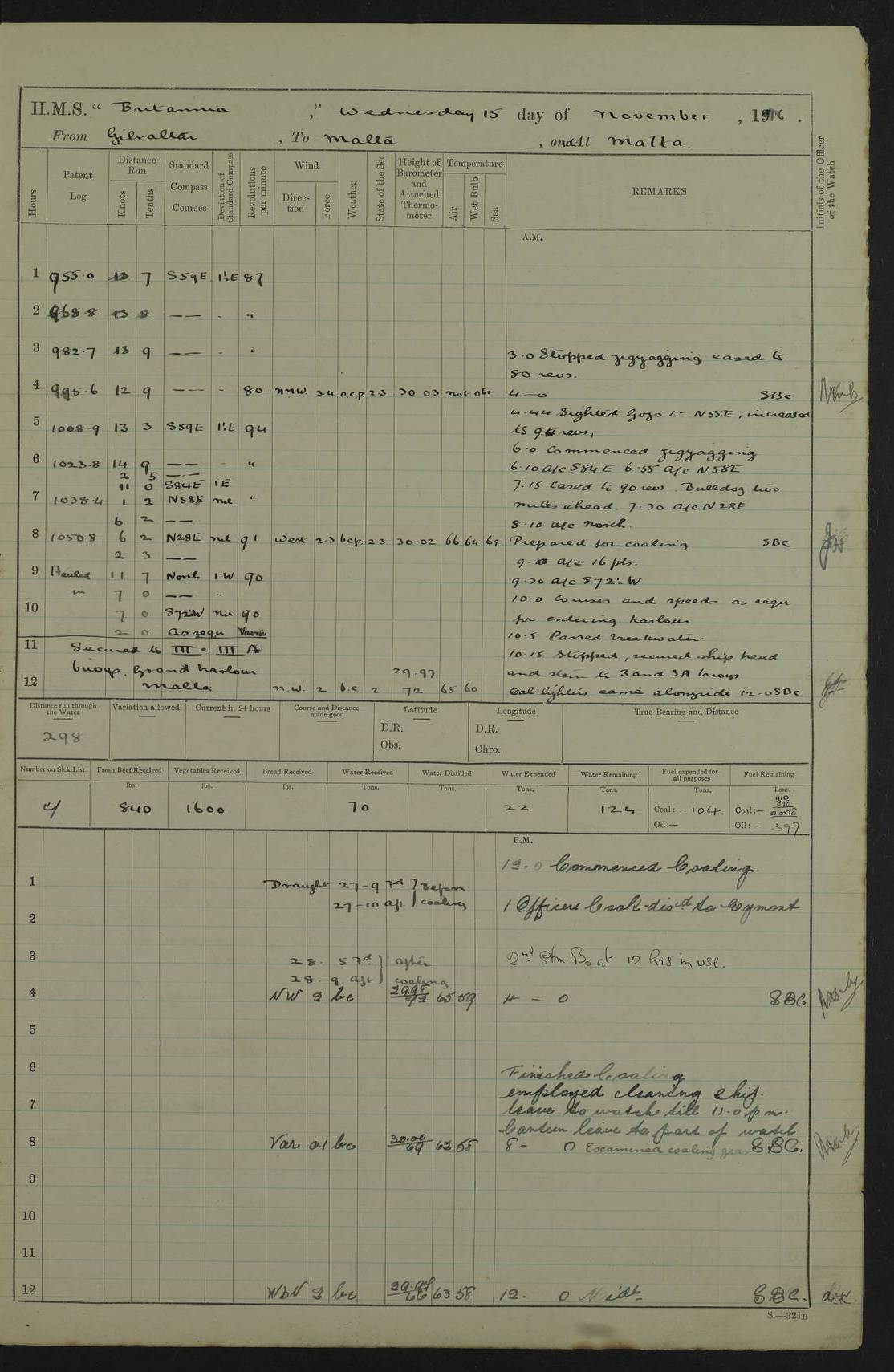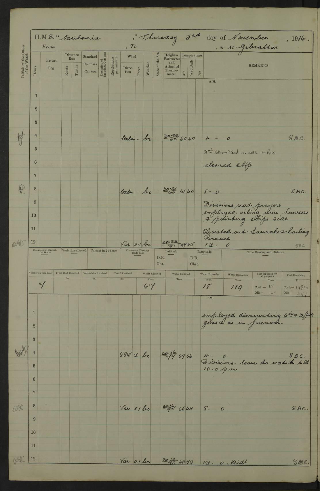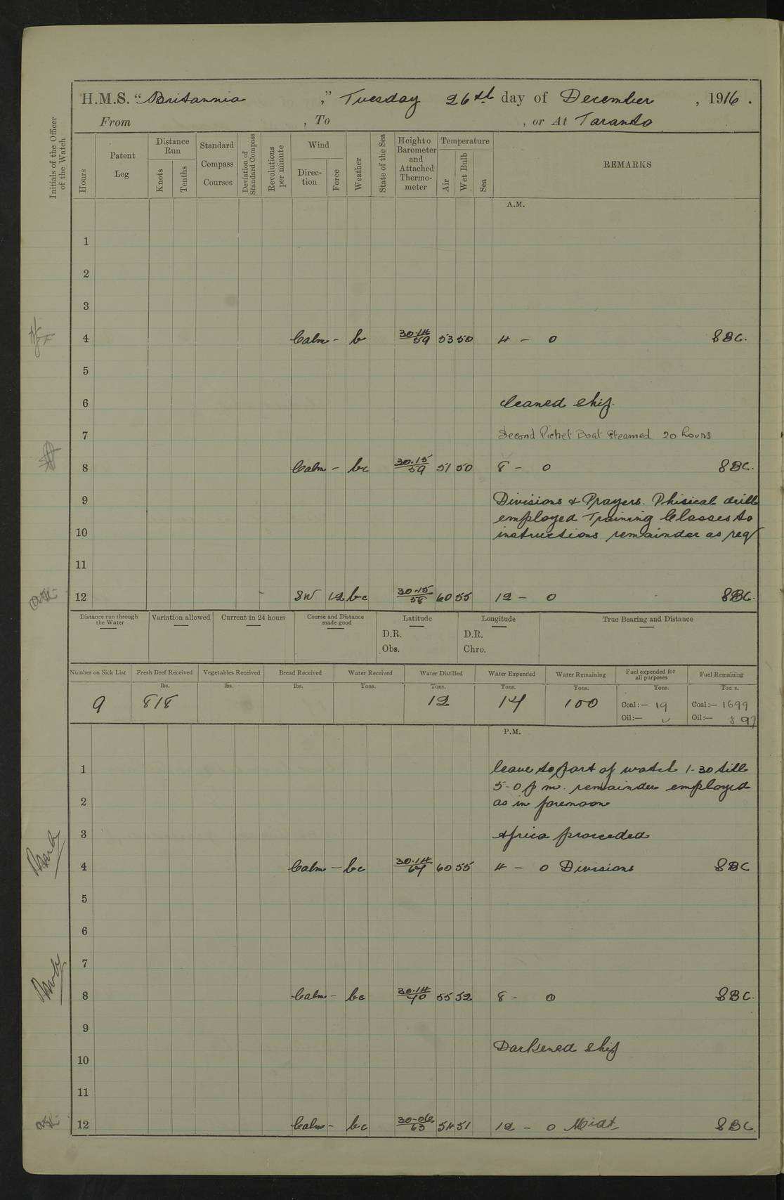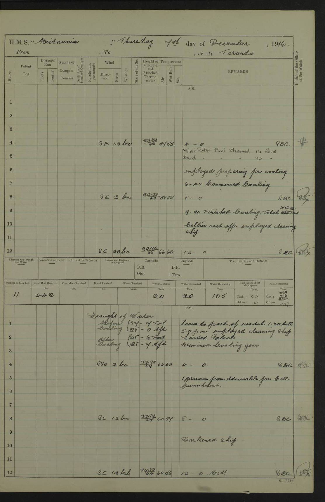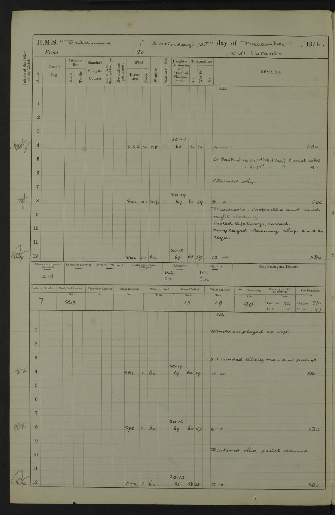 LOGS FOR JANUARY 1917 4caf8496cadfd3419700893f: (http://oldweather.s3.amazonaws.com/ADM53-36188/ADM 53-36188-001_0.jpg) 4caf8496cadfd34197008940: (http://oldweather.s3.amazonaws.com/ADM53-36188/ADM 53-36188-001_1.jpg) The above scans are of the front page of the log. 4caf8496cadfd34197008941: (http://oldweather.s3.amazonaws.com/ADM53-36188/ADM 53-36188-002_0.jpg) Power and fuel consumption page – blank. 4caf8496cadfd34197008942: (http://oldweather.s3.amazonaws.com/ADM53-36188/ADM 53-36188-002_1.jpg) 1 January 1917 Taranto Lat 40.46, Long 17.2 8.00am: Slipped and proceeded as requisite out of harbour. 8.35am: Stopped and came to in Mar Grande in 12 fathoms, veered to 5 shackles. am/pm: Exercised .303” aiming rifle. 4caf8496cadfd34197008943: (http://oldweather.s3.amazonaws.com/ADM53-36188/ADM 53-36188-003_0.jpg) 2 January 1917 Taranto Lat 40.46, Long 17.2 am: Sent party in tug to lay out trot(?) for calibration target. 1.45pm: Weighed, proceeded to entrance, joined fleet, carried out steam tactics. 4.00pm: Stopped, came to with starboard anchor in 9 fathoms, veered to 5 shackles. 4caf8496cadfd34197008944: (http://oldweather.s3.amazonaws.com/ADM53-36188/ADM 53-36188-003_1.jpg) 3 January 1917 Taranto Lat 40.46, Long 17.2 am: Sent party in tug to target. 11.36am: Weighed and proceeded to make fast to calibrating buoys. 1.30pm: Commenced calibration, starboard side. 3.20pm: Turned ship to fire port guns. pm: Range fouled. 4.50pm: Slipped and proceeded to anchorage. 5.07pm: Came to with starboard anchor in 9 fathoms, veered to 5 shackles. 4caf8496cadfd34197008945: (http://oldweather.s3.amazonaws.com/ADM53-36188/ADM 53-36188-004_0.jpg) 4 January 1917 Taranto Lat 40.46, Long 17.2 8.00am: Sent target party. 8.15am: Weighed and proceeded to calibrating buoys. 8.40am: Secured. pm: Commenced calibrating port guns. pm: Calibration completed. 1.52pm: Slipped from buoys, proceeded into Mar Piccolo. 2.45pm: Secured to No. 5 buoy. pm: Landed patrol. 4caf8496cadfd34197008946: (http://oldweather.s3.amazonaws.com/ADM53-36188/ADM 53-36188-004_1.jpg) 5 January 1917 Taranto Lat 40.46, Long 17.2 am: TBD Redpole arrived. HMS Redpole was a destroyer of the H (Acorn) class, launched in 1910 at J.S. White, Cowes, and sold in 1921. Details at http://www.dreadnoughtproject.org/tfs/index.php/H.M.S._Redpole_(1910) . pm: 1 Boy 1st class joined ship from hospital. pm: Discharged 1 AB to Admirable. pm: Landed liberty men and patrol. pm: Duncan arrived. 4caf8496cadfd34197008947: (http://oldweather.s3.amazonaws.com/ADM53-36188/ADM 53-36188-005_0.jpg) 6 January 1917 Taranto Lat 40.46, Long 17.2 am: Hoisted in 2nd picket boat. am: Divisions with night clothing. am: Discharged Mr Hill (Mate T) to hospital and 1 Ordinary Seaman , 1 Stoker to Isonzo. pm: Landed liberty men and patrol. pm: Isonzo proceeded. pm: Discharged 1 Private RMLI to Queen. 4caf8496cadfd34197008948: (http://oldweather.s3.amazonaws.com/ADM53-36188/ADM 53-36188-005_1.jpg) 7 January 1917 Taranto Lat 40.46, Long 17.2 am: Landed church parties. am: Held Divine Service. 4caf8496cadfd34197008949: (http://oldweather.s3.amazonaws.com/ADM53-36188/ADM 53-36188-006_0.jpg) 8 January 1917 Taranto Lat 40.6, Long 17.2 am: Hoisted out 2nd picket boat. am: Exercised all boats crews pull round fleet. Employed training classes to instructions, A and B 9.2 inch divisional drill, remainder as requisite. pm: Landed libertymen and Patrol. pm: Exercised searchlight crews. 4caf8496cadfd3419700894a: (http://oldweather.s3.amazonaws.com/ADM53-36188/ADM 53-36188-006_1.jpg) 9 January 1917 Taranto Lat 40.46, Long 17.2 am: Prince of Wales proceeded. am: marines to infantry drill. pm: landed liberty men and patrol. 4caf8496cadfd3419700894b: (http://oldweather.s3.amazonaws.com/ADM53-36188/ADM 53-36188-007_0.jpg) 10 January 1917 Taranto Lat 40.46, Long 17.2 am: 1 AB joined ship from SS Isonzo. pm: landed liberty men and patrol. pm: Prince of Wales arrived. 4caf8496cadfd3419700894c: (http://oldweather.s3.amazonaws.com/ADM53-36188/ADM 53-36188-007_1.jpg) 11 January 1917 Taranto Lat 40.46, Long 17.2 pm: Ammunition lighter secured alongside. pm: Gunners Party embarking ammunition. 4caf8496cadfd3419700894d: (http://oldweather.s3.amazonaws.com/ADM53-36188/ADM 53-36188-008_0.jpg) 12 January 1917 Taranto Lat 40.46, Long 17.2 am: Rigged coaling gear. am: Employed preparing ship for coaling. 12.45pm: Collier Silvia secured alongside. 1.06pm: Commenced coaling. 2.38pm: Completed coaling (total 406 tons). pm: Examined coaling gear. pm: Collier cast off. 4caf8496cadfd3419700894e: (http://oldweather.s3.amazonaws.com/ADM53-36188/ADM 53-36188-008_1.jpg) 13 January 1917 Taranto Lat 40.46, Long 17.2 am: Discharged 1 Chief Stoker and 1 Stoker to SS Isonzo. pm: Landed liberty men and patrol. 4caf8496cadfd3419700894f: (http://oldweather.s3.amazonaws.com/ADM53-36188/ADM 53-36188-009_0.jpg) 14 January 1917 Taranto Lat 40.46, Long 17.2 am: Landed church parties. am: Divisions. Read Articles of War. am: Held Divine Service. 4caf8496cadfd34197008950: (http://oldweather.s3.amazonaws.com/ADM53-36188/ADM 53-36188-009_1.jpg) 15 January 1917 Taranto Lat 40.46, Long 17.2 pm: Landed liberty men and patrol. 4caf8496cadfd34197008951: (http://oldweather.s3.amazonaws.com/ADM53-36188/ADM 53-36188-010_0.jpg) 16 January 1917 Taranto Lat 40.46, Long 17.2 am: Duncan proceeded into dock. am: Queen and Prince of Wales arrived. am: 6 inch guns crews, Boys of port watch and training classes to instruction. pm: Landed liberty men and patrol. pm: Discharged Court Martial prisoner to Queen. 4caf8496cadfd34197008952: (http://oldweather.s3.amazonaws.com/ADM53-36188/ADM 53-36188-010_1.jpg) 17 January 1917 Taranto Lat 40.46, Long 17.2 am: 1 Stoker joined ship from Admirable. pm: Training classes and Boys port watch to instructions, preparing ship for sea and as requisite. pm: Slipped and proceeded out of harbour. 2.55pm: Stopped, came to with starboard anchor in 10½ fathoms, veered to 5 shackles. 4caf8496cadfd34197008953: (http://oldweather