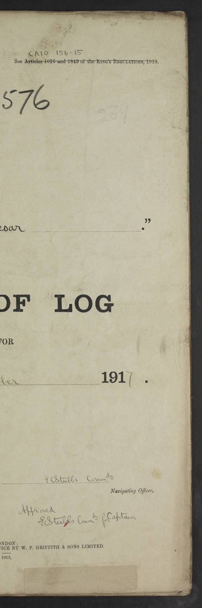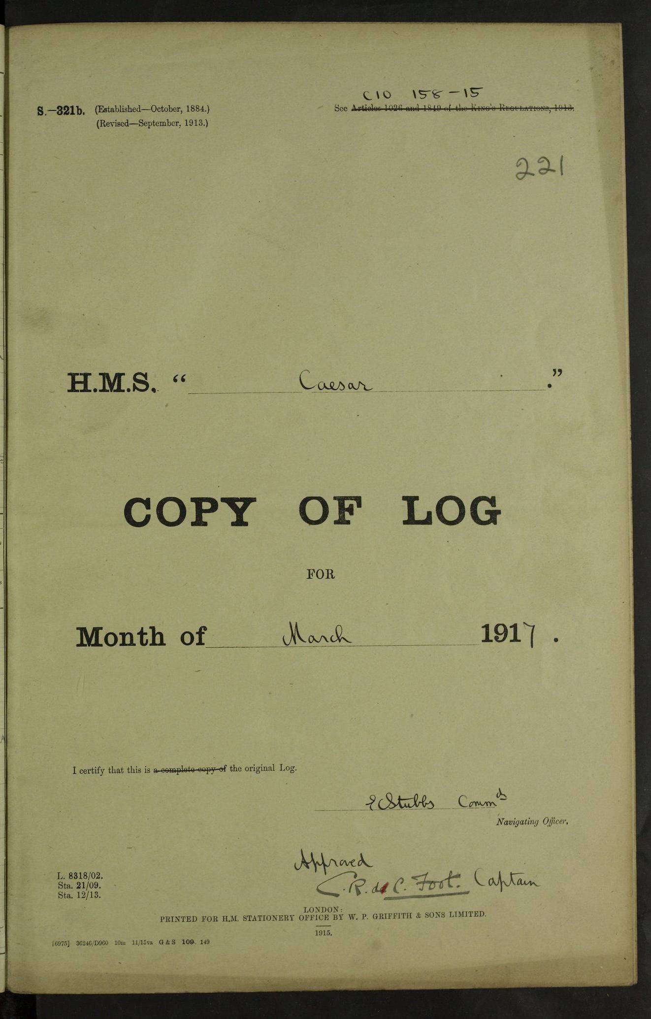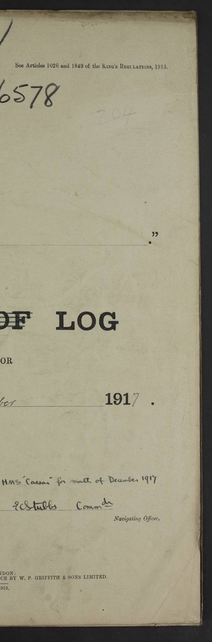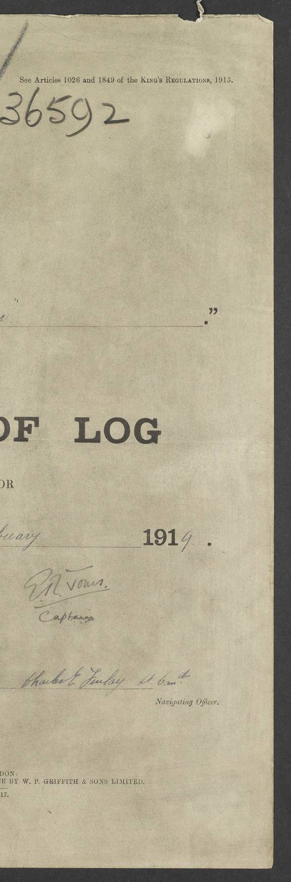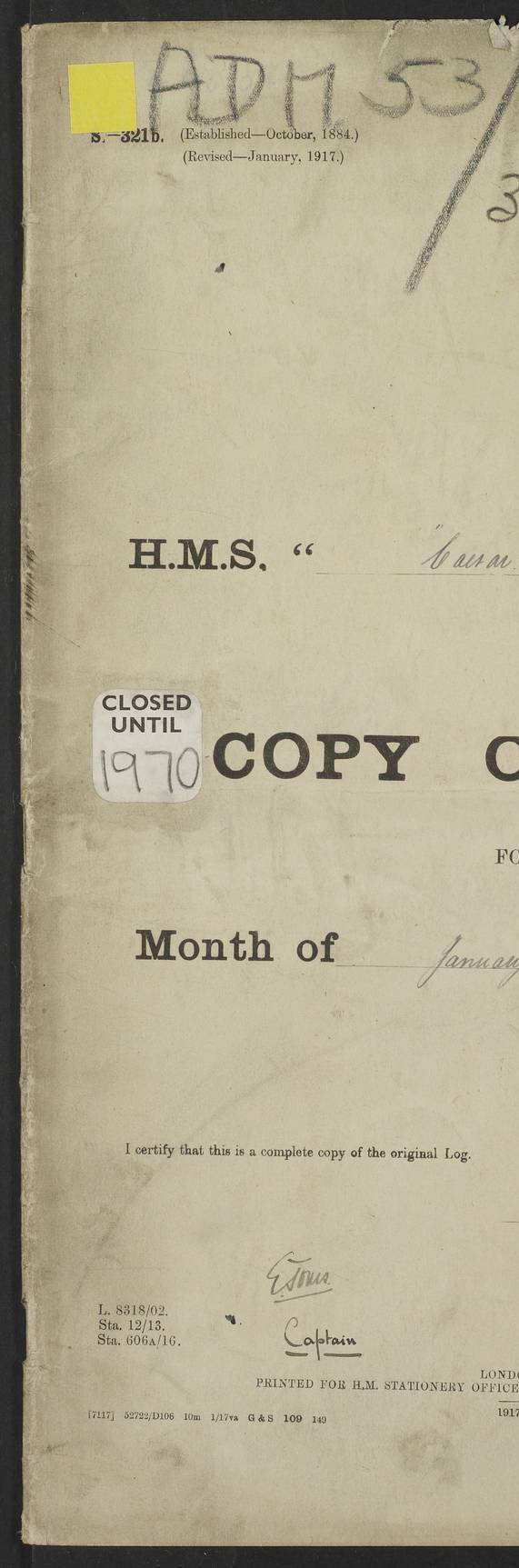 LOGS FOR JANUARY 1917 4caf84b6cadfd34197009935: (http://oldweather.s3.amazonaws.com/ADM53-36574/ADM 53-36574-143_1.jpg) [Cover of Log for January 1917; “I certify that this is a complete copy of the original Log” (“a complete copy of” crossed through), signed by EC Stubbs, Commander N [Navigator], Navigating Officer] 4caf84b6cadfd34197009936: (http://oldweather.s3.amazonaws.com/ADM53-36574/ADM 53-36574-144_0.jpg) [Blank page] 4caf84b6cadfd34197009937: (http://oldweather.s3.amazonaws.com/ADM53-36574/ADM 53-36574-144_1.jpg) [Page not filled in but signed by CR de C Foot, Captain [Cunningham Robert de Clare Foot], 1 February 1917] 4caf84b6cadfd34197009938: (http://oldweather.s3.amazonaws.com/ADM53-36574/ADM 53-36574-145_0.jpg) [Details of Barometer and Thermometers]