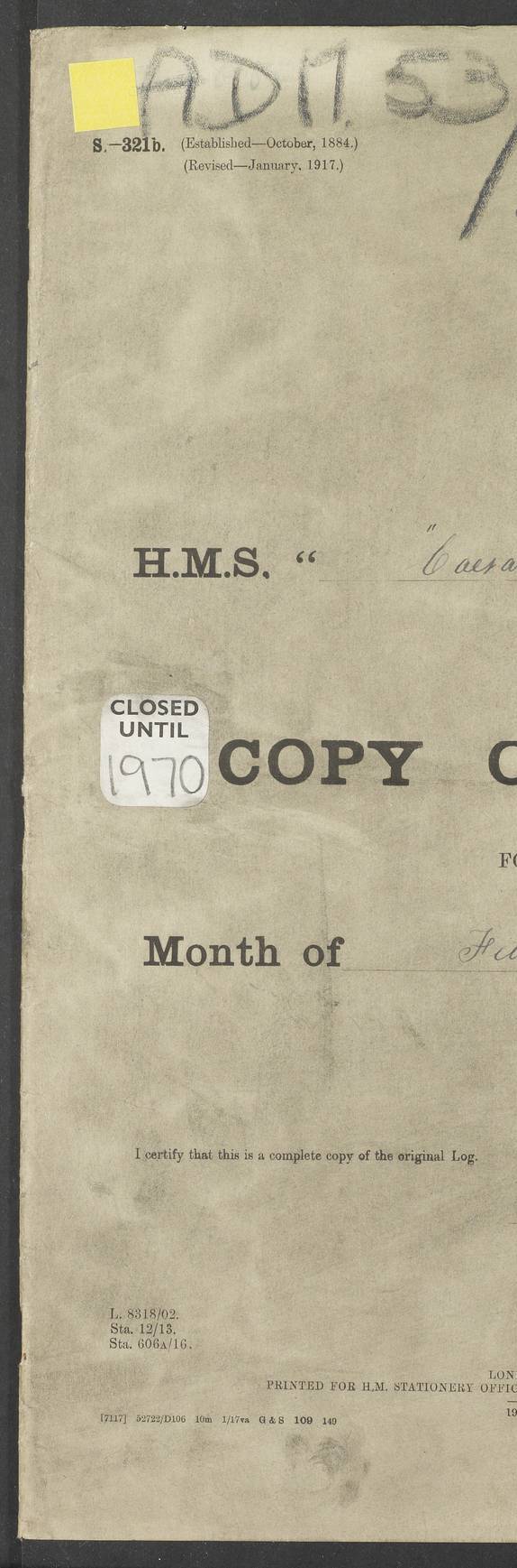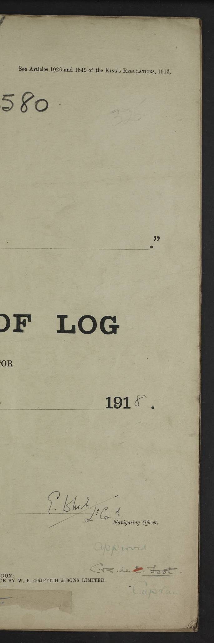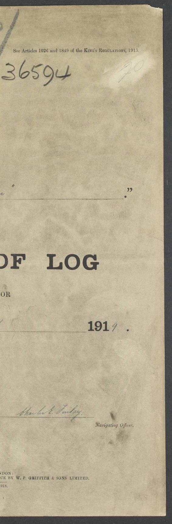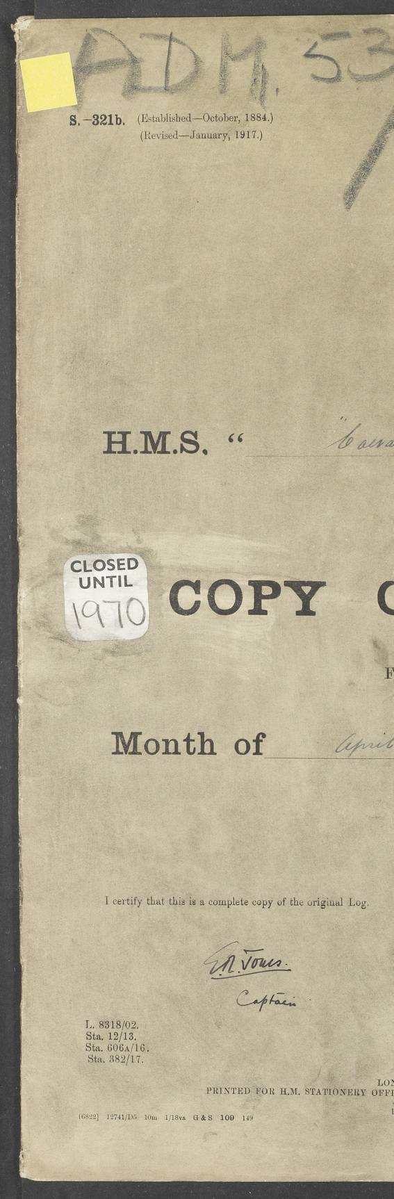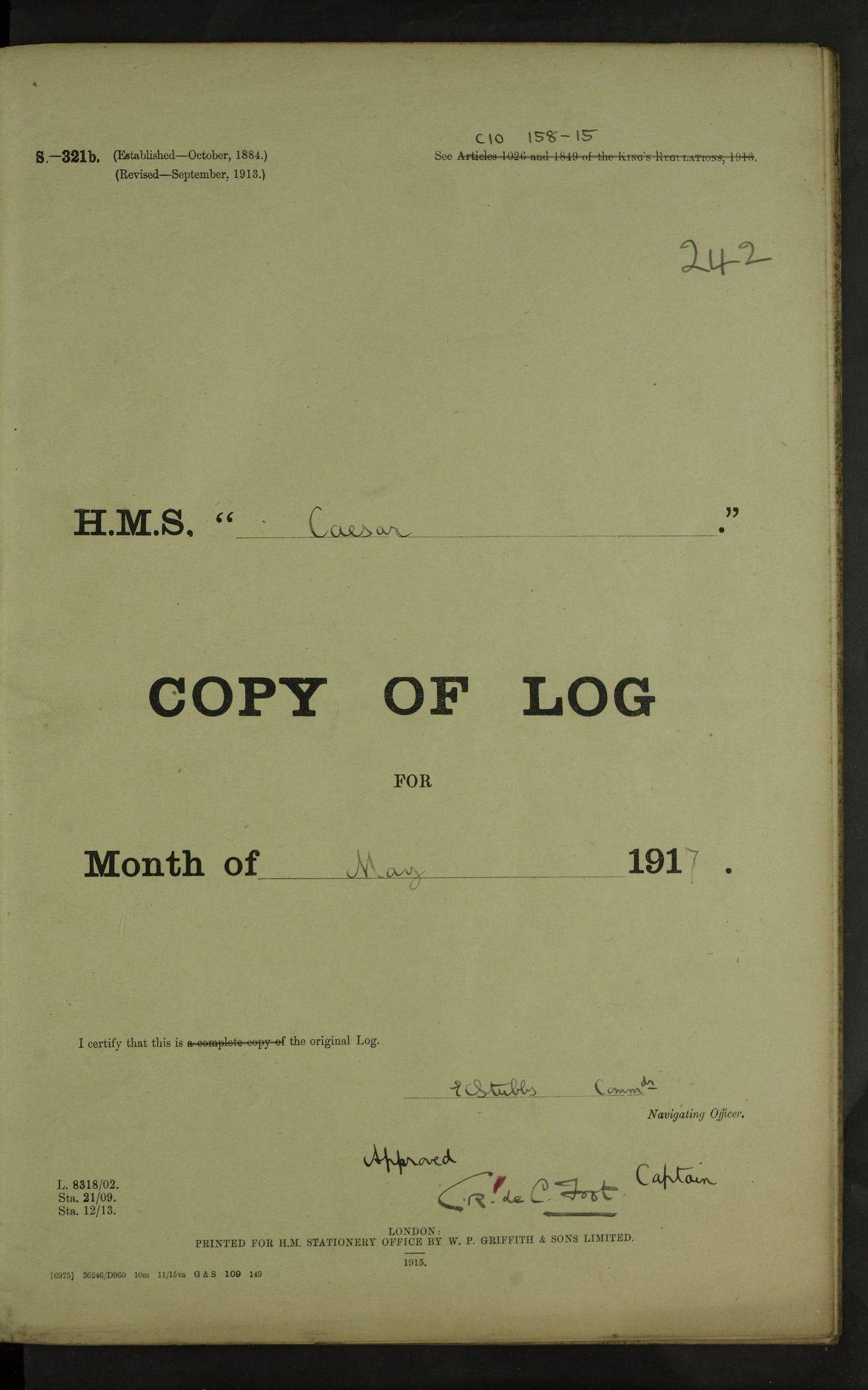 LOGS FOR JANUARY 1917 4caf84b6cadfd34197009935: (http://oldweather.s3.amazonaws.com/ADM53-36574/ADM 53-36574-143_1.jpg) [Cover of Log for January 1917; “I certify that this is a complete copy of the original Log” (“a complete copy of” crossed through), signed by EC Stubbs, Commander N [Navigator], Navigating Officer] 4caf84b6cadfd34197009936: (http://oldweather.s3.amazonaws.com/ADM53-36574/ADM 53-36574-144_0.jpg) [Blank page] 4caf84b6cadfd34197009937: (http://oldweather.s3.amazonaws.com/ADM53-36574/ADM 53-36574-144_1.jpg) [Page not filled in but signed by CR de C Foot, Captain [Cunningham Robert de Clare Foot], 1 February 1917] 4caf84b6cadfd34197009938: (http://oldweather.s3.amazonaws.com/ADM53-36574/ADM 53-36574-145_0.jpg) [Details of Barometer and Thermometers]