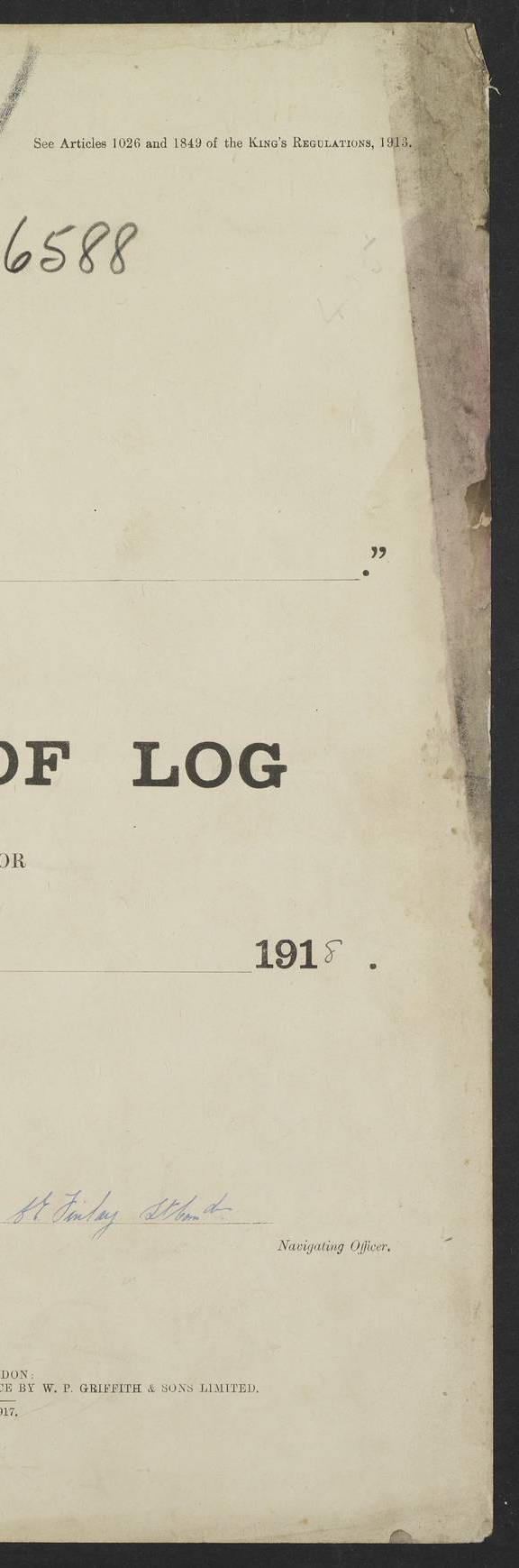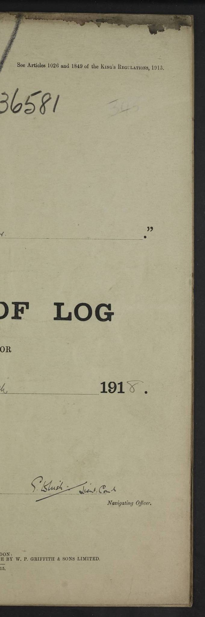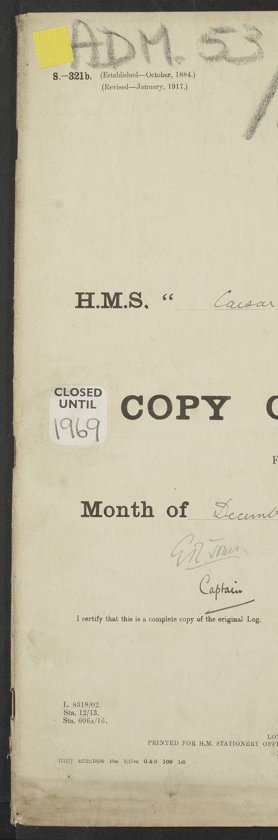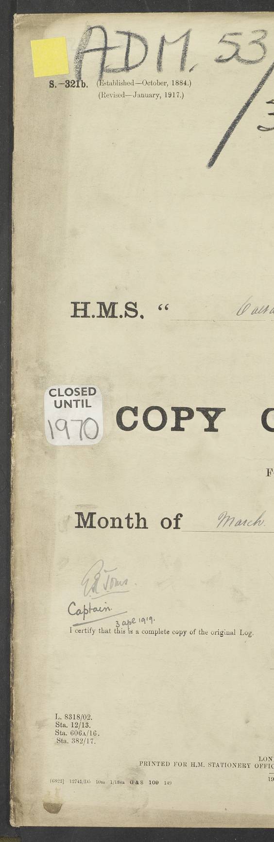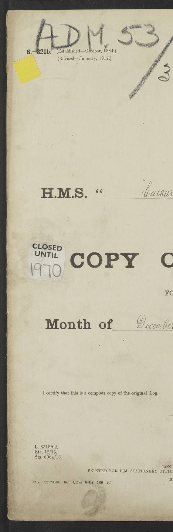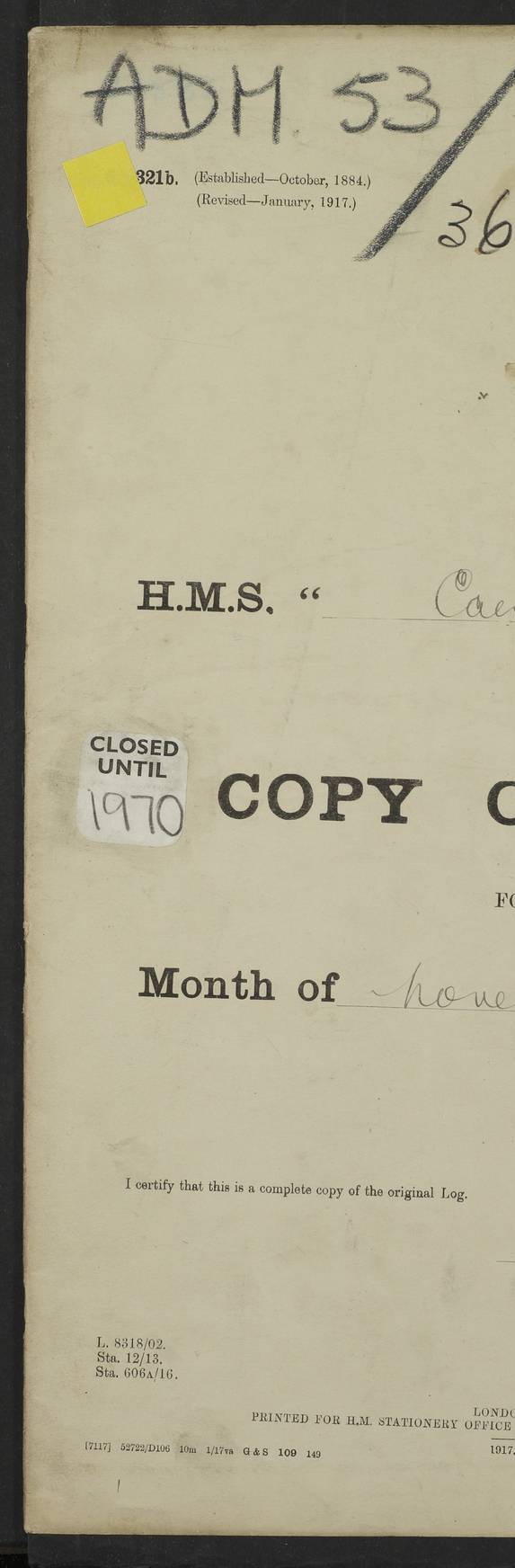 LOGS FOR JANUARY 1917 4caf84b6cadfd34197009935: (http://oldweather.s3.amazonaws.com/ADM53-36574/ADM 53-36574-143_1.jpg) [Cover of Log for January 1917; “I certify that this is a complete copy of the original Log” (“a complete copy of” crossed through), signed by EC Stubbs, Commander N [Navigator], Navigating Officer] 4caf84b6cadfd34197009936: (http://oldweather.s3.amazonaws.com/ADM53-36574/ADM 53-36574-144_0.jpg) [Blank page] 4caf84b6cadfd34197009937: (http://oldweather.s3.amazonaws.com/ADM53-36574/ADM 53-36574-144_1.jpg) [Page not filled in but signed by CR de C Foot, Captain [Cunningham Robert de Clare Foot], 1 February 1917] 4caf84b6cadfd34197009938: (http://oldweather.s3.amazonaws.com/ADM53-36574/ADM 53-36574-145_0.jpg) [Details of Barometer and Thermometers]