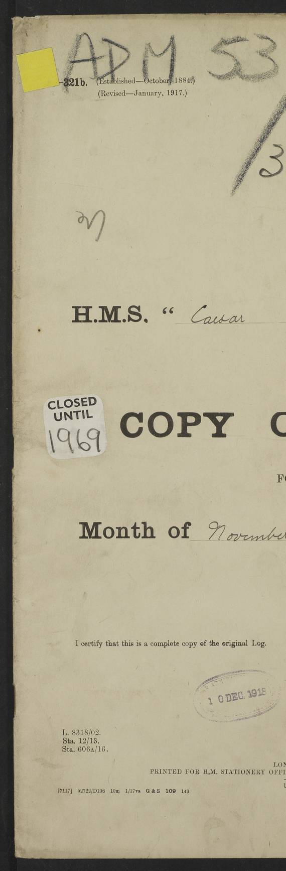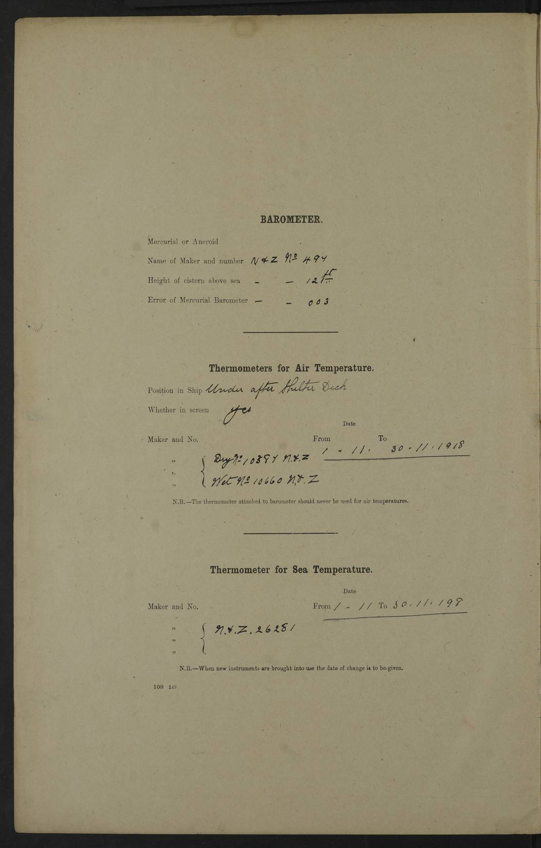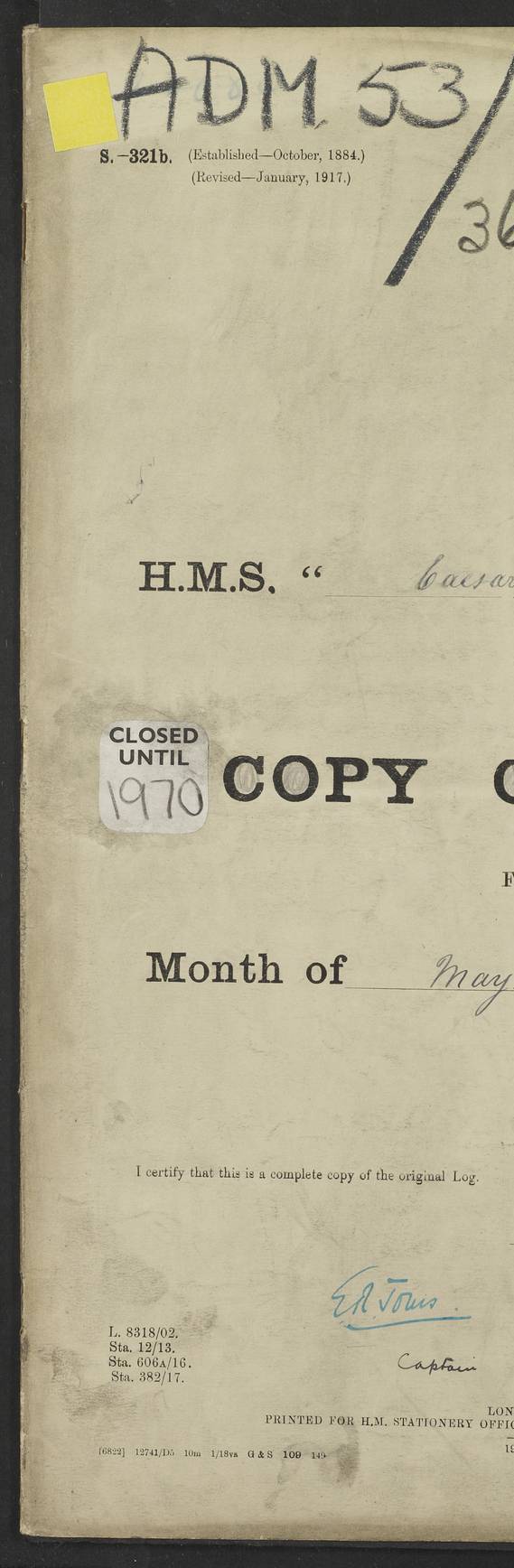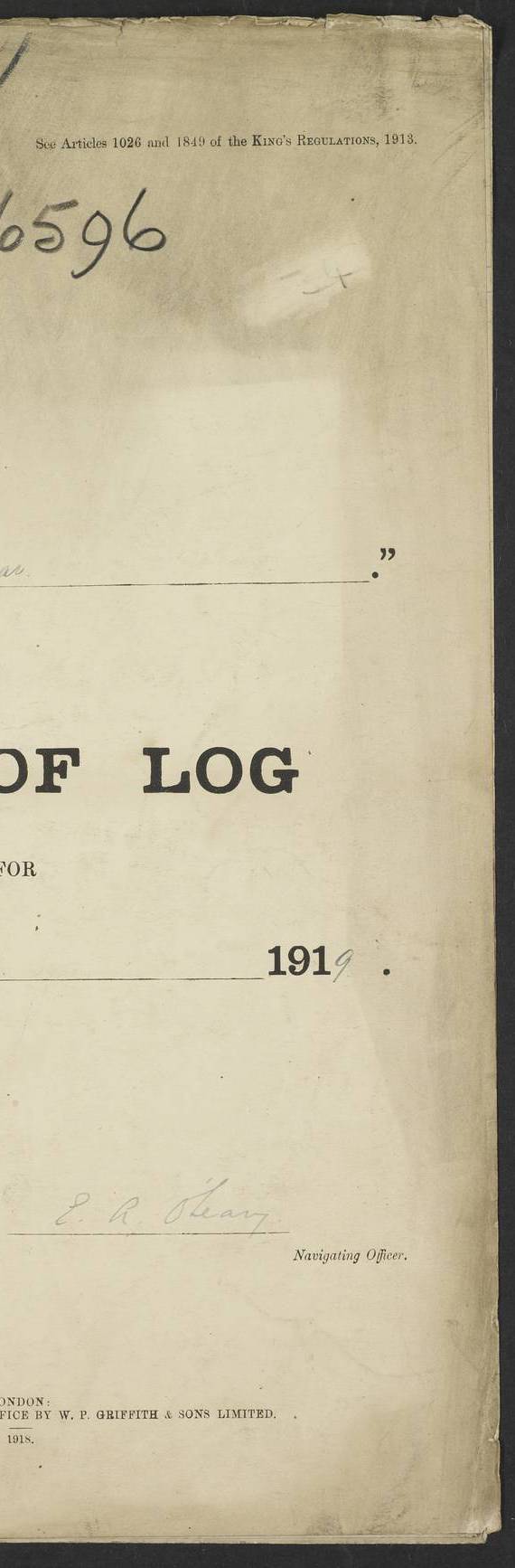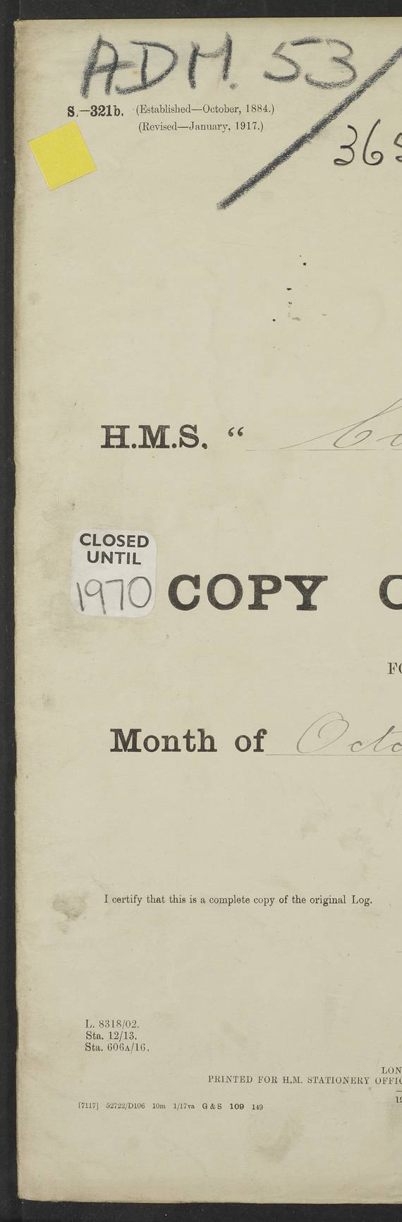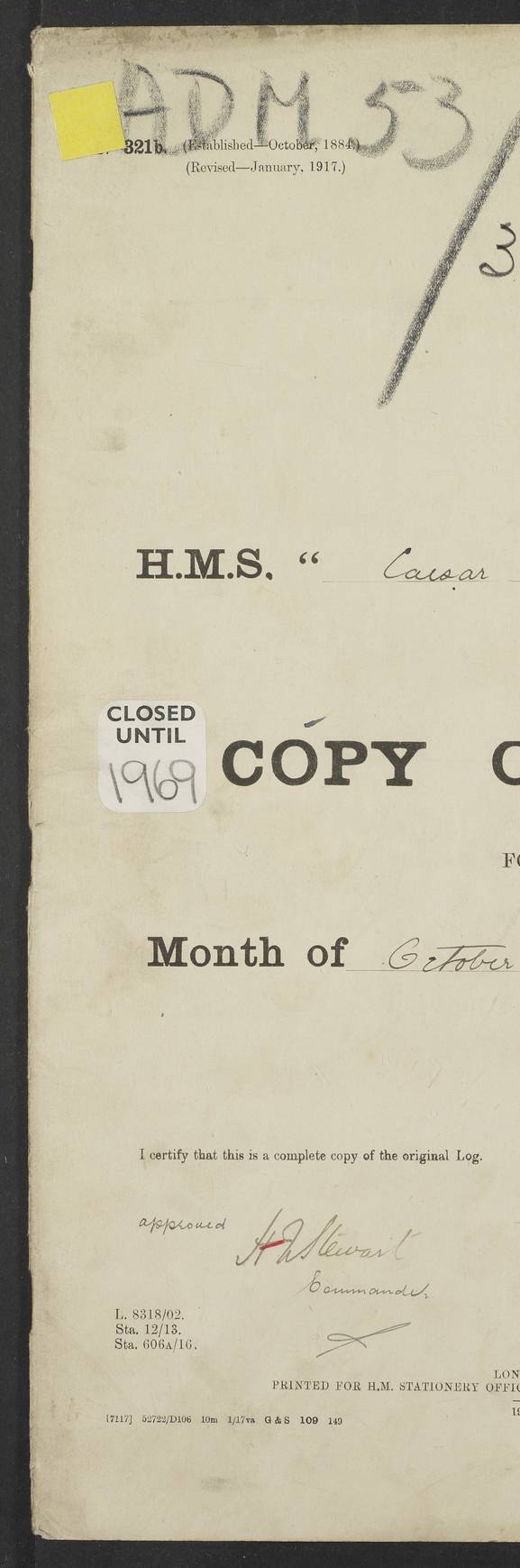 LOGS FOR JANUARY 1917 4caf84b6cadfd34197009935: (http://oldweather.s3.amazonaws.com/ADM53-36574/ADM 53-36574-143_1.jpg) [Cover of Log for January 1917; “I certify that this is a complete copy of the original Log” (“a complete copy of” crossed through), signed by EC Stubbs, Commander N [Navigator], Navigating Officer] 4caf84b6cadfd34197009936: (http://oldweather.s3.amazonaws.com/ADM53-36574/ADM 53-36574-144_0.jpg) [Blank page] 4caf84b6cadfd34197009937: (http://oldweather.s3.amazonaws.com/ADM53-36574/ADM 53-36574-144_1.jpg) [Page not filled in but signed by CR de C Foot, Captain [Cunningham Robert de Clare Foot], 1 February 1917] 4caf84b6cadfd34197009938: (http://oldweather.s3.amazonaws.com/ADM53-36574/ADM 53-36574-145_0.jpg) [Details of Barometer and Thermometers]