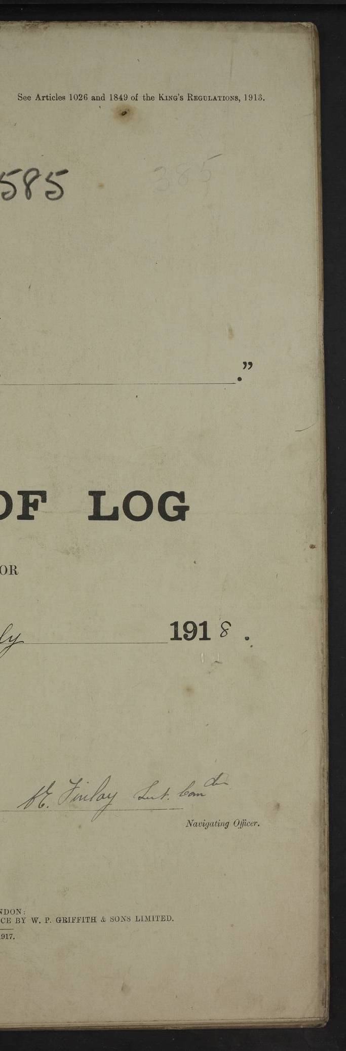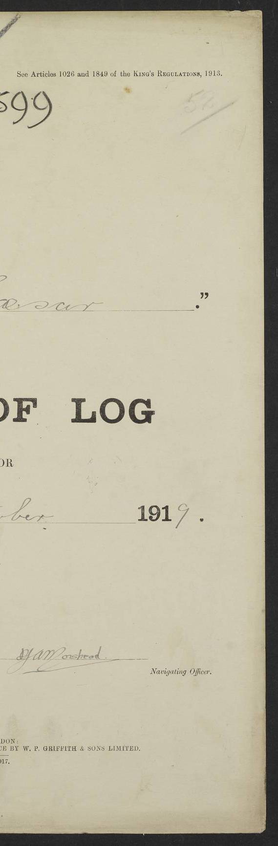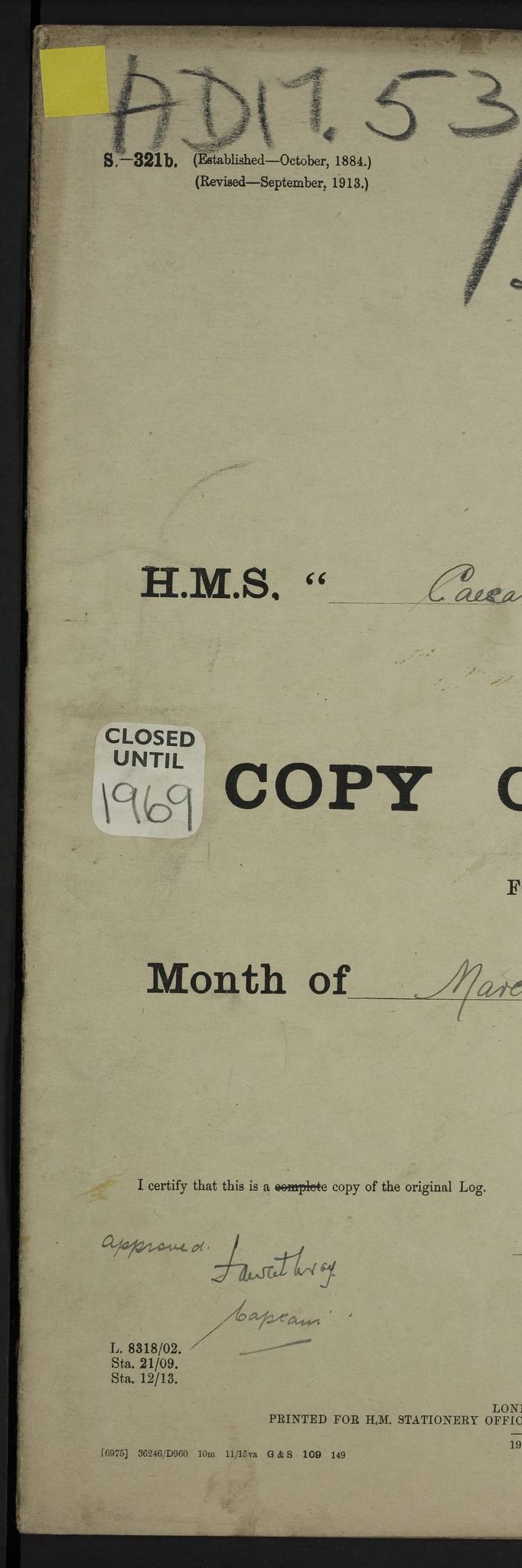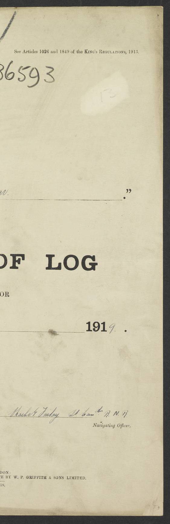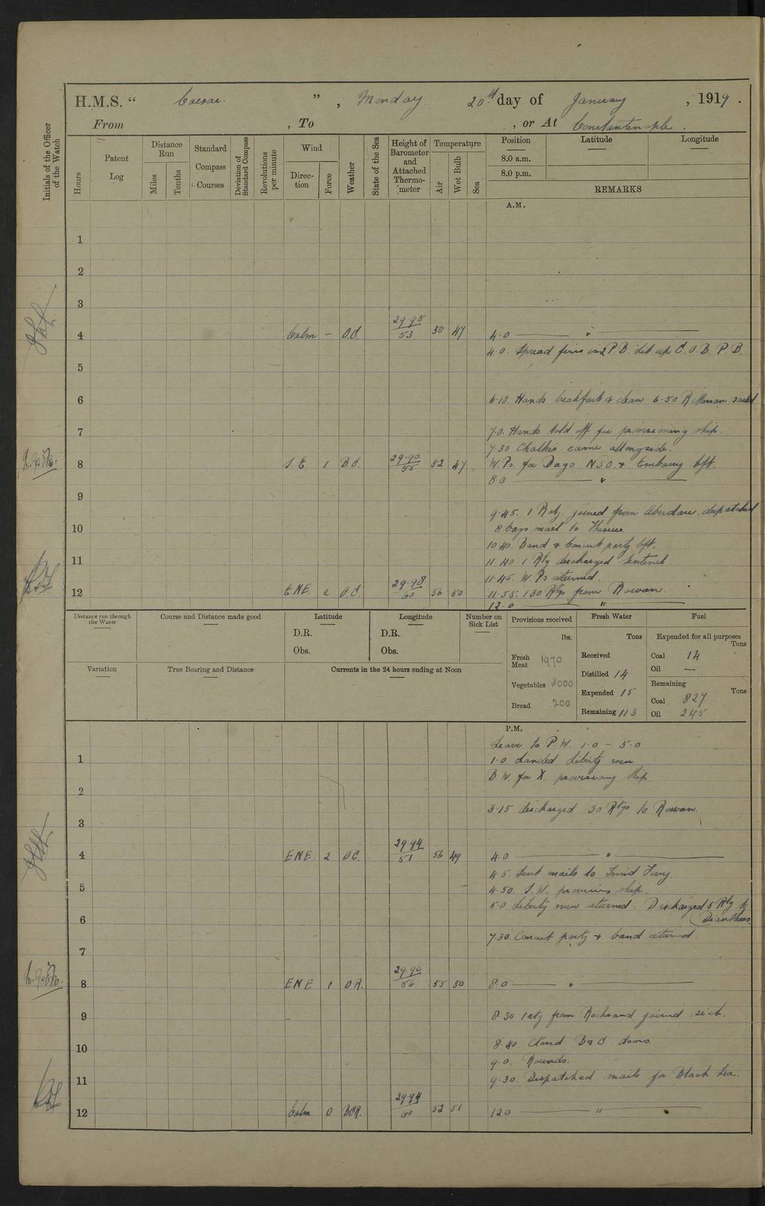 LOGS FOR JANUARY 1917 4caf84b6cadfd34197009935: (http://oldweather.s3.amazonaws.com/ADM53-36574/ADM 53-36574-143_1.jpg) [Cover of Log for January 1917; “I certify that this is a complete copy of the original Log” (“a complete copy of” crossed through), signed by EC Stubbs, Commander N [Navigator], Navigating Officer] 4caf84b6cadfd34197009936: (http://oldweather.s3.amazonaws.com/ADM53-36574/ADM 53-36574-144_0.jpg) [Blank page] 4caf84b6cadfd34197009937: (http://oldweather.s3.amazonaws.com/ADM53-36574/ADM 53-36574-144_1.jpg) [Page not filled in but signed by CR de C Foot, Captain [Cunningham Robert de Clare Foot], 1 February 1917] 4caf84b6cadfd34197009938: (http://oldweather.s3.amazonaws.com/ADM53-36574/ADM 53-36574-145_0.jpg) [Details of Barometer and Thermometers]