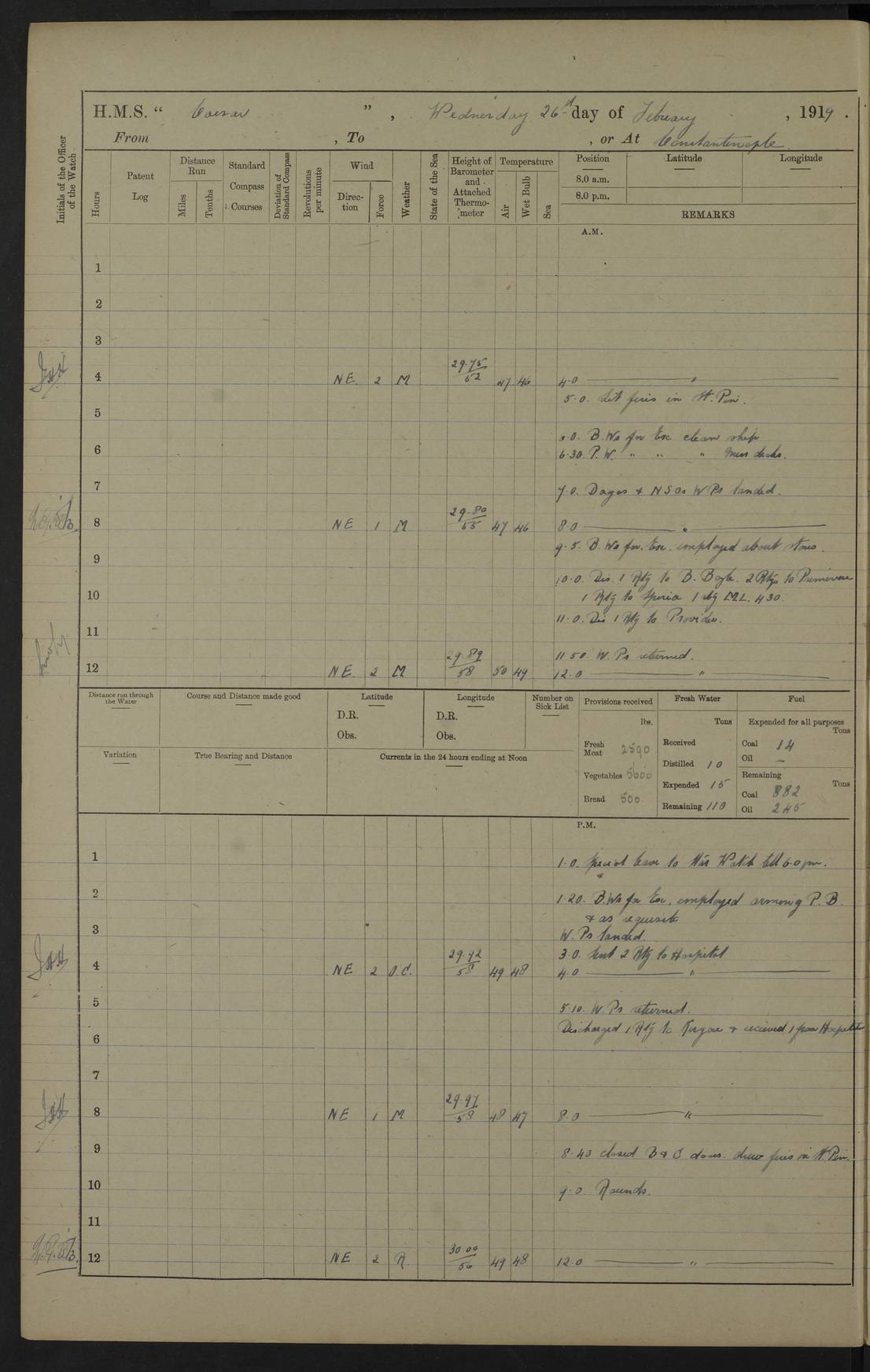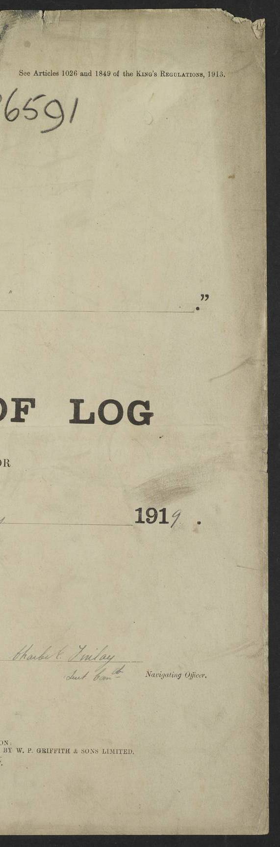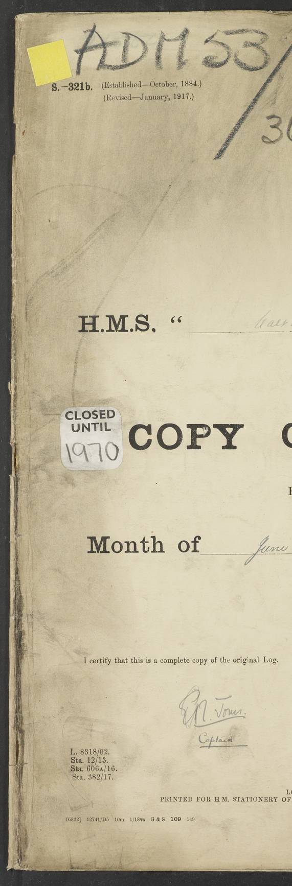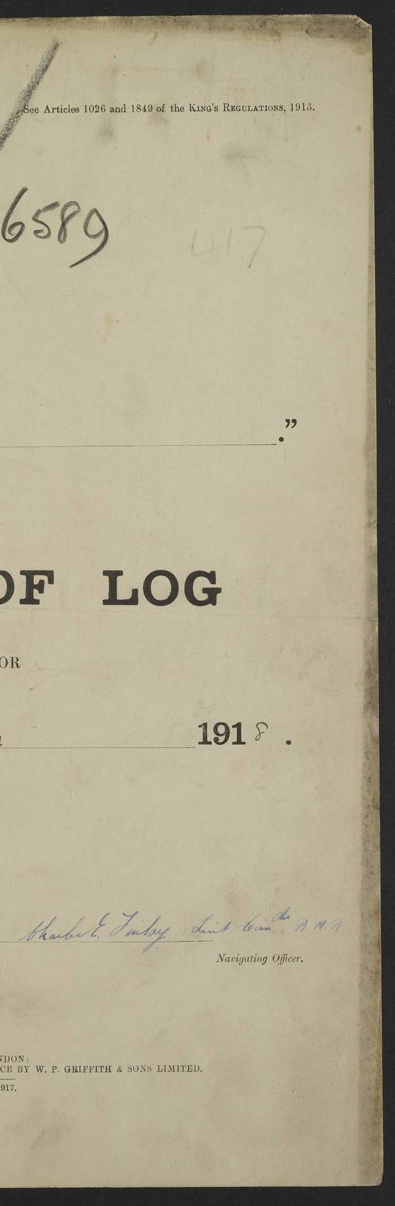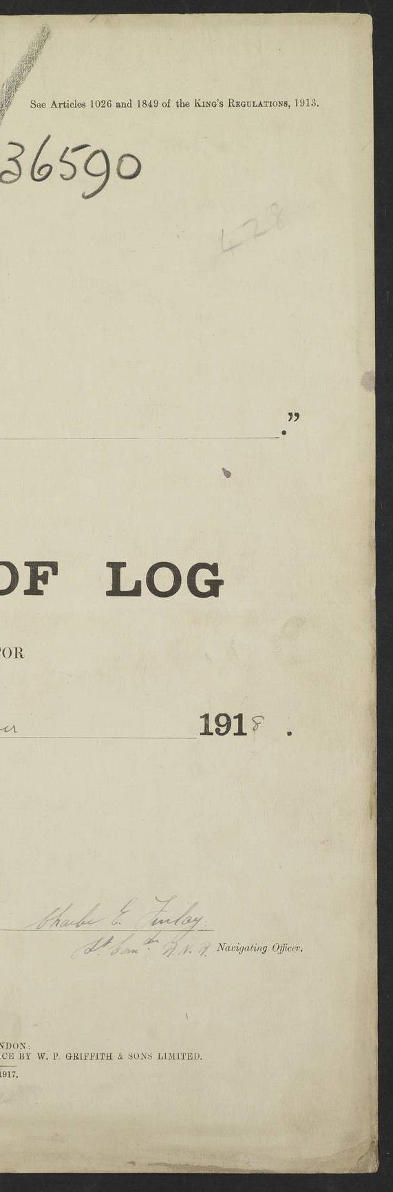 LOGS FOR JANUARY 1917 4caf84b6cadfd34197009935: (http://oldweather.s3.amazonaws.com/ADM53-36574/ADM 53-36574-143_1.jpg) [Cover of Log for January 1917; “I certify that this is a complete copy of the original Log” (“a complete copy of” crossed through), signed by EC Stubbs, Commander N [Navigator], Navigating Officer] 4caf84b6cadfd34197009936: (http://oldweather.s3.amazonaws.com/ADM53-36574/ADM 53-36574-144_0.jpg) [Blank page] 4caf84b6cadfd34197009937: (http://oldweather.s3.amazonaws.com/ADM53-36574/ADM 53-36574-144_1.jpg) [Page not filled in but signed by CR de C Foot, Captain [Cunningham Robert de Clare Foot], 1 February 1917] 4caf84b6cadfd34197009938: (http://oldweather.s3.amazonaws.com/ADM53-36574/ADM 53-36574-145_0.jpg) [Details of Barometer and Thermometers]