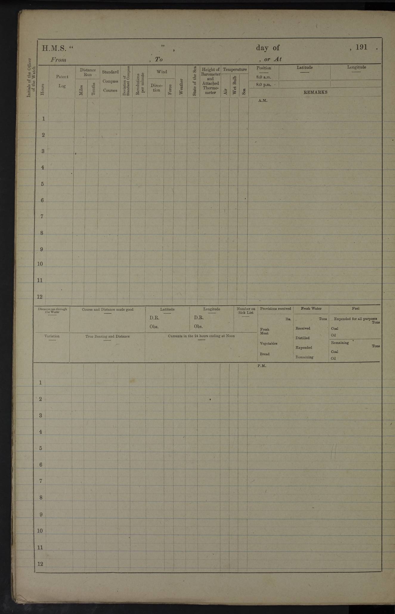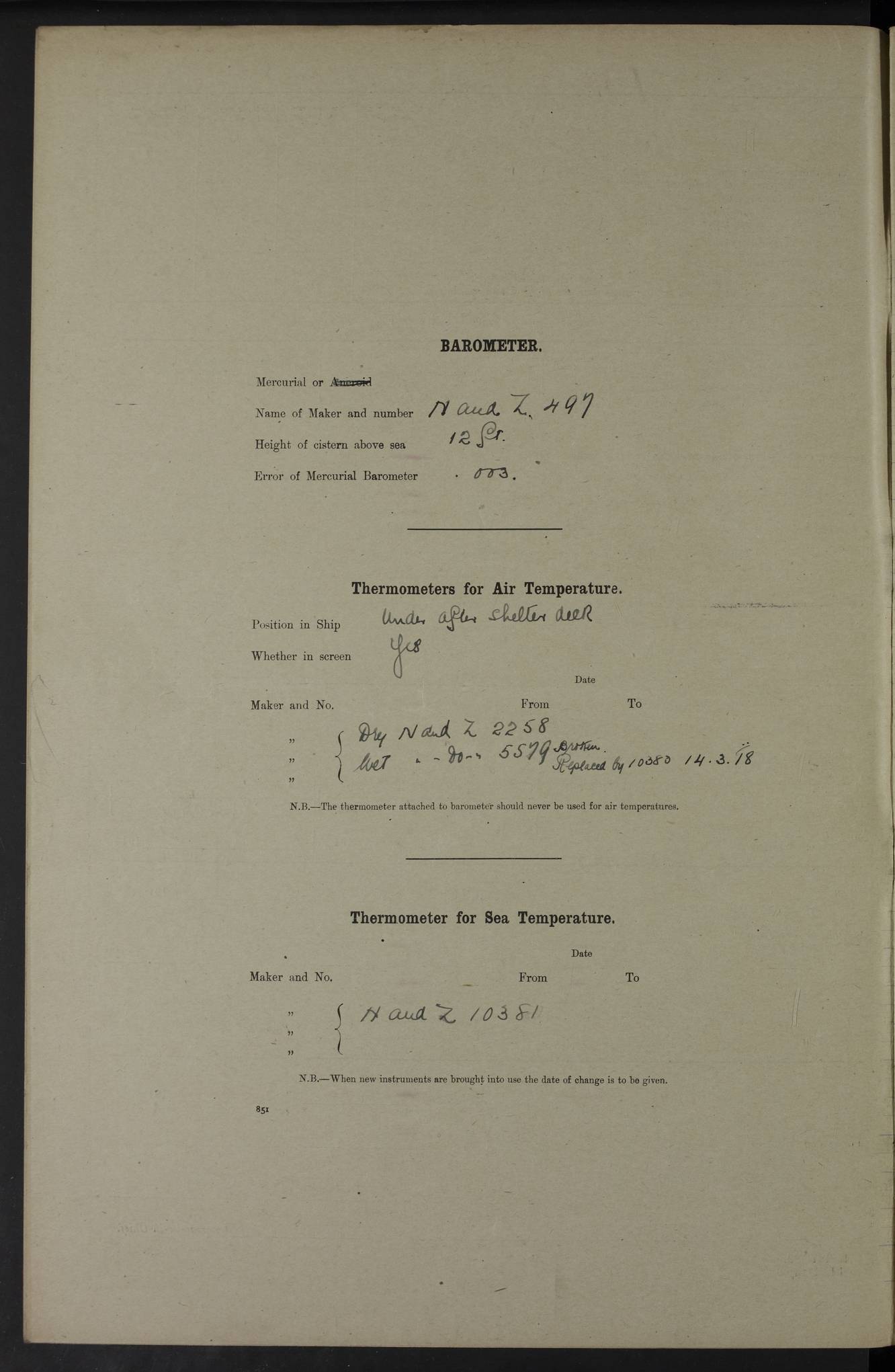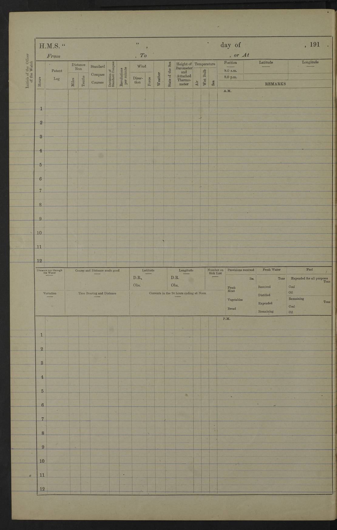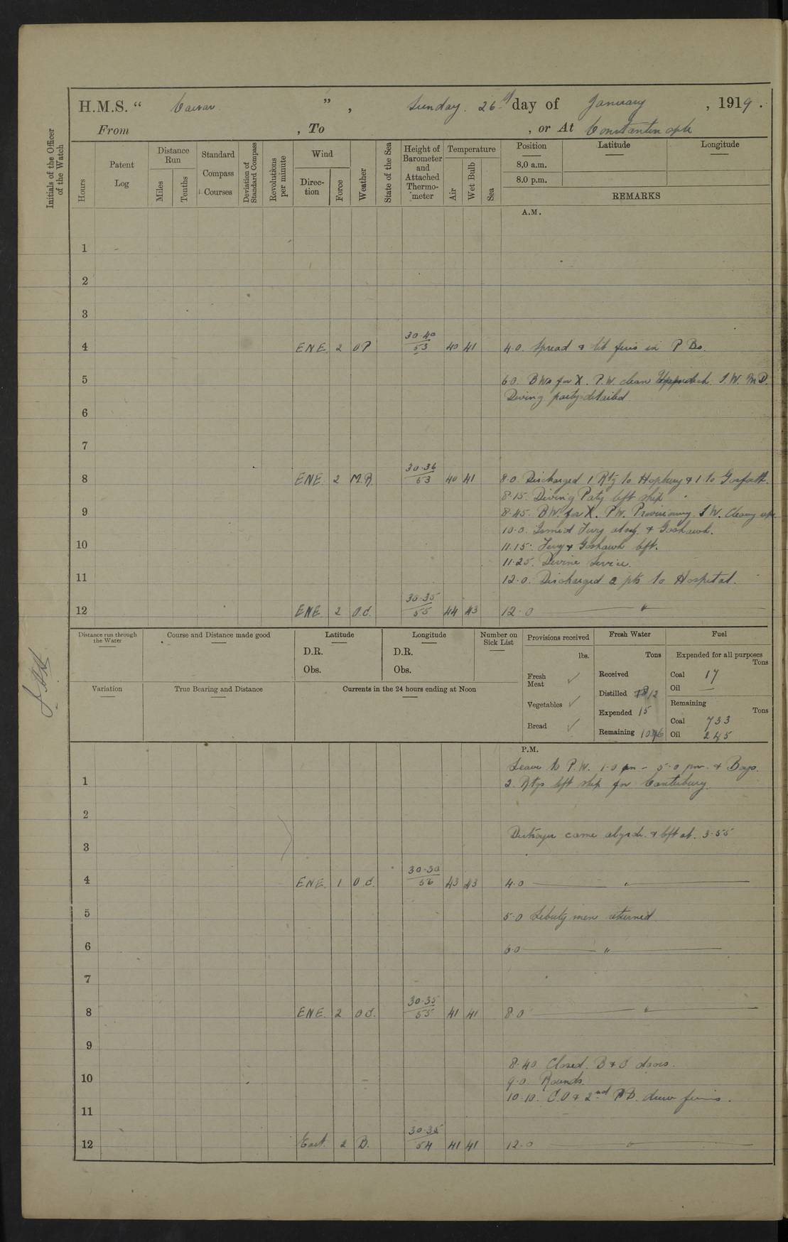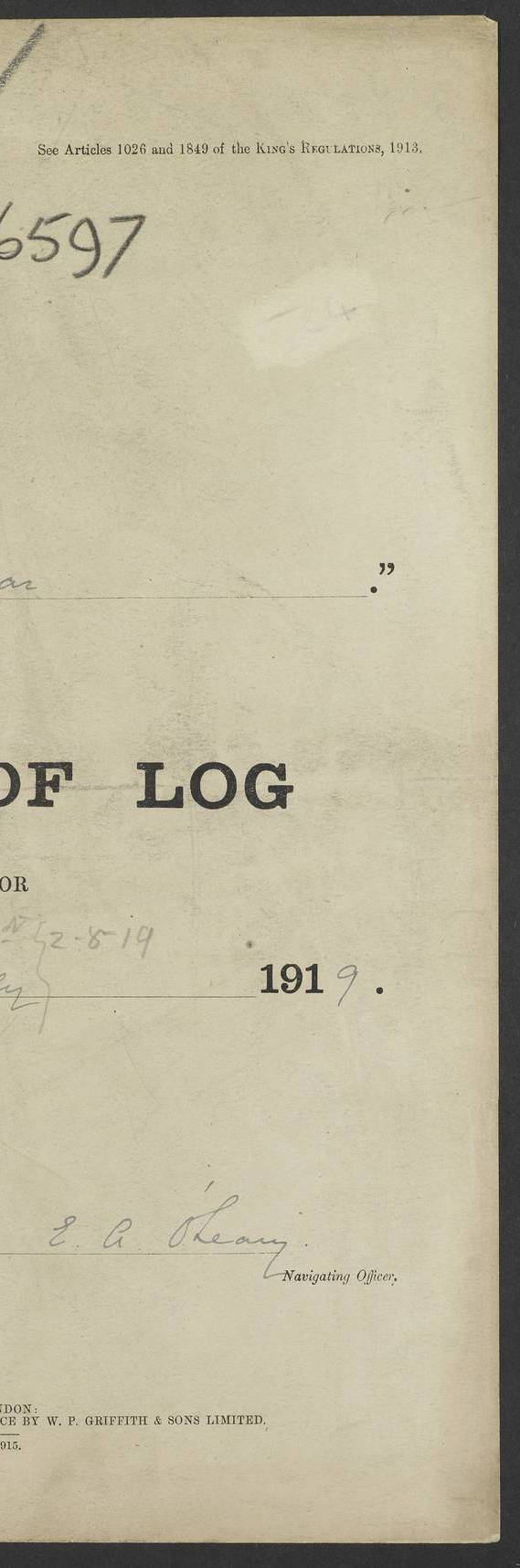 LOGS FOR JANUARY 1917 4caf84b6cadfd34197009935: (http://oldweather.s3.amazonaws.com/ADM53-36574/ADM 53-36574-143_1.jpg) [Cover of Log for January 1917; “I certify that this is a complete copy of the original Log” (“a complete copy of” crossed through), signed by EC Stubbs, Commander N [Navigator], Navigating Officer] 4caf84b6cadfd34197009936: (http://oldweather.s3.amazonaws.com/ADM53-36574/ADM 53-36574-144_0.jpg) [Blank page] 4caf84b6cadfd34197009937: (http://oldweather.s3.amazonaws.com/ADM53-36574/ADM 53-36574-144_1.jpg) [Page not filled in but signed by CR de C Foot, Captain [Cunningham Robert de Clare Foot], 1 February 1917] 4caf84b6cadfd34197009938: (http://oldweather.s3.amazonaws.com/ADM53-36574/ADM 53-36574-145_0.jpg) [Details of Barometer and Thermometers]