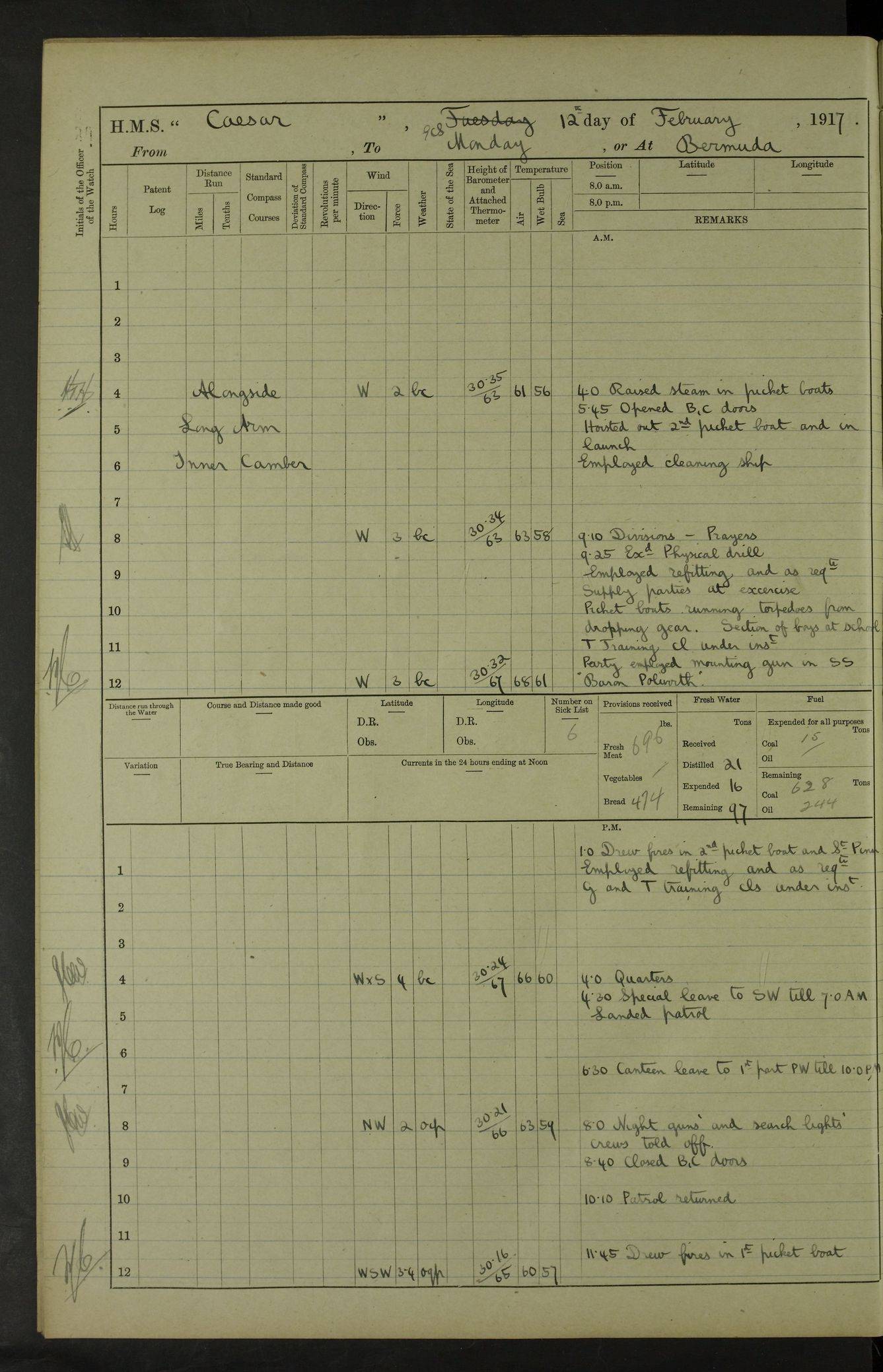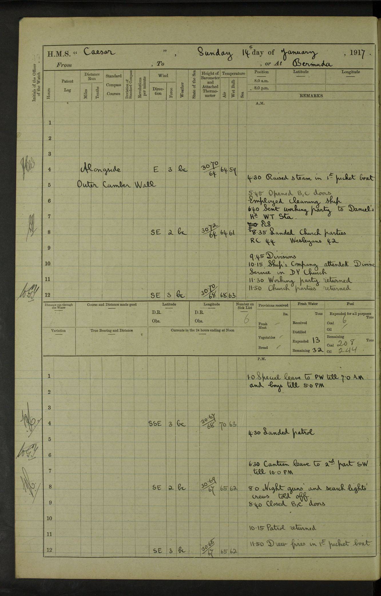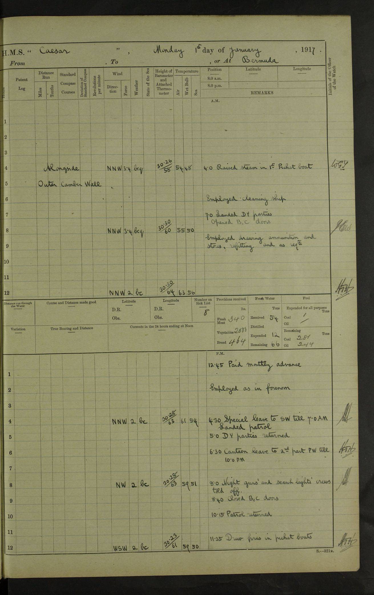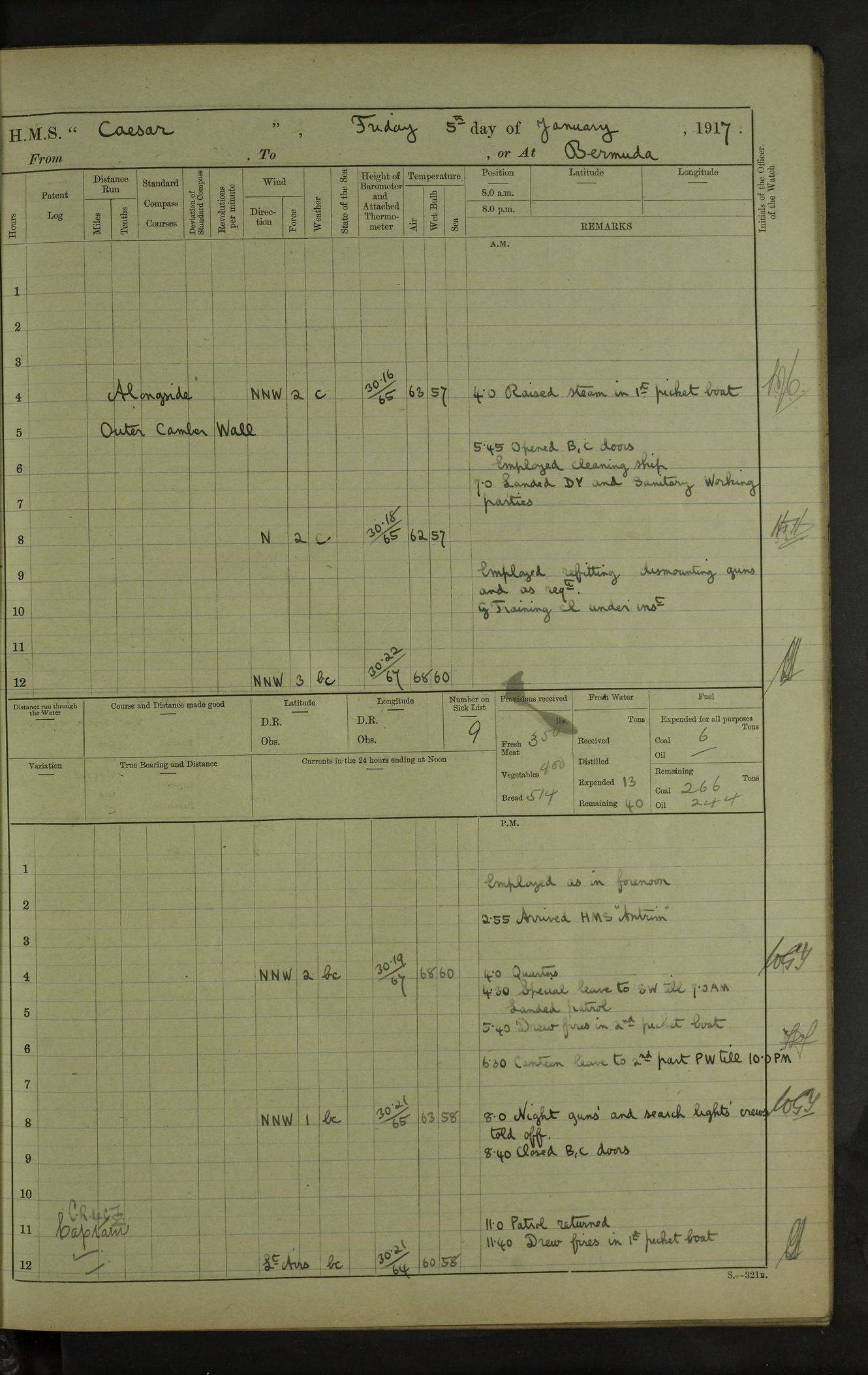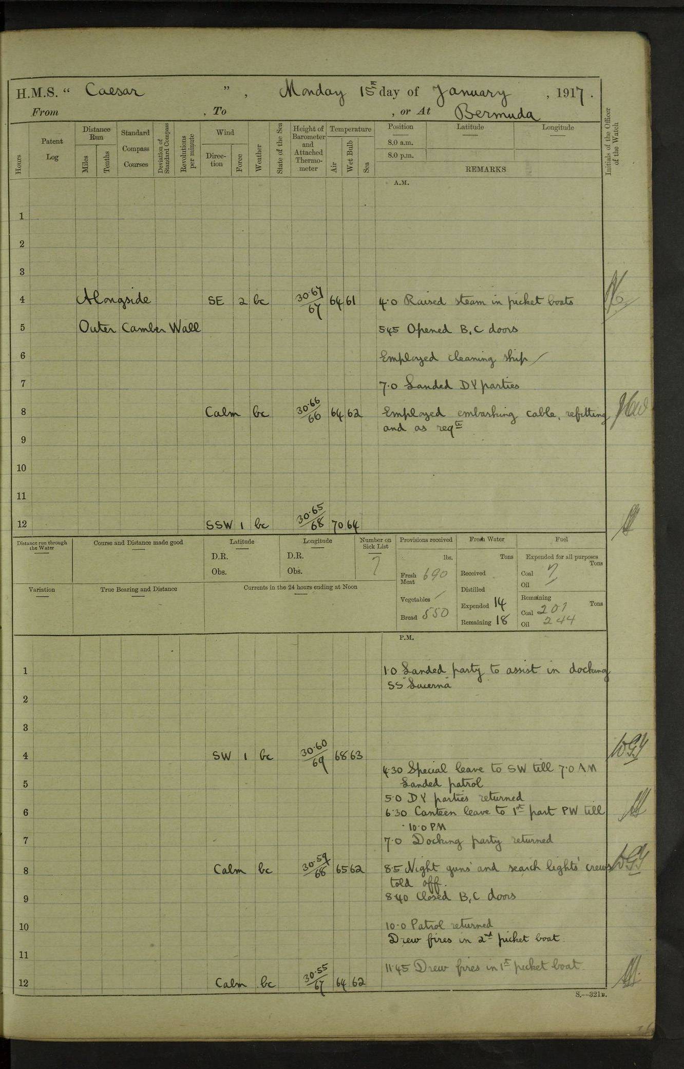 4caf84b6cadfd34197009939: (http://oldweather.s3.amazonaws.com/ADM53-36574/ADM 53-36574-145_1.jpg) 1 January 1917 At Bermuda Lat 32.32, Long -64.83 [Alongside Outer Camber Wall] 4.0am: Raised steam in first Picket boat. 6.0am: Employed cleaning ship. 7.0am: Landed Dockyard parties. Opened B, C doors. am: Employed drawing ammunition and stores, refitting and as requisite. 0.45pm: Paid monthly advance. pm: Employed as in forenoon. 4.30pm: Special leave to Starboard Watch till 7.0am. Landed patrol. 5.0pm: Dockyard parties returned. 6.30pm: Canteen leave to second part Port Watch till 10.0pm. 8.0pm: Night guns’ and search lights’ crews told off. 8.40pm: Closed B, C doors. 10.15pm: Patrol returned. 11.35pm: Drew fires in picket boats. [Number on sick list: 8] [Provisions received: Fresh Meat 340 lbs, Vegetables 2000 lbs, Bread 464 lbs] [Weather fine, though squally in early am. Noon temperature 63F] 4caf84b6cadfd3419700993a: (http://oldweather.s3.amazonaws.com/ADM53-36574/ADM 53-36574-146_0.jpg) 2 January 1917 [Year incorrectly shown as 1916] At Bermuda Lat 32.32, Long -64.83 [Alongside Outer Camber Wall] 4.30am: Raised steam in first picket boat. 6.30am: Landed working party to assist in repair of fenders in Inner Camber. 7.0am: Opened B, C doors. am: Employed embarking ammunition, refitting and as requisite. 11.45am: Working party returned. pm: Employed as in forenoon. 4.0pm: Quarters. 4.30pm: Special leave to Port Watch till 7.0am. Landed patrol. 6.30pm: Canteen leave to second part Starboard Watch till 10.0pm. 10.0pm: Patrol returned. 11.45pm: Drew fires in first picket boat. [Number on sick list: 8] [Provisions received: Fresh Meat 690 lbs, Bread 524 lbs] 4caf84b6cadfd3419700993b: (http://oldweather.s3.amazonaws.com/ADM53-36574/ADM 53-36574-146_1.jpg) 3 January 1917 [Year incorrectly shown as 1916] At Bermuda Lat 32.32, Long -64.83 [Alongside Outer Camber Wall] 7.0am: Opened B, C doors. Landed Dockyard parties. Sailed HMS “Antrim”. Landed Sanitary working party. am: Employed dismounting guns, drawing and returning stores, refitting and as requisite. Training class under instruction. 4.0pm: Quarters. Read Warrants No 268, 269. 4.30pm: Special leave to Starboard Watch till 7.0am. Landed patrol. 5.0pm: Dockyard and Working parties returned. 6.30pm: Canteen leave to first part Port Watch till 10.0pm. 8.5pm: Night guns’ and search lights’ crews told off. 10.0pm: Patrol returned. [Number on sick list: 8] [Provisions received: Fresh Meat 351 lbs, Vegetables 1000 lbs, Bread 512 lbs] 4caf84b6cadfd3419700993c: (http://oldweather.s3.amazonaws.com/ADM53-36574/ADM 53-36574-147_0.jpg) 4 January 1917 At Bermuda Lat 32.32, Long -64.83 [Alongside Outer Camber Wall] 7.0am: Landed Dockyard and Sanitary Working parties. am: Employed dismounting guns, sending up foretopmast, refitting and as requisite. Gunnery training class under instruction. 9.0am: Landed Working party to assist in repairs of fenders in Inner Camber. Discharged to SS “Kiakora” [probably Kaikoura] two ratings to form gun’s crew. 3.30pm: Working parties returned. 4.30pm: Special leave to Port Watch till 7.0am. Landed patrol. 6.30pm: Canteen leave to first part Starboard Watch till 10.0pm; 10.15pm: Patrol returned. [Number on sick list: 9] [Provisions received: Fresh Meat 353 lbs, Vegetables 1000 lbs, Bread 498 lbs] 4caf84b6cadfd3419700993d: (http://oldweather.s3.amazonaws.com/ADM53-36574/ADM 53-36574-147_1.jpg) 5 January 1917 At Bermuda Lat 32.32, Long -64.83 [Alongside Outer Camber Wall] 7.0am: Landed Dockyard and Sanitary Working parties. am: Employed refitting, dismounting guns and as requisite. Gunnery Training class under instruction. pm: Employed as in forenoon. 2.55pm: Arrived HMS “Antrim”. 4.30pm: Special leave to Starboard Watch till 7.0am. Landed patrol. 5.40pm: Drew fires in second picket boat. 6.30pm: Canteen leave to second part Port Watch till 10.0pm. 11.0pm: Patrol returned. 11.40pm: Drew fires in first picket boat. [Number on sick list: 9] [Provisions received: Fresh Meat 350 lbs, Vegetables 400 lbs, Bread 514 lbs] 4caf84b6cadfd3419700993e: (http://oldweather.s3.amazonaws.com/ADM53-36574/ADM 53-36574-148_0.jpg) 6 January 1917 At Bermuda Lat 32.32, Long -64.83 [Alongside Outer Camber Wall] 7.0am: Landed Dockyard parties. am: Employed cleaning ship, refitting, discharging ammunition from SS “Goodwood”, assisting in repairs to fenders of Inner Camber and as requisite. Training class under instruction. 11.45am: Dockyard parties returned. 0.30pm: Observed SS “Prophet” aground in Stag Channel. pm: Make and mend clothes. 1.30pm: Special leave to Port Watch till 7.0am and boys till 5.0pm. 3.0pm: SS “Prophet” refloated and proceeded to anchor. 4.0pm: Quarters. Read Warrant No 270. 4.30pm: Landed patrol. 5.0pm: Party employed discharging SS “Goodwood”. 6.30pm: Canteen leave to second part Starboard Watch till 10.0pm. 8.0pm: Night guns’ and search lights’ crews told off. 8.40pm: Closed B, C doors. 10.15pm: Patrol returned. [Number on sick list: 7] [Provisions received: Fresh Meat 361 lbs, Vegetables 2000 lbs, Bread 928 lbs] 4caf84b6cadfd3419700993f: (http://oldweather.s3.amazonaws.com/ADM53-36574/ADM 53-36574-148_1.jpg) 7 January 1917 At Bermuda Lat 32.32, Long -64.83 [Alongside Outer Camber Wall] 5.55am: Opened B, C doors. Employed cleaning ship. 8.30am: Landed Church parties, Presbyterians 18, Wesleyans 43, RCs 41. 9.30am: Divisions. 10.15am: Ship’s Company attended Divine Service at Dockyard Church. 11.20am: Church parties returned. 1.0pm: Special leave to Starboard Watch till 7.0am and boys will 5.0pm. 6.30pm: Canteen leave to first part Port Watch till 10.0pm. [Number on sick list: 8] [Weather fine, noon temperature 70F] 4caf84b6cadfd34197009940: (http://oldweather.s3.amazonaws.com/ADM53-36574/ADM 53-36574-149_0.jpg) 8 January 1917 At Bermuda Lat 32.32, Long -64.83 [Alongside Outer Camber Wall] 4.0am: Raised steam in first picket boat. 7.0am: Landed Dockyard parties. am: Employed dischargi
