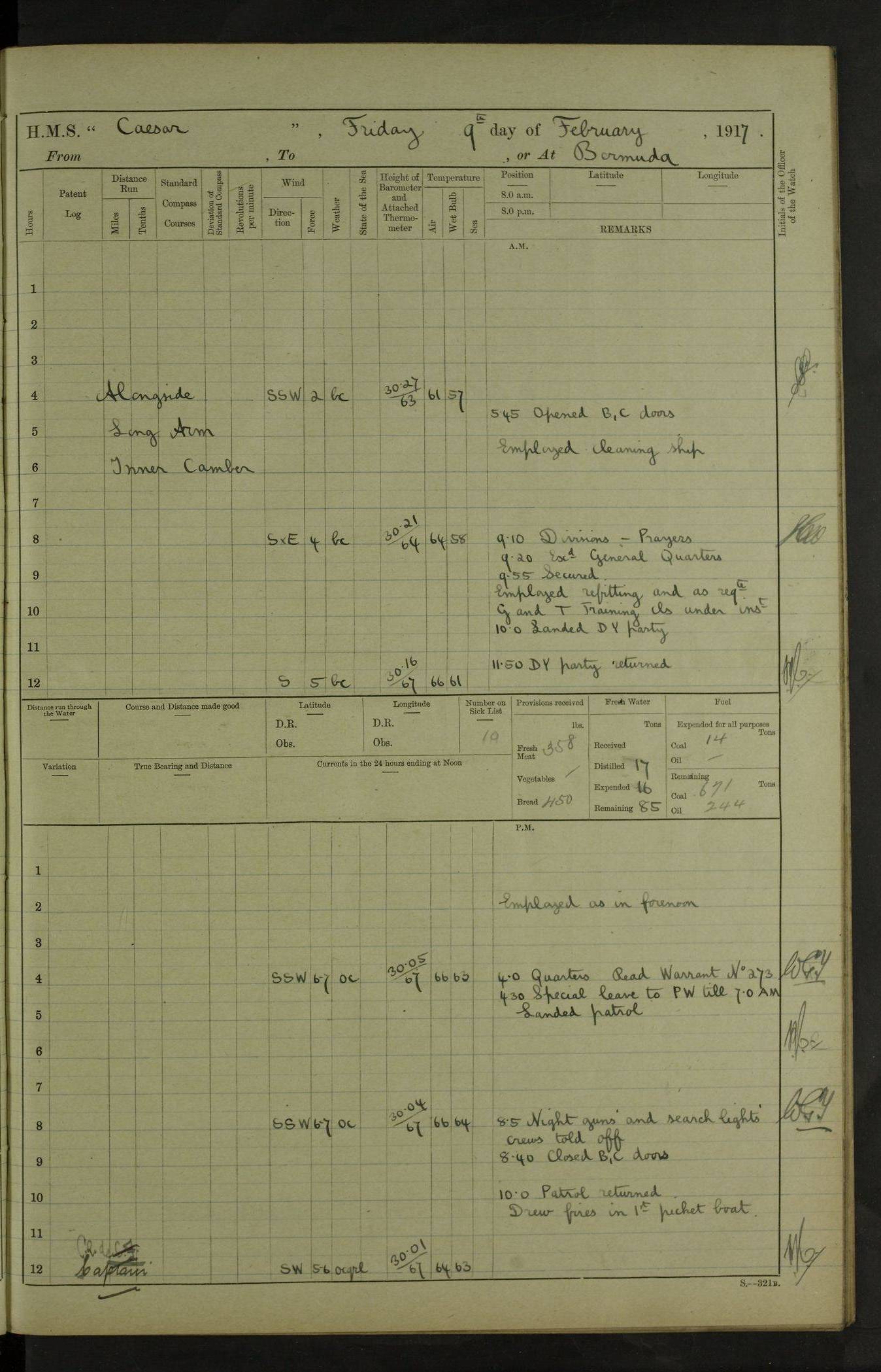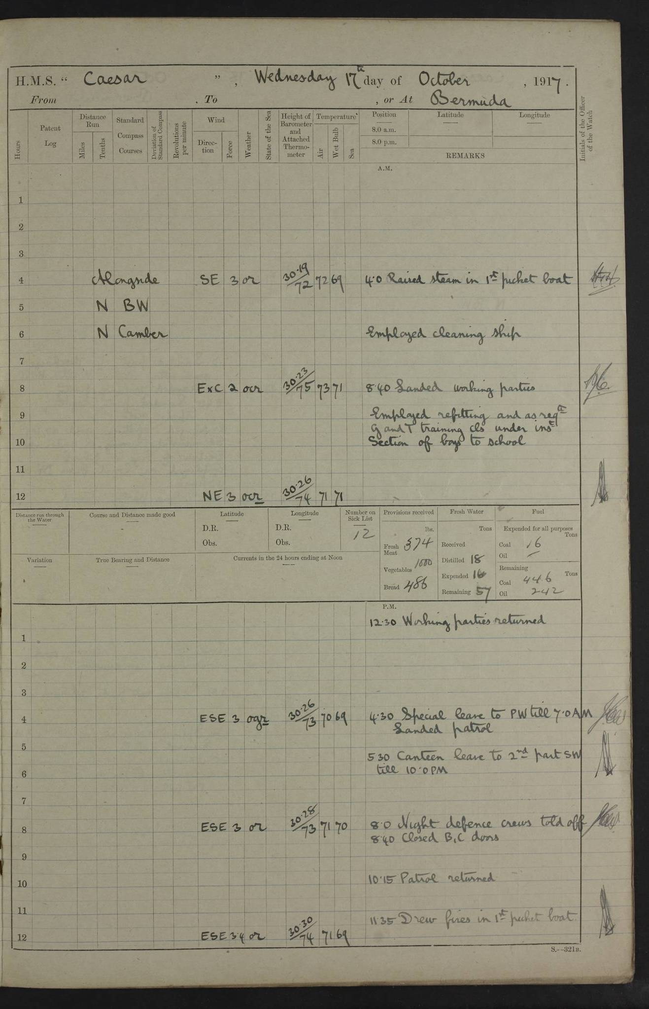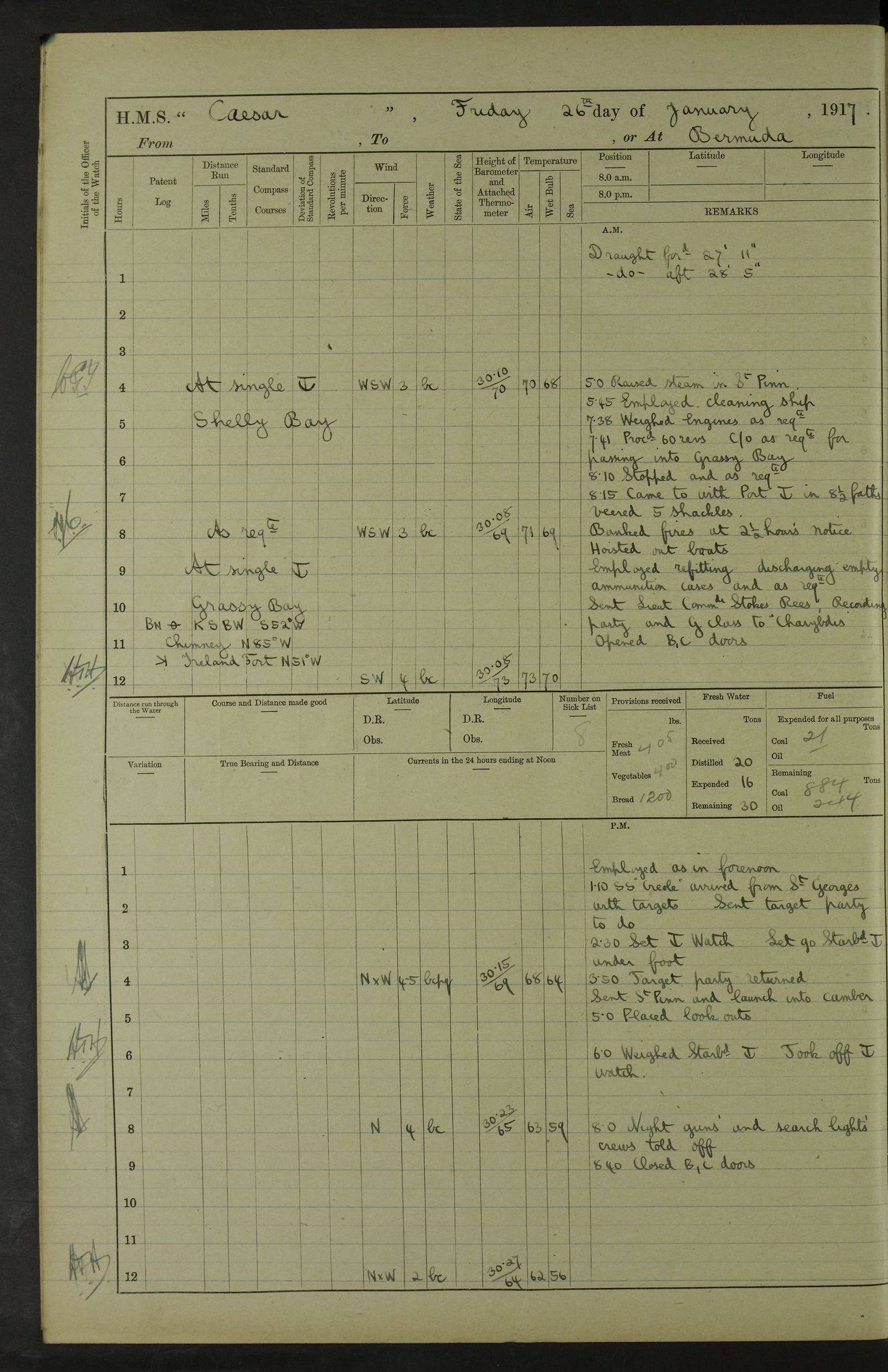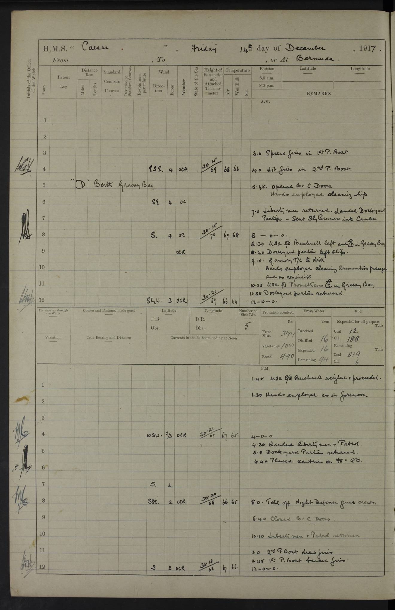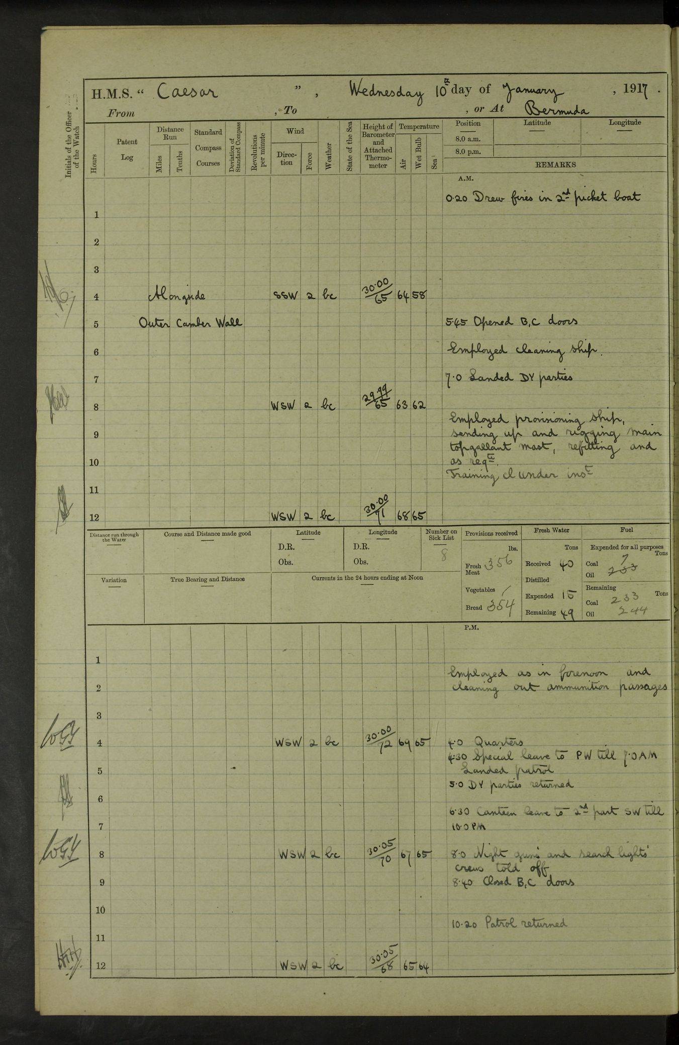 4caf84b6cadfd34197009939: (http://oldweather.s3.amazonaws.com/ADM53-36574/ADM 53-36574-145_1.jpg) 1 January 1917 At Bermuda Lat 32.32, Long -64.83 [Alongside Outer Camber Wall] 4.0am: Raised steam in first Picket boat. 6.0am: Employed cleaning ship. 7.0am: Landed Dockyard parties. Opened B, C doors. am: Employed drawing ammunition and stores, refitting and as requisite. 0.45pm: Paid monthly advance. pm: Employed as in forenoon. 4.30pm: Special leave to Starboard Watch till 7.0am. Landed patrol. 5.0pm: Dockyard parties returned. 6.30pm: Canteen leave to second part Port Watch till 10.0pm. 8.0pm: Night guns’ and search lights’ crews told off. 8.40pm: Closed B, C doors. 10.15pm: Patrol returned. 11.35pm: Drew fires in picket boats. [Number on sick list: 8] [Provisions received: Fresh Meat 340 lbs, Vegetables 2000 lbs, Bread 464 lbs] [Weather fine, though squally in early am. Noon temperature 63F] 4caf84b6cadfd3419700993a: (http://oldweather.s3.amazonaws.com/ADM53-36574/ADM 53-36574-146_0.jpg) 2 January 1917 [Year incorrectly shown as 1916] At Bermuda Lat 32.32, Long -64.83 [Alongside Outer Camber Wall] 4.30am: Raised steam in first picket boat. 6.30am: Landed working party to assist in repair of fenders in Inner Camber. 7.0am: Opened B, C doors. am: Employed embarking ammunition, refitting and as requisite. 11.45am: Working party returned. pm: Employed as in forenoon. 4.0pm: Quarters. 4.30pm: Special leave to Port Watch till 7.0am. Landed patrol. 6.30pm: Canteen leave to second part Starboard Watch till 10.0pm. 10.0pm: Patrol returned. 11.45pm: Drew fires in first picket boat. [Number on sick list: 8] [Provisions received: Fresh Meat 690 lbs, Bread 524 lbs] 4caf84b6cadfd3419700993b: (http://oldweather.s3.amazonaws.com/ADM53-36574/ADM 53-36574-146_1.jpg) 3 January 1917 [Year incorrectly shown as 1916] At Bermuda Lat 32.32, Long -64.83 [Alongside Outer Camber Wall] 7.0am: Opened B, C doors. Landed Dockyard parties. Sailed HMS “Antrim”. Landed Sanitary working party. am: Employed dismounting guns, drawing and returning stores, refitting and as requisite. Training class under instruction. 4.0pm: Quarters. Read Warrants No 268, 269. 4.30pm: Special leave to Starboard Watch till 7.0am. Landed patrol. 5.0pm: Dockyard and Working parties returned. 6.30pm: Canteen leave to first part Port Watch till 10.0pm. 8.5pm: Night guns’ and search lights’ crews told off. 10.0pm: Patrol returned. [Number on sick list: 8] [Provisions received: Fresh Meat 351 lbs, Vegetables 1000 lbs, Bread 512 lbs] 4caf84b6cadfd3419700993c: (http://oldweather.s3.amazonaws.com/ADM53-36574/ADM 53-36574-147_0.jpg) 4 January 1917 At Bermuda Lat 32.32, Long -64.83 [Alongside Outer Camber Wall] 7.0am: Landed Dockyard and Sanitary Working parties. am: Employed dismounting guns, sending up foretopmast, refitting and as requisite. Gunnery training class under instruction. 9.0am: Landed Working party to assist in repairs of fenders in Inner Camber. Discharged to SS “Kiakora” [probably Kaikoura] two ratings to form gun’s crew. 3.30pm: Working parties returned. 4.30pm: Special leave to Port Watch till 7.0am. Landed patrol. 6.30pm: Canteen leave to first part Starboard Watch till 10.0pm; 10.15pm: Patrol returned. [Number on sick list: 9] [Provisions received: Fresh Meat 353 lbs, Vegetables 1000 lbs, Bread 498 lbs] 4caf84b6cadfd3419700993d: (http://oldweather.s3.amazonaws.com/ADM53-36574/ADM 53-36574-147_1.jpg) 5 January 1917 At Bermuda Lat 32.32, Long -64.83 [Alongside Outer Camber Wall] 7.0am: Landed Dockyard and Sanitary Working parties. am: Employed refitting, dismounting guns and as requisite. Gunnery Training class under instruction. pm: Employed as in forenoon. 2.55pm: Arrived HMS “Antrim”. 4.30pm: Special leave to Starboard Watch till 7.0am. Landed patrol. 5.40pm: Drew fires in second picket boat. 6.30pm: Canteen leave to second part Port Watch till 10.0pm. 11.0pm: Patrol returned. 11.40pm: Drew fires in first picket boat. [Number on sick list: 9] [Provisions received: Fresh Meat 350 lbs, Vegetables 400 lbs, Bread 514 lbs] 4caf84b6cadfd3419700993e: (http://oldweather.s3.amazonaws.com/ADM53-36574/ADM 53-36574-148_0.jpg) 6 January 1917 At Bermuda Lat 32.32, Long -64.83 [Alongside Outer Camber Wall] 7.0am: Landed Dockyard parties. am: Employed cleaning ship, refitting, discharging ammunition from SS “Goodwood”, assisting in repairs to fenders of Inner Camber and as requisite. Training class under instruction. 11.45am: Dockyard parties returned. 0.30pm: Observed SS “Prophet” aground in Stag Channel. pm: Make and mend clothes. 1.30pm: Special leave to Port Watch till 7.0am and boys till 5.0pm. 3.0pm: SS “Prophet” refloated and proceeded to anchor. 4.0pm: Quarters. Read Warrant No 270. 4.30pm: Landed patrol. 5.0pm: Party employed discharging SS “Goodwood”. 6.30pm: Canteen leave to second part Starboard Watch till 10.0pm. 8.0pm: Night guns’ and search lights’ crews told off. 8.40pm: Closed B, C doors. 10.15pm: Patrol returned. [Number on sick list: 7] [Provisions received: Fresh Meat 361 lbs, Vegetables 2000 lbs, Bread 928 lbs] 4caf84b6cadfd3419700993f: (http://oldweather.s3.amazonaws.com/ADM53-36574/ADM 53-36574-148_1.jpg) 7 January 1917 At Bermuda Lat 32.32, Long -64.83 [Alongside Outer Camber Wall] 5.55am: Opened B, C doors. Employed cleaning ship. 8.30am: Landed Church parties, Presbyterians 18, Wesleyans 43, RCs 41. 9.30am: Divisions. 10.15am: Ship’s Company attended Divine Service at Dockyard Church. 11.20am: Church parties returned. 1.0pm: Special leave to Starboard Watch till 7.0am and boys will 5.0pm. 6.30pm: Canteen leave to first part Port Watch till 10.0pm. [Number on sick list: 8] [Weather fine, noon temperature 70F] 4caf84b6cadfd34197009940: (http://oldweather.s3.amazonaws.com/ADM53-36574/ADM 53-36574-149_0.jpg) 8 January 1917 At Bermuda Lat 32.32, Long -64.83 [Alongside Outer Camber Wall] 4.0am: Raised steam in first picket boat. 7.0am: Landed Dockyard parties. am: Employed dischargi