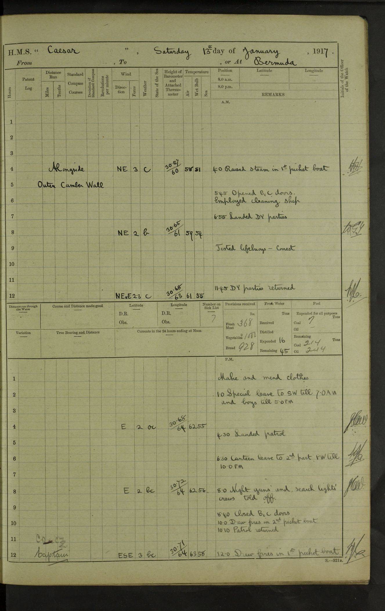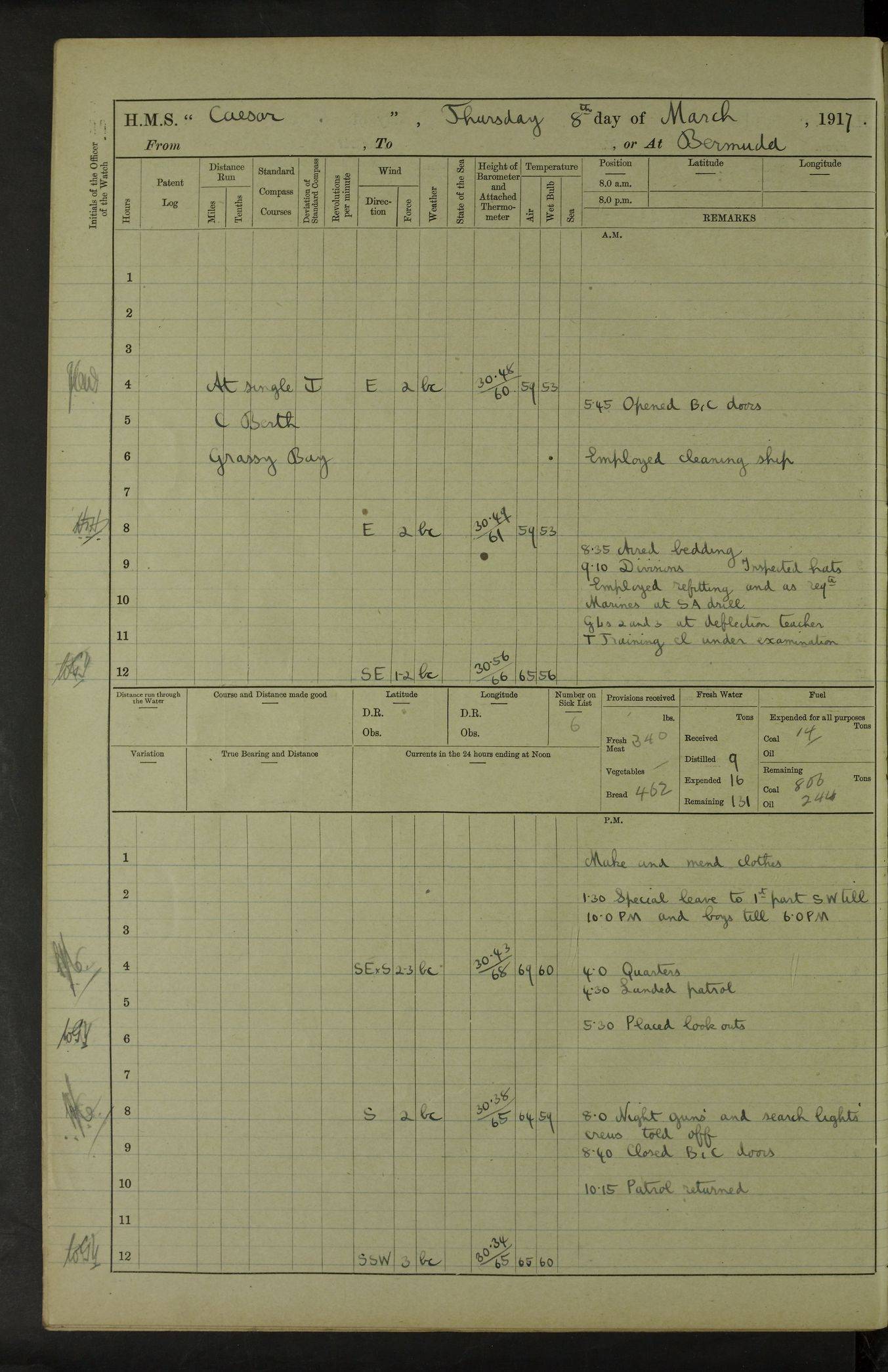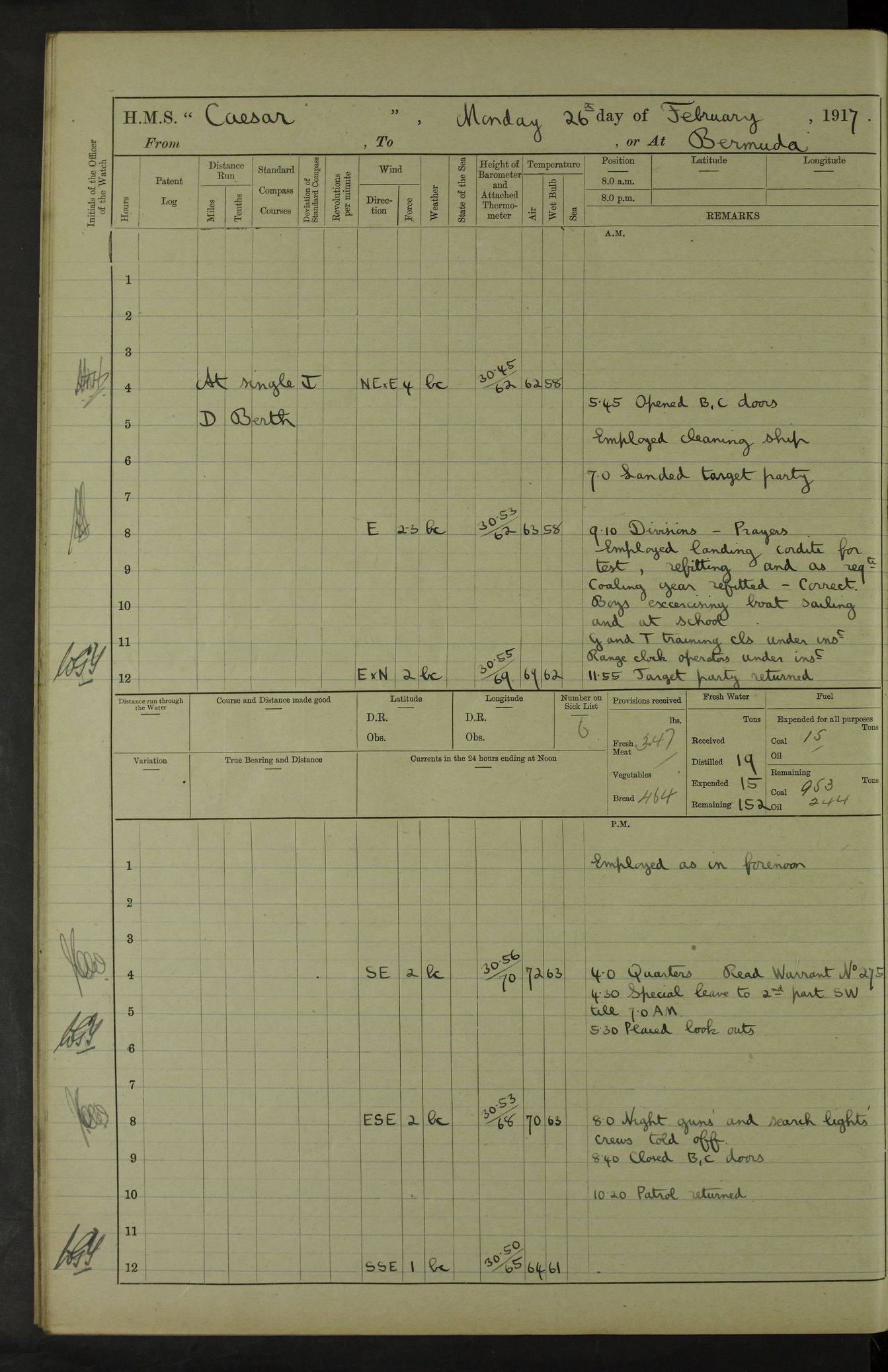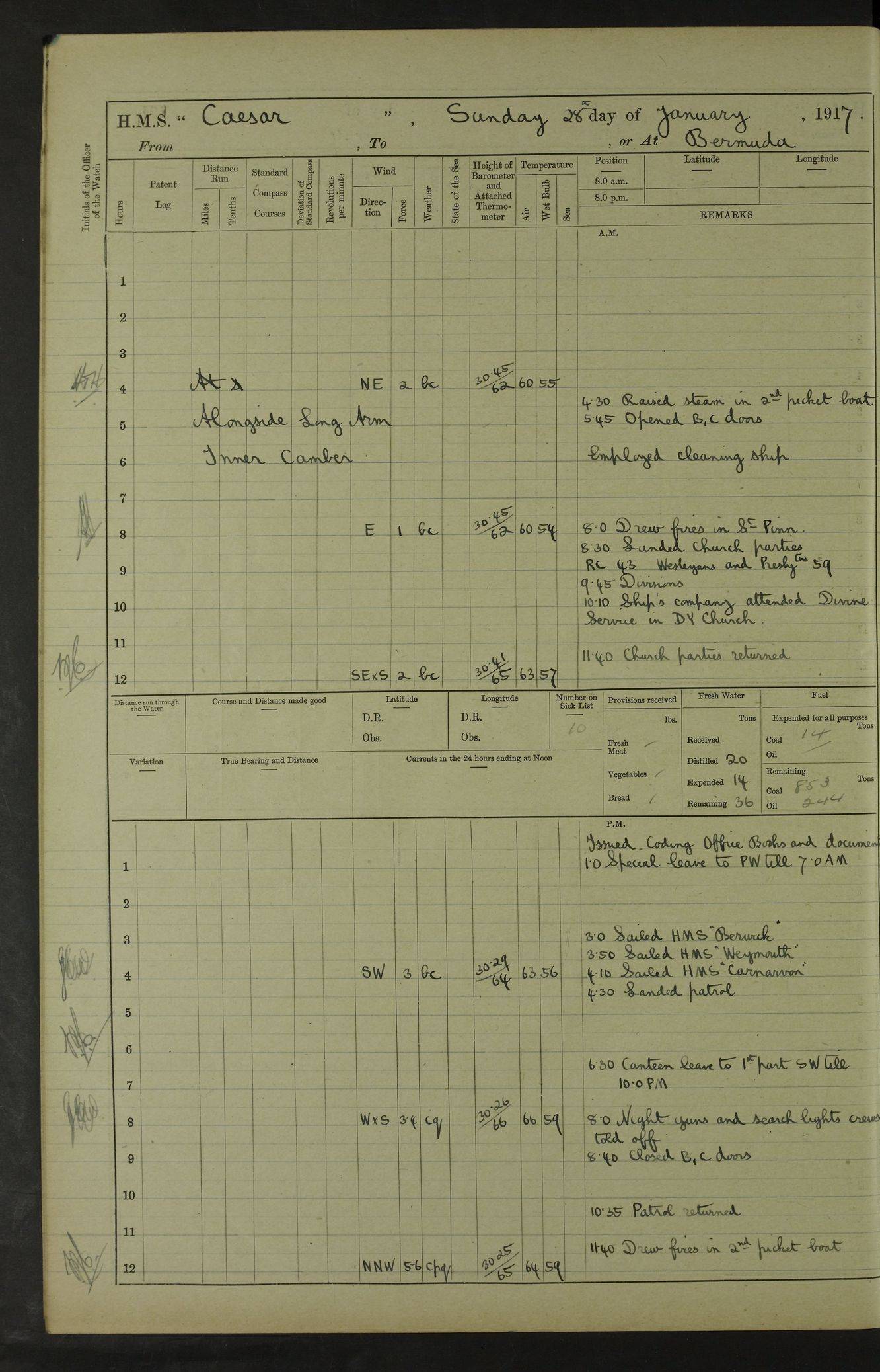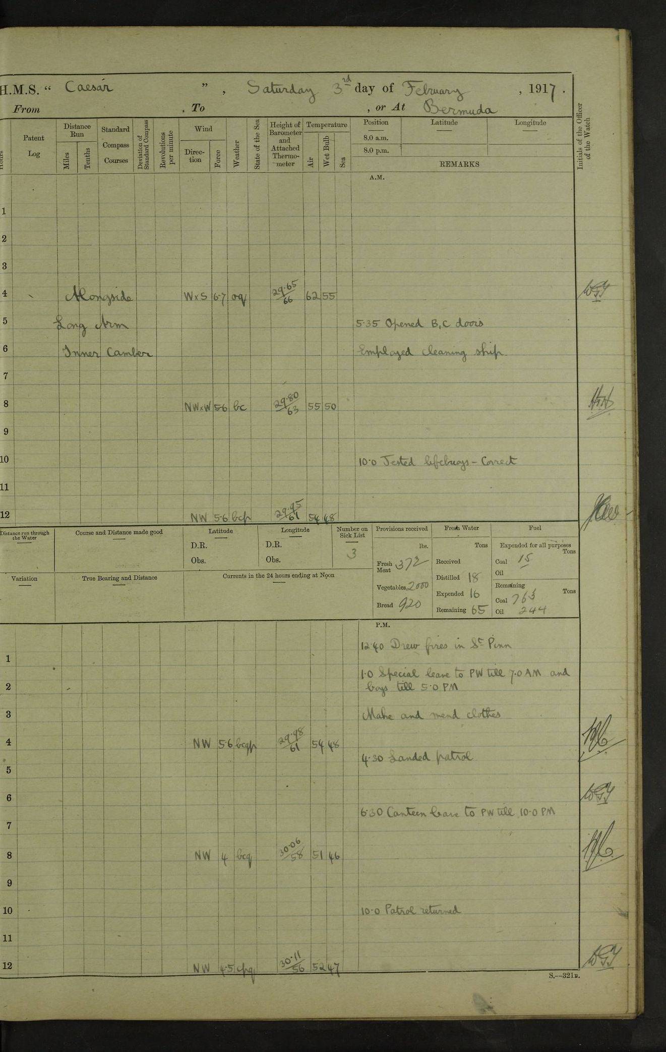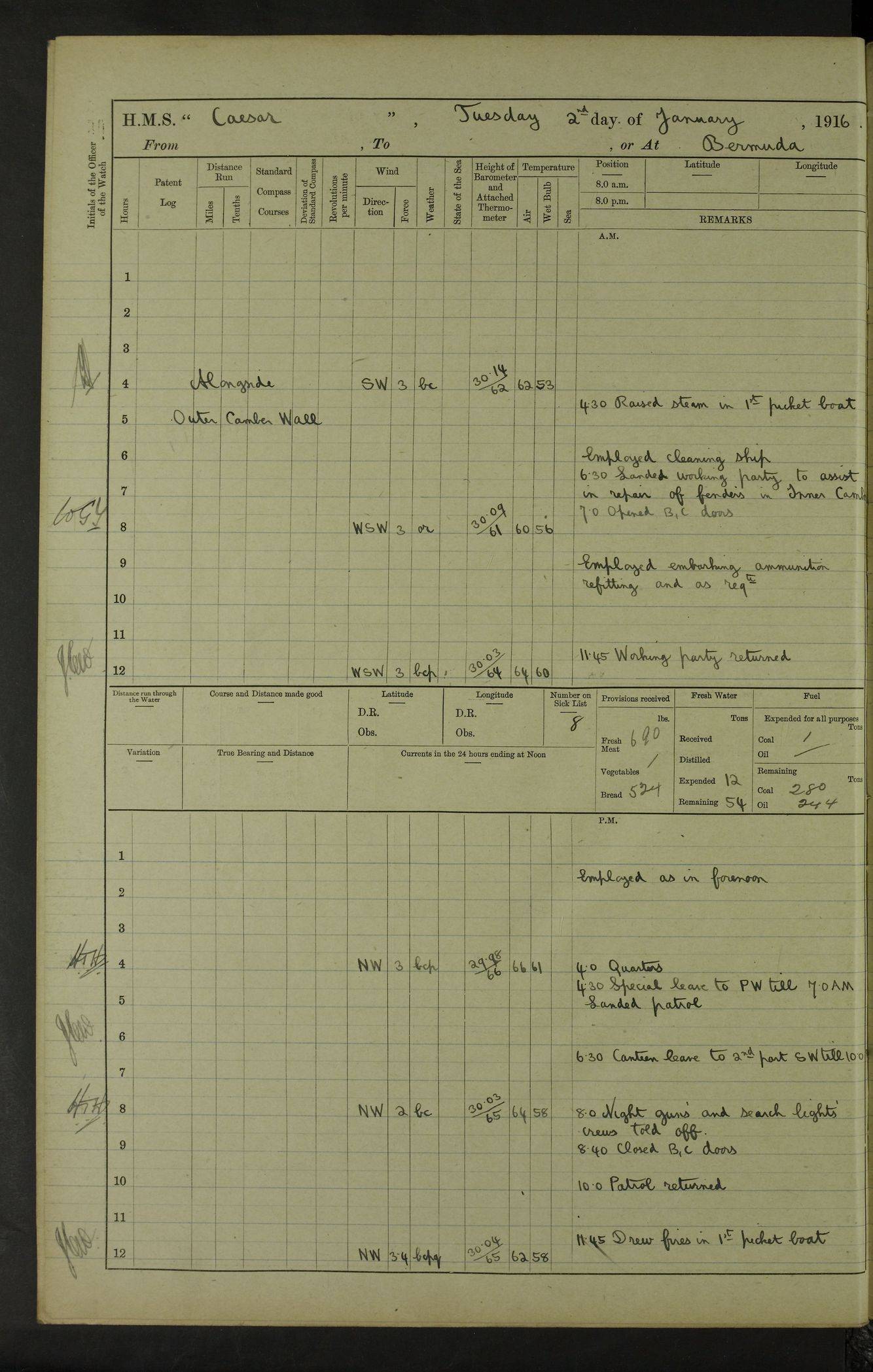 4caf84b6cadfd34197009939: (http://oldweather.s3.amazonaws.com/ADM53-36574/ADM 53-36574-145_1.jpg) 1 January 1917 At Bermuda Lat 32.32, Long -64.83 [Alongside Outer Camber Wall] 4.0am: Raised steam in first Picket boat. 6.0am: Employed cleaning ship. 7.0am: Landed Dockyard parties. Opened B, C doors. am: Employed drawing ammunition and stores, refitting and as requisite. 0.45pm: Paid monthly advance. pm: Employed as in forenoon. 4.30pm: Special leave to Starboard Watch till 7.0am. Landed patrol. 5.0pm: Dockyard parties returned. 6.30pm: Canteen leave to second part Port Watch till 10.0pm. 8.0pm: Night guns’ and search lights’ crews told off. 8.40pm: Closed B, C doors. 10.15pm: Patrol returned. 11.35pm: Drew fires in picket boats. [Number on sick list: 8] [Provisions received: Fresh Meat 340 lbs, Vegetables 2000 lbs, Bread 464 lbs] [Weather fine, though squally in early am. Noon temperature 63F] 4caf84b6cadfd3419700993a: (http://oldweather.s3.amazonaws.com/ADM53-36574/ADM 53-36574-146_0.jpg) 2 January 1917 [Year incorrectly shown as 1916] At Bermuda Lat 32.32, Long -64.83 [Alongside Outer Camber Wall] 4.30am: Raised steam in first picket boat. 6.30am: Landed working party to assist in repair of fenders in Inner Camber. 7.0am: Opened B, C doors. am: Employed embarking ammunition, refitting and as requisite. 11.45am: Working party returned. pm: Employed as in forenoon. 4.0pm: Quarters. 4.30pm: Special leave to Port Watch till 7.0am. Landed patrol. 6.30pm: Canteen leave to second part Starboard Watch till 10.0pm. 10.0pm: Patrol returned. 11.45pm: Drew fires in first picket boat. [Number on sick list: 8] [Provisions received: Fresh Meat 690 lbs, Bread 524 lbs] 4caf84b6cadfd3419700993b: (http://oldweather.s3.amazonaws.com/ADM53-36574/ADM 53-36574-146_1.jpg) 3 January 1917 [Year incorrectly shown as 1916] At Bermuda Lat 32.32, Long -64.83 [Alongside Outer Camber Wall] 7.0am: Opened B, C doors. Landed Dockyard parties. Sailed HMS “Antrim”. Landed Sanitary working party. am: Employed dismounting guns, drawing and returning stores, refitting and as requisite. Training class under instruction. 4.0pm: Quarters. Read Warrants No 268, 269. 4.30pm: Special leave to Starboard Watch till 7.0am. Landed patrol. 5.0pm: Dockyard and Working parties returned. 6.30pm: Canteen leave to first part Port Watch till 10.0pm. 8.5pm: Night guns’ and search lights’ crews told off. 10.0pm: Patrol returned. [Number on sick list: 8] [Provisions received: Fresh Meat 351 lbs, Vegetables 1000 lbs, Bread 512 lbs] 4caf84b6cadfd3419700993c: (http://oldweather.s3.amazonaws.com/ADM53-36574/ADM 53-36574-147_0.jpg) 4 January 1917 At Bermuda Lat 32.32, Long -64.83 [Alongside Outer Camber Wall] 7.0am: Landed Dockyard and Sanitary Working parties. am: Employed dismounting guns, sending up foretopmast, refitting and as requisite. Gunnery training class under instruction. 9.0am: Landed Working party to assist in repairs of fenders in Inner Camber. Discharged to SS “Kiakora” [probably Kaikoura] two ratings to form gun’s crew. 3.30pm: Working parties returned. 4.30pm: Special leave to Port Watch till 7.0am. Landed patrol. 6.30pm: Canteen leave to first part Starboard Watch till 10.0pm; 10.15pm: Patrol returned. [Number on sick list: 9] [Provisions received: Fresh Meat 353 lbs, Vegetables 1000 lbs, Bread 498 lbs] 4caf84b6cadfd3419700993d: (http://oldweather.s3.amazonaws.com/ADM53-36574/ADM 53-36574-147_1.jpg) 5 January 1917 At Bermuda Lat 32.32, Long -64.83 [Alongside Outer Camber Wall] 7.0am: Landed Dockyard and Sanitary Working parties. am: Employed refitting, dismounting guns and as requisite. Gunnery Training class under instruction. pm: Employed as in forenoon. 2.55pm: Arrived HMS “Antrim”. 4.30pm: Special leave to Starboard Watch till 7.0am. Landed patrol. 5.40pm: Drew fires in second picket boat. 6.30pm: Canteen leave to second part Port Watch till 10.0pm. 11.0pm: Patrol returned. 11.40pm: Drew fires in first picket boat. [Number on sick list: 9] [Provisions received: Fresh Meat 350 lbs, Vegetables 400 lbs, Bread 514 lbs] 4caf84b6cadfd3419700993e: (http://oldweather.s3.amazonaws.com/ADM53-36574/ADM 53-36574-148_0.jpg) 6 January 1917 At Bermuda Lat 32.32, Long -64.83 [Alongside Outer Camber Wall] 7.0am: Landed Dockyard parties. am: Employed cleaning ship, refitting, discharging ammunition from SS “Goodwood”, assisting in repairs to fenders of Inner Camber and as requisite. Training class under instruction. 11.45am: Dockyard parties returned. 0.30pm: Observed SS “Prophet” aground in Stag Channel. pm: Make and mend clothes. 1.30pm: Special leave to Port Watch till 7.0am and boys till 5.0pm. 3.0pm: SS “Prophet” refloated and proceeded to anchor. 4.0pm: Quarters. Read Warrant No 270. 4.30pm: Landed patrol. 5.0pm: Party employed discharging SS “Goodwood”. 6.30pm: Canteen leave to second part Starboard Watch till 10.0pm. 8.0pm: Night guns’ and search lights’ crews told off. 8.40pm: Closed B, C doors. 10.15pm: Patrol returned. [Number on sick list: 7] [Provisions received: Fresh Meat 361 lbs, Vegetables 2000 lbs, Bread 928 lbs] 4caf84b6cadfd3419700993f: (http://oldweather.s3.amazonaws.com/ADM53-36574/ADM 53-36574-148_1.jpg) 7 January 1917 At Bermuda Lat 32.32, Long -64.83 [Alongside Outer Camber Wall] 5.55am: Opened B, C doors. Employed cleaning ship. 8.30am: Landed Church parties, Presbyterians 18, Wesleyans 43, RCs 41. 9.30am: Divisions. 10.15am: Ship’s Company attended Divine Service at Dockyard Church. 11.20am: Church parties returned. 1.0pm: Special leave to Starboard Watch till 7.0am and boys will 5.0pm. 6.30pm: Canteen leave to first part Port Watch till 10.0pm. [Number on sick list: 8] [Weather fine, noon temperature 70F] 4caf84b6cadfd34197009940: (http://oldweather.s3.amazonaws.com/ADM53-36574/ADM 53-36574-149_0.jpg) 8 January 1917 At Bermuda Lat 32.32, Long -64.83 [Alongside Outer Camber Wall] 4.0am: Raised steam in first picket boat. 7.0am: Landed Dockyard parties. am: Employed dischargi
