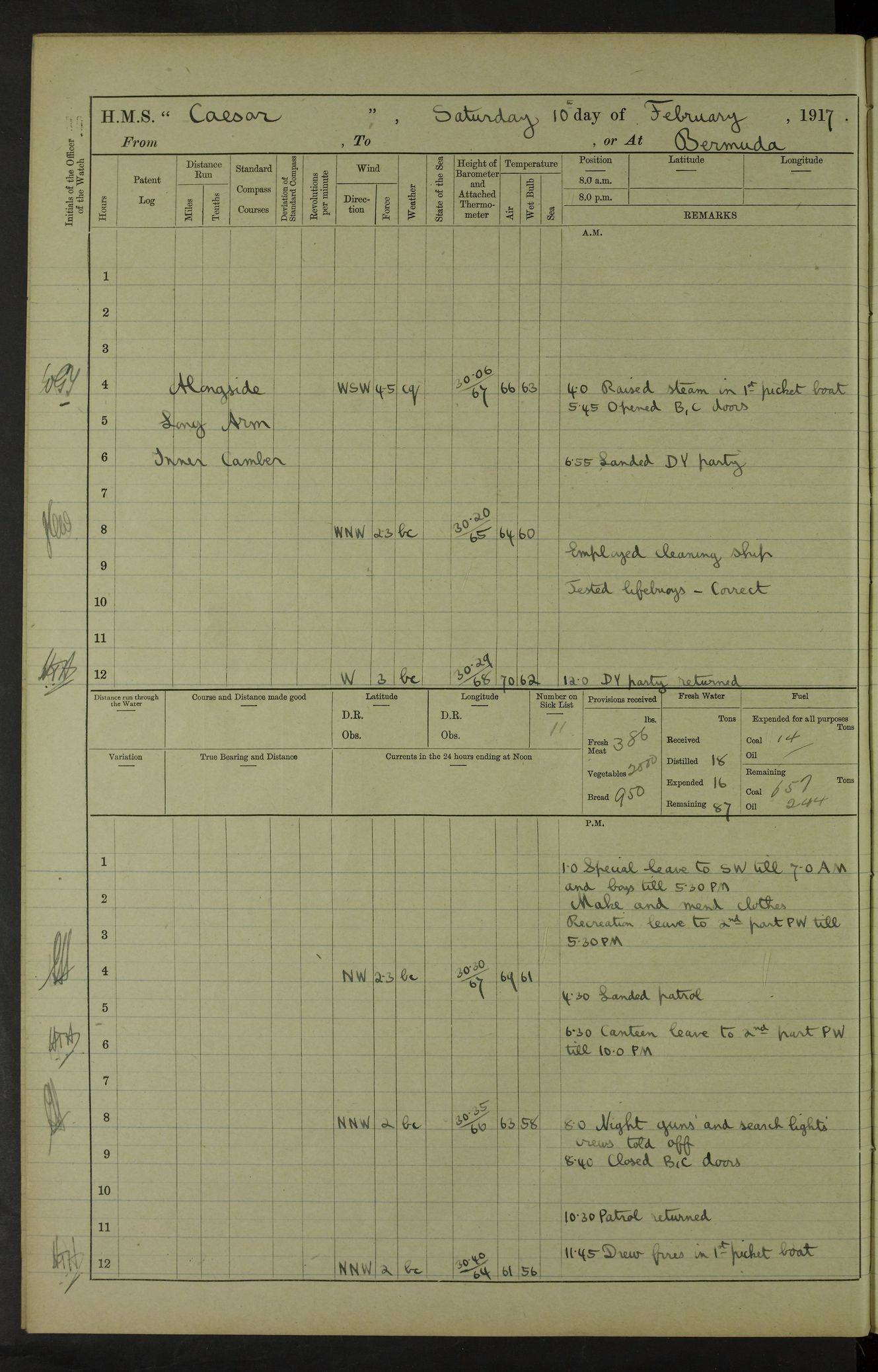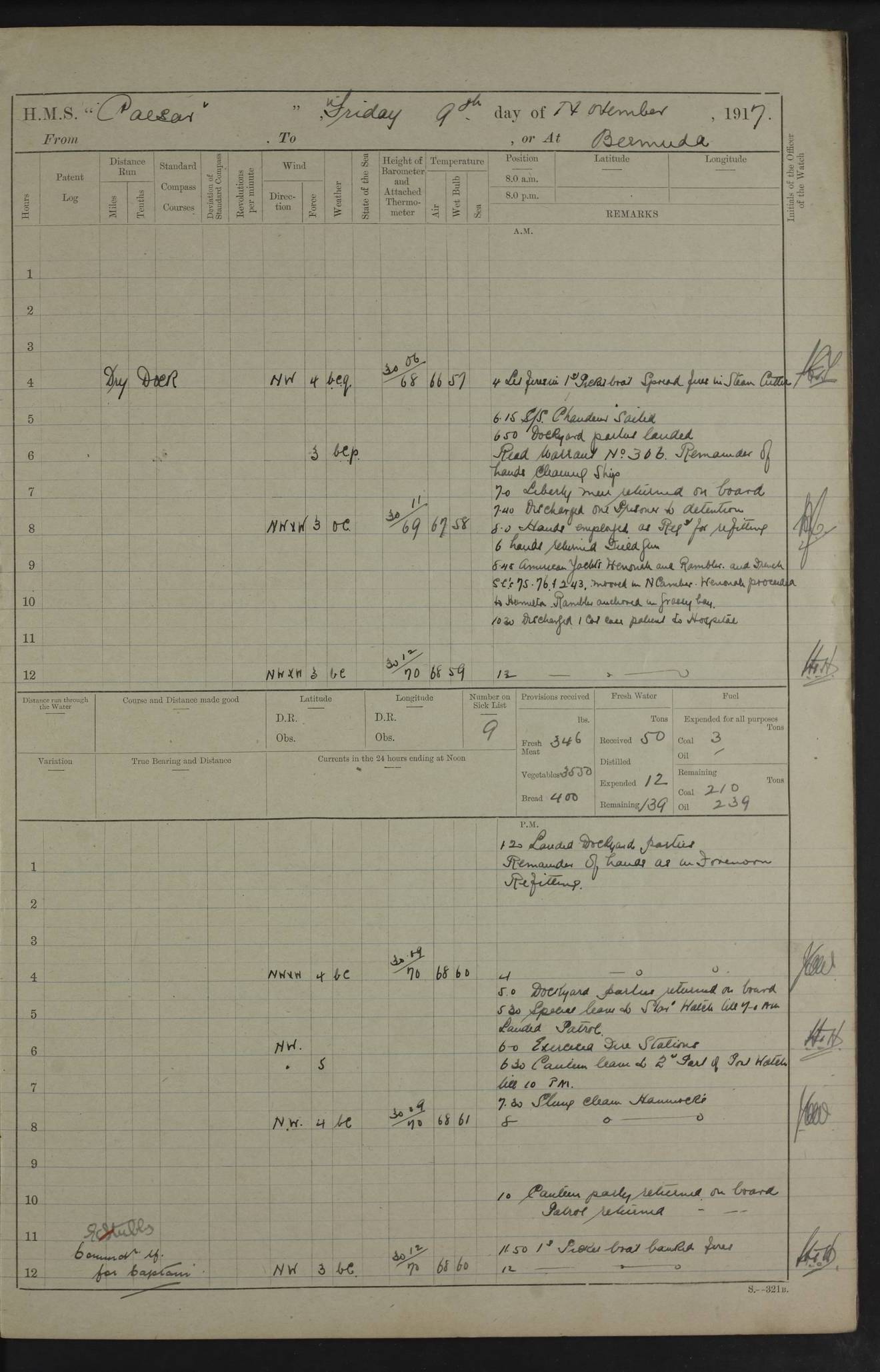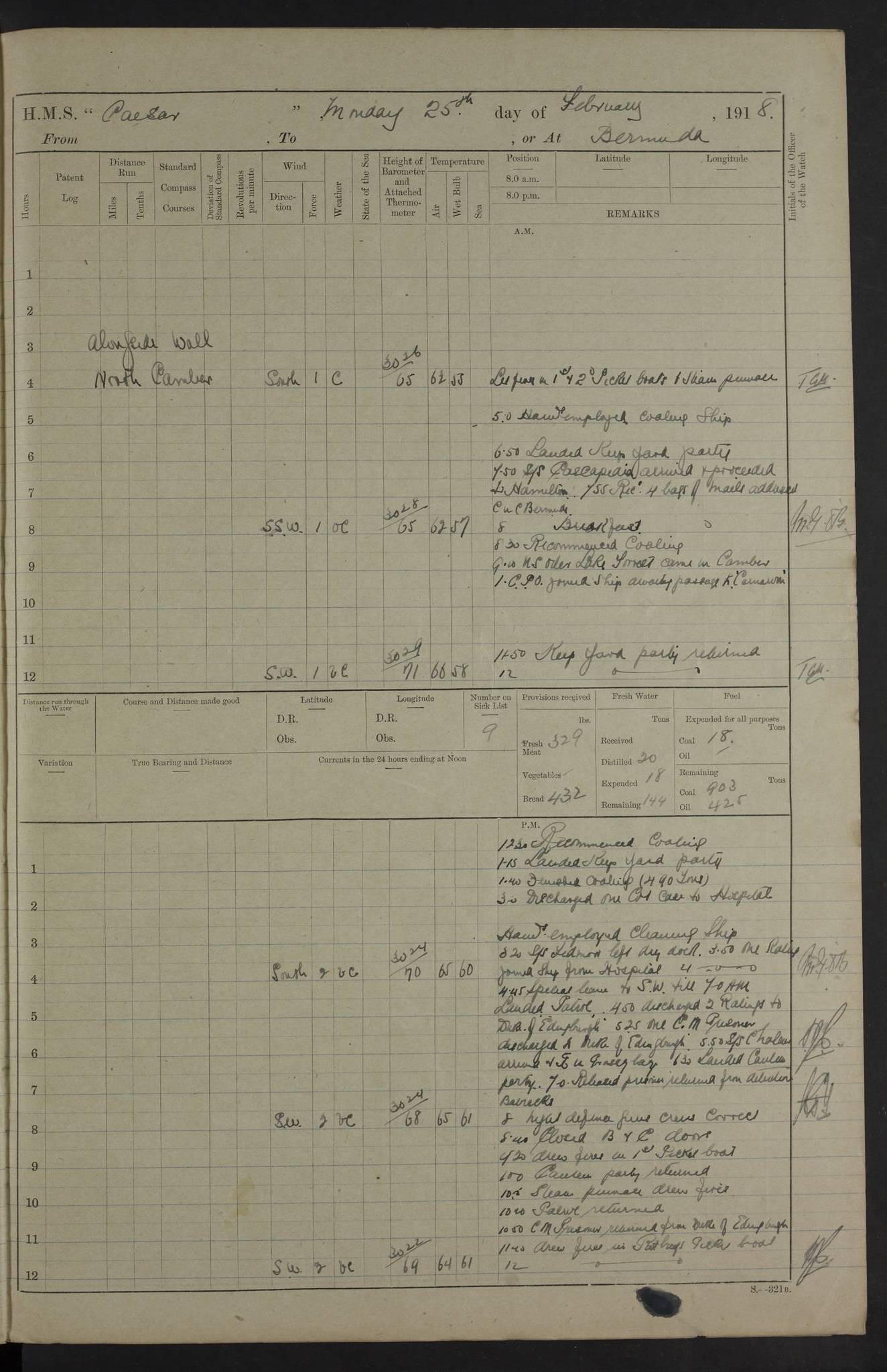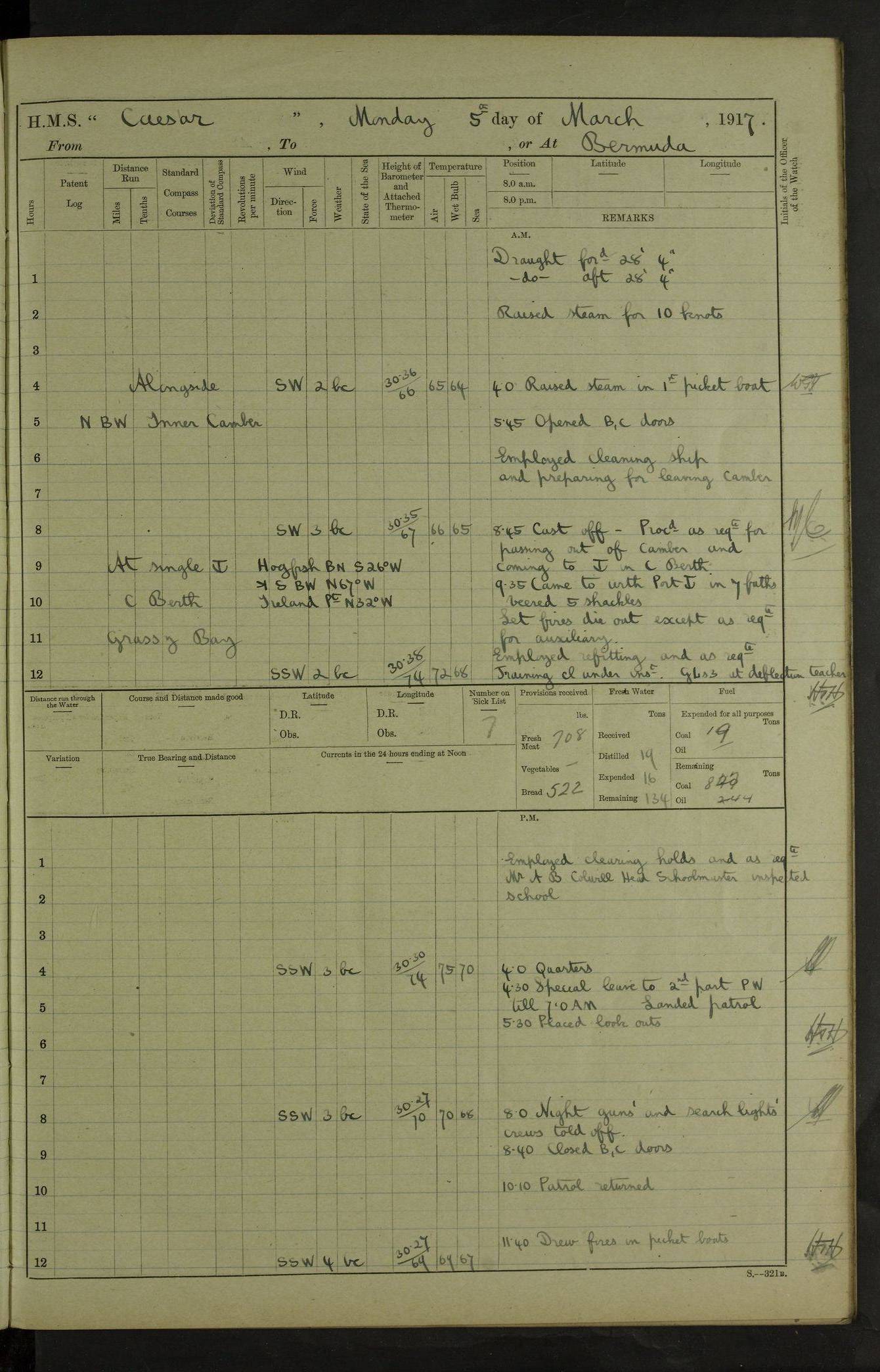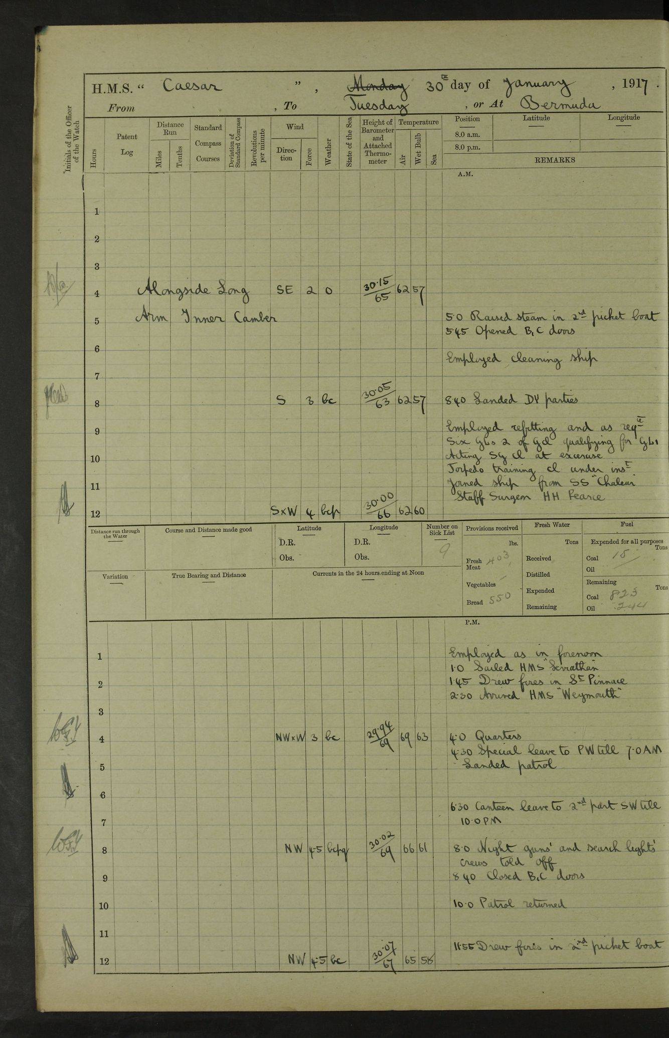 4caf84b6cadfd34197009939: (http://oldweather.s3.amazonaws.com/ADM53-36574/ADM 53-36574-145_1.jpg) 1 January 1917 At Bermuda Lat 32.32, Long -64.83 [Alongside Outer Camber Wall] 4.0am: Raised steam in first Picket boat. 6.0am: Employed cleaning ship. 7.0am: Landed Dockyard parties. Opened B, C doors. am: Employed drawing ammunition and stores, refitting and as requisite. 0.45pm: Paid monthly advance. pm: Employed as in forenoon. 4.30pm: Special leave to Starboard Watch till 7.0am. Landed patrol. 5.0pm: Dockyard parties returned. 6.30pm: Canteen leave to second part Port Watch till 10.0pm. 8.0pm: Night guns’ and search lights’ crews told off. 8.40pm: Closed B, C doors. 10.15pm: Patrol returned. 11.35pm: Drew fires in picket boats. [Number on sick list: 8] [Provisions received: Fresh Meat 340 lbs, Vegetables 2000 lbs, Bread 464 lbs] [Weather fine, though squally in early am. Noon temperature 63F] 4caf84b6cadfd3419700993a: (http://oldweather.s3.amazonaws.com/ADM53-36574/ADM 53-36574-146_0.jpg) 2 January 1917 [Year incorrectly shown as 1916] At Bermuda Lat 32.32, Long -64.83 [Alongside Outer Camber Wall] 4.30am: Raised steam in first picket boat. 6.30am: Landed working party to assist in repair of fenders in Inner Camber. 7.0am: Opened B, C doors. am: Employed embarking ammunition, refitting and as requisite. 11.45am: Working party returned. pm: Employed as in forenoon. 4.0pm: Quarters. 4.30pm: Special leave to Port Watch till 7.0am. Landed patrol. 6.30pm: Canteen leave to second part Starboard Watch till 10.0pm. 10.0pm: Patrol returned. 11.45pm: Drew fires in first picket boat. [Number on sick list: 8] [Provisions received: Fresh Meat 690 lbs, Bread 524 lbs] 4caf84b6cadfd3419700993b: (http://oldweather.s3.amazonaws.com/ADM53-36574/ADM 53-36574-146_1.jpg) 3 January 1917 [Year incorrectly shown as 1916] At Bermuda Lat 32.32, Long -64.83 [Alongside Outer Camber Wall] 7.0am: Opened B, C doors. Landed Dockyard parties. Sailed HMS “Antrim”. Landed Sanitary working party. am: Employed dismounting guns, drawing and returning stores, refitting and as requisite. Training class under instruction. 4.0pm: Quarters. Read Warrants No 268, 269. 4.30pm: Special leave to Starboard Watch till 7.0am. Landed patrol. 5.0pm: Dockyard and Working parties returned. 6.30pm: Canteen leave to first part Port Watch till 10.0pm. 8.5pm: Night guns’ and search lights’ crews told off. 10.0pm: Patrol returned. [Number on sick list: 8] [Provisions received: Fresh Meat 351 lbs, Vegetables 1000 lbs, Bread 512 lbs] 4caf84b6cadfd3419700993c: (http://oldweather.s3.amazonaws.com/ADM53-36574/ADM 53-36574-147_0.jpg) 4 January 1917 At Bermuda Lat 32.32, Long -64.83 [Alongside Outer Camber Wall] 7.0am: Landed Dockyard and Sanitary Working parties. am: Employed dismounting guns, sending up foretopmast, refitting and as requisite. Gunnery training class under instruction. 9.0am: Landed Working party to assist in repairs of fenders in Inner Camber. Discharged to SS “Kiakora” [probably Kaikoura] two ratings to form gun’s crew. 3.30pm: Working parties returned. 4.30pm: Special leave to Port Watch till 7.0am. Landed patrol. 6.30pm: Canteen leave to first part Starboard Watch till 10.0pm; 10.15pm: Patrol returned. [Number on sick list: 9] [Provisions received: Fresh Meat 353 lbs, Vegetables 1000 lbs, Bread 498 lbs] 4caf84b6cadfd3419700993d: (http://oldweather.s3.amazonaws.com/ADM53-36574/ADM 53-36574-147_1.jpg) 5 January 1917 At Bermuda Lat 32.32, Long -64.83 [Alongside Outer Camber Wall] 7.0am: Landed Dockyard and Sanitary Working parties. am: Employed refitting, dismounting guns and as requisite. Gunnery Training class under instruction. pm: Employed as in forenoon. 2.55pm: Arrived HMS “Antrim”. 4.30pm: Special leave to Starboard Watch till 7.0am. Landed patrol. 5.40pm: Drew fires in second picket boat. 6.30pm: Canteen leave to second part Port Watch till 10.0pm. 11.0pm: Patrol returned. 11.40pm: Drew fires in first picket boat. [Number on sick list: 9] [Provisions received: Fresh Meat 350 lbs, Vegetables 400 lbs, Bread 514 lbs] 4caf84b6cadfd3419700993e: (http://oldweather.s3.amazonaws.com/ADM53-36574/ADM 53-36574-148_0.jpg) 6 January 1917 At Bermuda Lat 32.32, Long -64.83 [Alongside Outer Camber Wall] 7.0am: Landed Dockyard parties. am: Employed cleaning ship, refitting, discharging ammunition from SS “Goodwood”, assisting in repairs to fenders of Inner Camber and as requisite. Training class under instruction. 11.45am: Dockyard parties returned. 0.30pm: Observed SS “Prophet” aground in Stag Channel. pm: Make and mend clothes. 1.30pm: Special leave to Port Watch till 7.0am and boys till 5.0pm. 3.0pm: SS “Prophet” refloated and proceeded to anchor. 4.0pm: Quarters. Read Warrant No 270. 4.30pm: Landed patrol. 5.0pm: Party employed discharging SS “Goodwood”. 6.30pm: Canteen leave to second part Starboard Watch till 10.0pm. 8.0pm: Night guns’ and search lights’ crews told off. 8.40pm: Closed B, C doors. 10.15pm: Patrol returned. [Number on sick list: 7] [Provisions received: Fresh Meat 361 lbs, Vegetables 2000 lbs, Bread 928 lbs] 4caf84b6cadfd3419700993f: (http://oldweather.s3.amazonaws.com/ADM53-36574/ADM 53-36574-148_1.jpg) 7 January 1917 At Bermuda Lat 32.32, Long -64.83 [Alongside Outer Camber Wall] 5.55am: Opened B, C doors. Employed cleaning ship. 8.30am: Landed Church parties, Presbyterians 18, Wesleyans 43, RCs 41. 9.30am: Divisions. 10.15am: Ship’s Company attended Divine Service at Dockyard Church. 11.20am: Church parties returned. 1.0pm: Special leave to Starboard Watch till 7.0am and boys will 5.0pm. 6.30pm: Canteen leave to first part Port Watch till 10.0pm. [Number on sick list: 8] [Weather fine, noon temperature 70F] 4caf84b6cadfd34197009940: (http://oldweather.s3.amazonaws.com/ADM53-36574/ADM 53-36574-149_0.jpg) 8 January 1917 At Bermuda Lat 32.32, Long -64.83 [Alongside Outer Camber Wall] 4.0am: Raised steam in first picket boat. 7.0am: Landed Dockyard parties. am: Employed dischargi