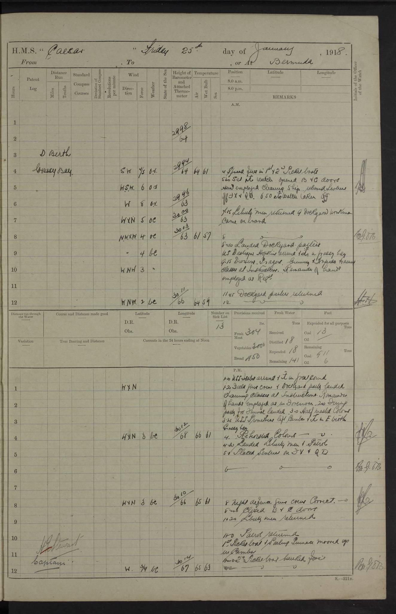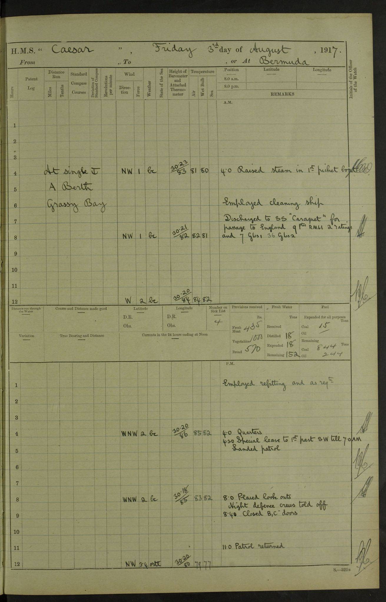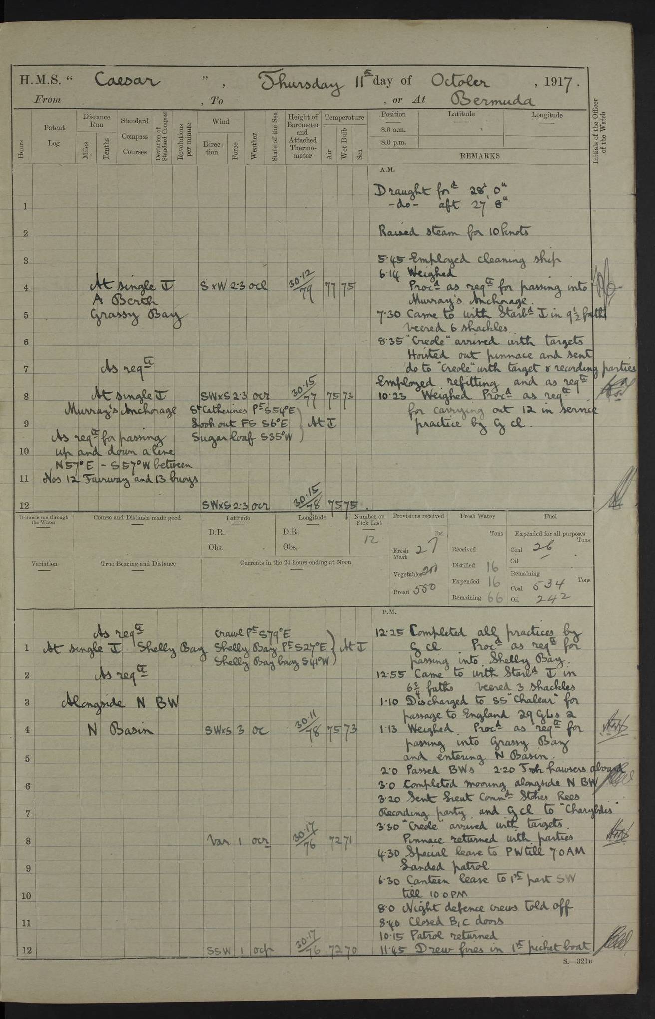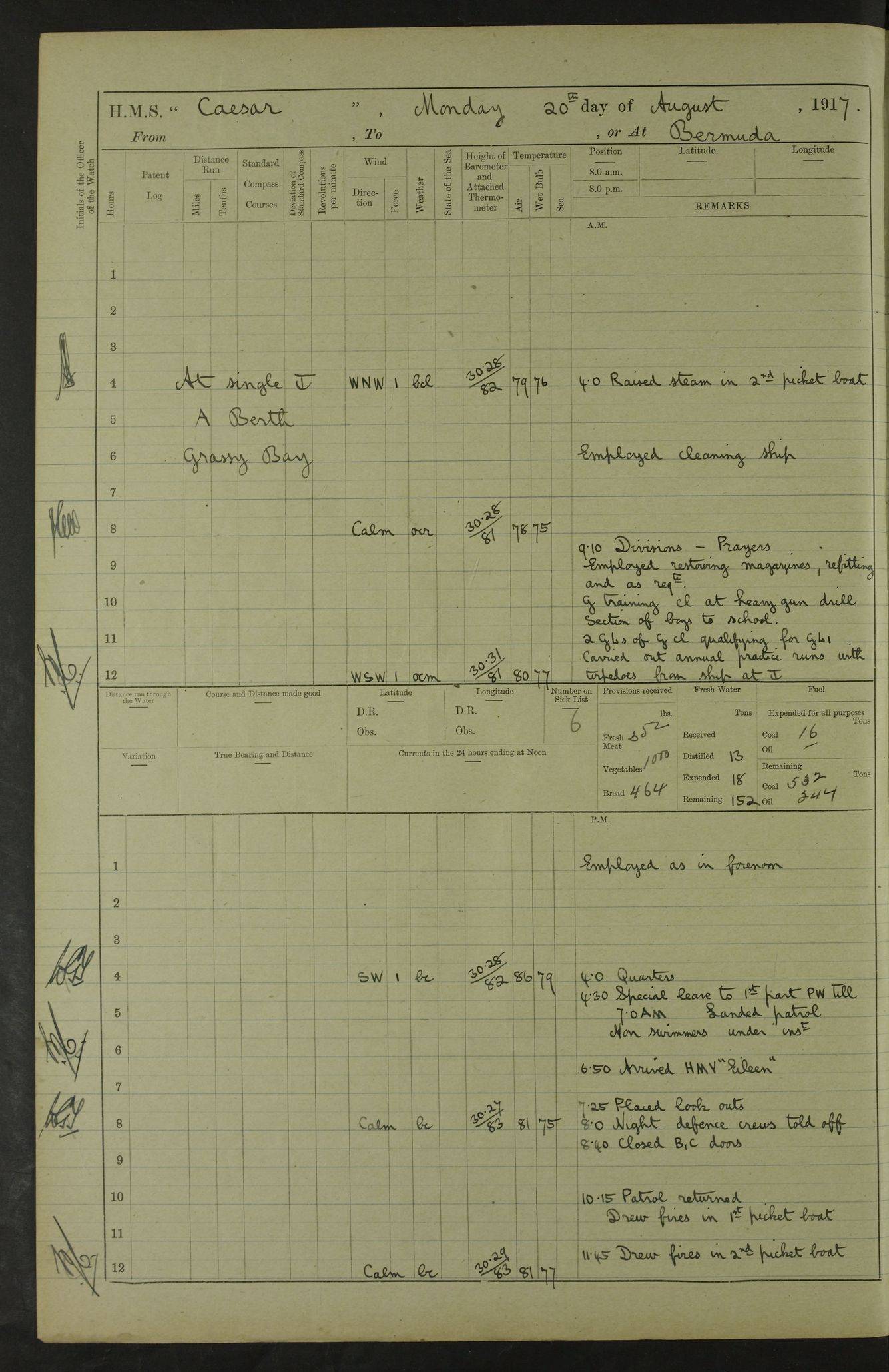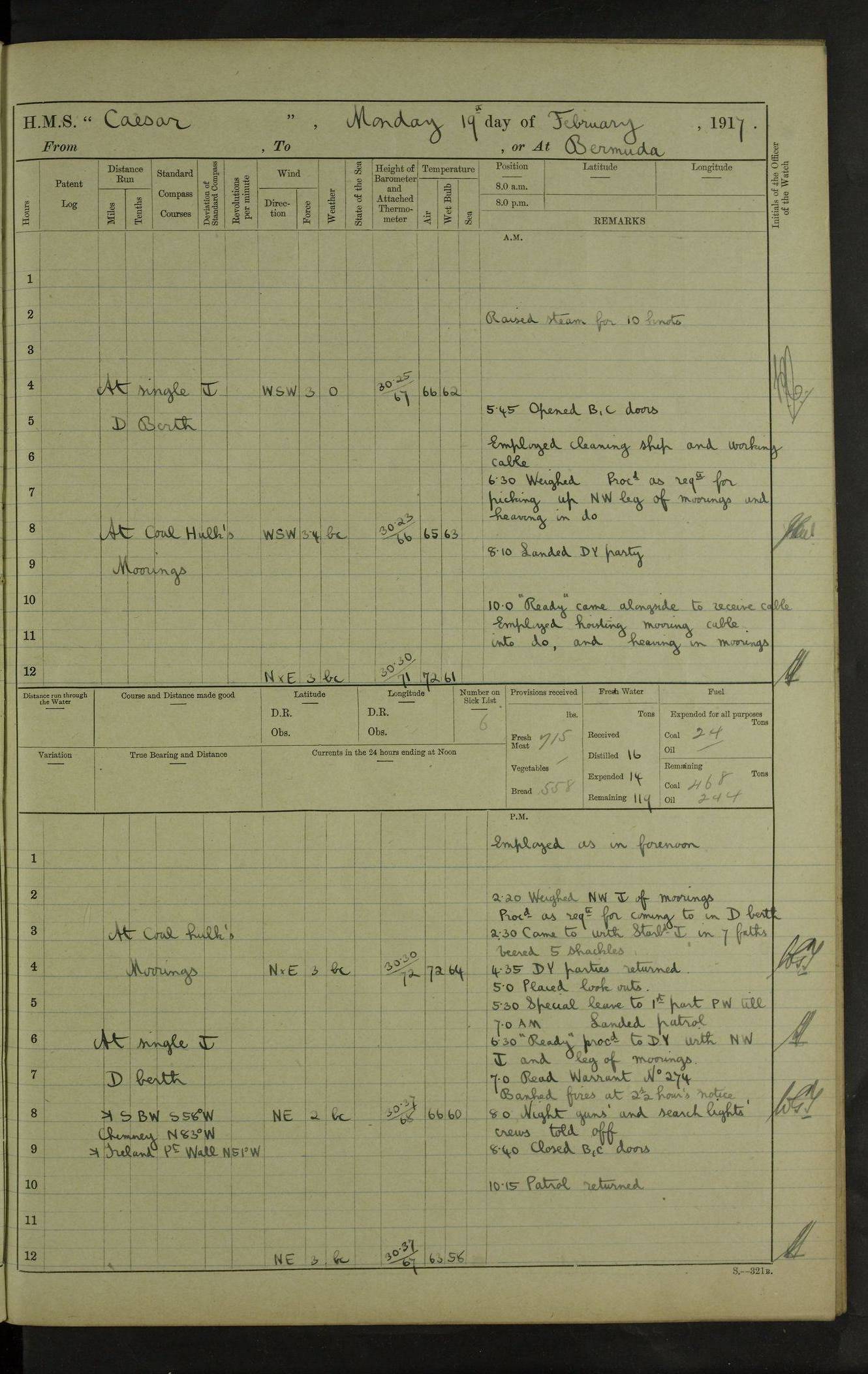4caf84b6cadfd34197009939: (http://oldweather.s3.amazonaws.com/ADM53-36574/ADM 53-36574-145_1.jpg) 1 January 1917 At Bermuda Lat 32.32, Long -64.83 [Alongside Outer Camber Wall] 4.0am: Raised steam in first Picket boat. 6.0am: Employed cleaning ship. 7.0am: Landed Dockyard parties. Opened B, C doors. am: Employed drawing ammunition and stores, refitting and as requisite. 0.45pm: Paid monthly advance. pm: Employed as in forenoon. 4.30pm: Special leave to Starboard Watch till 7.0am. Landed patrol. 5.0pm: Dockyard parties returned. 6.30pm: Canteen leave to second part Port Watch till 10.0pm. 8.0pm: Night guns’ and search lights’ crews told off. 8.40pm: Closed B, C doors. 10.15pm: Patrol returned. 11.35pm: Drew fires in picket boats. [Number on sick list: 8] [Provisions received: Fresh Meat 340 lbs, Vegetables 2000 lbs, Bread 464 lbs] [Weather fine, though squally in early am. Noon temperature 63F] 4caf84b6cadfd3419700993a: (http://oldweather.s3.amazonaws.com/ADM53-36574/ADM 53-36574-146_0.jpg) 2 January 1917 [Year incorrectly shown as 1916] At Bermuda Lat 32.32, Long -64.83 [Alongside Outer Camber Wall] 4.30am: Raised steam in first picket boat. 6.30am: Landed working party to assist in repair of fenders in Inner Camber. 7.0am: Opened B, C doors. am: Employed embarking ammunition, refitting and as requisite. 11.45am: Working party returned. pm: Employed as in forenoon. 4.0pm: Quarters. 4.30pm: Special leave to Port Watch till 7.0am. Landed patrol. 6.30pm: Canteen leave to second part Starboard Watch till 10.0pm. 10.0pm: Patrol returned. 11.45pm: Drew fires in first picket boat. [Number on sick list: 8] [Provisions received: Fresh Meat 690 lbs, Bread 524 lbs] 4caf84b6cadfd3419700993b: (http://oldweather.s3.amazonaws.com/ADM53-36574/ADM 53-36574-146_1.jpg) 3 January 1917 [Year incorrectly shown as 1916] At Bermuda Lat 32.32, Long -64.83 [Alongside Outer Camber Wall] 7.0am: Opened B, C doors. Landed Dockyard parties. Sailed HMS “Antrim”. Landed Sanitary working party. am: Employed dismounting guns, drawing and returning stores, refitting and as requisite. Training class under instruction. 4.0pm: Quarters. Read Warrants No 268, 269. 4.30pm: Special leave to Starboard Watch till 7.0am. Landed patrol. 5.0pm: Dockyard and Working parties returned. 6.30pm: Canteen leave to first part Port Watch till 10.0pm. 8.5pm: Night guns’ and search lights’ crews told off. 10.0pm: Patrol returned. [Number on sick list: 8] [Provisions received: Fresh Meat 351 lbs, Vegetables 1000 lbs, Bread 512 lbs] 4caf84b6cadfd3419700993c: (http://oldweather.s3.amazonaws.com/ADM53-36574/ADM 53-36574-147_0.jpg) 4 January 1917 At Bermuda Lat 32.32, Long -64.83 [Alongside Outer Camber Wall] 7.0am: Landed Dockyard and Sanitary Working parties. am: Employed dismounting guns, sending up foretopmast, refitting and as requisite. Gunnery training class under instruction. 9.0am: Landed Working party to assist in repairs of fenders in Inner Camber. Discharged to SS “Kiakora” [probably Kaikoura] two ratings to form gun’s crew. 3.30pm: Working parties returned. 4.30pm: Special leave to Port Watch till 7.0am. Landed patrol. 6.30pm: Canteen leave to first part Starboard Watch till 10.0pm; 10.15pm: Patrol returned. [Number on sick list: 9] [Provisions received: Fresh Meat 353 lbs, Vegetables 1000 lbs, Bread 498 lbs] 4caf84b6cadfd3419700993d: (http://oldweather.s3.amazonaws.com/ADM53-36574/ADM 53-36574-147_1.jpg) 5 January 1917 At Bermuda Lat 32.32, Long -64.83 [Alongside Outer Camber Wall] 7.0am: Landed Dockyard and Sanitary Working parties. am: Employed refitting, dismounting guns and as requisite. Gunnery Training class under instruction. pm: Employed as in forenoon. 2.55pm: Arrived HMS “Antrim”. 4.30pm: Special leave to Starboard Watch till 7.0am. Landed patrol. 5.40pm: Drew fires in second picket boat. 6.30pm: Canteen leave to second part Port Watch till 10.0pm. 11.0pm: Patrol returned. 11.40pm: Drew fires in first picket boat. [Number on sick list: 9] [Provisions received: Fresh Meat 350 lbs, Vegetables 400 lbs, Bread 514 lbs] 4caf84b6cadfd3419700993e: (http://oldweather.s3.amazonaws.com/ADM53-36574/ADM 53-36574-148_0.jpg) 6 January 1917 At Bermuda Lat 32.32, Long -64.83 [Alongside Outer Camber Wall] 7.0am: Landed Dockyard parties. am: Employed cleaning ship, refitting, discharging ammunition from SS “Goodwood”, assisting in repairs to fenders of Inner Camber and as requisite. Training class under instruction. 11.45am: Dockyard parties returned. 0.30pm: Observed SS “Prophet” aground in Stag Channel. pm: Make and mend clothes. 1.30pm: Special leave to Port Watch till 7.0am and boys till 5.0pm. 3.0pm: SS “Prophet” refloated and proceeded to anchor. 4.0pm: Quarters. Read Warrant No 270. 4.30pm: Landed patrol. 5.0pm: Party employed discharging SS “Goodwood”. 6.30pm: Canteen leave to second part Starboard Watch till 10.0pm. 8.0pm: Night guns’ and search lights’ crews told off. 8.40pm: Closed B, C doors. 10.15pm: Patrol returned. [Number on sick list: 7] [Provisions received: Fresh Meat 361 lbs, Vegetables 2000 lbs, Bread 928 lbs] 4caf84b6cadfd3419700993f: (http://oldweather.s3.amazonaws.com/ADM53-36574/ADM 53-36574-148_1.jpg) 7 January 1917 At Bermuda Lat 32.32, Long -64.83 [Alongside Outer Camber Wall] 5.55am: Opened B, C doors. Employed cleaning ship. 8.30am: Landed Church parties, Presbyterians 18, Wesleyans 43, RCs 41. 9.30am: Divisions. 10.15am: Ship’s Company attended Divine Service at Dockyard Church. 11.20am: Church parties returned. 1.0pm: Special leave to Starboard Watch till 7.0am and boys will 5.0pm. 6.30pm: Canteen leave to first part Port Watch till 10.0pm. [Number on sick list: 8] [Weather fine, noon temperature 70F] 4caf84b6cadfd34197009940: (http://oldweather.s3.amazonaws.com/ADM53-36574/ADM 53-36574-149_0.jpg) 8 January 1917 At Bermuda Lat 32.32, Long -64.83 [Alongside Outer Camber Wall] 4.0am: Raised steam in first picket boat. 7.0am: Landed Dockyard parties. am: Employed dischargi