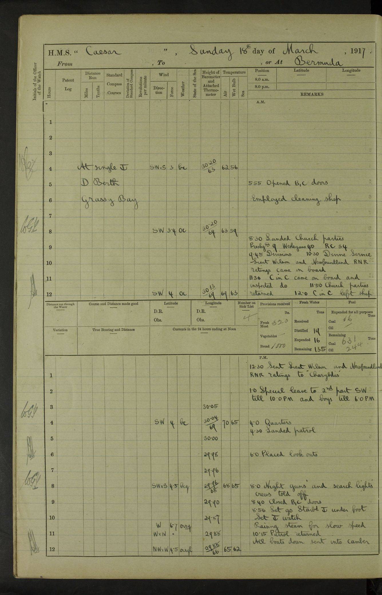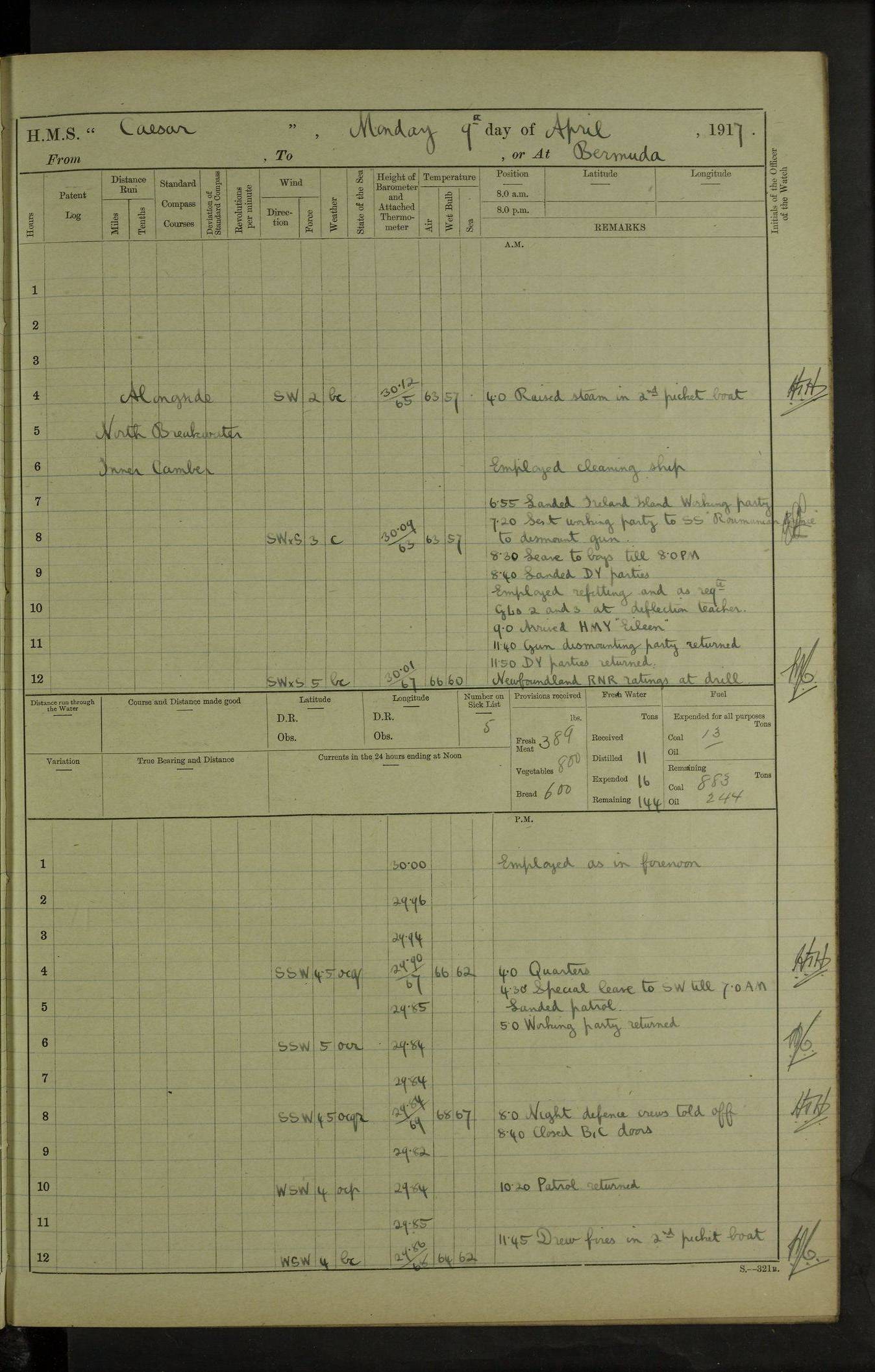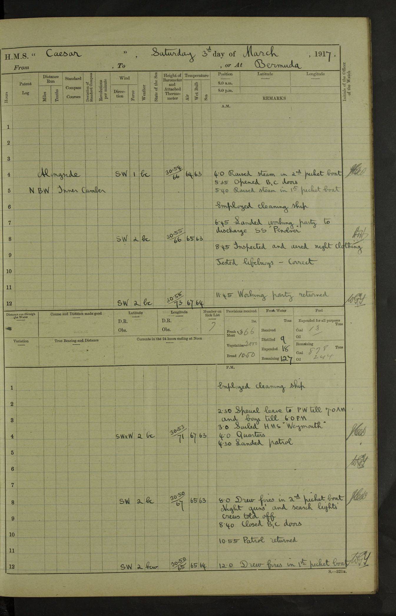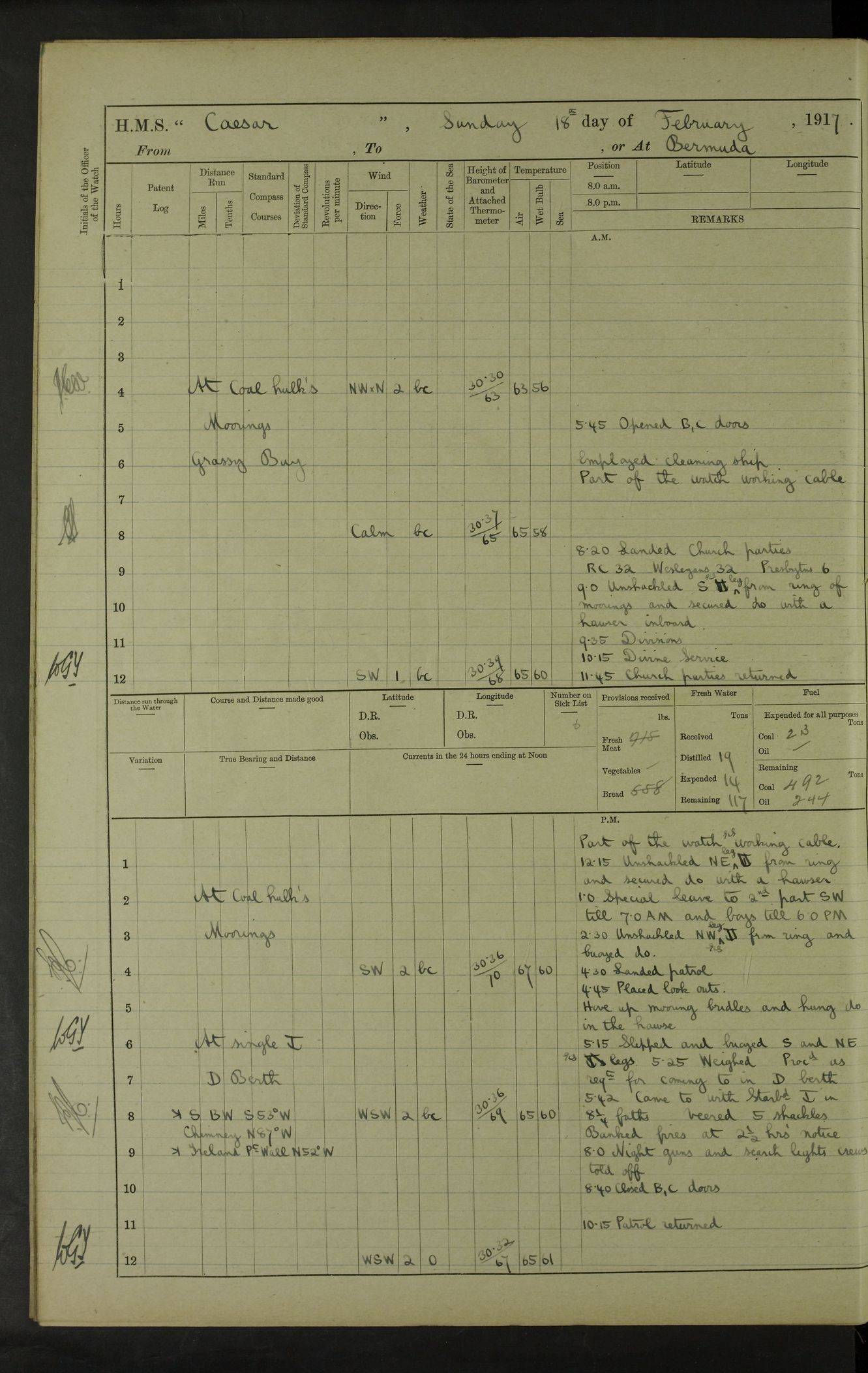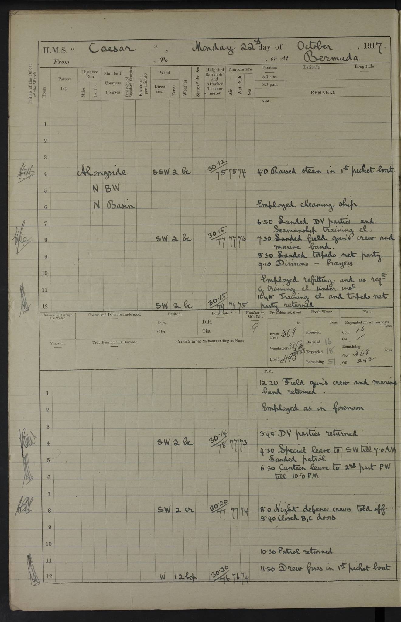 4caf84b6cadfd34197009939: (http://oldweather.s3.amazonaws.com/ADM53-36574/ADM 53-36574-145_1.jpg) 1 January 1917 At Bermuda Lat 32.32, Long -64.83 [Alongside Outer Camber Wall] 4.0am: Raised steam in first Picket boat. 6.0am: Employed cleaning ship. 7.0am: Landed Dockyard parties. Opened B, C doors. am: Employed drawing ammunition and stores, refitting and as requisite. 0.45pm: Paid monthly advance. pm: Employed as in forenoon. 4.30pm: Special leave to Starboard Watch till 7.0am. Landed patrol. 5.0pm: Dockyard parties returned. 6.30pm: Canteen leave to second part Port Watch till 10.0pm. 8.0pm: Night guns’ and search lights’ crews told off. 8.40pm: Closed B, C doors. 10.15pm: Patrol returned. 11.35pm: Drew fires in picket boats. [Number on sick list: 8] [Provisions received: Fresh Meat 340 lbs, Vegetables 2000 lbs, Bread 464 lbs] [Weather fine, though squally in early am. Noon temperature 63F] 4caf84b6cadfd3419700993a: (http://oldweather.s3.amazonaws.com/ADM53-36574/ADM 53-36574-146_0.jpg) 2 January 1917 [Year incorrectly shown as 1916] At Bermuda Lat 32.32, Long -64.83 [Alongside Outer Camber Wall] 4.30am: Raised steam in first picket boat. 6.30am: Landed working party to assist in repair of fenders in Inner Camber. 7.0am: Opened B, C doors. am: Employed embarking ammunition, refitting and as requisite. 11.45am: Working party returned. pm: Employed as in forenoon. 4.0pm: Quarters. 4.30pm: Special leave to Port Watch till 7.0am. Landed patrol. 6.30pm: Canteen leave to second part Starboard Watch till 10.0pm. 10.0pm: Patrol returned. 11.45pm: Drew fires in first picket boat. [Number on sick list: 8] [Provisions received: Fresh Meat 690 lbs, Bread 524 lbs] 4caf84b6cadfd3419700993b: (http://oldweather.s3.amazonaws.com/ADM53-36574/ADM 53-36574-146_1.jpg) 3 January 1917 [Year incorrectly shown as 1916] At Bermuda Lat 32.32, Long -64.83 [Alongside Outer Camber Wall] 7.0am: Opened B, C doors. Landed Dockyard parties. Sailed HMS “Antrim”. Landed Sanitary working party. am: Employed dismounting guns, drawing and returning stores, refitting and as requisite. Training class under instruction. 4.0pm: Quarters. Read Warrants No 268, 269. 4.30pm: Special leave to Starboard Watch till 7.0am. Landed patrol. 5.0pm: Dockyard and Working parties returned. 6.30pm: Canteen leave to first part Port Watch till 10.0pm. 8.5pm: Night guns’ and search lights’ crews told off. 10.0pm: Patrol returned. [Number on sick list: 8] [Provisions received: Fresh Meat 351 lbs, Vegetables 1000 lbs, Bread 512 lbs] 4caf84b6cadfd3419700993c: (http://oldweather.s3.amazonaws.com/ADM53-36574/ADM 53-36574-147_0.jpg) 4 January 1917 At Bermuda Lat 32.32, Long -64.83 [Alongside Outer Camber Wall] 7.0am: Landed Dockyard and Sanitary Working parties. am: Employed dismounting guns, sending up foretopmast, refitting and as requisite. Gunnery training class under instruction. 9.0am: Landed Working party to assist in repairs of fenders in Inner Camber. Discharged to SS “Kiakora” [probably Kaikoura] two ratings to form gun’s crew. 3.30pm: Working parties returned. 4.30pm: Special leave to Port Watch till 7.0am. Landed patrol. 6.30pm: Canteen leave to first part Starboard Watch till 10.0pm; 10.15pm: Patrol returned. [Number on sick list: 9] [Provisions received: Fresh Meat 353 lbs, Vegetables 1000 lbs, Bread 498 lbs] 4caf84b6cadfd3419700993d: (http://oldweather.s3.amazonaws.com/ADM53-36574/ADM 53-36574-147_1.jpg) 5 January 1917 At Bermuda Lat 32.32, Long -64.83 [Alongside Outer Camber Wall] 7.0am: Landed Dockyard and Sanitary Working parties. am: Employed refitting, dismounting guns and as requisite. Gunnery Training class under instruction. pm: Employed as in forenoon. 2.55pm: Arrived HMS “Antrim”. 4.30pm: Special leave to Starboard Watch till 7.0am. Landed patrol. 5.40pm: Drew fires in second picket boat. 6.30pm: Canteen leave to second part Port Watch till 10.0pm. 11.0pm: Patrol returned. 11.40pm: Drew fires in first picket boat. [Number on sick list: 9] [Provisions received: Fresh Meat 350 lbs, Vegetables 400 lbs, Bread 514 lbs] 4caf84b6cadfd3419700993e: (http://oldweather.s3.amazonaws.com/ADM53-36574/ADM 53-36574-148_0.jpg) 6 January 1917 At Bermuda Lat 32.32, Long -64.83 [Alongside Outer Camber Wall] 7.0am: Landed Dockyard parties. am: Employed cleaning ship, refitting, discharging ammunition from SS “Goodwood”, assisting in repairs to fenders of Inner Camber and as requisite. Training class under instruction. 11.45am: Dockyard parties returned. 0.30pm: Observed SS “Prophet” aground in Stag Channel. pm: Make and mend clothes. 1.30pm: Special leave to Port Watch till 7.0am and boys till 5.0pm. 3.0pm: SS “Prophet” refloated and proceeded to anchor. 4.0pm: Quarters. Read Warrant No 270. 4.30pm: Landed patrol. 5.0pm: Party employed discharging SS “Goodwood”. 6.30pm: Canteen leave to second part Starboard Watch till 10.0pm. 8.0pm: Night guns’ and search lights’ crews told off. 8.40pm: Closed B, C doors. 10.15pm: Patrol returned. [Number on sick list: 7] [Provisions received: Fresh Meat 361 lbs, Vegetables 2000 lbs, Bread 928 lbs] 4caf84b6cadfd3419700993f: (http://oldweather.s3.amazonaws.com/ADM53-36574/ADM 53-36574-148_1.jpg) 7 January 1917 At Bermuda Lat 32.32, Long -64.83 [Alongside Outer Camber Wall] 5.55am: Opened B, C doors. Employed cleaning ship. 8.30am: Landed Church parties, Presbyterians 18, Wesleyans 43, RCs 41. 9.30am: Divisions. 10.15am: Ship’s Company attended Divine Service at Dockyard Church. 11.20am: Church parties returned. 1.0pm: Special leave to Starboard Watch till 7.0am and boys will 5.0pm. 6.30pm: Canteen leave to first part Port Watch till 10.0pm. [Number on sick list: 8] [Weather fine, noon temperature 70F] 4caf84b6cadfd34197009940: (http://oldweather.s3.amazonaws.com/ADM53-36574/ADM 53-36574-149_0.jpg) 8 January 1917 At Bermuda Lat 32.32, Long -64.83 [Alongside Outer Camber Wall] 4.0am: Raised steam in first picket boat. 7.0am: Landed Dockyard parties. am: Employed dischargi