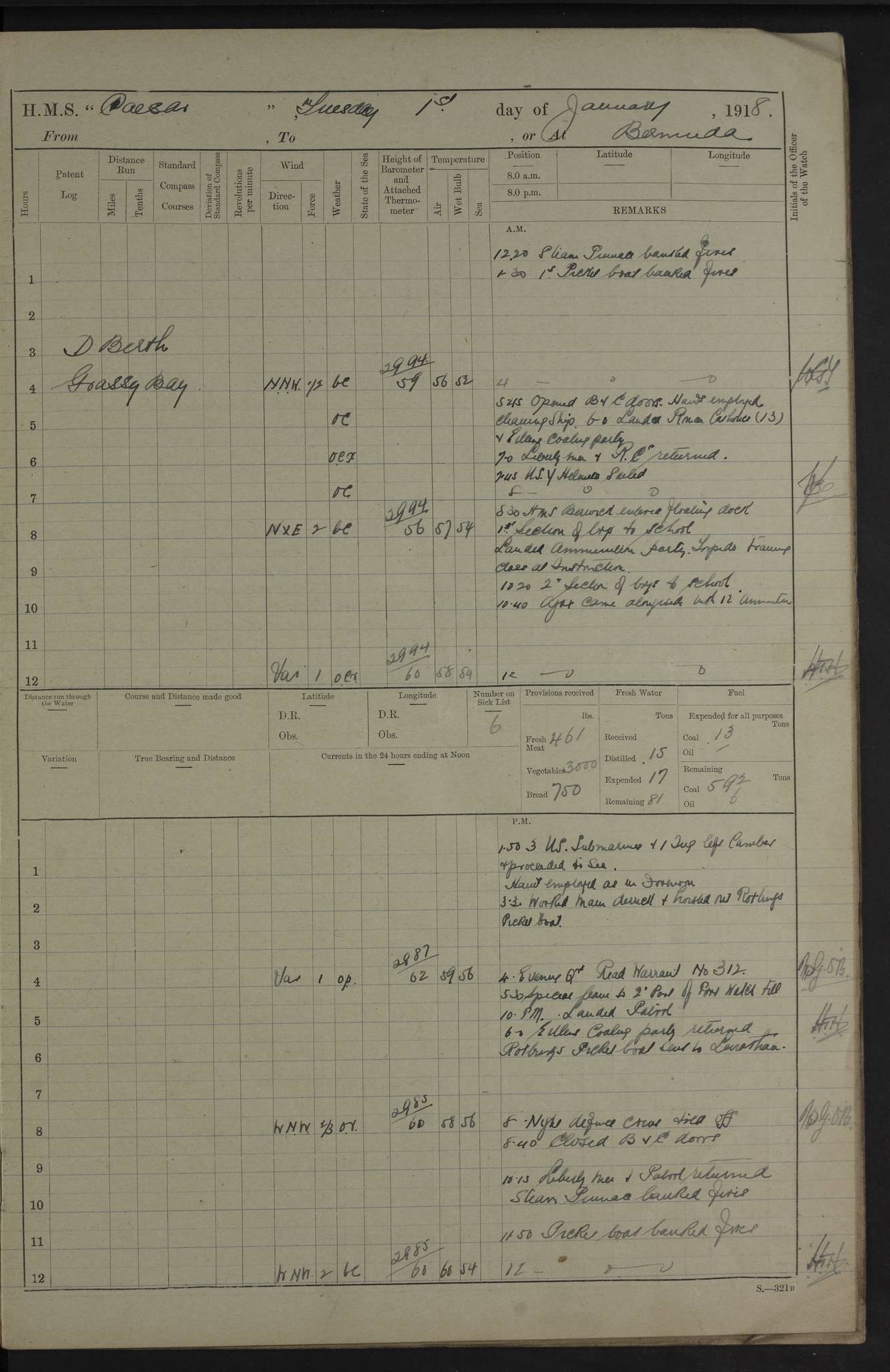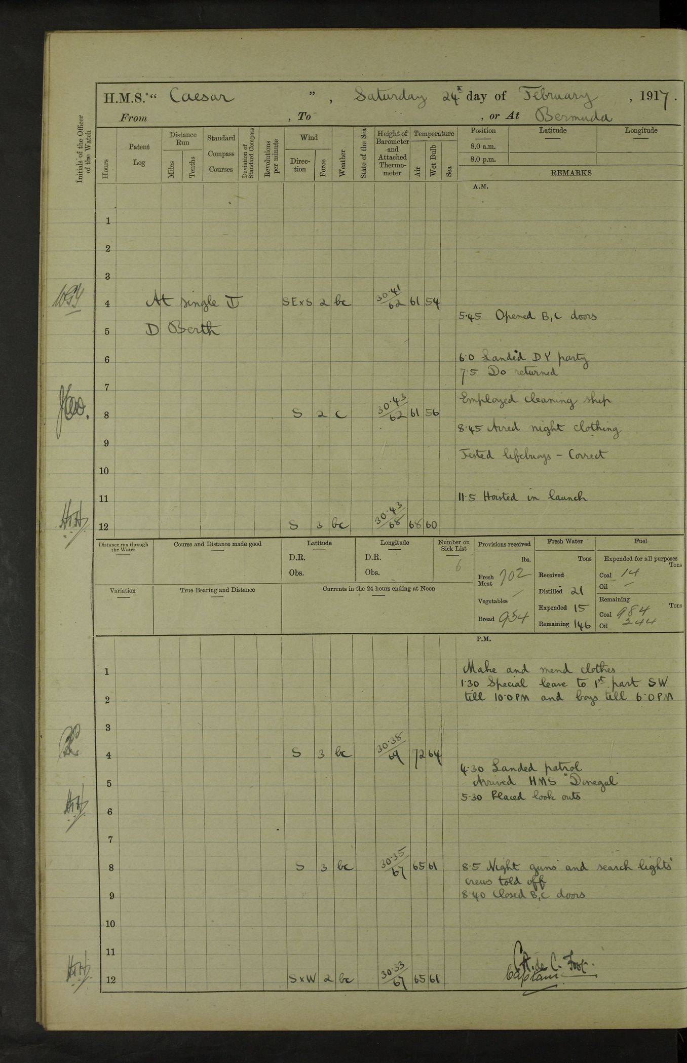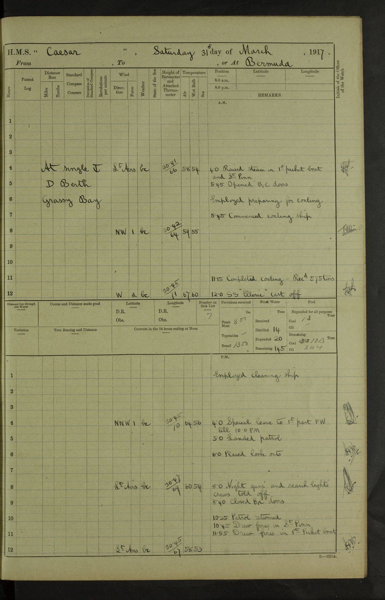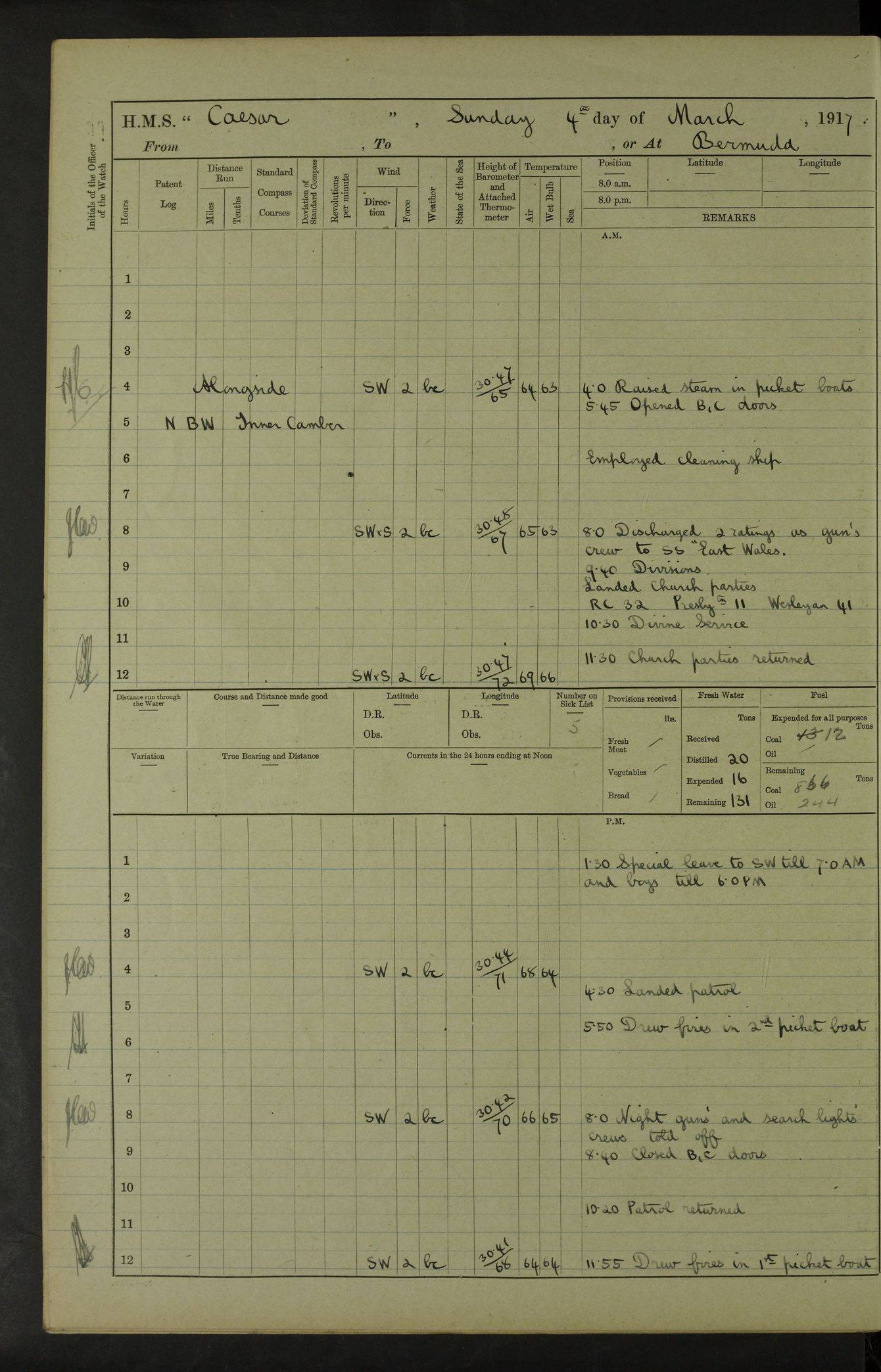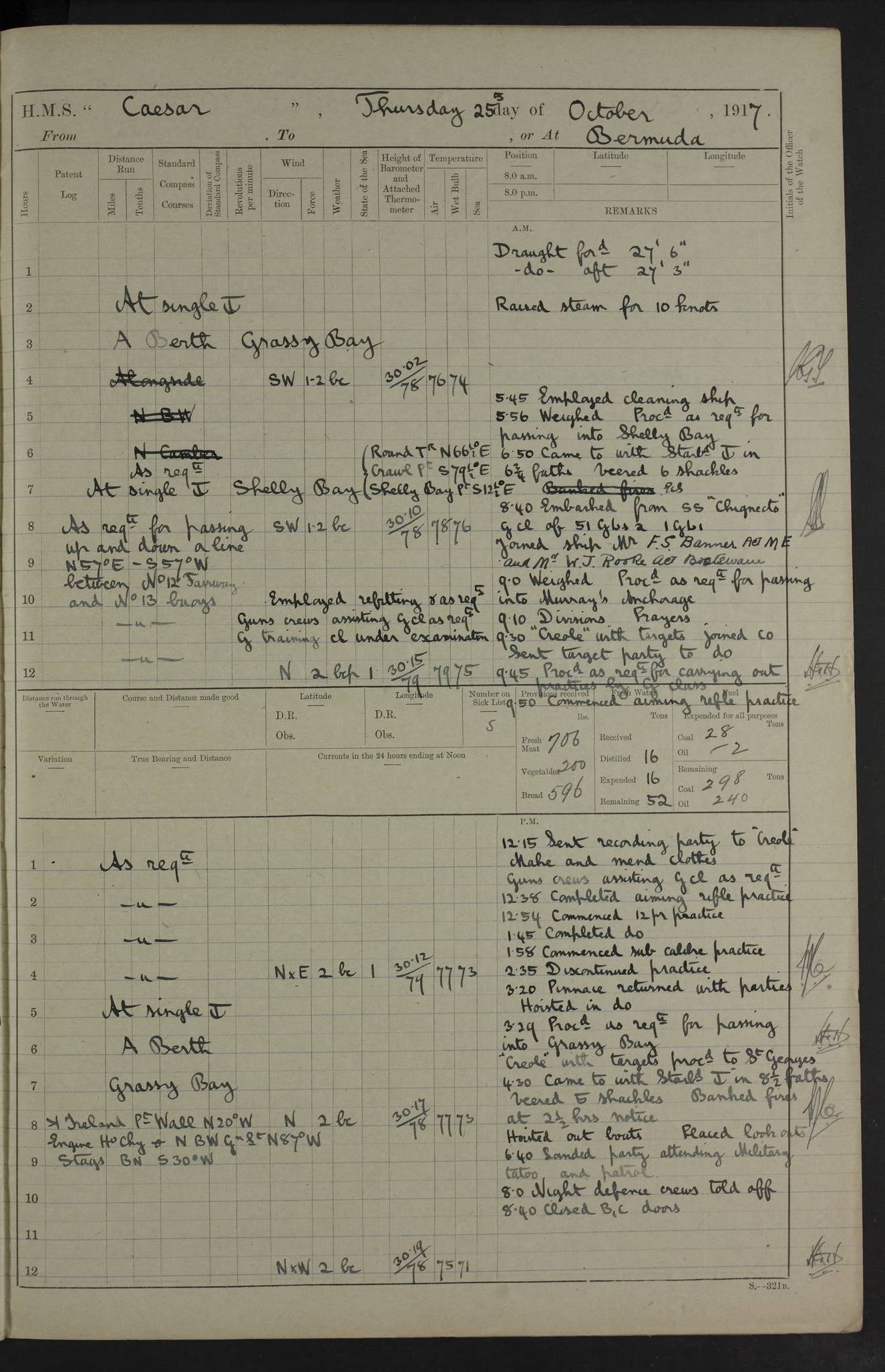 4caf84b6cadfd34197009939: (http://oldweather.s3.amazonaws.com/ADM53-36574/ADM 53-36574-145_1.jpg) 1 January 1917 At Bermuda Lat 32.32, Long -64.83 [Alongside Outer Camber Wall] 4.0am: Raised steam in first Picket boat. 6.0am: Employed cleaning ship. 7.0am: Landed Dockyard parties. Opened B, C doors. am: Employed drawing ammunition and stores, refitting and as requisite. 0.45pm: Paid monthly advance. pm: Employed as in forenoon. 4.30pm: Special leave to Starboard Watch till 7.0am. Landed patrol. 5.0pm: Dockyard parties returned. 6.30pm: Canteen leave to second part Port Watch till 10.0pm. 8.0pm: Night guns’ and search lights’ crews told off. 8.40pm: Closed B, C doors. 10.15pm: Patrol returned. 11.35pm: Drew fires in picket boats. [Number on sick list: 8] [Provisions received: Fresh Meat 340 lbs, Vegetables 2000 lbs, Bread 464 lbs] [Weather fine, though squally in early am. Noon temperature 63F] 4caf84b6cadfd3419700993a: (http://oldweather.s3.amazonaws.com/ADM53-36574/ADM 53-36574-146_0.jpg) 2 January 1917 [Year incorrectly shown as 1916] At Bermuda Lat 32.32, Long -64.83 [Alongside Outer Camber Wall] 4.30am: Raised steam in first picket boat. 6.30am: Landed working party to assist in repair of fenders in Inner Camber. 7.0am: Opened B, C doors. am: Employed embarking ammunition, refitting and as requisite. 11.45am: Working party returned. pm: Employed as in forenoon. 4.0pm: Quarters. 4.30pm: Special leave to Port Watch till 7.0am. Landed patrol. 6.30pm: Canteen leave to second part Starboard Watch till 10.0pm. 10.0pm: Patrol returned. 11.45pm: Drew fires in first picket boat. [Number on sick list: 8] [Provisions received: Fresh Meat 690 lbs, Bread 524 lbs] 4caf84b6cadfd3419700993b: (http://oldweather.s3.amazonaws.com/ADM53-36574/ADM 53-36574-146_1.jpg) 3 January 1917 [Year incorrectly shown as 1916] At Bermuda Lat 32.32, Long -64.83 [Alongside Outer Camber Wall] 7.0am: Opened B, C doors. Landed Dockyard parties. Sailed HMS “Antrim”. Landed Sanitary working party. am: Employed dismounting guns, drawing and returning stores, refitting and as requisite. Training class under instruction. 4.0pm: Quarters. Read Warrants No 268, 269. 4.30pm: Special leave to Starboard Watch till 7.0am. Landed patrol. 5.0pm: Dockyard and Working parties returned. 6.30pm: Canteen leave to first part Port Watch till 10.0pm. 8.5pm: Night guns’ and search lights’ crews told off. 10.0pm: Patrol returned. [Number on sick list: 8] [Provisions received: Fresh Meat 351 lbs, Vegetables 1000 lbs, Bread 512 lbs] 4caf84b6cadfd3419700993c: (http://oldweather.s3.amazonaws.com/ADM53-36574/ADM 53-36574-147_0.jpg) 4 January 1917 At Bermuda Lat 32.32, Long -64.83 [Alongside Outer Camber Wall] 7.0am: Landed Dockyard and Sanitary Working parties. am: Employed dismounting guns, sending up foretopmast, refitting and as requisite. Gunnery training class under instruction. 9.0am: Landed Working party to assist in repairs of fenders in Inner Camber. Discharged to SS “Kiakora” [probably Kaikoura] two ratings to form gun’s crew. 3.30pm: Working parties returned. 4.30pm: Special leave to Port Watch till 7.0am. Landed patrol. 6.30pm: Canteen leave to first part Starboard Watch till 10.0pm; 10.15pm: Patrol returned. [Number on sick list: 9] [Provisions received: Fresh Meat 353 lbs, Vegetables 1000 lbs, Bread 498 lbs] 4caf84b6cadfd3419700993d: (http://oldweather.s3.amazonaws.com/ADM53-36574/ADM 53-36574-147_1.jpg) 5 January 1917 At Bermuda Lat 32.32, Long -64.83 [Alongside Outer Camber Wall] 7.0am: Landed Dockyard and Sanitary Working parties. am: Employed refitting, dismounting guns and as requisite. Gunnery Training class under instruction. pm: Employed as in forenoon. 2.55pm: Arrived HMS “Antrim”. 4.30pm: Special leave to Starboard Watch till 7.0am. Landed patrol. 5.40pm: Drew fires in second picket boat. 6.30pm: Canteen leave to second part Port Watch till 10.0pm. 11.0pm: Patrol returned. 11.40pm: Drew fires in first picket boat. [Number on sick list: 9] [Provisions received: Fresh Meat 350 lbs, Vegetables 400 lbs, Bread 514 lbs] 4caf84b6cadfd3419700993e: (http://oldweather.s3.amazonaws.com/ADM53-36574/ADM 53-36574-148_0.jpg) 6 January 1917 At Bermuda Lat 32.32, Long -64.83 [Alongside Outer Camber Wall] 7.0am: Landed Dockyard parties. am: Employed cleaning ship, refitting, discharging ammunition from SS “Goodwood”, assisting in repairs to fenders of Inner Camber and as requisite. Training class under instruction. 11.45am: Dockyard parties returned. 0.30pm: Observed SS “Prophet” aground in Stag Channel. pm: Make and mend clothes. 1.30pm: Special leave to Port Watch till 7.0am and boys till 5.0pm. 3.0pm: SS “Prophet” refloated and proceeded to anchor. 4.0pm: Quarters. Read Warrant No 270. 4.30pm: Landed patrol. 5.0pm: Party employed discharging SS “Goodwood”. 6.30pm: Canteen leave to second part Starboard Watch till 10.0pm. 8.0pm: Night guns’ and search lights’ crews told off. 8.40pm: Closed B, C doors. 10.15pm: Patrol returned. [Number on sick list: 7] [Provisions received: Fresh Meat 361 lbs, Vegetables 2000 lbs, Bread 928 lbs] 4caf84b6cadfd3419700993f: (http://oldweather.s3.amazonaws.com/ADM53-36574/ADM 53-36574-148_1.jpg) 7 January 1917 At Bermuda Lat 32.32, Long -64.83 [Alongside Outer Camber Wall] 5.55am: Opened B, C doors. Employed cleaning ship. 8.30am: Landed Church parties, Presbyterians 18, Wesleyans 43, RCs 41. 9.30am: Divisions. 10.15am: Ship’s Company attended Divine Service at Dockyard Church. 11.20am: Church parties returned. 1.0pm: Special leave to Starboard Watch till 7.0am and boys will 5.0pm. 6.30pm: Canteen leave to first part Port Watch till 10.0pm. [Number on sick list: 8] [Weather fine, noon temperature 70F] 4caf84b6cadfd34197009940: (http://oldweather.s3.amazonaws.com/ADM53-36574/ADM 53-36574-149_0.jpg) 8 January 1917 At Bermuda Lat 32.32, Long -64.83 [Alongside Outer Camber Wall] 4.0am: Raised steam in first picket boat. 7.0am: Landed Dockyard parties. am: Employed dischargi