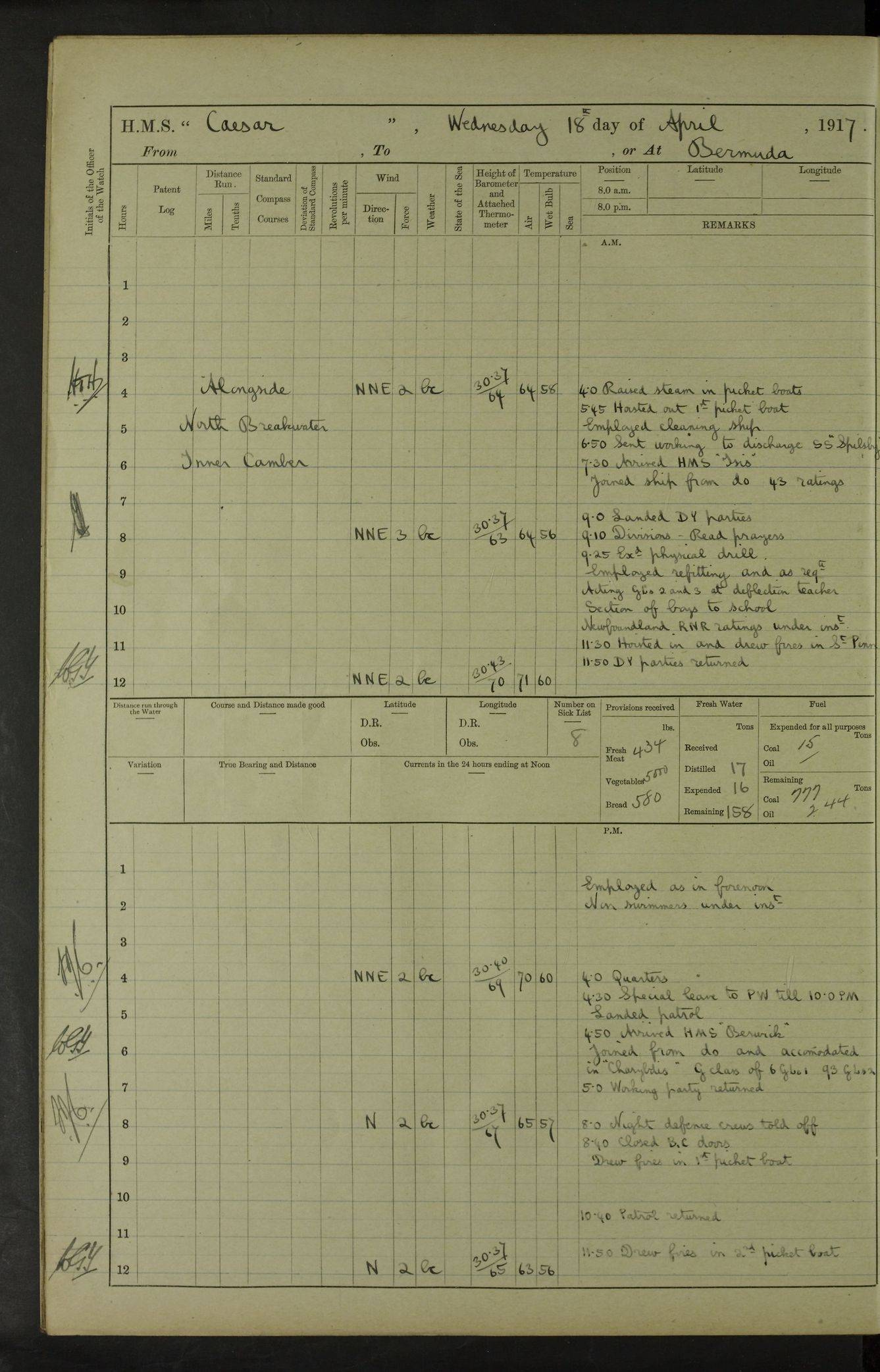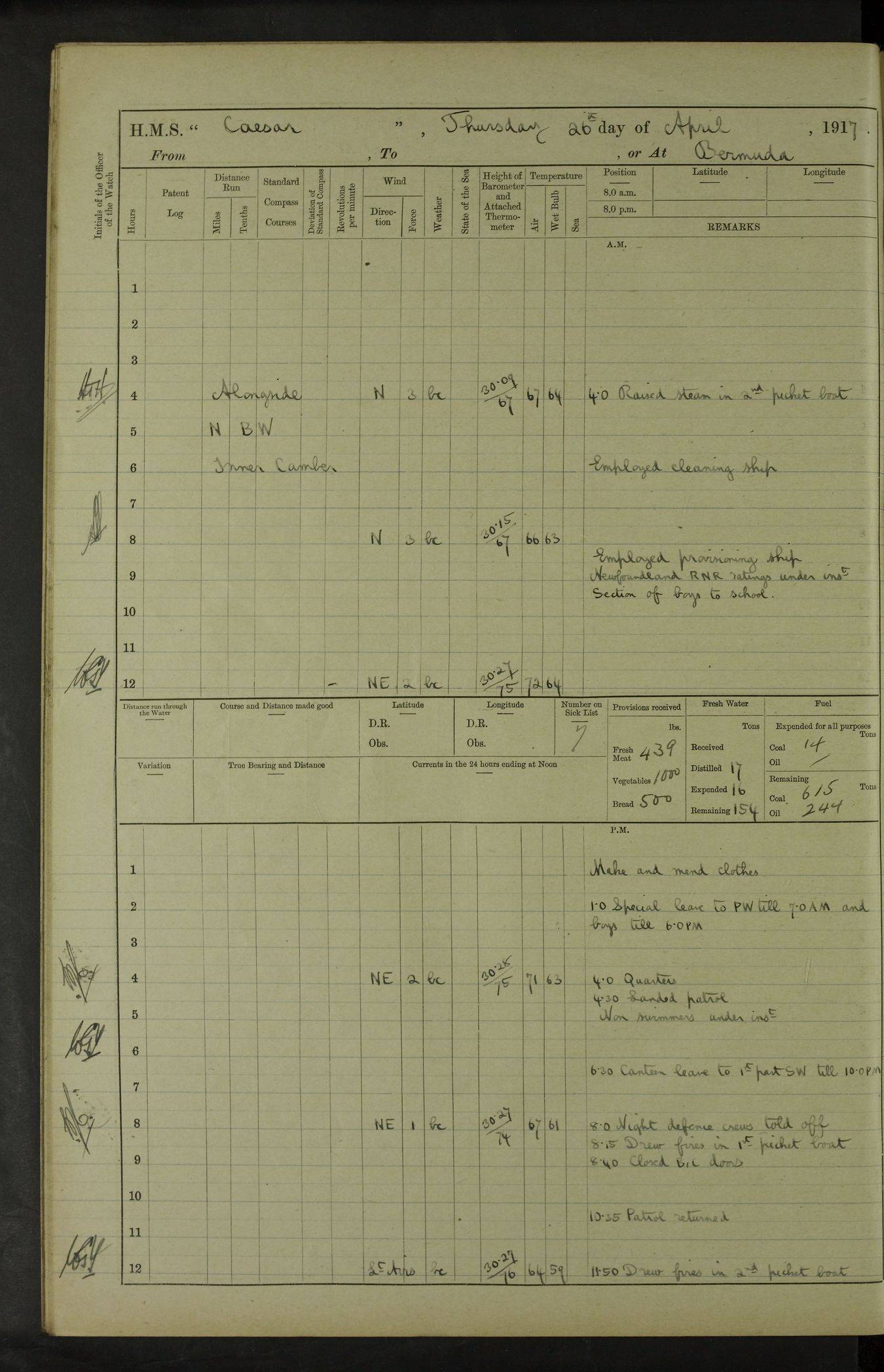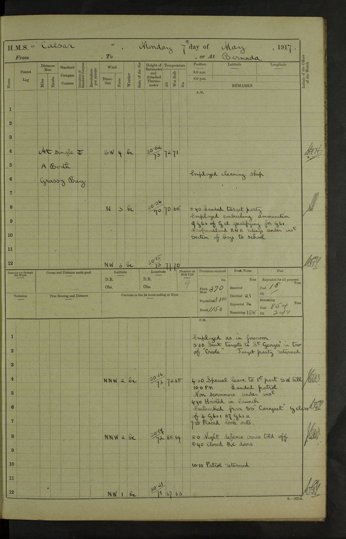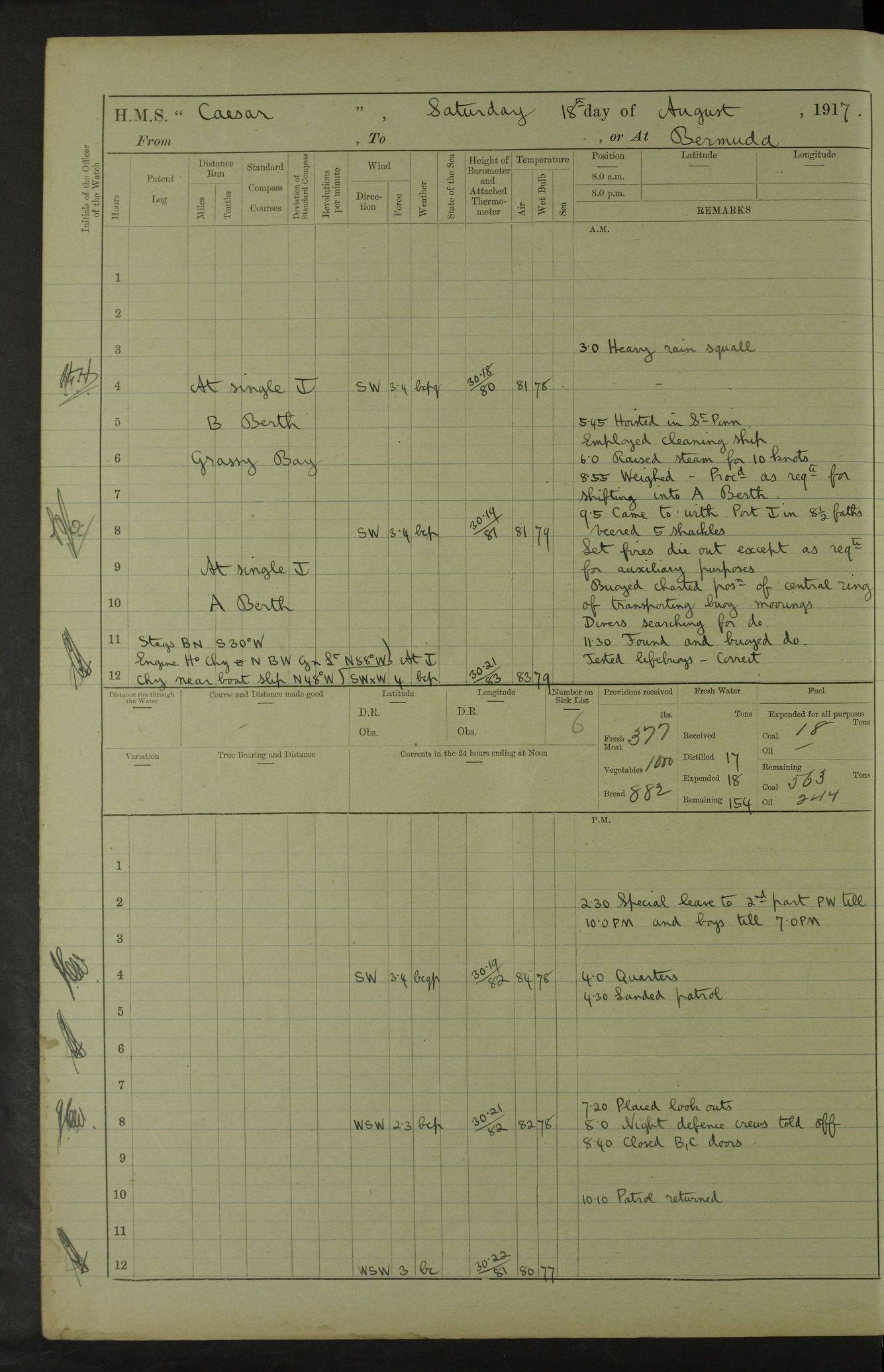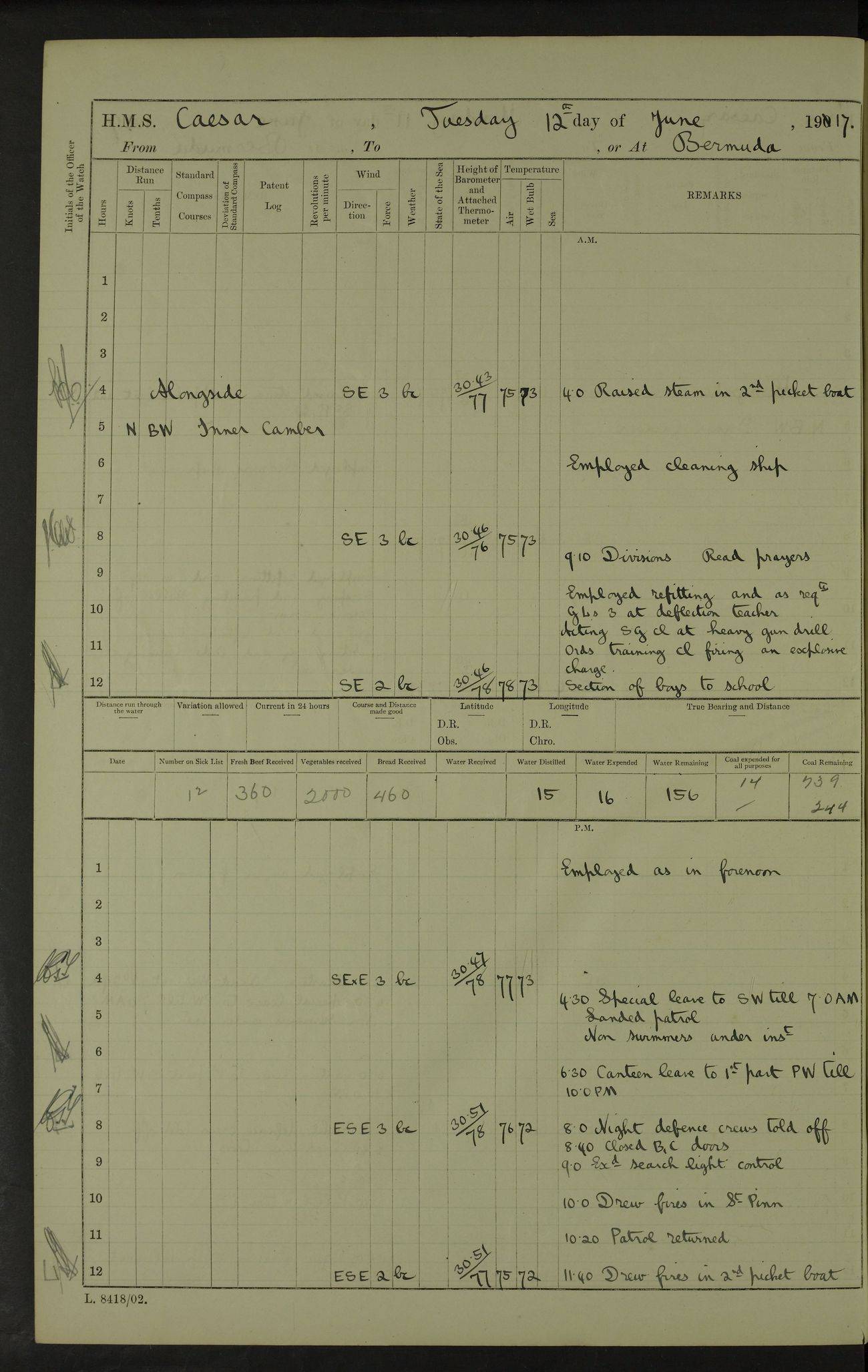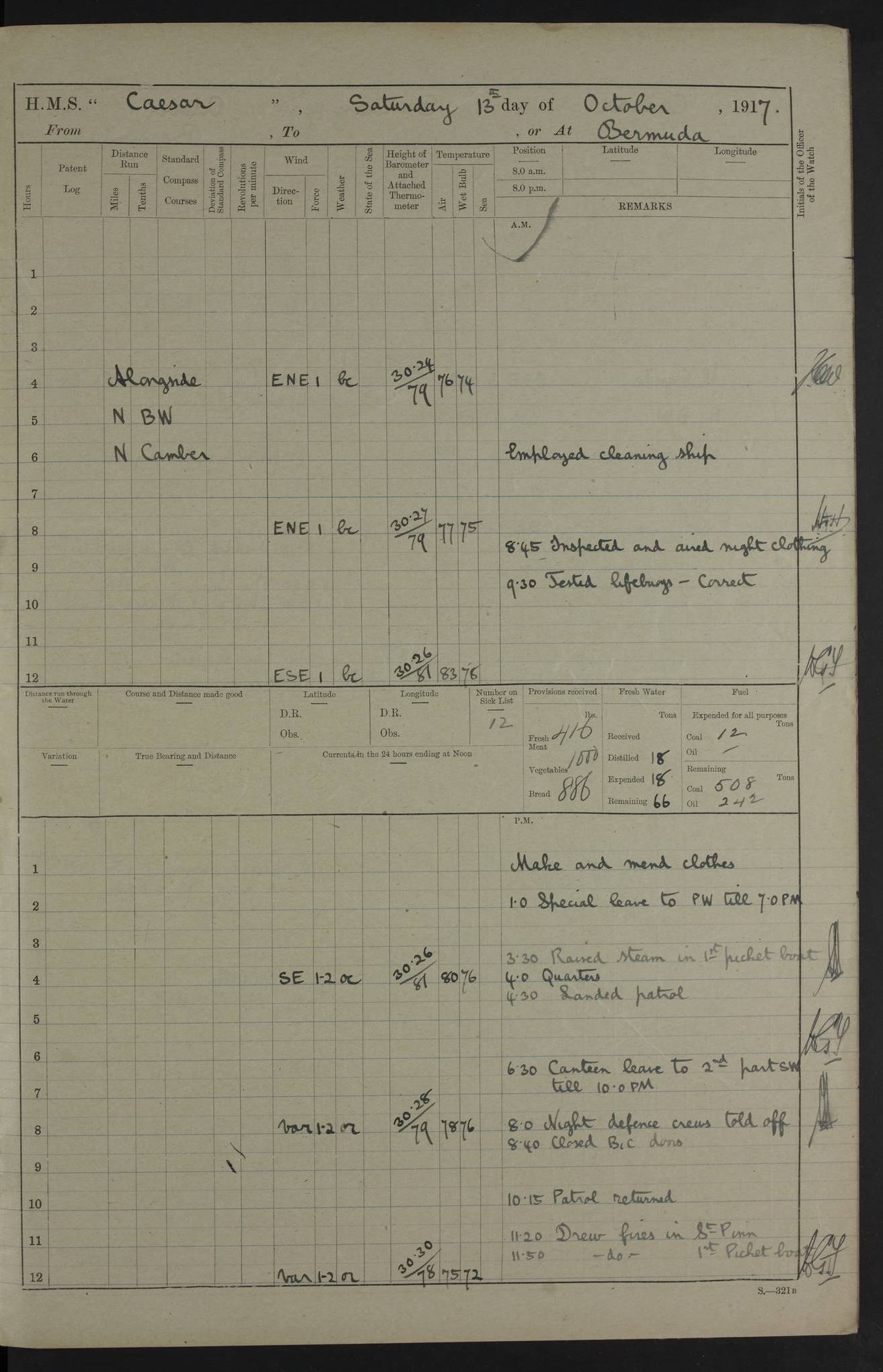 4caf84b6cadfd34197009939: (http://oldweather.s3.amazonaws.com/ADM53-36574/ADM 53-36574-145_1.jpg) 1 January 1917 At Bermuda Lat 32.32, Long -64.83 [Alongside Outer Camber Wall] 4.0am: Raised steam in first Picket boat. 6.0am: Employed cleaning ship. 7.0am: Landed Dockyard parties. Opened B, C doors. am: Employed drawing ammunition and stores, refitting and as requisite. 0.45pm: Paid monthly advance. pm: Employed as in forenoon. 4.30pm: Special leave to Starboard Watch till 7.0am. Landed patrol. 5.0pm: Dockyard parties returned. 6.30pm: Canteen leave to second part Port Watch till 10.0pm. 8.0pm: Night guns’ and search lights’ crews told off. 8.40pm: Closed B, C doors. 10.15pm: Patrol returned. 11.35pm: Drew fires in picket boats. [Number on sick list: 8] [Provisions received: Fresh Meat 340 lbs, Vegetables 2000 lbs, Bread 464 lbs] [Weather fine, though squally in early am. Noon temperature 63F] 4caf84b6cadfd3419700993a: (http://oldweather.s3.amazonaws.com/ADM53-36574/ADM 53-36574-146_0.jpg) 2 January 1917 [Year incorrectly shown as 1916] At Bermuda Lat 32.32, Long -64.83 [Alongside Outer Camber Wall] 4.30am: Raised steam in first picket boat. 6.30am: Landed working party to assist in repair of fenders in Inner Camber. 7.0am: Opened B, C doors. am: Employed embarking ammunition, refitting and as requisite. 11.45am: Working party returned. pm: Employed as in forenoon. 4.0pm: Quarters. 4.30pm: Special leave to Port Watch till 7.0am. Landed patrol. 6.30pm: Canteen leave to second part Starboard Watch till 10.0pm. 10.0pm: Patrol returned. 11.45pm: Drew fires in first picket boat. [Number on sick list: 8] [Provisions received: Fresh Meat 690 lbs, Bread 524 lbs] 4caf84b6cadfd3419700993b: (http://oldweather.s3.amazonaws.com/ADM53-36574/ADM 53-36574-146_1.jpg) 3 January 1917 [Year incorrectly shown as 1916] At Bermuda Lat 32.32, Long -64.83 [Alongside Outer Camber Wall] 7.0am: Opened B, C doors. Landed Dockyard parties. Sailed HMS “Antrim”. Landed Sanitary working party. am: Employed dismounting guns, drawing and returning stores, refitting and as requisite. Training class under instruction. 4.0pm: Quarters. Read Warrants No 268, 269. 4.30pm: Special leave to Starboard Watch till 7.0am. Landed patrol. 5.0pm: Dockyard and Working parties returned. 6.30pm: Canteen leave to first part Port Watch till 10.0pm. 8.5pm: Night guns’ and search lights’ crews told off. 10.0pm: Patrol returned. [Number on sick list: 8] [Provisions received: Fresh Meat 351 lbs, Vegetables 1000 lbs, Bread 512 lbs] 4caf84b6cadfd3419700993c: (http://oldweather.s3.amazonaws.com/ADM53-36574/ADM 53-36574-147_0.jpg) 4 January 1917 At Bermuda Lat 32.32, Long -64.83 [Alongside Outer Camber Wall] 7.0am: Landed Dockyard and Sanitary Working parties. am: Employed dismounting guns, sending up foretopmast, refitting and as requisite. Gunnery training class under instruction. 9.0am: Landed Working party to assist in repairs of fenders in Inner Camber. Discharged to SS “Kiakora” [probably Kaikoura] two ratings to form gun’s crew. 3.30pm: Working parties returned. 4.30pm: Special leave to Port Watch till 7.0am. Landed patrol. 6.30pm: Canteen leave to first part Starboard Watch till 10.0pm; 10.15pm: Patrol returned. [Number on sick list: 9] [Provisions received: Fresh Meat 353 lbs, Vegetables 1000 lbs, Bread 498 lbs] 4caf84b6cadfd3419700993d: (http://oldweather.s3.amazonaws.com/ADM53-36574/ADM 53-36574-147_1.jpg) 5 January 1917 At Bermuda Lat 32.32, Long -64.83 [Alongside Outer Camber Wall] 7.0am: Landed Dockyard and Sanitary Working parties. am: Employed refitting, dismounting guns and as requisite. Gunnery Training class under instruction. pm: Employed as in forenoon. 2.55pm: Arrived HMS “Antrim”. 4.30pm: Special leave to Starboard Watch till 7.0am. Landed patrol. 5.40pm: Drew fires in second picket boat. 6.30pm: Canteen leave to second part Port Watch till 10.0pm. 11.0pm: Patrol returned. 11.40pm: Drew fires in first picket boat. [Number on sick list: 9] [Provisions received: Fresh Meat 350 lbs, Vegetables 400 lbs, Bread 514 lbs] 4caf84b6cadfd3419700993e: (http://oldweather.s3.amazonaws.com/ADM53-36574/ADM 53-36574-148_0.jpg) 6 January 1917 At Bermuda Lat 32.32, Long -64.83 [Alongside Outer Camber Wall] 7.0am: Landed Dockyard parties. am: Employed cleaning ship, refitting, discharging ammunition from SS “Goodwood”, assisting in repairs to fenders of Inner Camber and as requisite. Training class under instruction. 11.45am: Dockyard parties returned. 0.30pm: Observed SS “Prophet” aground in Stag Channel. pm: Make and mend clothes. 1.30pm: Special leave to Port Watch till 7.0am and boys till 5.0pm. 3.0pm: SS “Prophet” refloated and proceeded to anchor. 4.0pm: Quarters. Read Warrant No 270. 4.30pm: Landed patrol. 5.0pm: Party employed discharging SS “Goodwood”. 6.30pm: Canteen leave to second part Starboard Watch till 10.0pm. 8.0pm: Night guns’ and search lights’ crews told off. 8.40pm: Closed B, C doors. 10.15pm: Patrol returned. [Number on sick list: 7] [Provisions received: Fresh Meat 361 lbs, Vegetables 2000 lbs, Bread 928 lbs] 4caf84b6cadfd3419700993f: (http://oldweather.s3.amazonaws.com/ADM53-36574/ADM 53-36574-148_1.jpg) 7 January 1917 At Bermuda Lat 32.32, Long -64.83 [Alongside Outer Camber Wall] 5.55am: Opened B, C doors. Employed cleaning ship. 8.30am: Landed Church parties, Presbyterians 18, Wesleyans 43, RCs 41. 9.30am: Divisions. 10.15am: Ship’s Company attended Divine Service at Dockyard Church. 11.20am: Church parties returned. 1.0pm: Special leave to Starboard Watch till 7.0am and boys will 5.0pm. 6.30pm: Canteen leave to first part Port Watch till 10.0pm. [Number on sick list: 8] [Weather fine, noon temperature 70F] 4caf84b6cadfd34197009940: (http://oldweather.s3.amazonaws.com/ADM53-36574/ADM 53-36574-149_0.jpg) 8 January 1917 At Bermuda Lat 32.32, Long -64.83 [Alongside Outer Camber Wall] 4.0am: Raised steam in first picket boat. 7.0am: Landed Dockyard parties. am: Employed dischargi