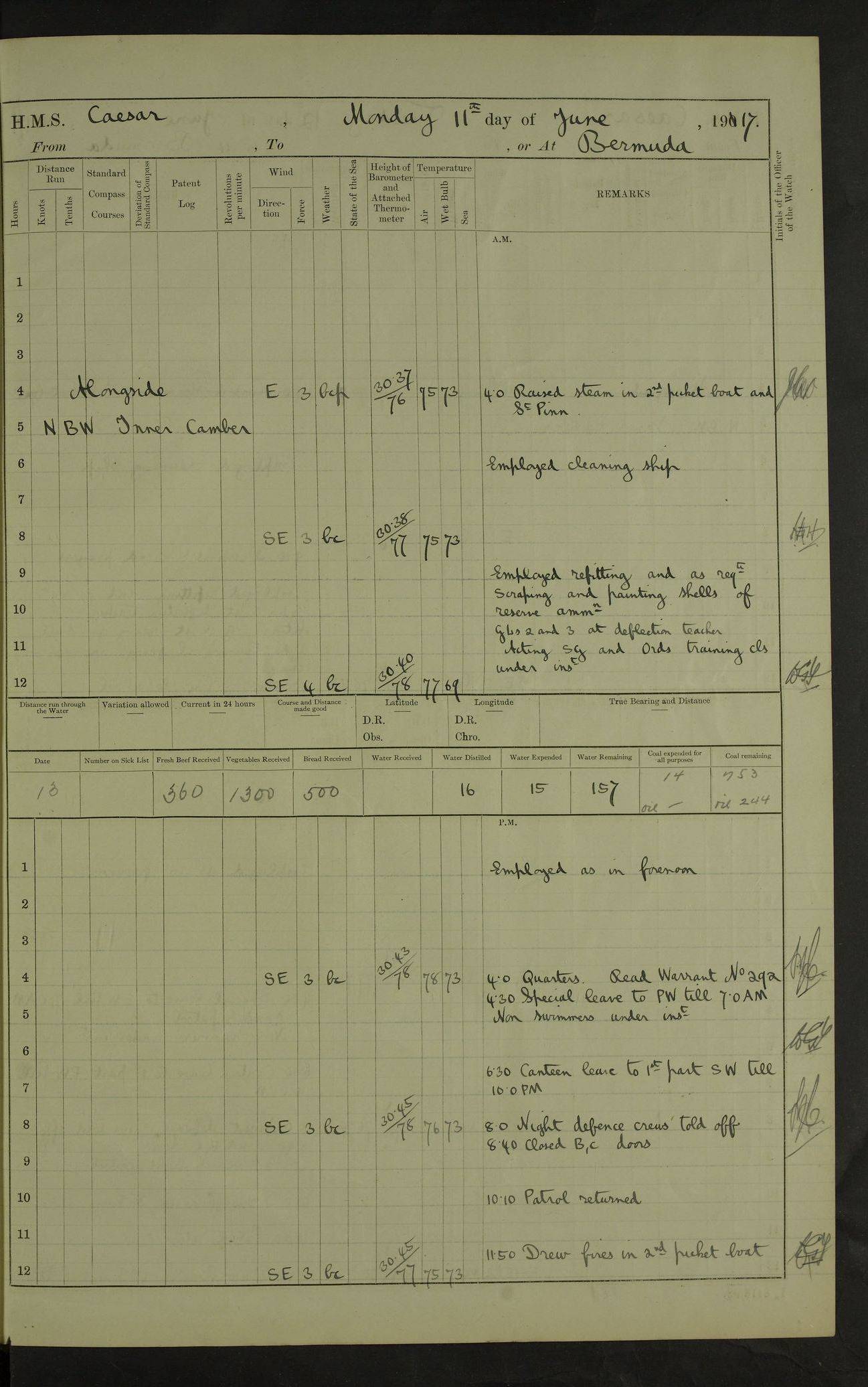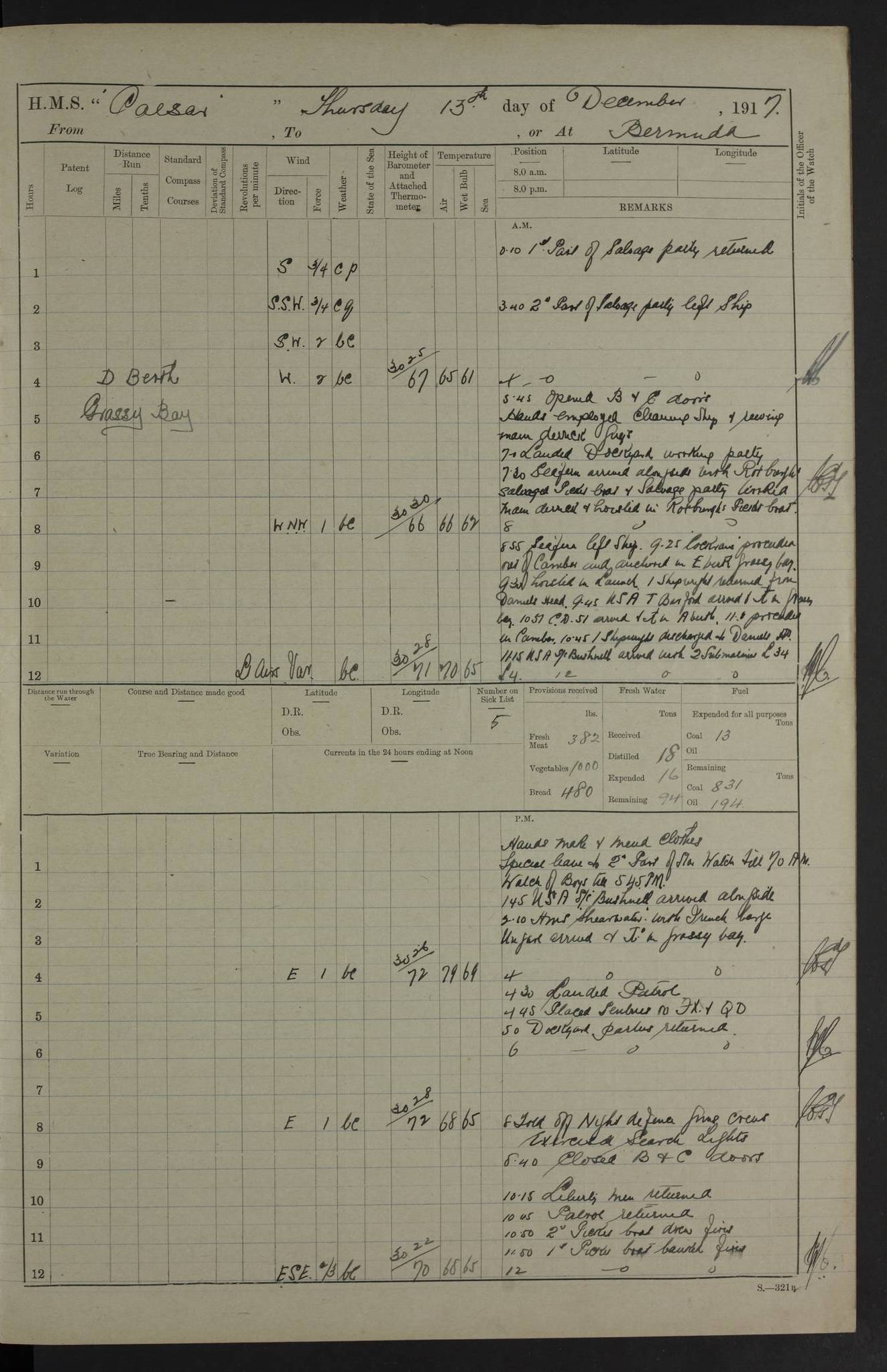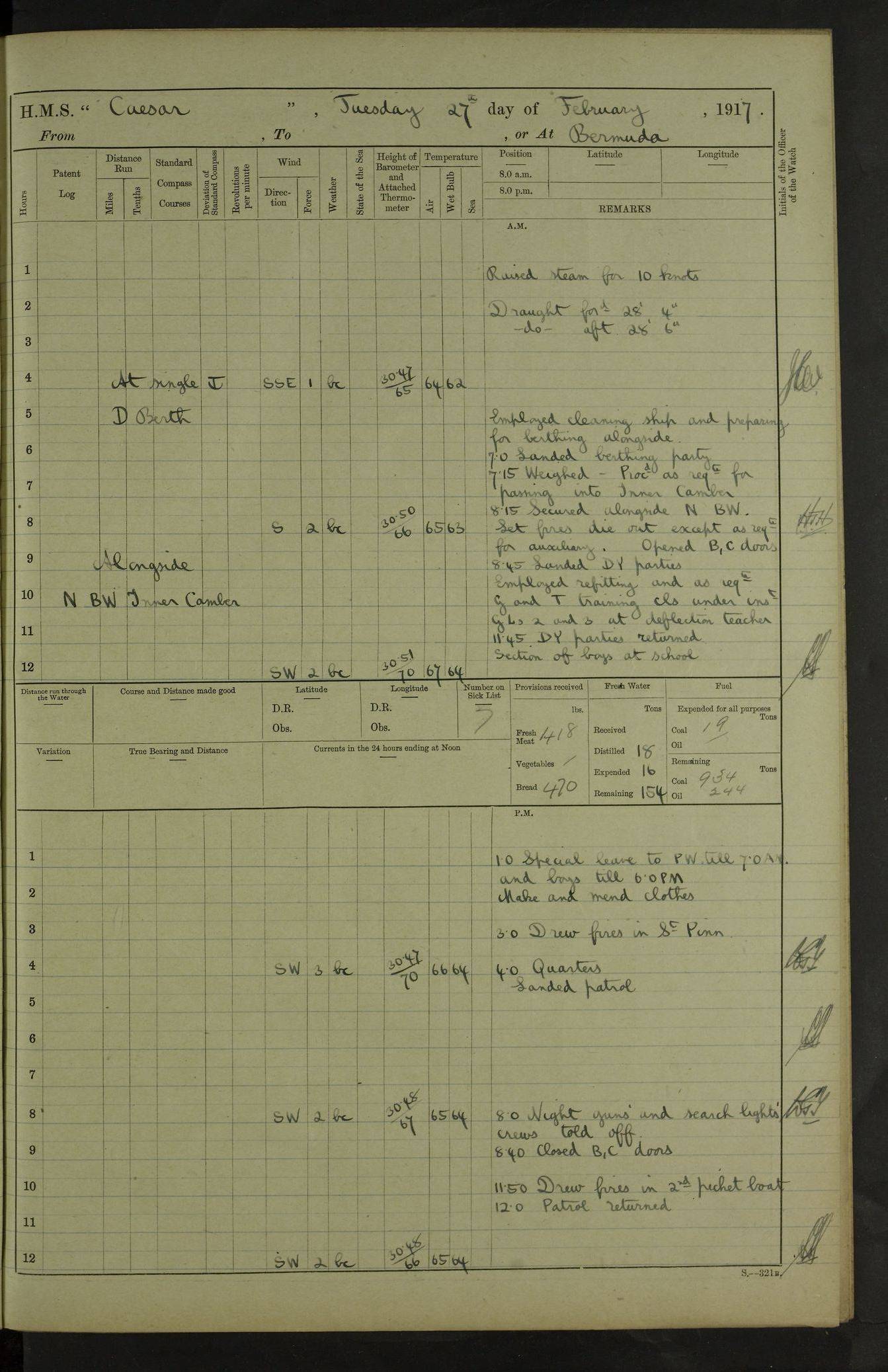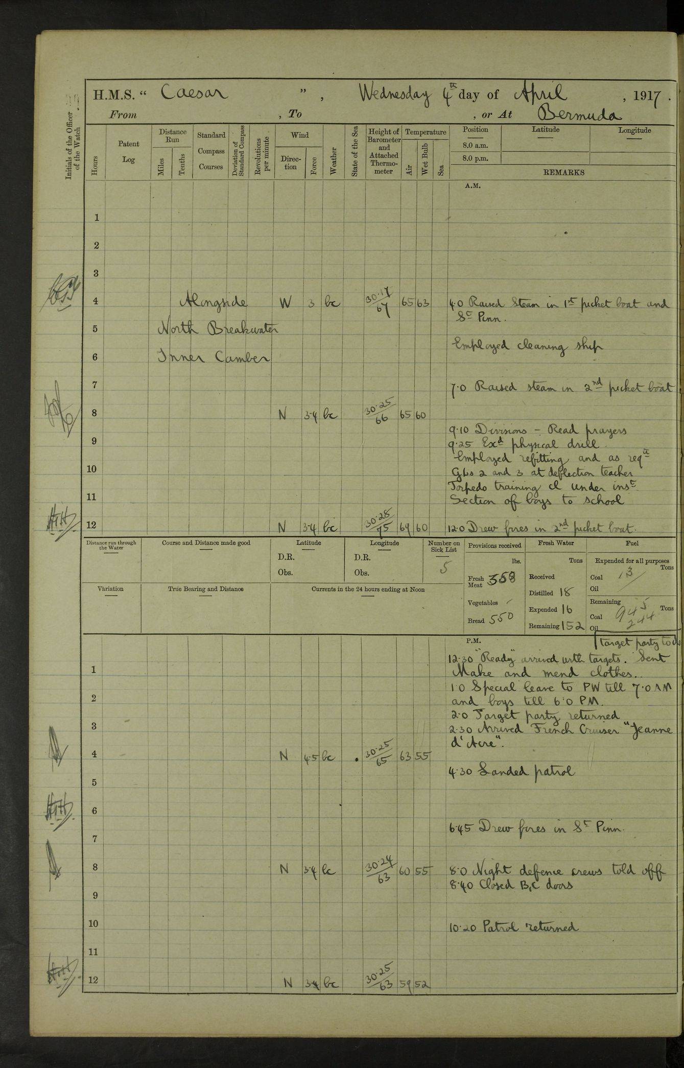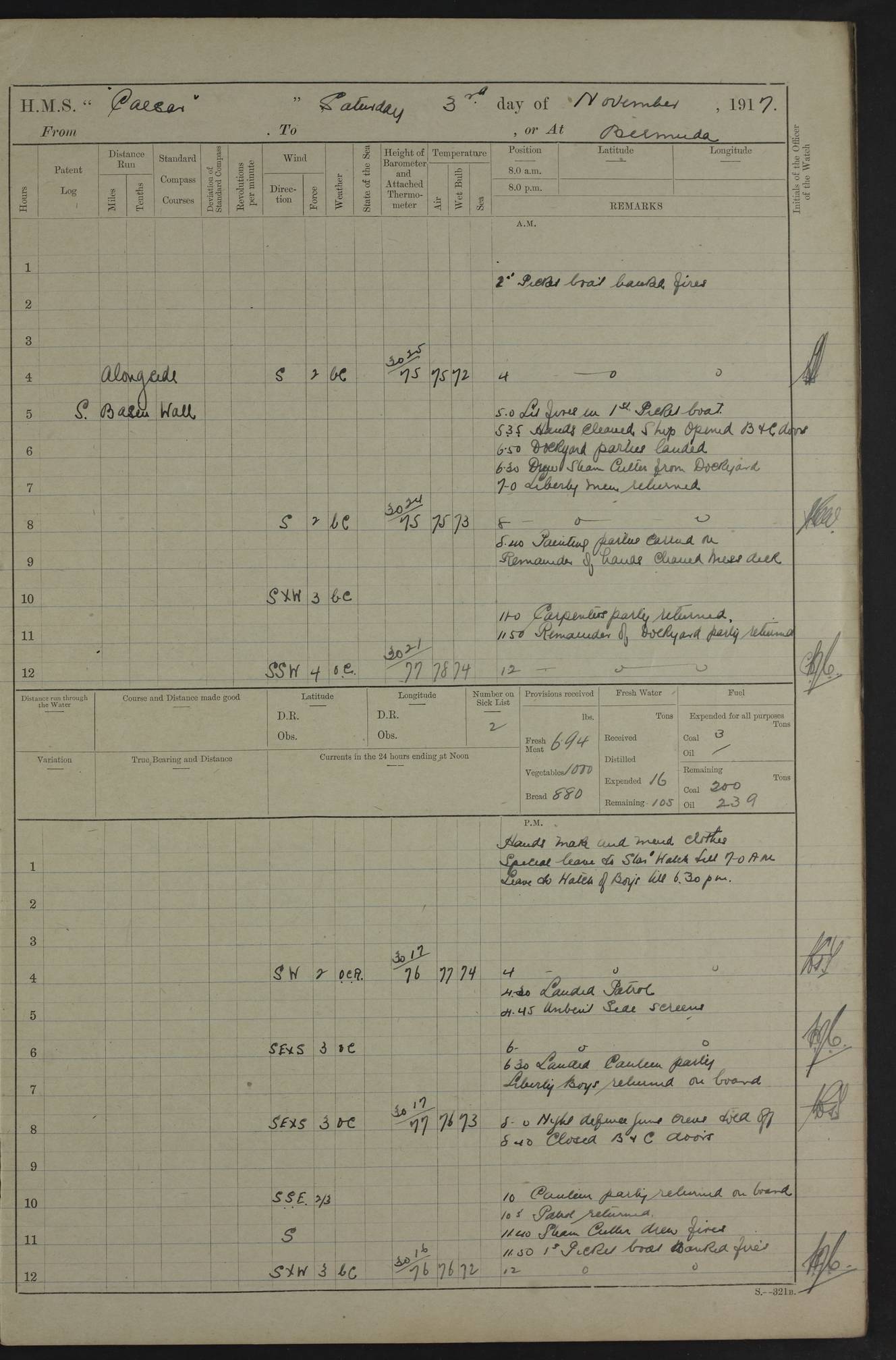4caf84b6cadfd34197009939: (http://oldweather.s3.amazonaws.com/ADM53-36574/ADM 53-36574-145_1.jpg) 1 January 1917 At Bermuda Lat 32.32, Long -64.83 [Alongside Outer Camber Wall] 4.0am: Raised steam in first Picket boat. 6.0am: Employed cleaning ship. 7.0am: Landed Dockyard parties. Opened B, C doors. am: Employed drawing ammunition and stores, refitting and as requisite. 0.45pm: Paid monthly advance. pm: Employed as in forenoon. 4.30pm: Special leave to Starboard Watch till 7.0am. Landed patrol. 5.0pm: Dockyard parties returned. 6.30pm: Canteen leave to second part Port Watch till 10.0pm. 8.0pm: Night guns’ and search lights’ crews told off. 8.40pm: Closed B, C doors. 10.15pm: Patrol returned. 11.35pm: Drew fires in picket boats. [Number on sick list: 8] [Provisions received: Fresh Meat 340 lbs, Vegetables 2000 lbs, Bread 464 lbs] [Weather fine, though squally in early am. Noon temperature 63F] 4caf84b6cadfd3419700993a: (http://oldweather.s3.amazonaws.com/ADM53-36574/ADM 53-36574-146_0.jpg) 2 January 1917 [Year incorrectly shown as 1916] At Bermuda Lat 32.32, Long -64.83 [Alongside Outer Camber Wall] 4.30am: Raised steam in first picket boat. 6.30am: Landed working party to assist in repair of fenders in Inner Camber. 7.0am: Opened B, C doors. am: Employed embarking ammunition, refitting and as requisite. 11.45am: Working party returned. pm: Employed as in forenoon. 4.0pm: Quarters. 4.30pm: Special leave to Port Watch till 7.0am. Landed patrol. 6.30pm: Canteen leave to second part Starboard Watch till 10.0pm. 10.0pm: Patrol returned. 11.45pm: Drew fires in first picket boat. [Number on sick list: 8] [Provisions received: Fresh Meat 690 lbs, Bread 524 lbs] 4caf84b6cadfd3419700993b: (http://oldweather.s3.amazonaws.com/ADM53-36574/ADM 53-36574-146_1.jpg) 3 January 1917 [Year incorrectly shown as 1916] At Bermuda Lat 32.32, Long -64.83 [Alongside Outer Camber Wall] 7.0am: Opened B, C doors. Landed Dockyard parties. Sailed HMS “Antrim”. Landed Sanitary working party. am: Employed dismounting guns, drawing and returning stores, refitting and as requisite. Training class under instruction. 4.0pm: Quarters. Read Warrants No 268, 269. 4.30pm: Special leave to Starboard Watch till 7.0am. Landed patrol. 5.0pm: Dockyard and Working parties returned. 6.30pm: Canteen leave to first part Port Watch till 10.0pm. 8.5pm: Night guns’ and search lights’ crews told off. 10.0pm: Patrol returned. [Number on sick list: 8] [Provisions received: Fresh Meat 351 lbs, Vegetables 1000 lbs, Bread 512 lbs] 4caf84b6cadfd3419700993c: (http://oldweather.s3.amazonaws.com/ADM53-36574/ADM 53-36574-147_0.jpg) 4 January 1917 At Bermuda Lat 32.32, Long -64.83 [Alongside Outer Camber Wall] 7.0am: Landed Dockyard and Sanitary Working parties. am: Employed dismounting guns, sending up foretopmast, refitting and as requisite. Gunnery training class under instruction. 9.0am: Landed Working party to assist in repairs of fenders in Inner Camber. Discharged to SS “Kiakora” [probably Kaikoura] two ratings to form gun’s crew. 3.30pm: Working parties returned. 4.30pm: Special leave to Port Watch till 7.0am. Landed patrol. 6.30pm: Canteen leave to first part Starboard Watch till 10.0pm; 10.15pm: Patrol returned. [Number on sick list: 9] [Provisions received: Fresh Meat 353 lbs, Vegetables 1000 lbs, Bread 498 lbs] 4caf84b6cadfd3419700993d: (http://oldweather.s3.amazonaws.com/ADM53-36574/ADM 53-36574-147_1.jpg) 5 January 1917 At Bermuda Lat 32.32, Long -64.83 [Alongside Outer Camber Wall] 7.0am: Landed Dockyard and Sanitary Working parties. am: Employed refitting, dismounting guns and as requisite. Gunnery Training class under instruction. pm: Employed as in forenoon. 2.55pm: Arrived HMS “Antrim”. 4.30pm: Special leave to Starboard Watch till 7.0am. Landed patrol. 5.40pm: Drew fires in second picket boat. 6.30pm: Canteen leave to second part Port Watch till 10.0pm. 11.0pm: Patrol returned. 11.40pm: Drew fires in first picket boat. [Number on sick list: 9] [Provisions received: Fresh Meat 350 lbs, Vegetables 400 lbs, Bread 514 lbs] 4caf84b6cadfd3419700993e: (http://oldweather.s3.amazonaws.com/ADM53-36574/ADM 53-36574-148_0.jpg) 6 January 1917 At Bermuda Lat 32.32, Long -64.83 [Alongside Outer Camber Wall] 7.0am: Landed Dockyard parties. am: Employed cleaning ship, refitting, discharging ammunition from SS “Goodwood”, assisting in repairs to fenders of Inner Camber and as requisite. Training class under instruction. 11.45am: Dockyard parties returned. 0.30pm: Observed SS “Prophet” aground in Stag Channel. pm: Make and mend clothes. 1.30pm: Special leave to Port Watch till 7.0am and boys till 5.0pm. 3.0pm: SS “Prophet” refloated and proceeded to anchor. 4.0pm: Quarters. Read Warrant No 270. 4.30pm: Landed patrol. 5.0pm: Party employed discharging SS “Goodwood”. 6.30pm: Canteen leave to second part Starboard Watch till 10.0pm. 8.0pm: Night guns’ and search lights’ crews told off. 8.40pm: Closed B, C doors. 10.15pm: Patrol returned. [Number on sick list: 7] [Provisions received: Fresh Meat 361 lbs, Vegetables 2000 lbs, Bread 928 lbs] 4caf84b6cadfd3419700993f: (http://oldweather.s3.amazonaws.com/ADM53-36574/ADM 53-36574-148_1.jpg) 7 January 1917 At Bermuda Lat 32.32, Long -64.83 [Alongside Outer Camber Wall] 5.55am: Opened B, C doors. Employed cleaning ship. 8.30am: Landed Church parties, Presbyterians 18, Wesleyans 43, RCs 41. 9.30am: Divisions. 10.15am: Ship’s Company attended Divine Service at Dockyard Church. 11.20am: Church parties returned. 1.0pm: Special leave to Starboard Watch till 7.0am and boys will 5.0pm. 6.30pm: Canteen leave to first part Port Watch till 10.0pm. [Number on sick list: 8] [Weather fine, noon temperature 70F] 4caf84b6cadfd34197009940: (http://oldweather.s3.amazonaws.com/ADM53-36574/ADM 53-36574-149_0.jpg) 8 January 1917 At Bermuda Lat 32.32, Long -64.83 [Alongside Outer Camber Wall] 4.0am: Raised steam in first picket boat. 7.0am: Landed Dockyard parties. am: Employed dischargi