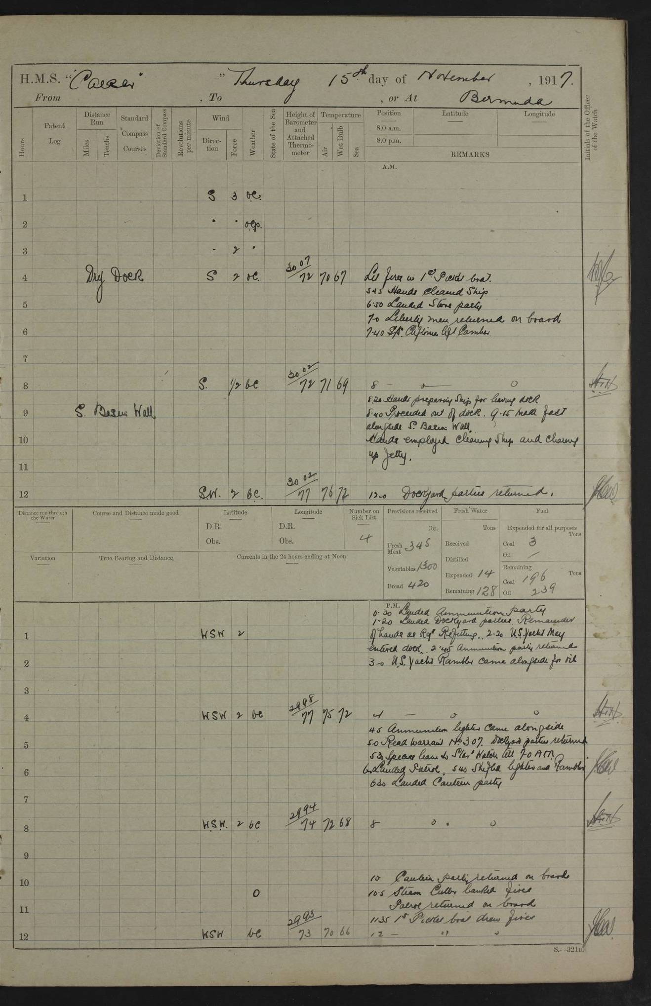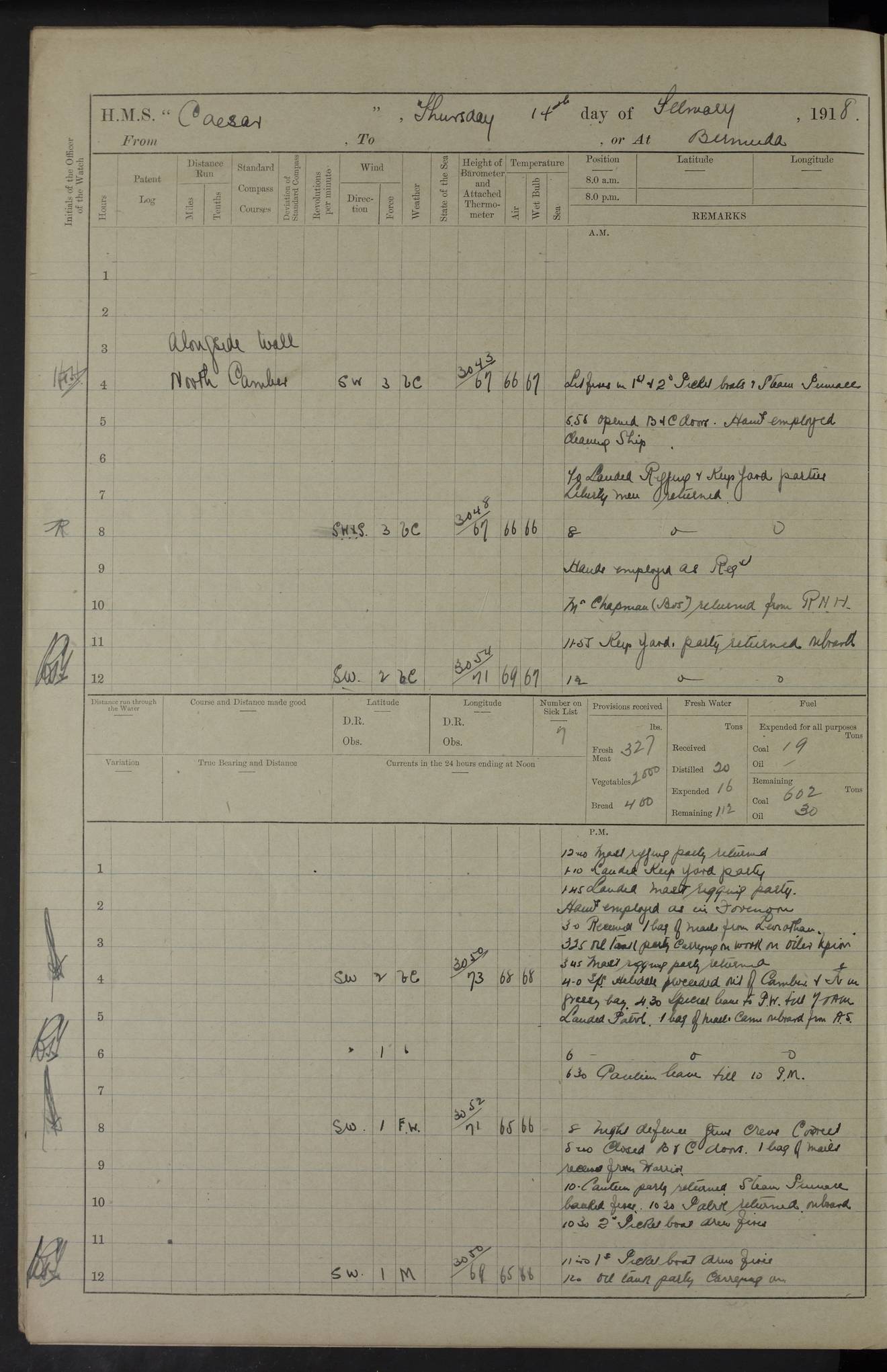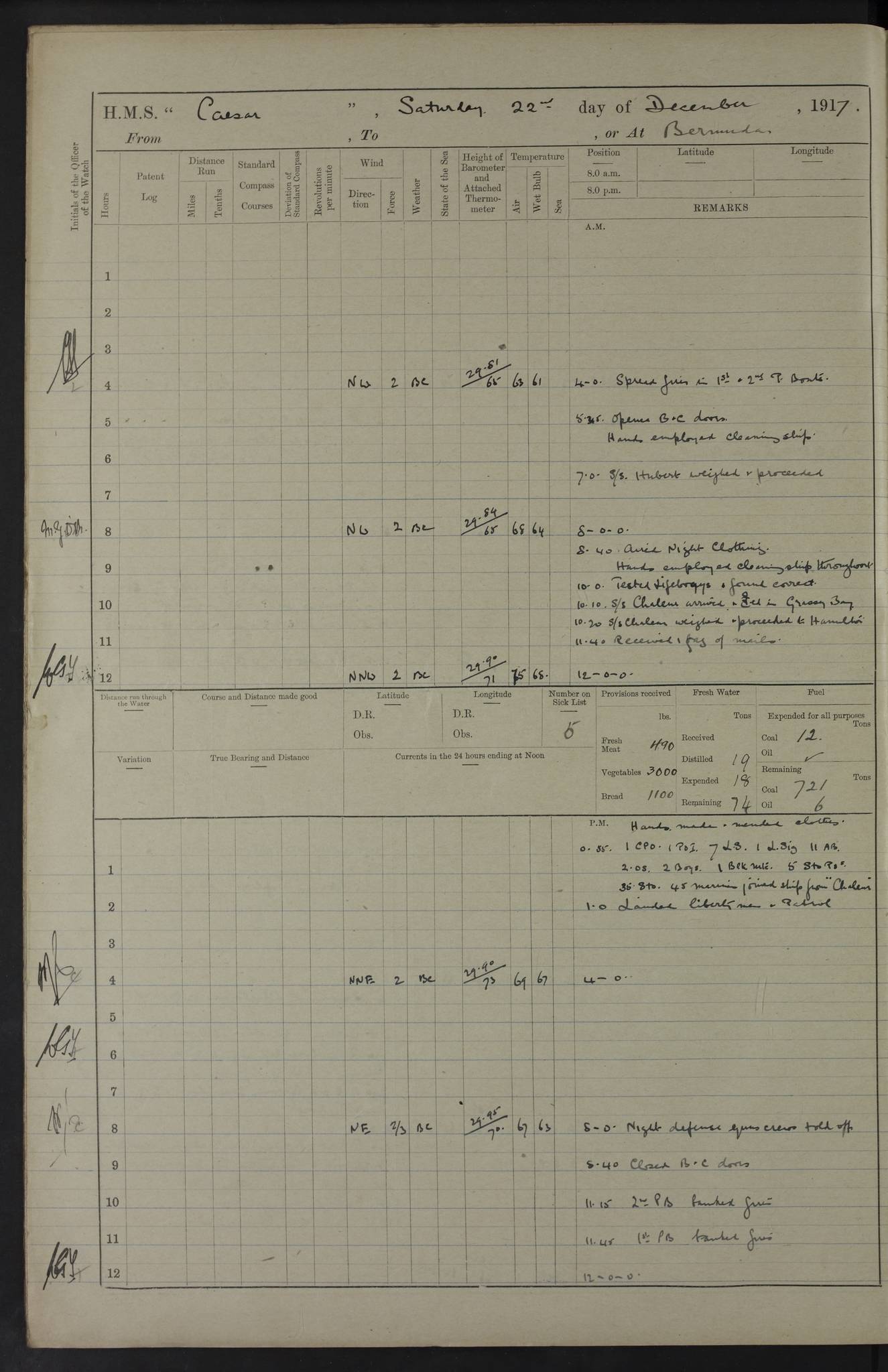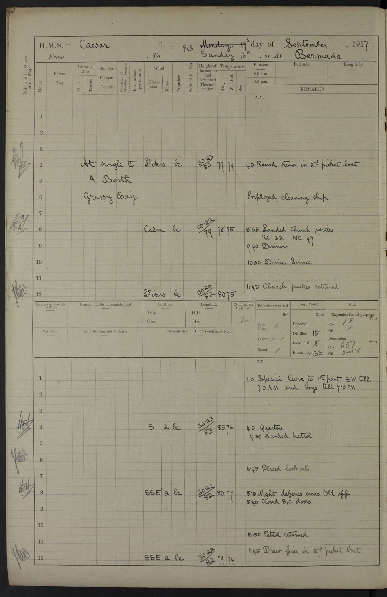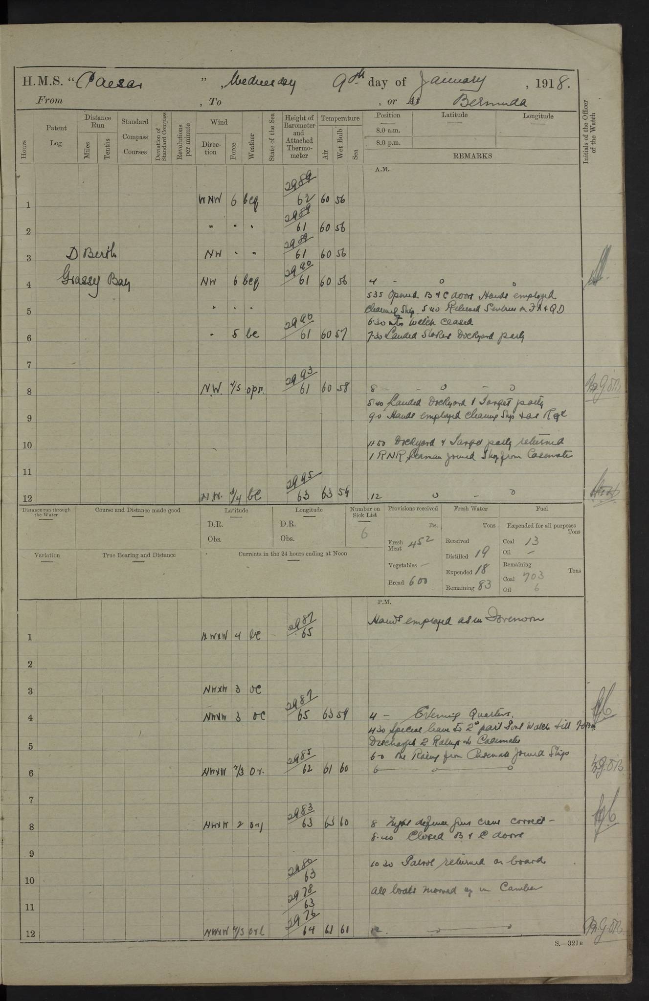 4caf84b6cadfd34197009939: (http://oldweather.s3.amazonaws.com/ADM53-36574/ADM 53-36574-145_1.jpg) 1 January 1917 At Bermuda Lat 32.32, Long -64.83 [Alongside Outer Camber Wall] 4.0am: Raised steam in first Picket boat. 6.0am: Employed cleaning ship. 7.0am: Landed Dockyard parties. Opened B, C doors. am: Employed drawing ammunition and stores, refitting and as requisite. 0.45pm: Paid monthly advance. pm: Employed as in forenoon. 4.30pm: Special leave to Starboard Watch till 7.0am. Landed patrol. 5.0pm: Dockyard parties returned. 6.30pm: Canteen leave to second part Port Watch till 10.0pm. 8.0pm: Night guns’ and search lights’ crews told off. 8.40pm: Closed B, C doors. 10.15pm: Patrol returned. 11.35pm: Drew fires in picket boats. [Number on sick list: 8] [Provisions received: Fresh Meat 340 lbs, Vegetables 2000 lbs, Bread 464 lbs] [Weather fine, though squally in early am. Noon temperature 63F] 4caf84b6cadfd3419700993a: (http://oldweather.s3.amazonaws.com/ADM53-36574/ADM 53-36574-146_0.jpg) 2 January 1917 [Year incorrectly shown as 1916] At Bermuda Lat 32.32, Long -64.83 [Alongside Outer Camber Wall] 4.30am: Raised steam in first picket boat. 6.30am: Landed working party to assist in repair of fenders in Inner Camber. 7.0am: Opened B, C doors. am: Employed embarking ammunition, refitting and as requisite. 11.45am: Working party returned. pm: Employed as in forenoon. 4.0pm: Quarters. 4.30pm: Special leave to Port Watch till 7.0am. Landed patrol. 6.30pm: Canteen leave to second part Starboard Watch till 10.0pm. 10.0pm: Patrol returned. 11.45pm: Drew fires in first picket boat. [Number on sick list: 8] [Provisions received: Fresh Meat 690 lbs, Bread 524 lbs] 4caf84b6cadfd3419700993b: (http://oldweather.s3.amazonaws.com/ADM53-36574/ADM 53-36574-146_1.jpg) 3 January 1917 [Year incorrectly shown as 1916] At Bermuda Lat 32.32, Long -64.83 [Alongside Outer Camber Wall] 7.0am: Opened B, C doors. Landed Dockyard parties. Sailed HMS “Antrim”. Landed Sanitary working party. am: Employed dismounting guns, drawing and returning stores, refitting and as requisite. Training class under instruction. 4.0pm: Quarters. Read Warrants No 268, 269. 4.30pm: Special leave to Starboard Watch till 7.0am. Landed patrol. 5.0pm: Dockyard and Working parties returned. 6.30pm: Canteen leave to first part Port Watch till 10.0pm. 8.5pm: Night guns’ and search lights’ crews told off. 10.0pm: Patrol returned. [Number on sick list: 8] [Provisions received: Fresh Meat 351 lbs, Vegetables 1000 lbs, Bread 512 lbs] 4caf84b6cadfd3419700993c: (http://oldweather.s3.amazonaws.com/ADM53-36574/ADM 53-36574-147_0.jpg) 4 January 1917 At Bermuda Lat 32.32, Long -64.83 [Alongside Outer Camber Wall] 7.0am: Landed Dockyard and Sanitary Working parties. am: Employed dismounting guns, sending up foretopmast, refitting and as requisite. Gunnery training class under instruction. 9.0am: Landed Working party to assist in repairs of fenders in Inner Camber. Discharged to SS “Kiakora” [probably Kaikoura] two ratings to form gun’s crew. 3.30pm: Working parties returned. 4.30pm: Special leave to Port Watch till 7.0am. Landed patrol. 6.30pm: Canteen leave to first part Starboard Watch till 10.0pm; 10.15pm: Patrol returned. [Number on sick list: 9] [Provisions received: Fresh Meat 353 lbs, Vegetables 1000 lbs, Bread 498 lbs] 4caf84b6cadfd3419700993d: (http://oldweather.s3.amazonaws.com/ADM53-36574/ADM 53-36574-147_1.jpg) 5 January 1917 At Bermuda Lat 32.32, Long -64.83 [Alongside Outer Camber Wall] 7.0am: Landed Dockyard and Sanitary Working parties. am: Employed refitting, dismounting guns and as requisite. Gunnery Training class under instruction. pm: Employed as in forenoon. 2.55pm: Arrived HMS “Antrim”. 4.30pm: Special leave to Starboard Watch till 7.0am. Landed patrol. 5.40pm: Drew fires in second picket boat. 6.30pm: Canteen leave to second part Port Watch till 10.0pm. 11.0pm: Patrol returned. 11.40pm: Drew fires in first picket boat. [Number on sick list: 9] [Provisions received: Fresh Meat 350 lbs, Vegetables 400 lbs, Bread 514 lbs] 4caf84b6cadfd3419700993e: (http://oldweather.s3.amazonaws.com/ADM53-36574/ADM 53-36574-148_0.jpg) 6 January 1917 At Bermuda Lat 32.32, Long -64.83 [Alongside Outer Camber Wall] 7.0am: Landed Dockyard parties. am: Employed cleaning ship, refitting, discharging ammunition from SS “Goodwood”, assisting in repairs to fenders of Inner Camber and as requisite. Training class under instruction. 11.45am: Dockyard parties returned. 0.30pm: Observed SS “Prophet” aground in Stag Channel. pm: Make and mend clothes. 1.30pm: Special leave to Port Watch till 7.0am and boys till 5.0pm. 3.0pm: SS “Prophet” refloated and proceeded to anchor. 4.0pm: Quarters. Read Warrant No 270. 4.30pm: Landed patrol. 5.0pm: Party employed discharging SS “Goodwood”. 6.30pm: Canteen leave to second part Starboard Watch till 10.0pm. 8.0pm: Night guns’ and search lights’ crews told off. 8.40pm: Closed B, C doors. 10.15pm: Patrol returned. [Number on sick list: 7] [Provisions received: Fresh Meat 361 lbs, Vegetables 2000 lbs, Bread 928 lbs] 4caf84b6cadfd3419700993f: (http://oldweather.s3.amazonaws.com/ADM53-36574/ADM 53-36574-148_1.jpg) 7 January 1917 At Bermuda Lat 32.32, Long -64.83 [Alongside Outer Camber Wall] 5.55am: Opened B, C doors. Employed cleaning ship. 8.30am: Landed Church parties, Presbyterians 18, Wesleyans 43, RCs 41. 9.30am: Divisions. 10.15am: Ship’s Company attended Divine Service at Dockyard Church. 11.20am: Church parties returned. 1.0pm: Special leave to Starboard Watch till 7.0am and boys will 5.0pm. 6.30pm: Canteen leave to first part Port Watch till 10.0pm. [Number on sick list: 8] [Weather fine, noon temperature 70F] 4caf84b6cadfd34197009940: (http://oldweather.s3.amazonaws.com/ADM53-36574/ADM 53-36574-149_0.jpg) 8 January 1917 At Bermuda Lat 32.32, Long -64.83 [Alongside Outer Camber Wall] 4.0am: Raised steam in first picket boat. 7.0am: Landed Dockyard parties. am: Employed dischargi
