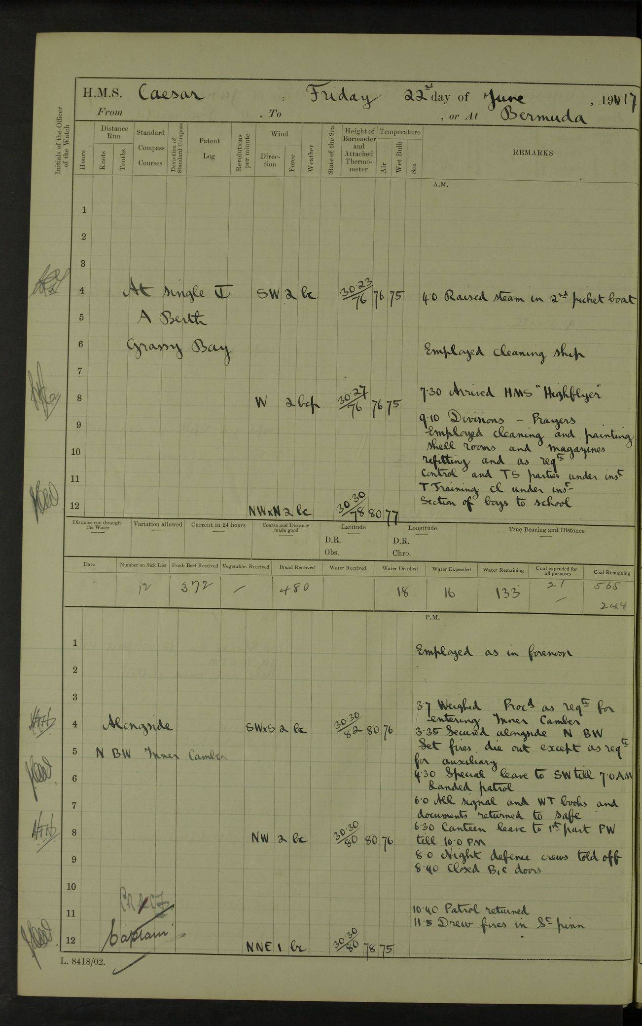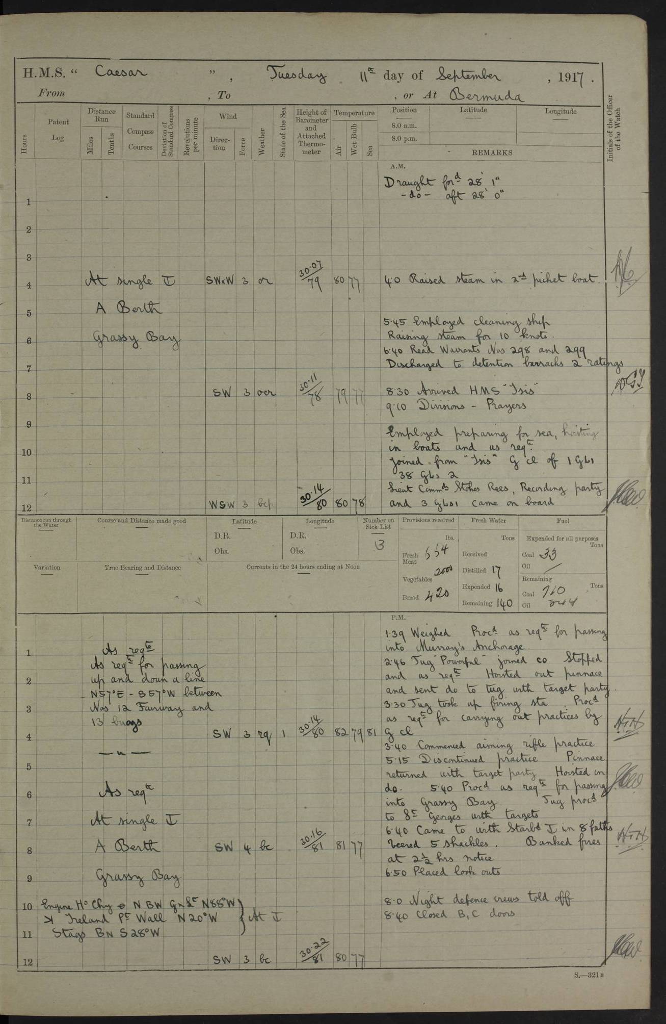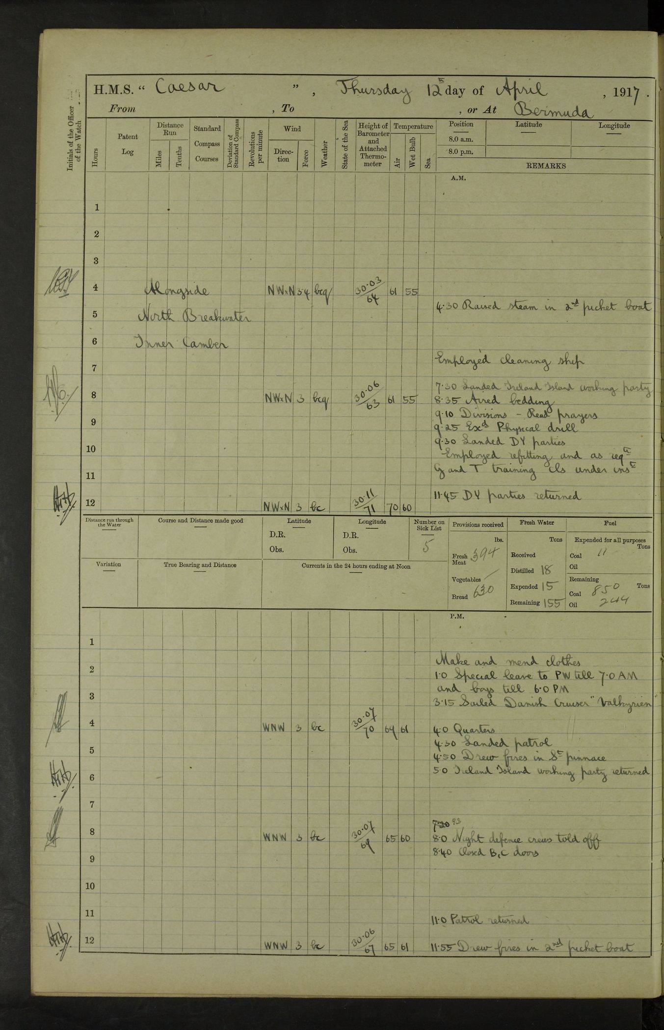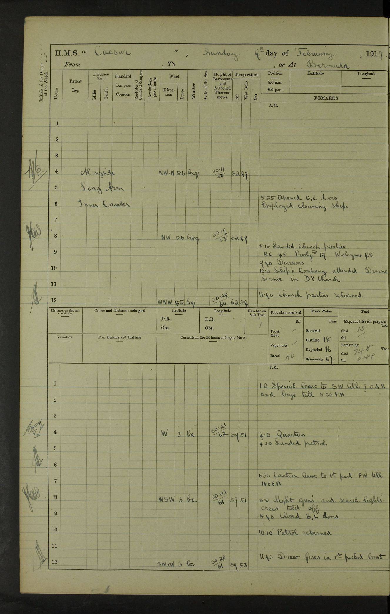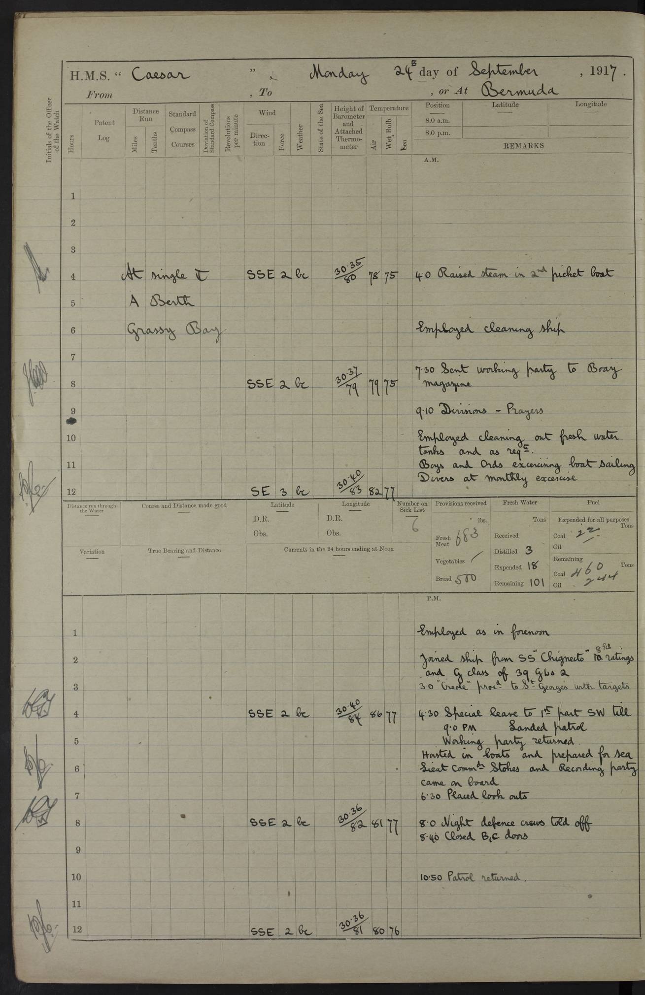 4caf84b6cadfd34197009939: (http://oldweather.s3.amazonaws.com/ADM53-36574/ADM 53-36574-145_1.jpg) 1 January 1917 At Bermuda Lat 32.32, Long -64.83 [Alongside Outer Camber Wall] 4.0am: Raised steam in first Picket boat. 6.0am: Employed cleaning ship. 7.0am: Landed Dockyard parties. Opened B, C doors. am: Employed drawing ammunition and stores, refitting and as requisite. 0.45pm: Paid monthly advance. pm: Employed as in forenoon. 4.30pm: Special leave to Starboard Watch till 7.0am. Landed patrol. 5.0pm: Dockyard parties returned. 6.30pm: Canteen leave to second part Port Watch till 10.0pm. 8.0pm: Night guns’ and search lights’ crews told off. 8.40pm: Closed B, C doors. 10.15pm: Patrol returned. 11.35pm: Drew fires in picket boats. [Number on sick list: 8] [Provisions received: Fresh Meat 340 lbs, Vegetables 2000 lbs, Bread 464 lbs] [Weather fine, though squally in early am. Noon temperature 63F] 4caf84b6cadfd3419700993a: (http://oldweather.s3.amazonaws.com/ADM53-36574/ADM 53-36574-146_0.jpg) 2 January 1917 [Year incorrectly shown as 1916] At Bermuda Lat 32.32, Long -64.83 [Alongside Outer Camber Wall] 4.30am: Raised steam in first picket boat. 6.30am: Landed working party to assist in repair of fenders in Inner Camber. 7.0am: Opened B, C doors. am: Employed embarking ammunition, refitting and as requisite. 11.45am: Working party returned. pm: Employed as in forenoon. 4.0pm: Quarters. 4.30pm: Special leave to Port Watch till 7.0am. Landed patrol. 6.30pm: Canteen leave to second part Starboard Watch till 10.0pm. 10.0pm: Patrol returned. 11.45pm: Drew fires in first picket boat. [Number on sick list: 8] [Provisions received: Fresh Meat 690 lbs, Bread 524 lbs] 4caf84b6cadfd3419700993b: (http://oldweather.s3.amazonaws.com/ADM53-36574/ADM 53-36574-146_1.jpg) 3 January 1917 [Year incorrectly shown as 1916] At Bermuda Lat 32.32, Long -64.83 [Alongside Outer Camber Wall] 7.0am: Opened B, C doors. Landed Dockyard parties. Sailed HMS “Antrim”. Landed Sanitary working party. am: Employed dismounting guns, drawing and returning stores, refitting and as requisite. Training class under instruction. 4.0pm: Quarters. Read Warrants No 268, 269. 4.30pm: Special leave to Starboard Watch till 7.0am. Landed patrol. 5.0pm: Dockyard and Working parties returned. 6.30pm: Canteen leave to first part Port Watch till 10.0pm. 8.5pm: Night guns’ and search lights’ crews told off. 10.0pm: Patrol returned. [Number on sick list: 8] [Provisions received: Fresh Meat 351 lbs, Vegetables 1000 lbs, Bread 512 lbs] 4caf84b6cadfd3419700993c: (http://oldweather.s3.amazonaws.com/ADM53-36574/ADM 53-36574-147_0.jpg) 4 January 1917 At Bermuda Lat 32.32, Long -64.83 [Alongside Outer Camber Wall] 7.0am: Landed Dockyard and Sanitary Working parties. am: Employed dismounting guns, sending up foretopmast, refitting and as requisite. Gunnery training class under instruction. 9.0am: Landed Working party to assist in repairs of fenders in Inner Camber. Discharged to SS “Kiakora” [probably Kaikoura] two ratings to form gun’s crew. 3.30pm: Working parties returned. 4.30pm: Special leave to Port Watch till 7.0am. Landed patrol. 6.30pm: Canteen leave to first part Starboard Watch till 10.0pm; 10.15pm: Patrol returned. [Number on sick list: 9] [Provisions received: Fresh Meat 353 lbs, Vegetables 1000 lbs, Bread 498 lbs] 4caf84b6cadfd3419700993d: (http://oldweather.s3.amazonaws.com/ADM53-36574/ADM 53-36574-147_1.jpg) 5 January 1917 At Bermuda Lat 32.32, Long -64.83 [Alongside Outer Camber Wall] 7.0am: Landed Dockyard and Sanitary Working parties. am: Employed refitting, dismounting guns and as requisite. Gunnery Training class under instruction. pm: Employed as in forenoon. 2.55pm: Arrived HMS “Antrim”. 4.30pm: Special leave to Starboard Watch till 7.0am. Landed patrol. 5.40pm: Drew fires in second picket boat. 6.30pm: Canteen leave to second part Port Watch till 10.0pm. 11.0pm: Patrol returned. 11.40pm: Drew fires in first picket boat. [Number on sick list: 9] [Provisions received: Fresh Meat 350 lbs, Vegetables 400 lbs, Bread 514 lbs] 4caf84b6cadfd3419700993e: (http://oldweather.s3.amazonaws.com/ADM53-36574/ADM 53-36574-148_0.jpg) 6 January 1917 At Bermuda Lat 32.32, Long -64.83 [Alongside Outer Camber Wall] 7.0am: Landed Dockyard parties. am: Employed cleaning ship, refitting, discharging ammunition from SS “Goodwood”, assisting in repairs to fenders of Inner Camber and as requisite. Training class under instruction. 11.45am: Dockyard parties returned. 0.30pm: Observed SS “Prophet” aground in Stag Channel. pm: Make and mend clothes. 1.30pm: Special leave to Port Watch till 7.0am and boys till 5.0pm. 3.0pm: SS “Prophet” refloated and proceeded to anchor. 4.0pm: Quarters. Read Warrant No 270. 4.30pm: Landed patrol. 5.0pm: Party employed discharging SS “Goodwood”. 6.30pm: Canteen leave to second part Starboard Watch till 10.0pm. 8.0pm: Night guns’ and search lights’ crews told off. 8.40pm: Closed B, C doors. 10.15pm: Patrol returned. [Number on sick list: 7] [Provisions received: Fresh Meat 361 lbs, Vegetables 2000 lbs, Bread 928 lbs] 4caf84b6cadfd3419700993f: (http://oldweather.s3.amazonaws.com/ADM53-36574/ADM 53-36574-148_1.jpg) 7 January 1917 At Bermuda Lat 32.32, Long -64.83 [Alongside Outer Camber Wall] 5.55am: Opened B, C doors. Employed cleaning ship. 8.30am: Landed Church parties, Presbyterians 18, Wesleyans 43, RCs 41. 9.30am: Divisions. 10.15am: Ship’s Company attended Divine Service at Dockyard Church. 11.20am: Church parties returned. 1.0pm: Special leave to Starboard Watch till 7.0am and boys will 5.0pm. 6.30pm: Canteen leave to first part Port Watch till 10.0pm. [Number on sick list: 8] [Weather fine, noon temperature 70F] 4caf84b6cadfd34197009940: (http://oldweather.s3.amazonaws.com/ADM53-36574/ADM 53-36574-149_0.jpg) 8 January 1917 At Bermuda Lat 32.32, Long -64.83 [Alongside Outer Camber Wall] 4.0am: Raised steam in first picket boat. 7.0am: Landed Dockyard parties. am: Employed dischargi
