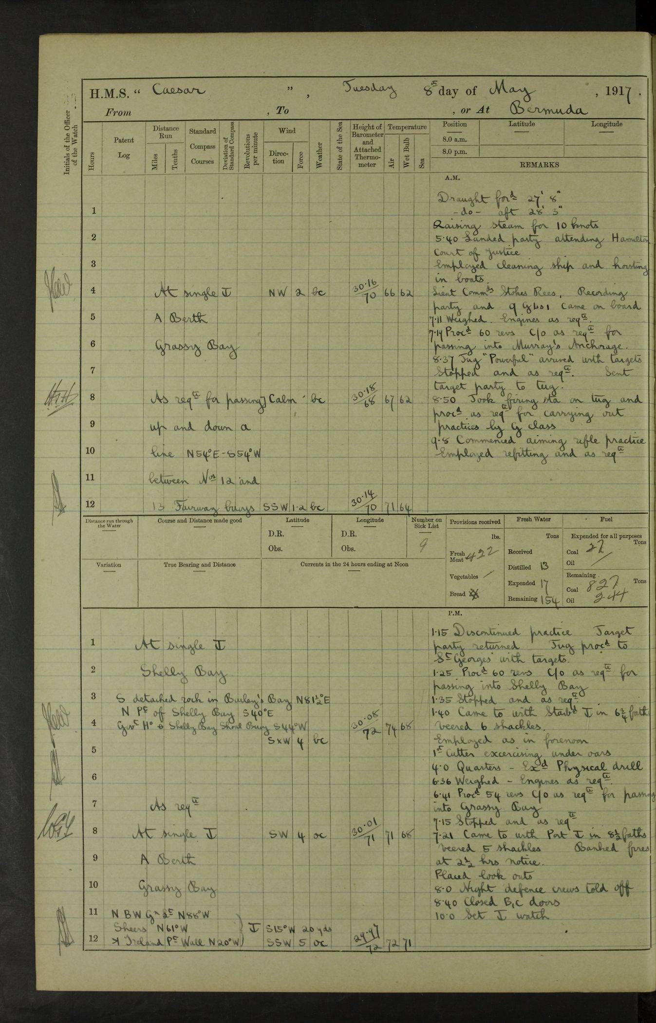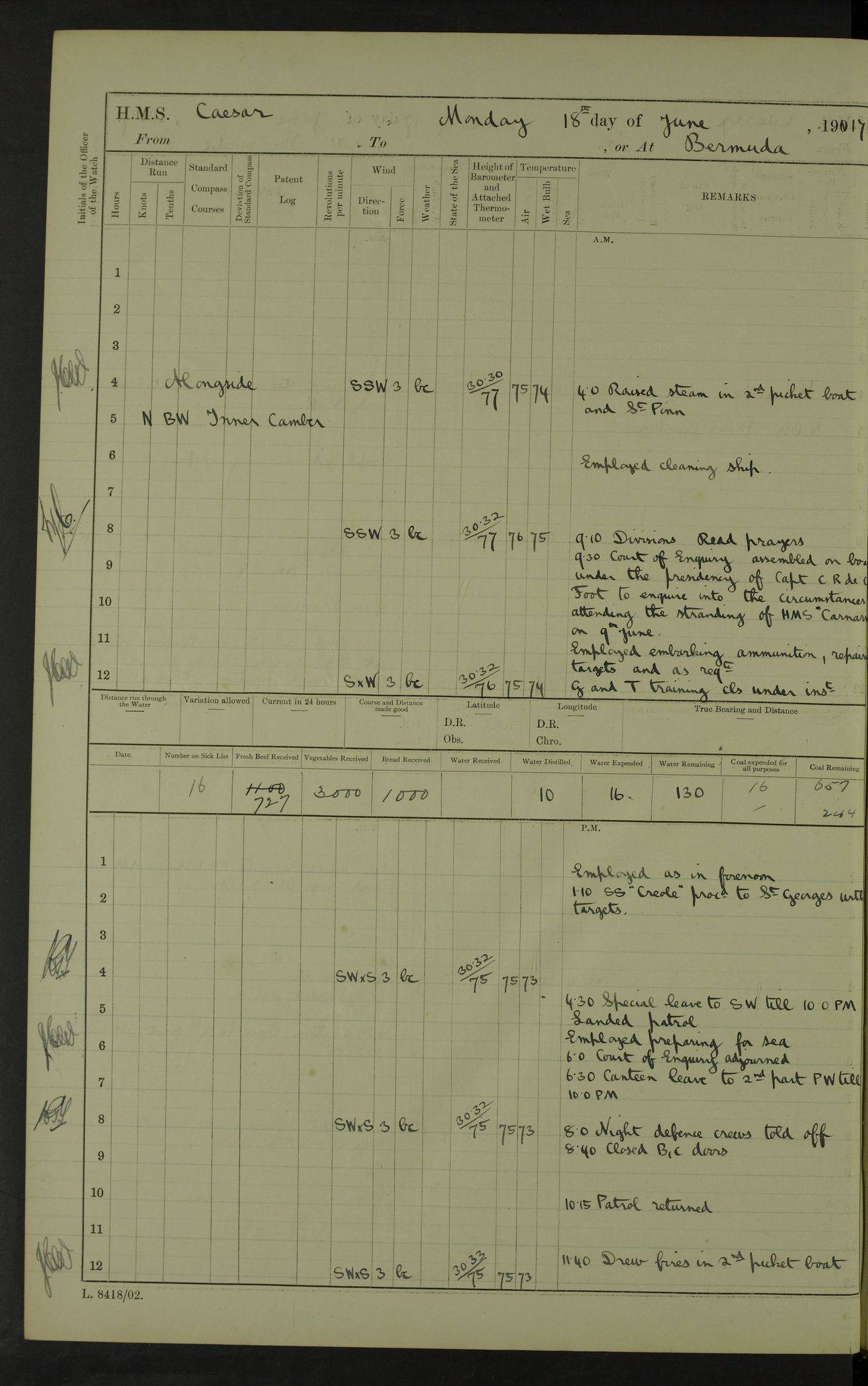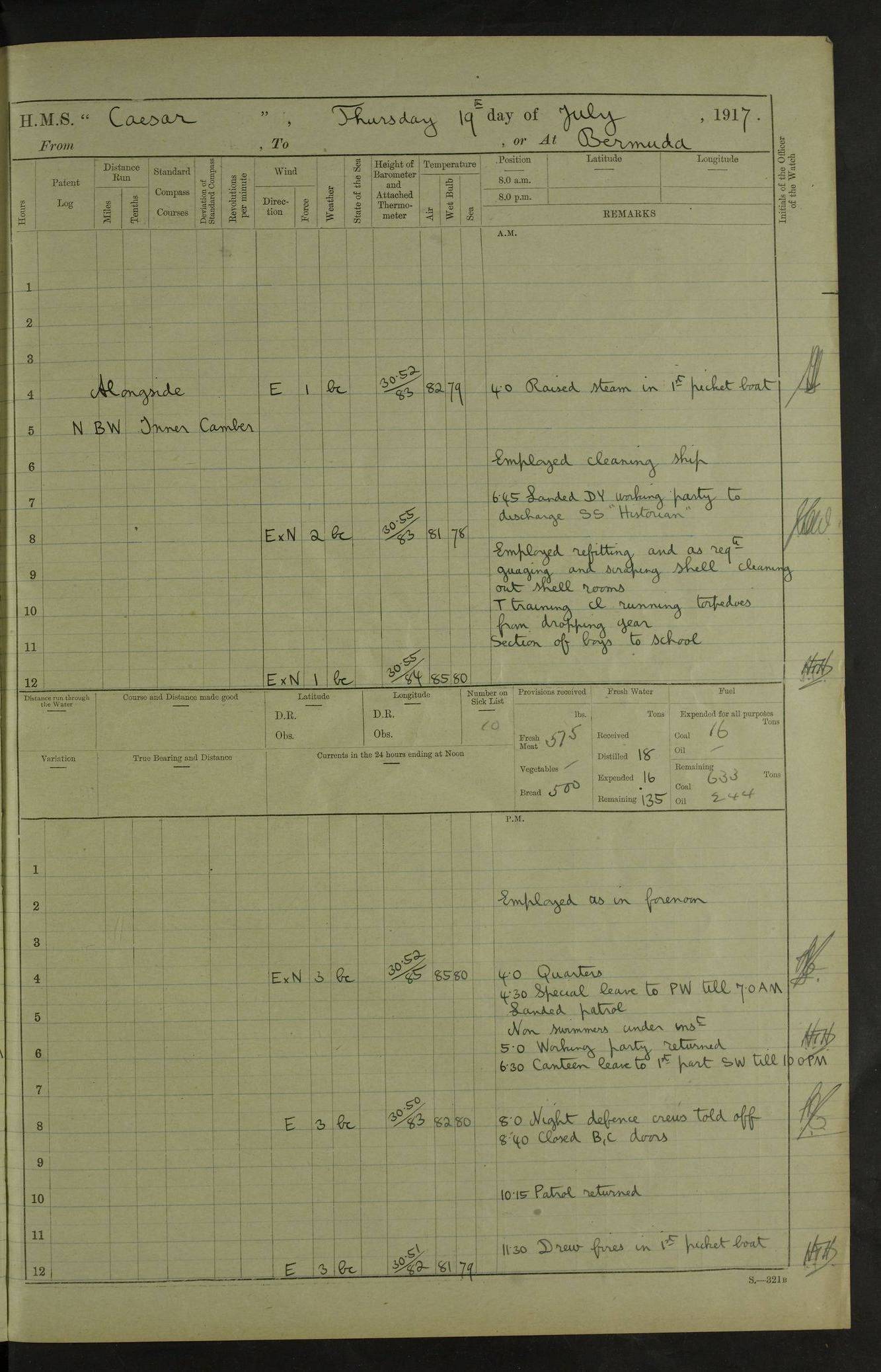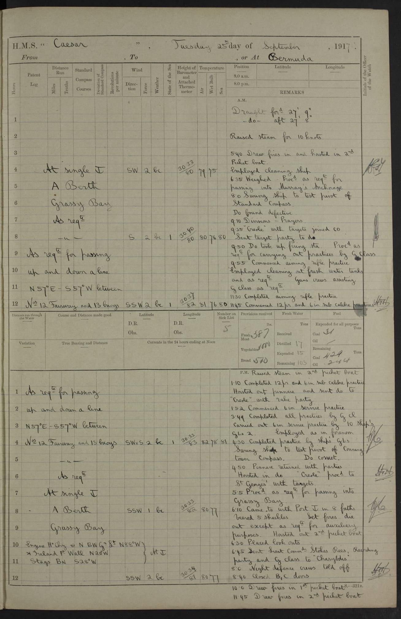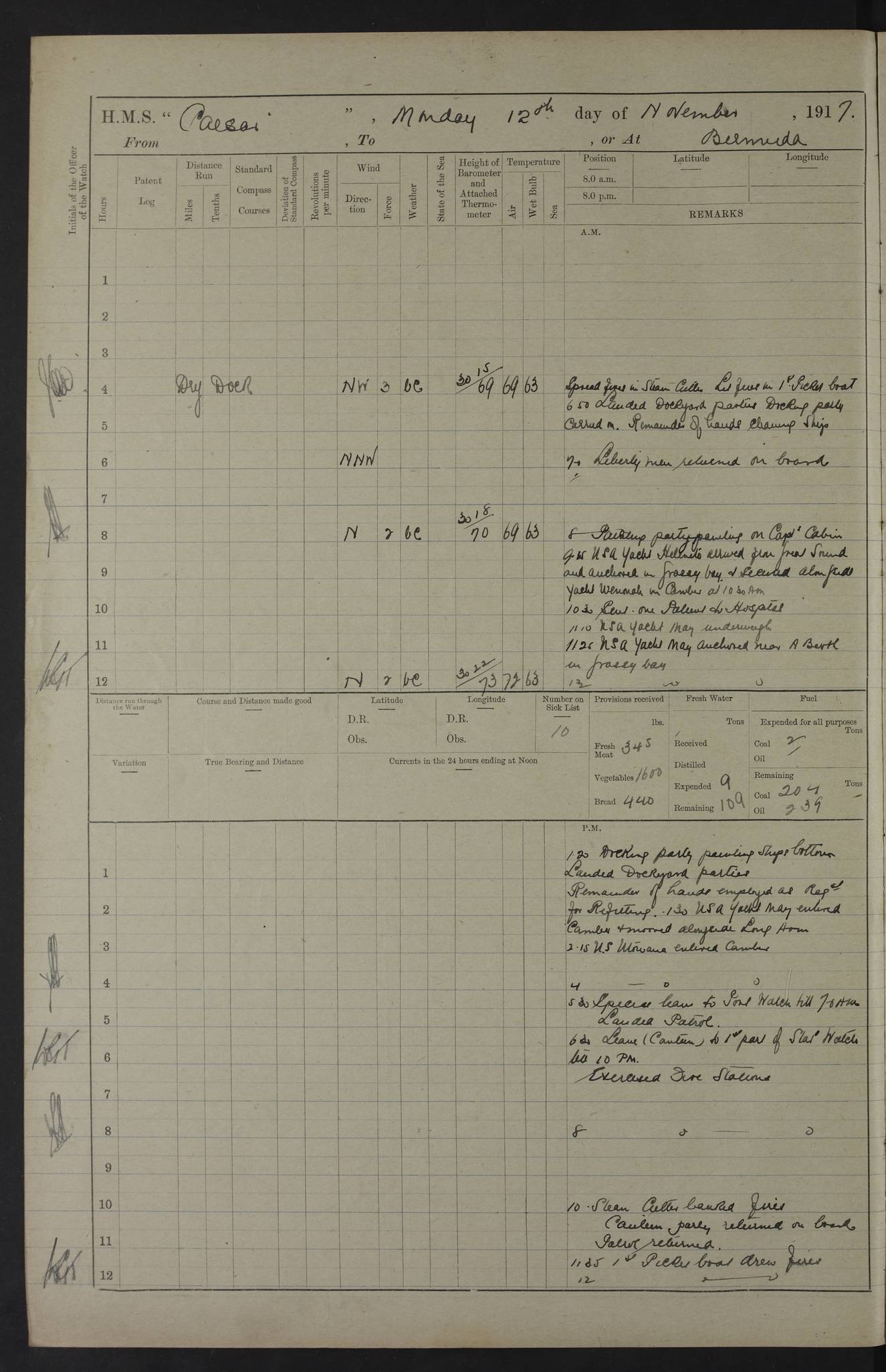 4caf84b6cadfd34197009939: (http://oldweather.s3.amazonaws.com/ADM53-36574/ADM 53-36574-145_1.jpg) 1 January 1917 At Bermuda Lat 32.32, Long -64.83 [Alongside Outer Camber Wall] 4.0am: Raised steam in first Picket boat. 6.0am: Employed cleaning ship. 7.0am: Landed Dockyard parties. Opened B, C doors. am: Employed drawing ammunition and stores, refitting and as requisite. 0.45pm: Paid monthly advance. pm: Employed as in forenoon. 4.30pm: Special leave to Starboard Watch till 7.0am. Landed patrol. 5.0pm: Dockyard parties returned. 6.30pm: Canteen leave to second part Port Watch till 10.0pm. 8.0pm: Night guns’ and search lights’ crews told off. 8.40pm: Closed B, C doors. 10.15pm: Patrol returned. 11.35pm: Drew fires in picket boats. [Number on sick list: 8] [Provisions received: Fresh Meat 340 lbs, Vegetables 2000 lbs, Bread 464 lbs] [Weather fine, though squally in early am. Noon temperature 63F] 4caf84b6cadfd3419700993a: (http://oldweather.s3.amazonaws.com/ADM53-36574/ADM 53-36574-146_0.jpg) 2 January 1917 [Year incorrectly shown as 1916] At Bermuda Lat 32.32, Long -64.83 [Alongside Outer Camber Wall] 4.30am: Raised steam in first picket boat. 6.30am: Landed working party to assist in repair of fenders in Inner Camber. 7.0am: Opened B, C doors. am: Employed embarking ammunition, refitting and as requisite. 11.45am: Working party returned. pm: Employed as in forenoon. 4.0pm: Quarters. 4.30pm: Special leave to Port Watch till 7.0am. Landed patrol. 6.30pm: Canteen leave to second part Starboard Watch till 10.0pm. 10.0pm: Patrol returned. 11.45pm: Drew fires in first picket boat. [Number on sick list: 8] [Provisions received: Fresh Meat 690 lbs, Bread 524 lbs] 4caf84b6cadfd3419700993b: (http://oldweather.s3.amazonaws.com/ADM53-36574/ADM 53-36574-146_1.jpg) 3 January 1917 [Year incorrectly shown as 1916] At Bermuda Lat 32.32, Long -64.83 [Alongside Outer Camber Wall] 7.0am: Opened B, C doors. Landed Dockyard parties. Sailed HMS “Antrim”. Landed Sanitary working party. am: Employed dismounting guns, drawing and returning stores, refitting and as requisite. Training class under instruction. 4.0pm: Quarters. Read Warrants No 268, 269. 4.30pm: Special leave to Starboard Watch till 7.0am. Landed patrol. 5.0pm: Dockyard and Working parties returned. 6.30pm: Canteen leave to first part Port Watch till 10.0pm. 8.5pm: Night guns’ and search lights’ crews told off. 10.0pm: Patrol returned. [Number on sick list: 8] [Provisions received: Fresh Meat 351 lbs, Vegetables 1000 lbs, Bread 512 lbs] 4caf84b6cadfd3419700993c: (http://oldweather.s3.amazonaws.com/ADM53-36574/ADM 53-36574-147_0.jpg) 4 January 1917 At Bermuda Lat 32.32, Long -64.83 [Alongside Outer Camber Wall] 7.0am: Landed Dockyard and Sanitary Working parties. am: Employed dismounting guns, sending up foretopmast, refitting and as requisite. Gunnery training class under instruction. 9.0am: Landed Working party to assist in repairs of fenders in Inner Camber. Discharged to SS “Kiakora” [probably Kaikoura] two ratings to form gun’s crew. 3.30pm: Working parties returned. 4.30pm: Special leave to Port Watch till 7.0am. Landed patrol. 6.30pm: Canteen leave to first part Starboard Watch till 10.0pm; 10.15pm: Patrol returned. [Number on sick list: 9] [Provisions received: Fresh Meat 353 lbs, Vegetables 1000 lbs, Bread 498 lbs] 4caf84b6cadfd3419700993d: (http://oldweather.s3.amazonaws.com/ADM53-36574/ADM 53-36574-147_1.jpg) 5 January 1917 At Bermuda Lat 32.32, Long -64.83 [Alongside Outer Camber Wall] 7.0am: Landed Dockyard and Sanitary Working parties. am: Employed refitting, dismounting guns and as requisite. Gunnery Training class under instruction. pm: Employed as in forenoon. 2.55pm: Arrived HMS “Antrim”. 4.30pm: Special leave to Starboard Watch till 7.0am. Landed patrol. 5.40pm: Drew fires in second picket boat. 6.30pm: Canteen leave to second part Port Watch till 10.0pm. 11.0pm: Patrol returned. 11.40pm: Drew fires in first picket boat. [Number on sick list: 9] [Provisions received: Fresh Meat 350 lbs, Vegetables 400 lbs, Bread 514 lbs] 4caf84b6cadfd3419700993e: (http://oldweather.s3.amazonaws.com/ADM53-36574/ADM 53-36574-148_0.jpg) 6 January 1917 At Bermuda Lat 32.32, Long -64.83 [Alongside Outer Camber Wall] 7.0am: Landed Dockyard parties. am: Employed cleaning ship, refitting, discharging ammunition from SS “Goodwood”, assisting in repairs to fenders of Inner Camber and as requisite. Training class under instruction. 11.45am: Dockyard parties returned. 0.30pm: Observed SS “Prophet” aground in Stag Channel. pm: Make and mend clothes. 1.30pm: Special leave to Port Watch till 7.0am and boys till 5.0pm. 3.0pm: SS “Prophet” refloated and proceeded to anchor. 4.0pm: Quarters. Read Warrant No 270. 4.30pm: Landed patrol. 5.0pm: Party employed discharging SS “Goodwood”. 6.30pm: Canteen leave to second part Starboard Watch till 10.0pm. 8.0pm: Night guns’ and search lights’ crews told off. 8.40pm: Closed B, C doors. 10.15pm: Patrol returned. [Number on sick list: 7] [Provisions received: Fresh Meat 361 lbs, Vegetables 2000 lbs, Bread 928 lbs] 4caf84b6cadfd3419700993f: (http://oldweather.s3.amazonaws.com/ADM53-36574/ADM 53-36574-148_1.jpg) 7 January 1917 At Bermuda Lat 32.32, Long -64.83 [Alongside Outer Camber Wall] 5.55am: Opened B, C doors. Employed cleaning ship. 8.30am: Landed Church parties, Presbyterians 18, Wesleyans 43, RCs 41. 9.30am: Divisions. 10.15am: Ship’s Company attended Divine Service at Dockyard Church. 11.20am: Church parties returned. 1.0pm: Special leave to Starboard Watch till 7.0am and boys will 5.0pm. 6.30pm: Canteen leave to first part Port Watch till 10.0pm. [Number on sick list: 8] [Weather fine, noon temperature 70F] 4caf84b6cadfd34197009940: (http://oldweather.s3.amazonaws.com/ADM53-36574/ADM 53-36574-149_0.jpg) 8 January 1917 At Bermuda Lat 32.32, Long -64.83 [Alongside Outer Camber Wall] 4.0am: Raised steam in first picket boat. 7.0am: Landed Dockyard parties. am: Employed dischargi
