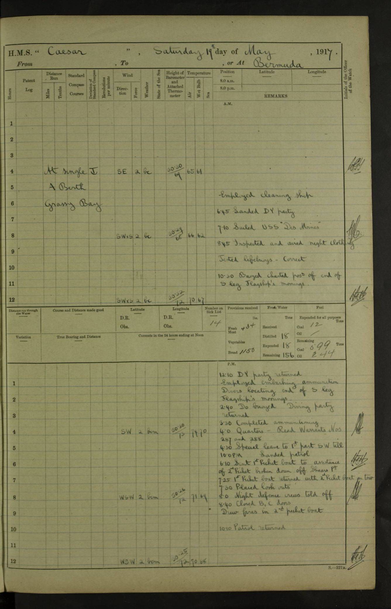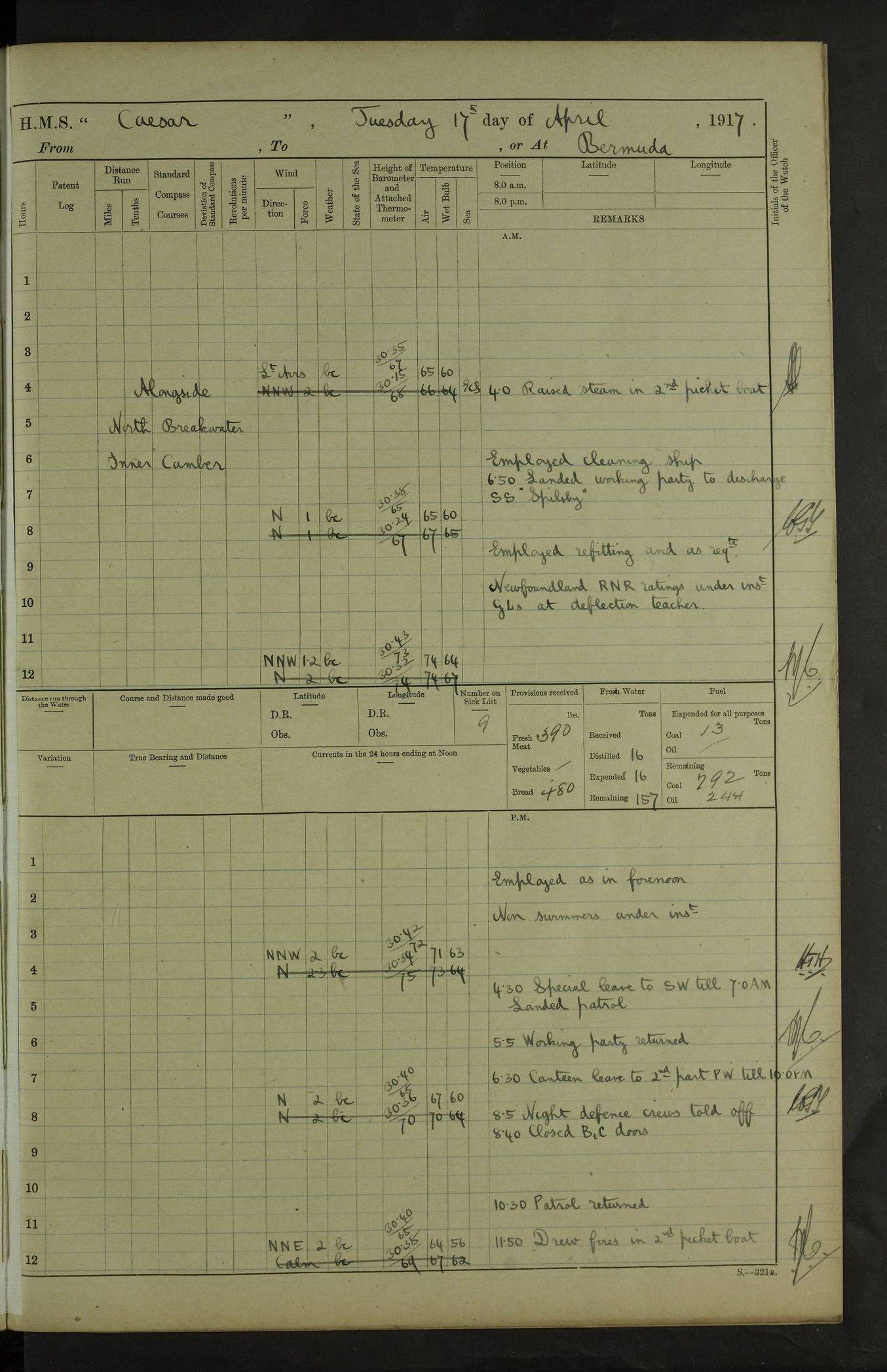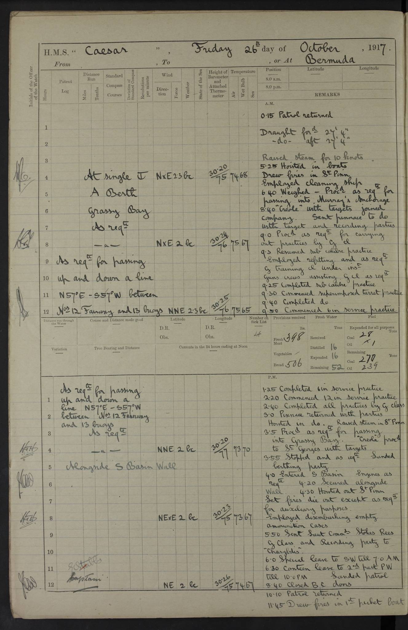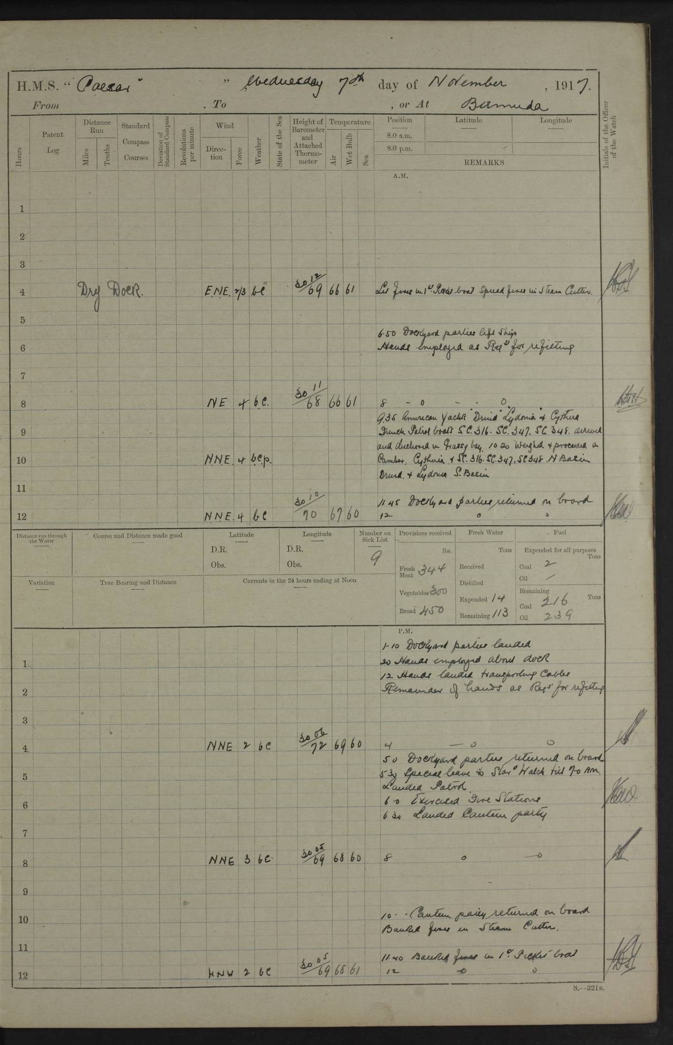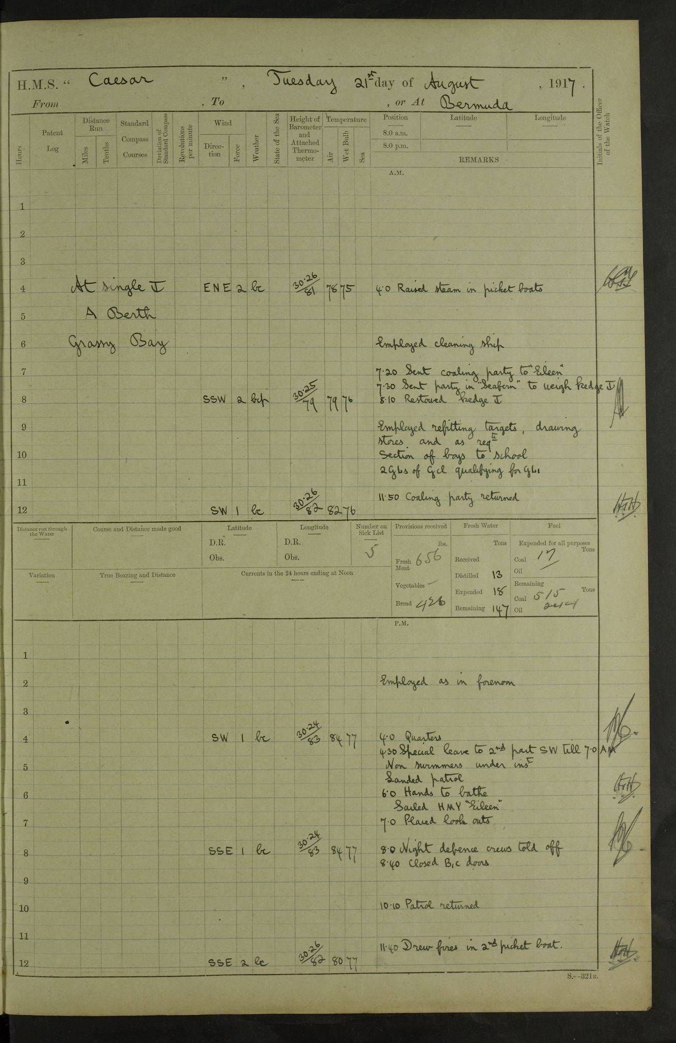 4caf84b6cadfd34197009939: (http://oldweather.s3.amazonaws.com/ADM53-36574/ADM 53-36574-145_1.jpg) 1 January 1917 At Bermuda Lat 32.32, Long -64.83 [Alongside Outer Camber Wall] 4.0am: Raised steam in first Picket boat. 6.0am: Employed cleaning ship. 7.0am: Landed Dockyard parties. Opened B, C doors. am: Employed drawing ammunition and stores, refitting and as requisite. 0.45pm: Paid monthly advance. pm: Employed as in forenoon. 4.30pm: Special leave to Starboard Watch till 7.0am. Landed patrol. 5.0pm: Dockyard parties returned. 6.30pm: Canteen leave to second part Port Watch till 10.0pm. 8.0pm: Night guns’ and search lights’ crews told off. 8.40pm: Closed B, C doors. 10.15pm: Patrol returned. 11.35pm: Drew fires in picket boats. [Number on sick list: 8] [Provisions received: Fresh Meat 340 lbs, Vegetables 2000 lbs, Bread 464 lbs] [Weather fine, though squally in early am. Noon temperature 63F] 4caf84b6cadfd3419700993a: (http://oldweather.s3.amazonaws.com/ADM53-36574/ADM 53-36574-146_0.jpg) 2 January 1917 [Year incorrectly shown as 1916] At Bermuda Lat 32.32, Long -64.83 [Alongside Outer Camber Wall] 4.30am: Raised steam in first picket boat. 6.30am: Landed working party to assist in repair of fenders in Inner Camber. 7.0am: Opened B, C doors. am: Employed embarking ammunition, refitting and as requisite. 11.45am: Working party returned. pm: Employed as in forenoon. 4.0pm: Quarters. 4.30pm: Special leave to Port Watch till 7.0am. Landed patrol. 6.30pm: Canteen leave to second part Starboard Watch till 10.0pm. 10.0pm: Patrol returned. 11.45pm: Drew fires in first picket boat. [Number on sick list: 8] [Provisions received: Fresh Meat 690 lbs, Bread 524 lbs] 4caf84b6cadfd3419700993b: (http://oldweather.s3.amazonaws.com/ADM53-36574/ADM 53-36574-146_1.jpg) 3 January 1917 [Year incorrectly shown as 1916] At Bermuda Lat 32.32, Long -64.83 [Alongside Outer Camber Wall] 7.0am: Opened B, C doors. Landed Dockyard parties. Sailed HMS “Antrim”. Landed Sanitary working party. am: Employed dismounting guns, drawing and returning stores, refitting and as requisite. Training class under instruction. 4.0pm: Quarters. Read Warrants No 268, 269. 4.30pm: Special leave to Starboard Watch till 7.0am. Landed patrol. 5.0pm: Dockyard and Working parties returned. 6.30pm: Canteen leave to first part Port Watch till 10.0pm. 8.5pm: Night guns’ and search lights’ crews told off. 10.0pm: Patrol returned. [Number on sick list: 8] [Provisions received: Fresh Meat 351 lbs, Vegetables 1000 lbs, Bread 512 lbs] 4caf84b6cadfd3419700993c: (http://oldweather.s3.amazonaws.com/ADM53-36574/ADM 53-36574-147_0.jpg) 4 January 1917 At Bermuda Lat 32.32, Long -64.83 [Alongside Outer Camber Wall] 7.0am: Landed Dockyard and Sanitary Working parties. am: Employed dismounting guns, sending up foretopmast, refitting and as requisite. Gunnery training class under instruction. 9.0am: Landed Working party to assist in repairs of fenders in Inner Camber. Discharged to SS “Kiakora” [probably Kaikoura] two ratings to form gun’s crew. 3.30pm: Working parties returned. 4.30pm: Special leave to Port Watch till 7.0am. Landed patrol. 6.30pm: Canteen leave to first part Starboard Watch till 10.0pm; 10.15pm: Patrol returned. [Number on sick list: 9] [Provisions received: Fresh Meat 353 lbs, Vegetables 1000 lbs, Bread 498 lbs] 4caf84b6cadfd3419700993d: (http://oldweather.s3.amazonaws.com/ADM53-36574/ADM 53-36574-147_1.jpg) 5 January 1917 At Bermuda Lat 32.32, Long -64.83 [Alongside Outer Camber Wall] 7.0am: Landed Dockyard and Sanitary Working parties. am: Employed refitting, dismounting guns and as requisite. Gunnery Training class under instruction. pm: Employed as in forenoon. 2.55pm: Arrived HMS “Antrim”. 4.30pm: Special leave to Starboard Watch till 7.0am. Landed patrol. 5.40pm: Drew fires in second picket boat. 6.30pm: Canteen leave to second part Port Watch till 10.0pm. 11.0pm: Patrol returned. 11.40pm: Drew fires in first picket boat. [Number on sick list: 9] [Provisions received: Fresh Meat 350 lbs, Vegetables 400 lbs, Bread 514 lbs] 4caf84b6cadfd3419700993e: (http://oldweather.s3.amazonaws.com/ADM53-36574/ADM 53-36574-148_0.jpg) 6 January 1917 At Bermuda Lat 32.32, Long -64.83 [Alongside Outer Camber Wall] 7.0am: Landed Dockyard parties. am: Employed cleaning ship, refitting, discharging ammunition from SS “Goodwood”, assisting in repairs to fenders of Inner Camber and as requisite. Training class under instruction. 11.45am: Dockyard parties returned. 0.30pm: Observed SS “Prophet” aground in Stag Channel. pm: Make and mend clothes. 1.30pm: Special leave to Port Watch till 7.0am and boys till 5.0pm. 3.0pm: SS “Prophet” refloated and proceeded to anchor. 4.0pm: Quarters. Read Warrant No 270. 4.30pm: Landed patrol. 5.0pm: Party employed discharging SS “Goodwood”. 6.30pm: Canteen leave to second part Starboard Watch till 10.0pm. 8.0pm: Night guns’ and search lights’ crews told off. 8.40pm: Closed B, C doors. 10.15pm: Patrol returned. [Number on sick list: 7] [Provisions received: Fresh Meat 361 lbs, Vegetables 2000 lbs, Bread 928 lbs] 4caf84b6cadfd3419700993f: (http://oldweather.s3.amazonaws.com/ADM53-36574/ADM 53-36574-148_1.jpg) 7 January 1917 At Bermuda Lat 32.32, Long -64.83 [Alongside Outer Camber Wall] 5.55am: Opened B, C doors. Employed cleaning ship. 8.30am: Landed Church parties, Presbyterians 18, Wesleyans 43, RCs 41. 9.30am: Divisions. 10.15am: Ship’s Company attended Divine Service at Dockyard Church. 11.20am: Church parties returned. 1.0pm: Special leave to Starboard Watch till 7.0am and boys will 5.0pm. 6.30pm: Canteen leave to first part Port Watch till 10.0pm. [Number on sick list: 8] [Weather fine, noon temperature 70F] 4caf84b6cadfd34197009940: (http://oldweather.s3.amazonaws.com/ADM53-36574/ADM 53-36574-149_0.jpg) 8 January 1917 At Bermuda Lat 32.32, Long -64.83 [Alongside Outer Camber Wall] 4.0am: Raised steam in first picket boat. 7.0am: Landed Dockyard parties. am: Employed dischargi