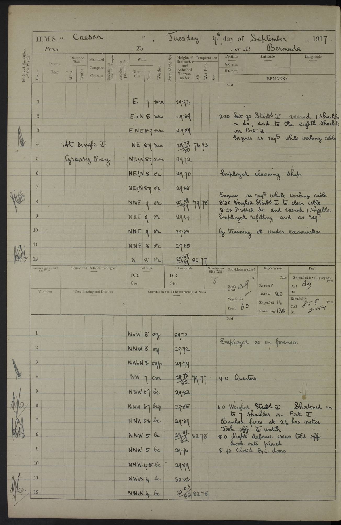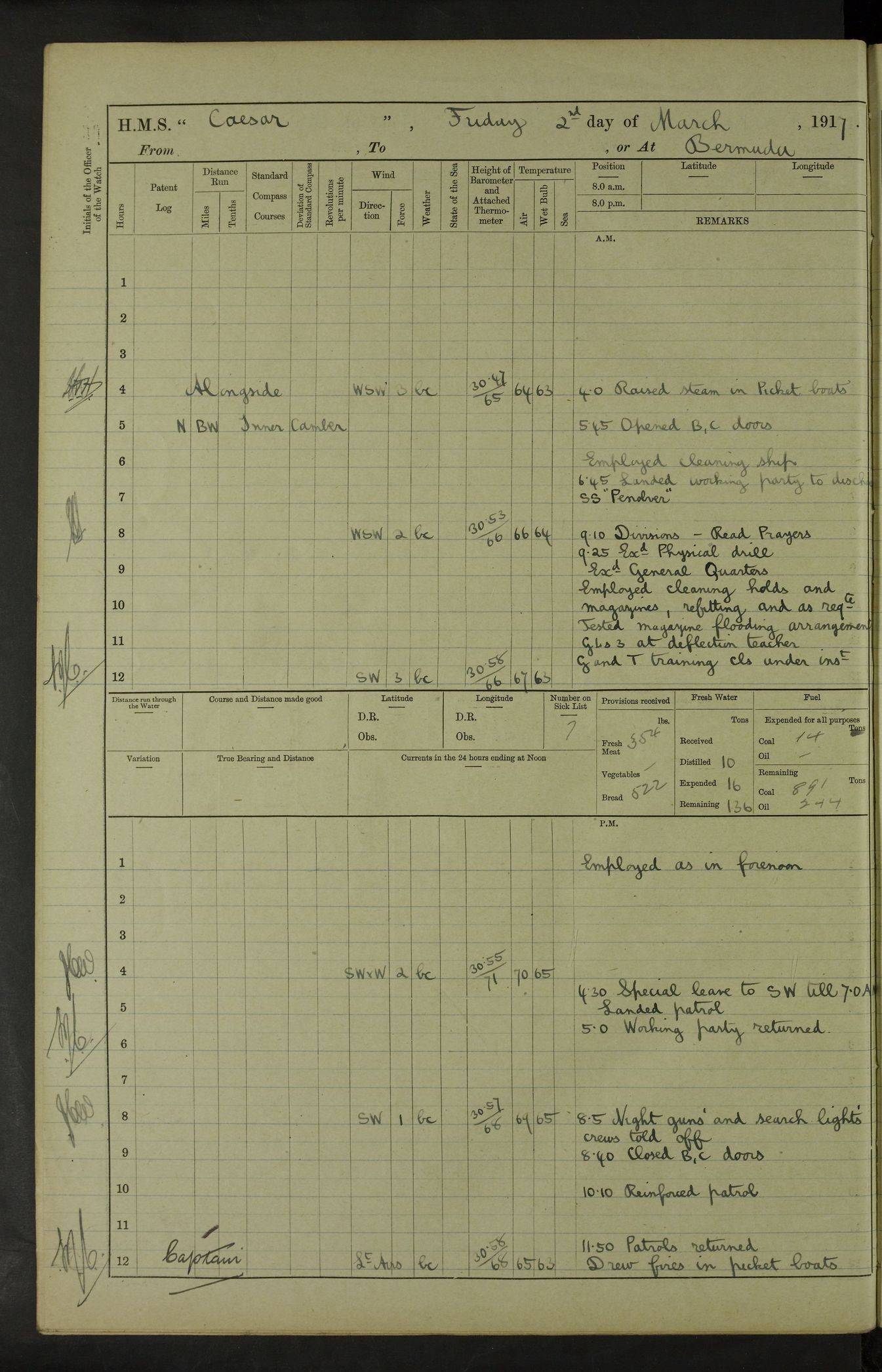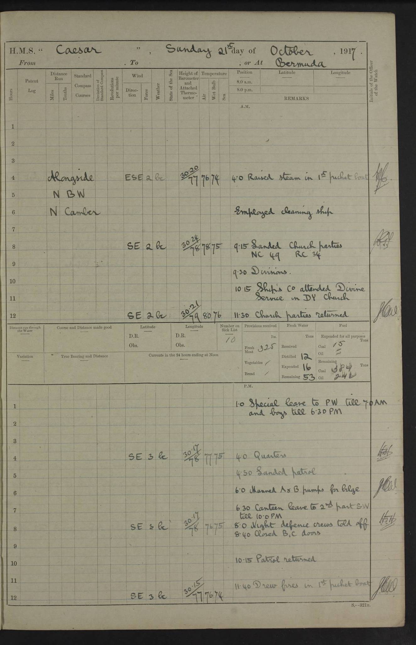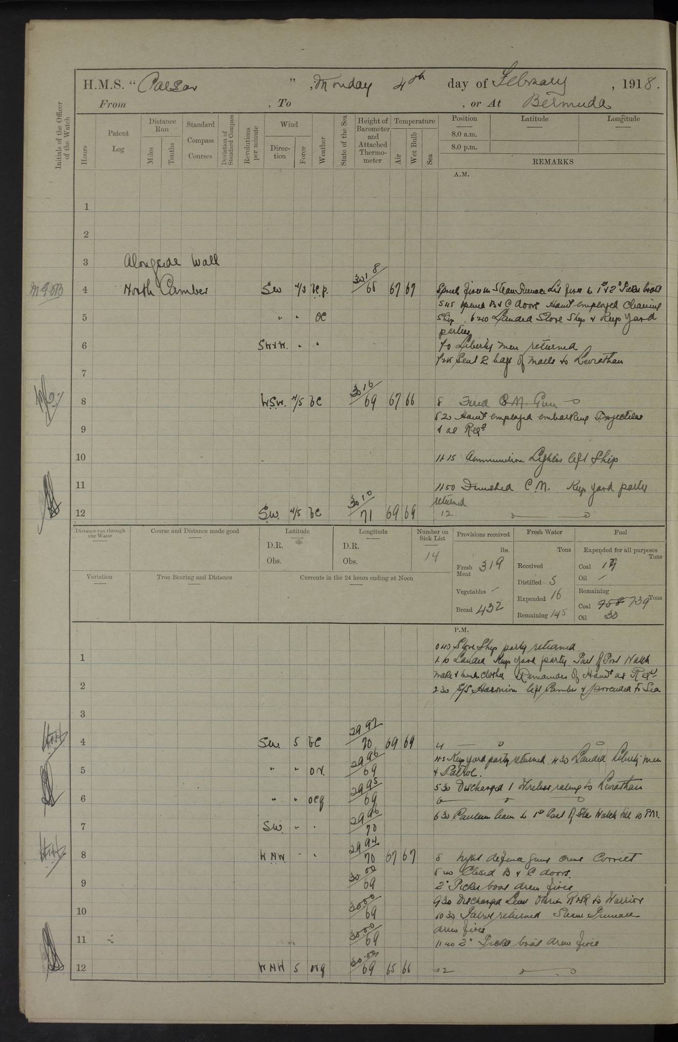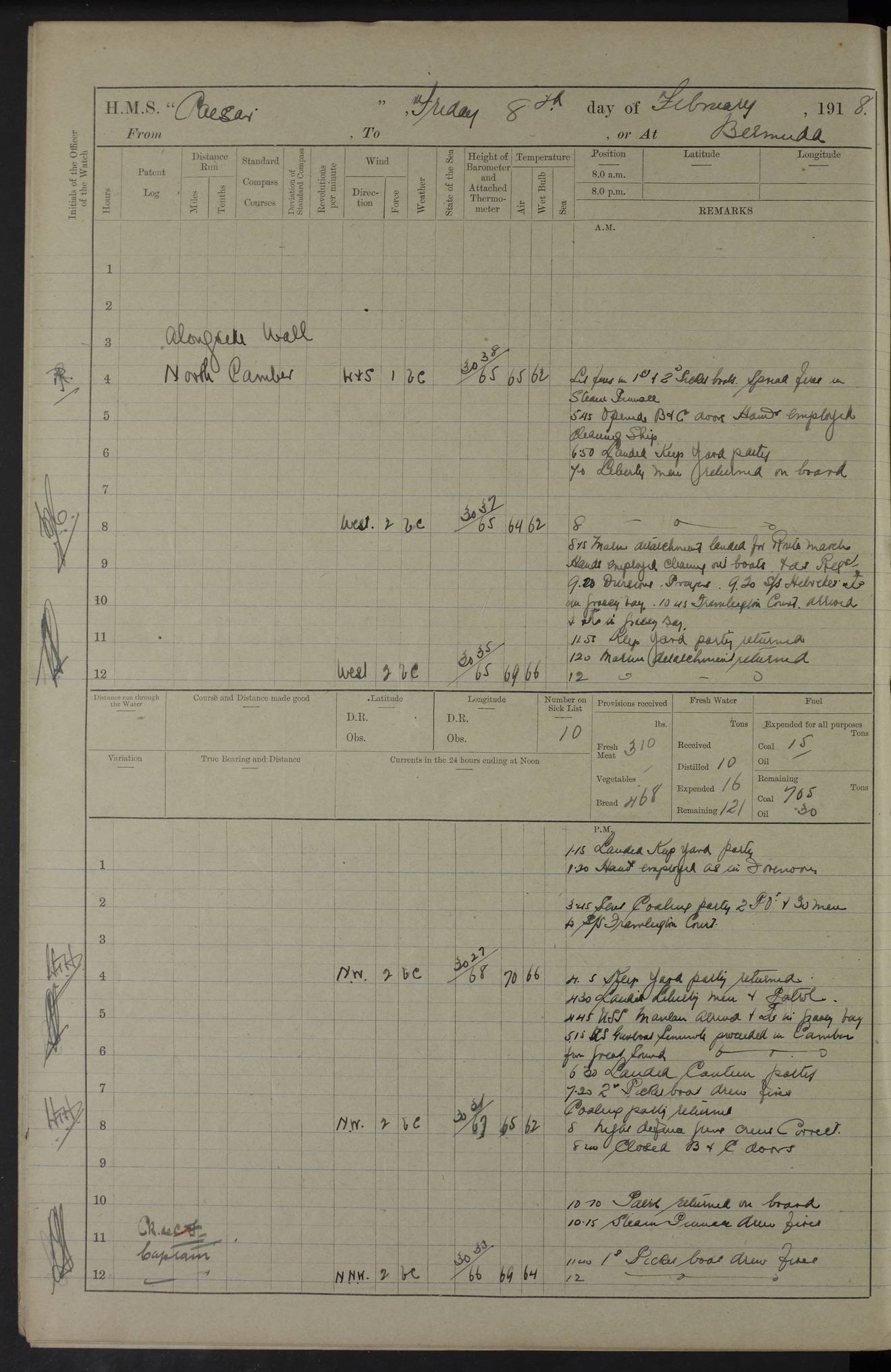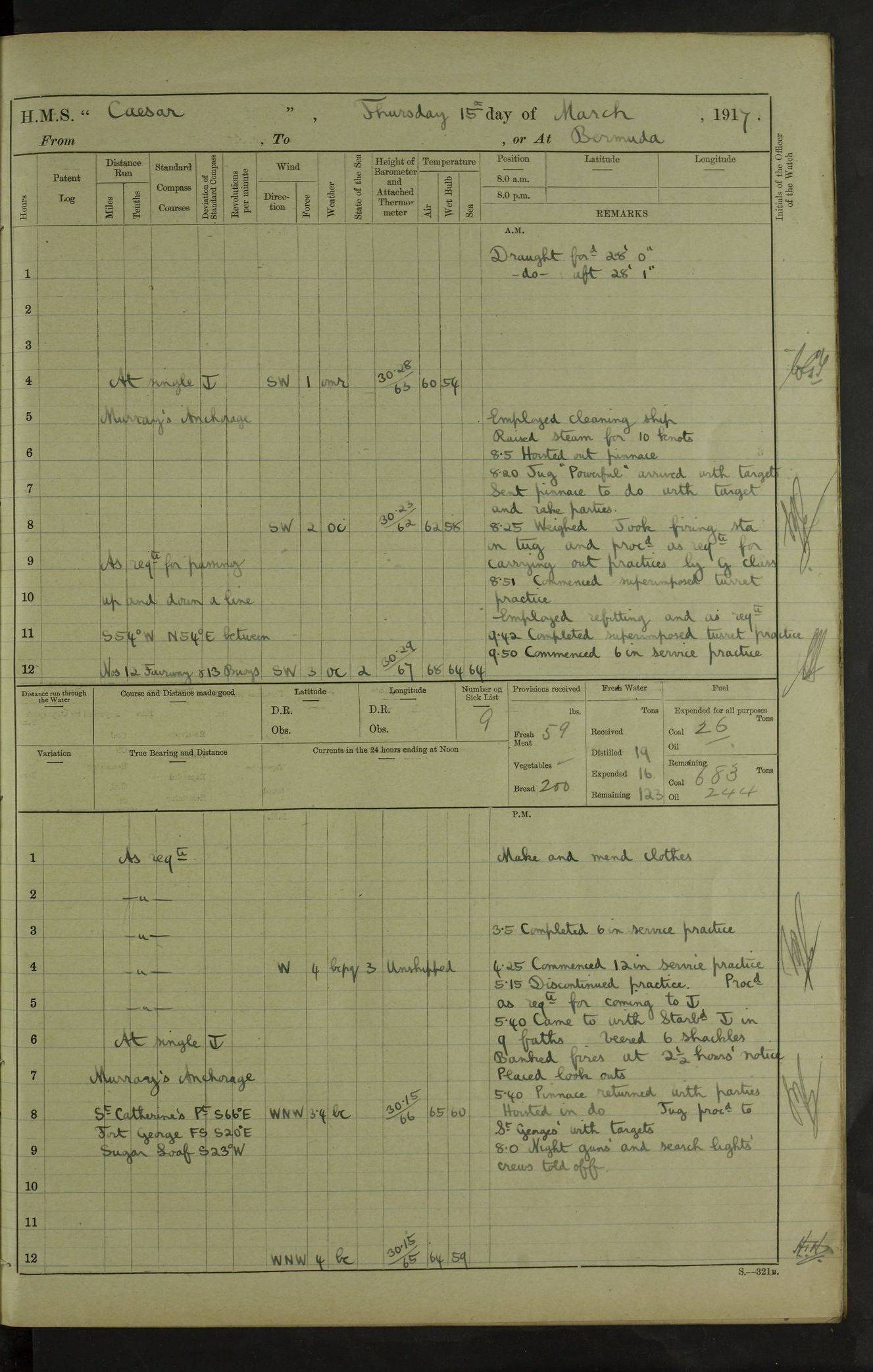 4caf84b6cadfd34197009939: (http://oldweather.s3.amazonaws.com/ADM53-36574/ADM 53-36574-145_1.jpg) 1 January 1917 At Bermuda Lat 32.32, Long -64.83 [Alongside Outer Camber Wall] 4.0am: Raised steam in first Picket boat. 6.0am: Employed cleaning ship. 7.0am: Landed Dockyard parties. Opened B, C doors. am: Employed drawing ammunition and stores, refitting and as requisite. 0.45pm: Paid monthly advance. pm: Employed as in forenoon. 4.30pm: Special leave to Starboard Watch till 7.0am. Landed patrol. 5.0pm: Dockyard parties returned. 6.30pm: Canteen leave to second part Port Watch till 10.0pm. 8.0pm: Night guns’ and search lights’ crews told off. 8.40pm: Closed B, C doors. 10.15pm: Patrol returned. 11.35pm: Drew fires in picket boats. [Number on sick list: 8] [Provisions received: Fresh Meat 340 lbs, Vegetables 2000 lbs, Bread 464 lbs] [Weather fine, though squally in early am. Noon temperature 63F] 4caf84b6cadfd3419700993a: (http://oldweather.s3.amazonaws.com/ADM53-36574/ADM 53-36574-146_0.jpg) 2 January 1917 [Year incorrectly shown as 1916] At Bermuda Lat 32.32, Long -64.83 [Alongside Outer Camber Wall] 4.30am: Raised steam in first picket boat. 6.30am: Landed working party to assist in repair of fenders in Inner Camber. 7.0am: Opened B, C doors. am: Employed embarking ammunition, refitting and as requisite. 11.45am: Working party returned. pm: Employed as in forenoon. 4.0pm: Quarters. 4.30pm: Special leave to Port Watch till 7.0am. Landed patrol. 6.30pm: Canteen leave to second part Starboard Watch till 10.0pm. 10.0pm: Patrol returned. 11.45pm: Drew fires in first picket boat. [Number on sick list: 8] [Provisions received: Fresh Meat 690 lbs, Bread 524 lbs] 4caf84b6cadfd3419700993b: (http://oldweather.s3.amazonaws.com/ADM53-36574/ADM 53-36574-146_1.jpg) 3 January 1917 [Year incorrectly shown as 1916] At Bermuda Lat 32.32, Long -64.83 [Alongside Outer Camber Wall] 7.0am: Opened B, C doors. Landed Dockyard parties. Sailed HMS “Antrim”. Landed Sanitary working party. am: Employed dismounting guns, drawing and returning stores, refitting and as requisite. Training class under instruction. 4.0pm: Quarters. Read Warrants No 268, 269. 4.30pm: Special leave to Starboard Watch till 7.0am. Landed patrol. 5.0pm: Dockyard and Working parties returned. 6.30pm: Canteen leave to first part Port Watch till 10.0pm. 8.5pm: Night guns’ and search lights’ crews told off. 10.0pm: Patrol returned. [Number on sick list: 8] [Provisions received: Fresh Meat 351 lbs, Vegetables 1000 lbs, Bread 512 lbs] 4caf84b6cadfd3419700993c: (http://oldweather.s3.amazonaws.com/ADM53-36574/ADM 53-36574-147_0.jpg) 4 January 1917 At Bermuda Lat 32.32, Long -64.83 [Alongside Outer Camber Wall] 7.0am: Landed Dockyard and Sanitary Working parties. am: Employed dismounting guns, sending up foretopmast, refitting and as requisite. Gunnery training class under instruction. 9.0am: Landed Working party to assist in repairs of fenders in Inner Camber. Discharged to SS “Kiakora” [probably Kaikoura] two ratings to form gun’s crew. 3.30pm: Working parties returned. 4.30pm: Special leave to Port Watch till 7.0am. Landed patrol. 6.30pm: Canteen leave to first part Starboard Watch till 10.0pm; 10.15pm: Patrol returned. [Number on sick list: 9] [Provisions received: Fresh Meat 353 lbs, Vegetables 1000 lbs, Bread 498 lbs] 4caf84b6cadfd3419700993d: (http://oldweather.s3.amazonaws.com/ADM53-36574/ADM 53-36574-147_1.jpg) 5 January 1917 At Bermuda Lat 32.32, Long -64.83 [Alongside Outer Camber Wall] 7.0am: Landed Dockyard and Sanitary Working parties. am: Employed refitting, dismounting guns and as requisite. Gunnery Training class under instruction. pm: Employed as in forenoon. 2.55pm: Arrived HMS “Antrim”. 4.30pm: Special leave to Starboard Watch till 7.0am. Landed patrol. 5.40pm: Drew fires in second picket boat. 6.30pm: Canteen leave to second part Port Watch till 10.0pm. 11.0pm: Patrol returned. 11.40pm: Drew fires in first picket boat. [Number on sick list: 9] [Provisions received: Fresh Meat 350 lbs, Vegetables 400 lbs, Bread 514 lbs] 4caf84b6cadfd3419700993e: (http://oldweather.s3.amazonaws.com/ADM53-36574/ADM 53-36574-148_0.jpg) 6 January 1917 At Bermuda Lat 32.32, Long -64.83 [Alongside Outer Camber Wall] 7.0am: Landed Dockyard parties. am: Employed cleaning ship, refitting, discharging ammunition from SS “Goodwood”, assisting in repairs to fenders of Inner Camber and as requisite. Training class under instruction. 11.45am: Dockyard parties returned. 0.30pm: Observed SS “Prophet” aground in Stag Channel. pm: Make and mend clothes. 1.30pm: Special leave to Port Watch till 7.0am and boys till 5.0pm. 3.0pm: SS “Prophet” refloated and proceeded to anchor. 4.0pm: Quarters. Read Warrant No 270. 4.30pm: Landed patrol. 5.0pm: Party employed discharging SS “Goodwood”. 6.30pm: Canteen leave to second part Starboard Watch till 10.0pm. 8.0pm: Night guns’ and search lights’ crews told off. 8.40pm: Closed B, C doors. 10.15pm: Patrol returned. [Number on sick list: 7] [Provisions received: Fresh Meat 361 lbs, Vegetables 2000 lbs, Bread 928 lbs] 4caf84b6cadfd3419700993f: (http://oldweather.s3.amazonaws.com/ADM53-36574/ADM 53-36574-148_1.jpg) 7 January 1917 At Bermuda Lat 32.32, Long -64.83 [Alongside Outer Camber Wall] 5.55am: Opened B, C doors. Employed cleaning ship. 8.30am: Landed Church parties, Presbyterians 18, Wesleyans 43, RCs 41. 9.30am: Divisions. 10.15am: Ship’s Company attended Divine Service at Dockyard Church. 11.20am: Church parties returned. 1.0pm: Special leave to Starboard Watch till 7.0am and boys will 5.0pm. 6.30pm: Canteen leave to first part Port Watch till 10.0pm. [Number on sick list: 8] [Weather fine, noon temperature 70F] 4caf84b6cadfd34197009940: (http://oldweather.s3.amazonaws.com/ADM53-36574/ADM 53-36574-149_0.jpg) 8 January 1917 At Bermuda Lat 32.32, Long -64.83 [Alongside Outer Camber Wall] 4.0am: Raised steam in first picket boat. 7.0am: Landed Dockyard parties. am: Employed dischargi