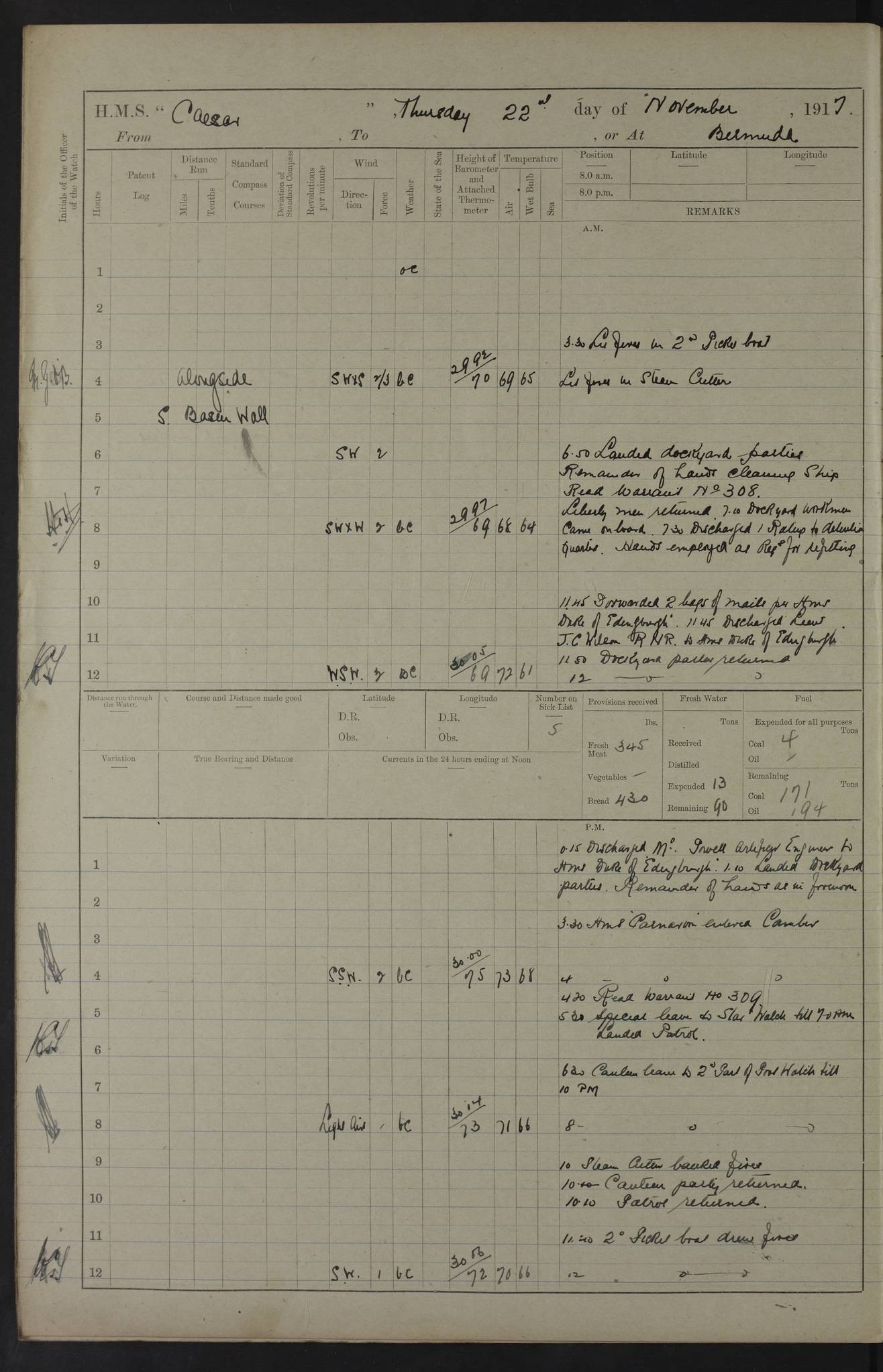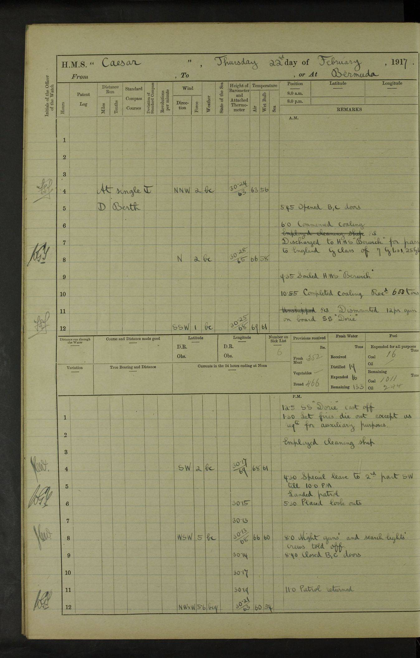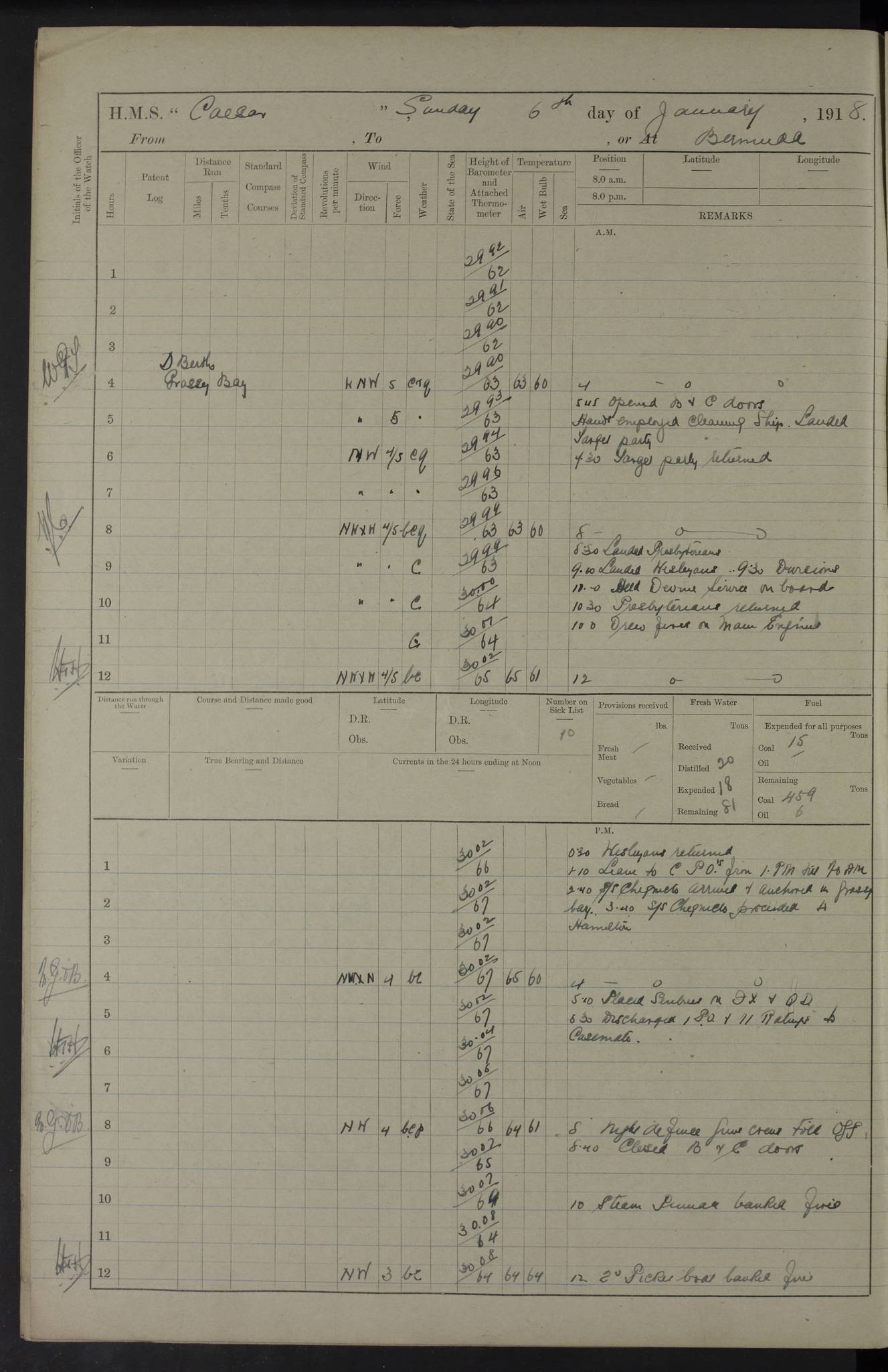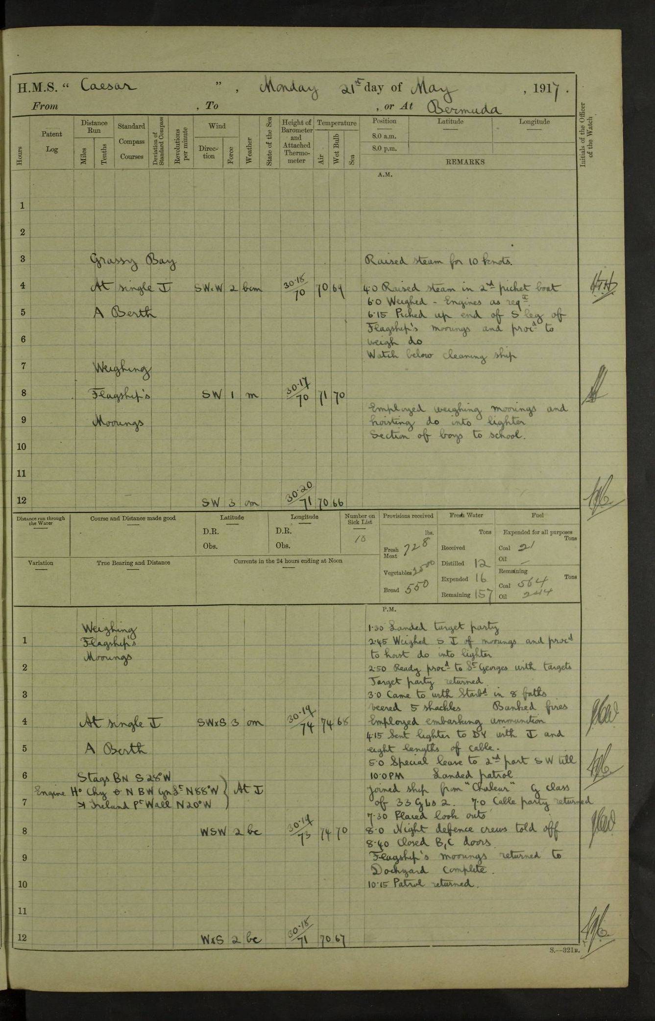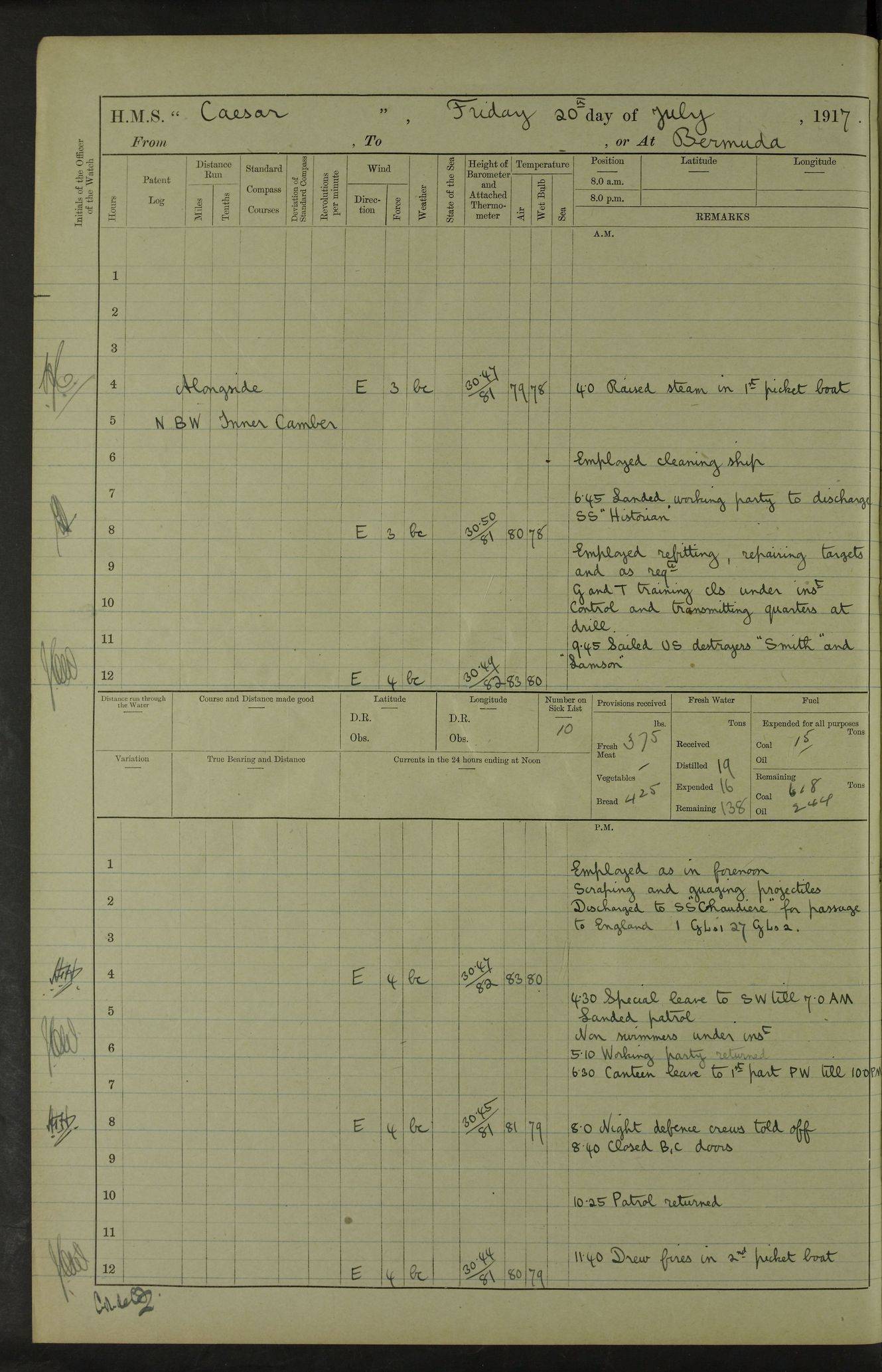 4caf84b6cadfd34197009939: (http://oldweather.s3.amazonaws.com/ADM53-36574/ADM 53-36574-145_1.jpg) 1 January 1917 At Bermuda Lat 32.32, Long -64.83 [Alongside Outer Camber Wall] 4.0am: Raised steam in first Picket boat. 6.0am: Employed cleaning ship. 7.0am: Landed Dockyard parties. Opened B, C doors. am: Employed drawing ammunition and stores, refitting and as requisite. 0.45pm: Paid monthly advance. pm: Employed as in forenoon. 4.30pm: Special leave to Starboard Watch till 7.0am. Landed patrol. 5.0pm: Dockyard parties returned. 6.30pm: Canteen leave to second part Port Watch till 10.0pm. 8.0pm: Night guns’ and search lights’ crews told off. 8.40pm: Closed B, C doors. 10.15pm: Patrol returned. 11.35pm: Drew fires in picket boats. [Number on sick list: 8] [Provisions received: Fresh Meat 340 lbs, Vegetables 2000 lbs, Bread 464 lbs] [Weather fine, though squally in early am. Noon temperature 63F] 4caf84b6cadfd3419700993a: (http://oldweather.s3.amazonaws.com/ADM53-36574/ADM 53-36574-146_0.jpg) 2 January 1917 [Year incorrectly shown as 1916] At Bermuda Lat 32.32, Long -64.83 [Alongside Outer Camber Wall] 4.30am: Raised steam in first picket boat. 6.30am: Landed working party to assist in repair of fenders in Inner Camber. 7.0am: Opened B, C doors. am: Employed embarking ammunition, refitting and as requisite. 11.45am: Working party returned. pm: Employed as in forenoon. 4.0pm: Quarters. 4.30pm: Special leave to Port Watch till 7.0am. Landed patrol. 6.30pm: Canteen leave to second part Starboard Watch till 10.0pm. 10.0pm: Patrol returned. 11.45pm: Drew fires in first picket boat. [Number on sick list: 8] [Provisions received: Fresh Meat 690 lbs, Bread 524 lbs] 4caf84b6cadfd3419700993b: (http://oldweather.s3.amazonaws.com/ADM53-36574/ADM 53-36574-146_1.jpg) 3 January 1917 [Year incorrectly shown as 1916] At Bermuda Lat 32.32, Long -64.83 [Alongside Outer Camber Wall] 7.0am: Opened B, C doors. Landed Dockyard parties. Sailed HMS “Antrim”. Landed Sanitary working party. am: Employed dismounting guns, drawing and returning stores, refitting and as requisite. Training class under instruction. 4.0pm: Quarters. Read Warrants No 268, 269. 4.30pm: Special leave to Starboard Watch till 7.0am. Landed patrol. 5.0pm: Dockyard and Working parties returned. 6.30pm: Canteen leave to first part Port Watch till 10.0pm. 8.5pm: Night guns’ and search lights’ crews told off. 10.0pm: Patrol returned. [Number on sick list: 8] [Provisions received: Fresh Meat 351 lbs, Vegetables 1000 lbs, Bread 512 lbs] 4caf84b6cadfd3419700993c: (http://oldweather.s3.amazonaws.com/ADM53-36574/ADM 53-36574-147_0.jpg) 4 January 1917 At Bermuda Lat 32.32, Long -64.83 [Alongside Outer Camber Wall] 7.0am: Landed Dockyard and Sanitary Working parties. am: Employed dismounting guns, sending up foretopmast, refitting and as requisite. Gunnery training class under instruction. 9.0am: Landed Working party to assist in repairs of fenders in Inner Camber. Discharged to SS “Kiakora” [probably Kaikoura] two ratings to form gun’s crew. 3.30pm: Working parties returned. 4.30pm: Special leave to Port Watch till 7.0am. Landed patrol. 6.30pm: Canteen leave to first part Starboard Watch till 10.0pm; 10.15pm: Patrol returned. [Number on sick list: 9] [Provisions received: Fresh Meat 353 lbs, Vegetables 1000 lbs, Bread 498 lbs] 4caf84b6cadfd3419700993d: (http://oldweather.s3.amazonaws.com/ADM53-36574/ADM 53-36574-147_1.jpg) 5 January 1917 At Bermuda Lat 32.32, Long -64.83 [Alongside Outer Camber Wall] 7.0am: Landed Dockyard and Sanitary Working parties. am: Employed refitting, dismounting guns and as requisite. Gunnery Training class under instruction. pm: Employed as in forenoon. 2.55pm: Arrived HMS “Antrim”. 4.30pm: Special leave to Starboard Watch till 7.0am. Landed patrol. 5.40pm: Drew fires in second picket boat. 6.30pm: Canteen leave to second part Port Watch till 10.0pm. 11.0pm: Patrol returned. 11.40pm: Drew fires in first picket boat. [Number on sick list: 9] [Provisions received: Fresh Meat 350 lbs, Vegetables 400 lbs, Bread 514 lbs] 4caf84b6cadfd3419700993e: (http://oldweather.s3.amazonaws.com/ADM53-36574/ADM 53-36574-148_0.jpg) 6 January 1917 At Bermuda Lat 32.32, Long -64.83 [Alongside Outer Camber Wall] 7.0am: Landed Dockyard parties. am: Employed cleaning ship, refitting, discharging ammunition from SS “Goodwood”, assisting in repairs to fenders of Inner Camber and as requisite. Training class under instruction. 11.45am: Dockyard parties returned. 0.30pm: Observed SS “Prophet” aground in Stag Channel. pm: Make and mend clothes. 1.30pm: Special leave to Port Watch till 7.0am and boys till 5.0pm. 3.0pm: SS “Prophet” refloated and proceeded to anchor. 4.0pm: Quarters. Read Warrant No 270. 4.30pm: Landed patrol. 5.0pm: Party employed discharging SS “Goodwood”. 6.30pm: Canteen leave to second part Starboard Watch till 10.0pm. 8.0pm: Night guns’ and search lights’ crews told off. 8.40pm: Closed B, C doors. 10.15pm: Patrol returned. [Number on sick list: 7] [Provisions received: Fresh Meat 361 lbs, Vegetables 2000 lbs, Bread 928 lbs] 4caf84b6cadfd3419700993f: (http://oldweather.s3.amazonaws.com/ADM53-36574/ADM 53-36574-148_1.jpg) 7 January 1917 At Bermuda Lat 32.32, Long -64.83 [Alongside Outer Camber Wall] 5.55am: Opened B, C doors. Employed cleaning ship. 8.30am: Landed Church parties, Presbyterians 18, Wesleyans 43, RCs 41. 9.30am: Divisions. 10.15am: Ship’s Company attended Divine Service at Dockyard Church. 11.20am: Church parties returned. 1.0pm: Special leave to Starboard Watch till 7.0am and boys will 5.0pm. 6.30pm: Canteen leave to first part Port Watch till 10.0pm. [Number on sick list: 8] [Weather fine, noon temperature 70F] 4caf84b6cadfd34197009940: (http://oldweather.s3.amazonaws.com/ADM53-36574/ADM 53-36574-149_0.jpg) 8 January 1917 At Bermuda Lat 32.32, Long -64.83 [Alongside Outer Camber Wall] 4.0am: Raised steam in first picket boat. 7.0am: Landed Dockyard parties. am: Employed dischargi