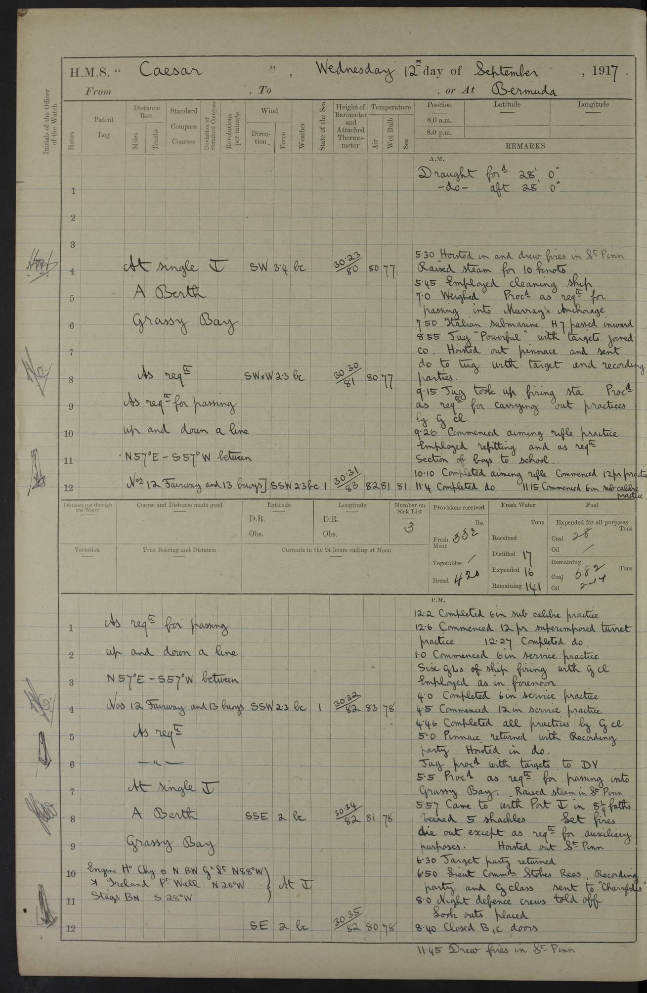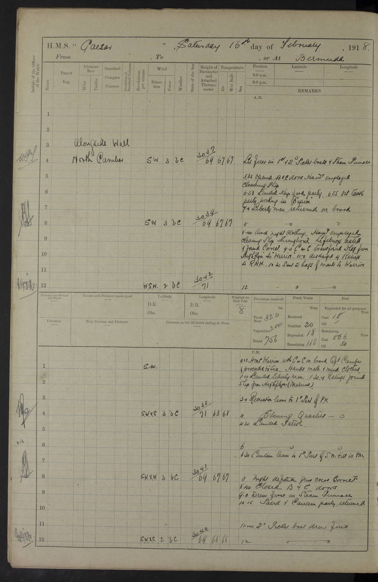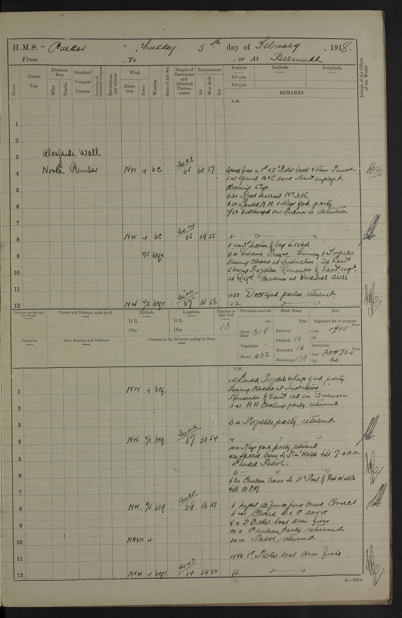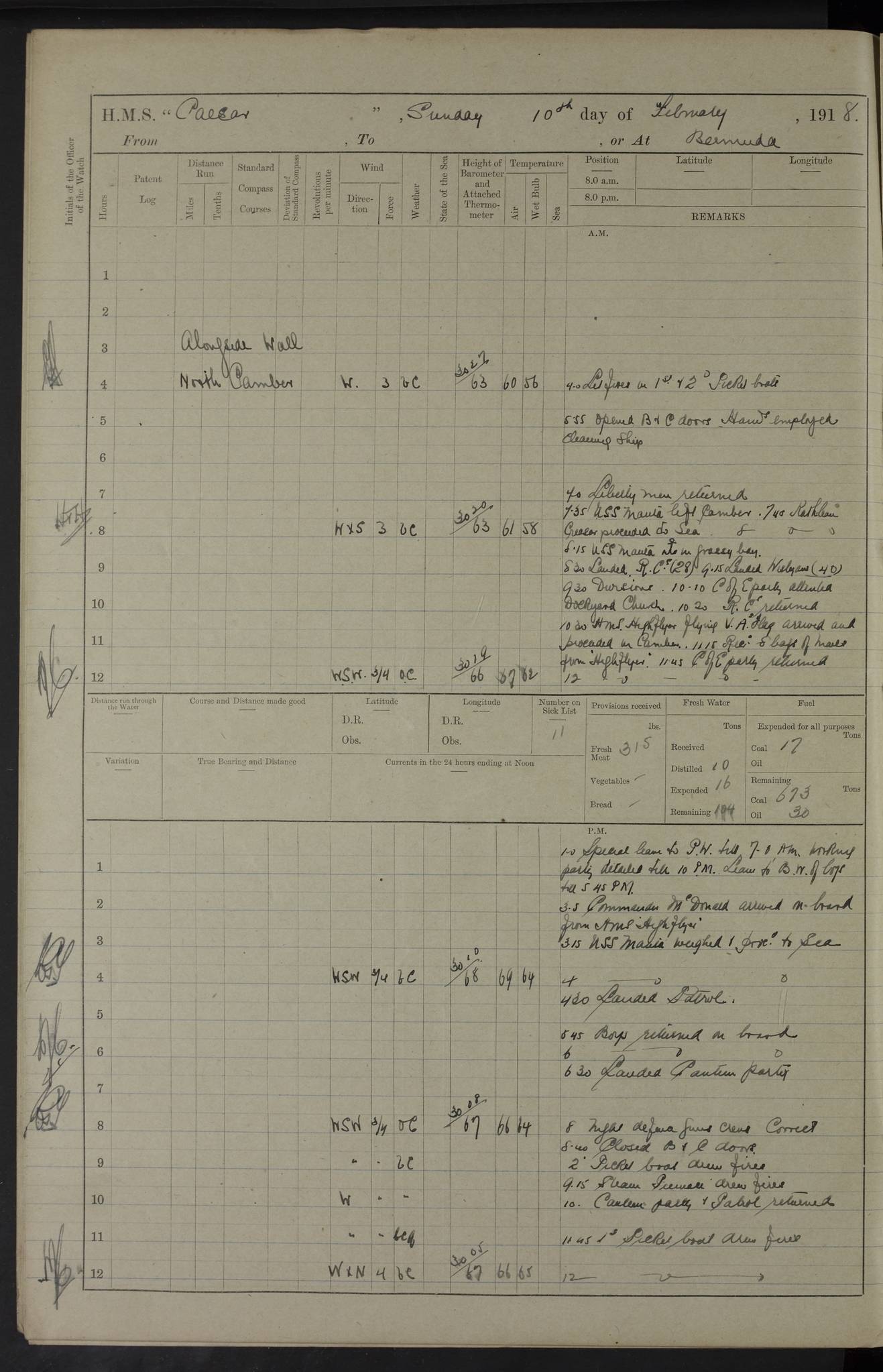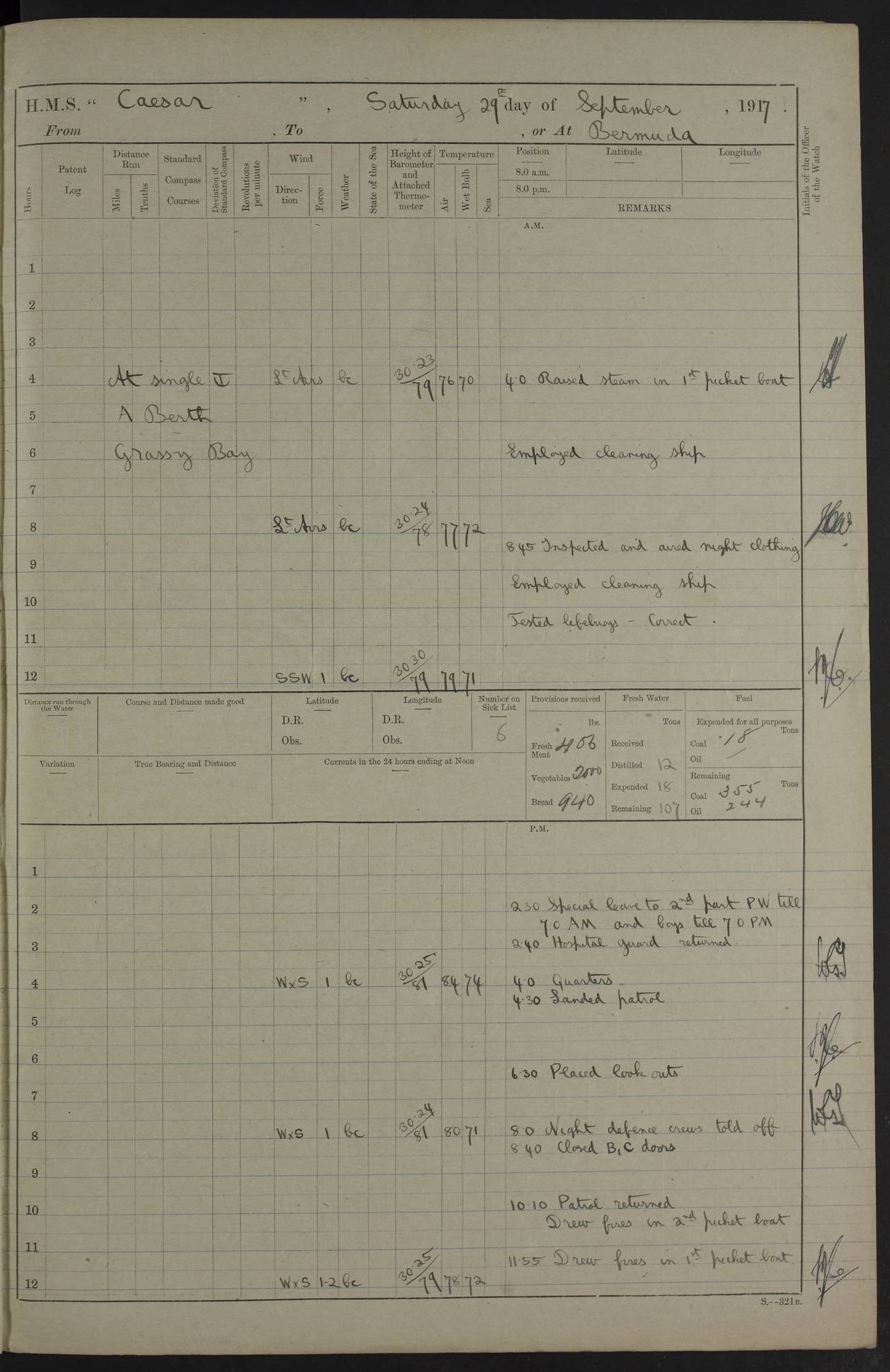 4caf84b6cadfd34197009939: (http://oldweather.s3.amazonaws.com/ADM53-36574/ADM 53-36574-145_1.jpg) 1 January 1917 At Bermuda Lat 32.32, Long -64.83 [Alongside Outer Camber Wall] 4.0am: Raised steam in first Picket boat. 6.0am: Employed cleaning ship. 7.0am: Landed Dockyard parties. Opened B, C doors. am: Employed drawing ammunition and stores, refitting and as requisite. 0.45pm: Paid monthly advance. pm: Employed as in forenoon. 4.30pm: Special leave to Starboard Watch till 7.0am. Landed patrol. 5.0pm: Dockyard parties returned. 6.30pm: Canteen leave to second part Port Watch till 10.0pm. 8.0pm: Night guns’ and search lights’ crews told off. 8.40pm: Closed B, C doors. 10.15pm: Patrol returned. 11.35pm: Drew fires in picket boats. [Number on sick list: 8] [Provisions received: Fresh Meat 340 lbs, Vegetables 2000 lbs, Bread 464 lbs] [Weather fine, though squally in early am. Noon temperature 63F] 4caf84b6cadfd3419700993a: (http://oldweather.s3.amazonaws.com/ADM53-36574/ADM 53-36574-146_0.jpg) 2 January 1917 [Year incorrectly shown as 1916] At Bermuda Lat 32.32, Long -64.83 [Alongside Outer Camber Wall] 4.30am: Raised steam in first picket boat. 6.30am: Landed working party to assist in repair of fenders in Inner Camber. 7.0am: Opened B, C doors. am: Employed embarking ammunition, refitting and as requisite. 11.45am: Working party returned. pm: Employed as in forenoon. 4.0pm: Quarters. 4.30pm: Special leave to Port Watch till 7.0am. Landed patrol. 6.30pm: Canteen leave to second part Starboard Watch till 10.0pm. 10.0pm: Patrol returned. 11.45pm: Drew fires in first picket boat. [Number on sick list: 8] [Provisions received: Fresh Meat 690 lbs, Bread 524 lbs] 4caf84b6cadfd3419700993b: (http://oldweather.s3.amazonaws.com/ADM53-36574/ADM 53-36574-146_1.jpg) 3 January 1917 [Year incorrectly shown as 1916] At Bermuda Lat 32.32, Long -64.83 [Alongside Outer Camber Wall] 7.0am: Opened B, C doors. Landed Dockyard parties. Sailed HMS “Antrim”. Landed Sanitary working party. am: Employed dismounting guns, drawing and returning stores, refitting and as requisite. Training class under instruction. 4.0pm: Quarters. Read Warrants No 268, 269. 4.30pm: Special leave to Starboard Watch till 7.0am. Landed patrol. 5.0pm: Dockyard and Working parties returned. 6.30pm: Canteen leave to first part Port Watch till 10.0pm. 8.5pm: Night guns’ and search lights’ crews told off. 10.0pm: Patrol returned. [Number on sick list: 8] [Provisions received: Fresh Meat 351 lbs, Vegetables 1000 lbs, Bread 512 lbs] 4caf84b6cadfd3419700993c: (http://oldweather.s3.amazonaws.com/ADM53-36574/ADM 53-36574-147_0.jpg) 4 January 1917 At Bermuda Lat 32.32, Long -64.83 [Alongside Outer Camber Wall] 7.0am: Landed Dockyard and Sanitary Working parties. am: Employed dismounting guns, sending up foretopmast, refitting and as requisite. Gunnery training class under instruction. 9.0am: Landed Working party to assist in repairs of fenders in Inner Camber. Discharged to SS “Kiakora” [probably Kaikoura] two ratings to form gun’s crew. 3.30pm: Working parties returned. 4.30pm: Special leave to Port Watch till 7.0am. Landed patrol. 6.30pm: Canteen leave to first part Starboard Watch till 10.0pm; 10.15pm: Patrol returned. [Number on sick list: 9] [Provisions received: Fresh Meat 353 lbs, Vegetables 1000 lbs, Bread 498 lbs] 4caf84b6cadfd3419700993d: (http://oldweather.s3.amazonaws.com/ADM53-36574/ADM 53-36574-147_1.jpg) 5 January 1917 At Bermuda Lat 32.32, Long -64.83 [Alongside Outer Camber Wall] 7.0am: Landed Dockyard and Sanitary Working parties. am: Employed refitting, dismounting guns and as requisite. Gunnery Training class under instruction. pm: Employed as in forenoon. 2.55pm: Arrived HMS “Antrim”. 4.30pm: Special leave to Starboard Watch till 7.0am. Landed patrol. 5.40pm: Drew fires in second picket boat. 6.30pm: Canteen leave to second part Port Watch till 10.0pm. 11.0pm: Patrol returned. 11.40pm: Drew fires in first picket boat. [Number on sick list: 9] [Provisions received: Fresh Meat 350 lbs, Vegetables 400 lbs, Bread 514 lbs] 4caf84b6cadfd3419700993e: (http://oldweather.s3.amazonaws.com/ADM53-36574/ADM 53-36574-148_0.jpg) 6 January 1917 At Bermuda Lat 32.32, Long -64.83 [Alongside Outer Camber Wall] 7.0am: Landed Dockyard parties. am: Employed cleaning ship, refitting, discharging ammunition from SS “Goodwood”, assisting in repairs to fenders of Inner Camber and as requisite. Training class under instruction. 11.45am: Dockyard parties returned. 0.30pm: Observed SS “Prophet” aground in Stag Channel. pm: Make and mend clothes. 1.30pm: Special leave to Port Watch till 7.0am and boys till 5.0pm. 3.0pm: SS “Prophet” refloated and proceeded to anchor. 4.0pm: Quarters. Read Warrant No 270. 4.30pm: Landed patrol. 5.0pm: Party employed discharging SS “Goodwood”. 6.30pm: Canteen leave to second part Starboard Watch till 10.0pm. 8.0pm: Night guns’ and search lights’ crews told off. 8.40pm: Closed B, C doors. 10.15pm: Patrol returned. [Number on sick list: 7] [Provisions received: Fresh Meat 361 lbs, Vegetables 2000 lbs, Bread 928 lbs] 4caf84b6cadfd3419700993f: (http://oldweather.s3.amazonaws.com/ADM53-36574/ADM 53-36574-148_1.jpg) 7 January 1917 At Bermuda Lat 32.32, Long -64.83 [Alongside Outer Camber Wall] 5.55am: Opened B, C doors. Employed cleaning ship. 8.30am: Landed Church parties, Presbyterians 18, Wesleyans 43, RCs 41. 9.30am: Divisions. 10.15am: Ship’s Company attended Divine Service at Dockyard Church. 11.20am: Church parties returned. 1.0pm: Special leave to Starboard Watch till 7.0am and boys will 5.0pm. 6.30pm: Canteen leave to first part Port Watch till 10.0pm. [Number on sick list: 8] [Weather fine, noon temperature 70F] 4caf84b6cadfd34197009940: (http://oldweather.s3.amazonaws.com/ADM53-36574/ADM 53-36574-149_0.jpg) 8 January 1917 At Bermuda Lat 32.32, Long -64.83 [Alongside Outer Camber Wall] 4.0am: Raised steam in first picket boat. 7.0am: Landed Dockyard parties. am: Employed dischargi