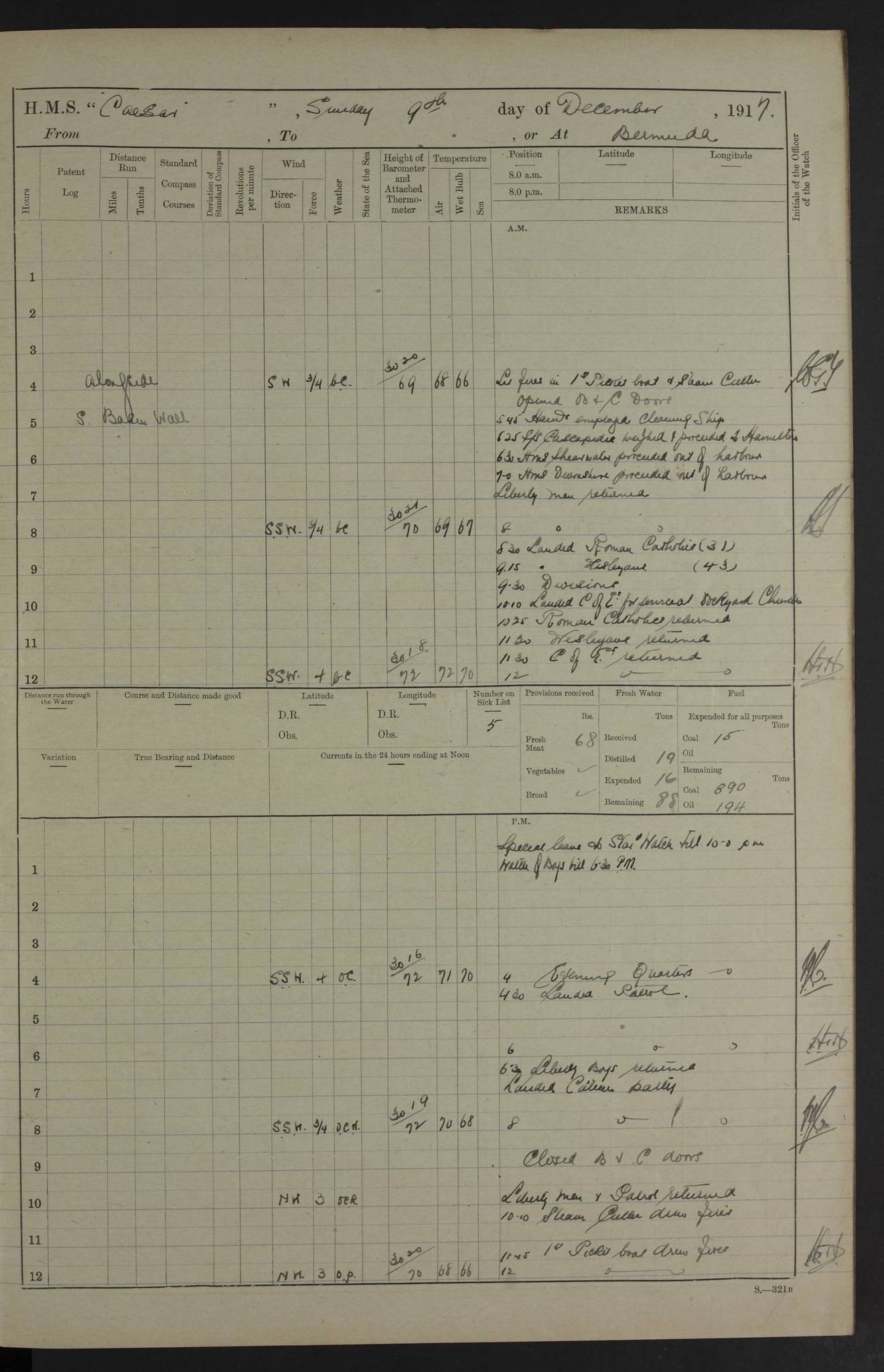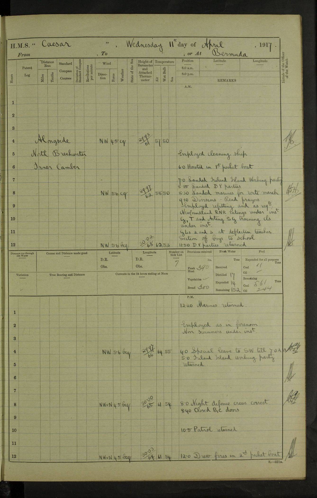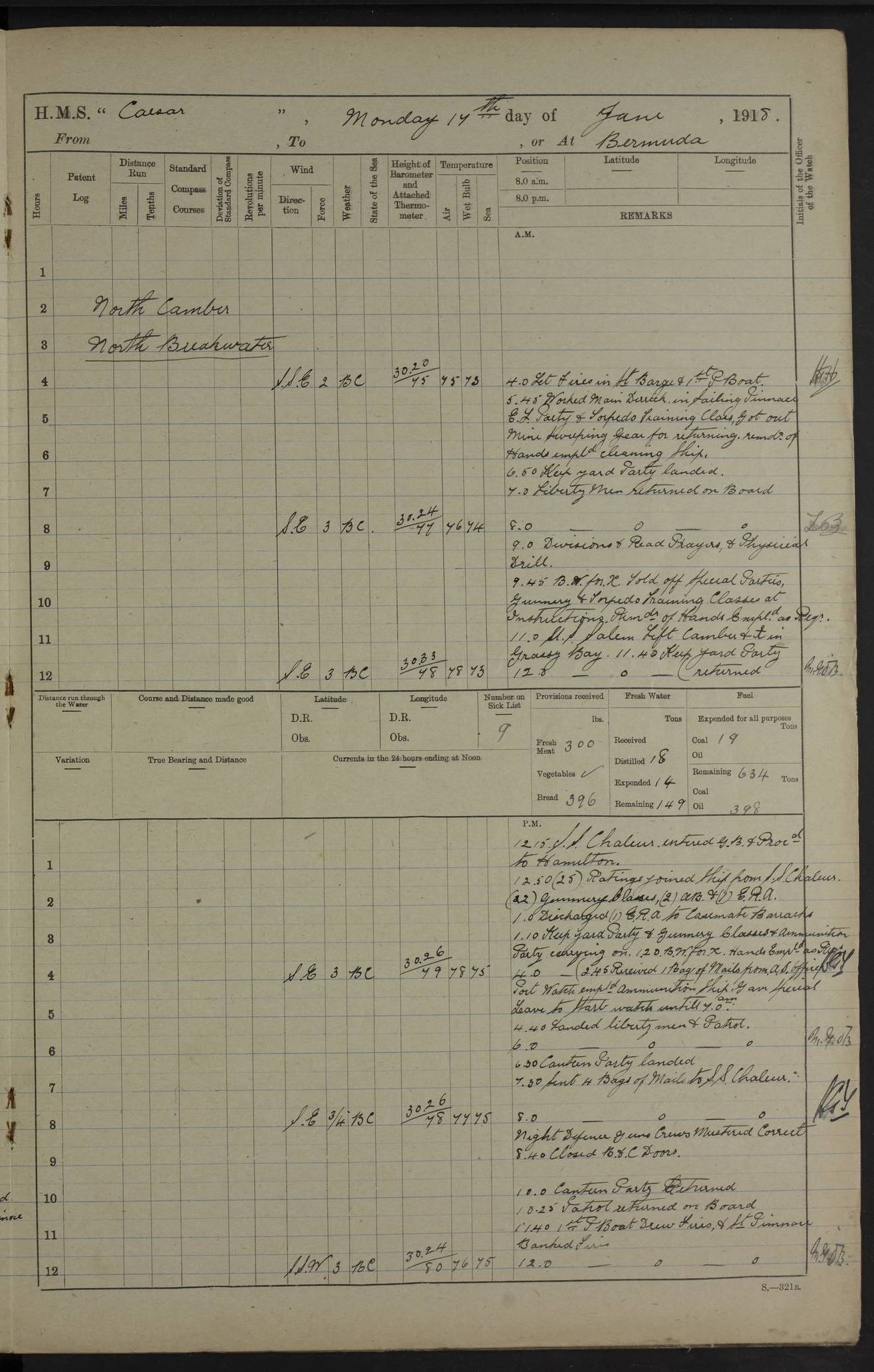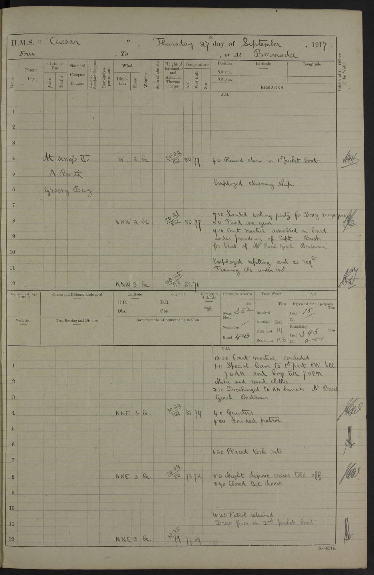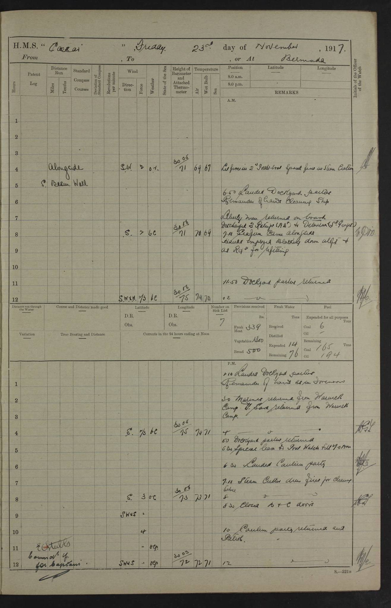 4caf84b6cadfd34197009939: (http://oldweather.s3.amazonaws.com/ADM53-36574/ADM 53-36574-145_1.jpg) 1 January 1917 At Bermuda Lat 32.32, Long -64.83 [Alongside Outer Camber Wall] 4.0am: Raised steam in first Picket boat. 6.0am: Employed cleaning ship. 7.0am: Landed Dockyard parties. Opened B, C doors. am: Employed drawing ammunition and stores, refitting and as requisite. 0.45pm: Paid monthly advance. pm: Employed as in forenoon. 4.30pm: Special leave to Starboard Watch till 7.0am. Landed patrol. 5.0pm: Dockyard parties returned. 6.30pm: Canteen leave to second part Port Watch till 10.0pm. 8.0pm: Night guns’ and search lights’ crews told off. 8.40pm: Closed B, C doors. 10.15pm: Patrol returned. 11.35pm: Drew fires in picket boats. [Number on sick list: 8] [Provisions received: Fresh Meat 340 lbs, Vegetables 2000 lbs, Bread 464 lbs] [Weather fine, though squally in early am. Noon temperature 63F] 4caf84b6cadfd3419700993a: (http://oldweather.s3.amazonaws.com/ADM53-36574/ADM 53-36574-146_0.jpg) 2 January 1917 [Year incorrectly shown as 1916] At Bermuda Lat 32.32, Long -64.83 [Alongside Outer Camber Wall] 4.30am: Raised steam in first picket boat. 6.30am: Landed working party to assist in repair of fenders in Inner Camber. 7.0am: Opened B, C doors. am: Employed embarking ammunition, refitting and as requisite. 11.45am: Working party returned. pm: Employed as in forenoon. 4.0pm: Quarters. 4.30pm: Special leave to Port Watch till 7.0am. Landed patrol. 6.30pm: Canteen leave to second part Starboard Watch till 10.0pm. 10.0pm: Patrol returned. 11.45pm: Drew fires in first picket boat. [Number on sick list: 8] [Provisions received: Fresh Meat 690 lbs, Bread 524 lbs] 4caf84b6cadfd3419700993b: (http://oldweather.s3.amazonaws.com/ADM53-36574/ADM 53-36574-146_1.jpg) 3 January 1917 [Year incorrectly shown as 1916] At Bermuda Lat 32.32, Long -64.83 [Alongside Outer Camber Wall] 7.0am: Opened B, C doors. Landed Dockyard parties. Sailed HMS “Antrim”. Landed Sanitary working party. am: Employed dismounting guns, drawing and returning stores, refitting and as requisite. Training class under instruction. 4.0pm: Quarters. Read Warrants No 268, 269. 4.30pm: Special leave to Starboard Watch till 7.0am. Landed patrol. 5.0pm: Dockyard and Working parties returned. 6.30pm: Canteen leave to first part Port Watch till 10.0pm. 8.5pm: Night guns’ and search lights’ crews told off. 10.0pm: Patrol returned. [Number on sick list: 8] [Provisions received: Fresh Meat 351 lbs, Vegetables 1000 lbs, Bread 512 lbs] 4caf84b6cadfd3419700993c: (http://oldweather.s3.amazonaws.com/ADM53-36574/ADM 53-36574-147_0.jpg) 4 January 1917 At Bermuda Lat 32.32, Long -64.83 [Alongside Outer Camber Wall] 7.0am: Landed Dockyard and Sanitary Working parties. am: Employed dismounting guns, sending up foretopmast, refitting and as requisite. Gunnery training class under instruction. 9.0am: Landed Working party to assist in repairs of fenders in Inner Camber. Discharged to SS “Kiakora” [probably Kaikoura] two ratings to form gun’s crew. 3.30pm: Working parties returned. 4.30pm: Special leave to Port Watch till 7.0am. Landed patrol. 6.30pm: Canteen leave to first part Starboard Watch till 10.0pm; 10.15pm: Patrol returned. [Number on sick list: 9] [Provisions received: Fresh Meat 353 lbs, Vegetables 1000 lbs, Bread 498 lbs] 4caf84b6cadfd3419700993d: (http://oldweather.s3.amazonaws.com/ADM53-36574/ADM 53-36574-147_1.jpg) 5 January 1917 At Bermuda Lat 32.32, Long -64.83 [Alongside Outer Camber Wall] 7.0am: Landed Dockyard and Sanitary Working parties. am: Employed refitting, dismounting guns and as requisite. Gunnery Training class under instruction. pm: Employed as in forenoon. 2.55pm: Arrived HMS “Antrim”. 4.30pm: Special leave to Starboard Watch till 7.0am. Landed patrol. 5.40pm: Drew fires in second picket boat. 6.30pm: Canteen leave to second part Port Watch till 10.0pm. 11.0pm: Patrol returned. 11.40pm: Drew fires in first picket boat. [Number on sick list: 9] [Provisions received: Fresh Meat 350 lbs, Vegetables 400 lbs, Bread 514 lbs] 4caf84b6cadfd3419700993e: (http://oldweather.s3.amazonaws.com/ADM53-36574/ADM 53-36574-148_0.jpg) 6 January 1917 At Bermuda Lat 32.32, Long -64.83 [Alongside Outer Camber Wall] 7.0am: Landed Dockyard parties. am: Employed cleaning ship, refitting, discharging ammunition from SS “Goodwood”, assisting in repairs to fenders of Inner Camber and as requisite. Training class under instruction. 11.45am: Dockyard parties returned. 0.30pm: Observed SS “Prophet” aground in Stag Channel. pm: Make and mend clothes. 1.30pm: Special leave to Port Watch till 7.0am and boys till 5.0pm. 3.0pm: SS “Prophet” refloated and proceeded to anchor. 4.0pm: Quarters. Read Warrant No 270. 4.30pm: Landed patrol. 5.0pm: Party employed discharging SS “Goodwood”. 6.30pm: Canteen leave to second part Starboard Watch till 10.0pm. 8.0pm: Night guns’ and search lights’ crews told off. 8.40pm: Closed B, C doors. 10.15pm: Patrol returned. [Number on sick list: 7] [Provisions received: Fresh Meat 361 lbs, Vegetables 2000 lbs, Bread 928 lbs] 4caf84b6cadfd3419700993f: (http://oldweather.s3.amazonaws.com/ADM53-36574/ADM 53-36574-148_1.jpg) 7 January 1917 At Bermuda Lat 32.32, Long -64.83 [Alongside Outer Camber Wall] 5.55am: Opened B, C doors. Employed cleaning ship. 8.30am: Landed Church parties, Presbyterians 18, Wesleyans 43, RCs 41. 9.30am: Divisions. 10.15am: Ship’s Company attended Divine Service at Dockyard Church. 11.20am: Church parties returned. 1.0pm: Special leave to Starboard Watch till 7.0am and boys will 5.0pm. 6.30pm: Canteen leave to first part Port Watch till 10.0pm. [Number on sick list: 8] [Weather fine, noon temperature 70F] 4caf84b6cadfd34197009940: (http://oldweather.s3.amazonaws.com/ADM53-36574/ADM 53-36574-149_0.jpg) 8 January 1917 At Bermuda Lat 32.32, Long -64.83 [Alongside Outer Camber Wall] 4.0am: Raised steam in first picket boat. 7.0am: Landed Dockyard parties. am: Employed dischargi