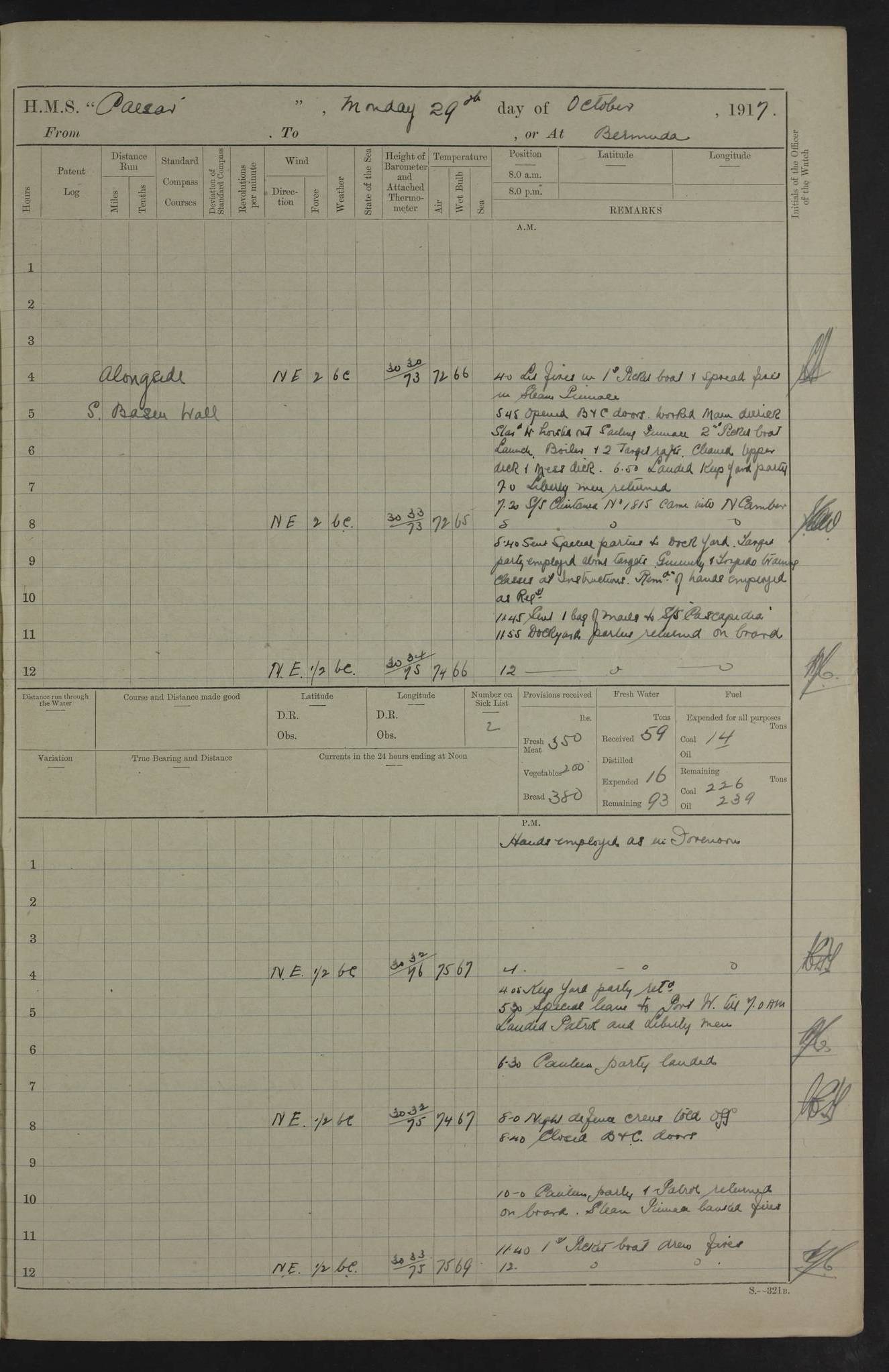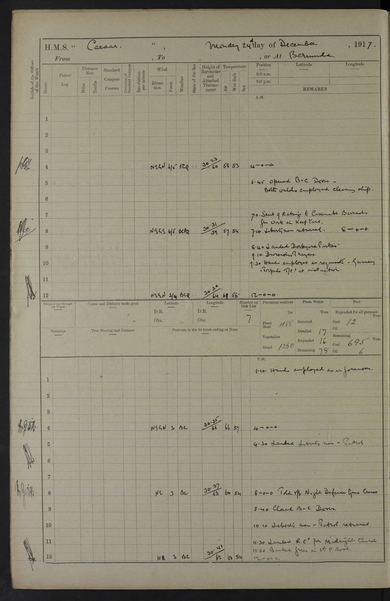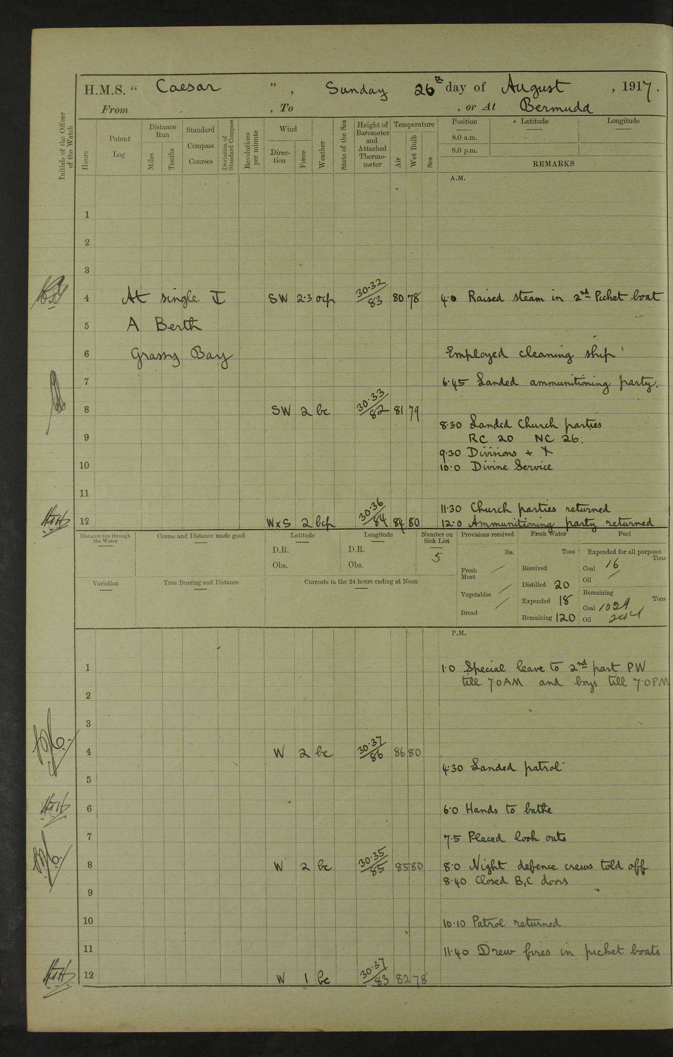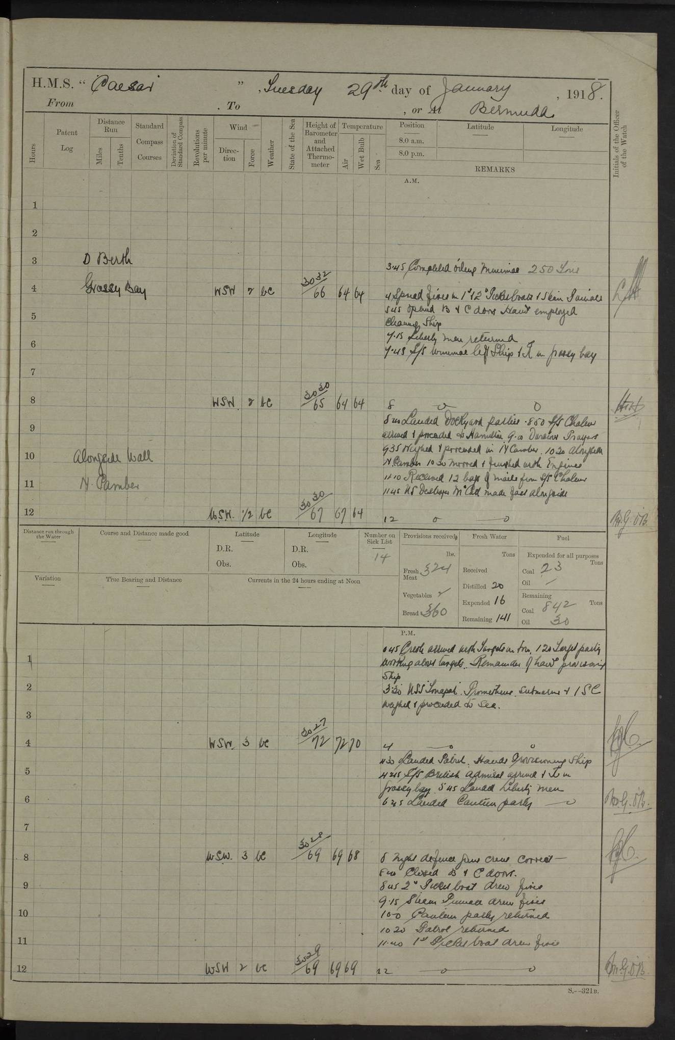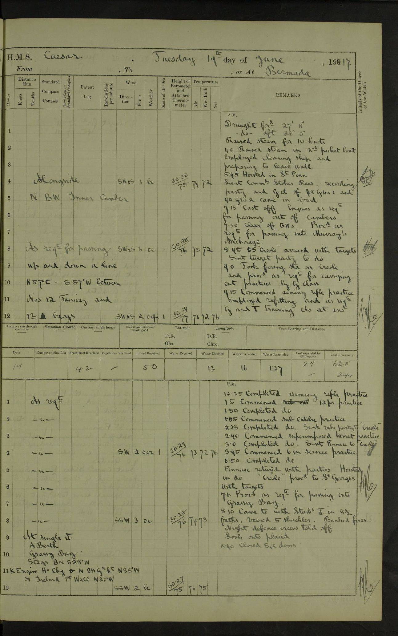 4caf84b6cadfd34197009939: (http://oldweather.s3.amazonaws.com/ADM53-36574/ADM 53-36574-145_1.jpg) 1 January 1917 At Bermuda Lat 32.32, Long -64.83 [Alongside Outer Camber Wall] 4.0am: Raised steam in first Picket boat. 6.0am: Employed cleaning ship. 7.0am: Landed Dockyard parties. Opened B, C doors. am: Employed drawing ammunition and stores, refitting and as requisite. 0.45pm: Paid monthly advance. pm: Employed as in forenoon. 4.30pm: Special leave to Starboard Watch till 7.0am. Landed patrol. 5.0pm: Dockyard parties returned. 6.30pm: Canteen leave to second part Port Watch till 10.0pm. 8.0pm: Night guns’ and search lights’ crews told off. 8.40pm: Closed B, C doors. 10.15pm: Patrol returned. 11.35pm: Drew fires in picket boats. [Number on sick list: 8] [Provisions received: Fresh Meat 340 lbs, Vegetables 2000 lbs, Bread 464 lbs] [Weather fine, though squally in early am. Noon temperature 63F] 4caf84b6cadfd3419700993a: (http://oldweather.s3.amazonaws.com/ADM53-36574/ADM 53-36574-146_0.jpg) 2 January 1917 [Year incorrectly shown as 1916] At Bermuda Lat 32.32, Long -64.83 [Alongside Outer Camber Wall] 4.30am: Raised steam in first picket boat. 6.30am: Landed working party to assist in repair of fenders in Inner Camber. 7.0am: Opened B, C doors. am: Employed embarking ammunition, refitting and as requisite. 11.45am: Working party returned. pm: Employed as in forenoon. 4.0pm: Quarters. 4.30pm: Special leave to Port Watch till 7.0am. Landed patrol. 6.30pm: Canteen leave to second part Starboard Watch till 10.0pm. 10.0pm: Patrol returned. 11.45pm: Drew fires in first picket boat. [Number on sick list: 8] [Provisions received: Fresh Meat 690 lbs, Bread 524 lbs] 4caf84b6cadfd3419700993b: (http://oldweather.s3.amazonaws.com/ADM53-36574/ADM 53-36574-146_1.jpg) 3 January 1917 [Year incorrectly shown as 1916] At Bermuda Lat 32.32, Long -64.83 [Alongside Outer Camber Wall] 7.0am: Opened B, C doors. Landed Dockyard parties. Sailed HMS “Antrim”. Landed Sanitary working party. am: Employed dismounting guns, drawing and returning stores, refitting and as requisite. Training class under instruction. 4.0pm: Quarters. Read Warrants No 268, 269. 4.30pm: Special leave to Starboard Watch till 7.0am. Landed patrol. 5.0pm: Dockyard and Working parties returned. 6.30pm: Canteen leave to first part Port Watch till 10.0pm. 8.5pm: Night guns’ and search lights’ crews told off. 10.0pm: Patrol returned. [Number on sick list: 8] [Provisions received: Fresh Meat 351 lbs, Vegetables 1000 lbs, Bread 512 lbs] 4caf84b6cadfd3419700993c: (http://oldweather.s3.amazonaws.com/ADM53-36574/ADM 53-36574-147_0.jpg) 4 January 1917 At Bermuda Lat 32.32, Long -64.83 [Alongside Outer Camber Wall] 7.0am: Landed Dockyard and Sanitary Working parties. am: Employed dismounting guns, sending up foretopmast, refitting and as requisite. Gunnery training class under instruction. 9.0am: Landed Working party to assist in repairs of fenders in Inner Camber. Discharged to SS “Kiakora” [probably Kaikoura] two ratings to form gun’s crew. 3.30pm: Working parties returned. 4.30pm: Special leave to Port Watch till 7.0am. Landed patrol. 6.30pm: Canteen leave to first part Starboard Watch till 10.0pm; 10.15pm: Patrol returned. [Number on sick list: 9] [Provisions received: Fresh Meat 353 lbs, Vegetables 1000 lbs, Bread 498 lbs] 4caf84b6cadfd3419700993d: (http://oldweather.s3.amazonaws.com/ADM53-36574/ADM 53-36574-147_1.jpg) 5 January 1917 At Bermuda Lat 32.32, Long -64.83 [Alongside Outer Camber Wall] 7.0am: Landed Dockyard and Sanitary Working parties. am: Employed refitting, dismounting guns and as requisite. Gunnery Training class under instruction. pm: Employed as in forenoon. 2.55pm: Arrived HMS “Antrim”. 4.30pm: Special leave to Starboard Watch till 7.0am. Landed patrol. 5.40pm: Drew fires in second picket boat. 6.30pm: Canteen leave to second part Port Watch till 10.0pm. 11.0pm: Patrol returned. 11.40pm: Drew fires in first picket boat. [Number on sick list: 9] [Provisions received: Fresh Meat 350 lbs, Vegetables 400 lbs, Bread 514 lbs] 4caf84b6cadfd3419700993e: (http://oldweather.s3.amazonaws.com/ADM53-36574/ADM 53-36574-148_0.jpg) 6 January 1917 At Bermuda Lat 32.32, Long -64.83 [Alongside Outer Camber Wall] 7.0am: Landed Dockyard parties. am: Employed cleaning ship, refitting, discharging ammunition from SS “Goodwood”, assisting in repairs to fenders of Inner Camber and as requisite. Training class under instruction. 11.45am: Dockyard parties returned. 0.30pm: Observed SS “Prophet” aground in Stag Channel. pm: Make and mend clothes. 1.30pm: Special leave to Port Watch till 7.0am and boys till 5.0pm. 3.0pm: SS “Prophet” refloated and proceeded to anchor. 4.0pm: Quarters. Read Warrant No 270. 4.30pm: Landed patrol. 5.0pm: Party employed discharging SS “Goodwood”. 6.30pm: Canteen leave to second part Starboard Watch till 10.0pm. 8.0pm: Night guns’ and search lights’ crews told off. 8.40pm: Closed B, C doors. 10.15pm: Patrol returned. [Number on sick list: 7] [Provisions received: Fresh Meat 361 lbs, Vegetables 2000 lbs, Bread 928 lbs] 4caf84b6cadfd3419700993f: (http://oldweather.s3.amazonaws.com/ADM53-36574/ADM 53-36574-148_1.jpg) 7 January 1917 At Bermuda Lat 32.32, Long -64.83 [Alongside Outer Camber Wall] 5.55am: Opened B, C doors. Employed cleaning ship. 8.30am: Landed Church parties, Presbyterians 18, Wesleyans 43, RCs 41. 9.30am: Divisions. 10.15am: Ship’s Company attended Divine Service at Dockyard Church. 11.20am: Church parties returned. 1.0pm: Special leave to Starboard Watch till 7.0am and boys will 5.0pm. 6.30pm: Canteen leave to first part Port Watch till 10.0pm. [Number on sick list: 8] [Weather fine, noon temperature 70F] 4caf84b6cadfd34197009940: (http://oldweather.s3.amazonaws.com/ADM53-36574/ADM 53-36574-149_0.jpg) 8 January 1917 At Bermuda Lat 32.32, Long -64.83 [Alongside Outer Camber Wall] 4.0am: Raised steam in first picket boat. 7.0am: Landed Dockyard parties. am: Employed dischargi