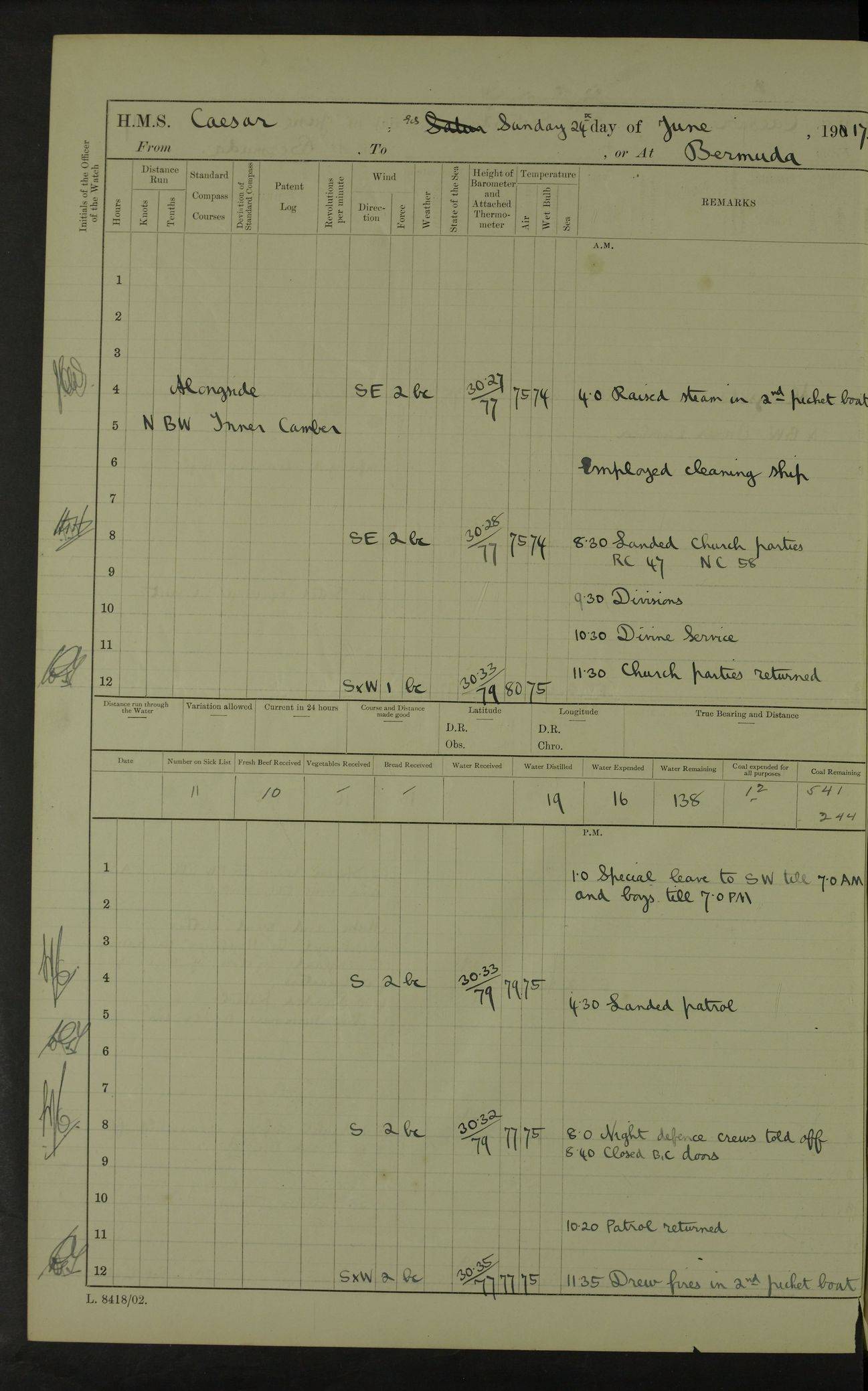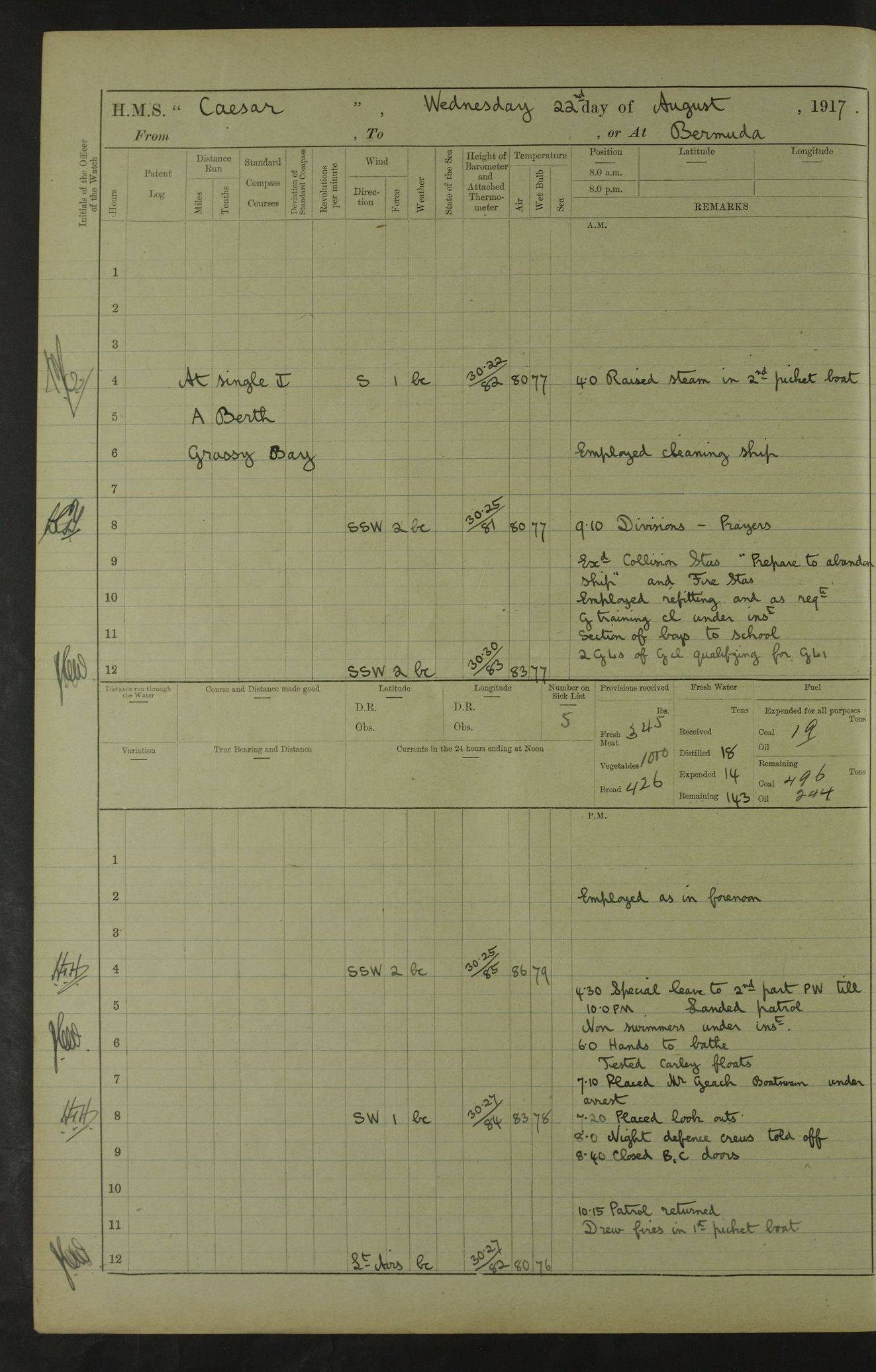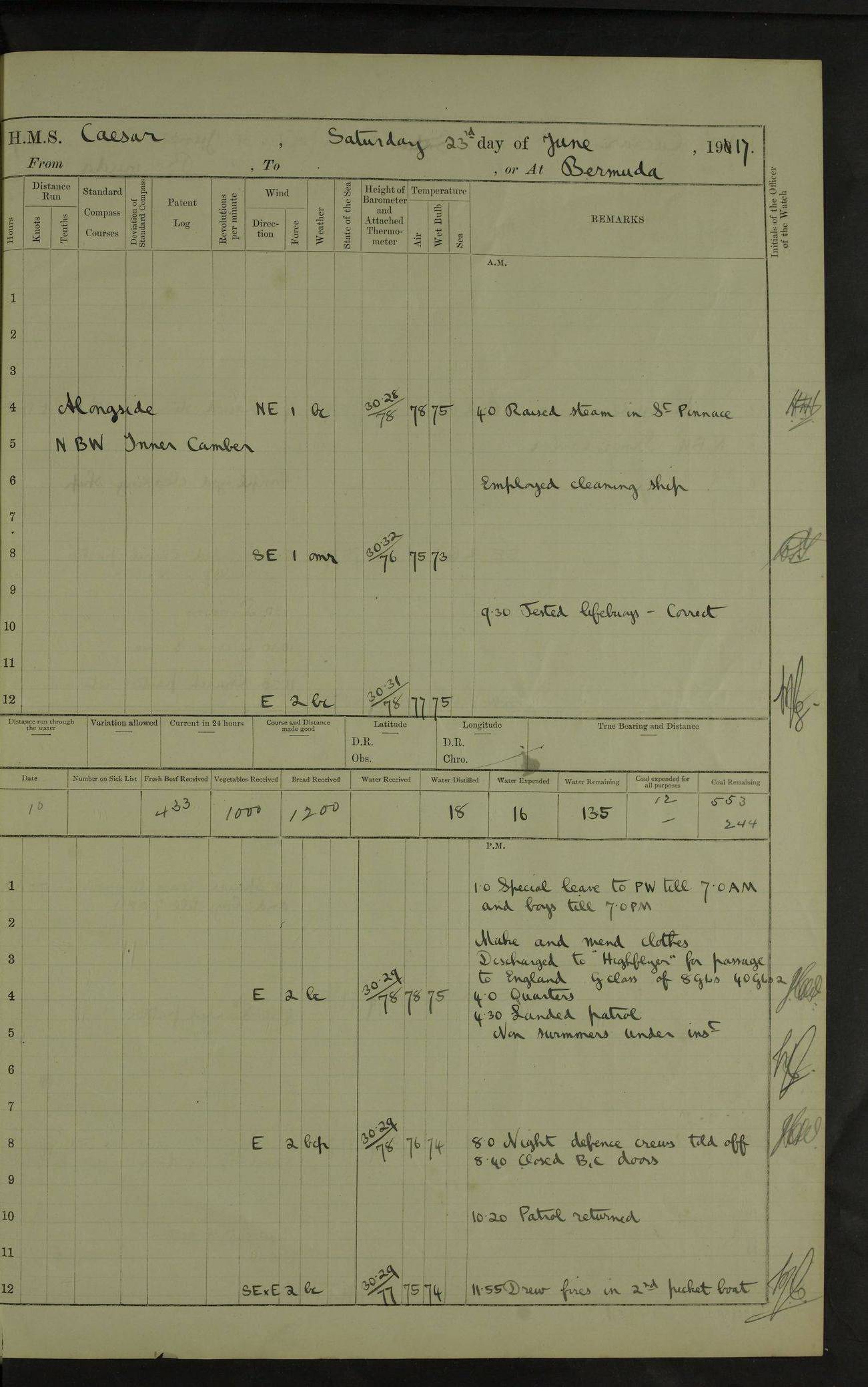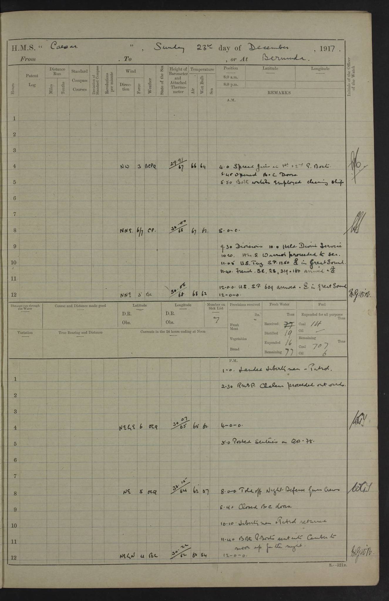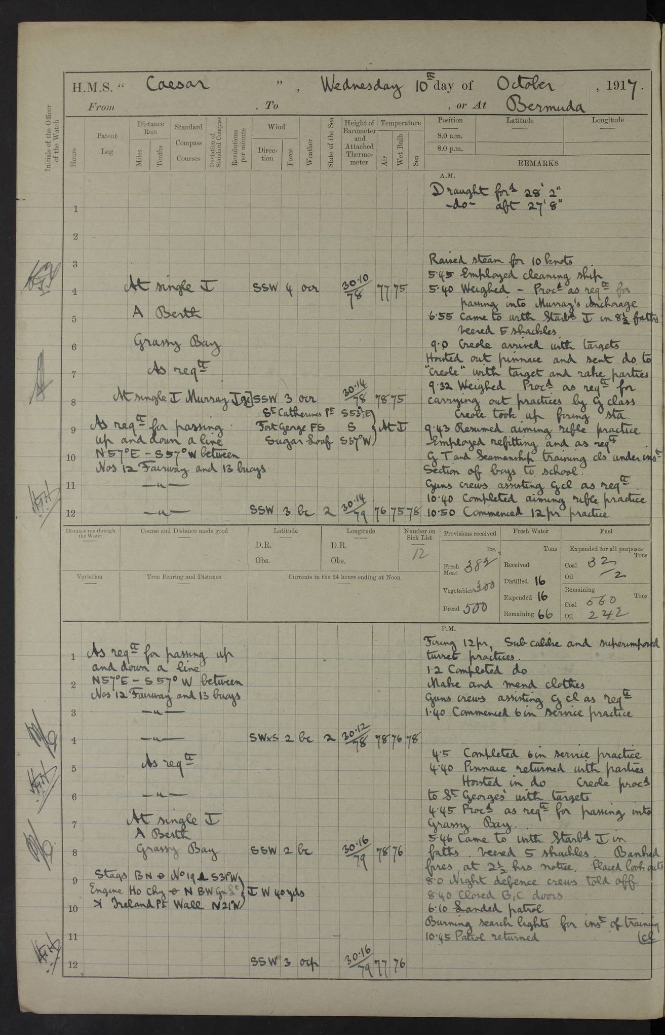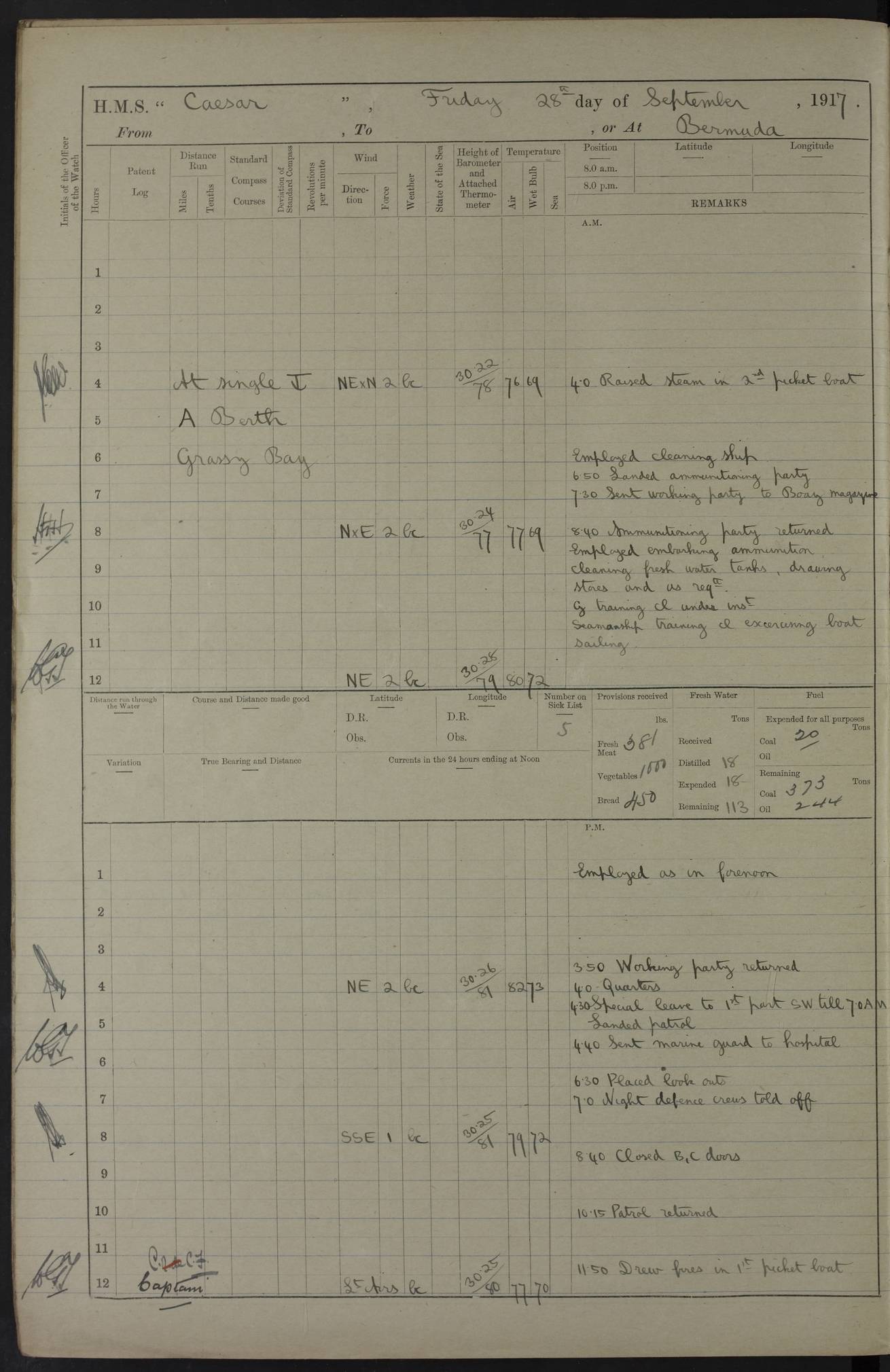 4caf84b6cadfd34197009939: (http://oldweather.s3.amazonaws.com/ADM53-36574/ADM 53-36574-145_1.jpg) 1 January 1917 At Bermuda Lat 32.32, Long -64.83 [Alongside Outer Camber Wall] 4.0am: Raised steam in first Picket boat. 6.0am: Employed cleaning ship. 7.0am: Landed Dockyard parties. Opened B, C doors. am: Employed drawing ammunition and stores, refitting and as requisite. 0.45pm: Paid monthly advance. pm: Employed as in forenoon. 4.30pm: Special leave to Starboard Watch till 7.0am. Landed patrol. 5.0pm: Dockyard parties returned. 6.30pm: Canteen leave to second part Port Watch till 10.0pm. 8.0pm: Night guns’ and search lights’ crews told off. 8.40pm: Closed B, C doors. 10.15pm: Patrol returned. 11.35pm: Drew fires in picket boats. [Number on sick list: 8] [Provisions received: Fresh Meat 340 lbs, Vegetables 2000 lbs, Bread 464 lbs] [Weather fine, though squally in early am. Noon temperature 63F] 4caf84b6cadfd3419700993a: (http://oldweather.s3.amazonaws.com/ADM53-36574/ADM 53-36574-146_0.jpg) 2 January 1917 [Year incorrectly shown as 1916] At Bermuda Lat 32.32, Long -64.83 [Alongside Outer Camber Wall] 4.30am: Raised steam in first picket boat. 6.30am: Landed working party to assist in repair of fenders in Inner Camber. 7.0am: Opened B, C doors. am: Employed embarking ammunition, refitting and as requisite. 11.45am: Working party returned. pm: Employed as in forenoon. 4.0pm: Quarters. 4.30pm: Special leave to Port Watch till 7.0am. Landed patrol. 6.30pm: Canteen leave to second part Starboard Watch till 10.0pm. 10.0pm: Patrol returned. 11.45pm: Drew fires in first picket boat. [Number on sick list: 8] [Provisions received: Fresh Meat 690 lbs, Bread 524 lbs] 4caf84b6cadfd3419700993b: (http://oldweather.s3.amazonaws.com/ADM53-36574/ADM 53-36574-146_1.jpg) 3 January 1917 [Year incorrectly shown as 1916] At Bermuda Lat 32.32, Long -64.83 [Alongside Outer Camber Wall] 7.0am: Opened B, C doors. Landed Dockyard parties. Sailed HMS “Antrim”. Landed Sanitary working party. am: Employed dismounting guns, drawing and returning stores, refitting and as requisite. Training class under instruction. 4.0pm: Quarters. Read Warrants No 268, 269. 4.30pm: Special leave to Starboard Watch till 7.0am. Landed patrol. 5.0pm: Dockyard and Working parties returned. 6.30pm: Canteen leave to first part Port Watch till 10.0pm. 8.5pm: Night guns’ and search lights’ crews told off. 10.0pm: Patrol returned. [Number on sick list: 8] [Provisions received: Fresh Meat 351 lbs, Vegetables 1000 lbs, Bread 512 lbs] 4caf84b6cadfd3419700993c: (http://oldweather.s3.amazonaws.com/ADM53-36574/ADM 53-36574-147_0.jpg) 4 January 1917 At Bermuda Lat 32.32, Long -64.83 [Alongside Outer Camber Wall] 7.0am: Landed Dockyard and Sanitary Working parties. am: Employed dismounting guns, sending up foretopmast, refitting and as requisite. Gunnery training class under instruction. 9.0am: Landed Working party to assist in repairs of fenders in Inner Camber. Discharged to SS “Kiakora” [probably Kaikoura] two ratings to form gun’s crew. 3.30pm: Working parties returned. 4.30pm: Special leave to Port Watch till 7.0am. Landed patrol. 6.30pm: Canteen leave to first part Starboard Watch till 10.0pm; 10.15pm: Patrol returned. [Number on sick list: 9] [Provisions received: Fresh Meat 353 lbs, Vegetables 1000 lbs, Bread 498 lbs] 4caf84b6cadfd3419700993d: (http://oldweather.s3.amazonaws.com/ADM53-36574/ADM 53-36574-147_1.jpg) 5 January 1917 At Bermuda Lat 32.32, Long -64.83 [Alongside Outer Camber Wall] 7.0am: Landed Dockyard and Sanitary Working parties. am: Employed refitting, dismounting guns and as requisite. Gunnery Training class under instruction. pm: Employed as in forenoon. 2.55pm: Arrived HMS “Antrim”. 4.30pm: Special leave to Starboard Watch till 7.0am. Landed patrol. 5.40pm: Drew fires in second picket boat. 6.30pm: Canteen leave to second part Port Watch till 10.0pm. 11.0pm: Patrol returned. 11.40pm: Drew fires in first picket boat. [Number on sick list: 9] [Provisions received: Fresh Meat 350 lbs, Vegetables 400 lbs, Bread 514 lbs] 4caf84b6cadfd3419700993e: (http://oldweather.s3.amazonaws.com/ADM53-36574/ADM 53-36574-148_0.jpg) 6 January 1917 At Bermuda Lat 32.32, Long -64.83 [Alongside Outer Camber Wall] 7.0am: Landed Dockyard parties. am: Employed cleaning ship, refitting, discharging ammunition from SS “Goodwood”, assisting in repairs to fenders of Inner Camber and as requisite. Training class under instruction. 11.45am: Dockyard parties returned. 0.30pm: Observed SS “Prophet” aground in Stag Channel. pm: Make and mend clothes. 1.30pm: Special leave to Port Watch till 7.0am and boys till 5.0pm. 3.0pm: SS “Prophet” refloated and proceeded to anchor. 4.0pm: Quarters. Read Warrant No 270. 4.30pm: Landed patrol. 5.0pm: Party employed discharging SS “Goodwood”. 6.30pm: Canteen leave to second part Starboard Watch till 10.0pm. 8.0pm: Night guns’ and search lights’ crews told off. 8.40pm: Closed B, C doors. 10.15pm: Patrol returned. [Number on sick list: 7] [Provisions received: Fresh Meat 361 lbs, Vegetables 2000 lbs, Bread 928 lbs] 4caf84b6cadfd3419700993f: (http://oldweather.s3.amazonaws.com/ADM53-36574/ADM 53-36574-148_1.jpg) 7 January 1917 At Bermuda Lat 32.32, Long -64.83 [Alongside Outer Camber Wall] 5.55am: Opened B, C doors. Employed cleaning ship. 8.30am: Landed Church parties, Presbyterians 18, Wesleyans 43, RCs 41. 9.30am: Divisions. 10.15am: Ship’s Company attended Divine Service at Dockyard Church. 11.20am: Church parties returned. 1.0pm: Special leave to Starboard Watch till 7.0am and boys will 5.0pm. 6.30pm: Canteen leave to first part Port Watch till 10.0pm. [Number on sick list: 8] [Weather fine, noon temperature 70F] 4caf84b6cadfd34197009940: (http://oldweather.s3.amazonaws.com/ADM53-36574/ADM 53-36574-149_0.jpg) 8 January 1917 At Bermuda Lat 32.32, Long -64.83 [Alongside Outer Camber Wall] 4.0am: Raised steam in first picket boat. 7.0am: Landed Dockyard parties. am: Employed dischargi