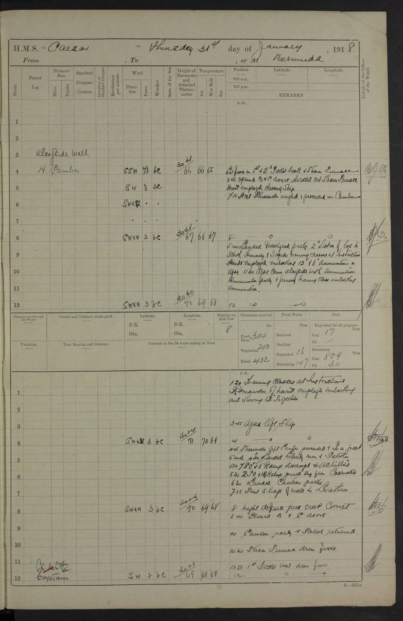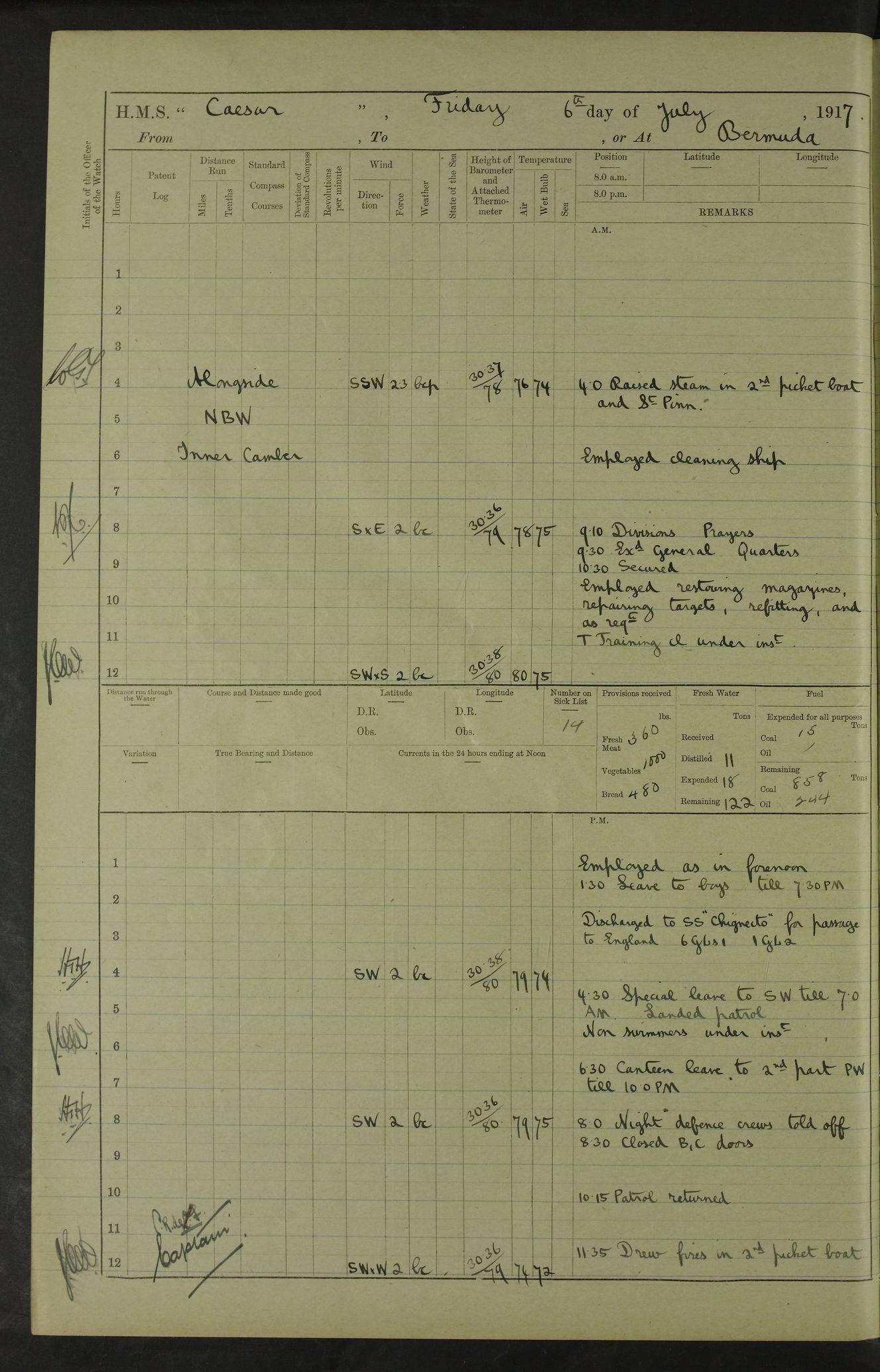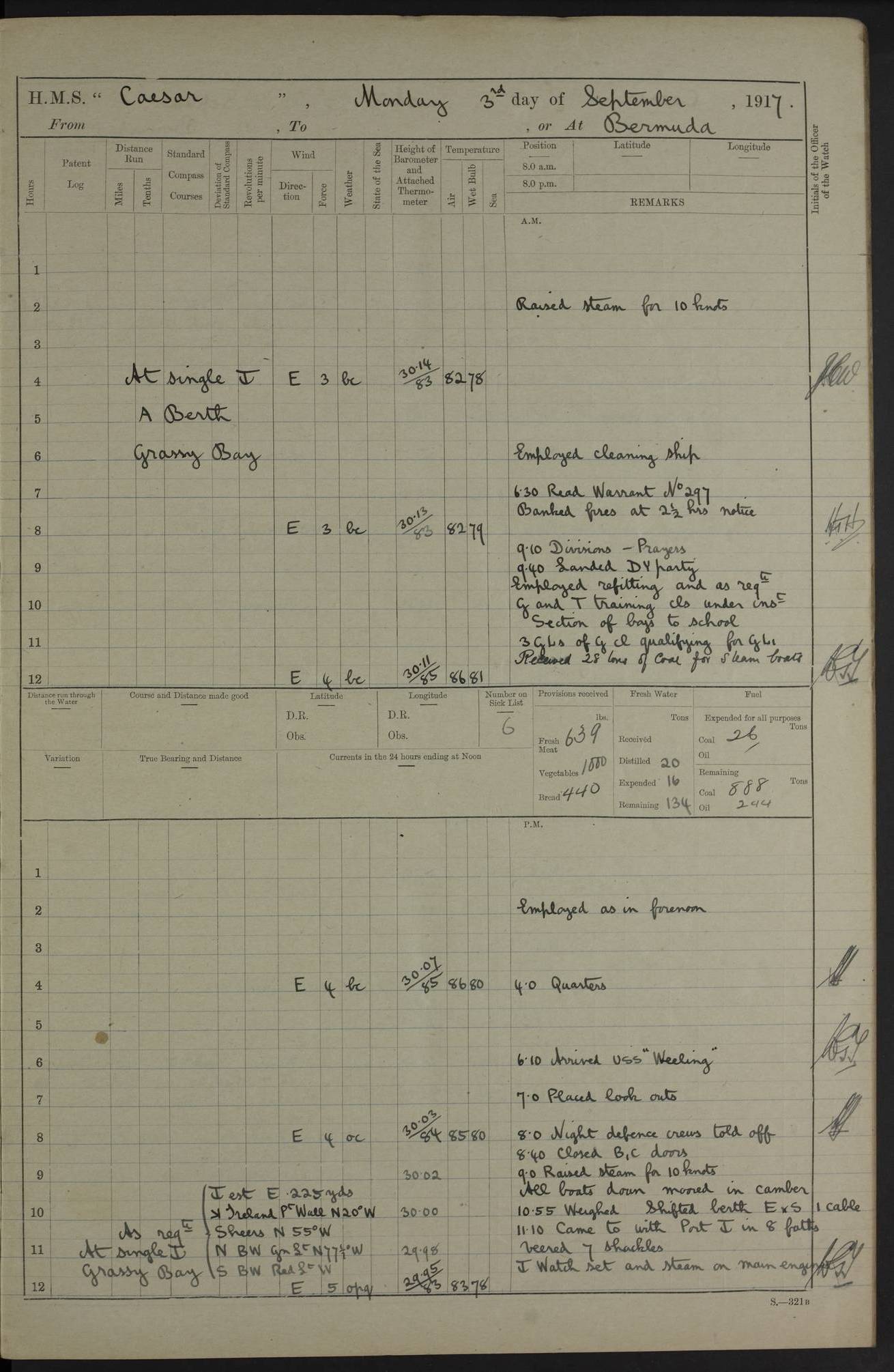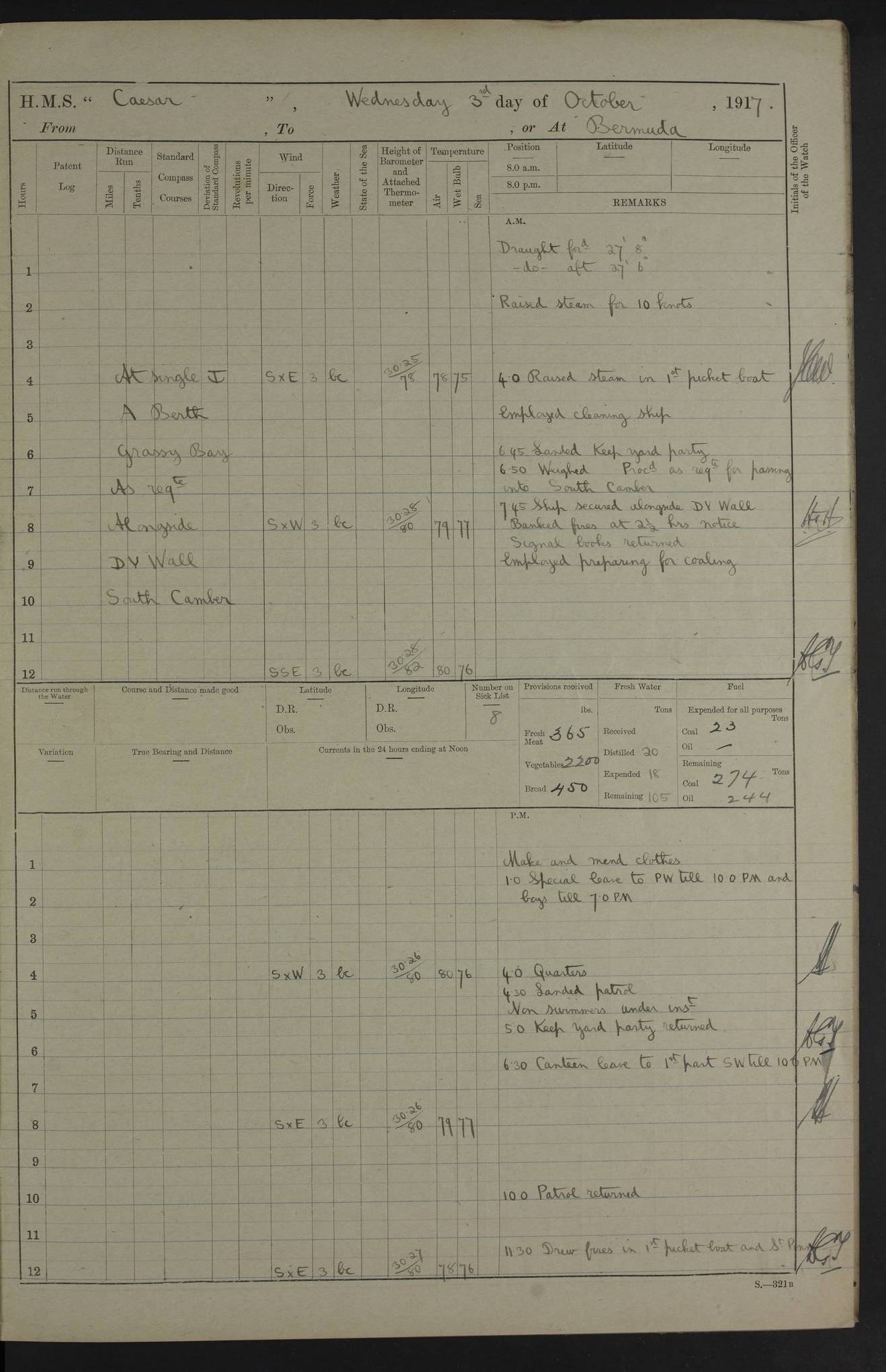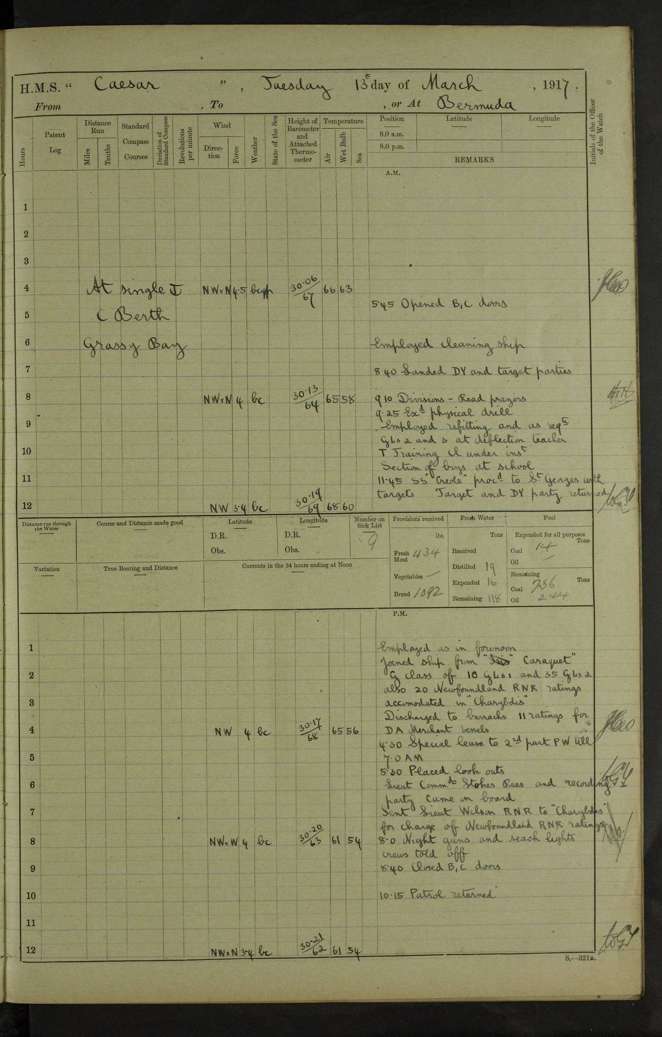 4caf84b6cadfd34197009939: (http://oldweather.s3.amazonaws.com/ADM53-36574/ADM 53-36574-145_1.jpg) 1 January 1917 At Bermuda Lat 32.32, Long -64.83 [Alongside Outer Camber Wall] 4.0am: Raised steam in first Picket boat. 6.0am: Employed cleaning ship. 7.0am: Landed Dockyard parties. Opened B, C doors. am: Employed drawing ammunition and stores, refitting and as requisite. 0.45pm: Paid monthly advance. pm: Employed as in forenoon. 4.30pm: Special leave to Starboard Watch till 7.0am. Landed patrol. 5.0pm: Dockyard parties returned. 6.30pm: Canteen leave to second part Port Watch till 10.0pm. 8.0pm: Night guns’ and search lights’ crews told off. 8.40pm: Closed B, C doors. 10.15pm: Patrol returned. 11.35pm: Drew fires in picket boats. [Number on sick list: 8] [Provisions received: Fresh Meat 340 lbs, Vegetables 2000 lbs, Bread 464 lbs] [Weather fine, though squally in early am. Noon temperature 63F] 4caf84b6cadfd3419700993a: (http://oldweather.s3.amazonaws.com/ADM53-36574/ADM 53-36574-146_0.jpg) 2 January 1917 [Year incorrectly shown as 1916] At Bermuda Lat 32.32, Long -64.83 [Alongside Outer Camber Wall] 4.30am: Raised steam in first picket boat. 6.30am: Landed working party to assist in repair of fenders in Inner Camber. 7.0am: Opened B, C doors. am: Employed embarking ammunition, refitting and as requisite. 11.45am: Working party returned. pm: Employed as in forenoon. 4.0pm: Quarters. 4.30pm: Special leave to Port Watch till 7.0am. Landed patrol. 6.30pm: Canteen leave to second part Starboard Watch till 10.0pm. 10.0pm: Patrol returned. 11.45pm: Drew fires in first picket boat. [Number on sick list: 8] [Provisions received: Fresh Meat 690 lbs, Bread 524 lbs] 4caf84b6cadfd3419700993b: (http://oldweather.s3.amazonaws.com/ADM53-36574/ADM 53-36574-146_1.jpg) 3 January 1917 [Year incorrectly shown as 1916] At Bermuda Lat 32.32, Long -64.83 [Alongside Outer Camber Wall] 7.0am: Opened B, C doors. Landed Dockyard parties. Sailed HMS “Antrim”. Landed Sanitary working party. am: Employed dismounting guns, drawing and returning stores, refitting and as requisite. Training class under instruction. 4.0pm: Quarters. Read Warrants No 268, 269. 4.30pm: Special leave to Starboard Watch till 7.0am. Landed patrol. 5.0pm: Dockyard and Working parties returned. 6.30pm: Canteen leave to first part Port Watch till 10.0pm. 8.5pm: Night guns’ and search lights’ crews told off. 10.0pm: Patrol returned. [Number on sick list: 8] [Provisions received: Fresh Meat 351 lbs, Vegetables 1000 lbs, Bread 512 lbs] 4caf84b6cadfd3419700993c: (http://oldweather.s3.amazonaws.com/ADM53-36574/ADM 53-36574-147_0.jpg) 4 January 1917 At Bermuda Lat 32.32, Long -64.83 [Alongside Outer Camber Wall] 7.0am: Landed Dockyard and Sanitary Working parties. am: Employed dismounting guns, sending up foretopmast, refitting and as requisite. Gunnery training class under instruction. 9.0am: Landed Working party to assist in repairs of fenders in Inner Camber. Discharged to SS “Kiakora” [probably Kaikoura] two ratings to form gun’s crew. 3.30pm: Working parties returned. 4.30pm: Special leave to Port Watch till 7.0am. Landed patrol. 6.30pm: Canteen leave to first part Starboard Watch till 10.0pm; 10.15pm: Patrol returned. [Number on sick list: 9] [Provisions received: Fresh Meat 353 lbs, Vegetables 1000 lbs, Bread 498 lbs] 4caf84b6cadfd3419700993d: (http://oldweather.s3.amazonaws.com/ADM53-36574/ADM 53-36574-147_1.jpg) 5 January 1917 At Bermuda Lat 32.32, Long -64.83 [Alongside Outer Camber Wall] 7.0am: Landed Dockyard and Sanitary Working parties. am: Employed refitting, dismounting guns and as requisite. Gunnery Training class under instruction. pm: Employed as in forenoon. 2.55pm: Arrived HMS “Antrim”. 4.30pm: Special leave to Starboard Watch till 7.0am. Landed patrol. 5.40pm: Drew fires in second picket boat. 6.30pm: Canteen leave to second part Port Watch till 10.0pm. 11.0pm: Patrol returned. 11.40pm: Drew fires in first picket boat. [Number on sick list: 9] [Provisions received: Fresh Meat 350 lbs, Vegetables 400 lbs, Bread 514 lbs] 4caf84b6cadfd3419700993e: (http://oldweather.s3.amazonaws.com/ADM53-36574/ADM 53-36574-148_0.jpg) 6 January 1917 At Bermuda Lat 32.32, Long -64.83 [Alongside Outer Camber Wall] 7.0am: Landed Dockyard parties. am: Employed cleaning ship, refitting, discharging ammunition from SS “Goodwood”, assisting in repairs to fenders of Inner Camber and as requisite. Training class under instruction. 11.45am: Dockyard parties returned. 0.30pm: Observed SS “Prophet” aground in Stag Channel. pm: Make and mend clothes. 1.30pm: Special leave to Port Watch till 7.0am and boys till 5.0pm. 3.0pm: SS “Prophet” refloated and proceeded to anchor. 4.0pm: Quarters. Read Warrant No 270. 4.30pm: Landed patrol. 5.0pm: Party employed discharging SS “Goodwood”. 6.30pm: Canteen leave to second part Starboard Watch till 10.0pm. 8.0pm: Night guns’ and search lights’ crews told off. 8.40pm: Closed B, C doors. 10.15pm: Patrol returned. [Number on sick list: 7] [Provisions received: Fresh Meat 361 lbs, Vegetables 2000 lbs, Bread 928 lbs] 4caf84b6cadfd3419700993f: (http://oldweather.s3.amazonaws.com/ADM53-36574/ADM 53-36574-148_1.jpg) 7 January 1917 At Bermuda Lat 32.32, Long -64.83 [Alongside Outer Camber Wall] 5.55am: Opened B, C doors. Employed cleaning ship. 8.30am: Landed Church parties, Presbyterians 18, Wesleyans 43, RCs 41. 9.30am: Divisions. 10.15am: Ship’s Company attended Divine Service at Dockyard Church. 11.20am: Church parties returned. 1.0pm: Special leave to Starboard Watch till 7.0am and boys will 5.0pm. 6.30pm: Canteen leave to first part Port Watch till 10.0pm. [Number on sick list: 8] [Weather fine, noon temperature 70F] 4caf84b6cadfd34197009940: (http://oldweather.s3.amazonaws.com/ADM53-36574/ADM 53-36574-149_0.jpg) 8 January 1917 At Bermuda Lat 32.32, Long -64.83 [Alongside Outer Camber Wall] 4.0am: Raised steam in first picket boat. 7.0am: Landed Dockyard parties. am: Employed dischargi