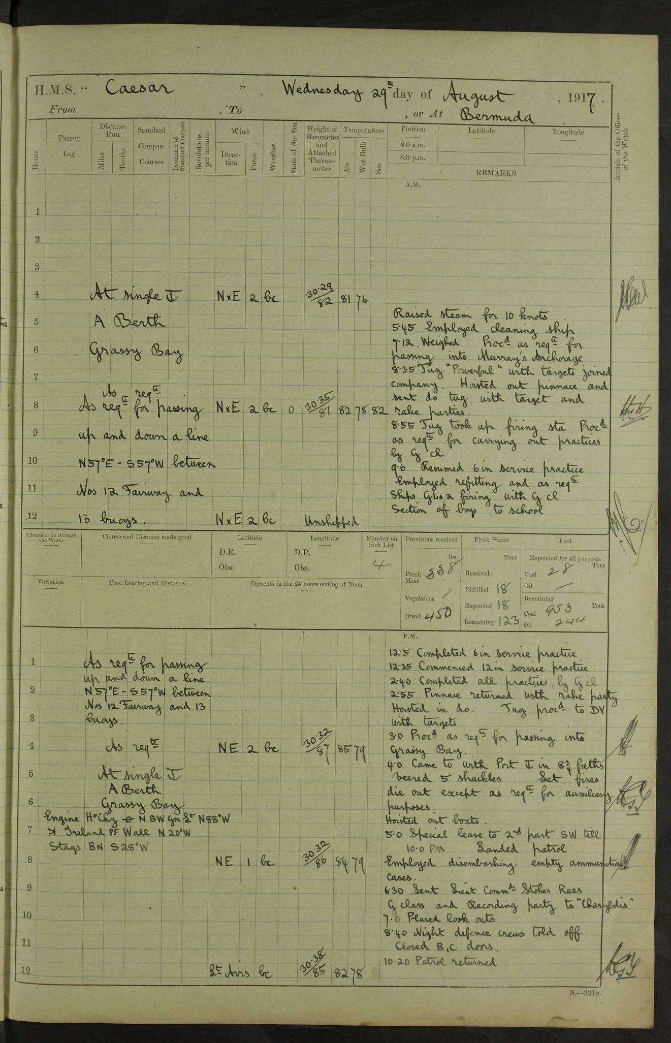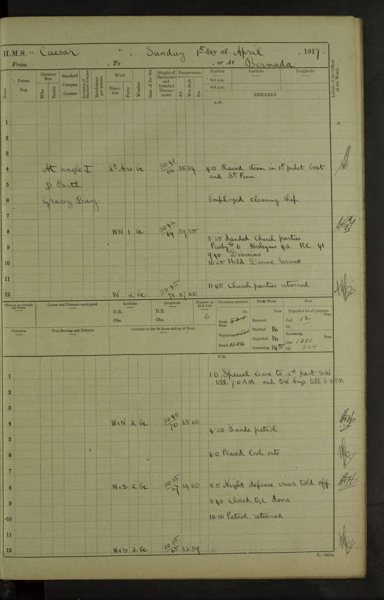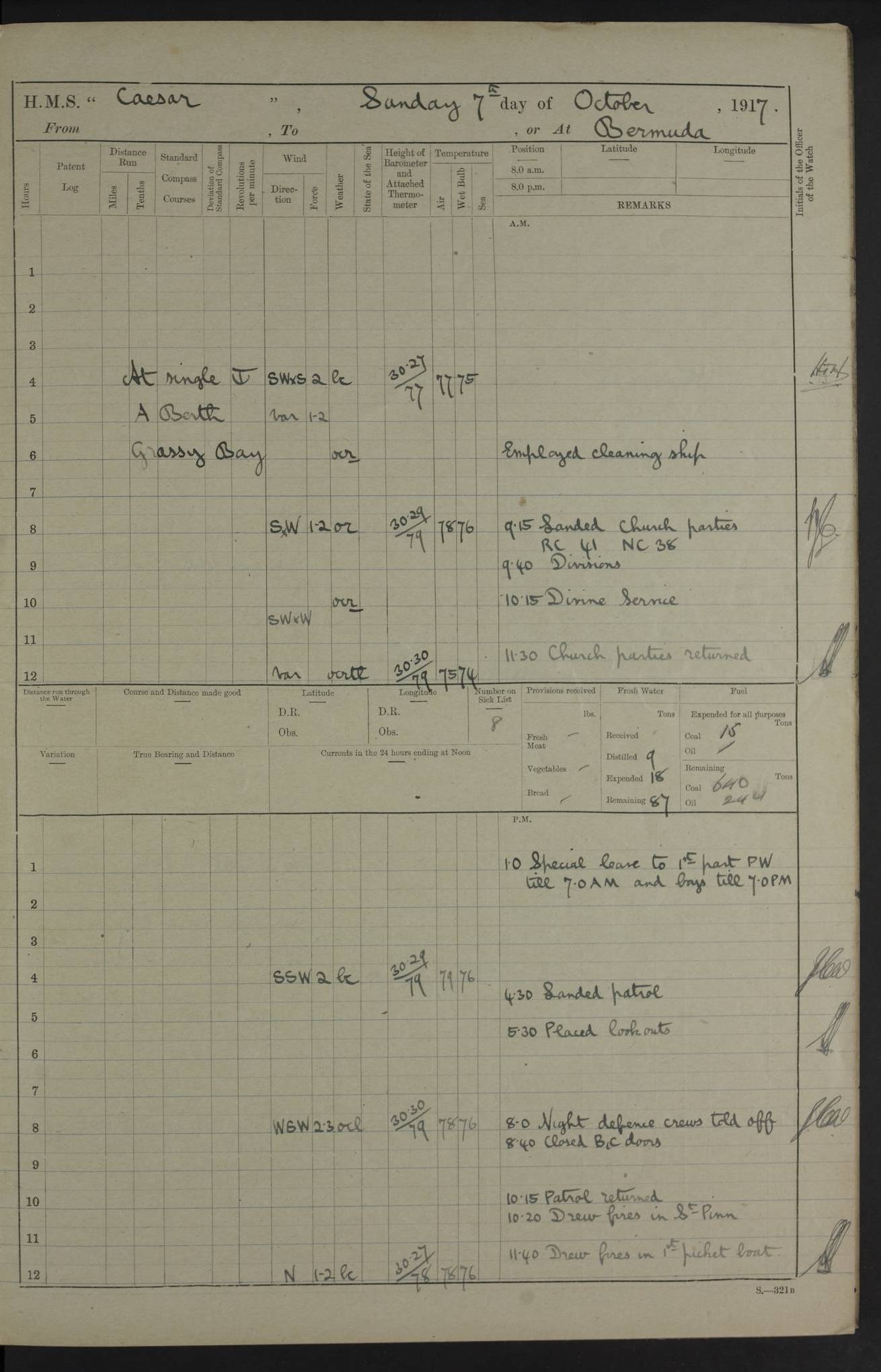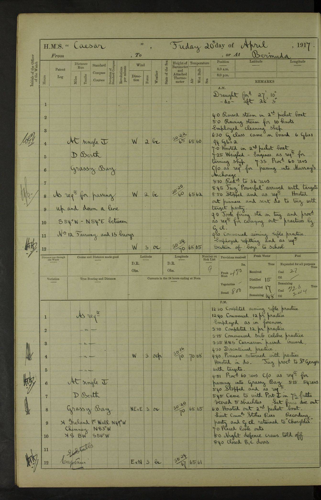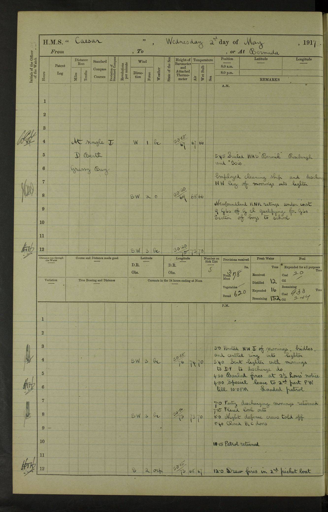 4caf84b6cadfd34197009939: (http://oldweather.s3.amazonaws.com/ADM53-36574/ADM 53-36574-145_1.jpg) 1 January 1917 At Bermuda Lat 32.32, Long -64.83 [Alongside Outer Camber Wall] 4.0am: Raised steam in first Picket boat. 6.0am: Employed cleaning ship. 7.0am: Landed Dockyard parties. Opened B, C doors. am: Employed drawing ammunition and stores, refitting and as requisite. 0.45pm: Paid monthly advance. pm: Employed as in forenoon. 4.30pm: Special leave to Starboard Watch till 7.0am. Landed patrol. 5.0pm: Dockyard parties returned. 6.30pm: Canteen leave to second part Port Watch till 10.0pm. 8.0pm: Night guns’ and search lights’ crews told off. 8.40pm: Closed B, C doors. 10.15pm: Patrol returned. 11.35pm: Drew fires in picket boats. [Number on sick list: 8] [Provisions received: Fresh Meat 340 lbs, Vegetables 2000 lbs, Bread 464 lbs] [Weather fine, though squally in early am. Noon temperature 63F] 4caf84b6cadfd3419700993a: (http://oldweather.s3.amazonaws.com/ADM53-36574/ADM 53-36574-146_0.jpg) 2 January 1917 [Year incorrectly shown as 1916] At Bermuda Lat 32.32, Long -64.83 [Alongside Outer Camber Wall] 4.30am: Raised steam in first picket boat. 6.30am: Landed working party to assist in repair of fenders in Inner Camber. 7.0am: Opened B, C doors. am: Employed embarking ammunition, refitting and as requisite. 11.45am: Working party returned. pm: Employed as in forenoon. 4.0pm: Quarters. 4.30pm: Special leave to Port Watch till 7.0am. Landed patrol. 6.30pm: Canteen leave to second part Starboard Watch till 10.0pm. 10.0pm: Patrol returned. 11.45pm: Drew fires in first picket boat. [Number on sick list: 8] [Provisions received: Fresh Meat 690 lbs, Bread 524 lbs] 4caf84b6cadfd3419700993b: (http://oldweather.s3.amazonaws.com/ADM53-36574/ADM 53-36574-146_1.jpg) 3 January 1917 [Year incorrectly shown as 1916] At Bermuda Lat 32.32, Long -64.83 [Alongside Outer Camber Wall] 7.0am: Opened B, C doors. Landed Dockyard parties. Sailed HMS “Antrim”. Landed Sanitary working party. am: Employed dismounting guns, drawing and returning stores, refitting and as requisite. Training class under instruction. 4.0pm: Quarters. Read Warrants No 268, 269. 4.30pm: Special leave to Starboard Watch till 7.0am. Landed patrol. 5.0pm: Dockyard and Working parties returned. 6.30pm: Canteen leave to first part Port Watch till 10.0pm. 8.5pm: Night guns’ and search lights’ crews told off. 10.0pm: Patrol returned. [Number on sick list: 8] [Provisions received: Fresh Meat 351 lbs, Vegetables 1000 lbs, Bread 512 lbs] 4caf84b6cadfd3419700993c: (http://oldweather.s3.amazonaws.com/ADM53-36574/ADM 53-36574-147_0.jpg) 4 January 1917 At Bermuda Lat 32.32, Long -64.83 [Alongside Outer Camber Wall] 7.0am: Landed Dockyard and Sanitary Working parties. am: Employed dismounting guns, sending up foretopmast, refitting and as requisite. Gunnery training class under instruction. 9.0am: Landed Working party to assist in repairs of fenders in Inner Camber. Discharged to SS “Kiakora” [probably Kaikoura] two ratings to form gun’s crew. 3.30pm: Working parties returned. 4.30pm: Special leave to Port Watch till 7.0am. Landed patrol. 6.30pm: Canteen leave to first part Starboard Watch till 10.0pm; 10.15pm: Patrol returned. [Number on sick list: 9] [Provisions received: Fresh Meat 353 lbs, Vegetables 1000 lbs, Bread 498 lbs] 4caf84b6cadfd3419700993d: (http://oldweather.s3.amazonaws.com/ADM53-36574/ADM 53-36574-147_1.jpg) 5 January 1917 At Bermuda Lat 32.32, Long -64.83 [Alongside Outer Camber Wall] 7.0am: Landed Dockyard and Sanitary Working parties. am: Employed refitting, dismounting guns and as requisite. Gunnery Training class under instruction. pm: Employed as in forenoon. 2.55pm: Arrived HMS “Antrim”. 4.30pm: Special leave to Starboard Watch till 7.0am. Landed patrol. 5.40pm: Drew fires in second picket boat. 6.30pm: Canteen leave to second part Port Watch till 10.0pm. 11.0pm: Patrol returned. 11.40pm: Drew fires in first picket boat. [Number on sick list: 9] [Provisions received: Fresh Meat 350 lbs, Vegetables 400 lbs, Bread 514 lbs] 4caf84b6cadfd3419700993e: (http://oldweather.s3.amazonaws.com/ADM53-36574/ADM 53-36574-148_0.jpg) 6 January 1917 At Bermuda Lat 32.32, Long -64.83 [Alongside Outer Camber Wall] 7.0am: Landed Dockyard parties. am: Employed cleaning ship, refitting, discharging ammunition from SS “Goodwood”, assisting in repairs to fenders of Inner Camber and as requisite. Training class under instruction. 11.45am: Dockyard parties returned. 0.30pm: Observed SS “Prophet” aground in Stag Channel. pm: Make and mend clothes. 1.30pm: Special leave to Port Watch till 7.0am and boys till 5.0pm. 3.0pm: SS “Prophet” refloated and proceeded to anchor. 4.0pm: Quarters. Read Warrant No 270. 4.30pm: Landed patrol. 5.0pm: Party employed discharging SS “Goodwood”. 6.30pm: Canteen leave to second part Starboard Watch till 10.0pm. 8.0pm: Night guns’ and search lights’ crews told off. 8.40pm: Closed B, C doors. 10.15pm: Patrol returned. [Number on sick list: 7] [Provisions received: Fresh Meat 361 lbs, Vegetables 2000 lbs, Bread 928 lbs] 4caf84b6cadfd3419700993f: (http://oldweather.s3.amazonaws.com/ADM53-36574/ADM 53-36574-148_1.jpg) 7 January 1917 At Bermuda Lat 32.32, Long -64.83 [Alongside Outer Camber Wall] 5.55am: Opened B, C doors. Employed cleaning ship. 8.30am: Landed Church parties, Presbyterians 18, Wesleyans 43, RCs 41. 9.30am: Divisions. 10.15am: Ship’s Company attended Divine Service at Dockyard Church. 11.20am: Church parties returned. 1.0pm: Special leave to Starboard Watch till 7.0am and boys will 5.0pm. 6.30pm: Canteen leave to first part Port Watch till 10.0pm. [Number on sick list: 8] [Weather fine, noon temperature 70F] 4caf84b6cadfd34197009940: (http://oldweather.s3.amazonaws.com/ADM53-36574/ADM 53-36574-149_0.jpg) 8 January 1917 At Bermuda Lat 32.32, Long -64.83 [Alongside Outer Camber Wall] 4.0am: Raised steam in first picket boat. 7.0am: Landed Dockyard parties. am: Employed dischargi