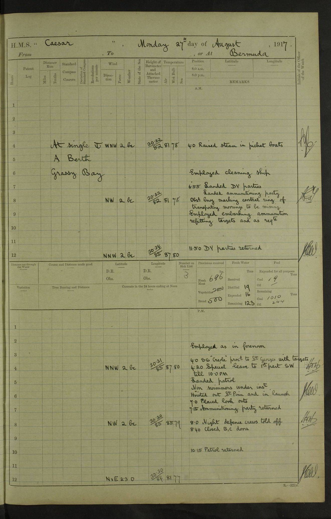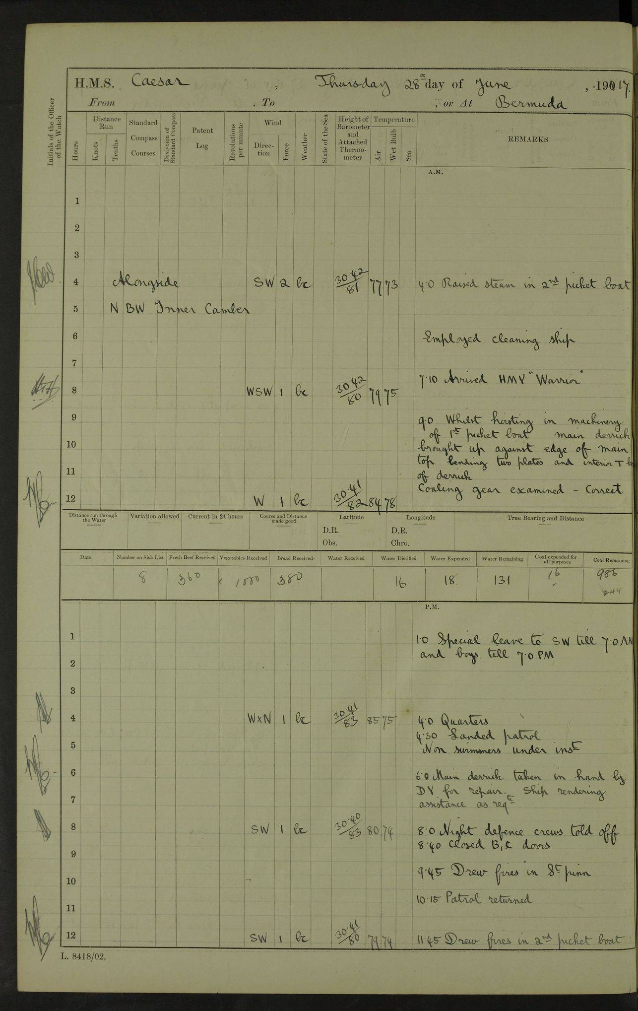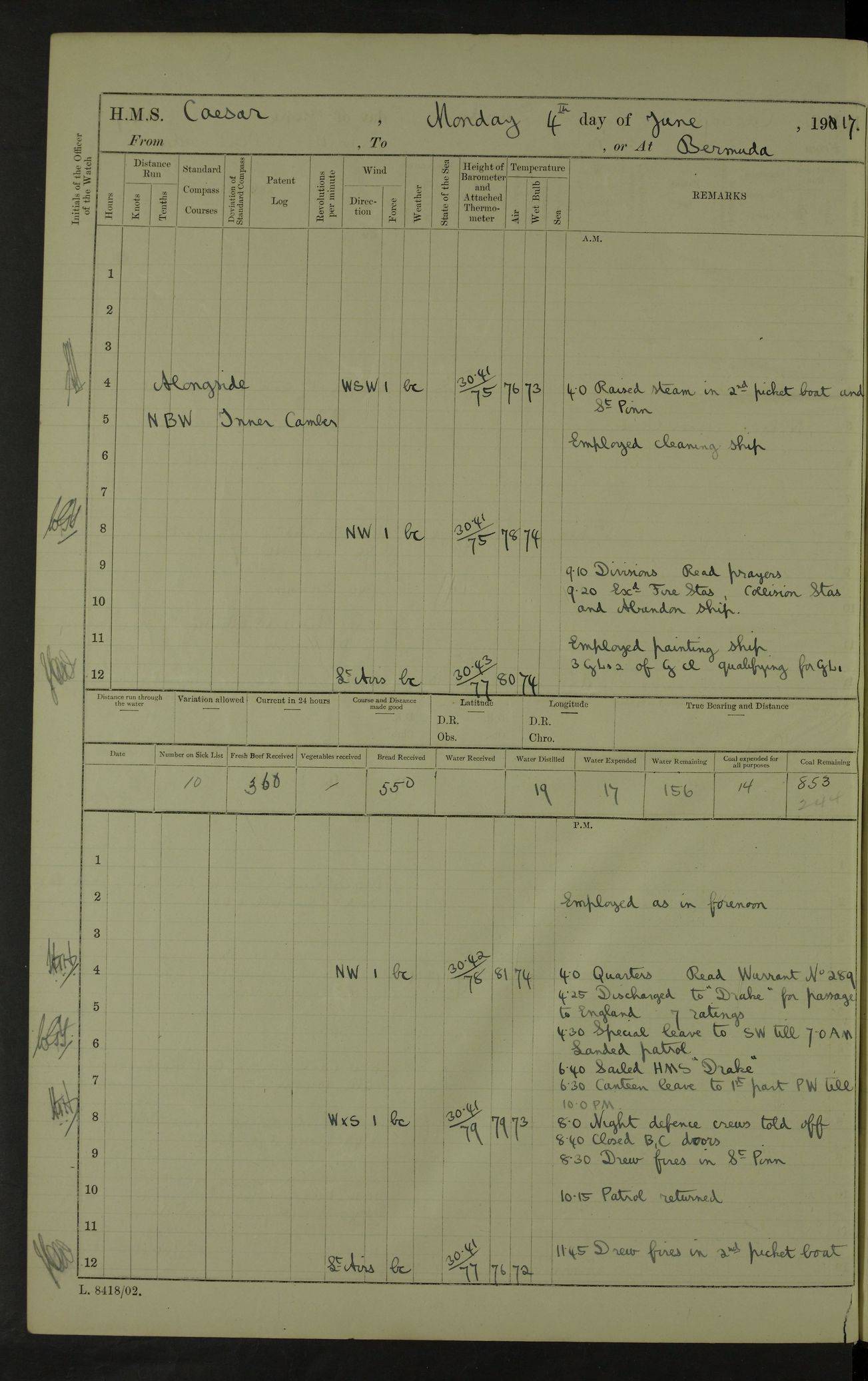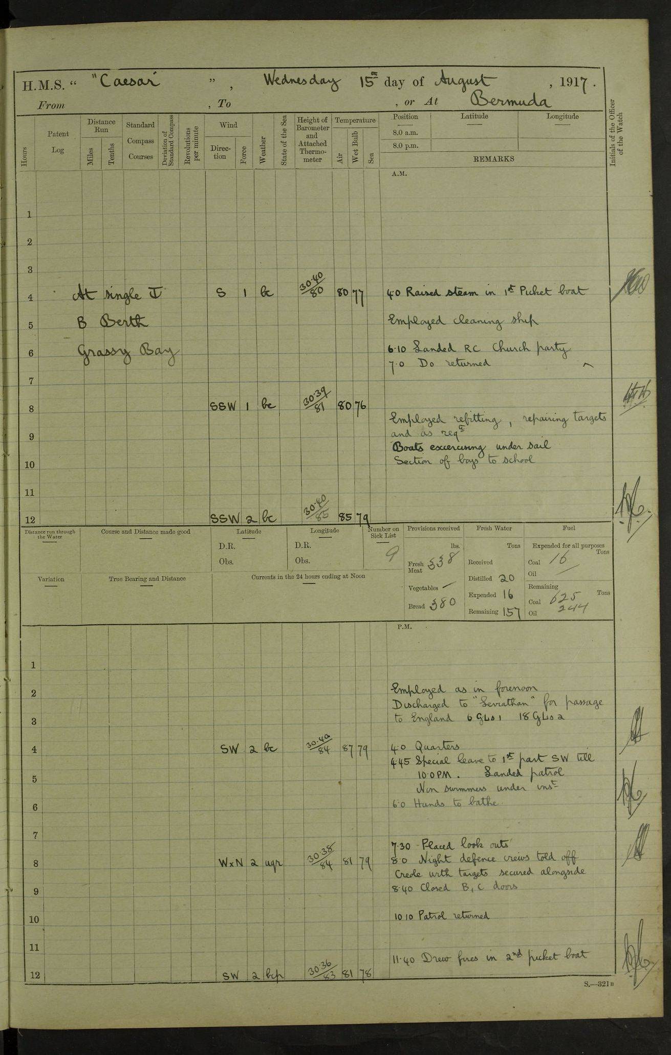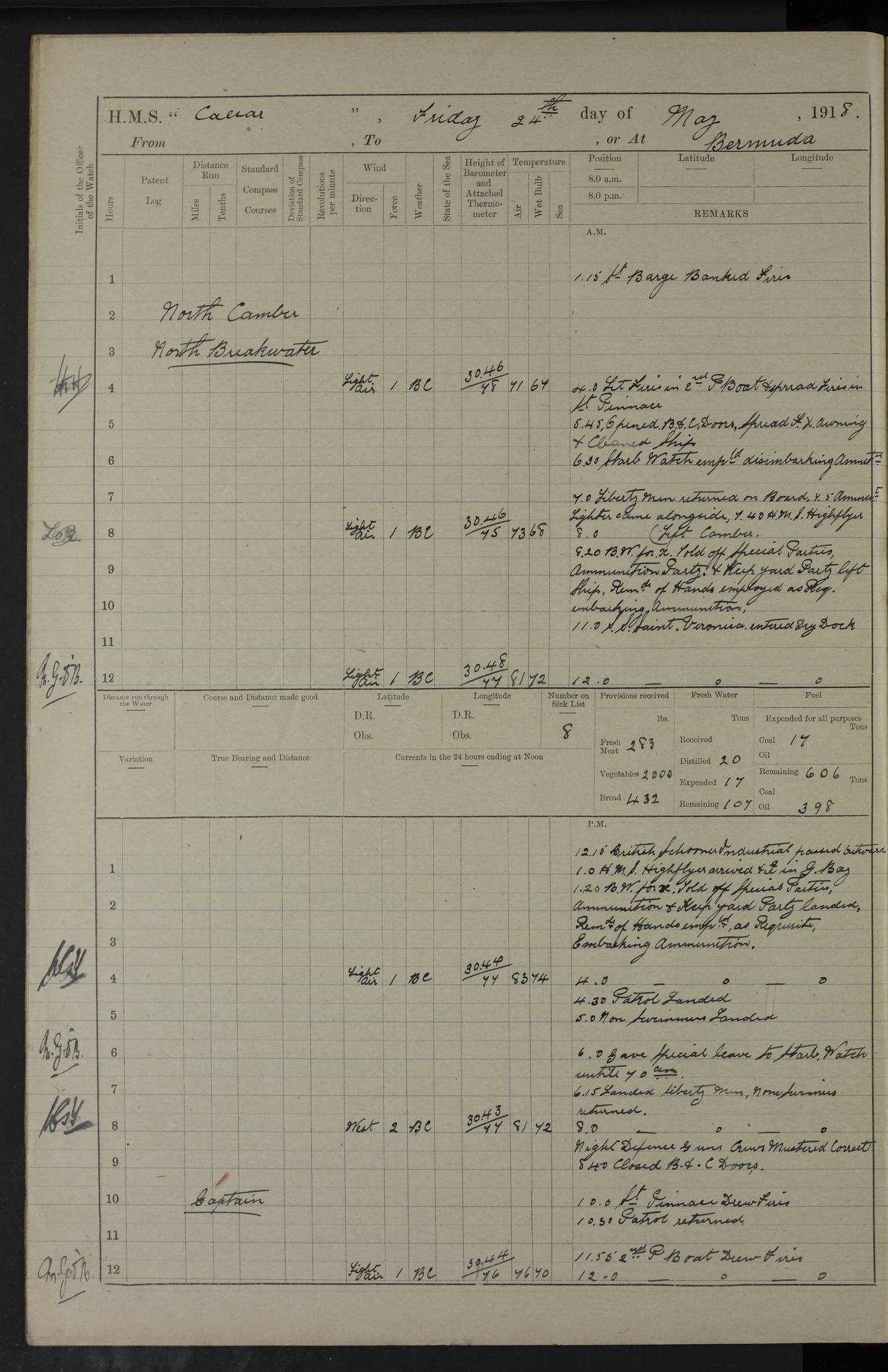 4caf84b6cadfd34197009939: (http://oldweather.s3.amazonaws.com/ADM53-36574/ADM 53-36574-145_1.jpg) 1 January 1917 At Bermuda Lat 32.32, Long -64.83 [Alongside Outer Camber Wall] 4.0am: Raised steam in first Picket boat. 6.0am: Employed cleaning ship. 7.0am: Landed Dockyard parties. Opened B, C doors. am: Employed drawing ammunition and stores, refitting and as requisite. 0.45pm: Paid monthly advance. pm: Employed as in forenoon. 4.30pm: Special leave to Starboard Watch till 7.0am. Landed patrol. 5.0pm: Dockyard parties returned. 6.30pm: Canteen leave to second part Port Watch till 10.0pm. 8.0pm: Night guns’ and search lights’ crews told off. 8.40pm: Closed B, C doors. 10.15pm: Patrol returned. 11.35pm: Drew fires in picket boats. [Number on sick list: 8] [Provisions received: Fresh Meat 340 lbs, Vegetables 2000 lbs, Bread 464 lbs] [Weather fine, though squally in early am. Noon temperature 63F] 4caf84b6cadfd3419700993a: (http://oldweather.s3.amazonaws.com/ADM53-36574/ADM 53-36574-146_0.jpg) 2 January 1917 [Year incorrectly shown as 1916] At Bermuda Lat 32.32, Long -64.83 [Alongside Outer Camber Wall] 4.30am: Raised steam in first picket boat. 6.30am: Landed working party to assist in repair of fenders in Inner Camber. 7.0am: Opened B, C doors. am: Employed embarking ammunition, refitting and as requisite. 11.45am: Working party returned. pm: Employed as in forenoon. 4.0pm: Quarters. 4.30pm: Special leave to Port Watch till 7.0am. Landed patrol. 6.30pm: Canteen leave to second part Starboard Watch till 10.0pm. 10.0pm: Patrol returned. 11.45pm: Drew fires in first picket boat. [Number on sick list: 8] [Provisions received: Fresh Meat 690 lbs, Bread 524 lbs] 4caf84b6cadfd3419700993b: (http://oldweather.s3.amazonaws.com/ADM53-36574/ADM 53-36574-146_1.jpg) 3 January 1917 [Year incorrectly shown as 1916] At Bermuda Lat 32.32, Long -64.83 [Alongside Outer Camber Wall] 7.0am: Opened B, C doors. Landed Dockyard parties. Sailed HMS “Antrim”. Landed Sanitary working party. am: Employed dismounting guns, drawing and returning stores, refitting and as requisite. Training class under instruction. 4.0pm: Quarters. Read Warrants No 268, 269. 4.30pm: Special leave to Starboard Watch till 7.0am. Landed patrol. 5.0pm: Dockyard and Working parties returned. 6.30pm: Canteen leave to first part Port Watch till 10.0pm. 8.5pm: Night guns’ and search lights’ crews told off. 10.0pm: Patrol returned. [Number on sick list: 8] [Provisions received: Fresh Meat 351 lbs, Vegetables 1000 lbs, Bread 512 lbs] 4caf84b6cadfd3419700993c: (http://oldweather.s3.amazonaws.com/ADM53-36574/ADM 53-36574-147_0.jpg) 4 January 1917 At Bermuda Lat 32.32, Long -64.83 [Alongside Outer Camber Wall] 7.0am: Landed Dockyard and Sanitary Working parties. am: Employed dismounting guns, sending up foretopmast, refitting and as requisite. Gunnery training class under instruction. 9.0am: Landed Working party to assist in repairs of fenders in Inner Camber. Discharged to SS “Kiakora” [probably Kaikoura] two ratings to form gun’s crew. 3.30pm: Working parties returned. 4.30pm: Special leave to Port Watch till 7.0am. Landed patrol. 6.30pm: Canteen leave to first part Starboard Watch till 10.0pm; 10.15pm: Patrol returned. [Number on sick list: 9] [Provisions received: Fresh Meat 353 lbs, Vegetables 1000 lbs, Bread 498 lbs] 4caf84b6cadfd3419700993d: (http://oldweather.s3.amazonaws.com/ADM53-36574/ADM 53-36574-147_1.jpg) 5 January 1917 At Bermuda Lat 32.32, Long -64.83 [Alongside Outer Camber Wall] 7.0am: Landed Dockyard and Sanitary Working parties. am: Employed refitting, dismounting guns and as requisite. Gunnery Training class under instruction. pm: Employed as in forenoon. 2.55pm: Arrived HMS “Antrim”. 4.30pm: Special leave to Starboard Watch till 7.0am. Landed patrol. 5.40pm: Drew fires in second picket boat. 6.30pm: Canteen leave to second part Port Watch till 10.0pm. 11.0pm: Patrol returned. 11.40pm: Drew fires in first picket boat. [Number on sick list: 9] [Provisions received: Fresh Meat 350 lbs, Vegetables 400 lbs, Bread 514 lbs] 4caf84b6cadfd3419700993e: (http://oldweather.s3.amazonaws.com/ADM53-36574/ADM 53-36574-148_0.jpg) 6 January 1917 At Bermuda Lat 32.32, Long -64.83 [Alongside Outer Camber Wall] 7.0am: Landed Dockyard parties. am: Employed cleaning ship, refitting, discharging ammunition from SS “Goodwood”, assisting in repairs to fenders of Inner Camber and as requisite. Training class under instruction. 11.45am: Dockyard parties returned. 0.30pm: Observed SS “Prophet” aground in Stag Channel. pm: Make and mend clothes. 1.30pm: Special leave to Port Watch till 7.0am and boys till 5.0pm. 3.0pm: SS “Prophet” refloated and proceeded to anchor. 4.0pm: Quarters. Read Warrant No 270. 4.30pm: Landed patrol. 5.0pm: Party employed discharging SS “Goodwood”. 6.30pm: Canteen leave to second part Starboard Watch till 10.0pm. 8.0pm: Night guns’ and search lights’ crews told off. 8.40pm: Closed B, C doors. 10.15pm: Patrol returned. [Number on sick list: 7] [Provisions received: Fresh Meat 361 lbs, Vegetables 2000 lbs, Bread 928 lbs] 4caf84b6cadfd3419700993f: (http://oldweather.s3.amazonaws.com/ADM53-36574/ADM 53-36574-148_1.jpg) 7 January 1917 At Bermuda Lat 32.32, Long -64.83 [Alongside Outer Camber Wall] 5.55am: Opened B, C doors. Employed cleaning ship. 8.30am: Landed Church parties, Presbyterians 18, Wesleyans 43, RCs 41. 9.30am: Divisions. 10.15am: Ship’s Company attended Divine Service at Dockyard Church. 11.20am: Church parties returned. 1.0pm: Special leave to Starboard Watch till 7.0am and boys will 5.0pm. 6.30pm: Canteen leave to first part Port Watch till 10.0pm. [Number on sick list: 8] [Weather fine, noon temperature 70F] 4caf84b6cadfd34197009940: (http://oldweather.s3.amazonaws.com/ADM53-36574/ADM 53-36574-149_0.jpg) 8 January 1917 At Bermuda Lat 32.32, Long -64.83 [Alongside Outer Camber Wall] 4.0am: Raised steam in first picket boat. 7.0am: Landed Dockyard parties. am: Employed dischargi