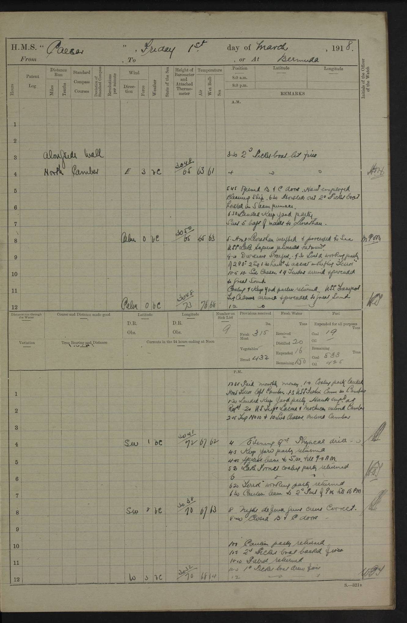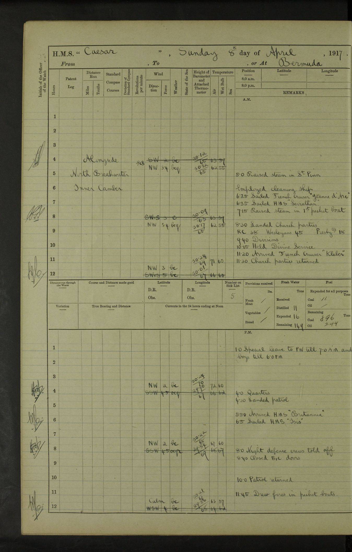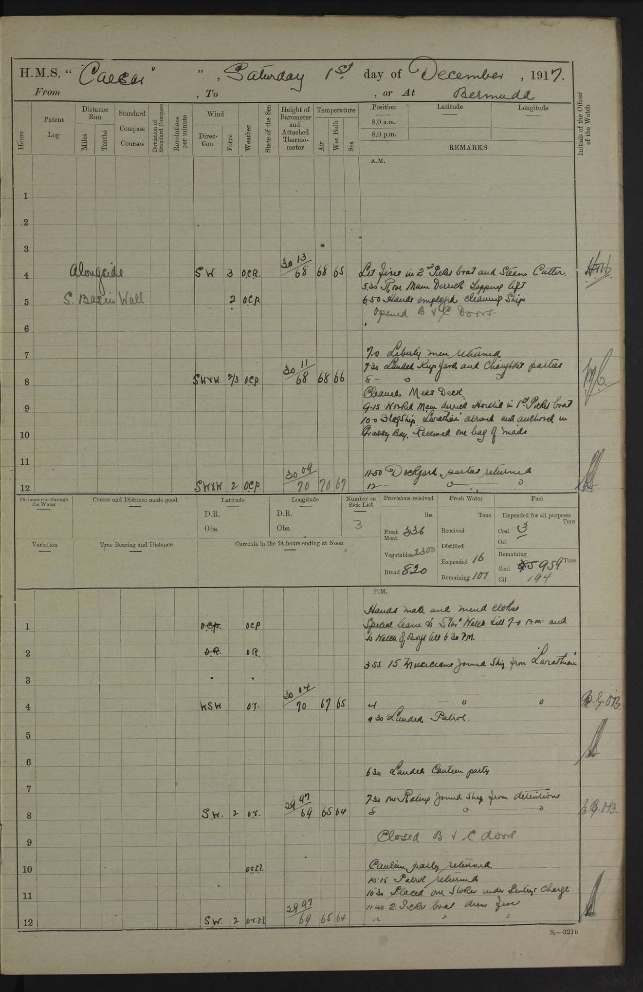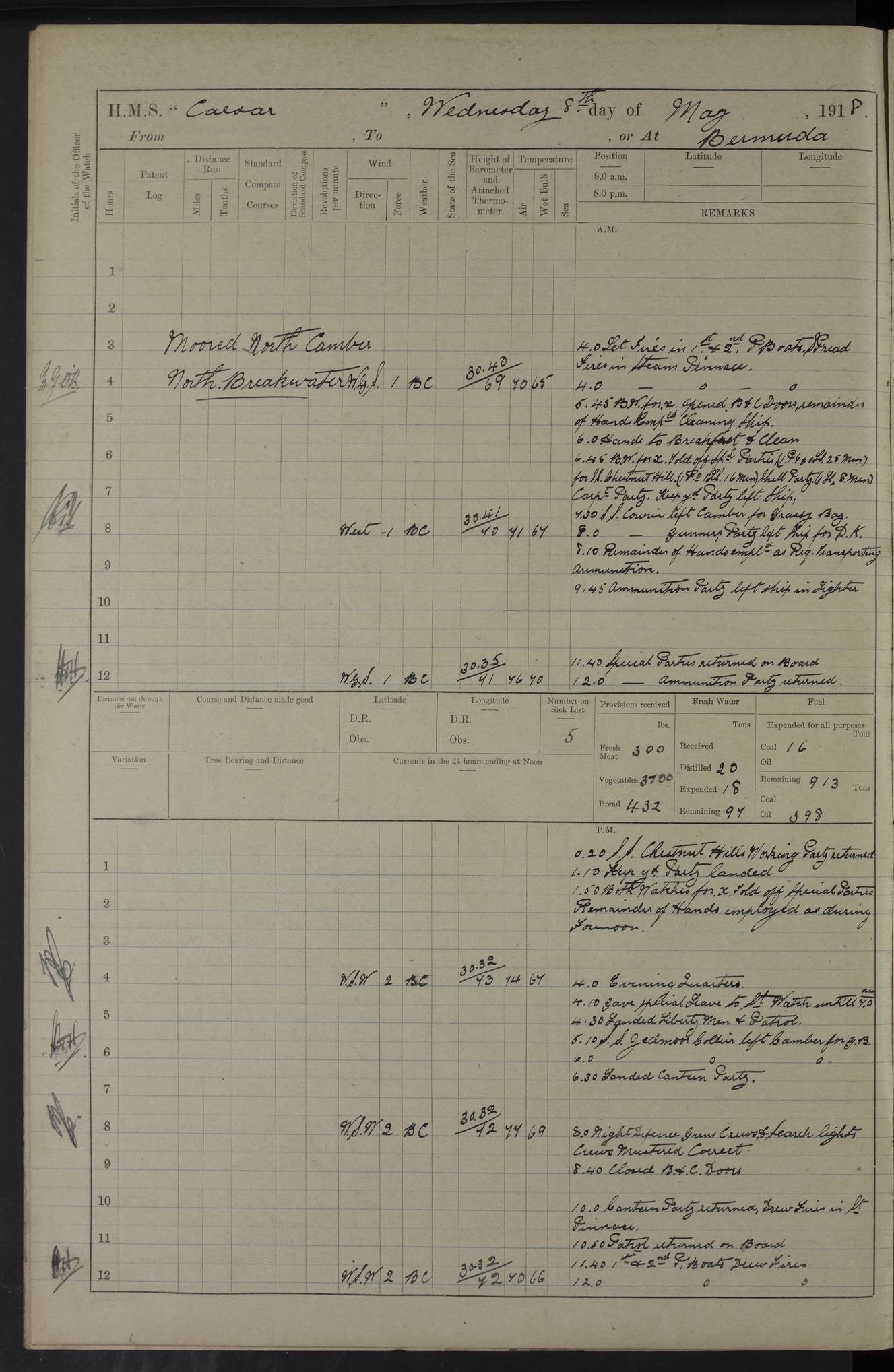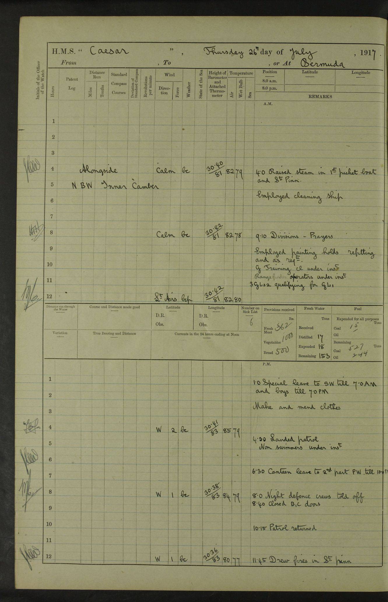 4caf84b6cadfd34197009939: (http://oldweather.s3.amazonaws.com/ADM53-36574/ADM 53-36574-145_1.jpg) 1 January 1917 At Bermuda Lat 32.32, Long -64.83 [Alongside Outer Camber Wall] 4.0am: Raised steam in first Picket boat. 6.0am: Employed cleaning ship. 7.0am: Landed Dockyard parties. Opened B, C doors. am: Employed drawing ammunition and stores, refitting and as requisite. 0.45pm: Paid monthly advance. pm: Employed as in forenoon. 4.30pm: Special leave to Starboard Watch till 7.0am. Landed patrol. 5.0pm: Dockyard parties returned. 6.30pm: Canteen leave to second part Port Watch till 10.0pm. 8.0pm: Night guns’ and search lights’ crews told off. 8.40pm: Closed B, C doors. 10.15pm: Patrol returned. 11.35pm: Drew fires in picket boats. [Number on sick list: 8] [Provisions received: Fresh Meat 340 lbs, Vegetables 2000 lbs, Bread 464 lbs] [Weather fine, though squally in early am. Noon temperature 63F] 4caf84b6cadfd3419700993a: (http://oldweather.s3.amazonaws.com/ADM53-36574/ADM 53-36574-146_0.jpg) 2 January 1917 [Year incorrectly shown as 1916] At Bermuda Lat 32.32, Long -64.83 [Alongside Outer Camber Wall] 4.30am: Raised steam in first picket boat. 6.30am: Landed working party to assist in repair of fenders in Inner Camber. 7.0am: Opened B, C doors. am: Employed embarking ammunition, refitting and as requisite. 11.45am: Working party returned. pm: Employed as in forenoon. 4.0pm: Quarters. 4.30pm: Special leave to Port Watch till 7.0am. Landed patrol. 6.30pm: Canteen leave to second part Starboard Watch till 10.0pm. 10.0pm: Patrol returned. 11.45pm: Drew fires in first picket boat. [Number on sick list: 8] [Provisions received: Fresh Meat 690 lbs, Bread 524 lbs] 4caf84b6cadfd3419700993b: (http://oldweather.s3.amazonaws.com/ADM53-36574/ADM 53-36574-146_1.jpg) 3 January 1917 [Year incorrectly shown as 1916] At Bermuda Lat 32.32, Long -64.83 [Alongside Outer Camber Wall] 7.0am: Opened B, C doors. Landed Dockyard parties. Sailed HMS “Antrim”. Landed Sanitary working party. am: Employed dismounting guns, drawing and returning stores, refitting and as requisite. Training class under instruction. 4.0pm: Quarters. Read Warrants No 268, 269. 4.30pm: Special leave to Starboard Watch till 7.0am. Landed patrol. 5.0pm: Dockyard and Working parties returned. 6.30pm: Canteen leave to first part Port Watch till 10.0pm. 8.5pm: Night guns’ and search lights’ crews told off. 10.0pm: Patrol returned. [Number on sick list: 8] [Provisions received: Fresh Meat 351 lbs, Vegetables 1000 lbs, Bread 512 lbs] 4caf84b6cadfd3419700993c: (http://oldweather.s3.amazonaws.com/ADM53-36574/ADM 53-36574-147_0.jpg) 4 January 1917 At Bermuda Lat 32.32, Long -64.83 [Alongside Outer Camber Wall] 7.0am: Landed Dockyard and Sanitary Working parties. am: Employed dismounting guns, sending up foretopmast, refitting and as requisite. Gunnery training class under instruction. 9.0am: Landed Working party to assist in repairs of fenders in Inner Camber. Discharged to SS “Kiakora” [probably Kaikoura] two ratings to form gun’s crew. 3.30pm: Working parties returned. 4.30pm: Special leave to Port Watch till 7.0am. Landed patrol. 6.30pm: Canteen leave to first part Starboard Watch till 10.0pm; 10.15pm: Patrol returned. [Number on sick list: 9] [Provisions received: Fresh Meat 353 lbs, Vegetables 1000 lbs, Bread 498 lbs] 4caf84b6cadfd3419700993d: (http://oldweather.s3.amazonaws.com/ADM53-36574/ADM 53-36574-147_1.jpg) 5 January 1917 At Bermuda Lat 32.32, Long -64.83 [Alongside Outer Camber Wall] 7.0am: Landed Dockyard and Sanitary Working parties. am: Employed refitting, dismounting guns and as requisite. Gunnery Training class under instruction. pm: Employed as in forenoon. 2.55pm: Arrived HMS “Antrim”. 4.30pm: Special leave to Starboard Watch till 7.0am. Landed patrol. 5.40pm: Drew fires in second picket boat. 6.30pm: Canteen leave to second part Port Watch till 10.0pm. 11.0pm: Patrol returned. 11.40pm: Drew fires in first picket boat. [Number on sick list: 9] [Provisions received: Fresh Meat 350 lbs, Vegetables 400 lbs, Bread 514 lbs] 4caf84b6cadfd3419700993e: (http://oldweather.s3.amazonaws.com/ADM53-36574/ADM 53-36574-148_0.jpg) 6 January 1917 At Bermuda Lat 32.32, Long -64.83 [Alongside Outer Camber Wall] 7.0am: Landed Dockyard parties. am: Employed cleaning ship, refitting, discharging ammunition from SS “Goodwood”, assisting in repairs to fenders of Inner Camber and as requisite. Training class under instruction. 11.45am: Dockyard parties returned. 0.30pm: Observed SS “Prophet” aground in Stag Channel. pm: Make and mend clothes. 1.30pm: Special leave to Port Watch till 7.0am and boys till 5.0pm. 3.0pm: SS “Prophet” refloated and proceeded to anchor. 4.0pm: Quarters. Read Warrant No 270. 4.30pm: Landed patrol. 5.0pm: Party employed discharging SS “Goodwood”. 6.30pm: Canteen leave to second part Starboard Watch till 10.0pm. 8.0pm: Night guns’ and search lights’ crews told off. 8.40pm: Closed B, C doors. 10.15pm: Patrol returned. [Number on sick list: 7] [Provisions received: Fresh Meat 361 lbs, Vegetables 2000 lbs, Bread 928 lbs] 4caf84b6cadfd3419700993f: (http://oldweather.s3.amazonaws.com/ADM53-36574/ADM 53-36574-148_1.jpg) 7 January 1917 At Bermuda Lat 32.32, Long -64.83 [Alongside Outer Camber Wall] 5.55am: Opened B, C doors. Employed cleaning ship. 8.30am: Landed Church parties, Presbyterians 18, Wesleyans 43, RCs 41. 9.30am: Divisions. 10.15am: Ship’s Company attended Divine Service at Dockyard Church. 11.20am: Church parties returned. 1.0pm: Special leave to Starboard Watch till 7.0am and boys will 5.0pm. 6.30pm: Canteen leave to first part Port Watch till 10.0pm. [Number on sick list: 8] [Weather fine, noon temperature 70F] 4caf84b6cadfd34197009940: (http://oldweather.s3.amazonaws.com/ADM53-36574/ADM 53-36574-149_0.jpg) 8 January 1917 At Bermuda Lat 32.32, Long -64.83 [Alongside Outer Camber Wall] 4.0am: Raised steam in first picket boat. 7.0am: Landed Dockyard parties. am: Employed dischargi