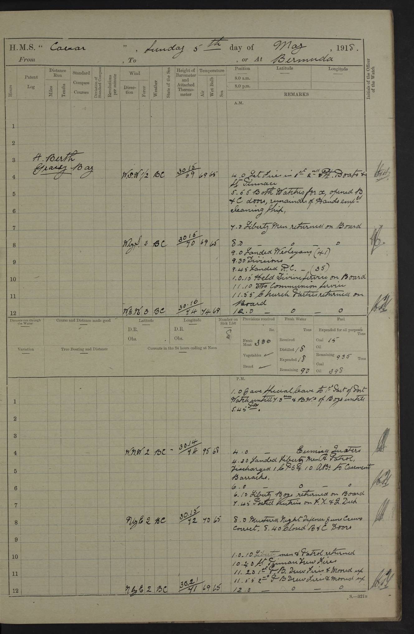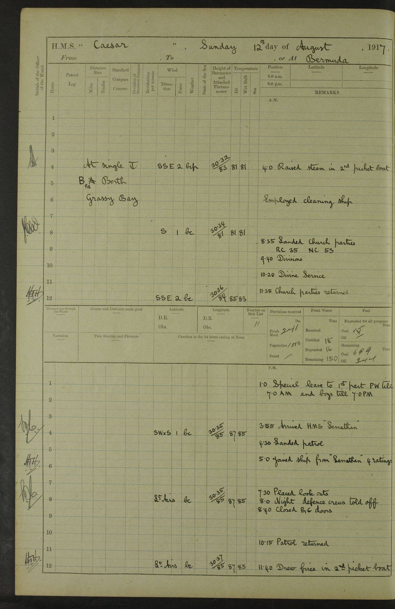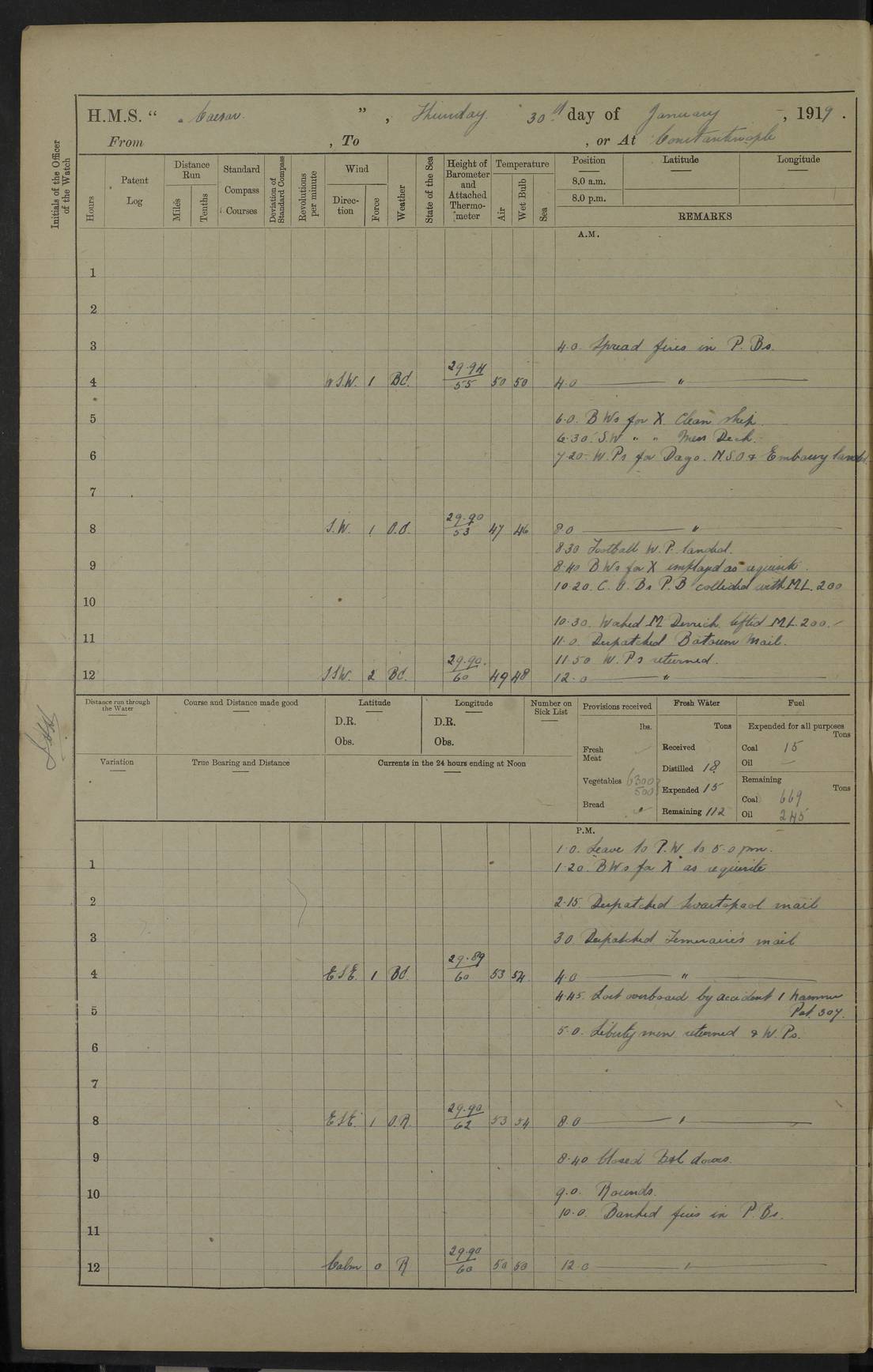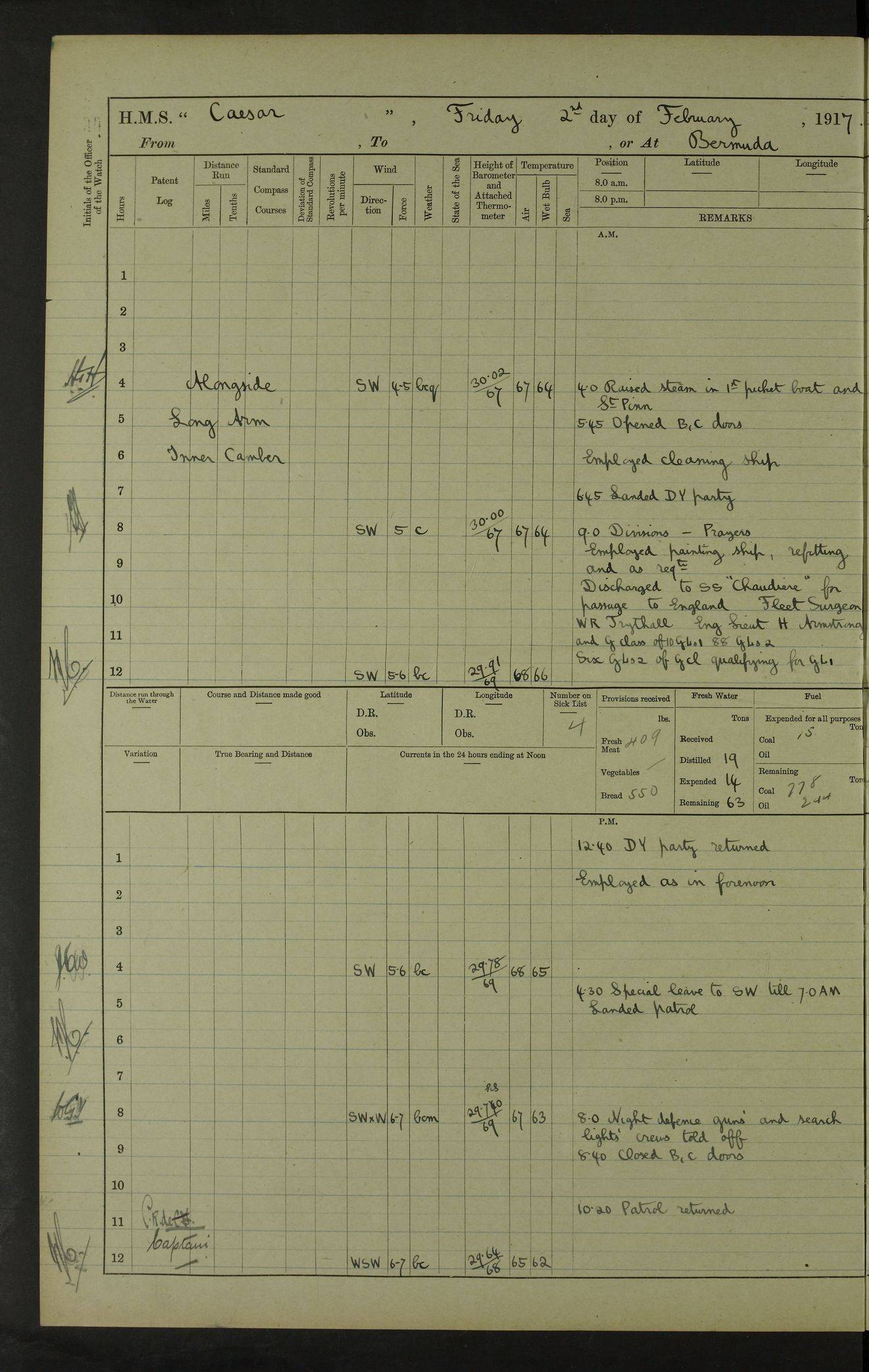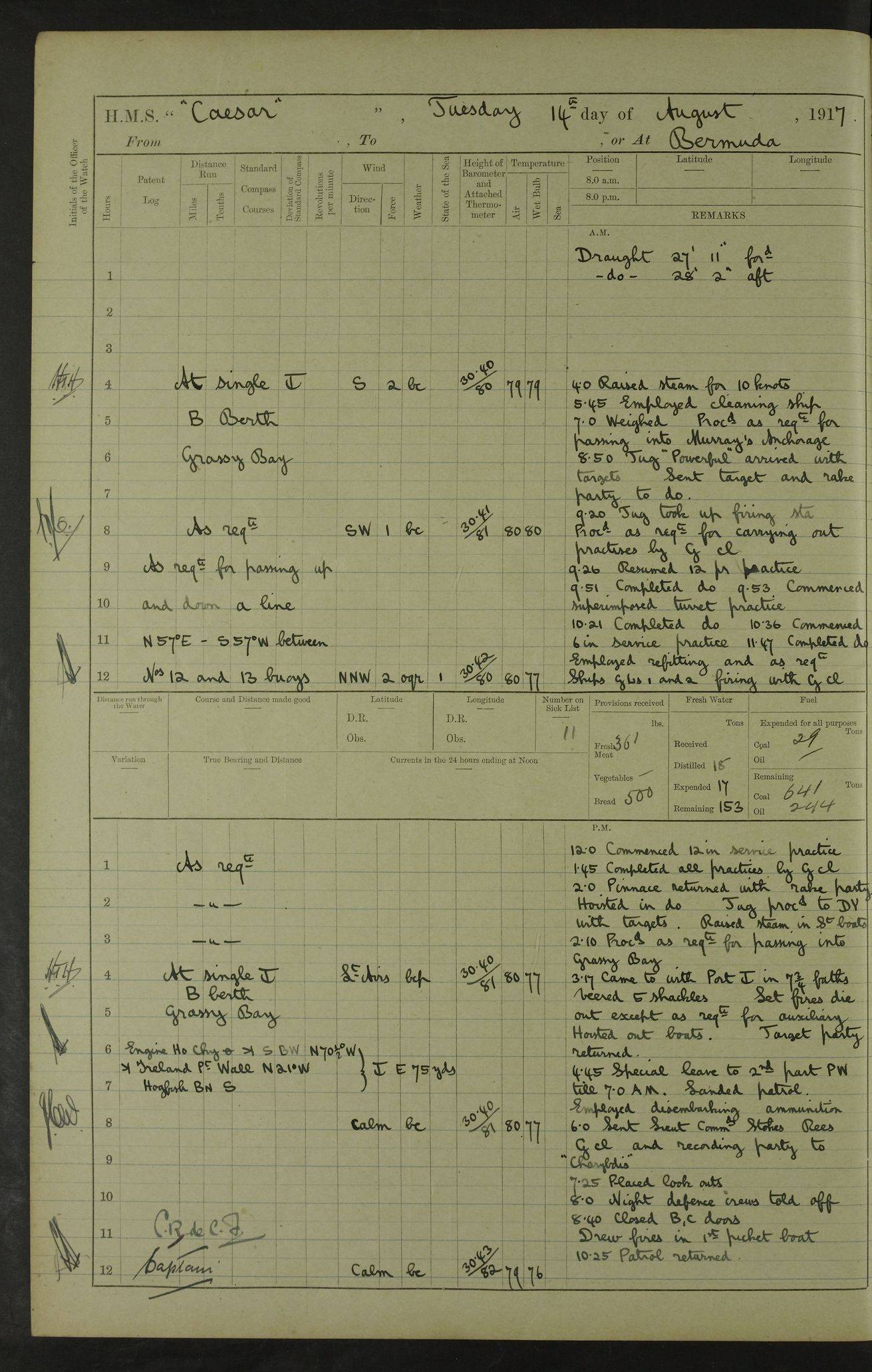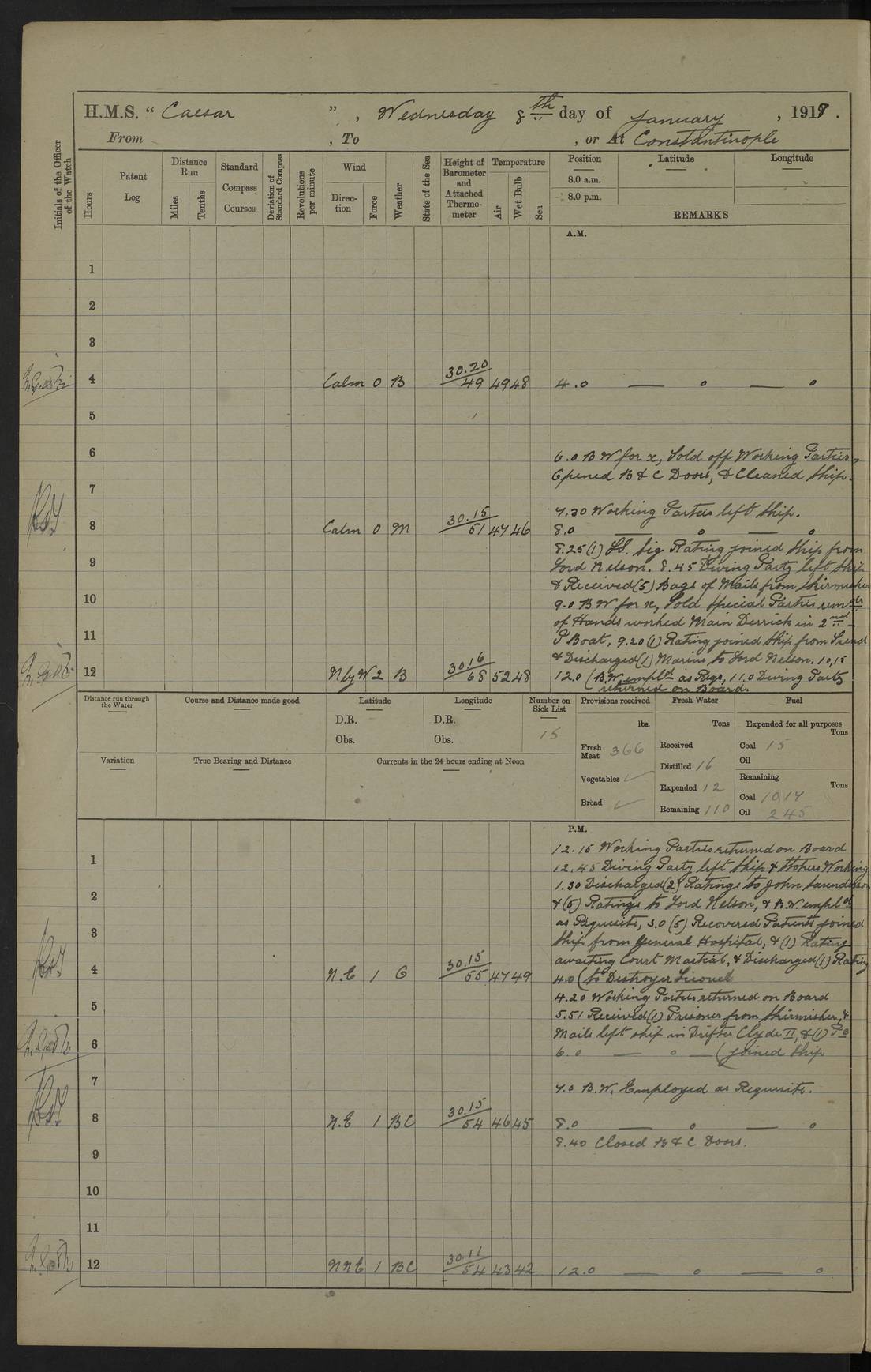4caf84b6cadfd34197009939: (http://oldweather.s3.amazonaws.com/ADM53-36574/ADM 53-36574-145_1.jpg) 1 January 1917 At Bermuda Lat 32.32, Long -64.83 [Alongside Outer Camber Wall] 4.0am: Raised steam in first Picket boat. 6.0am: Employed cleaning ship. 7.0am: Landed Dockyard parties. Opened B, C doors. am: Employed drawing ammunition and stores, refitting and as requisite. 0.45pm: Paid monthly advance. pm: Employed as in forenoon. 4.30pm: Special leave to Starboard Watch till 7.0am. Landed patrol. 5.0pm: Dockyard parties returned. 6.30pm: Canteen leave to second part Port Watch till 10.0pm. 8.0pm: Night guns’ and search lights’ crews told off. 8.40pm: Closed B, C doors. 10.15pm: Patrol returned. 11.35pm: Drew fires in picket boats. [Number on sick list: 8] [Provisions received: Fresh Meat 340 lbs, Vegetables 2000 lbs, Bread 464 lbs] [Weather fine, though squally in early am. Noon temperature 63F] 4caf84b6cadfd3419700993a: (http://oldweather.s3.amazonaws.com/ADM53-36574/ADM 53-36574-146_0.jpg) 2 January 1917 [Year incorrectly shown as 1916] At Bermuda Lat 32.32, Long -64.83 [Alongside Outer Camber Wall] 4.30am: Raised steam in first picket boat. 6.30am: Landed working party to assist in repair of fenders in Inner Camber. 7.0am: Opened B, C doors. am: Employed embarking ammunition, refitting and as requisite. 11.45am: Working party returned. pm: Employed as in forenoon. 4.0pm: Quarters. 4.30pm: Special leave to Port Watch till 7.0am. Landed patrol. 6.30pm: Canteen leave to second part Starboard Watch till 10.0pm. 10.0pm: Patrol returned. 11.45pm: Drew fires in first picket boat. [Number on sick list: 8] [Provisions received: Fresh Meat 690 lbs, Bread 524 lbs] 4caf84b6cadfd3419700993b: (http://oldweather.s3.amazonaws.com/ADM53-36574/ADM 53-36574-146_1.jpg) 3 January 1917 [Year incorrectly shown as 1916] At Bermuda Lat 32.32, Long -64.83 [Alongside Outer Camber Wall] 7.0am: Opened B, C doors. Landed Dockyard parties. Sailed HMS “Antrim”. Landed Sanitary working party. am: Employed dismounting guns, drawing and returning stores, refitting and as requisite. Training class under instruction. 4.0pm: Quarters. Read Warrants No 268, 269. 4.30pm: Special leave to Starboard Watch till 7.0am. Landed patrol. 5.0pm: Dockyard and Working parties returned. 6.30pm: Canteen leave to first part Port Watch till 10.0pm. 8.5pm: Night guns’ and search lights’ crews told off. 10.0pm: Patrol returned. [Number on sick list: 8] [Provisions received: Fresh Meat 351 lbs, Vegetables 1000 lbs, Bread 512 lbs] 4caf84b6cadfd3419700993c: (http://oldweather.s3.amazonaws.com/ADM53-36574/ADM 53-36574-147_0.jpg) 4 January 1917 At Bermuda Lat 32.32, Long -64.83 [Alongside Outer Camber Wall] 7.0am: Landed Dockyard and Sanitary Working parties. am: Employed dismounting guns, sending up foretopmast, refitting and as requisite. Gunnery training class under instruction. 9.0am: Landed Working party to assist in repairs of fenders in Inner Camber. Discharged to SS “Kiakora” [probably Kaikoura] two ratings to form gun’s crew. 3.30pm: Working parties returned. 4.30pm: Special leave to Port Watch till 7.0am. Landed patrol. 6.30pm: Canteen leave to first part Starboard Watch till 10.0pm; 10.15pm: Patrol returned. [Number on sick list: 9] [Provisions received: Fresh Meat 353 lbs, Vegetables 1000 lbs, Bread 498 lbs] 4caf84b6cadfd3419700993d: (http://oldweather.s3.amazonaws.com/ADM53-36574/ADM 53-36574-147_1.jpg) 5 January 1917 At Bermuda Lat 32.32, Long -64.83 [Alongside Outer Camber Wall] 7.0am: Landed Dockyard and Sanitary Working parties. am: Employed refitting, dismounting guns and as requisite. Gunnery Training class under instruction. pm: Employed as in forenoon. 2.55pm: Arrived HMS “Antrim”. 4.30pm: Special leave to Starboard Watch till 7.0am. Landed patrol. 5.40pm: Drew fires in second picket boat. 6.30pm: Canteen leave to second part Port Watch till 10.0pm. 11.0pm: Patrol returned. 11.40pm: Drew fires in first picket boat. [Number on sick list: 9] [Provisions received: Fresh Meat 350 lbs, Vegetables 400 lbs, Bread 514 lbs] 4caf84b6cadfd3419700993e: (http://oldweather.s3.amazonaws.com/ADM53-36574/ADM 53-36574-148_0.jpg) 6 January 1917 At Bermuda Lat 32.32, Long -64.83 [Alongside Outer Camber Wall] 7.0am: Landed Dockyard parties. am: Employed cleaning ship, refitting, discharging ammunition from SS “Goodwood”, assisting in repairs to fenders of Inner Camber and as requisite. Training class under instruction. 11.45am: Dockyard parties returned. 0.30pm: Observed SS “Prophet” aground in Stag Channel. pm: Make and mend clothes. 1.30pm: Special leave to Port Watch till 7.0am and boys till 5.0pm. 3.0pm: SS “Prophet” refloated and proceeded to anchor. 4.0pm: Quarters. Read Warrant No 270. 4.30pm: Landed patrol. 5.0pm: Party employed discharging SS “Goodwood”. 6.30pm: Canteen leave to second part Starboard Watch till 10.0pm. 8.0pm: Night guns’ and search lights’ crews told off. 8.40pm: Closed B, C doors. 10.15pm: Patrol returned. [Number on sick list: 7] [Provisions received: Fresh Meat 361 lbs, Vegetables 2000 lbs, Bread 928 lbs] 4caf84b6cadfd3419700993f: (http://oldweather.s3.amazonaws.com/ADM53-36574/ADM 53-36574-148_1.jpg) 7 January 1917 At Bermuda Lat 32.32, Long -64.83 [Alongside Outer Camber Wall] 5.55am: Opened B, C doors. Employed cleaning ship. 8.30am: Landed Church parties, Presbyterians 18, Wesleyans 43, RCs 41. 9.30am: Divisions. 10.15am: Ship’s Company attended Divine Service at Dockyard Church. 11.20am: Church parties returned. 1.0pm: Special leave to Starboard Watch till 7.0am and boys will 5.0pm. 6.30pm: Canteen leave to first part Port Watch till 10.0pm. [Number on sick list: 8] [Weather fine, noon temperature 70F] 4caf84b6cadfd34197009940: (http://oldweather.s3.amazonaws.com/ADM53-36574/ADM 53-36574-149_0.jpg) 8 January 1917 At Bermuda Lat 32.32, Long -64.83 [Alongside Outer Camber Wall] 4.0am: Raised steam in first picket boat. 7.0am: Landed Dockyard parties. am: Employed dischargi