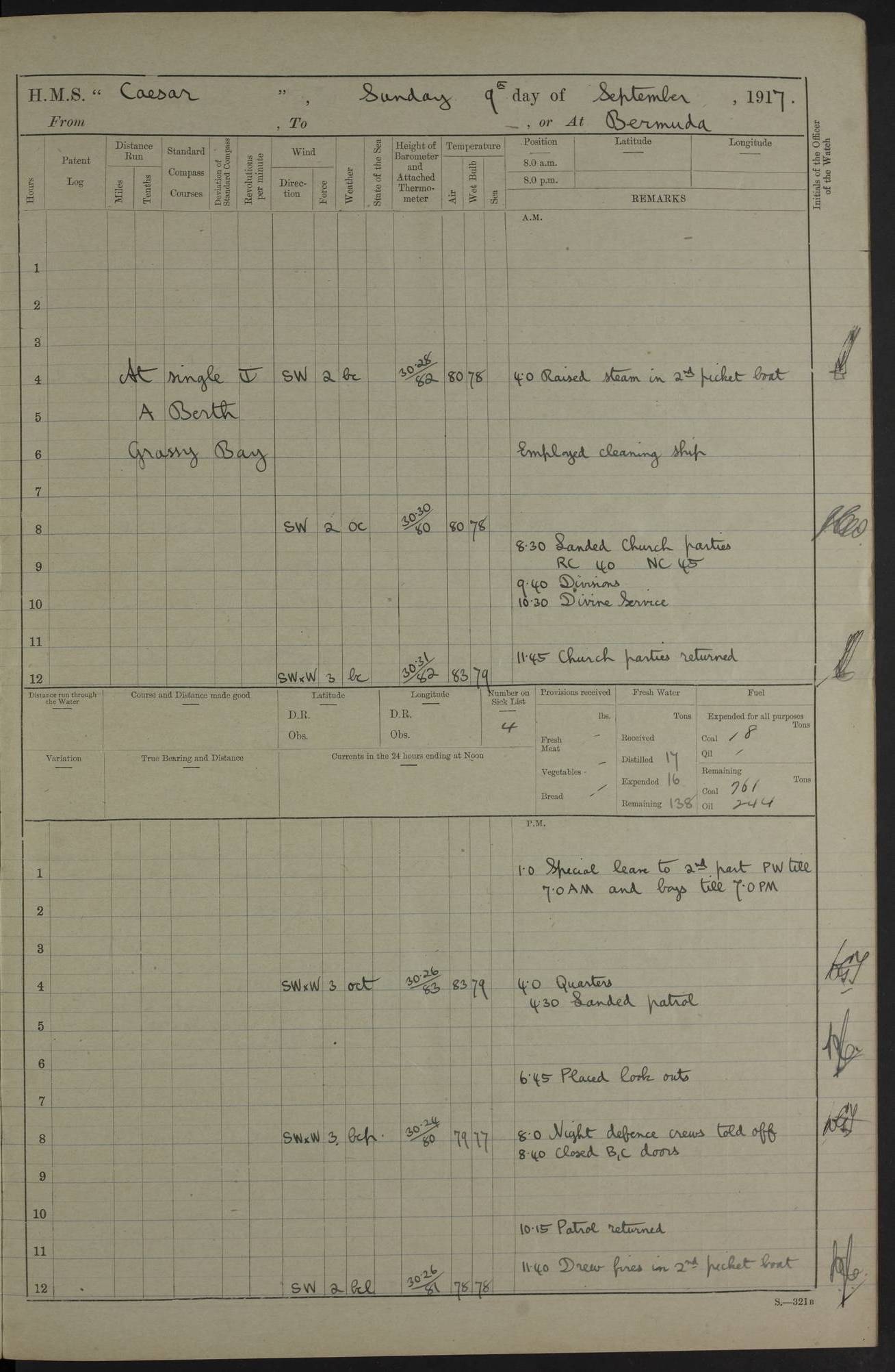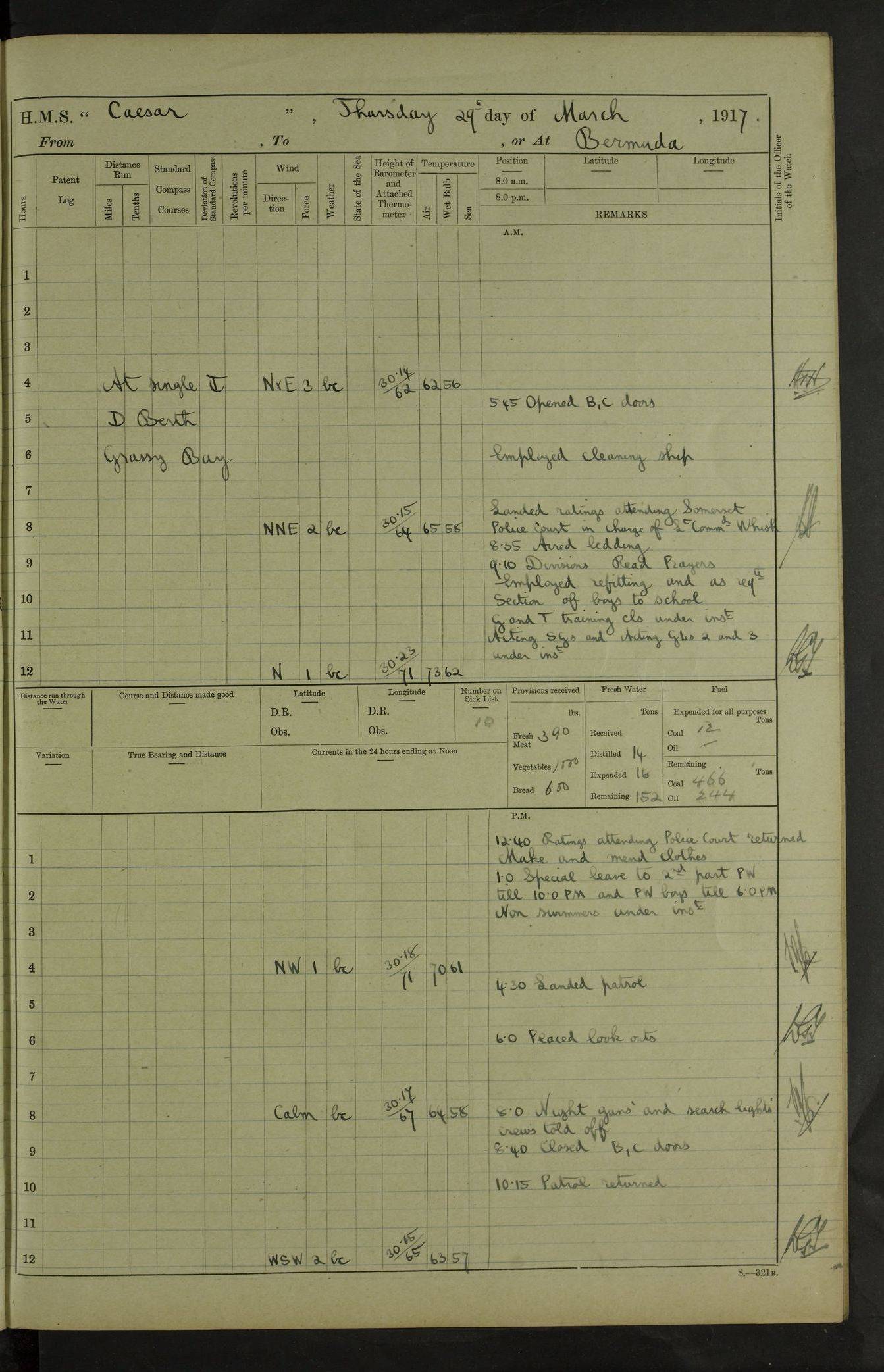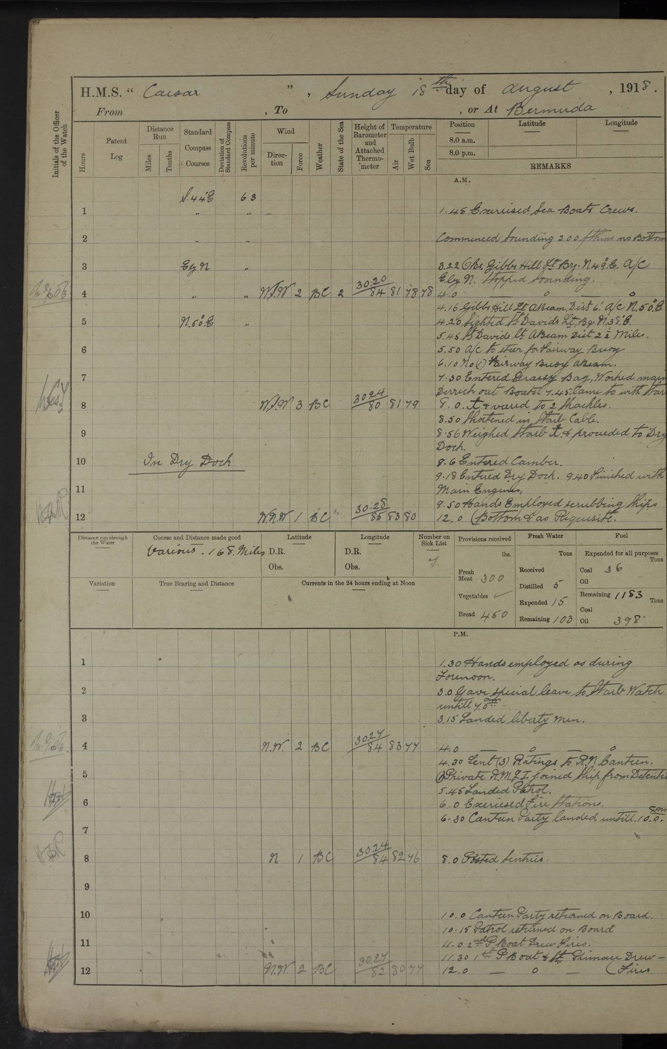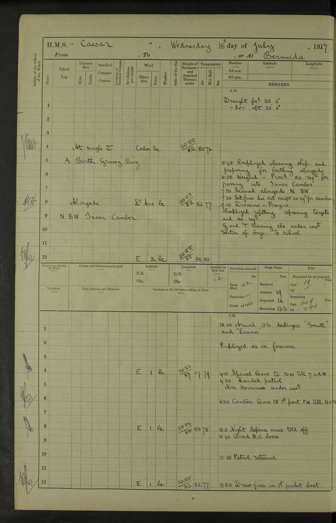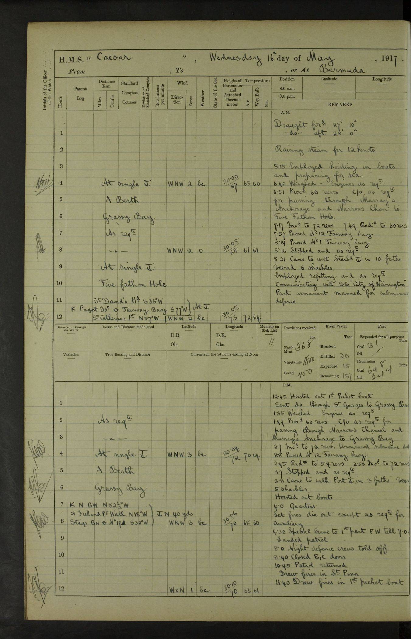 4caf84b6cadfd34197009939: (http://oldweather.s3.amazonaws.com/ADM53-36574/ADM 53-36574-145_1.jpg) 1 January 1917 At Bermuda Lat 32.32, Long -64.83 [Alongside Outer Camber Wall] 4.0am: Raised steam in first Picket boat. 6.0am: Employed cleaning ship. 7.0am: Landed Dockyard parties. Opened B, C doors. am: Employed drawing ammunition and stores, refitting and as requisite. 0.45pm: Paid monthly advance. pm: Employed as in forenoon. 4.30pm: Special leave to Starboard Watch till 7.0am. Landed patrol. 5.0pm: Dockyard parties returned. 6.30pm: Canteen leave to second part Port Watch till 10.0pm. 8.0pm: Night guns’ and search lights’ crews told off. 8.40pm: Closed B, C doors. 10.15pm: Patrol returned. 11.35pm: Drew fires in picket boats. [Number on sick list: 8] [Provisions received: Fresh Meat 340 lbs, Vegetables 2000 lbs, Bread 464 lbs] [Weather fine, though squally in early am. Noon temperature 63F] 4caf84b6cadfd3419700993a: (http://oldweather.s3.amazonaws.com/ADM53-36574/ADM 53-36574-146_0.jpg) 2 January 1917 [Year incorrectly shown as 1916] At Bermuda Lat 32.32, Long -64.83 [Alongside Outer Camber Wall] 4.30am: Raised steam in first picket boat. 6.30am: Landed working party to assist in repair of fenders in Inner Camber. 7.0am: Opened B, C doors. am: Employed embarking ammunition, refitting and as requisite. 11.45am: Working party returned. pm: Employed as in forenoon. 4.0pm: Quarters. 4.30pm: Special leave to Port Watch till 7.0am. Landed patrol. 6.30pm: Canteen leave to second part Starboard Watch till 10.0pm. 10.0pm: Patrol returned. 11.45pm: Drew fires in first picket boat. [Number on sick list: 8] [Provisions received: Fresh Meat 690 lbs, Bread 524 lbs] 4caf84b6cadfd3419700993b: (http://oldweather.s3.amazonaws.com/ADM53-36574/ADM 53-36574-146_1.jpg) 3 January 1917 [Year incorrectly shown as 1916] At Bermuda Lat 32.32, Long -64.83 [Alongside Outer Camber Wall] 7.0am: Opened B, C doors. Landed Dockyard parties. Sailed HMS “Antrim”. Landed Sanitary working party. am: Employed dismounting guns, drawing and returning stores, refitting and as requisite. Training class under instruction. 4.0pm: Quarters. Read Warrants No 268, 269. 4.30pm: Special leave to Starboard Watch till 7.0am. Landed patrol. 5.0pm: Dockyard and Working parties returned. 6.30pm: Canteen leave to first part Port Watch till 10.0pm. 8.5pm: Night guns’ and search lights’ crews told off. 10.0pm: Patrol returned. [Number on sick list: 8] [Provisions received: Fresh Meat 351 lbs, Vegetables 1000 lbs, Bread 512 lbs] 4caf84b6cadfd3419700993c: (http://oldweather.s3.amazonaws.com/ADM53-36574/ADM 53-36574-147_0.jpg) 4 January 1917 At Bermuda Lat 32.32, Long -64.83 [Alongside Outer Camber Wall] 7.0am: Landed Dockyard and Sanitary Working parties. am: Employed dismounting guns, sending up foretopmast, refitting and as requisite. Gunnery training class under instruction. 9.0am: Landed Working party to assist in repairs of fenders in Inner Camber. Discharged to SS “Kiakora” [probably Kaikoura] two ratings to form gun’s crew. 3.30pm: Working parties returned. 4.30pm: Special leave to Port Watch till 7.0am. Landed patrol. 6.30pm: Canteen leave to first part Starboard Watch till 10.0pm; 10.15pm: Patrol returned. [Number on sick list: 9] [Provisions received: Fresh Meat 353 lbs, Vegetables 1000 lbs, Bread 498 lbs] 4caf84b6cadfd3419700993d: (http://oldweather.s3.amazonaws.com/ADM53-36574/ADM 53-36574-147_1.jpg) 5 January 1917 At Bermuda Lat 32.32, Long -64.83 [Alongside Outer Camber Wall] 7.0am: Landed Dockyard and Sanitary Working parties. am: Employed refitting, dismounting guns and as requisite. Gunnery Training class under instruction. pm: Employed as in forenoon. 2.55pm: Arrived HMS “Antrim”. 4.30pm: Special leave to Starboard Watch till 7.0am. Landed patrol. 5.40pm: Drew fires in second picket boat. 6.30pm: Canteen leave to second part Port Watch till 10.0pm. 11.0pm: Patrol returned. 11.40pm: Drew fires in first picket boat. [Number on sick list: 9] [Provisions received: Fresh Meat 350 lbs, Vegetables 400 lbs, Bread 514 lbs] 4caf84b6cadfd3419700993e: (http://oldweather.s3.amazonaws.com/ADM53-36574/ADM 53-36574-148_0.jpg) 6 January 1917 At Bermuda Lat 32.32, Long -64.83 [Alongside Outer Camber Wall] 7.0am: Landed Dockyard parties. am: Employed cleaning ship, refitting, discharging ammunition from SS “Goodwood”, assisting in repairs to fenders of Inner Camber and as requisite. Training class under instruction. 11.45am: Dockyard parties returned. 0.30pm: Observed SS “Prophet” aground in Stag Channel. pm: Make and mend clothes. 1.30pm: Special leave to Port Watch till 7.0am and boys till 5.0pm. 3.0pm: SS “Prophet” refloated and proceeded to anchor. 4.0pm: Quarters. Read Warrant No 270. 4.30pm: Landed patrol. 5.0pm: Party employed discharging SS “Goodwood”. 6.30pm: Canteen leave to second part Starboard Watch till 10.0pm. 8.0pm: Night guns’ and search lights’ crews told off. 8.40pm: Closed B, C doors. 10.15pm: Patrol returned. [Number on sick list: 7] [Provisions received: Fresh Meat 361 lbs, Vegetables 2000 lbs, Bread 928 lbs] 4caf84b6cadfd3419700993f: (http://oldweather.s3.amazonaws.com/ADM53-36574/ADM 53-36574-148_1.jpg) 7 January 1917 At Bermuda Lat 32.32, Long -64.83 [Alongside Outer Camber Wall] 5.55am: Opened B, C doors. Employed cleaning ship. 8.30am: Landed Church parties, Presbyterians 18, Wesleyans 43, RCs 41. 9.30am: Divisions. 10.15am: Ship’s Company attended Divine Service at Dockyard Church. 11.20am: Church parties returned. 1.0pm: Special leave to Starboard Watch till 7.0am and boys will 5.0pm. 6.30pm: Canteen leave to first part Port Watch till 10.0pm. [Number on sick list: 8] [Weather fine, noon temperature 70F] 4caf84b6cadfd34197009940: (http://oldweather.s3.amazonaws.com/ADM53-36574/ADM 53-36574-149_0.jpg) 8 January 1917 At Bermuda Lat 32.32, Long -64.83 [Alongside Outer Camber Wall] 4.0am: Raised steam in first picket boat. 7.0am: Landed Dockyard parties. am: Employed dischargi