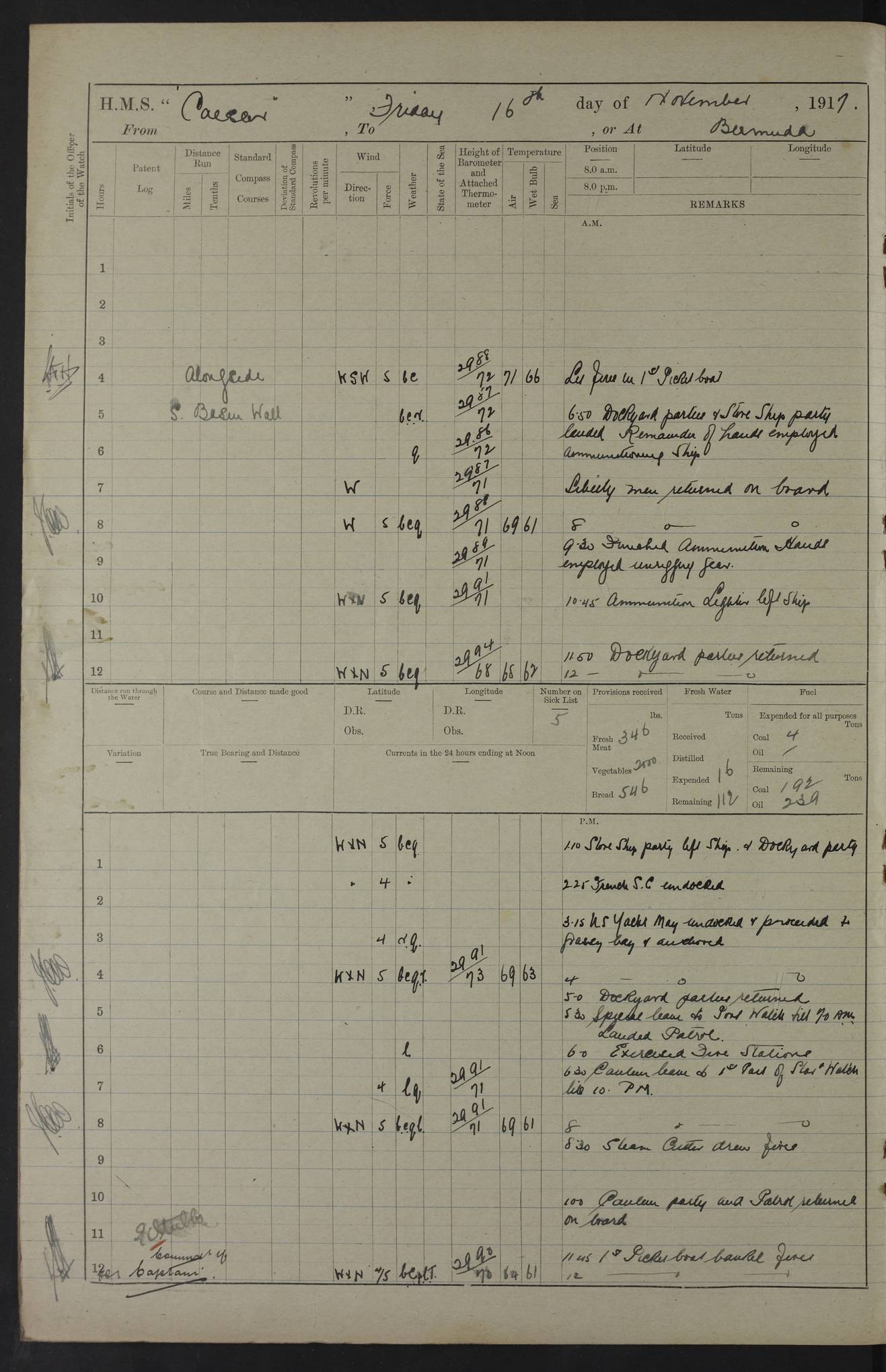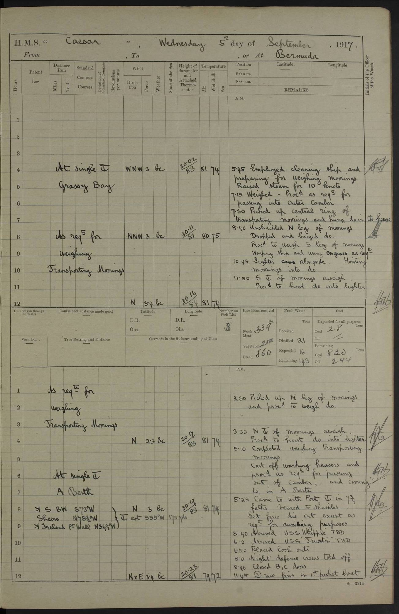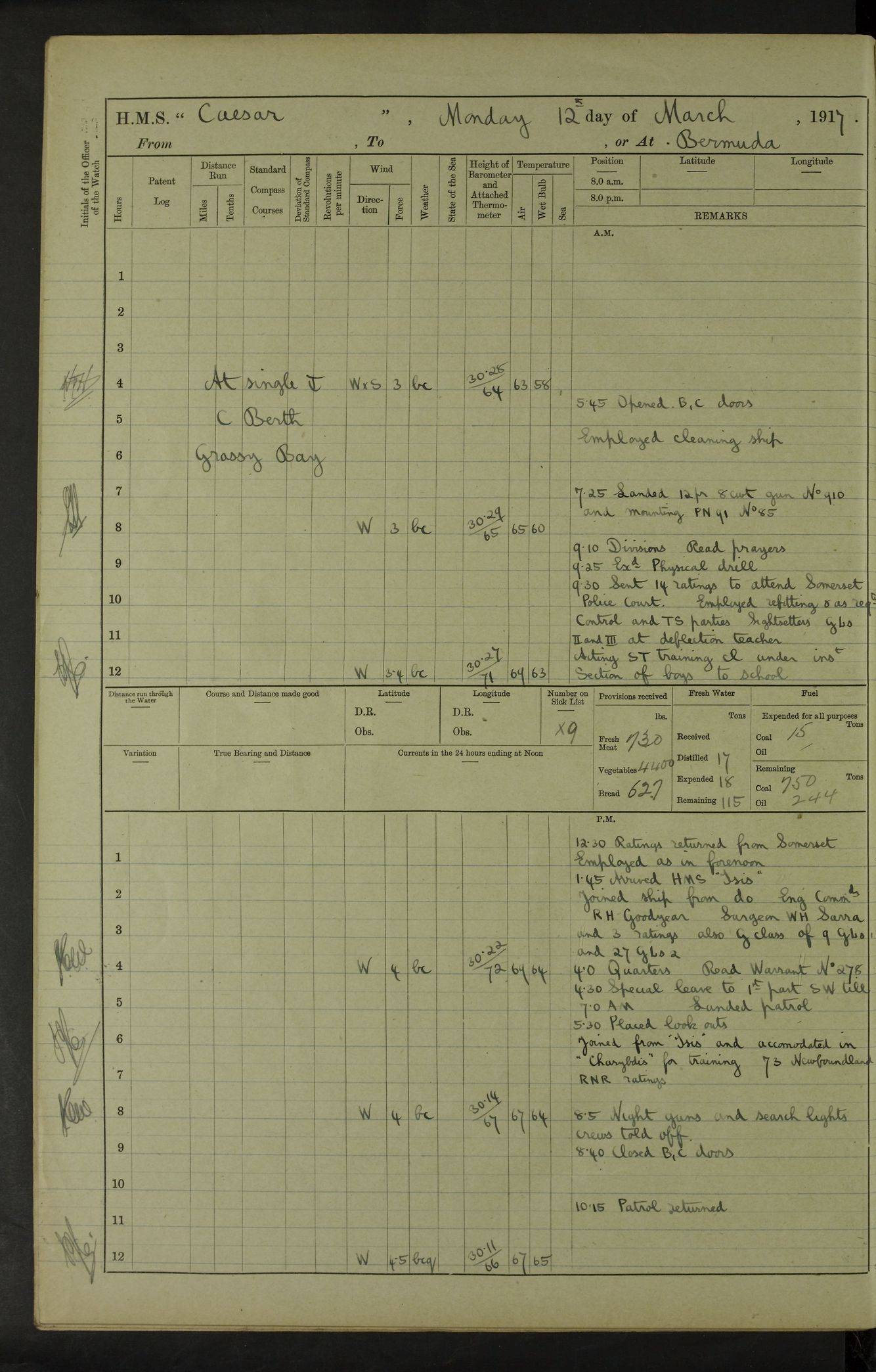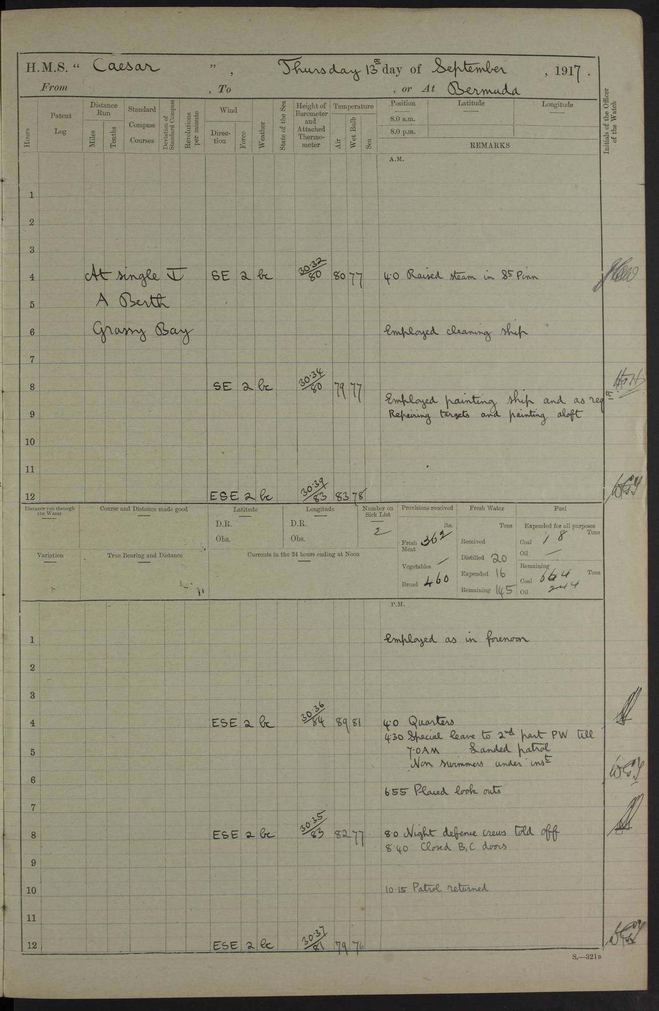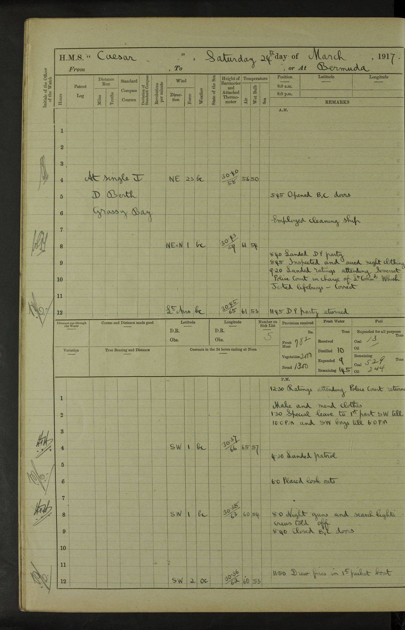 4caf84b6cadfd34197009939: (http://oldweather.s3.amazonaws.com/ADM53-36574/ADM 53-36574-145_1.jpg) 1 January 1917 At Bermuda Lat 32.32, Long -64.83 [Alongside Outer Camber Wall] 4.0am: Raised steam in first Picket boat. 6.0am: Employed cleaning ship. 7.0am: Landed Dockyard parties. Opened B, C doors. am: Employed drawing ammunition and stores, refitting and as requisite. 0.45pm: Paid monthly advance. pm: Employed as in forenoon. 4.30pm: Special leave to Starboard Watch till 7.0am. Landed patrol. 5.0pm: Dockyard parties returned. 6.30pm: Canteen leave to second part Port Watch till 10.0pm. 8.0pm: Night guns’ and search lights’ crews told off. 8.40pm: Closed B, C doors. 10.15pm: Patrol returned. 11.35pm: Drew fires in picket boats. [Number on sick list: 8] [Provisions received: Fresh Meat 340 lbs, Vegetables 2000 lbs, Bread 464 lbs] [Weather fine, though squally in early am. Noon temperature 63F] 4caf84b6cadfd3419700993a: (http://oldweather.s3.amazonaws.com/ADM53-36574/ADM 53-36574-146_0.jpg) 2 January 1917 [Year incorrectly shown as 1916] At Bermuda Lat 32.32, Long -64.83 [Alongside Outer Camber Wall] 4.30am: Raised steam in first picket boat. 6.30am: Landed working party to assist in repair of fenders in Inner Camber. 7.0am: Opened B, C doors. am: Employed embarking ammunition, refitting and as requisite. 11.45am: Working party returned. pm: Employed as in forenoon. 4.0pm: Quarters. 4.30pm: Special leave to Port Watch till 7.0am. Landed patrol. 6.30pm: Canteen leave to second part Starboard Watch till 10.0pm. 10.0pm: Patrol returned. 11.45pm: Drew fires in first picket boat. [Number on sick list: 8] [Provisions received: Fresh Meat 690 lbs, Bread 524 lbs] 4caf84b6cadfd3419700993b: (http://oldweather.s3.amazonaws.com/ADM53-36574/ADM 53-36574-146_1.jpg) 3 January 1917 [Year incorrectly shown as 1916] At Bermuda Lat 32.32, Long -64.83 [Alongside Outer Camber Wall] 7.0am: Opened B, C doors. Landed Dockyard parties. Sailed HMS “Antrim”. Landed Sanitary working party. am: Employed dismounting guns, drawing and returning stores, refitting and as requisite. Training class under instruction. 4.0pm: Quarters. Read Warrants No 268, 269. 4.30pm: Special leave to Starboard Watch till 7.0am. Landed patrol. 5.0pm: Dockyard and Working parties returned. 6.30pm: Canteen leave to first part Port Watch till 10.0pm. 8.5pm: Night guns’ and search lights’ crews told off. 10.0pm: Patrol returned. [Number on sick list: 8] [Provisions received: Fresh Meat 351 lbs, Vegetables 1000 lbs, Bread 512 lbs] 4caf84b6cadfd3419700993c: (http://oldweather.s3.amazonaws.com/ADM53-36574/ADM 53-36574-147_0.jpg) 4 January 1917 At Bermuda Lat 32.32, Long -64.83 [Alongside Outer Camber Wall] 7.0am: Landed Dockyard and Sanitary Working parties. am: Employed dismounting guns, sending up foretopmast, refitting and as requisite. Gunnery training class under instruction. 9.0am: Landed Working party to assist in repairs of fenders in Inner Camber. Discharged to SS “Kiakora” [probably Kaikoura] two ratings to form gun’s crew. 3.30pm: Working parties returned. 4.30pm: Special leave to Port Watch till 7.0am. Landed patrol. 6.30pm: Canteen leave to first part Starboard Watch till 10.0pm; 10.15pm: Patrol returned. [Number on sick list: 9] [Provisions received: Fresh Meat 353 lbs, Vegetables 1000 lbs, Bread 498 lbs] 4caf84b6cadfd3419700993d: (http://oldweather.s3.amazonaws.com/ADM53-36574/ADM 53-36574-147_1.jpg) 5 January 1917 At Bermuda Lat 32.32, Long -64.83 [Alongside Outer Camber Wall] 7.0am: Landed Dockyard and Sanitary Working parties. am: Employed refitting, dismounting guns and as requisite. Gunnery Training class under instruction. pm: Employed as in forenoon. 2.55pm: Arrived HMS “Antrim”. 4.30pm: Special leave to Starboard Watch till 7.0am. Landed patrol. 5.40pm: Drew fires in second picket boat. 6.30pm: Canteen leave to second part Port Watch till 10.0pm. 11.0pm: Patrol returned. 11.40pm: Drew fires in first picket boat. [Number on sick list: 9] [Provisions received: Fresh Meat 350 lbs, Vegetables 400 lbs, Bread 514 lbs] 4caf84b6cadfd3419700993e: (http://oldweather.s3.amazonaws.com/ADM53-36574/ADM 53-36574-148_0.jpg) 6 January 1917 At Bermuda Lat 32.32, Long -64.83 [Alongside Outer Camber Wall] 7.0am: Landed Dockyard parties. am: Employed cleaning ship, refitting, discharging ammunition from SS “Goodwood”, assisting in repairs to fenders of Inner Camber and as requisite. Training class under instruction. 11.45am: Dockyard parties returned. 0.30pm: Observed SS “Prophet” aground in Stag Channel. pm: Make and mend clothes. 1.30pm: Special leave to Port Watch till 7.0am and boys till 5.0pm. 3.0pm: SS “Prophet” refloated and proceeded to anchor. 4.0pm: Quarters. Read Warrant No 270. 4.30pm: Landed patrol. 5.0pm: Party employed discharging SS “Goodwood”. 6.30pm: Canteen leave to second part Starboard Watch till 10.0pm. 8.0pm: Night guns’ and search lights’ crews told off. 8.40pm: Closed B, C doors. 10.15pm: Patrol returned. [Number on sick list: 7] [Provisions received: Fresh Meat 361 lbs, Vegetables 2000 lbs, Bread 928 lbs] 4caf84b6cadfd3419700993f: (http://oldweather.s3.amazonaws.com/ADM53-36574/ADM 53-36574-148_1.jpg) 7 January 1917 At Bermuda Lat 32.32, Long -64.83 [Alongside Outer Camber Wall] 5.55am: Opened B, C doors. Employed cleaning ship. 8.30am: Landed Church parties, Presbyterians 18, Wesleyans 43, RCs 41. 9.30am: Divisions. 10.15am: Ship’s Company attended Divine Service at Dockyard Church. 11.20am: Church parties returned. 1.0pm: Special leave to Starboard Watch till 7.0am and boys will 5.0pm. 6.30pm: Canteen leave to first part Port Watch till 10.0pm. [Number on sick list: 8] [Weather fine, noon temperature 70F] 4caf84b6cadfd34197009940: (http://oldweather.s3.amazonaws.com/ADM53-36574/ADM 53-36574-149_0.jpg) 8 January 1917 At Bermuda Lat 32.32, Long -64.83 [Alongside Outer Camber Wall] 4.0am: Raised steam in first picket boat. 7.0am: Landed Dockyard parties. am: Employed dischargi