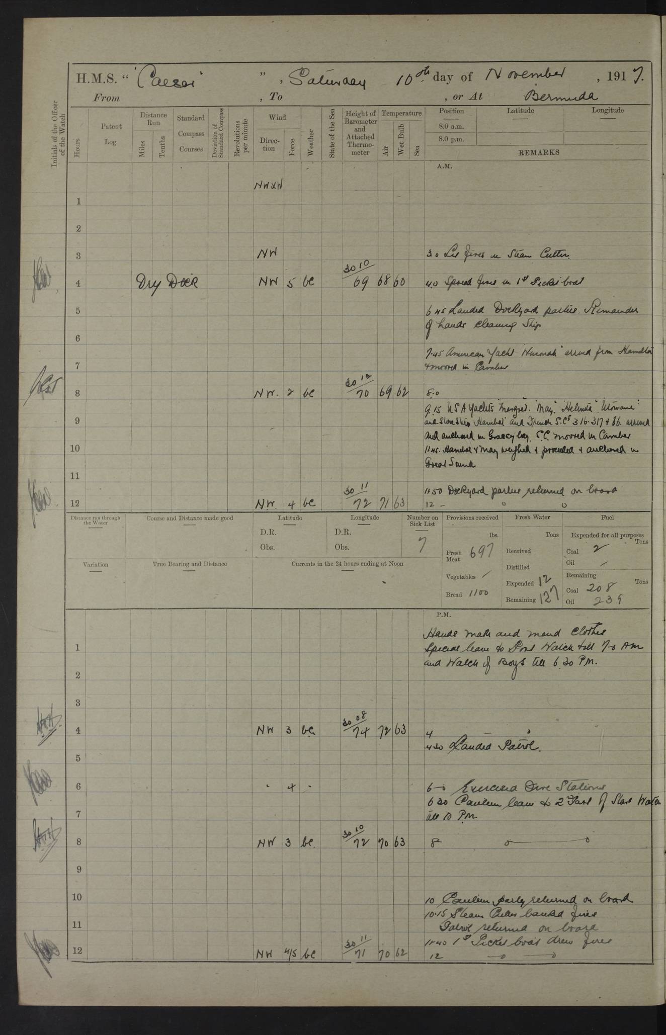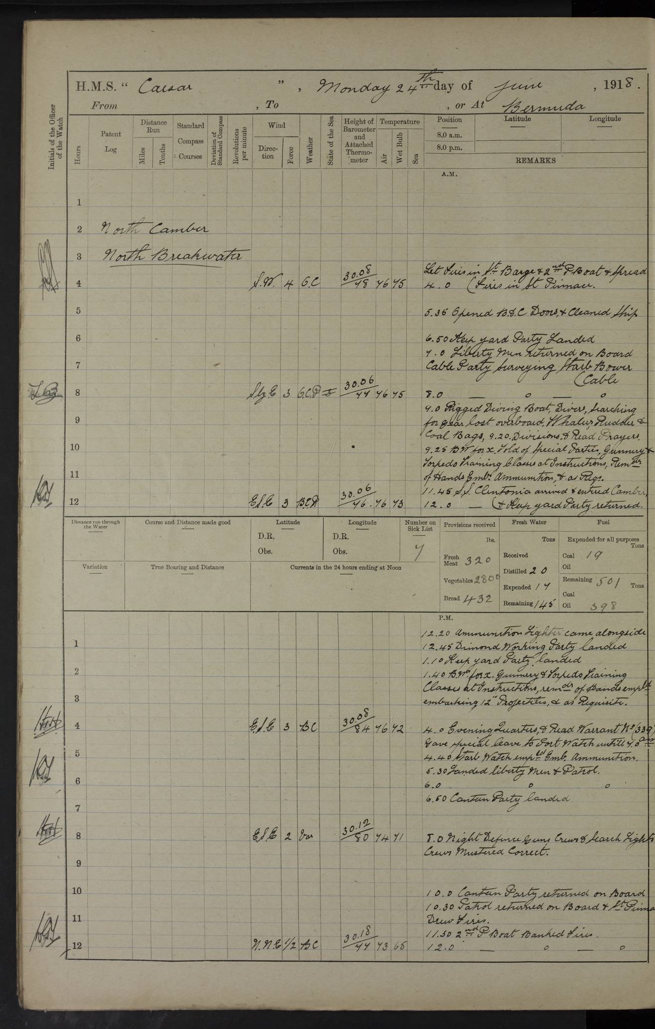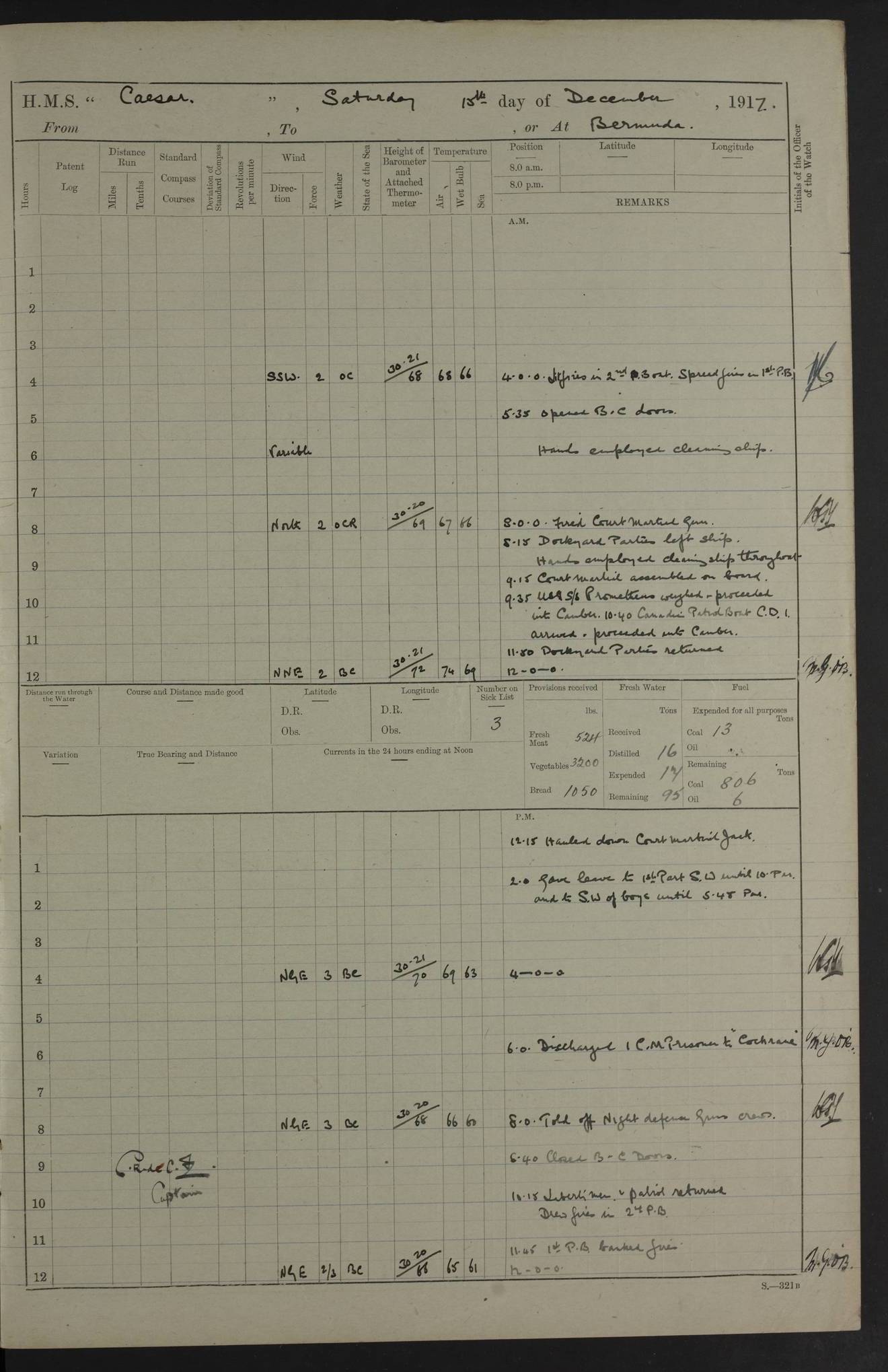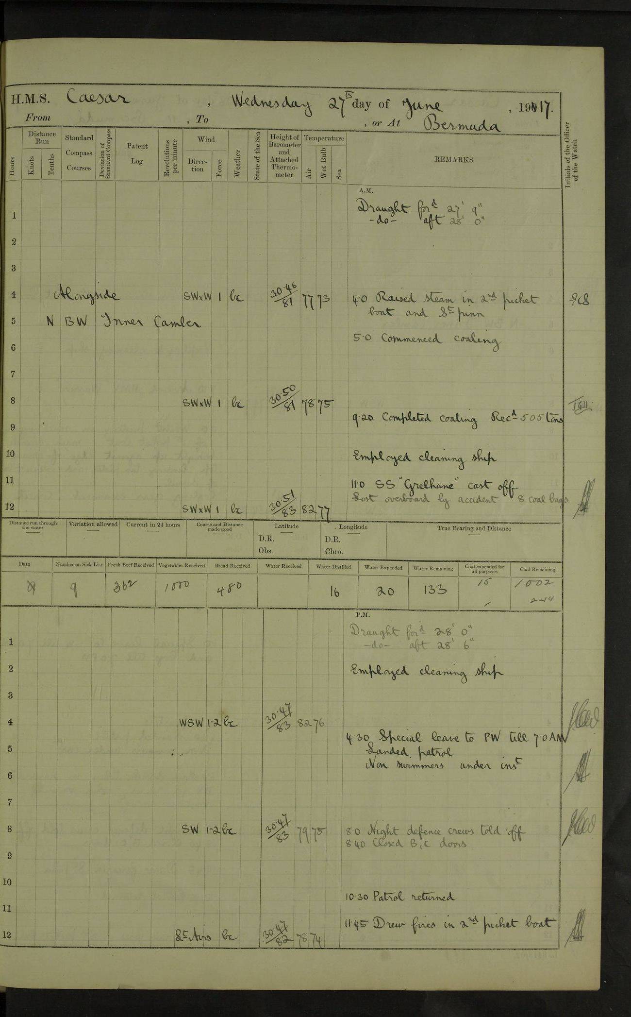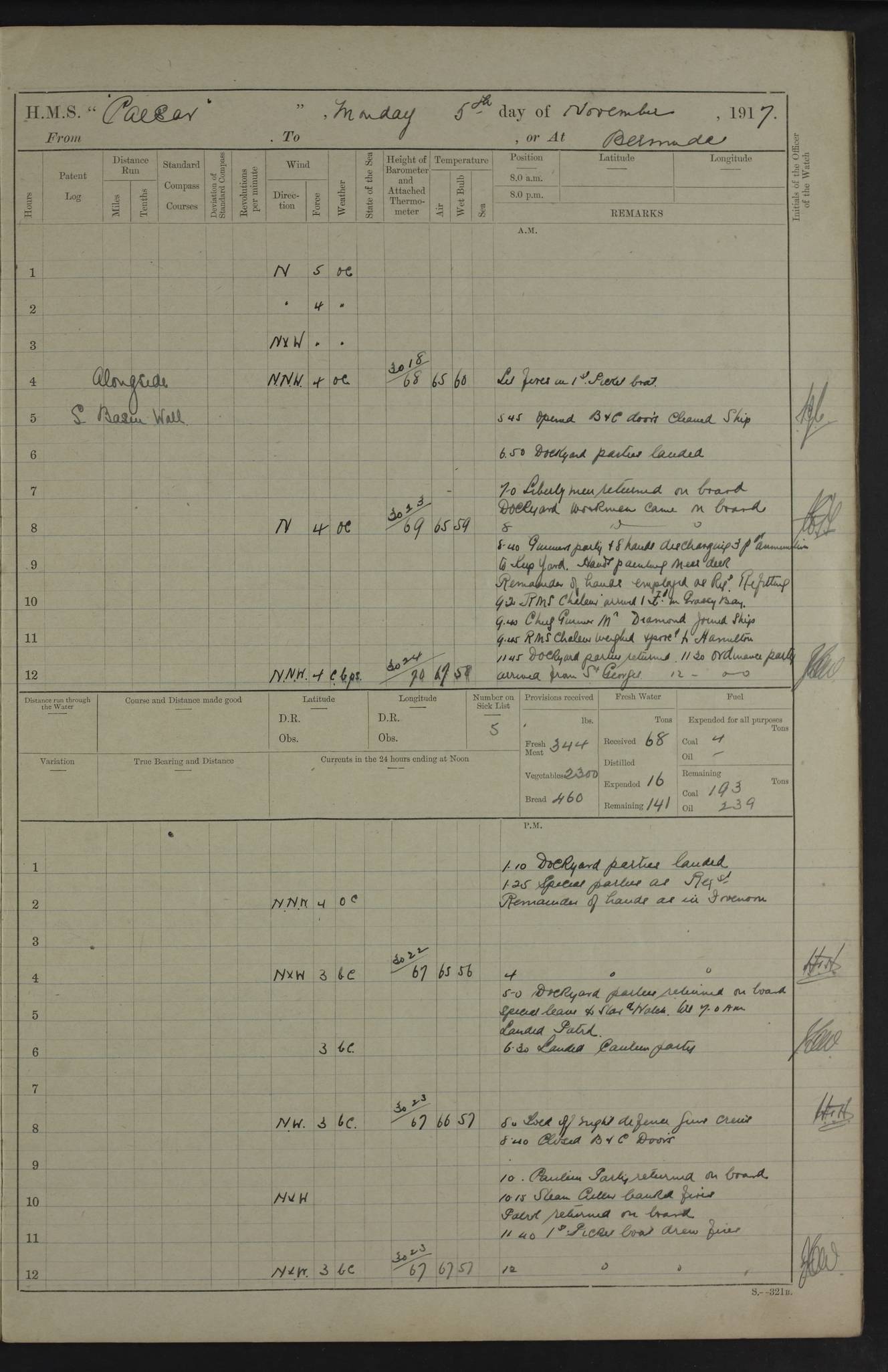 4caf84b6cadfd34197009939: (http://oldweather.s3.amazonaws.com/ADM53-36574/ADM 53-36574-145_1.jpg) 1 January 1917 At Bermuda Lat 32.32, Long -64.83 [Alongside Outer Camber Wall] 4.0am: Raised steam in first Picket boat. 6.0am: Employed cleaning ship. 7.0am: Landed Dockyard parties. Opened B, C doors. am: Employed drawing ammunition and stores, refitting and as requisite. 0.45pm: Paid monthly advance. pm: Employed as in forenoon. 4.30pm: Special leave to Starboard Watch till 7.0am. Landed patrol. 5.0pm: Dockyard parties returned. 6.30pm: Canteen leave to second part Port Watch till 10.0pm. 8.0pm: Night guns’ and search lights’ crews told off. 8.40pm: Closed B, C doors. 10.15pm: Patrol returned. 11.35pm: Drew fires in picket boats. [Number on sick list: 8] [Provisions received: Fresh Meat 340 lbs, Vegetables 2000 lbs, Bread 464 lbs] [Weather fine, though squally in early am. Noon temperature 63F] 4caf84b6cadfd3419700993a: (http://oldweather.s3.amazonaws.com/ADM53-36574/ADM 53-36574-146_0.jpg) 2 January 1917 [Year incorrectly shown as 1916] At Bermuda Lat 32.32, Long -64.83 [Alongside Outer Camber Wall] 4.30am: Raised steam in first picket boat. 6.30am: Landed working party to assist in repair of fenders in Inner Camber. 7.0am: Opened B, C doors. am: Employed embarking ammunition, refitting and as requisite. 11.45am: Working party returned. pm: Employed as in forenoon. 4.0pm: Quarters. 4.30pm: Special leave to Port Watch till 7.0am. Landed patrol. 6.30pm: Canteen leave to second part Starboard Watch till 10.0pm. 10.0pm: Patrol returned. 11.45pm: Drew fires in first picket boat. [Number on sick list: 8] [Provisions received: Fresh Meat 690 lbs, Bread 524 lbs] 4caf84b6cadfd3419700993b: (http://oldweather.s3.amazonaws.com/ADM53-36574/ADM 53-36574-146_1.jpg) 3 January 1917 [Year incorrectly shown as 1916] At Bermuda Lat 32.32, Long -64.83 [Alongside Outer Camber Wall] 7.0am: Opened B, C doors. Landed Dockyard parties. Sailed HMS “Antrim”. Landed Sanitary working party. am: Employed dismounting guns, drawing and returning stores, refitting and as requisite. Training class under instruction. 4.0pm: Quarters. Read Warrants No 268, 269. 4.30pm: Special leave to Starboard Watch till 7.0am. Landed patrol. 5.0pm: Dockyard and Working parties returned. 6.30pm: Canteen leave to first part Port Watch till 10.0pm. 8.5pm: Night guns’ and search lights’ crews told off. 10.0pm: Patrol returned. [Number on sick list: 8] [Provisions received: Fresh Meat 351 lbs, Vegetables 1000 lbs, Bread 512 lbs] 4caf84b6cadfd3419700993c: (http://oldweather.s3.amazonaws.com/ADM53-36574/ADM 53-36574-147_0.jpg) 4 January 1917 At Bermuda Lat 32.32, Long -64.83 [Alongside Outer Camber Wall] 7.0am: Landed Dockyard and Sanitary Working parties. am: Employed dismounting guns, sending up foretopmast, refitting and as requisite. Gunnery training class under instruction. 9.0am: Landed Working party to assist in repairs of fenders in Inner Camber. Discharged to SS “Kiakora” [probably Kaikoura] two ratings to form gun’s crew. 3.30pm: Working parties returned. 4.30pm: Special leave to Port Watch till 7.0am. Landed patrol. 6.30pm: Canteen leave to first part Starboard Watch till 10.0pm; 10.15pm: Patrol returned. [Number on sick list: 9] [Provisions received: Fresh Meat 353 lbs, Vegetables 1000 lbs, Bread 498 lbs] 4caf84b6cadfd3419700993d: (http://oldweather.s3.amazonaws.com/ADM53-36574/ADM 53-36574-147_1.jpg) 5 January 1917 At Bermuda Lat 32.32, Long -64.83 [Alongside Outer Camber Wall] 7.0am: Landed Dockyard and Sanitary Working parties. am: Employed refitting, dismounting guns and as requisite. Gunnery Training class under instruction. pm: Employed as in forenoon. 2.55pm: Arrived HMS “Antrim”. 4.30pm: Special leave to Starboard Watch till 7.0am. Landed patrol. 5.40pm: Drew fires in second picket boat. 6.30pm: Canteen leave to second part Port Watch till 10.0pm. 11.0pm: Patrol returned. 11.40pm: Drew fires in first picket boat. [Number on sick list: 9] [Provisions received: Fresh Meat 350 lbs, Vegetables 400 lbs, Bread 514 lbs] 4caf84b6cadfd3419700993e: (http://oldweather.s3.amazonaws.com/ADM53-36574/ADM 53-36574-148_0.jpg) 6 January 1917 At Bermuda Lat 32.32, Long -64.83 [Alongside Outer Camber Wall] 7.0am: Landed Dockyard parties. am: Employed cleaning ship, refitting, discharging ammunition from SS “Goodwood”, assisting in repairs to fenders of Inner Camber and as requisite. Training class under instruction. 11.45am: Dockyard parties returned. 0.30pm: Observed SS “Prophet” aground in Stag Channel. pm: Make and mend clothes. 1.30pm: Special leave to Port Watch till 7.0am and boys till 5.0pm. 3.0pm: SS “Prophet” refloated and proceeded to anchor. 4.0pm: Quarters. Read Warrant No 270. 4.30pm: Landed patrol. 5.0pm: Party employed discharging SS “Goodwood”. 6.30pm: Canteen leave to second part Starboard Watch till 10.0pm. 8.0pm: Night guns’ and search lights’ crews told off. 8.40pm: Closed B, C doors. 10.15pm: Patrol returned. [Number on sick list: 7] [Provisions received: Fresh Meat 361 lbs, Vegetables 2000 lbs, Bread 928 lbs] 4caf84b6cadfd3419700993f: (http://oldweather.s3.amazonaws.com/ADM53-36574/ADM 53-36574-148_1.jpg) 7 January 1917 At Bermuda Lat 32.32, Long -64.83 [Alongside Outer Camber Wall] 5.55am: Opened B, C doors. Employed cleaning ship. 8.30am: Landed Church parties, Presbyterians 18, Wesleyans 43, RCs 41. 9.30am: Divisions. 10.15am: Ship’s Company attended Divine Service at Dockyard Church. 11.20am: Church parties returned. 1.0pm: Special leave to Starboard Watch till 7.0am and boys will 5.0pm. 6.30pm: Canteen leave to first part Port Watch till 10.0pm. [Number on sick list: 8] [Weather fine, noon temperature 70F] 4caf84b6cadfd34197009940: (http://oldweather.s3.amazonaws.com/ADM53-36574/ADM 53-36574-149_0.jpg) 8 January 1917 At Bermuda Lat 32.32, Long -64.83 [Alongside Outer Camber Wall] 4.0am: Raised steam in first picket boat. 7.0am: Landed Dockyard parties. am: Employed dischargi