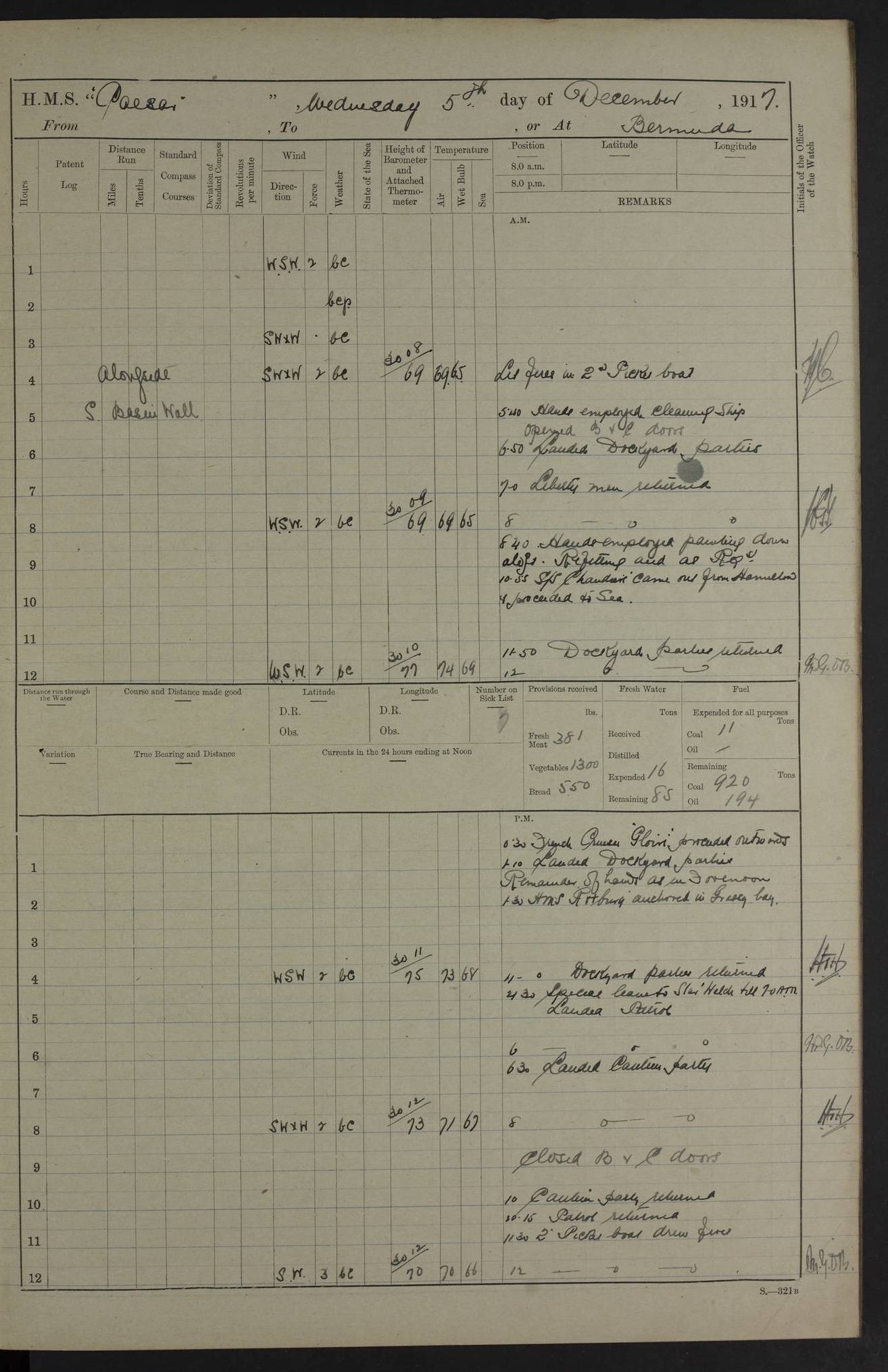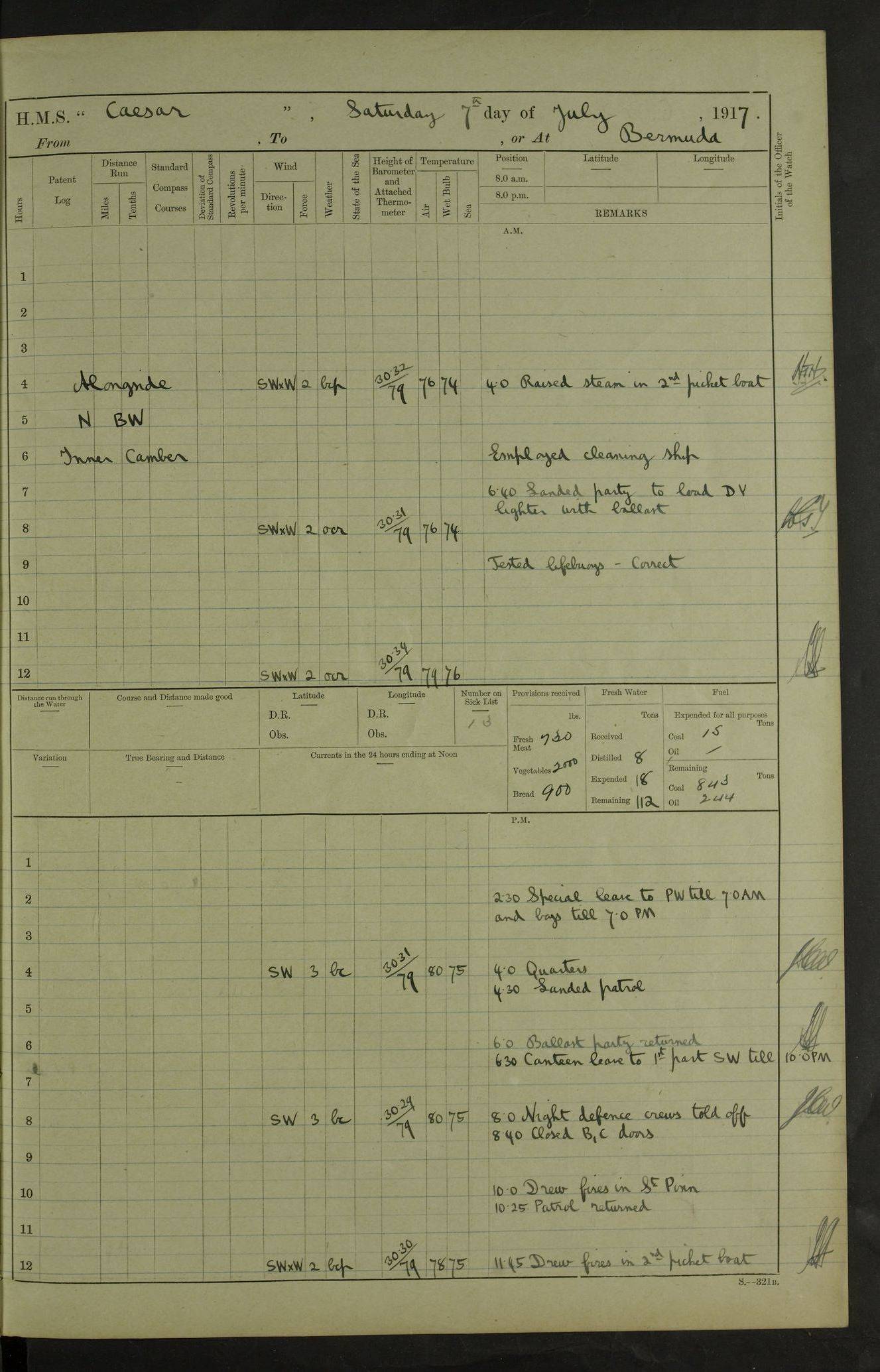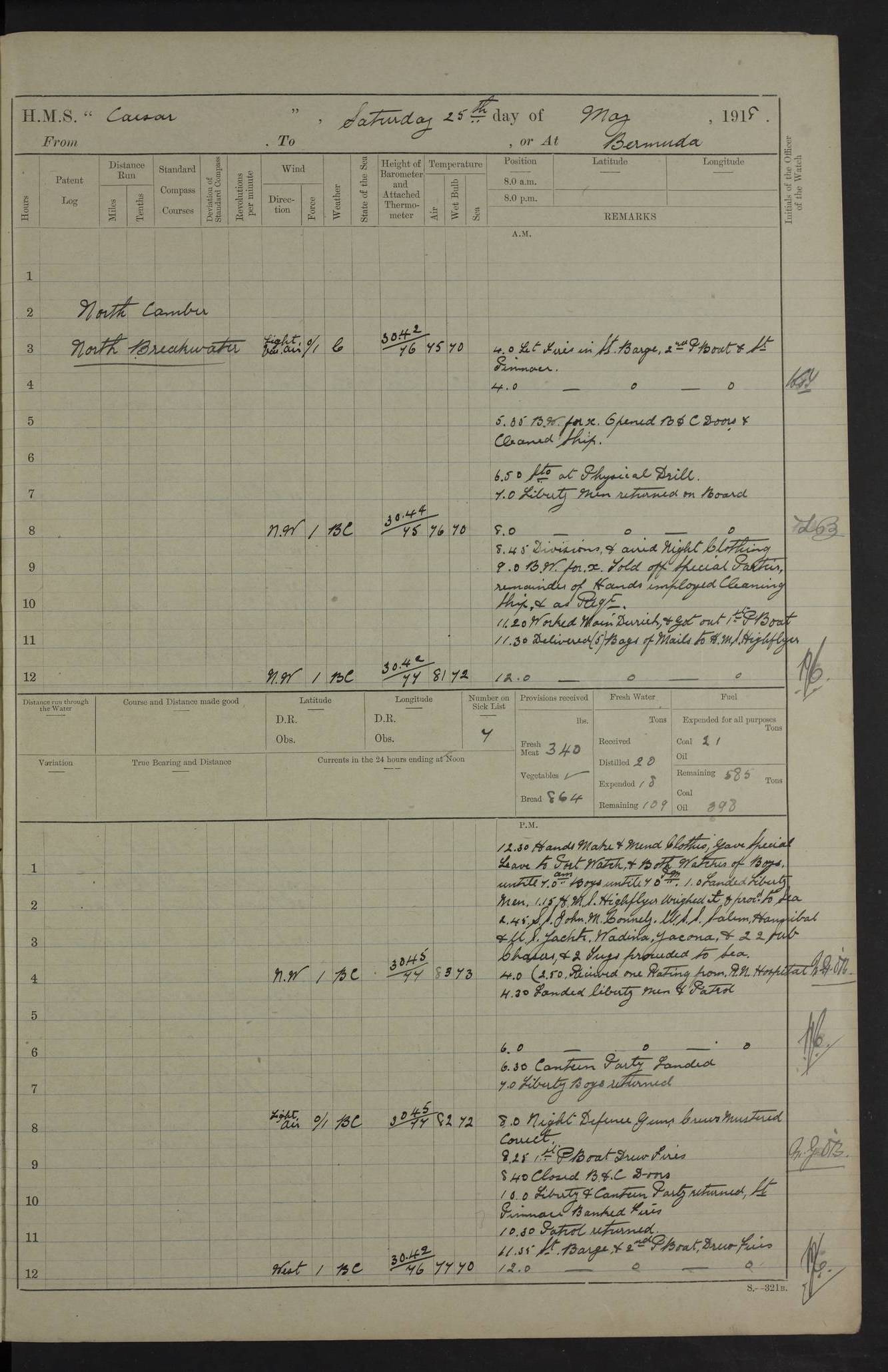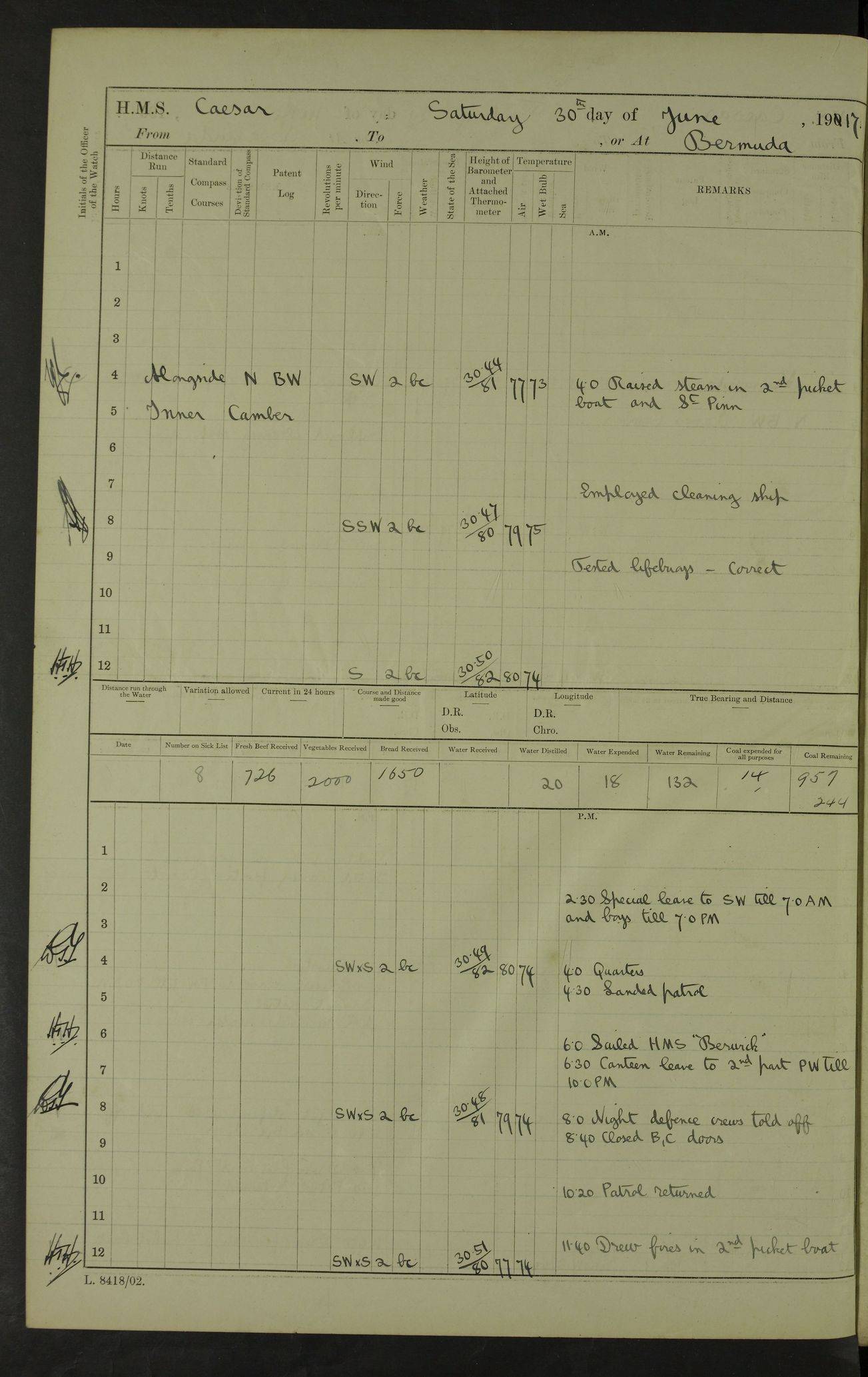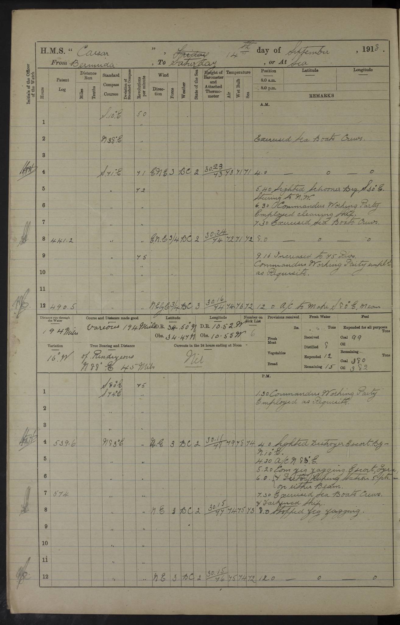 4caf84b6cadfd34197009939: (http://oldweather.s3.amazonaws.com/ADM53-36574/ADM 53-36574-145_1.jpg) 1 January 1917 At Bermuda Lat 32.32, Long -64.83 [Alongside Outer Camber Wall] 4.0am: Raised steam in first Picket boat. 6.0am: Employed cleaning ship. 7.0am: Landed Dockyard parties. Opened B, C doors. am: Employed drawing ammunition and stores, refitting and as requisite. 0.45pm: Paid monthly advance. pm: Employed as in forenoon. 4.30pm: Special leave to Starboard Watch till 7.0am. Landed patrol. 5.0pm: Dockyard parties returned. 6.30pm: Canteen leave to second part Port Watch till 10.0pm. 8.0pm: Night guns’ and search lights’ crews told off. 8.40pm: Closed B, C doors. 10.15pm: Patrol returned. 11.35pm: Drew fires in picket boats. [Number on sick list: 8] [Provisions received: Fresh Meat 340 lbs, Vegetables 2000 lbs, Bread 464 lbs] [Weather fine, though squally in early am. Noon temperature 63F] 4caf84b6cadfd3419700993a: (http://oldweather.s3.amazonaws.com/ADM53-36574/ADM 53-36574-146_0.jpg) 2 January 1917 [Year incorrectly shown as 1916] At Bermuda Lat 32.32, Long -64.83 [Alongside Outer Camber Wall] 4.30am: Raised steam in first picket boat. 6.30am: Landed working party to assist in repair of fenders in Inner Camber. 7.0am: Opened B, C doors. am: Employed embarking ammunition, refitting and as requisite. 11.45am: Working party returned. pm: Employed as in forenoon. 4.0pm: Quarters. 4.30pm: Special leave to Port Watch till 7.0am. Landed patrol. 6.30pm: Canteen leave to second part Starboard Watch till 10.0pm. 10.0pm: Patrol returned. 11.45pm: Drew fires in first picket boat. [Number on sick list: 8] [Provisions received: Fresh Meat 690 lbs, Bread 524 lbs] 4caf84b6cadfd3419700993b: (http://oldweather.s3.amazonaws.com/ADM53-36574/ADM 53-36574-146_1.jpg) 3 January 1917 [Year incorrectly shown as 1916] At Bermuda Lat 32.32, Long -64.83 [Alongside Outer Camber Wall] 7.0am: Opened B, C doors. Landed Dockyard parties. Sailed HMS “Antrim”. Landed Sanitary working party. am: Employed dismounting guns, drawing and returning stores, refitting and as requisite. Training class under instruction. 4.0pm: Quarters. Read Warrants No 268, 269. 4.30pm: Special leave to Starboard Watch till 7.0am. Landed patrol. 5.0pm: Dockyard and Working parties returned. 6.30pm: Canteen leave to first part Port Watch till 10.0pm. 8.5pm: Night guns’ and search lights’ crews told off. 10.0pm: Patrol returned. [Number on sick list: 8] [Provisions received: Fresh Meat 351 lbs, Vegetables 1000 lbs, Bread 512 lbs] 4caf84b6cadfd3419700993c: (http://oldweather.s3.amazonaws.com/ADM53-36574/ADM 53-36574-147_0.jpg) 4 January 1917 At Bermuda Lat 32.32, Long -64.83 [Alongside Outer Camber Wall] 7.0am: Landed Dockyard and Sanitary Working parties. am: Employed dismounting guns, sending up foretopmast, refitting and as requisite. Gunnery training class under instruction. 9.0am: Landed Working party to assist in repairs of fenders in Inner Camber. Discharged to SS “Kiakora” [probably Kaikoura] two ratings to form gun’s crew. 3.30pm: Working parties returned. 4.30pm: Special leave to Port Watch till 7.0am. Landed patrol. 6.30pm: Canteen leave to first part Starboard Watch till 10.0pm; 10.15pm: Patrol returned. [Number on sick list: 9] [Provisions received: Fresh Meat 353 lbs, Vegetables 1000 lbs, Bread 498 lbs] 4caf84b6cadfd3419700993d: (http://oldweather.s3.amazonaws.com/ADM53-36574/ADM 53-36574-147_1.jpg) 5 January 1917 At Bermuda Lat 32.32, Long -64.83 [Alongside Outer Camber Wall] 7.0am: Landed Dockyard and Sanitary Working parties. am: Employed refitting, dismounting guns and as requisite. Gunnery Training class under instruction. pm: Employed as in forenoon. 2.55pm: Arrived HMS “Antrim”. 4.30pm: Special leave to Starboard Watch till 7.0am. Landed patrol. 5.40pm: Drew fires in second picket boat. 6.30pm: Canteen leave to second part Port Watch till 10.0pm. 11.0pm: Patrol returned. 11.40pm: Drew fires in first picket boat. [Number on sick list: 9] [Provisions received: Fresh Meat 350 lbs, Vegetables 400 lbs, Bread 514 lbs] 4caf84b6cadfd3419700993e: (http://oldweather.s3.amazonaws.com/ADM53-36574/ADM 53-36574-148_0.jpg) 6 January 1917 At Bermuda Lat 32.32, Long -64.83 [Alongside Outer Camber Wall] 7.0am: Landed Dockyard parties. am: Employed cleaning ship, refitting, discharging ammunition from SS “Goodwood”, assisting in repairs to fenders of Inner Camber and as requisite. Training class under instruction. 11.45am: Dockyard parties returned. 0.30pm: Observed SS “Prophet” aground in Stag Channel. pm: Make and mend clothes. 1.30pm: Special leave to Port Watch till 7.0am and boys till 5.0pm. 3.0pm: SS “Prophet” refloated and proceeded to anchor. 4.0pm: Quarters. Read Warrant No 270. 4.30pm: Landed patrol. 5.0pm: Party employed discharging SS “Goodwood”. 6.30pm: Canteen leave to second part Starboard Watch till 10.0pm. 8.0pm: Night guns’ and search lights’ crews told off. 8.40pm: Closed B, C doors. 10.15pm: Patrol returned. [Number on sick list: 7] [Provisions received: Fresh Meat 361 lbs, Vegetables 2000 lbs, Bread 928 lbs] 4caf84b6cadfd3419700993f: (http://oldweather.s3.amazonaws.com/ADM53-36574/ADM 53-36574-148_1.jpg) 7 January 1917 At Bermuda Lat 32.32, Long -64.83 [Alongside Outer Camber Wall] 5.55am: Opened B, C doors. Employed cleaning ship. 8.30am: Landed Church parties, Presbyterians 18, Wesleyans 43, RCs 41. 9.30am: Divisions. 10.15am: Ship’s Company attended Divine Service at Dockyard Church. 11.20am: Church parties returned. 1.0pm: Special leave to Starboard Watch till 7.0am and boys will 5.0pm. 6.30pm: Canteen leave to first part Port Watch till 10.0pm. [Number on sick list: 8] [Weather fine, noon temperature 70F] 4caf84b6cadfd34197009940: (http://oldweather.s3.amazonaws.com/ADM53-36574/ADM 53-36574-149_0.jpg) 8 January 1917 At Bermuda Lat 32.32, Long -64.83 [Alongside Outer Camber Wall] 4.0am: Raised steam in first picket boat. 7.0am: Landed Dockyard parties. am: Employed dischargi