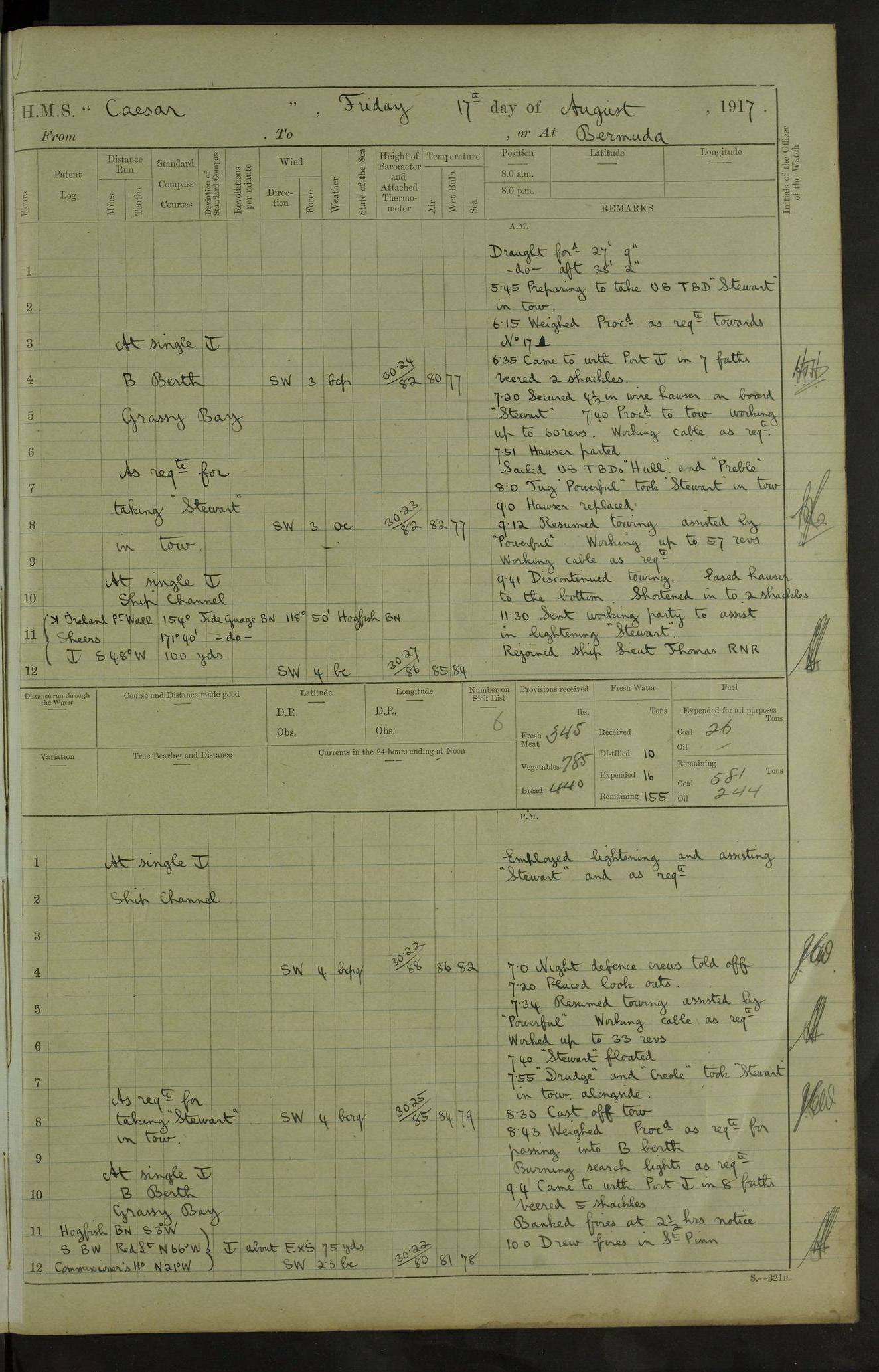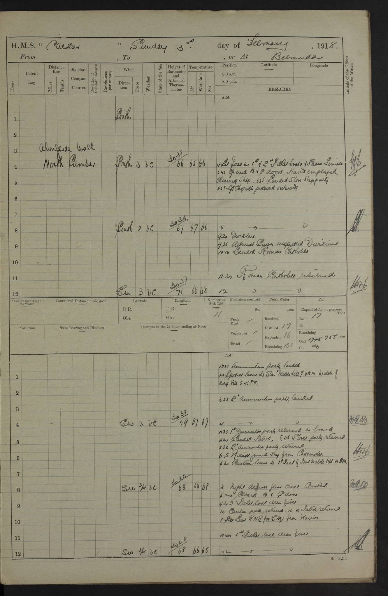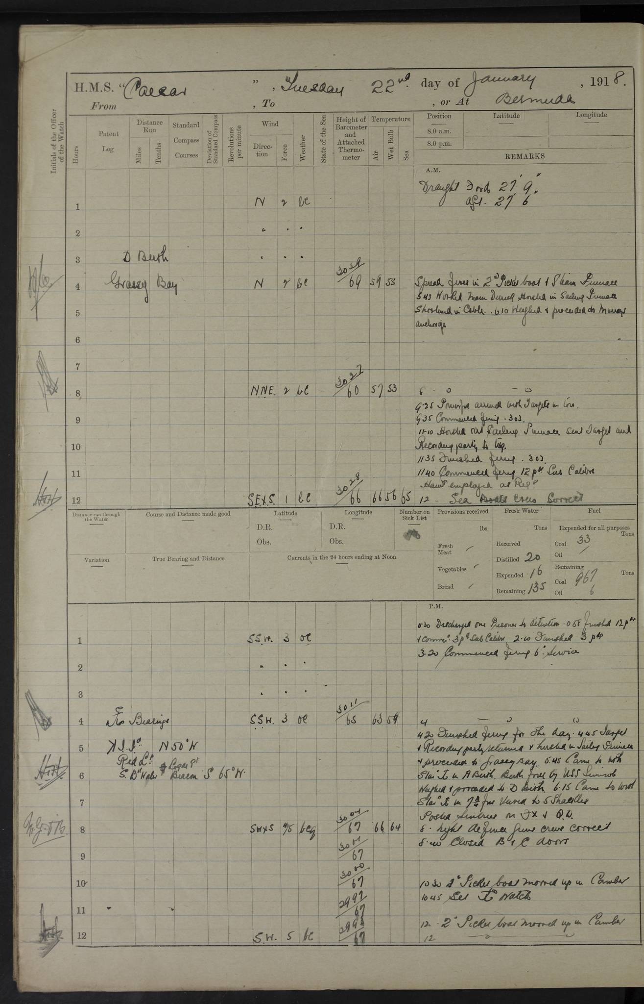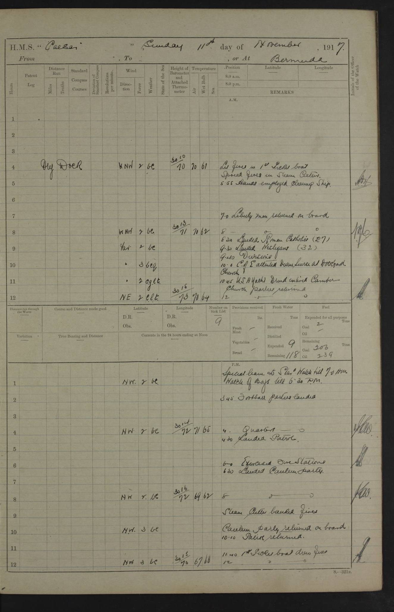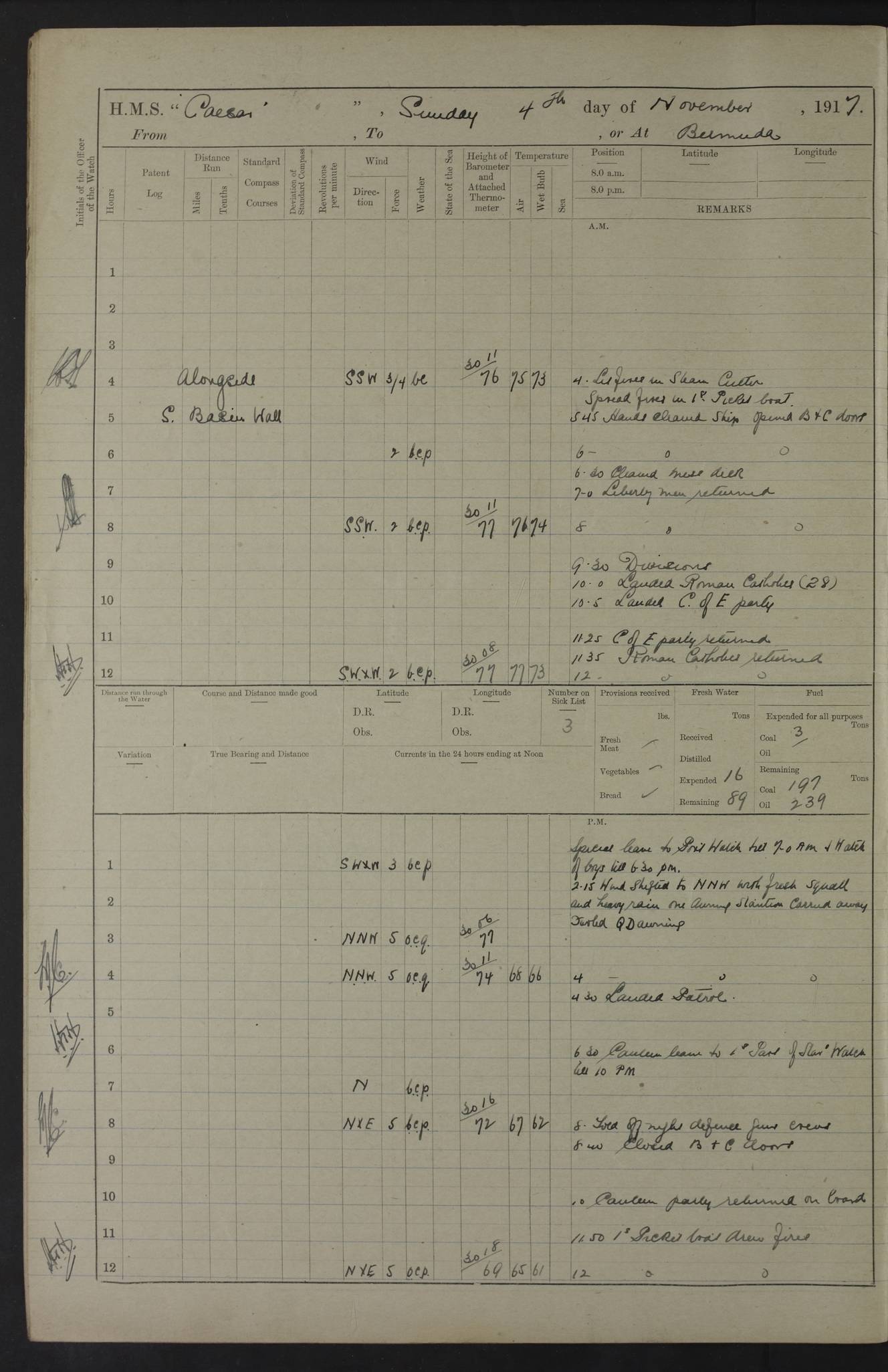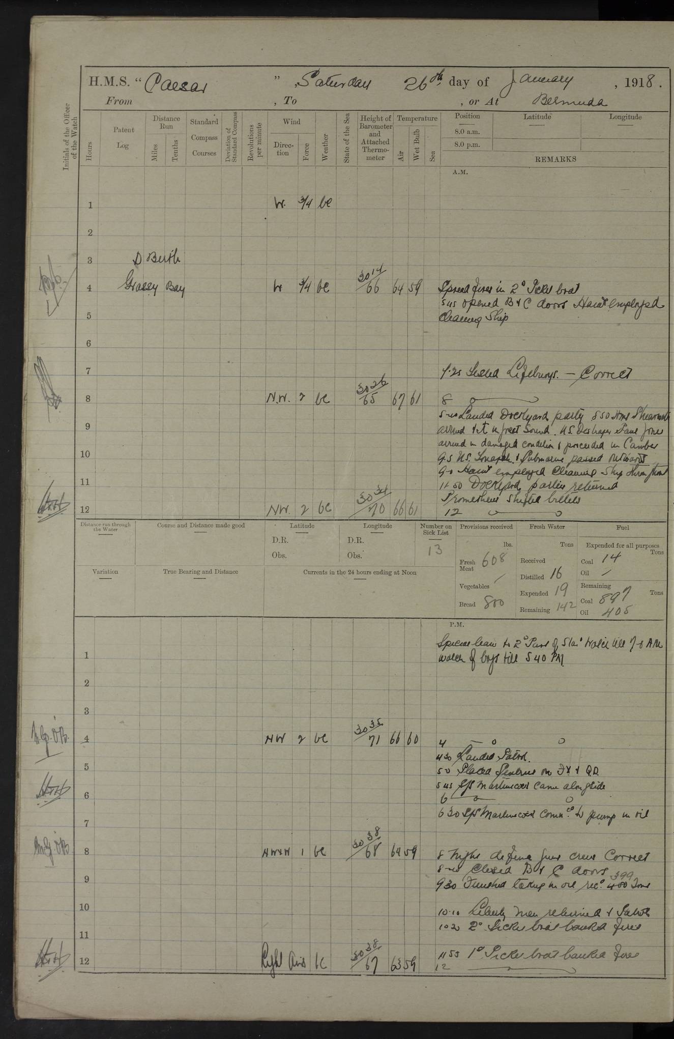 4caf84b6cadfd34197009939: (http://oldweather.s3.amazonaws.com/ADM53-36574/ADM 53-36574-145_1.jpg) 1 January 1917 At Bermuda Lat 32.32, Long -64.83 [Alongside Outer Camber Wall] 4.0am: Raised steam in first Picket boat. 6.0am: Employed cleaning ship. 7.0am: Landed Dockyard parties. Opened B, C doors. am: Employed drawing ammunition and stores, refitting and as requisite. 0.45pm: Paid monthly advance. pm: Employed as in forenoon. 4.30pm: Special leave to Starboard Watch till 7.0am. Landed patrol. 5.0pm: Dockyard parties returned. 6.30pm: Canteen leave to second part Port Watch till 10.0pm. 8.0pm: Night guns’ and search lights’ crews told off. 8.40pm: Closed B, C doors. 10.15pm: Patrol returned. 11.35pm: Drew fires in picket boats. [Number on sick list: 8] [Provisions received: Fresh Meat 340 lbs, Vegetables 2000 lbs, Bread 464 lbs] [Weather fine, though squally in early am. Noon temperature 63F] 4caf84b6cadfd3419700993a: (http://oldweather.s3.amazonaws.com/ADM53-36574/ADM 53-36574-146_0.jpg) 2 January 1917 [Year incorrectly shown as 1916] At Bermuda Lat 32.32, Long -64.83 [Alongside Outer Camber Wall] 4.30am: Raised steam in first picket boat. 6.30am: Landed working party to assist in repair of fenders in Inner Camber. 7.0am: Opened B, C doors. am: Employed embarking ammunition, refitting and as requisite. 11.45am: Working party returned. pm: Employed as in forenoon. 4.0pm: Quarters. 4.30pm: Special leave to Port Watch till 7.0am. Landed patrol. 6.30pm: Canteen leave to second part Starboard Watch till 10.0pm. 10.0pm: Patrol returned. 11.45pm: Drew fires in first picket boat. [Number on sick list: 8] [Provisions received: Fresh Meat 690 lbs, Bread 524 lbs] 4caf84b6cadfd3419700993b: (http://oldweather.s3.amazonaws.com/ADM53-36574/ADM 53-36574-146_1.jpg) 3 January 1917 [Year incorrectly shown as 1916] At Bermuda Lat 32.32, Long -64.83 [Alongside Outer Camber Wall] 7.0am: Opened B, C doors. Landed Dockyard parties. Sailed HMS “Antrim”. Landed Sanitary working party. am: Employed dismounting guns, drawing and returning stores, refitting and as requisite. Training class under instruction. 4.0pm: Quarters. Read Warrants No 268, 269. 4.30pm: Special leave to Starboard Watch till 7.0am. Landed patrol. 5.0pm: Dockyard and Working parties returned. 6.30pm: Canteen leave to first part Port Watch till 10.0pm. 8.5pm: Night guns’ and search lights’ crews told off. 10.0pm: Patrol returned. [Number on sick list: 8] [Provisions received: Fresh Meat 351 lbs, Vegetables 1000 lbs, Bread 512 lbs] 4caf84b6cadfd3419700993c: (http://oldweather.s3.amazonaws.com/ADM53-36574/ADM 53-36574-147_0.jpg) 4 January 1917 At Bermuda Lat 32.32, Long -64.83 [Alongside Outer Camber Wall] 7.0am: Landed Dockyard and Sanitary Working parties. am: Employed dismounting guns, sending up foretopmast, refitting and as requisite. Gunnery training class under instruction. 9.0am: Landed Working party to assist in repairs of fenders in Inner Camber. Discharged to SS “Kiakora” [probably Kaikoura] two ratings to form gun’s crew. 3.30pm: Working parties returned. 4.30pm: Special leave to Port Watch till 7.0am. Landed patrol. 6.30pm: Canteen leave to first part Starboard Watch till 10.0pm; 10.15pm: Patrol returned. [Number on sick list: 9] [Provisions received: Fresh Meat 353 lbs, Vegetables 1000 lbs, Bread 498 lbs] 4caf84b6cadfd3419700993d: (http://oldweather.s3.amazonaws.com/ADM53-36574/ADM 53-36574-147_1.jpg) 5 January 1917 At Bermuda Lat 32.32, Long -64.83 [Alongside Outer Camber Wall] 7.0am: Landed Dockyard and Sanitary Working parties. am: Employed refitting, dismounting guns and as requisite. Gunnery Training class under instruction. pm: Employed as in forenoon. 2.55pm: Arrived HMS “Antrim”. 4.30pm: Special leave to Starboard Watch till 7.0am. Landed patrol. 5.40pm: Drew fires in second picket boat. 6.30pm: Canteen leave to second part Port Watch till 10.0pm. 11.0pm: Patrol returned. 11.40pm: Drew fires in first picket boat. [Number on sick list: 9] [Provisions received: Fresh Meat 350 lbs, Vegetables 400 lbs, Bread 514 lbs] 4caf84b6cadfd3419700993e: (http://oldweather.s3.amazonaws.com/ADM53-36574/ADM 53-36574-148_0.jpg) 6 January 1917 At Bermuda Lat 32.32, Long -64.83 [Alongside Outer Camber Wall] 7.0am: Landed Dockyard parties. am: Employed cleaning ship, refitting, discharging ammunition from SS “Goodwood”, assisting in repairs to fenders of Inner Camber and as requisite. Training class under instruction. 11.45am: Dockyard parties returned. 0.30pm: Observed SS “Prophet” aground in Stag Channel. pm: Make and mend clothes. 1.30pm: Special leave to Port Watch till 7.0am and boys till 5.0pm. 3.0pm: SS “Prophet” refloated and proceeded to anchor. 4.0pm: Quarters. Read Warrant No 270. 4.30pm: Landed patrol. 5.0pm: Party employed discharging SS “Goodwood”. 6.30pm: Canteen leave to second part Starboard Watch till 10.0pm. 8.0pm: Night guns’ and search lights’ crews told off. 8.40pm: Closed B, C doors. 10.15pm: Patrol returned. [Number on sick list: 7] [Provisions received: Fresh Meat 361 lbs, Vegetables 2000 lbs, Bread 928 lbs] 4caf84b6cadfd3419700993f: (http://oldweather.s3.amazonaws.com/ADM53-36574/ADM 53-36574-148_1.jpg) 7 January 1917 At Bermuda Lat 32.32, Long -64.83 [Alongside Outer Camber Wall] 5.55am: Opened B, C doors. Employed cleaning ship. 8.30am: Landed Church parties, Presbyterians 18, Wesleyans 43, RCs 41. 9.30am: Divisions. 10.15am: Ship’s Company attended Divine Service at Dockyard Church. 11.20am: Church parties returned. 1.0pm: Special leave to Starboard Watch till 7.0am and boys will 5.0pm. 6.30pm: Canteen leave to first part Port Watch till 10.0pm. [Number on sick list: 8] [Weather fine, noon temperature 70F] 4caf84b6cadfd34197009940: (http://oldweather.s3.amazonaws.com/ADM53-36574/ADM 53-36574-149_0.jpg) 8 January 1917 At Bermuda Lat 32.32, Long -64.83 [Alongside Outer Camber Wall] 4.0am: Raised steam in first picket boat. 7.0am: Landed Dockyard parties. am: Employed dischargi