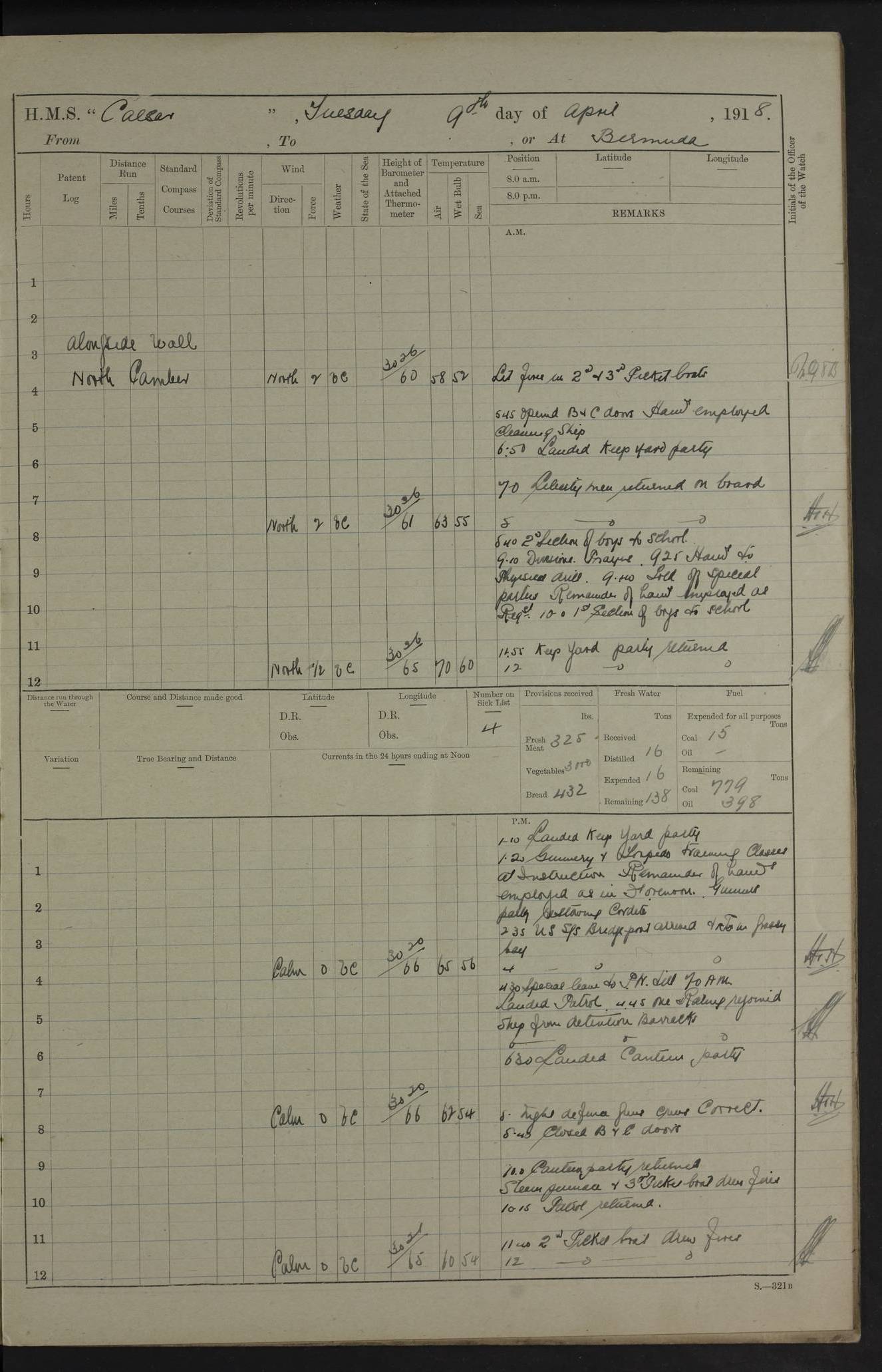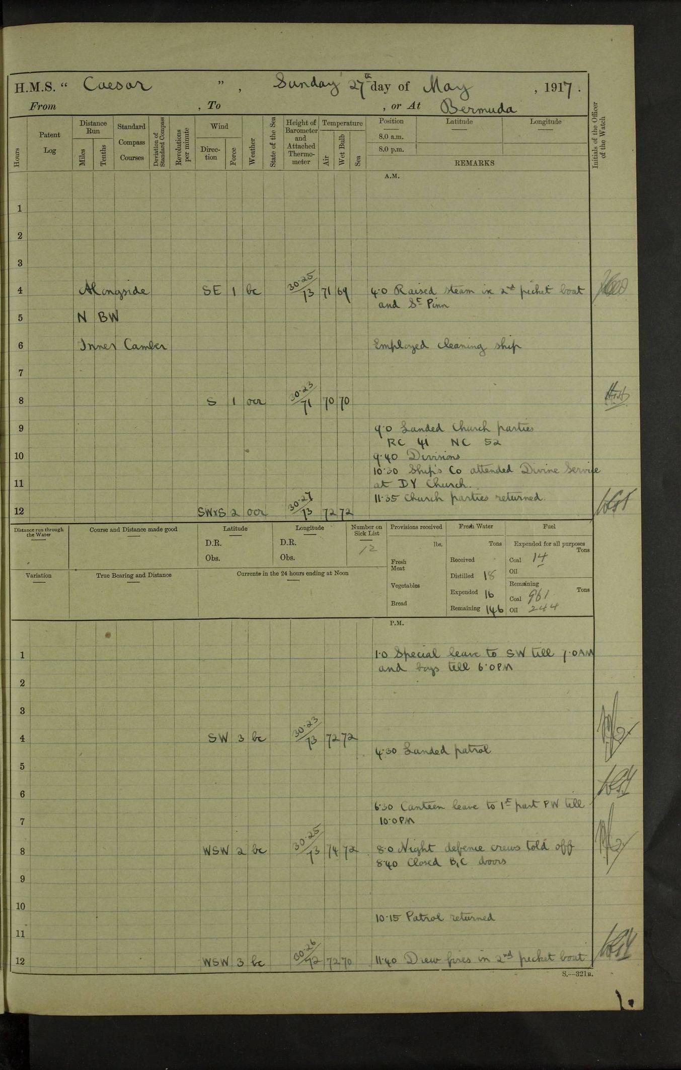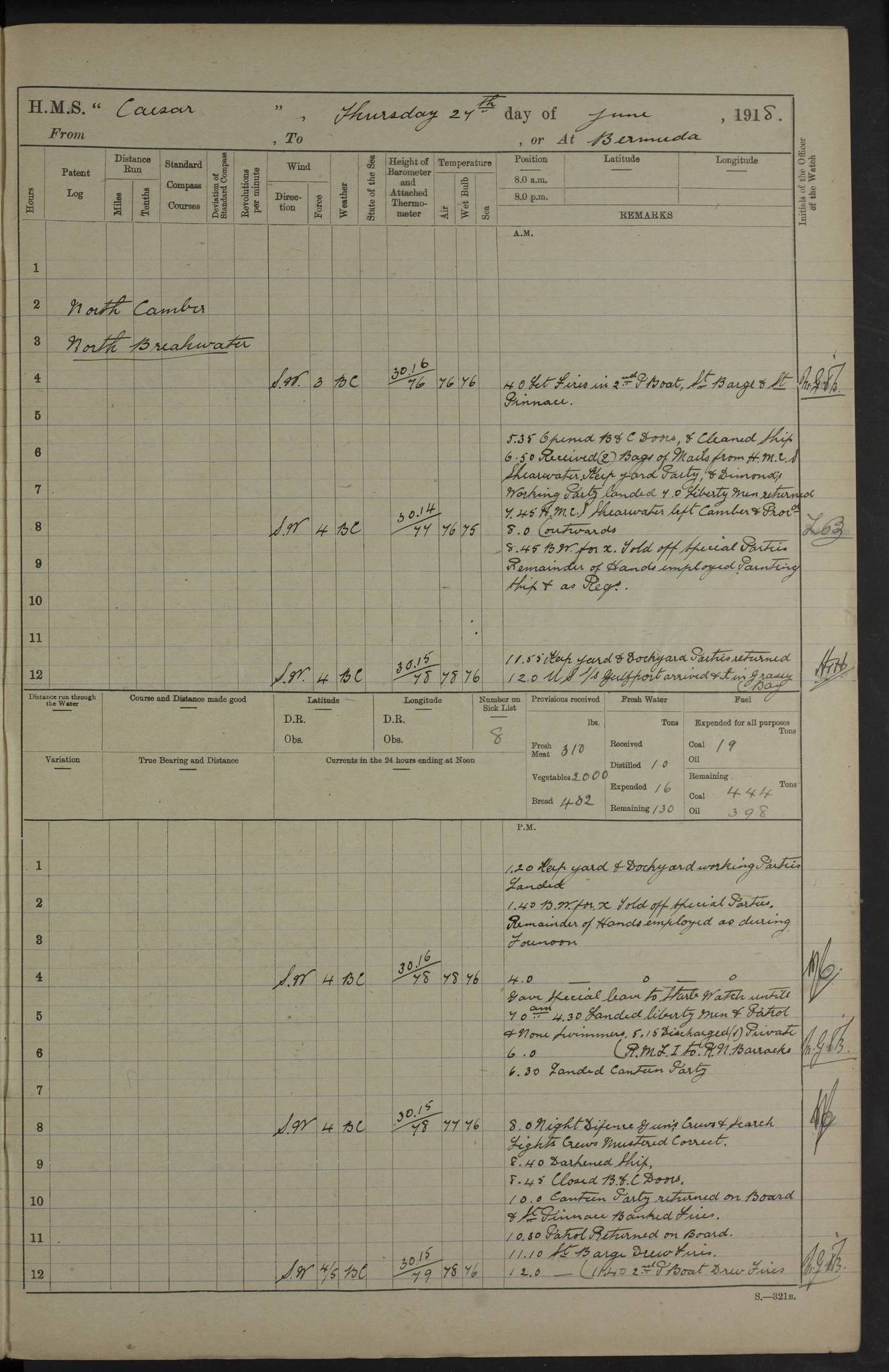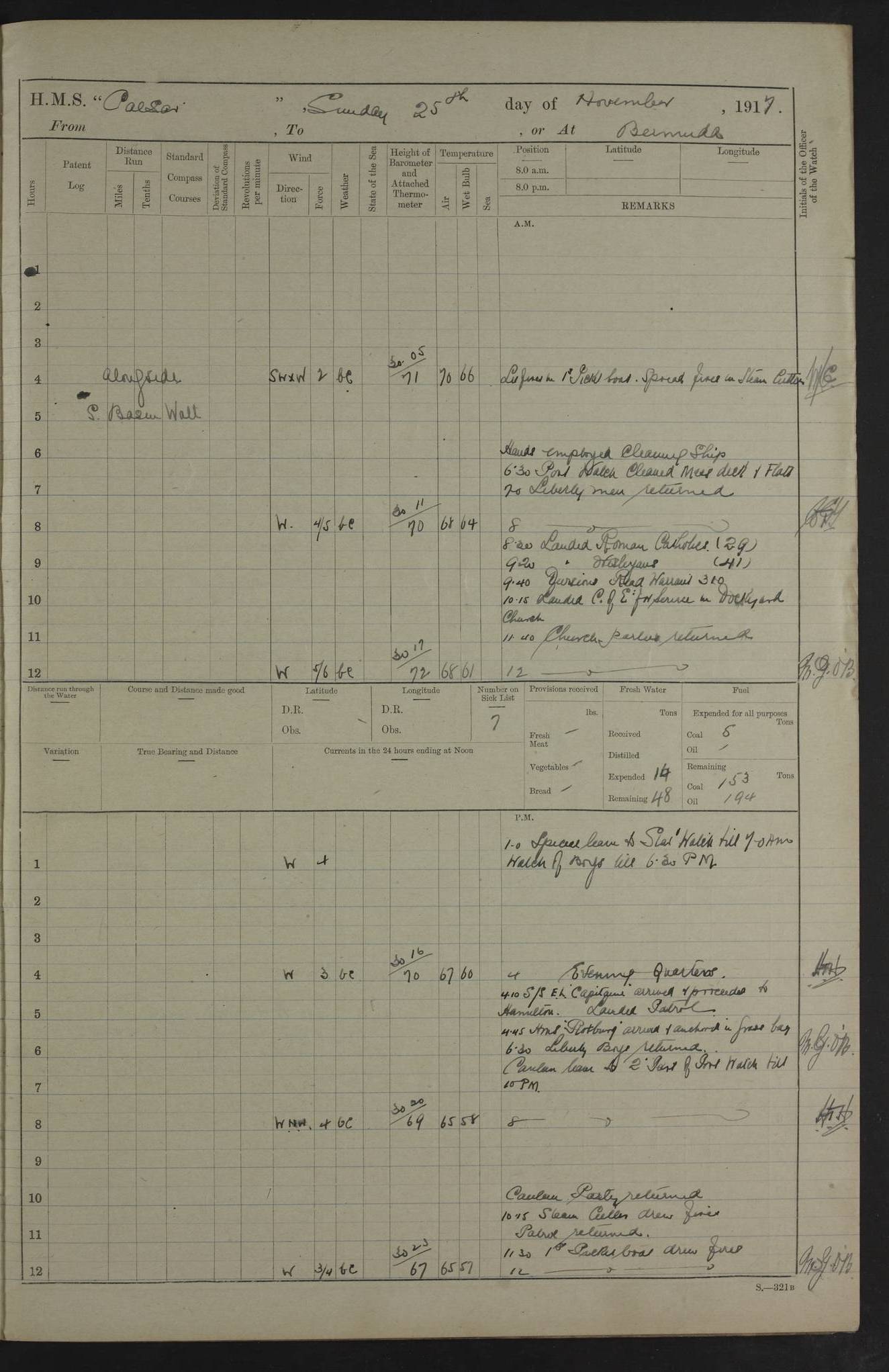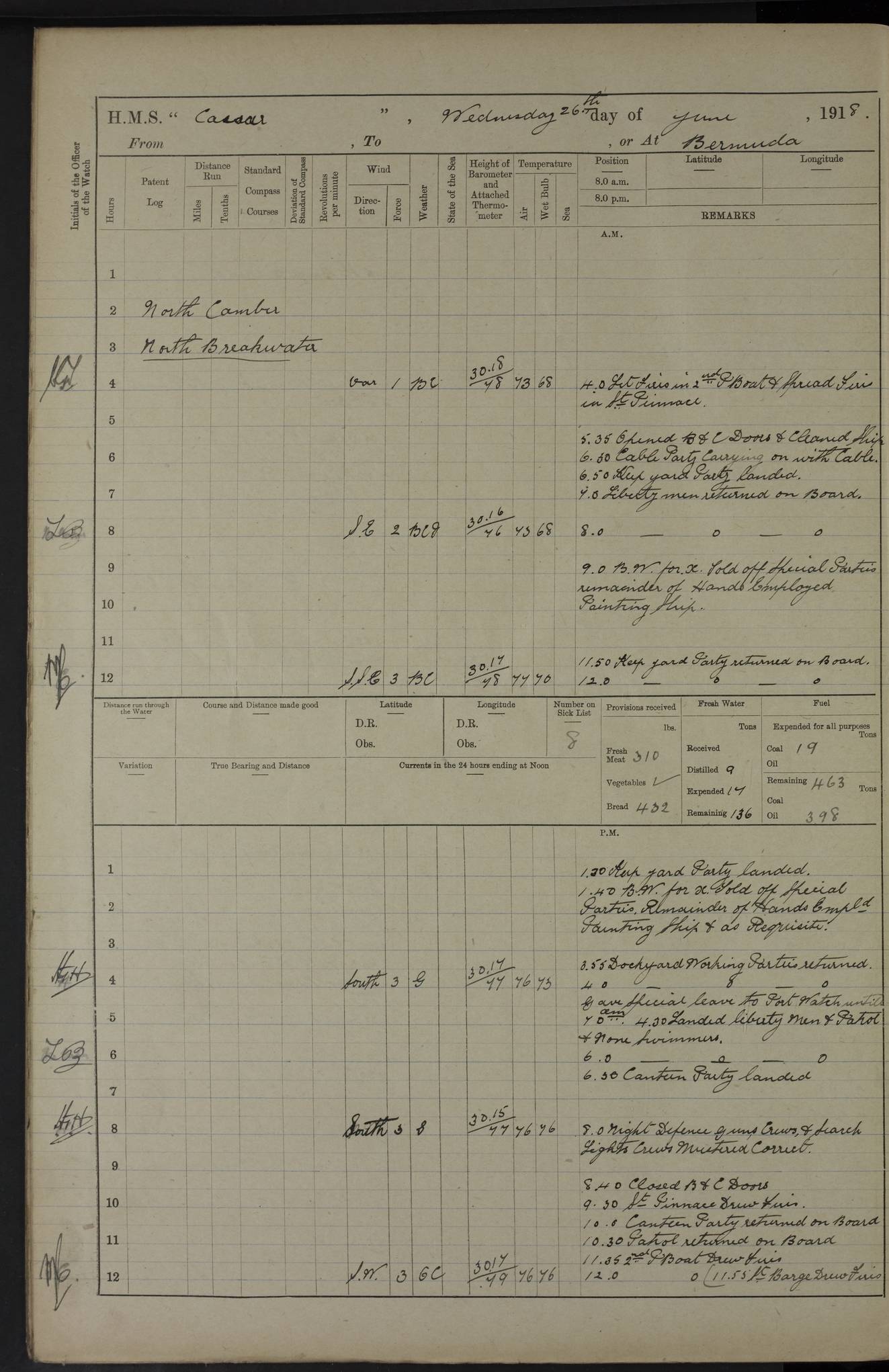 4caf84b6cadfd34197009939: (http://oldweather.s3.amazonaws.com/ADM53-36574/ADM 53-36574-145_1.jpg) 1 January 1917 At Bermuda Lat 32.32, Long -64.83 [Alongside Outer Camber Wall] 4.0am: Raised steam in first Picket boat. 6.0am: Employed cleaning ship. 7.0am: Landed Dockyard parties. Opened B, C doors. am: Employed drawing ammunition and stores, refitting and as requisite. 0.45pm: Paid monthly advance. pm: Employed as in forenoon. 4.30pm: Special leave to Starboard Watch till 7.0am. Landed patrol. 5.0pm: Dockyard parties returned. 6.30pm: Canteen leave to second part Port Watch till 10.0pm. 8.0pm: Night guns’ and search lights’ crews told off. 8.40pm: Closed B, C doors. 10.15pm: Patrol returned. 11.35pm: Drew fires in picket boats. [Number on sick list: 8] [Provisions received: Fresh Meat 340 lbs, Vegetables 2000 lbs, Bread 464 lbs] [Weather fine, though squally in early am. Noon temperature 63F] 4caf84b6cadfd3419700993a: (http://oldweather.s3.amazonaws.com/ADM53-36574/ADM 53-36574-146_0.jpg) 2 January 1917 [Year incorrectly shown as 1916] At Bermuda Lat 32.32, Long -64.83 [Alongside Outer Camber Wall] 4.30am: Raised steam in first picket boat. 6.30am: Landed working party to assist in repair of fenders in Inner Camber. 7.0am: Opened B, C doors. am: Employed embarking ammunition, refitting and as requisite. 11.45am: Working party returned. pm: Employed as in forenoon. 4.0pm: Quarters. 4.30pm: Special leave to Port Watch till 7.0am. Landed patrol. 6.30pm: Canteen leave to second part Starboard Watch till 10.0pm. 10.0pm: Patrol returned. 11.45pm: Drew fires in first picket boat. [Number on sick list: 8] [Provisions received: Fresh Meat 690 lbs, Bread 524 lbs] 4caf84b6cadfd3419700993b: (http://oldweather.s3.amazonaws.com/ADM53-36574/ADM 53-36574-146_1.jpg) 3 January 1917 [Year incorrectly shown as 1916] At Bermuda Lat 32.32, Long -64.83 [Alongside Outer Camber Wall] 7.0am: Opened B, C doors. Landed Dockyard parties. Sailed HMS “Antrim”. Landed Sanitary working party. am: Employed dismounting guns, drawing and returning stores, refitting and as requisite. Training class under instruction. 4.0pm: Quarters. Read Warrants No 268, 269. 4.30pm: Special leave to Starboard Watch till 7.0am. Landed patrol. 5.0pm: Dockyard and Working parties returned. 6.30pm: Canteen leave to first part Port Watch till 10.0pm. 8.5pm: Night guns’ and search lights’ crews told off. 10.0pm: Patrol returned. [Number on sick list: 8] [Provisions received: Fresh Meat 351 lbs, Vegetables 1000 lbs, Bread 512 lbs] 4caf84b6cadfd3419700993c: (http://oldweather.s3.amazonaws.com/ADM53-36574/ADM 53-36574-147_0.jpg) 4 January 1917 At Bermuda Lat 32.32, Long -64.83 [Alongside Outer Camber Wall] 7.0am: Landed Dockyard and Sanitary Working parties. am: Employed dismounting guns, sending up foretopmast, refitting and as requisite. Gunnery training class under instruction. 9.0am: Landed Working party to assist in repairs of fenders in Inner Camber. Discharged to SS “Kiakora” [probably Kaikoura] two ratings to form gun’s crew. 3.30pm: Working parties returned. 4.30pm: Special leave to Port Watch till 7.0am. Landed patrol. 6.30pm: Canteen leave to first part Starboard Watch till 10.0pm; 10.15pm: Patrol returned. [Number on sick list: 9] [Provisions received: Fresh Meat 353 lbs, Vegetables 1000 lbs, Bread 498 lbs] 4caf84b6cadfd3419700993d: (http://oldweather.s3.amazonaws.com/ADM53-36574/ADM 53-36574-147_1.jpg) 5 January 1917 At Bermuda Lat 32.32, Long -64.83 [Alongside Outer Camber Wall] 7.0am: Landed Dockyard and Sanitary Working parties. am: Employed refitting, dismounting guns and as requisite. Gunnery Training class under instruction. pm: Employed as in forenoon. 2.55pm: Arrived HMS “Antrim”. 4.30pm: Special leave to Starboard Watch till 7.0am. Landed patrol. 5.40pm: Drew fires in second picket boat. 6.30pm: Canteen leave to second part Port Watch till 10.0pm. 11.0pm: Patrol returned. 11.40pm: Drew fires in first picket boat. [Number on sick list: 9] [Provisions received: Fresh Meat 350 lbs, Vegetables 400 lbs, Bread 514 lbs] 4caf84b6cadfd3419700993e: (http://oldweather.s3.amazonaws.com/ADM53-36574/ADM 53-36574-148_0.jpg) 6 January 1917 At Bermuda Lat 32.32, Long -64.83 [Alongside Outer Camber Wall] 7.0am: Landed Dockyard parties. am: Employed cleaning ship, refitting, discharging ammunition from SS “Goodwood”, assisting in repairs to fenders of Inner Camber and as requisite. Training class under instruction. 11.45am: Dockyard parties returned. 0.30pm: Observed SS “Prophet” aground in Stag Channel. pm: Make and mend clothes. 1.30pm: Special leave to Port Watch till 7.0am and boys till 5.0pm. 3.0pm: SS “Prophet” refloated and proceeded to anchor. 4.0pm: Quarters. Read Warrant No 270. 4.30pm: Landed patrol. 5.0pm: Party employed discharging SS “Goodwood”. 6.30pm: Canteen leave to second part Starboard Watch till 10.0pm. 8.0pm: Night guns’ and search lights’ crews told off. 8.40pm: Closed B, C doors. 10.15pm: Patrol returned. [Number on sick list: 7] [Provisions received: Fresh Meat 361 lbs, Vegetables 2000 lbs, Bread 928 lbs] 4caf84b6cadfd3419700993f: (http://oldweather.s3.amazonaws.com/ADM53-36574/ADM 53-36574-148_1.jpg) 7 January 1917 At Bermuda Lat 32.32, Long -64.83 [Alongside Outer Camber Wall] 5.55am: Opened B, C doors. Employed cleaning ship. 8.30am: Landed Church parties, Presbyterians 18, Wesleyans 43, RCs 41. 9.30am: Divisions. 10.15am: Ship’s Company attended Divine Service at Dockyard Church. 11.20am: Church parties returned. 1.0pm: Special leave to Starboard Watch till 7.0am and boys will 5.0pm. 6.30pm: Canteen leave to first part Port Watch till 10.0pm. [Number on sick list: 8] [Weather fine, noon temperature 70F] 4caf84b6cadfd34197009940: (http://oldweather.s3.amazonaws.com/ADM53-36574/ADM 53-36574-149_0.jpg) 8 January 1917 At Bermuda Lat 32.32, Long -64.83 [Alongside Outer Camber Wall] 4.0am: Raised steam in first picket boat. 7.0am: Landed Dockyard parties. am: Employed dischargi