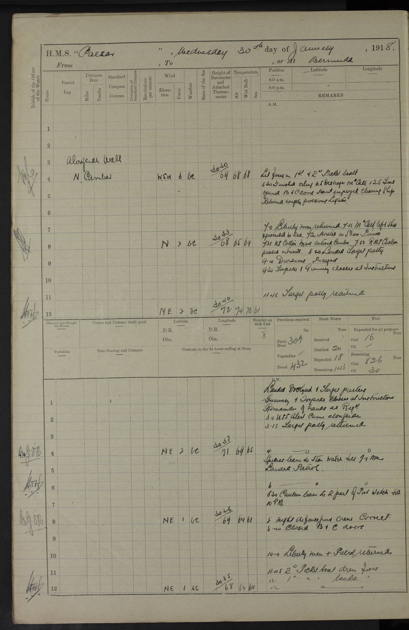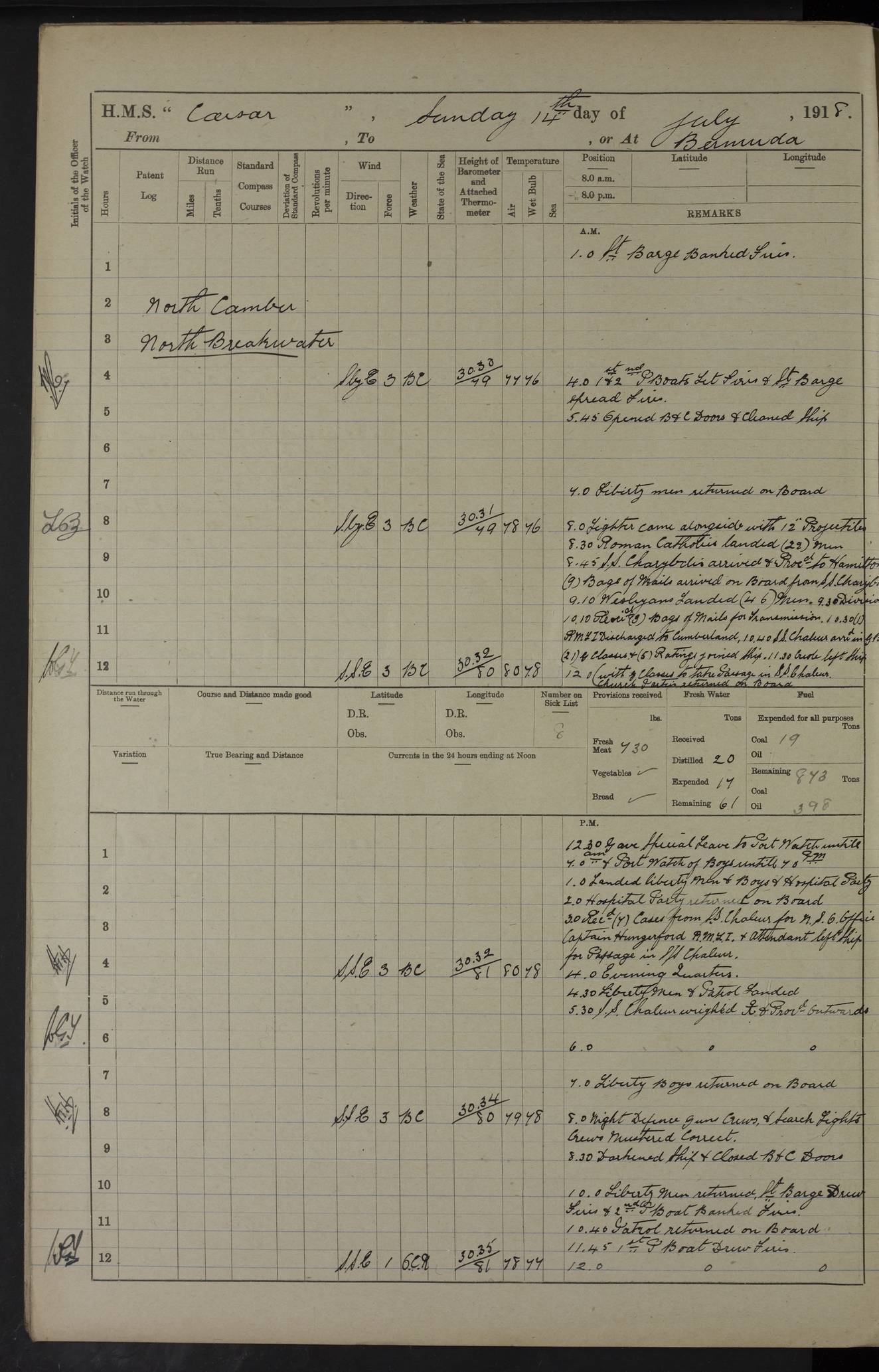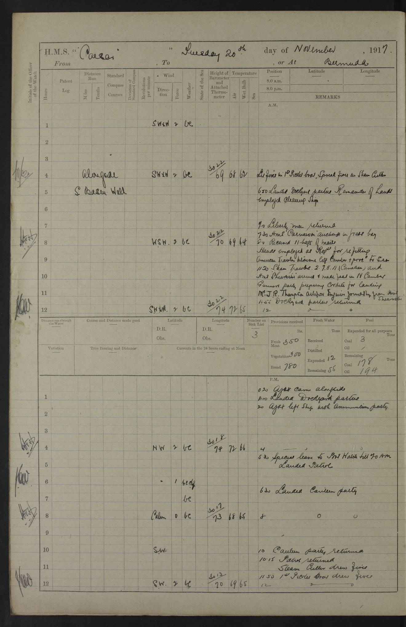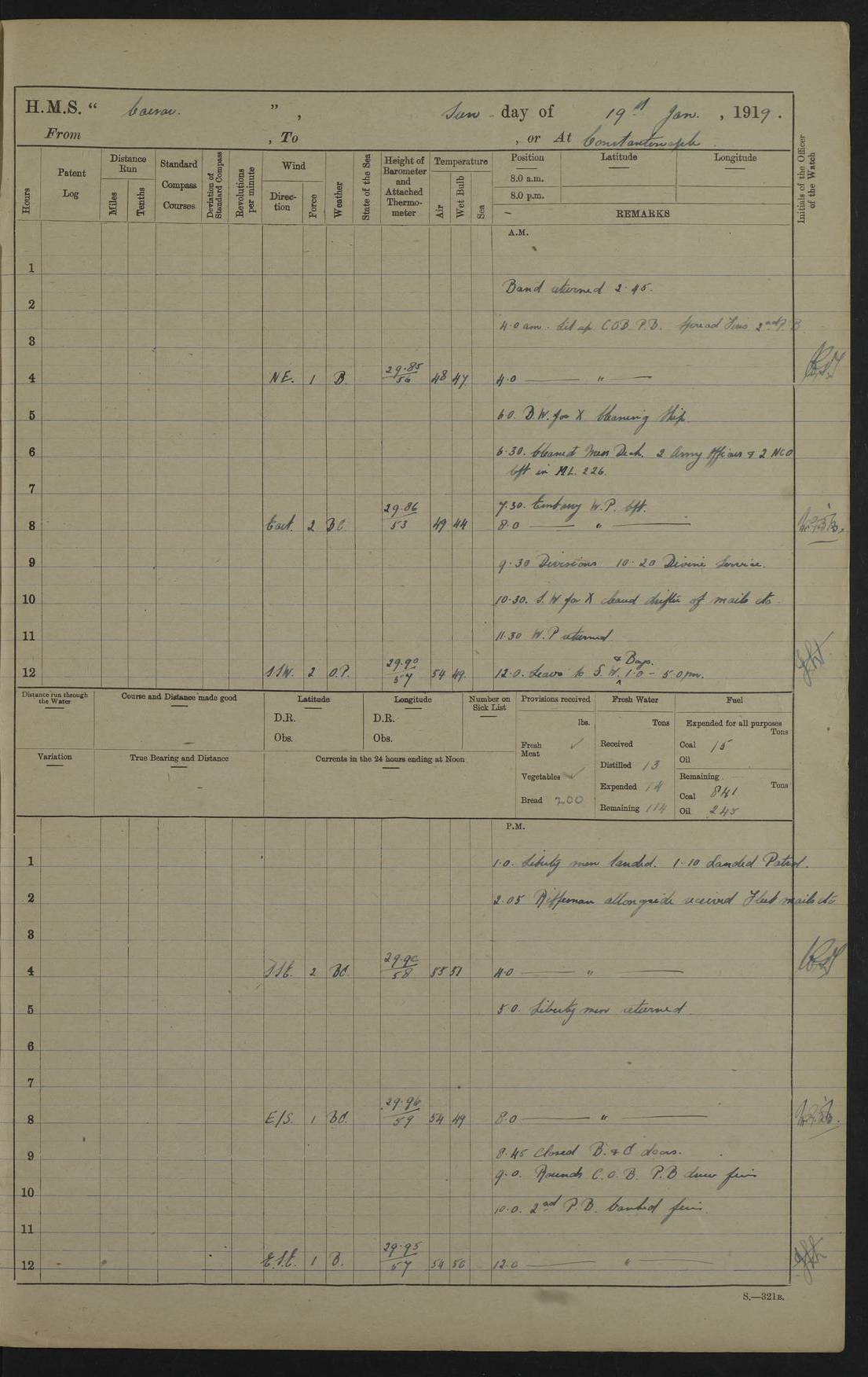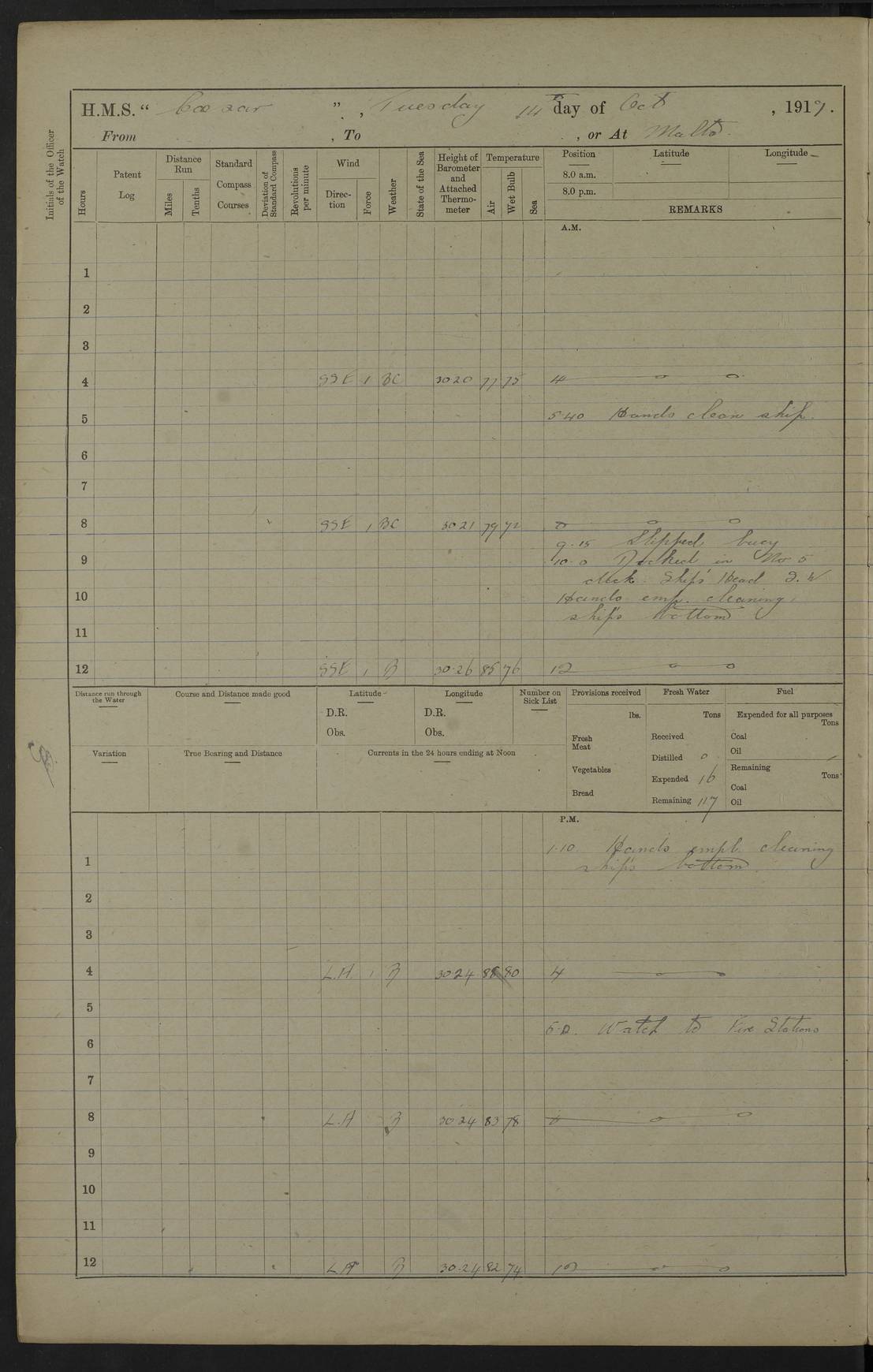 4caf84b6cadfd34197009939: (http://oldweather.s3.amazonaws.com/ADM53-36574/ADM 53-36574-145_1.jpg) 1 January 1917 At Bermuda Lat 32.32, Long -64.83 [Alongside Outer Camber Wall] 4.0am: Raised steam in first Picket boat. 6.0am: Employed cleaning ship. 7.0am: Landed Dockyard parties. Opened B, C doors. am: Employed drawing ammunition and stores, refitting and as requisite. 0.45pm: Paid monthly advance. pm: Employed as in forenoon. 4.30pm: Special leave to Starboard Watch till 7.0am. Landed patrol. 5.0pm: Dockyard parties returned. 6.30pm: Canteen leave to second part Port Watch till 10.0pm. 8.0pm: Night guns’ and search lights’ crews told off. 8.40pm: Closed B, C doors. 10.15pm: Patrol returned. 11.35pm: Drew fires in picket boats. [Number on sick list: 8] [Provisions received: Fresh Meat 340 lbs, Vegetables 2000 lbs, Bread 464 lbs] [Weather fine, though squally in early am. Noon temperature 63F] 4caf84b6cadfd3419700993a: (http://oldweather.s3.amazonaws.com/ADM53-36574/ADM 53-36574-146_0.jpg) 2 January 1917 [Year incorrectly shown as 1916] At Bermuda Lat 32.32, Long -64.83 [Alongside Outer Camber Wall] 4.30am: Raised steam in first picket boat. 6.30am: Landed working party to assist in repair of fenders in Inner Camber. 7.0am: Opened B, C doors. am: Employed embarking ammunition, refitting and as requisite. 11.45am: Working party returned. pm: Employed as in forenoon. 4.0pm: Quarters. 4.30pm: Special leave to Port Watch till 7.0am. Landed patrol. 6.30pm: Canteen leave to second part Starboard Watch till 10.0pm. 10.0pm: Patrol returned. 11.45pm: Drew fires in first picket boat. [Number on sick list: 8] [Provisions received: Fresh Meat 690 lbs, Bread 524 lbs] 4caf84b6cadfd3419700993b: (http://oldweather.s3.amazonaws.com/ADM53-36574/ADM 53-36574-146_1.jpg) 3 January 1917 [Year incorrectly shown as 1916] At Bermuda Lat 32.32, Long -64.83 [Alongside Outer Camber Wall] 7.0am: Opened B, C doors. Landed Dockyard parties. Sailed HMS “Antrim”. Landed Sanitary working party. am: Employed dismounting guns, drawing and returning stores, refitting and as requisite. Training class under instruction. 4.0pm: Quarters. Read Warrants No 268, 269. 4.30pm: Special leave to Starboard Watch till 7.0am. Landed patrol. 5.0pm: Dockyard and Working parties returned. 6.30pm: Canteen leave to first part Port Watch till 10.0pm. 8.5pm: Night guns’ and search lights’ crews told off. 10.0pm: Patrol returned. [Number on sick list: 8] [Provisions received: Fresh Meat 351 lbs, Vegetables 1000 lbs, Bread 512 lbs] 4caf84b6cadfd3419700993c: (http://oldweather.s3.amazonaws.com/ADM53-36574/ADM 53-36574-147_0.jpg) 4 January 1917 At Bermuda Lat 32.32, Long -64.83 [Alongside Outer Camber Wall] 7.0am: Landed Dockyard and Sanitary Working parties. am: Employed dismounting guns, sending up foretopmast, refitting and as requisite. Gunnery training class under instruction. 9.0am: Landed Working party to assist in repairs of fenders in Inner Camber. Discharged to SS “Kiakora” [probably Kaikoura] two ratings to form gun’s crew. 3.30pm: Working parties returned. 4.30pm: Special leave to Port Watch till 7.0am. Landed patrol. 6.30pm: Canteen leave to first part Starboard Watch till 10.0pm; 10.15pm: Patrol returned. [Number on sick list: 9] [Provisions received: Fresh Meat 353 lbs, Vegetables 1000 lbs, Bread 498 lbs] 4caf84b6cadfd3419700993d: (http://oldweather.s3.amazonaws.com/ADM53-36574/ADM 53-36574-147_1.jpg) 5 January 1917 At Bermuda Lat 32.32, Long -64.83 [Alongside Outer Camber Wall] 7.0am: Landed Dockyard and Sanitary Working parties. am: Employed refitting, dismounting guns and as requisite. Gunnery Training class under instruction. pm: Employed as in forenoon. 2.55pm: Arrived HMS “Antrim”. 4.30pm: Special leave to Starboard Watch till 7.0am. Landed patrol. 5.40pm: Drew fires in second picket boat. 6.30pm: Canteen leave to second part Port Watch till 10.0pm. 11.0pm: Patrol returned. 11.40pm: Drew fires in first picket boat. [Number on sick list: 9] [Provisions received: Fresh Meat 350 lbs, Vegetables 400 lbs, Bread 514 lbs] 4caf84b6cadfd3419700993e: (http://oldweather.s3.amazonaws.com/ADM53-36574/ADM 53-36574-148_0.jpg) 6 January 1917 At Bermuda Lat 32.32, Long -64.83 [Alongside Outer Camber Wall] 7.0am: Landed Dockyard parties. am: Employed cleaning ship, refitting, discharging ammunition from SS “Goodwood”, assisting in repairs to fenders of Inner Camber and as requisite. Training class under instruction. 11.45am: Dockyard parties returned. 0.30pm: Observed SS “Prophet” aground in Stag Channel. pm: Make and mend clothes. 1.30pm: Special leave to Port Watch till 7.0am and boys till 5.0pm. 3.0pm: SS “Prophet” refloated and proceeded to anchor. 4.0pm: Quarters. Read Warrant No 270. 4.30pm: Landed patrol. 5.0pm: Party employed discharging SS “Goodwood”. 6.30pm: Canteen leave to second part Starboard Watch till 10.0pm. 8.0pm: Night guns’ and search lights’ crews told off. 8.40pm: Closed B, C doors. 10.15pm: Patrol returned. [Number on sick list: 7] [Provisions received: Fresh Meat 361 lbs, Vegetables 2000 lbs, Bread 928 lbs] 4caf84b6cadfd3419700993f: (http://oldweather.s3.amazonaws.com/ADM53-36574/ADM 53-36574-148_1.jpg) 7 January 1917 At Bermuda Lat 32.32, Long -64.83 [Alongside Outer Camber Wall] 5.55am: Opened B, C doors. Employed cleaning ship. 8.30am: Landed Church parties, Presbyterians 18, Wesleyans 43, RCs 41. 9.30am: Divisions. 10.15am: Ship’s Company attended Divine Service at Dockyard Church. 11.20am: Church parties returned. 1.0pm: Special leave to Starboard Watch till 7.0am and boys will 5.0pm. 6.30pm: Canteen leave to first part Port Watch till 10.0pm. [Number on sick list: 8] [Weather fine, noon temperature 70F] 4caf84b6cadfd34197009940: (http://oldweather.s3.amazonaws.com/ADM53-36574/ADM 53-36574-149_0.jpg) 8 January 1917 At Bermuda Lat 32.32, Long -64.83 [Alongside Outer Camber Wall] 4.0am: Raised steam in first picket boat. 7.0am: Landed Dockyard parties. am: Employed dischargi