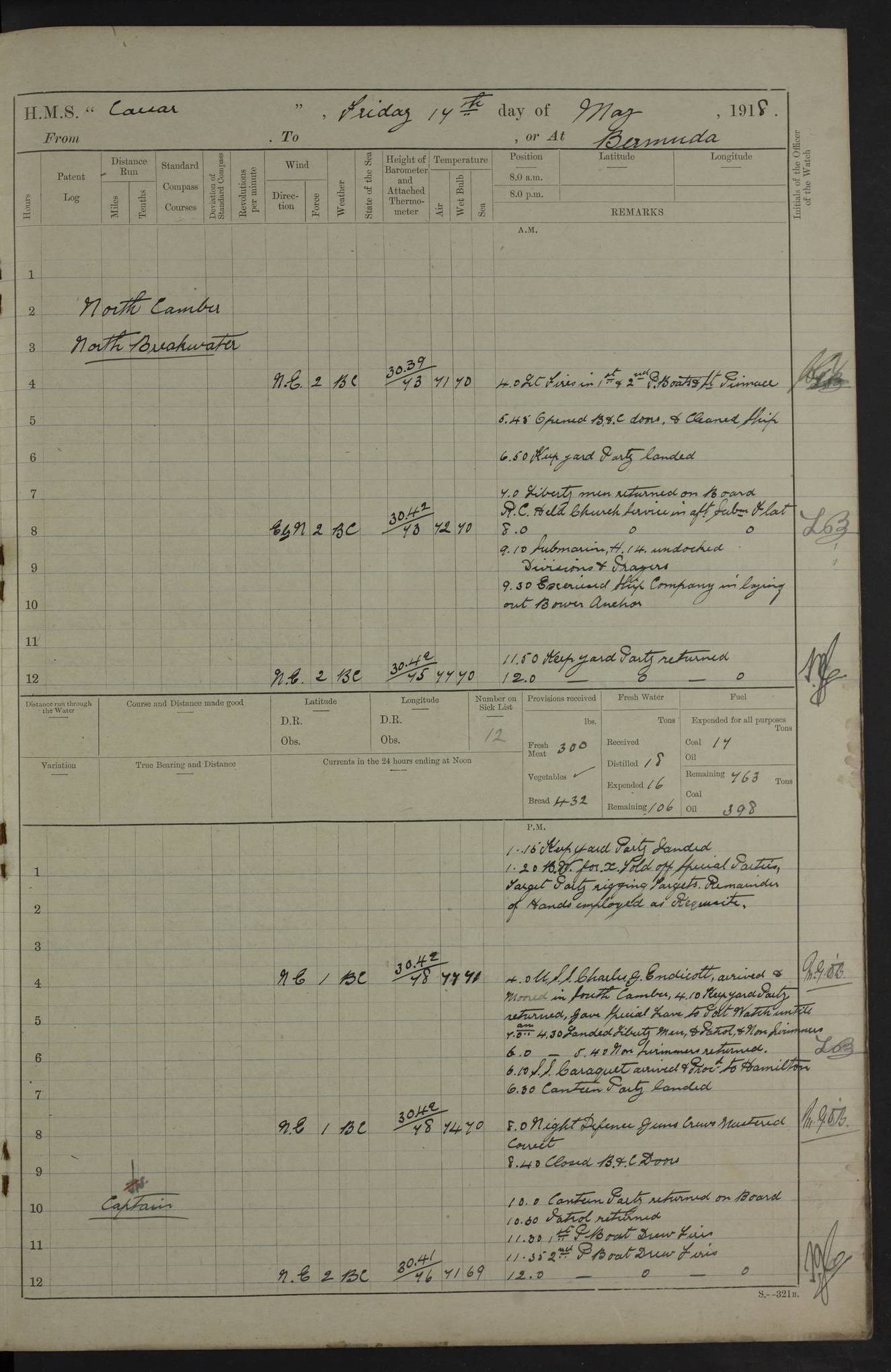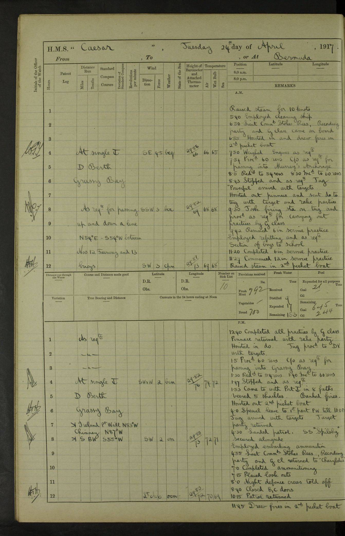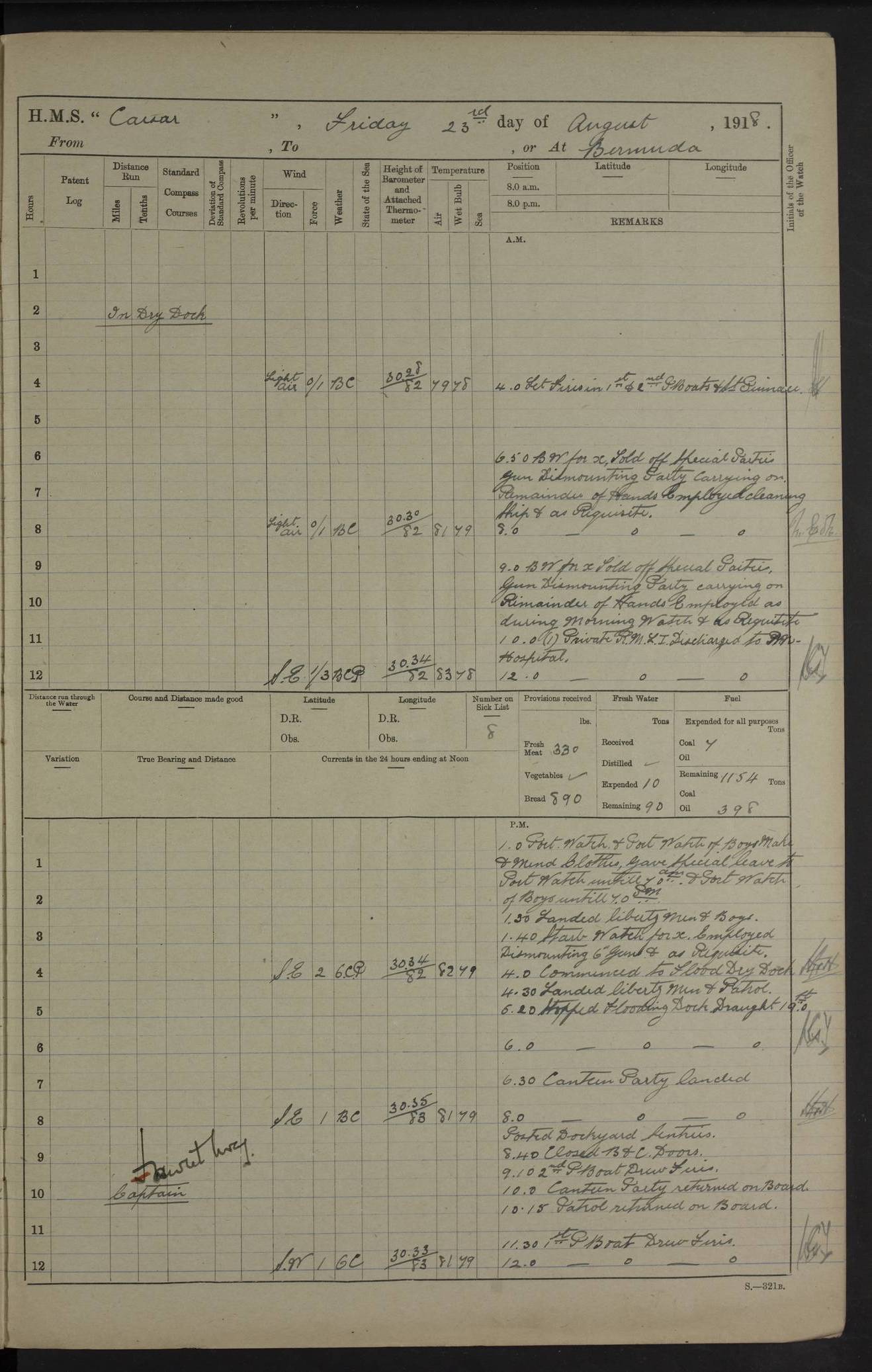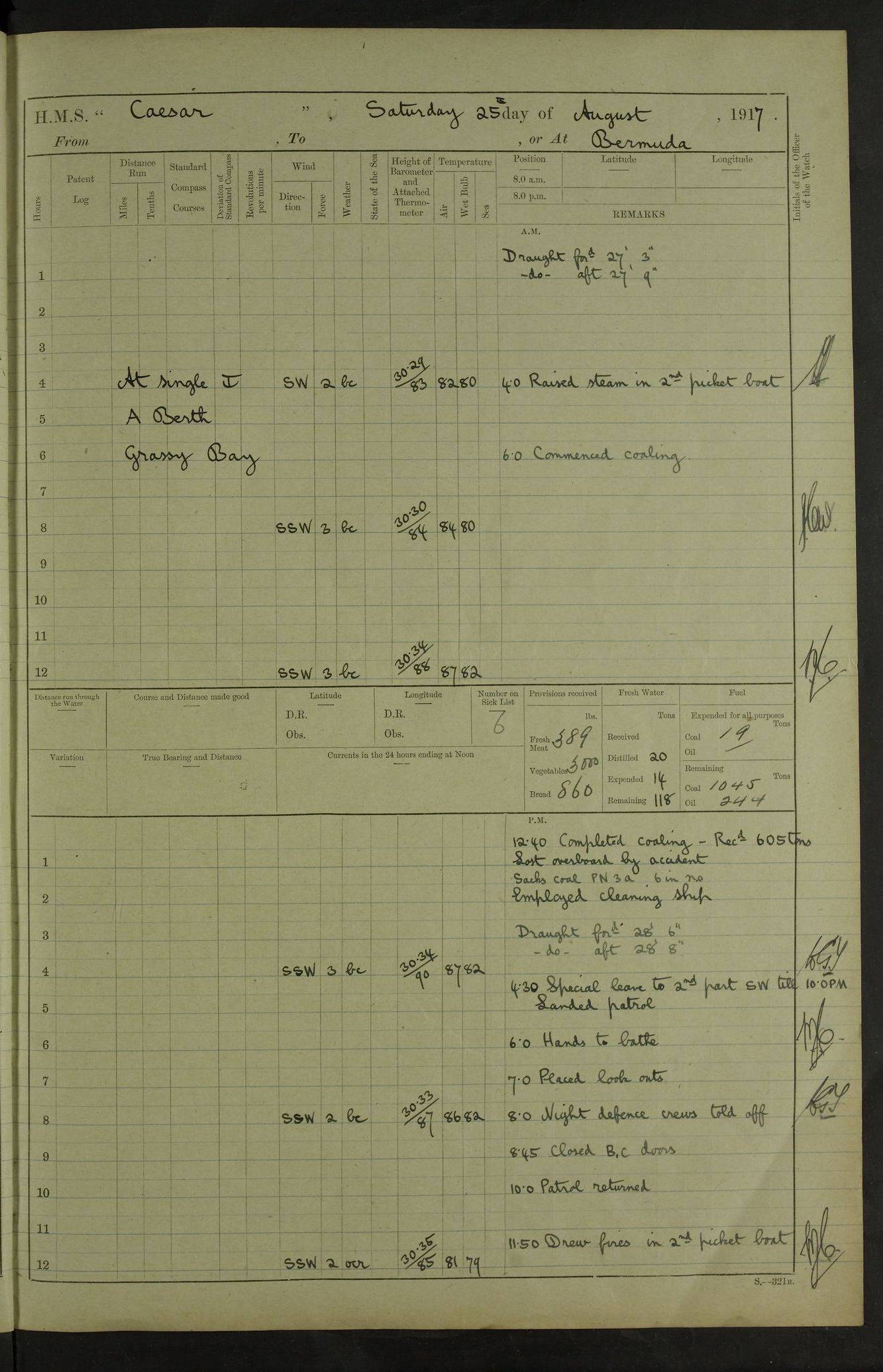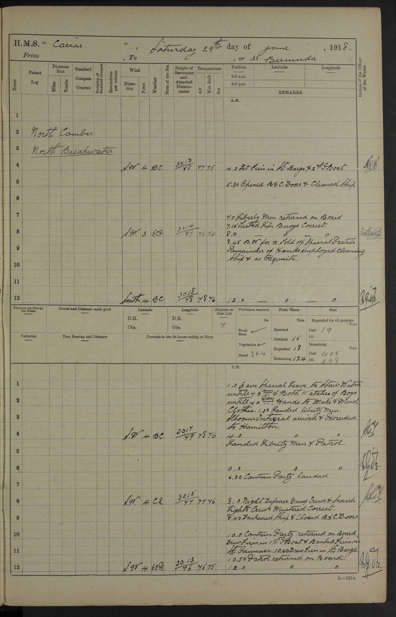 4caf84b6cadfd34197009939: (http://oldweather.s3.amazonaws.com/ADM53-36574/ADM 53-36574-145_1.jpg) 1 January 1917 At Bermuda Lat 32.32, Long -64.83 [Alongside Outer Camber Wall] 4.0am: Raised steam in first Picket boat. 6.0am: Employed cleaning ship. 7.0am: Landed Dockyard parties. Opened B, C doors. am: Employed drawing ammunition and stores, refitting and as requisite. 0.45pm: Paid monthly advance. pm: Employed as in forenoon. 4.30pm: Special leave to Starboard Watch till 7.0am. Landed patrol. 5.0pm: Dockyard parties returned. 6.30pm: Canteen leave to second part Port Watch till 10.0pm. 8.0pm: Night guns’ and search lights’ crews told off. 8.40pm: Closed B, C doors. 10.15pm: Patrol returned. 11.35pm: Drew fires in picket boats. [Number on sick list: 8] [Provisions received: Fresh Meat 340 lbs, Vegetables 2000 lbs, Bread 464 lbs] [Weather fine, though squally in early am. Noon temperature 63F] 4caf84b6cadfd3419700993a: (http://oldweather.s3.amazonaws.com/ADM53-36574/ADM 53-36574-146_0.jpg) 2 January 1917 [Year incorrectly shown as 1916] At Bermuda Lat 32.32, Long -64.83 [Alongside Outer Camber Wall] 4.30am: Raised steam in first picket boat. 6.30am: Landed working party to assist in repair of fenders in Inner Camber. 7.0am: Opened B, C doors. am: Employed embarking ammunition, refitting and as requisite. 11.45am: Working party returned. pm: Employed as in forenoon. 4.0pm: Quarters. 4.30pm: Special leave to Port Watch till 7.0am. Landed patrol. 6.30pm: Canteen leave to second part Starboard Watch till 10.0pm. 10.0pm: Patrol returned. 11.45pm: Drew fires in first picket boat. [Number on sick list: 8] [Provisions received: Fresh Meat 690 lbs, Bread 524 lbs] 4caf84b6cadfd3419700993b: (http://oldweather.s3.amazonaws.com/ADM53-36574/ADM 53-36574-146_1.jpg) 3 January 1917 [Year incorrectly shown as 1916] At Bermuda Lat 32.32, Long -64.83 [Alongside Outer Camber Wall] 7.0am: Opened B, C doors. Landed Dockyard parties. Sailed HMS “Antrim”. Landed Sanitary working party. am: Employed dismounting guns, drawing and returning stores, refitting and as requisite. Training class under instruction. 4.0pm: Quarters. Read Warrants No 268, 269. 4.30pm: Special leave to Starboard Watch till 7.0am. Landed patrol. 5.0pm: Dockyard and Working parties returned. 6.30pm: Canteen leave to first part Port Watch till 10.0pm. 8.5pm: Night guns’ and search lights’ crews told off. 10.0pm: Patrol returned. [Number on sick list: 8] [Provisions received: Fresh Meat 351 lbs, Vegetables 1000 lbs, Bread 512 lbs] 4caf84b6cadfd3419700993c: (http://oldweather.s3.amazonaws.com/ADM53-36574/ADM 53-36574-147_0.jpg) 4 January 1917 At Bermuda Lat 32.32, Long -64.83 [Alongside Outer Camber Wall] 7.0am: Landed Dockyard and Sanitary Working parties. am: Employed dismounting guns, sending up foretopmast, refitting and as requisite. Gunnery training class under instruction. 9.0am: Landed Working party to assist in repairs of fenders in Inner Camber. Discharged to SS “Kiakora” [probably Kaikoura] two ratings to form gun’s crew. 3.30pm: Working parties returned. 4.30pm: Special leave to Port Watch till 7.0am. Landed patrol. 6.30pm: Canteen leave to first part Starboard Watch till 10.0pm; 10.15pm: Patrol returned. [Number on sick list: 9] [Provisions received: Fresh Meat 353 lbs, Vegetables 1000 lbs, Bread 498 lbs] 4caf84b6cadfd3419700993d: (http://oldweather.s3.amazonaws.com/ADM53-36574/ADM 53-36574-147_1.jpg) 5 January 1917 At Bermuda Lat 32.32, Long -64.83 [Alongside Outer Camber Wall] 7.0am: Landed Dockyard and Sanitary Working parties. am: Employed refitting, dismounting guns and as requisite. Gunnery Training class under instruction. pm: Employed as in forenoon. 2.55pm: Arrived HMS “Antrim”. 4.30pm: Special leave to Starboard Watch till 7.0am. Landed patrol. 5.40pm: Drew fires in second picket boat. 6.30pm: Canteen leave to second part Port Watch till 10.0pm. 11.0pm: Patrol returned. 11.40pm: Drew fires in first picket boat. [Number on sick list: 9] [Provisions received: Fresh Meat 350 lbs, Vegetables 400 lbs, Bread 514 lbs] 4caf84b6cadfd3419700993e: (http://oldweather.s3.amazonaws.com/ADM53-36574/ADM 53-36574-148_0.jpg) 6 January 1917 At Bermuda Lat 32.32, Long -64.83 [Alongside Outer Camber Wall] 7.0am: Landed Dockyard parties. am: Employed cleaning ship, refitting, discharging ammunition from SS “Goodwood”, assisting in repairs to fenders of Inner Camber and as requisite. Training class under instruction. 11.45am: Dockyard parties returned. 0.30pm: Observed SS “Prophet” aground in Stag Channel. pm: Make and mend clothes. 1.30pm: Special leave to Port Watch till 7.0am and boys till 5.0pm. 3.0pm: SS “Prophet” refloated and proceeded to anchor. 4.0pm: Quarters. Read Warrant No 270. 4.30pm: Landed patrol. 5.0pm: Party employed discharging SS “Goodwood”. 6.30pm: Canteen leave to second part Starboard Watch till 10.0pm. 8.0pm: Night guns’ and search lights’ crews told off. 8.40pm: Closed B, C doors. 10.15pm: Patrol returned. [Number on sick list: 7] [Provisions received: Fresh Meat 361 lbs, Vegetables 2000 lbs, Bread 928 lbs] 4caf84b6cadfd3419700993f: (http://oldweather.s3.amazonaws.com/ADM53-36574/ADM 53-36574-148_1.jpg) 7 January 1917 At Bermuda Lat 32.32, Long -64.83 [Alongside Outer Camber Wall] 5.55am: Opened B, C doors. Employed cleaning ship. 8.30am: Landed Church parties, Presbyterians 18, Wesleyans 43, RCs 41. 9.30am: Divisions. 10.15am: Ship’s Company attended Divine Service at Dockyard Church. 11.20am: Church parties returned. 1.0pm: Special leave to Starboard Watch till 7.0am and boys will 5.0pm. 6.30pm: Canteen leave to first part Port Watch till 10.0pm. [Number on sick list: 8] [Weather fine, noon temperature 70F] 4caf84b6cadfd34197009940: (http://oldweather.s3.amazonaws.com/ADM53-36574/ADM 53-36574-149_0.jpg) 8 January 1917 At Bermuda Lat 32.32, Long -64.83 [Alongside Outer Camber Wall] 4.0am: Raised steam in first picket boat. 7.0am: Landed Dockyard parties. am: Employed dischargi